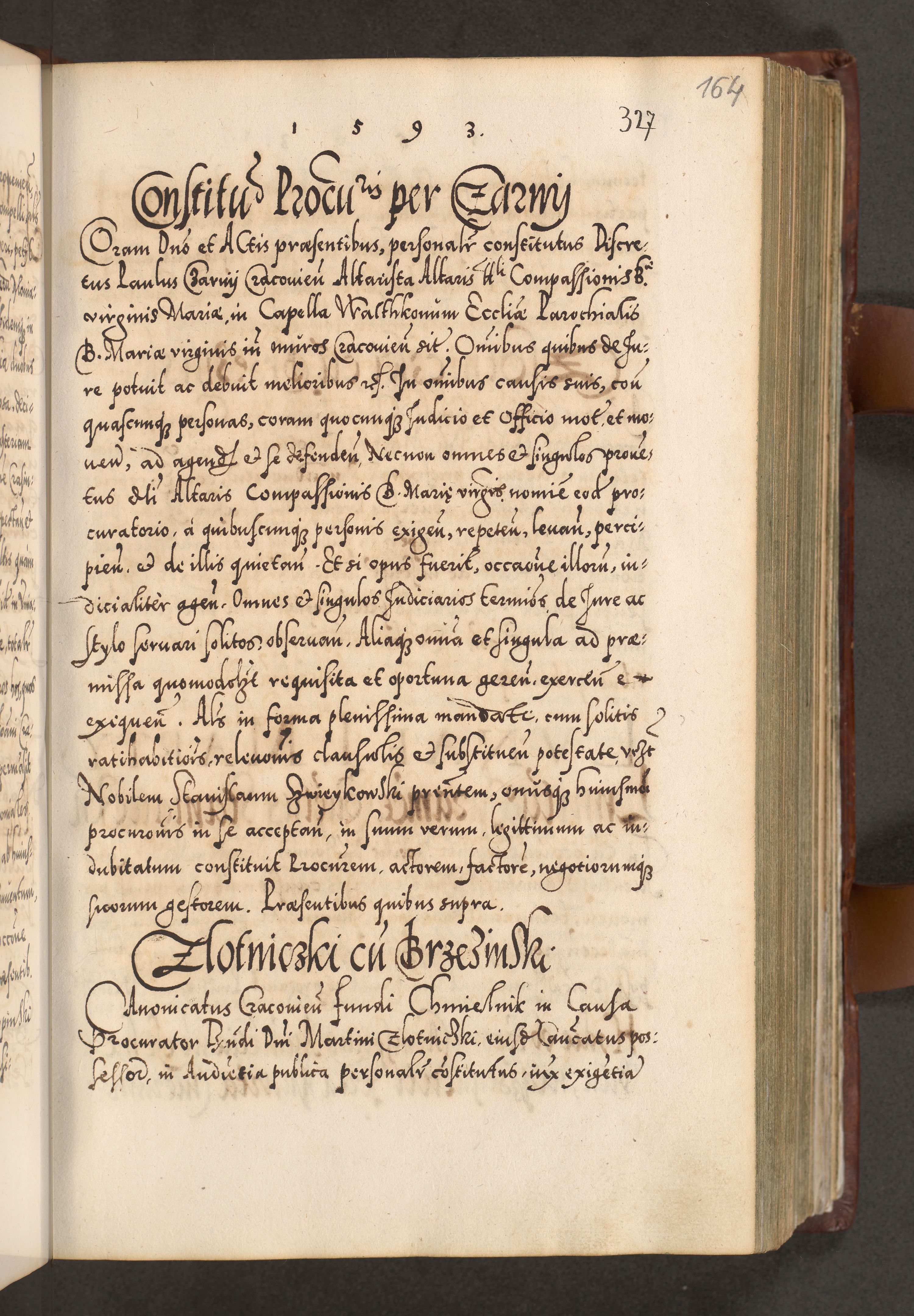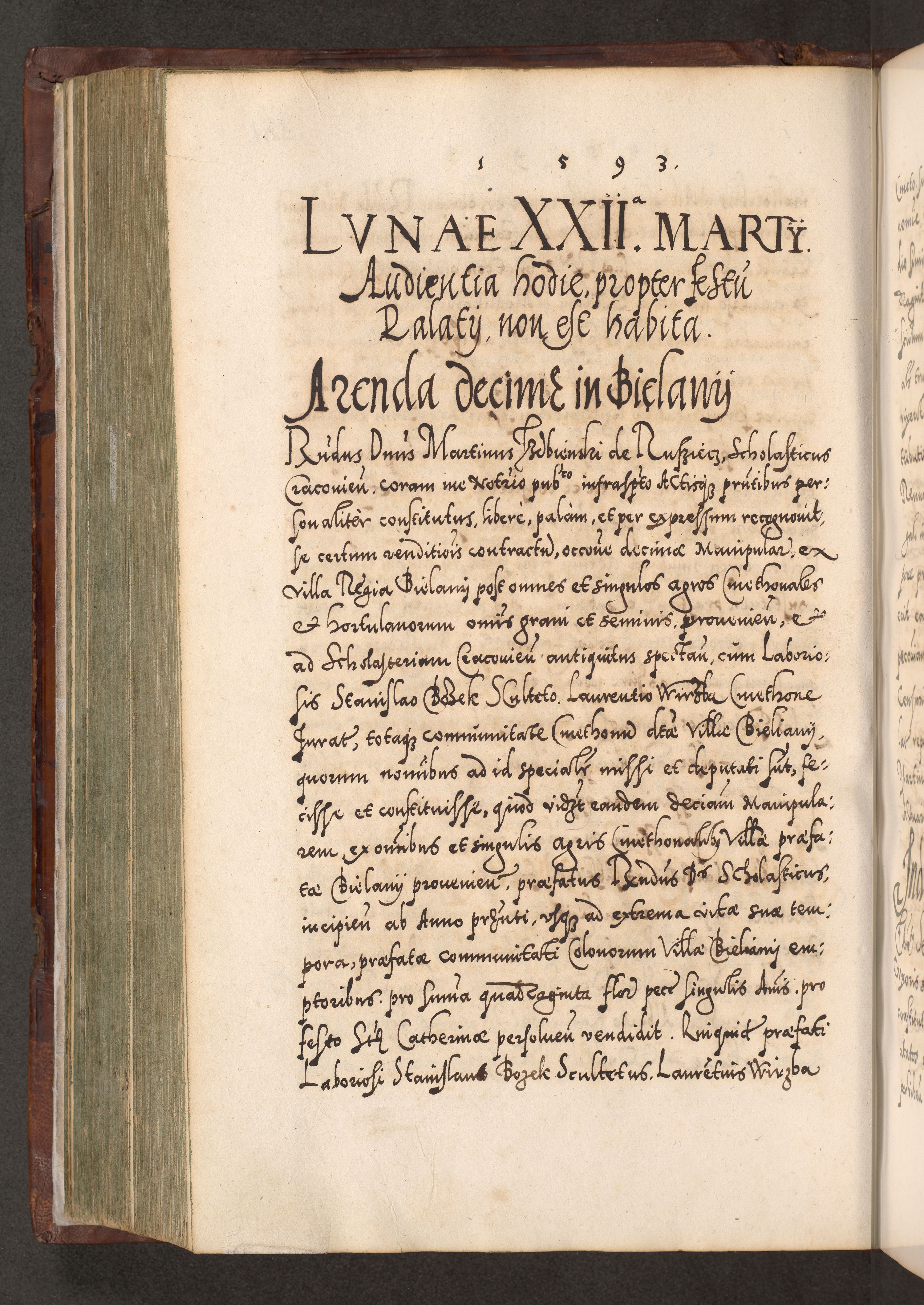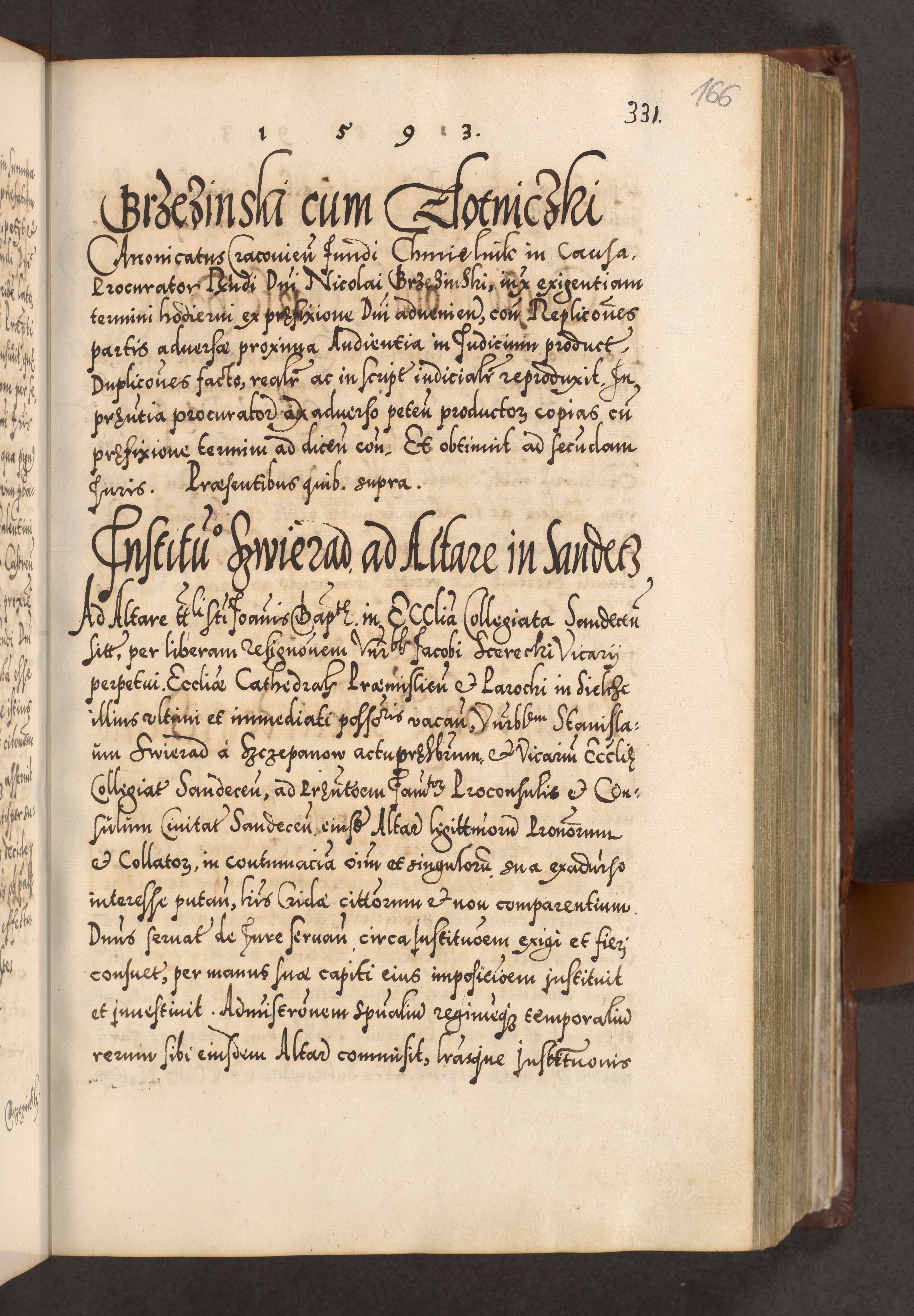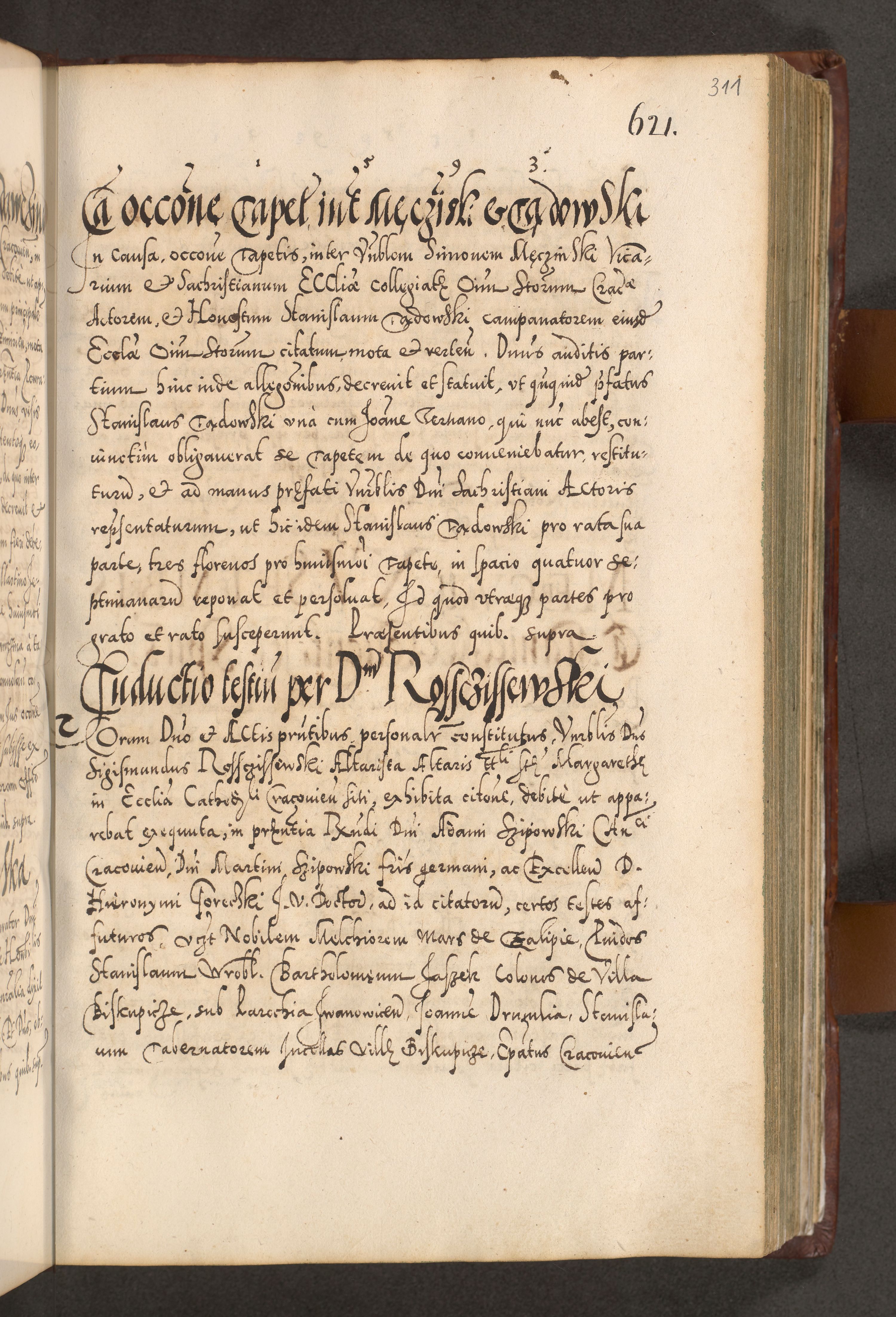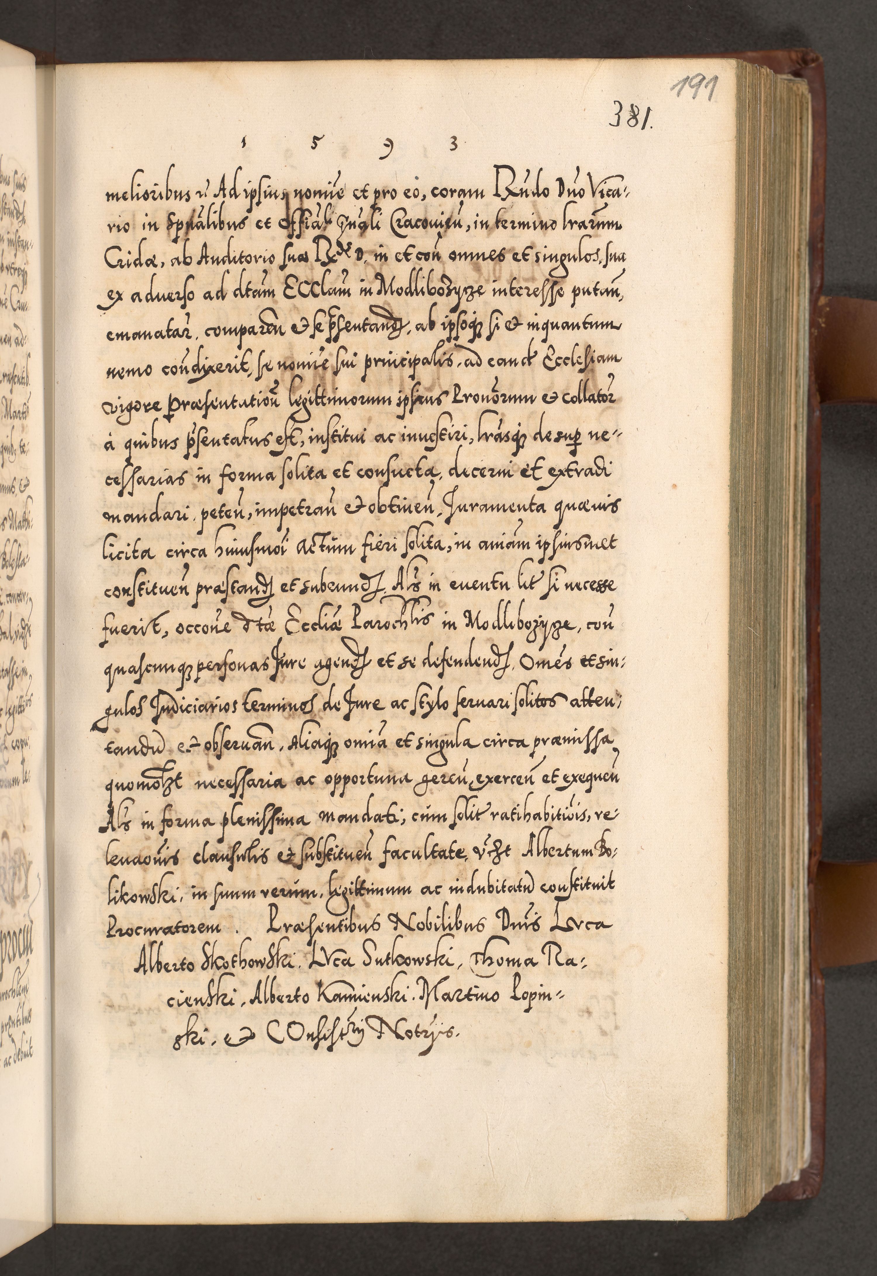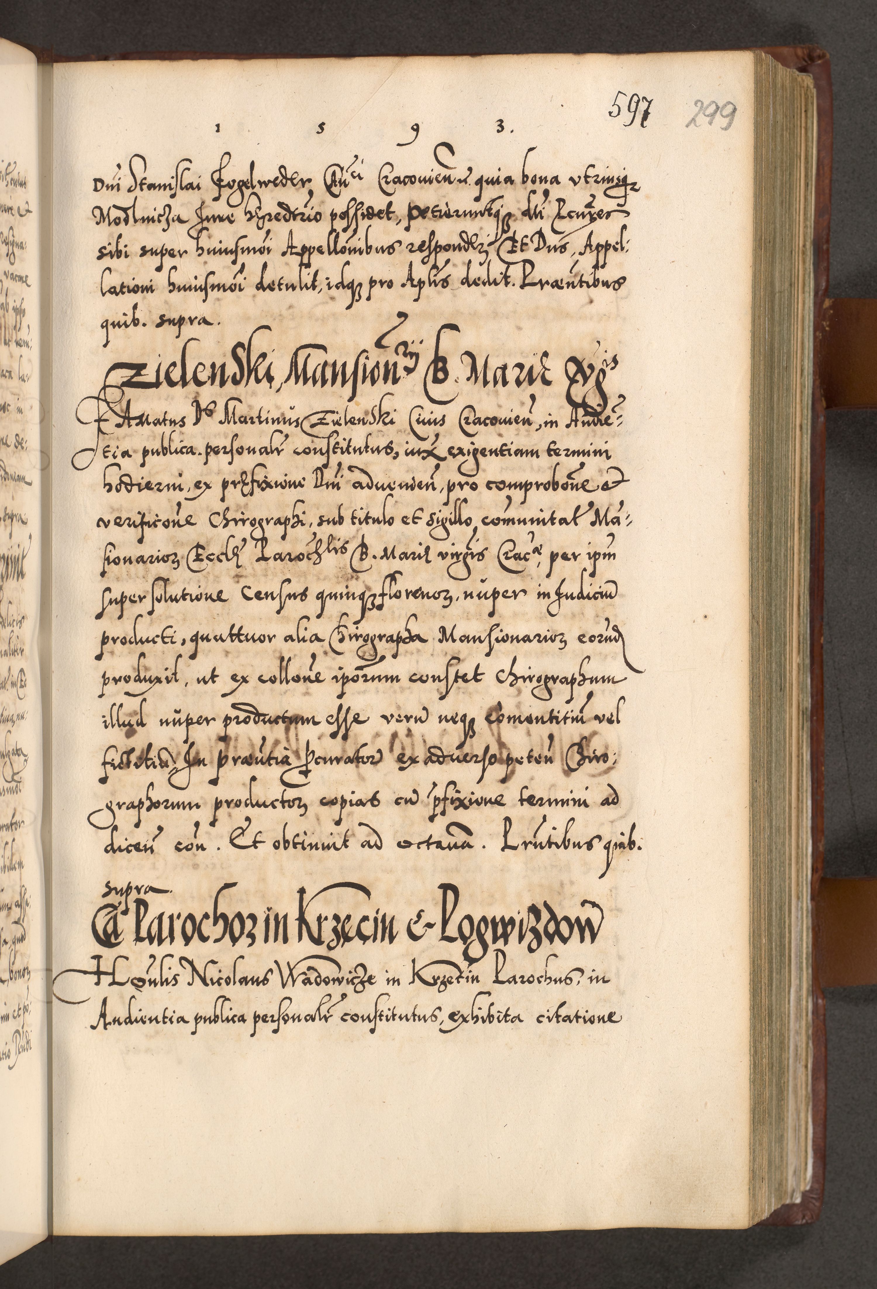 Illistrissimo et revedissimo in Christo Patre Domino Domino Georgio Rzadziwił Miserone Divina Sacrostae R. E. Tituli S. Sixti Presbitero Cardinali Duce in Olyka et Niesswiesz ad Gubernacula Ecclessiae Cracoviensis cuius administratorialem a Sancta Sede Apostolica obtinverat feliciter sedente. Acta actorum, causarum, sententiarum tam deffinitivarum quam interloquutoriarum decretorum, obligationum, quietationum, recognitionum, constitutionum procuratorum etc. coram Reverendo Domino Stanislao Crassinskz de Crasne Archidiacono Cracoviensis, Scholastico Gnesnesis, Custode Plocensis etc. Vicario et Officiali Generali Cracoviensi in Ano Domini Millesimo Quingentesimo Nonagesimo Primo cuius indictio quarta pontificatus SS. Domini Nostri Gregorii XIIII Anno I psius prio feliciter incipiut