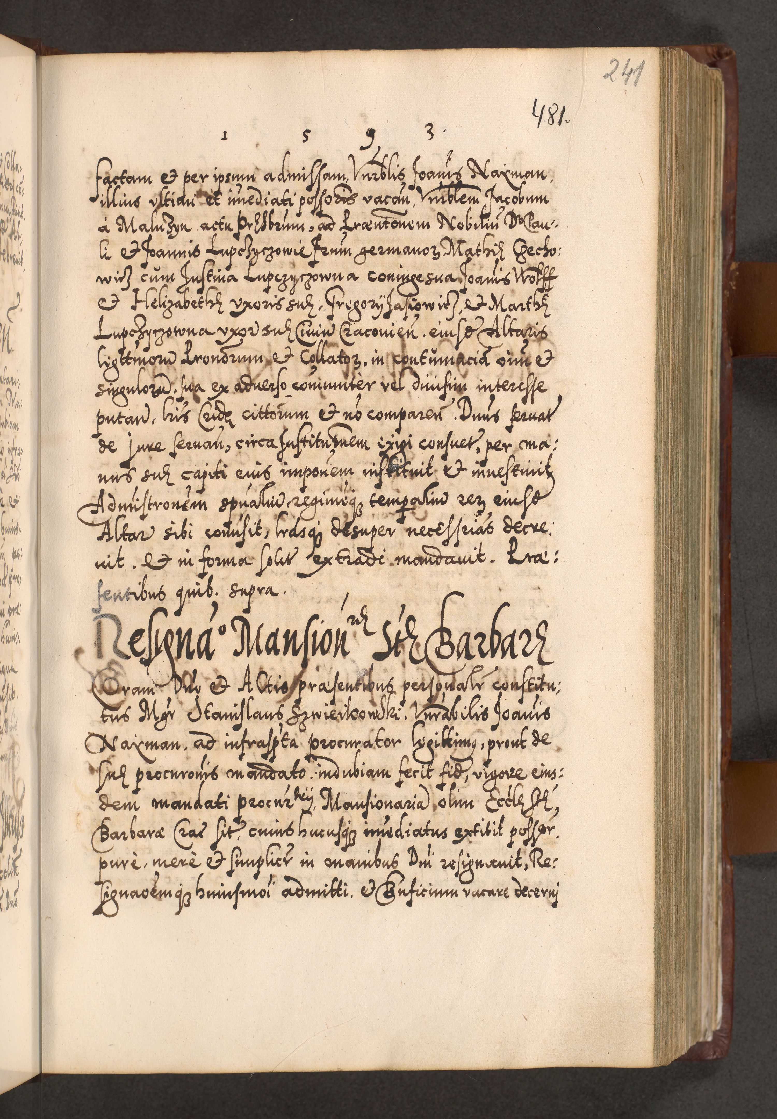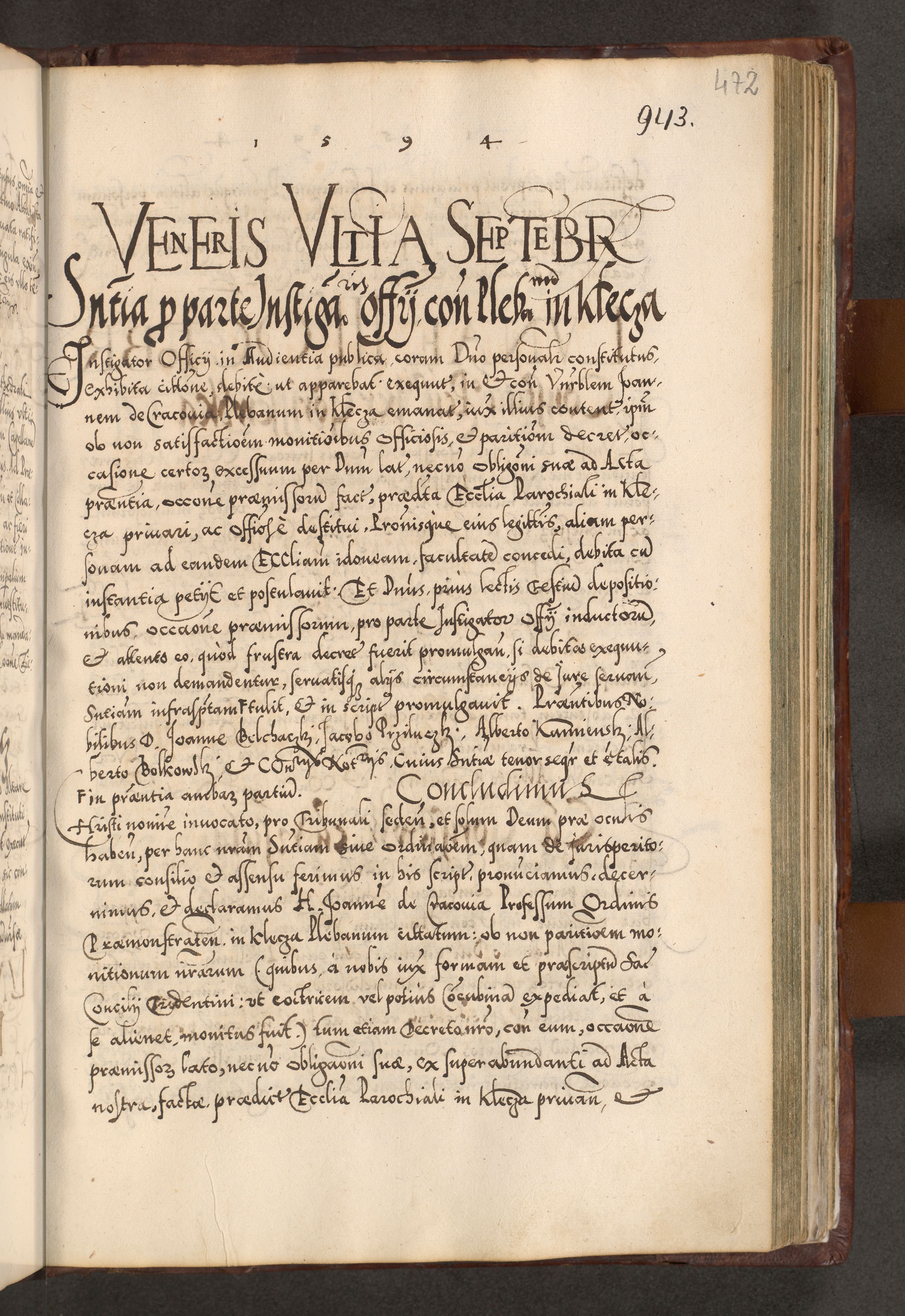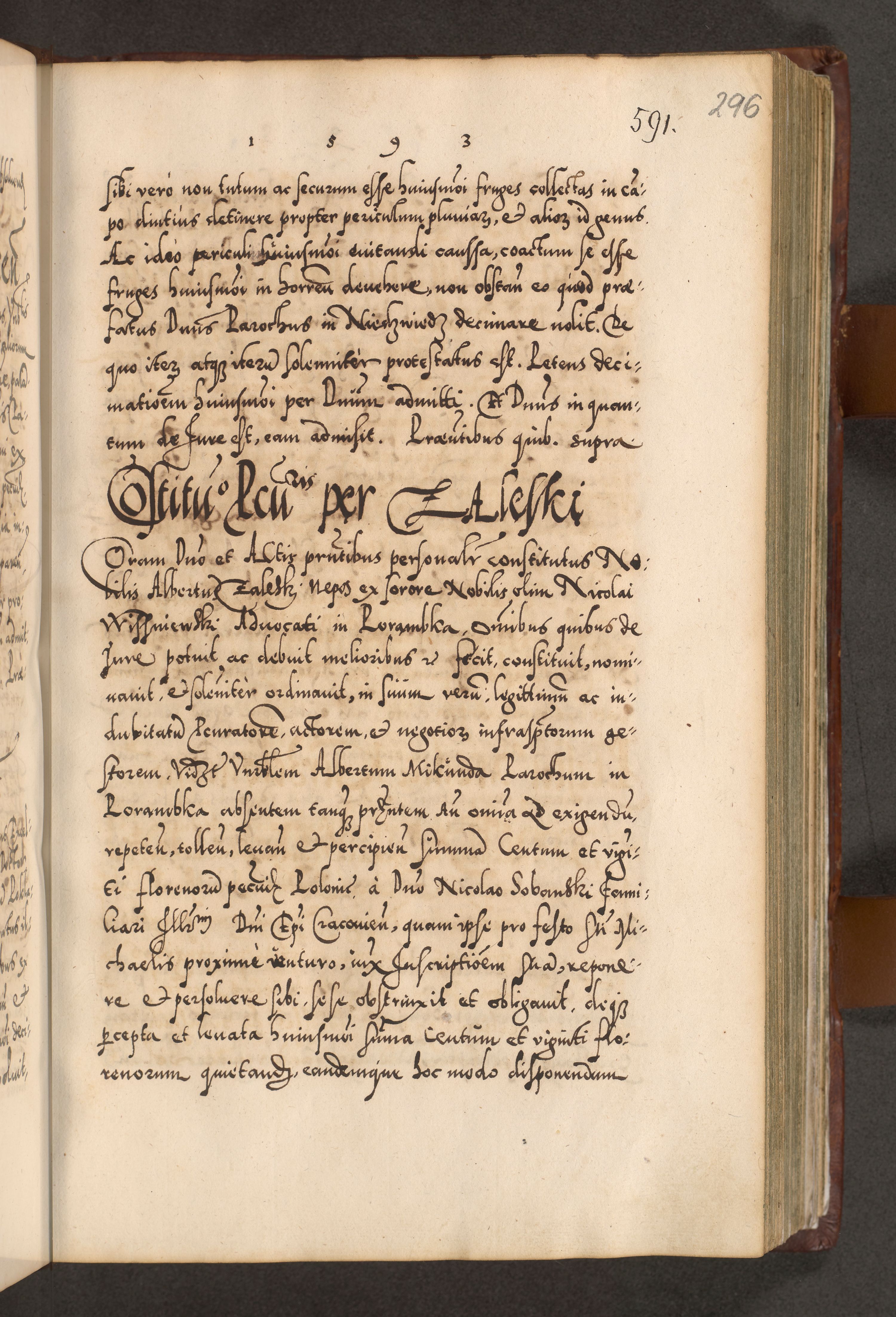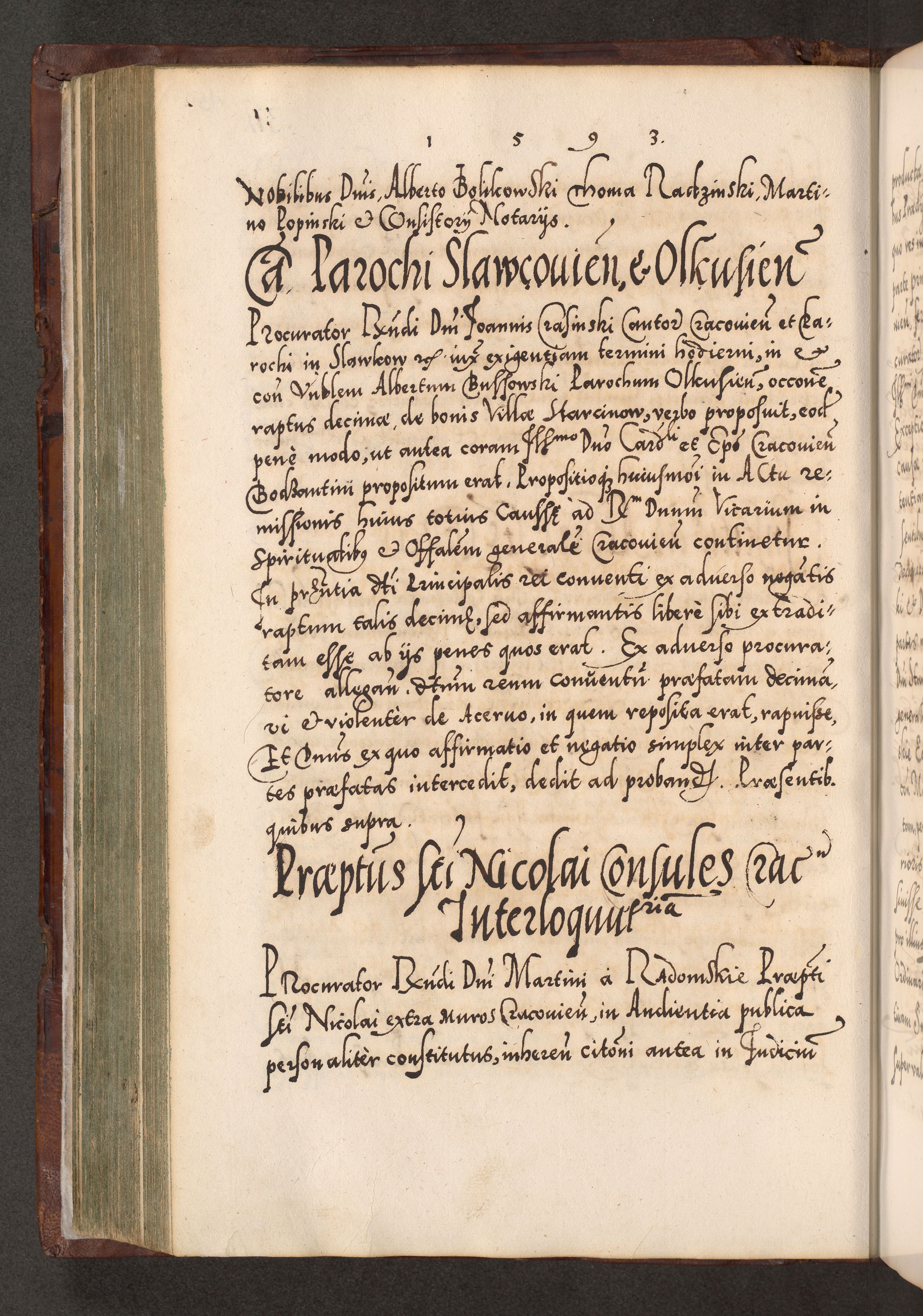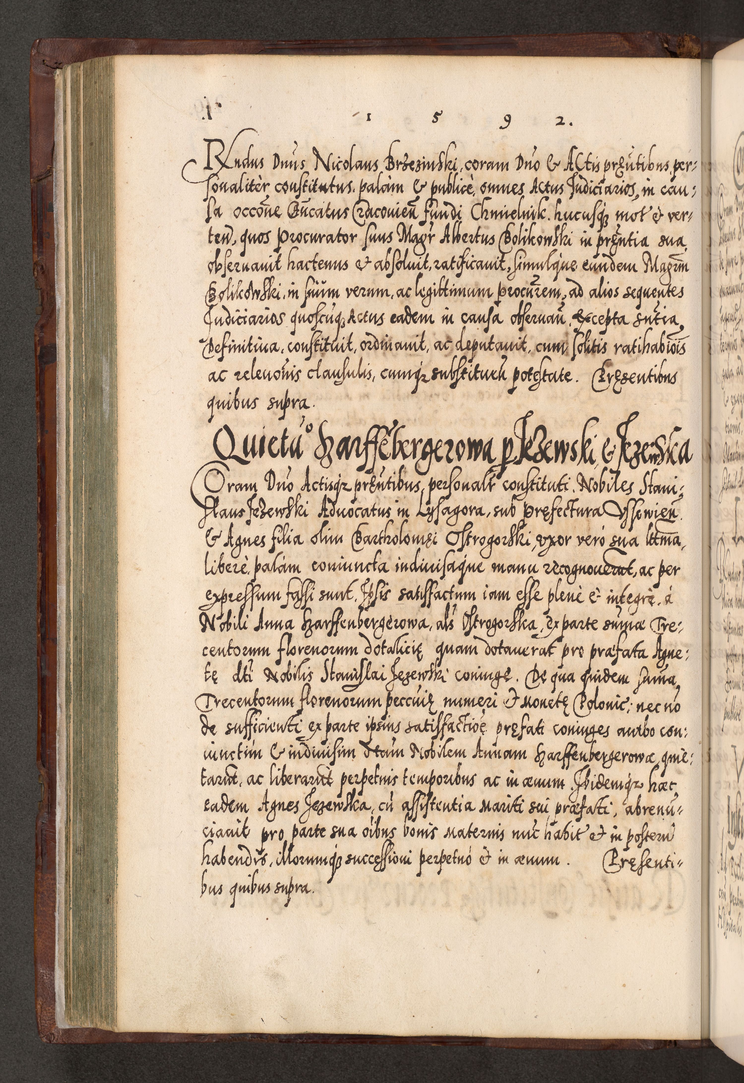 Illistrissimo et revedissimo in Christo Patre Domino Domino Georgio Rzadziwił Miserone Divina Sacrostae R. E. Tituli S. Sixti Presbitero Cardinali Duce in Olyka et Niesswiesz ad Gubernacula Ecclessiae Cracoviensis cuius administratorialem a Sancta Sede Apostolica obtinverat feliciter sedente. Acta actorum, causarum, sententiarum tam deffinitivarum quam interloquutoriarum decretorum, obligationum, quietationum, recognitionum, constitutionum procuratorum etc. coram Reverendo Domino Stanislao Crassinskz de Crasne Archidiacono Cracoviensis, Scholastico Gnesnesis, Custode Plocensis etc. Vicario et Officiali Generali Cracoviensi in Ano Domini Millesimo Quingentesimo Nonagesimo Primo cuius indictio quarta pontificatus SS. Domini Nostri Gregorii XIIII Anno I psius prio feliciter incipiut