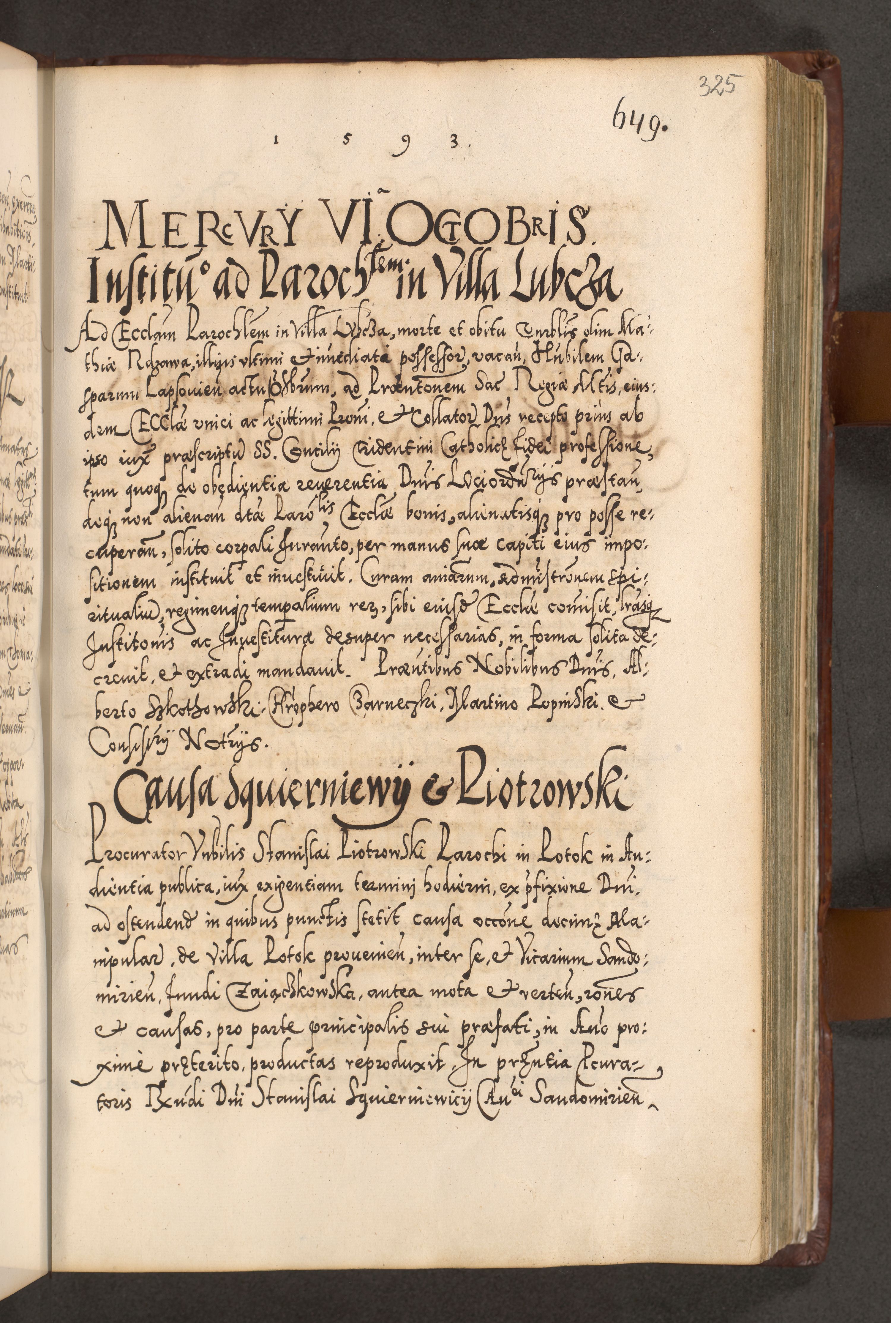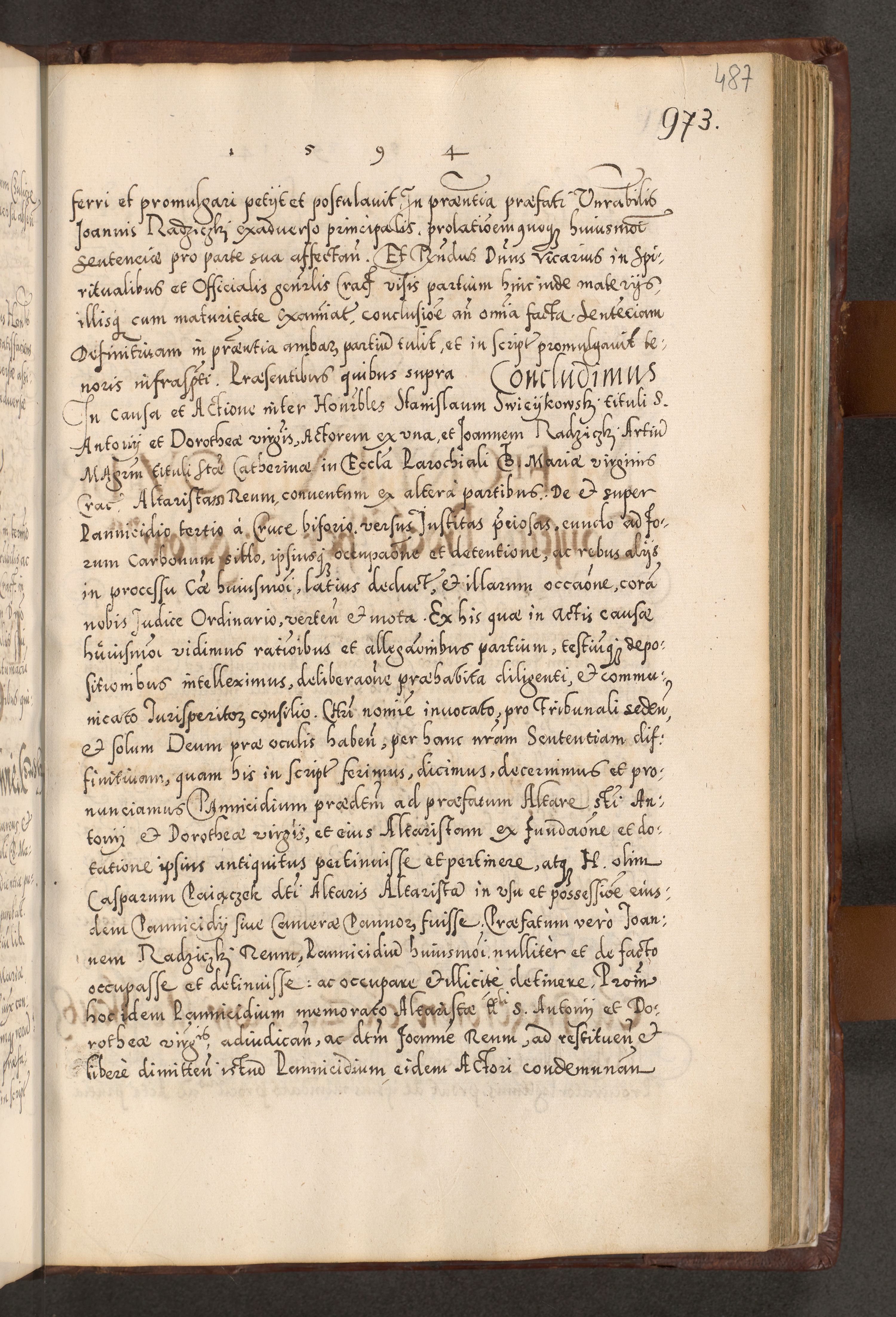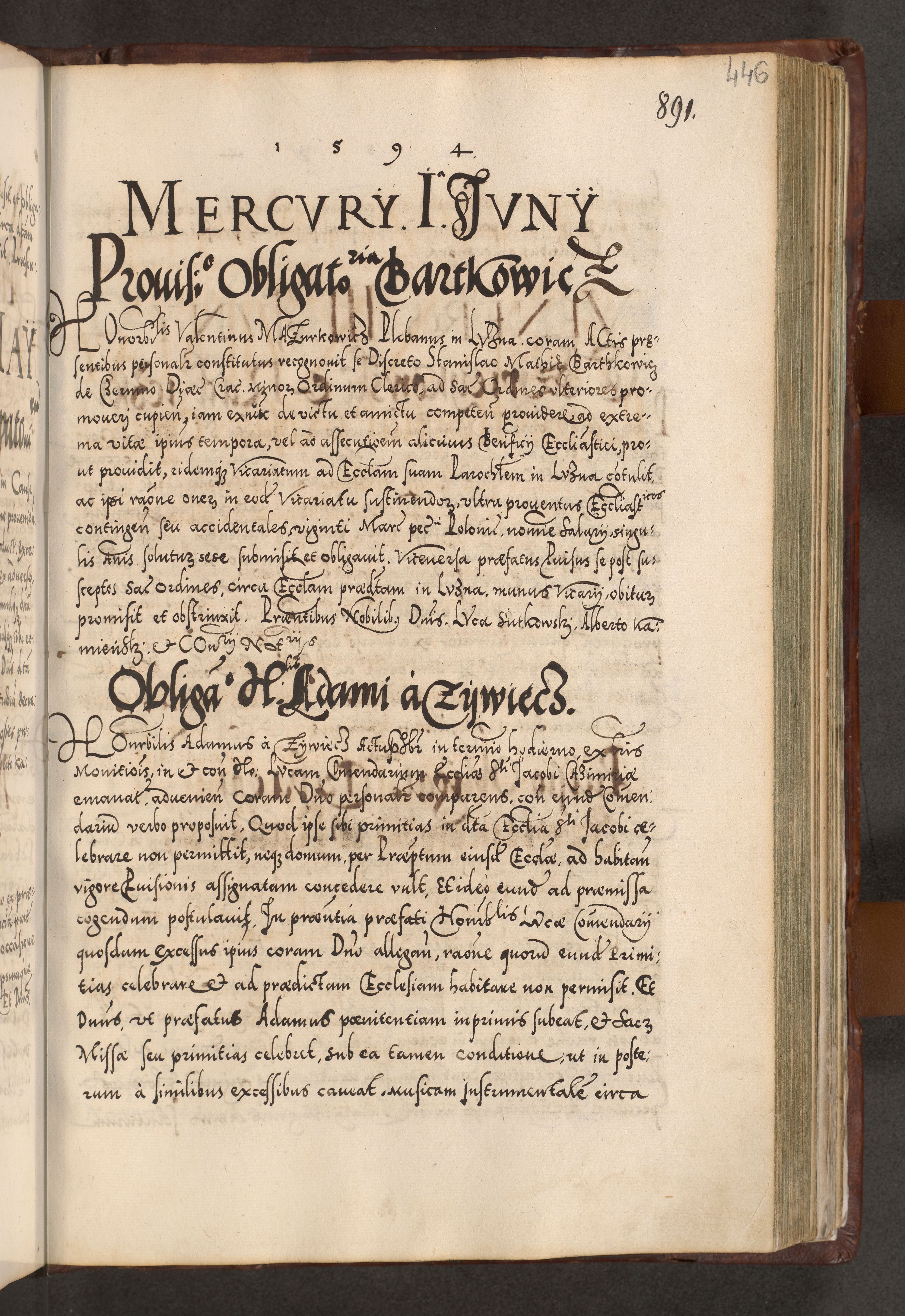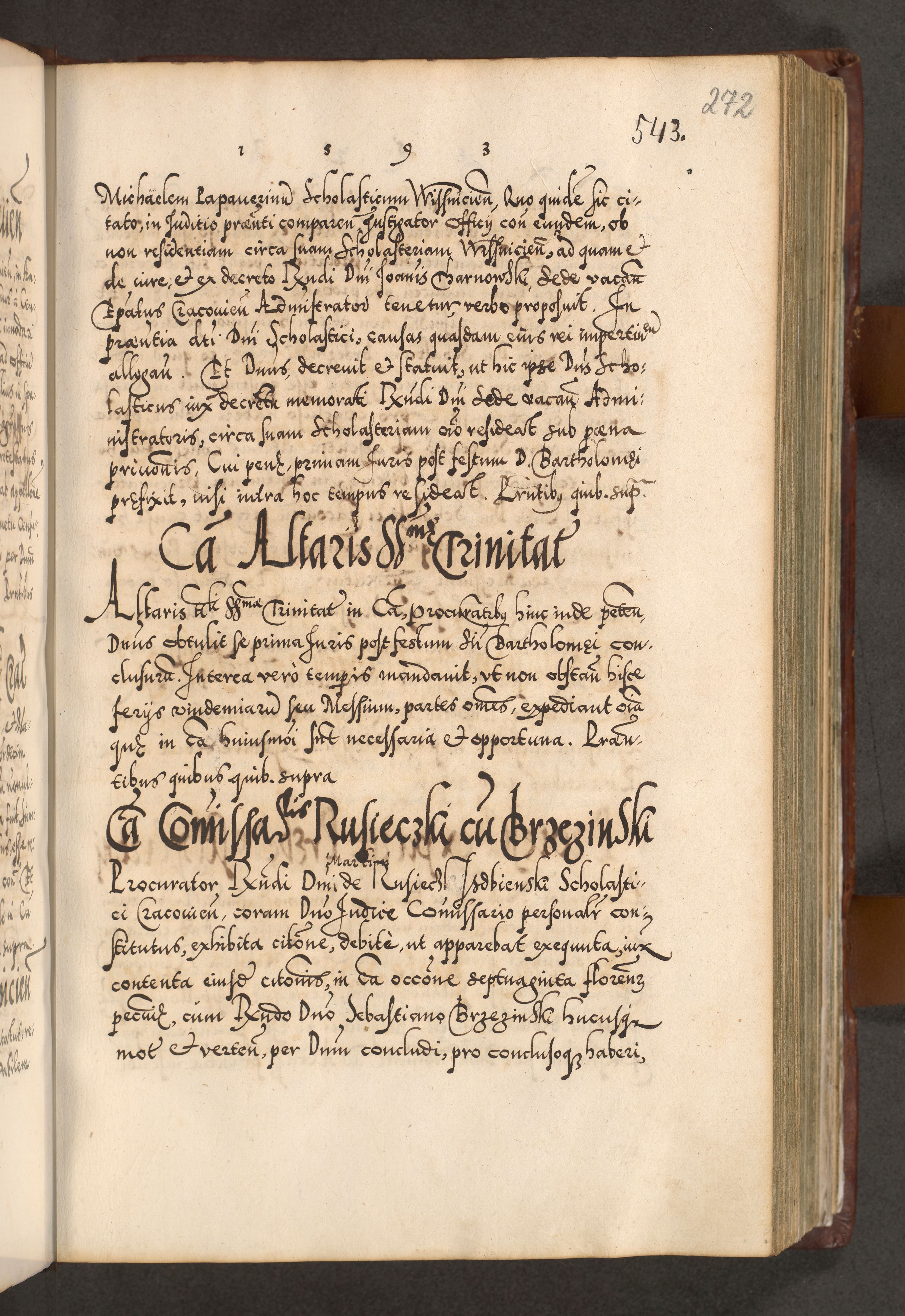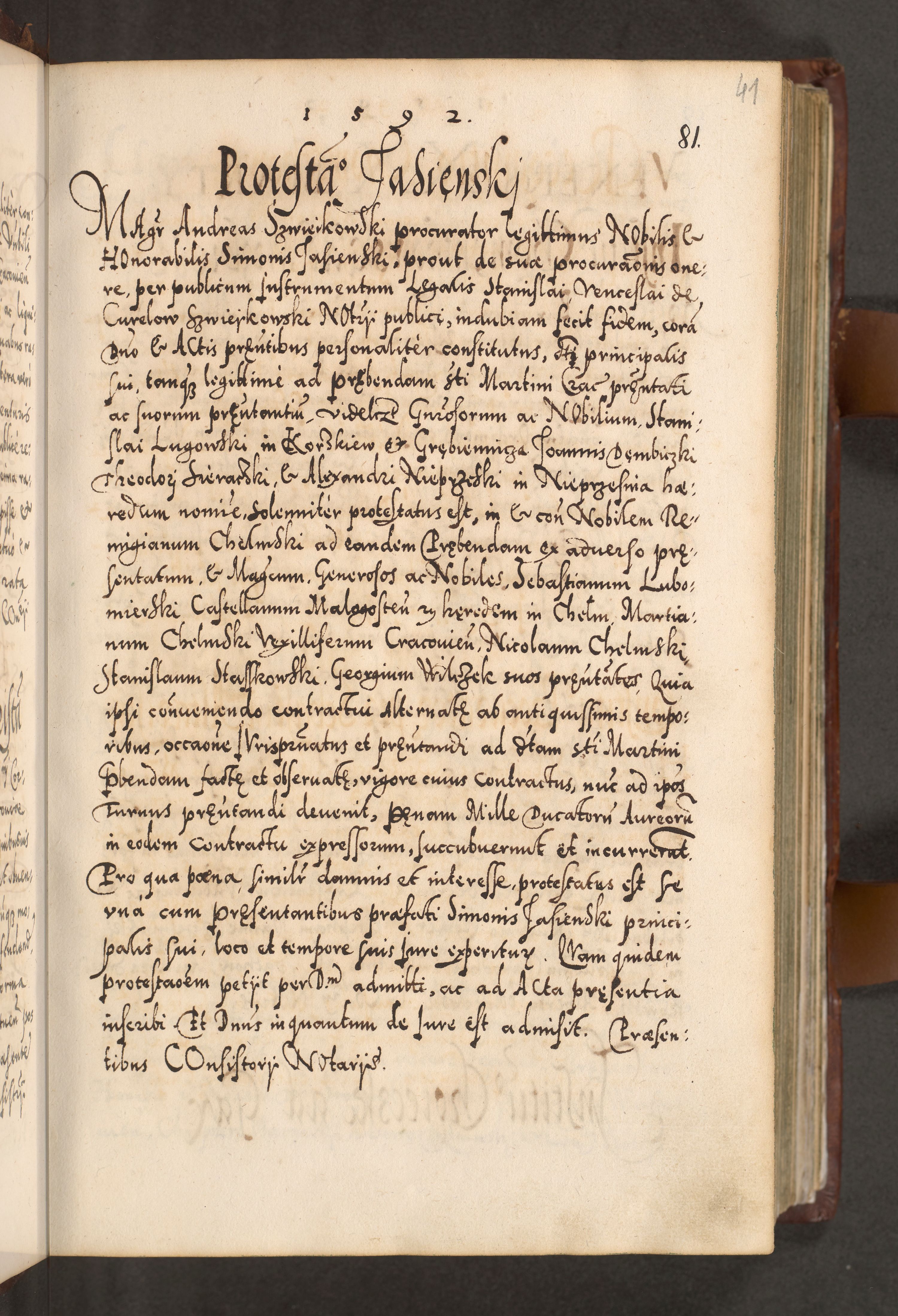 Illistrissimo et revedissimo in Christo Patre Domino Domino Georgio Rzadziwił Miserone Divina Sacrostae R. E. Tituli S. Sixti Presbitero Cardinali Duce in Olyka et Niesswiesz ad Gubernacula Ecclessiae Cracoviensis cuius administratorialem a Sancta Sede Apostolica obtinverat feliciter sedente. Acta actorum, causarum, sententiarum tam deffinitivarum quam interloquutoriarum decretorum, obligationum, quietationum, recognitionum, constitutionum procuratorum etc. coram Reverendo Domino Stanislao Crassinskz de Crasne Archidiacono Cracoviensis, Scholastico Gnesnesis, Custode Plocensis etc. Vicario et Officiali Generali Cracoviensi in Ano Domini Millesimo Quingentesimo Nonagesimo Primo cuius indictio quarta pontificatus SS. Domini Nostri Gregorii XIIII Anno I psius prio feliciter incipiut