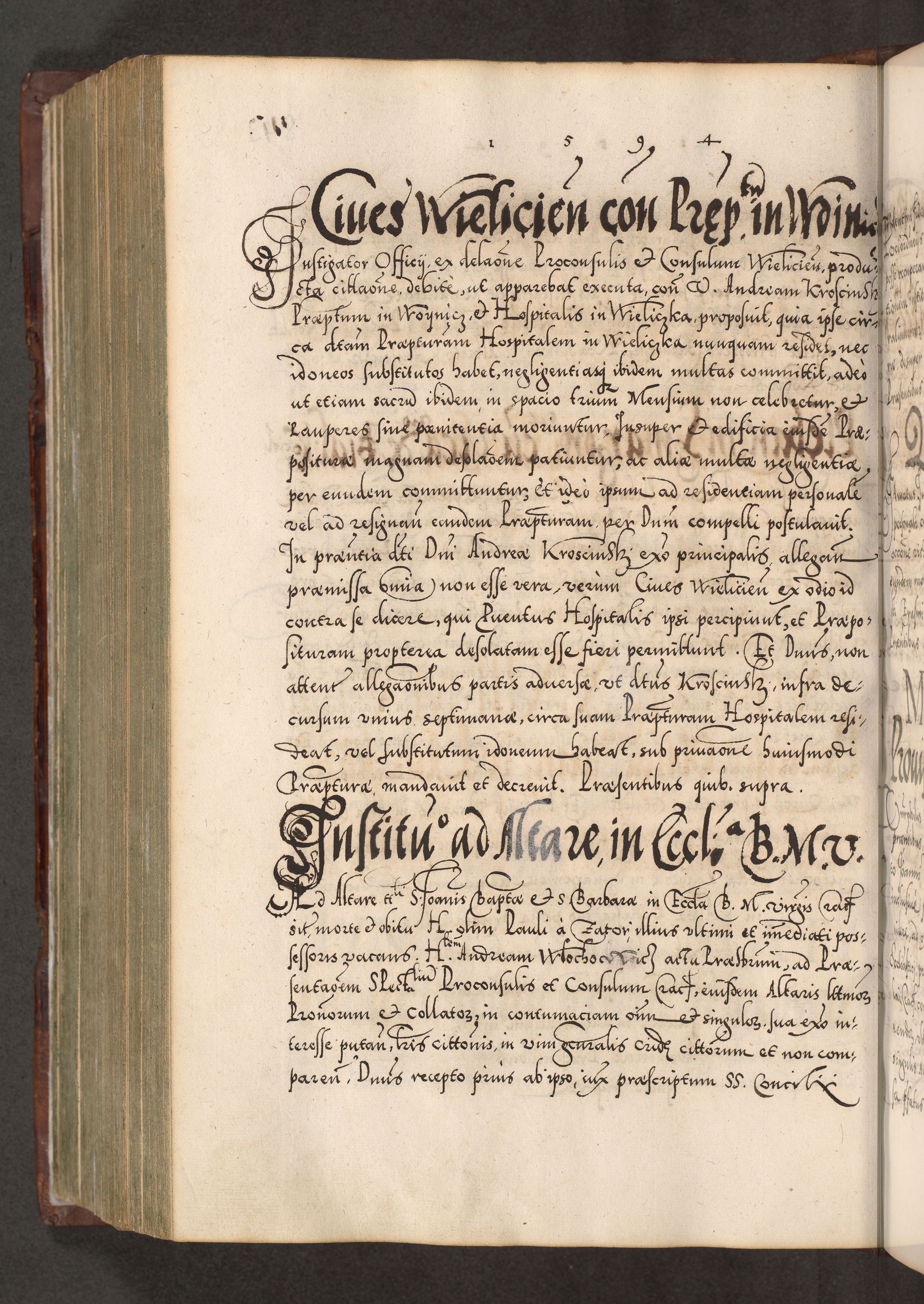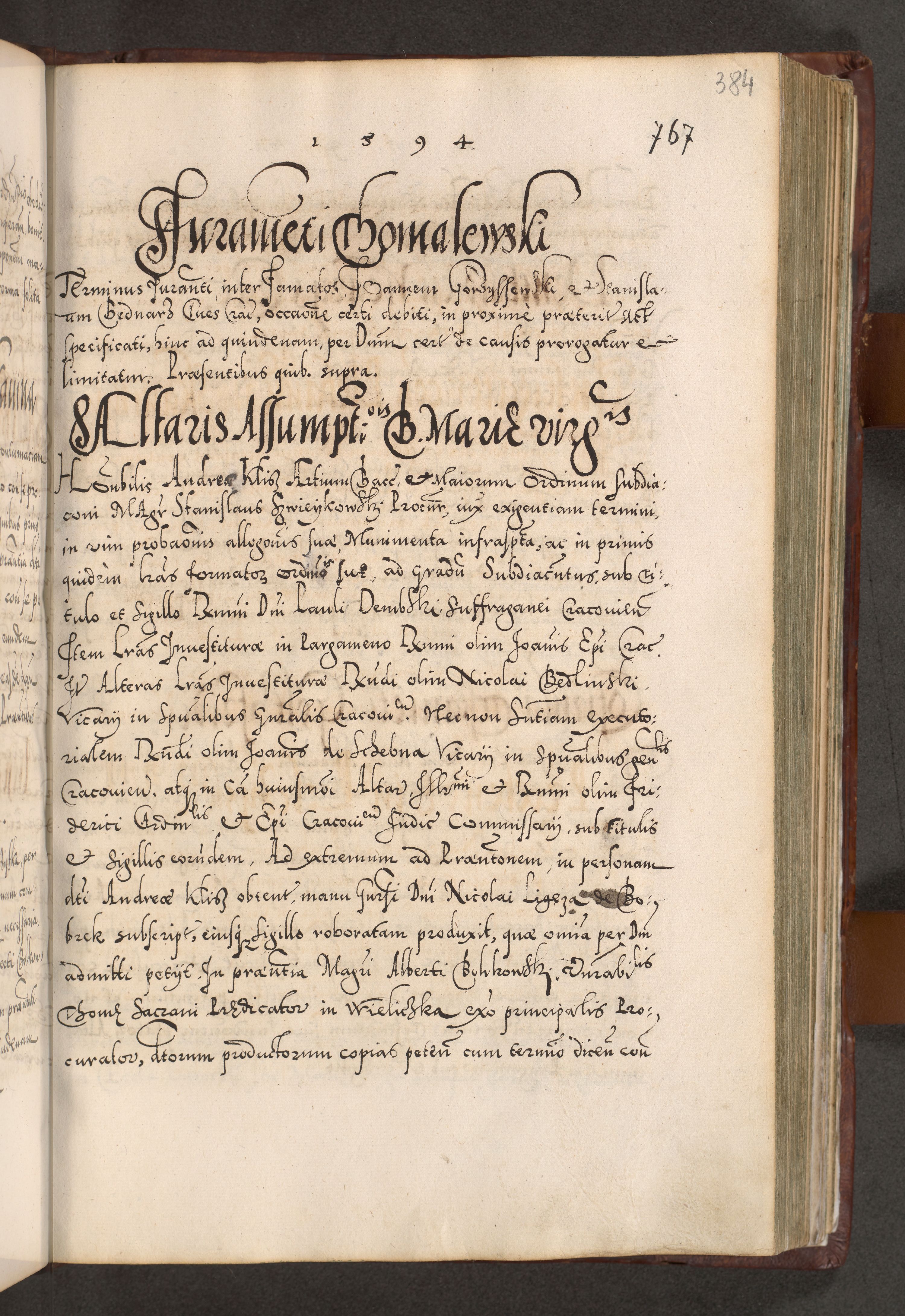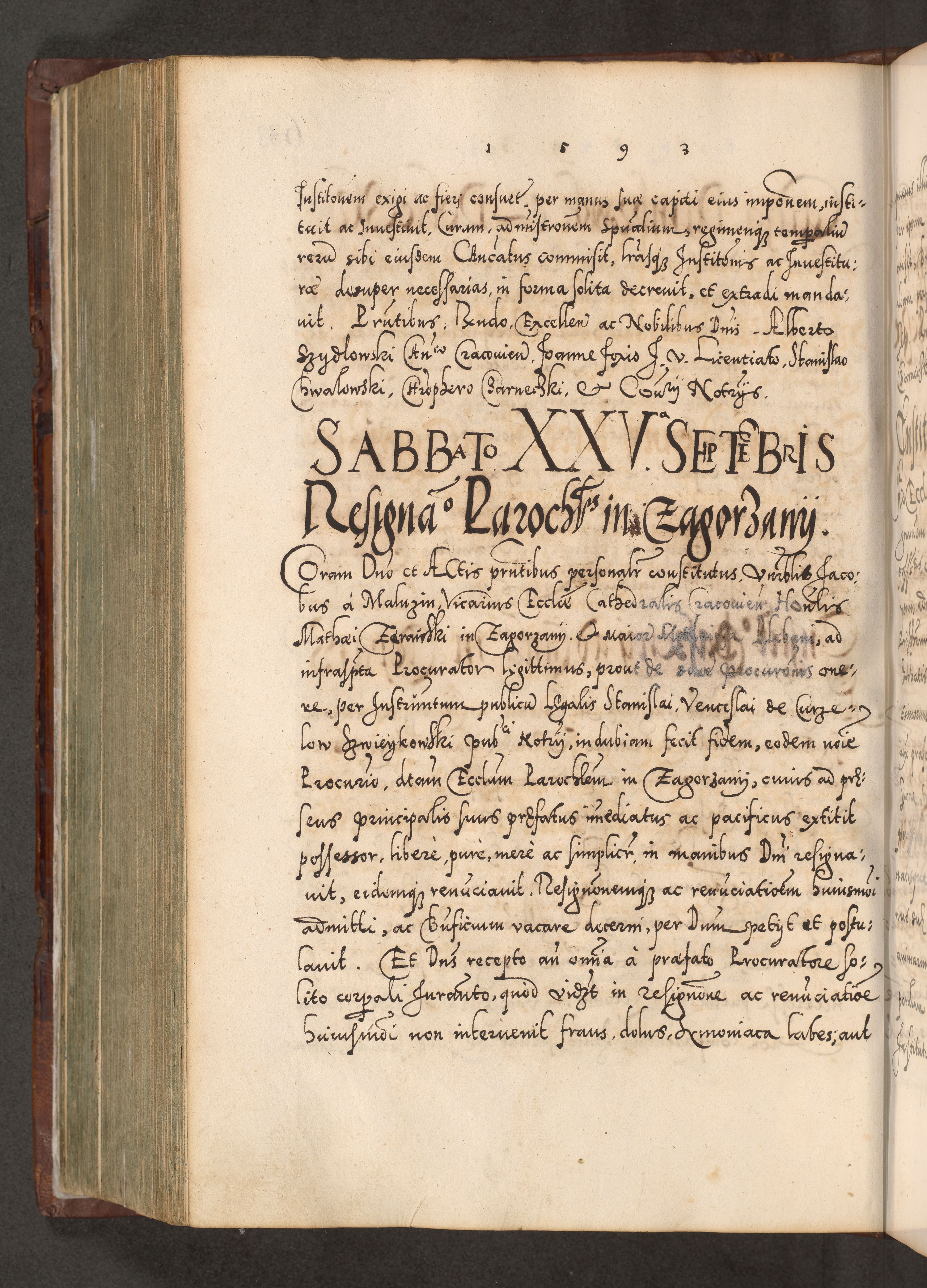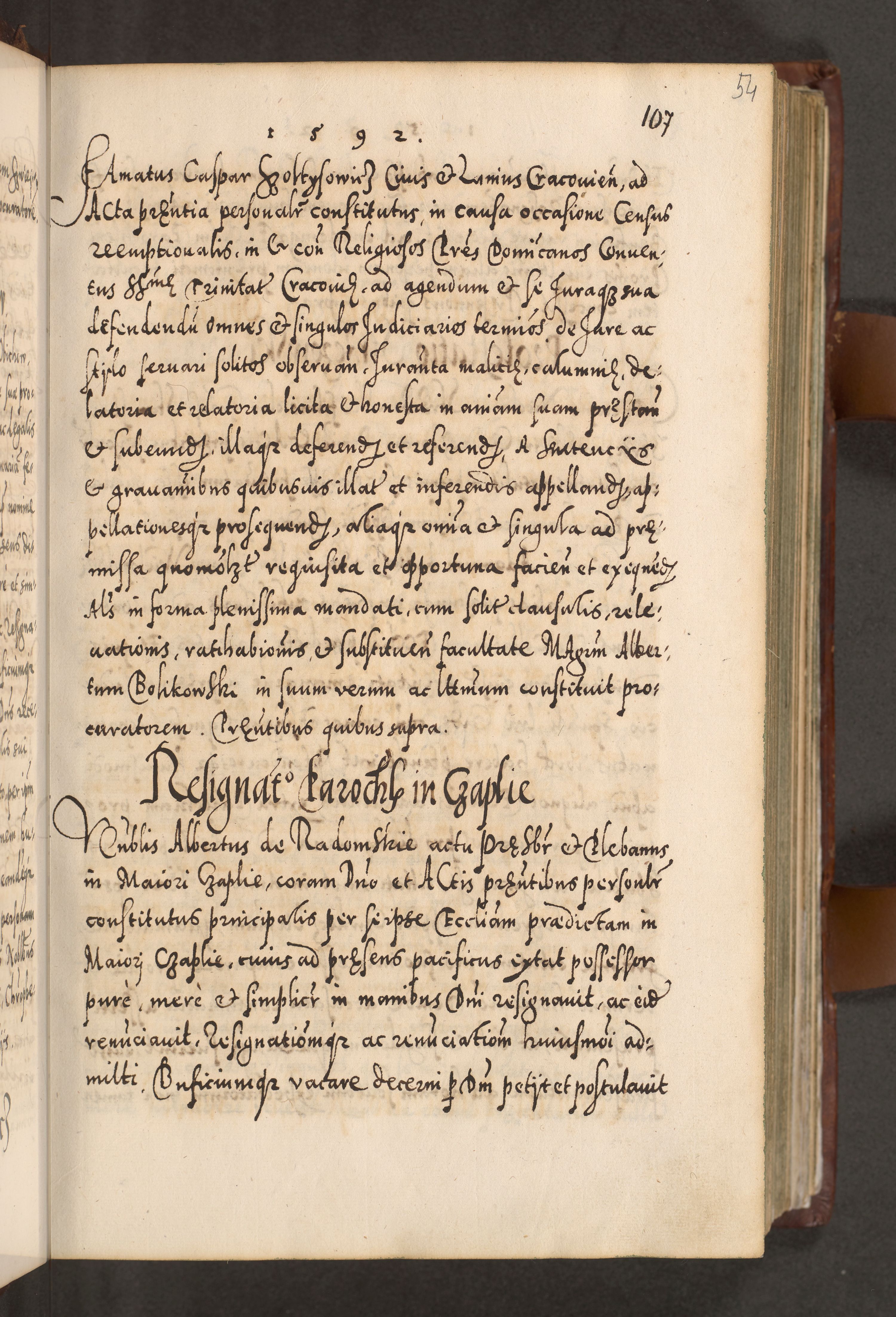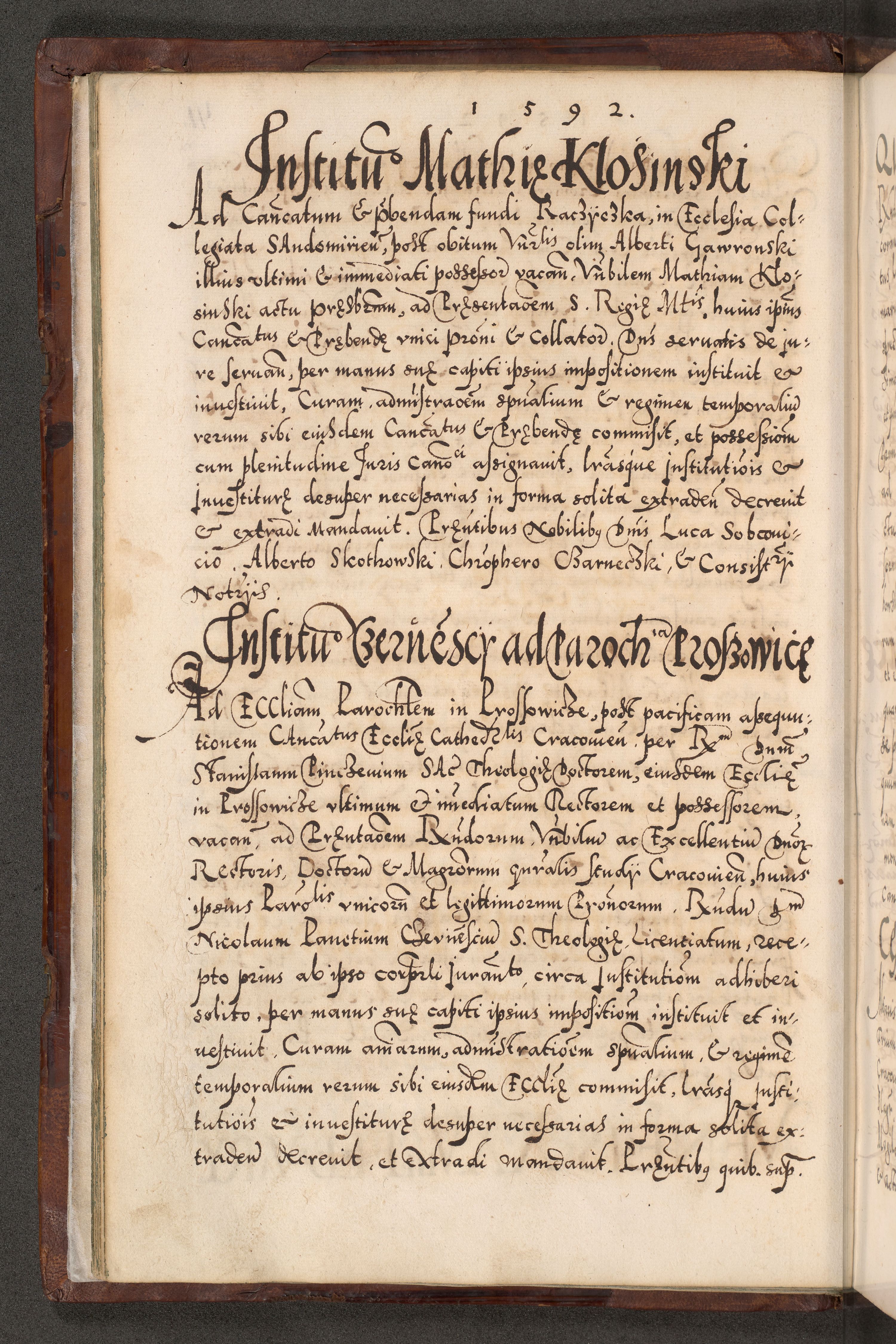 Illistrissimo et revedissimo in Christo Patre Domino Domino Georgio Rzadziwił Miserone Divina Sacrostae R. E. Tituli S. Sixti Presbitero Cardinali Duce in Olyka et Niesswiesz ad Gubernacula Ecclessiae Cracoviensis cuius administratorialem a Sancta Sede Apostolica obtinverat feliciter sedente. Acta actorum, causarum, sententiarum tam deffinitivarum quam interloquutoriarum decretorum, obligationum, quietationum, recognitionum, constitutionum procuratorum etc. coram Reverendo Domino Stanislao Crassinskz de Crasne Archidiacono Cracoviensis, Scholastico Gnesnesis, Custode Plocensis etc. Vicario et Officiali Generali Cracoviensi in Ano Domini Millesimo Quingentesimo Nonagesimo Primo cuius indictio quarta pontificatus SS. Domini Nostri Gregorii XIIII Anno I psius prio feliciter incipiut
