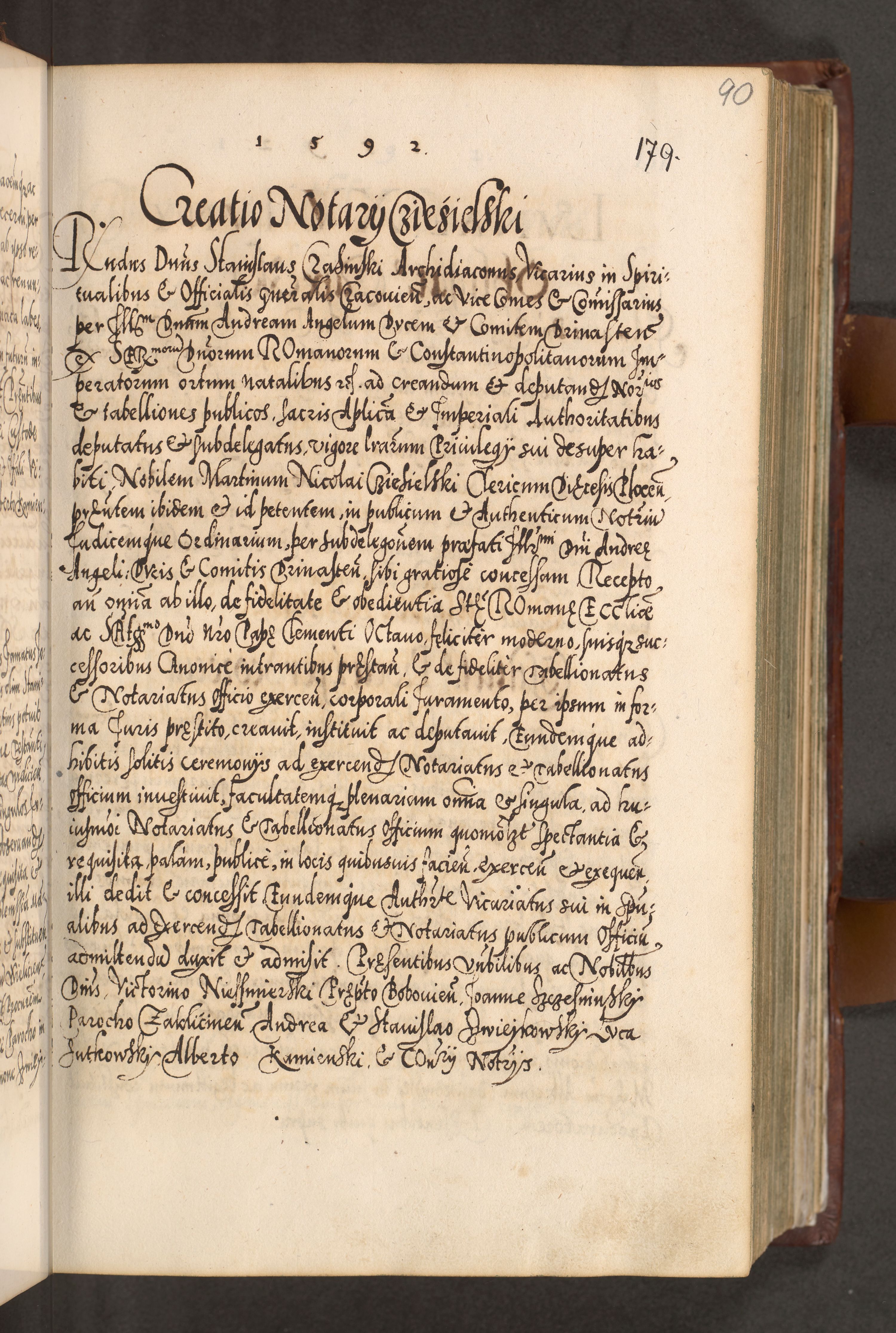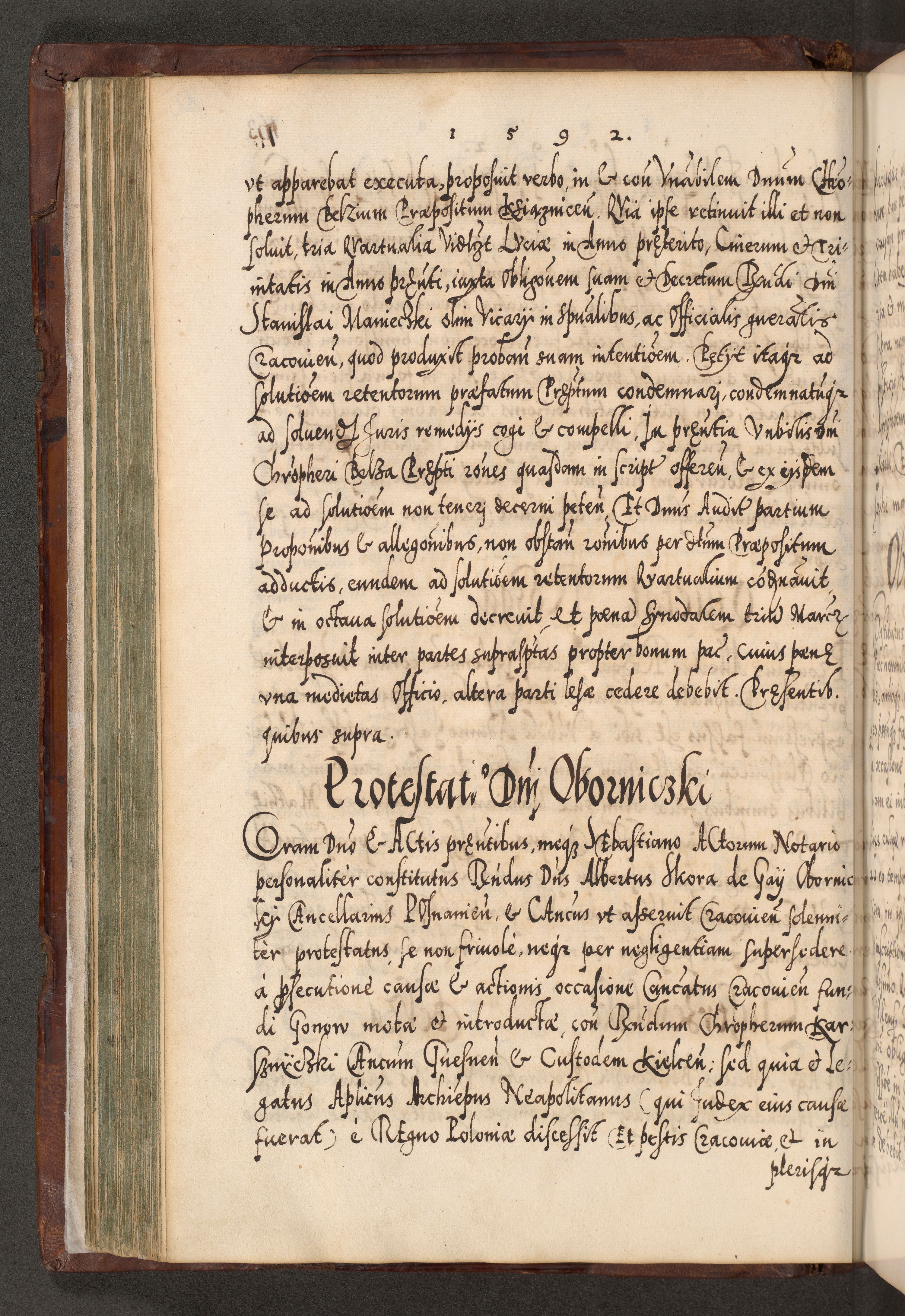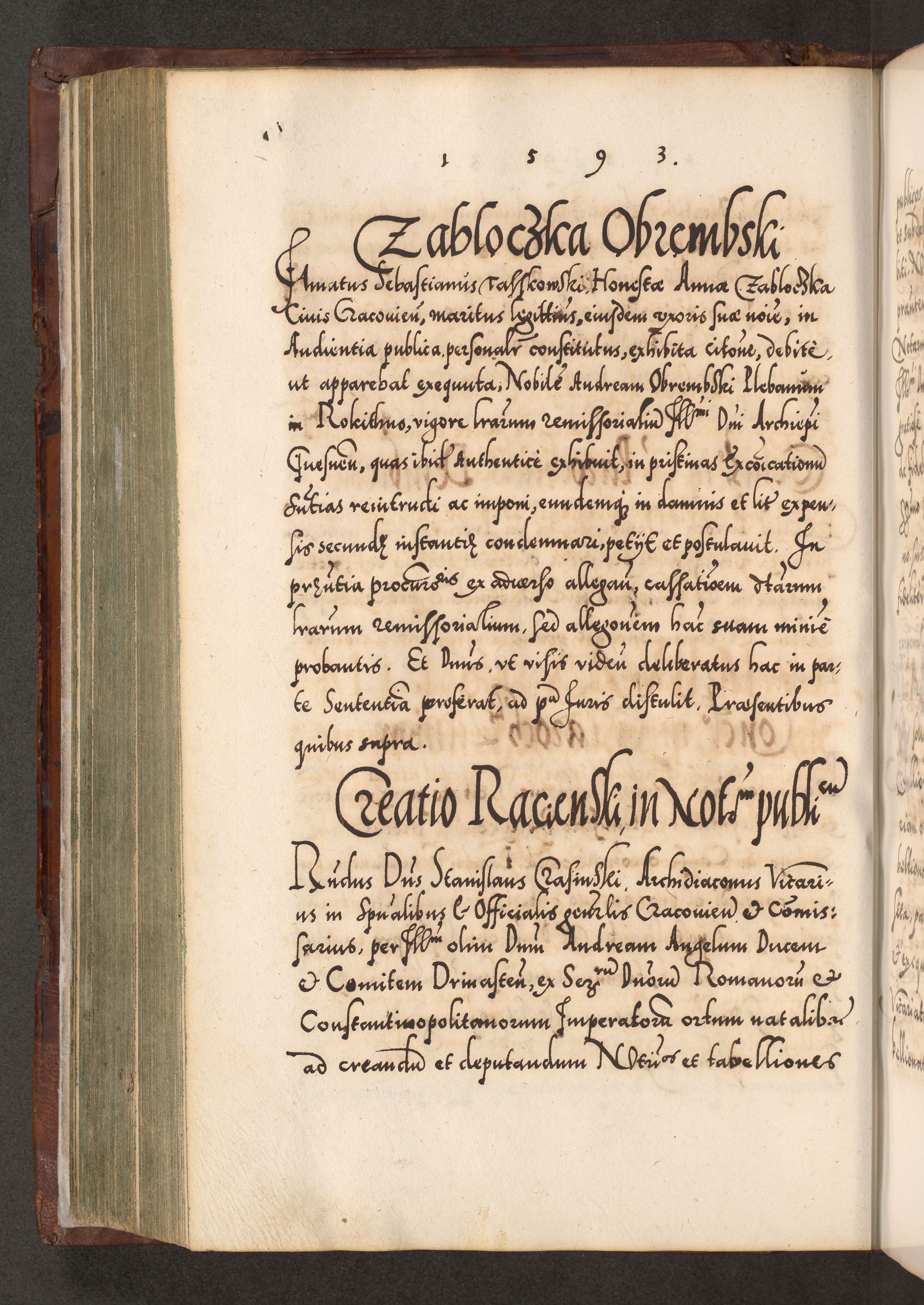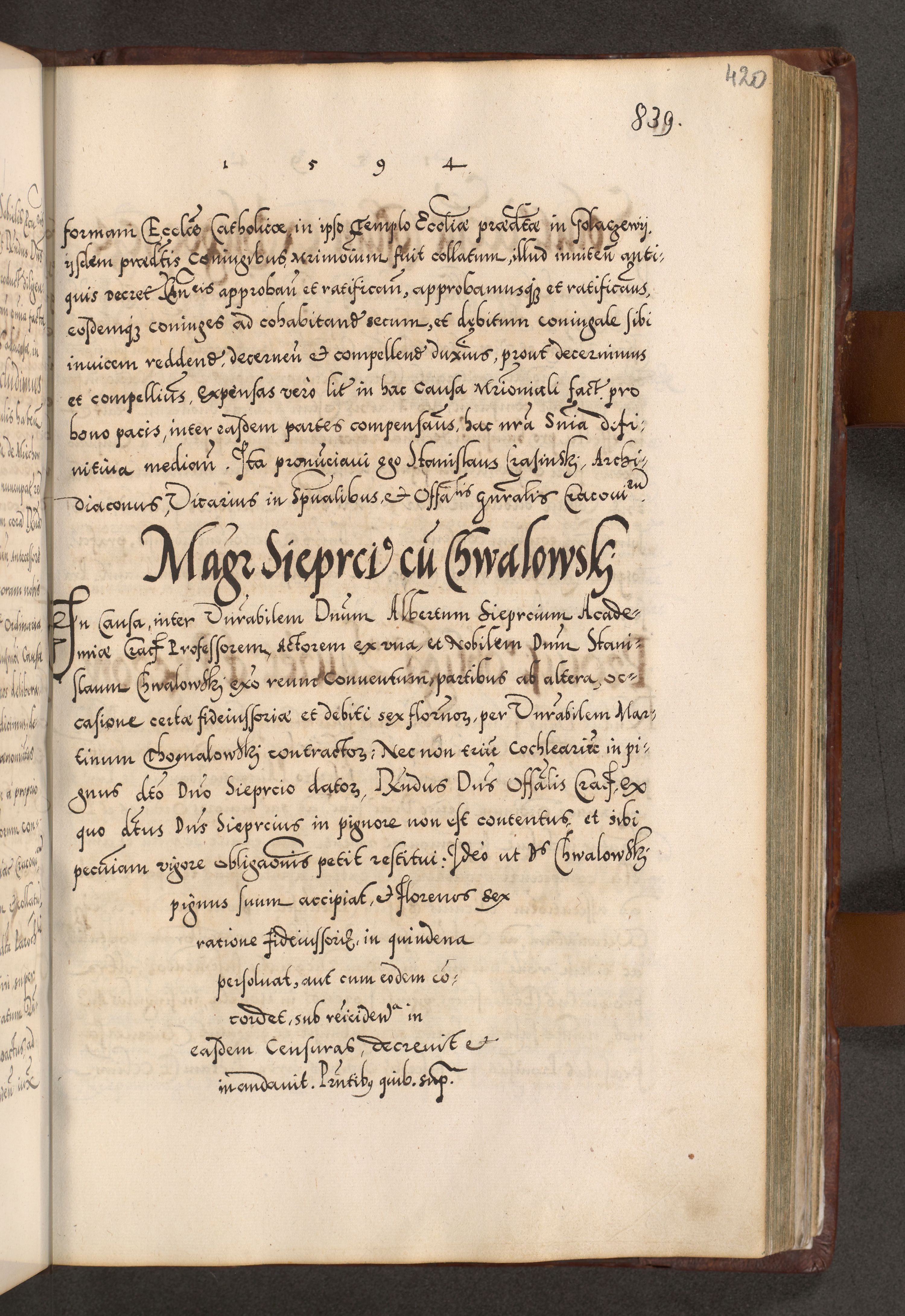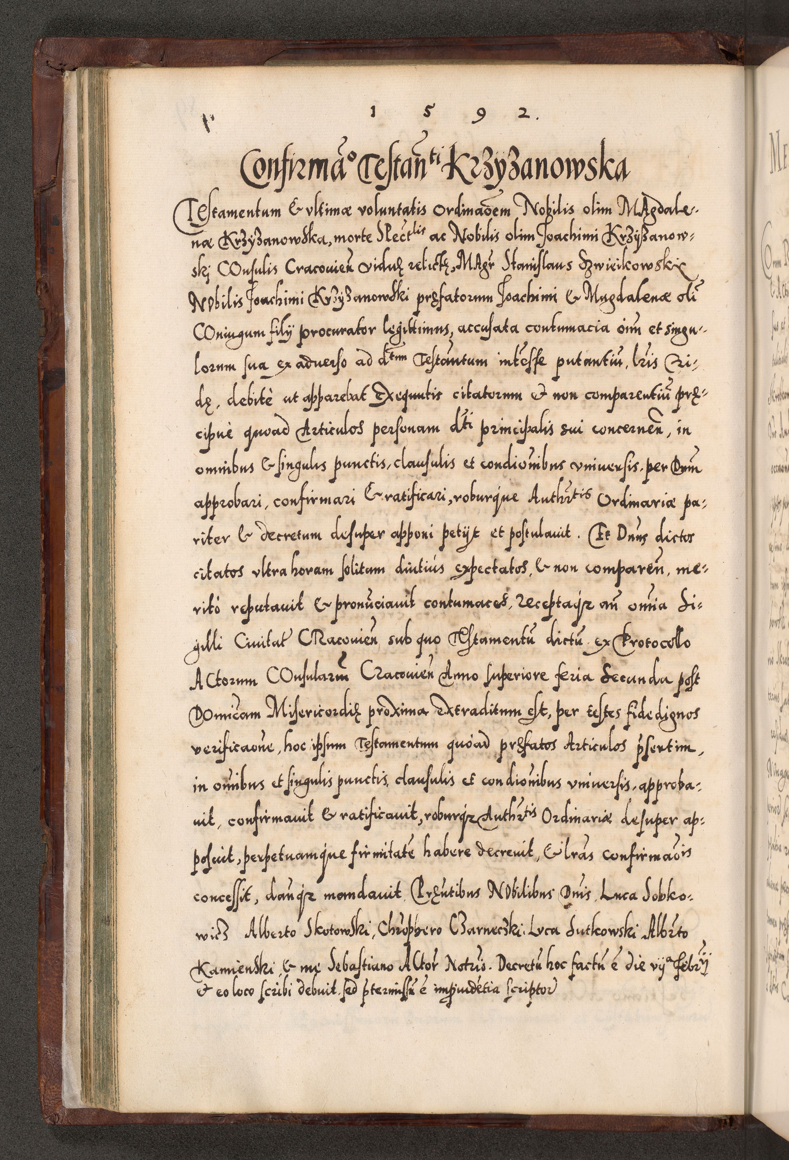 Illistrissimo et revedissimo in Christo Patre Domino Domino Georgio Rzadziwił Miserone Divina Sacrostae R. E. Tituli S. Sixti Presbitero Cardinali Duce in Olyka et Niesswiesz ad Gubernacula Ecclessiae Cracoviensis cuius administratorialem a Sancta Sede Apostolica obtinverat feliciter sedente. Acta actorum, causarum, sententiarum tam deffinitivarum quam interloquutoriarum decretorum, obligationum, quietationum, recognitionum, constitutionum procuratorum etc. coram Reverendo Domino Stanislao Crassinskz de Crasne Archidiacono Cracoviensis, Scholastico Gnesnesis, Custode Plocensis etc. Vicario et Officiali Generali Cracoviensi in Ano Domini Millesimo Quingentesimo Nonagesimo Primo cuius indictio quarta pontificatus SS. Domini Nostri Gregorii XIIII Anno I psius prio feliciter incipiut