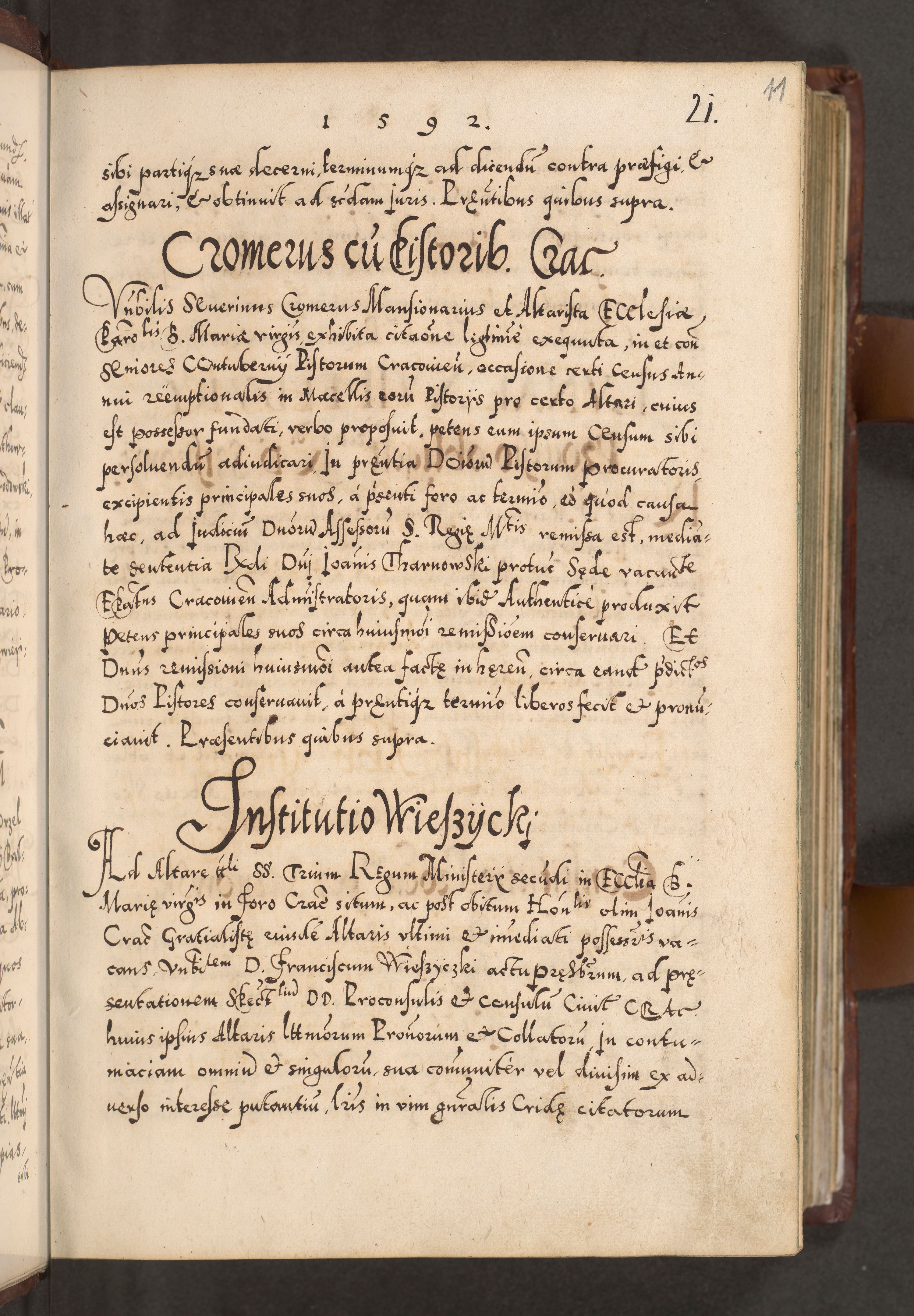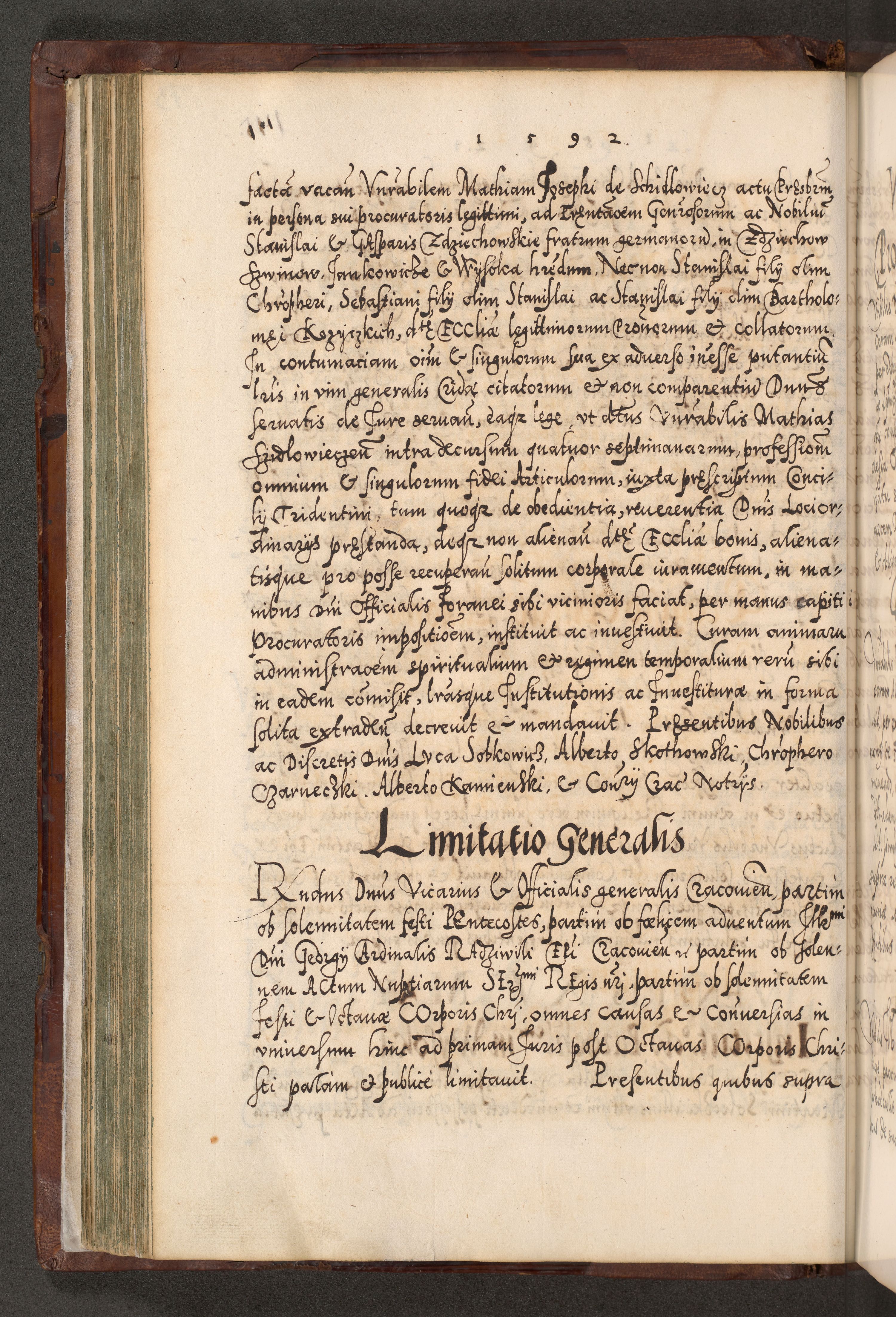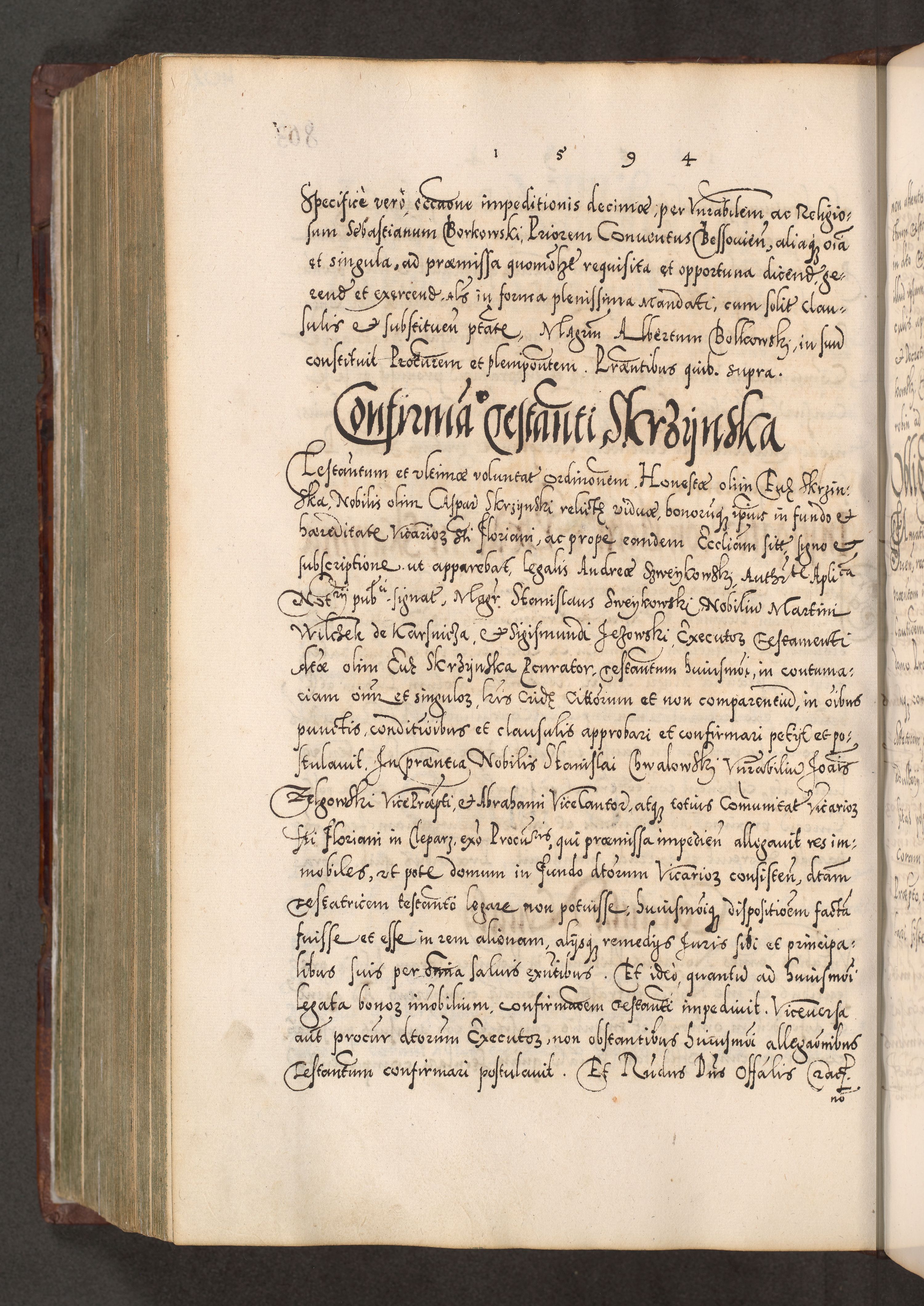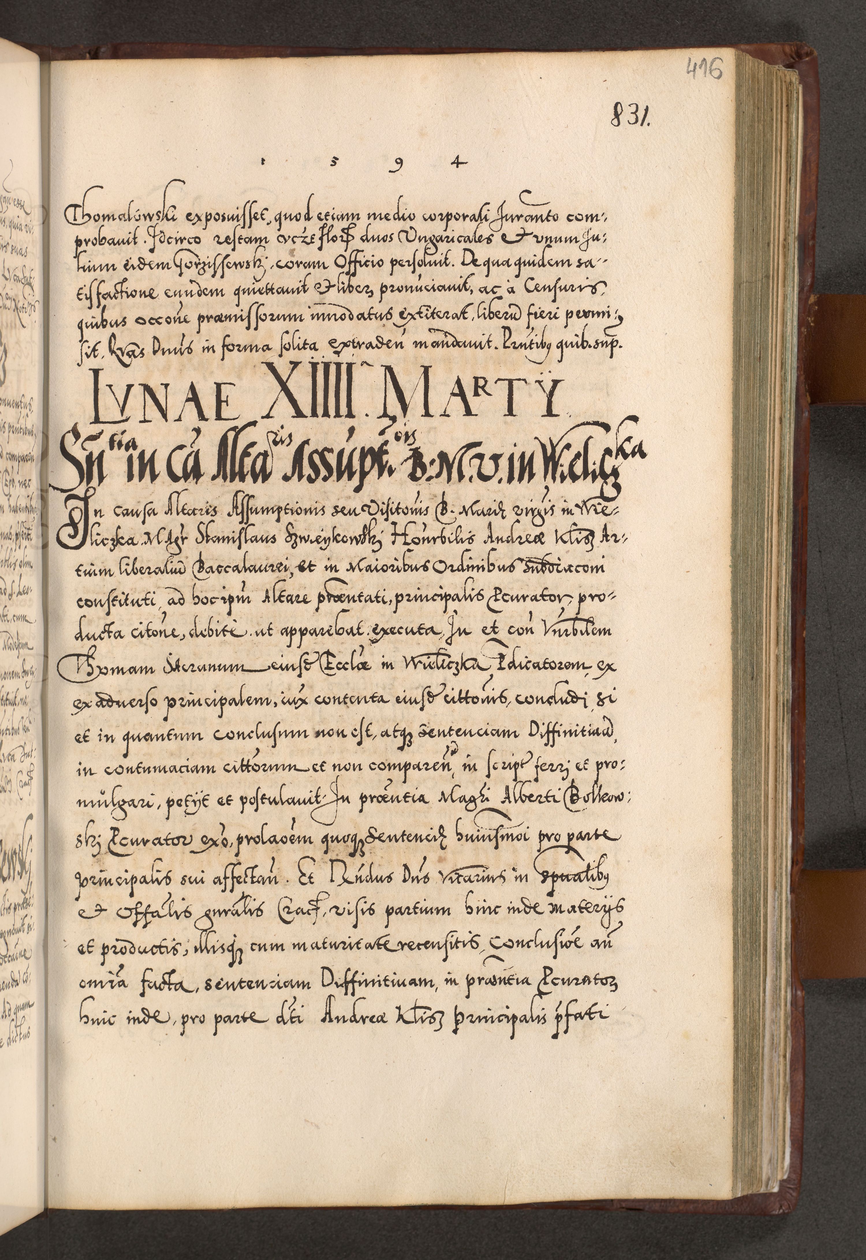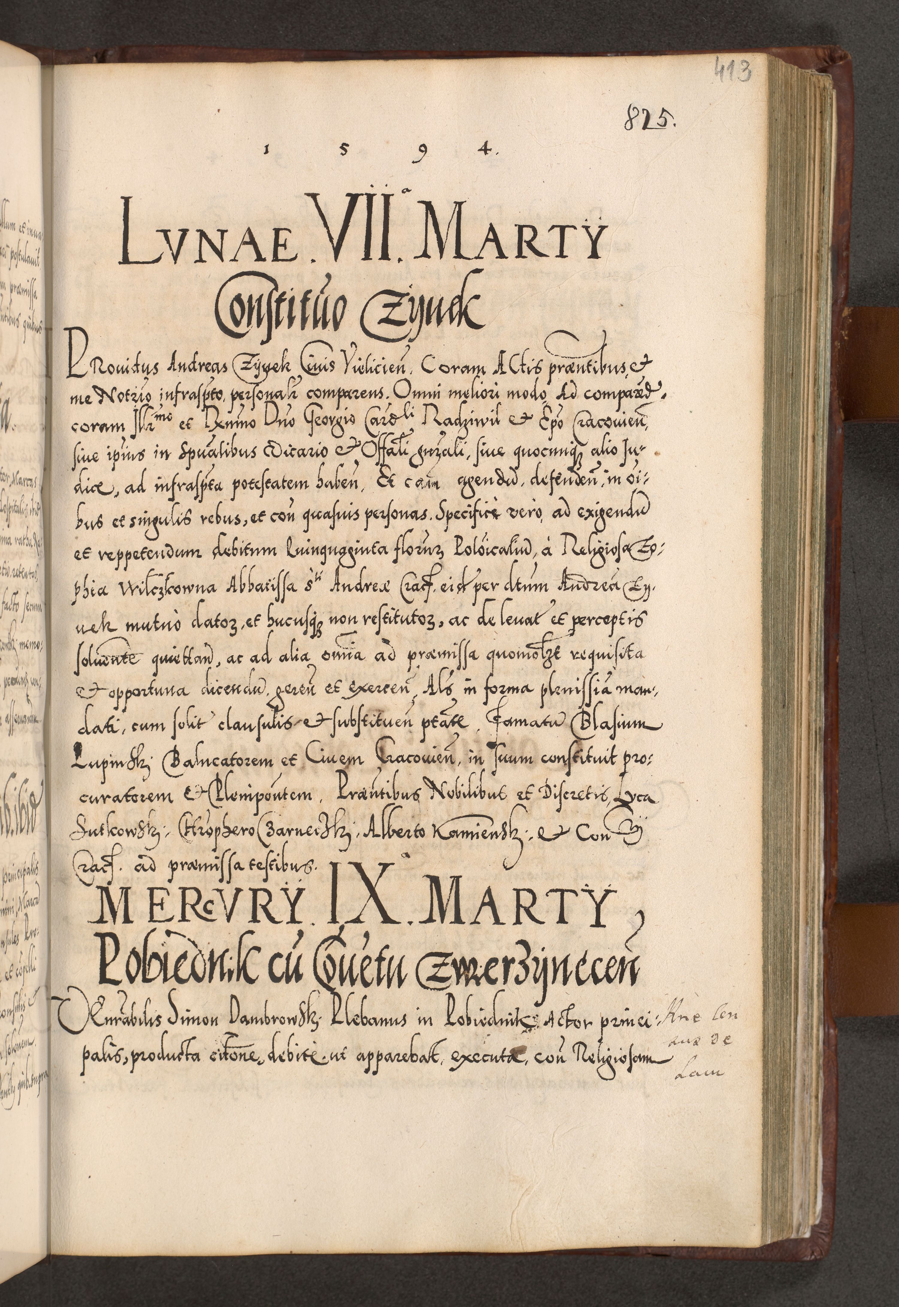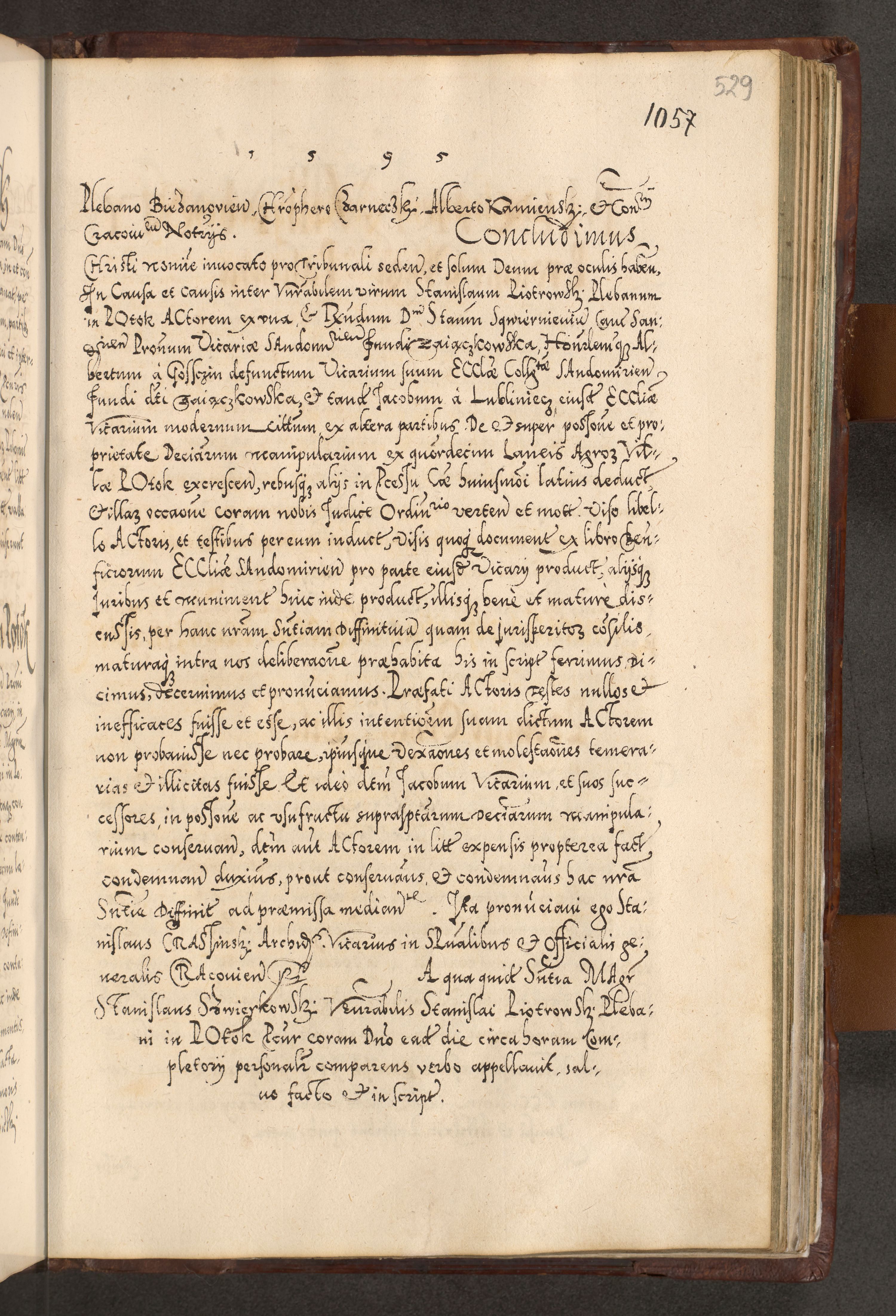 Illistrissimo et revedissimo in Christo Patre Domino Domino Georgio Rzadziwił Miserone Divina Sacrostae R. E. Tituli S. Sixti Presbitero Cardinali Duce in Olyka et Niesswiesz ad Gubernacula Ecclessiae Cracoviensis cuius administratorialem a Sancta Sede Apostolica obtinverat feliciter sedente. Acta actorum, causarum, sententiarum tam deffinitivarum quam interloquutoriarum decretorum, obligationum, quietationum, recognitionum, constitutionum procuratorum etc. coram Reverendo Domino Stanislao Crassinskz de Crasne Archidiacono Cracoviensis, Scholastico Gnesnesis, Custode Plocensis etc. Vicario et Officiali Generali Cracoviensi in Ano Domini Millesimo Quingentesimo Nonagesimo Primo cuius indictio quarta pontificatus SS. Domini Nostri Gregorii XIIII Anno I psius prio feliciter incipiut