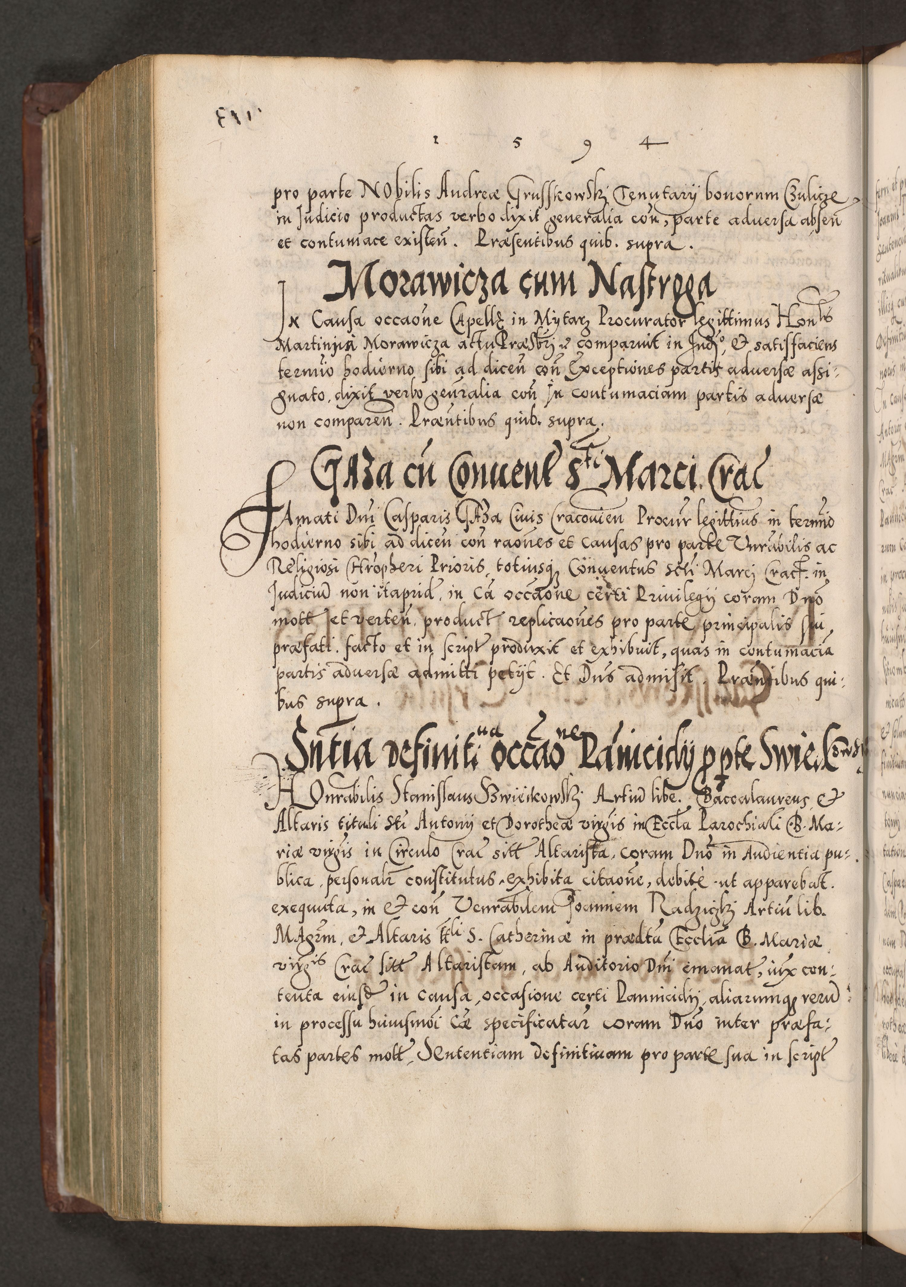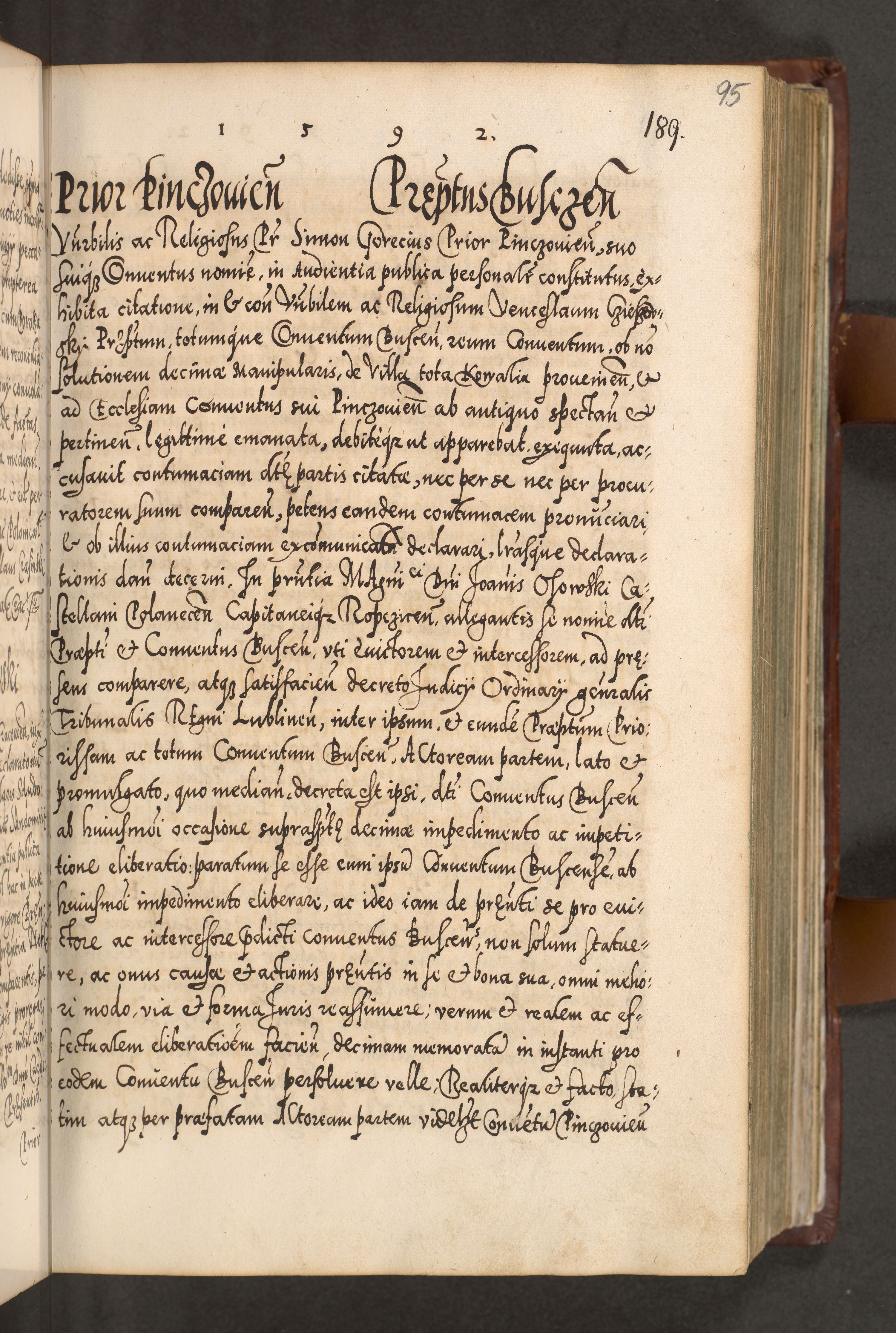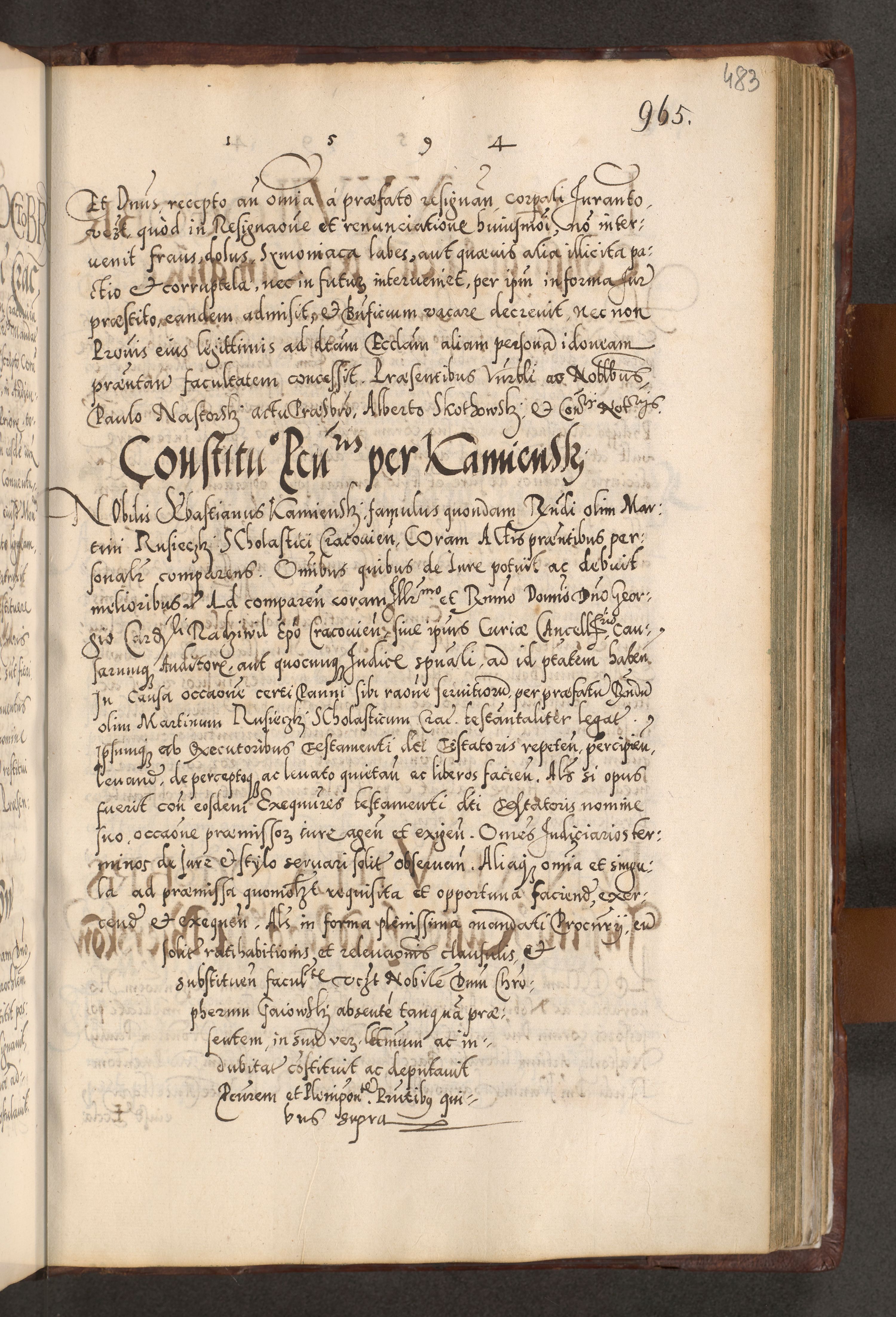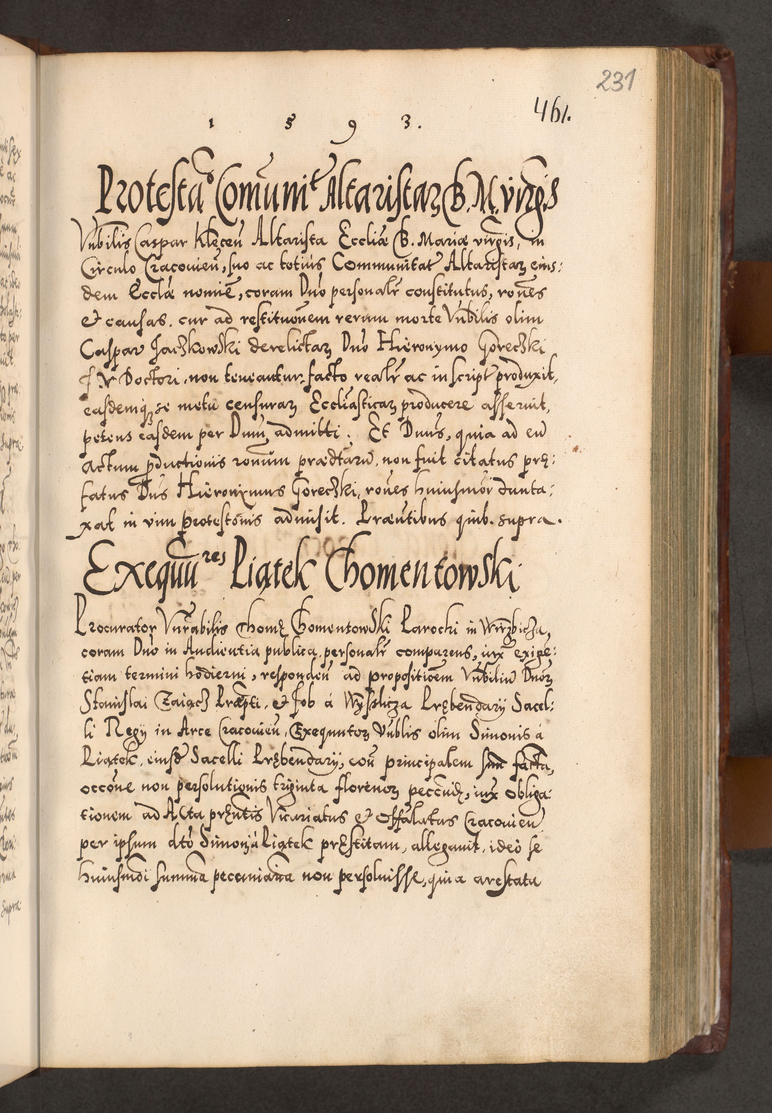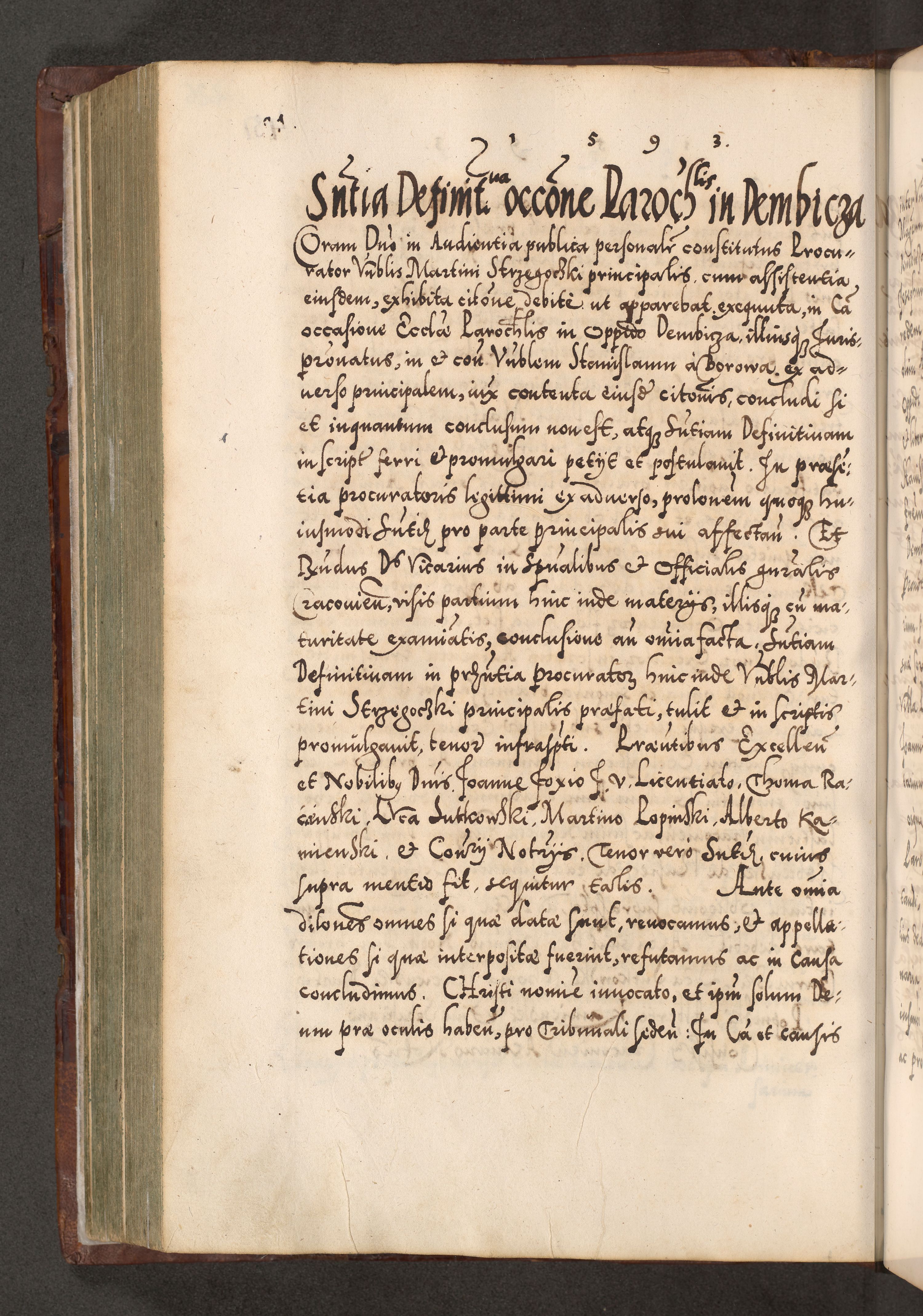 Illistrissimo et revedissimo in Christo Patre Domino Domino Georgio Rzadziwił Miserone Divina Sacrostae R. E. Tituli S. Sixti Presbitero Cardinali Duce in Olyka et Niesswiesz ad Gubernacula Ecclessiae Cracoviensis cuius administratorialem a Sancta Sede Apostolica obtinverat feliciter sedente. Acta actorum, causarum, sententiarum tam deffinitivarum quam interloquutoriarum decretorum, obligationum, quietationum, recognitionum, constitutionum procuratorum etc. coram Reverendo Domino Stanislao Crassinskz de Crasne Archidiacono Cracoviensis, Scholastico Gnesnesis, Custode Plocensis etc. Vicario et Officiali Generali Cracoviensi in Ano Domini Millesimo Quingentesimo Nonagesimo Primo cuius indictio quarta pontificatus SS. Domini Nostri Gregorii XIIII Anno I psius prio feliciter incipiut