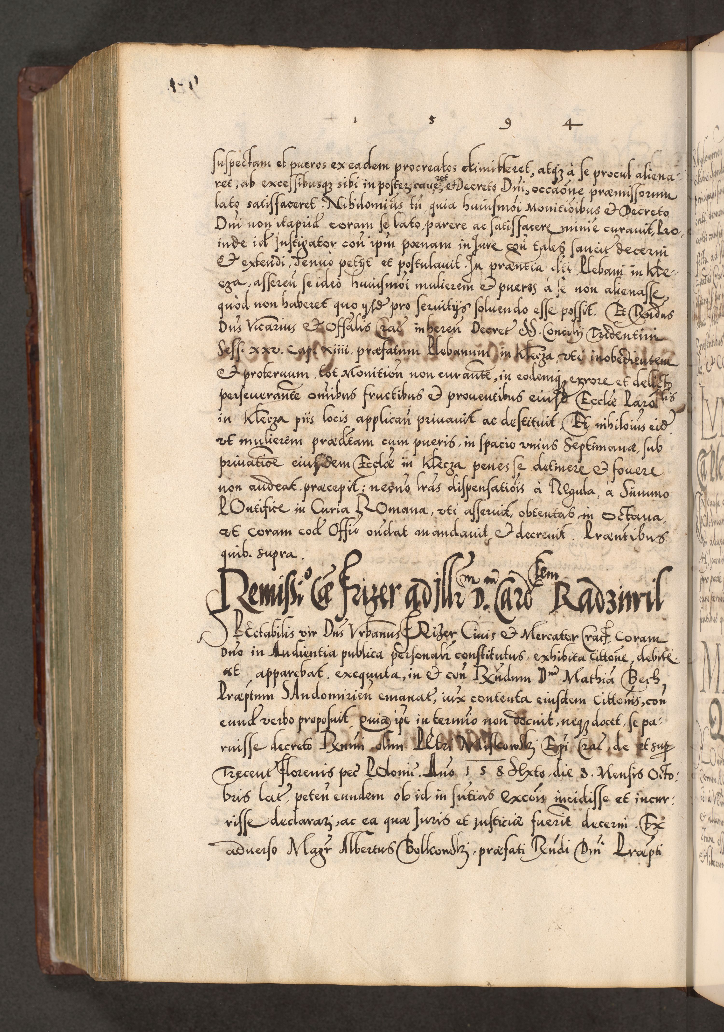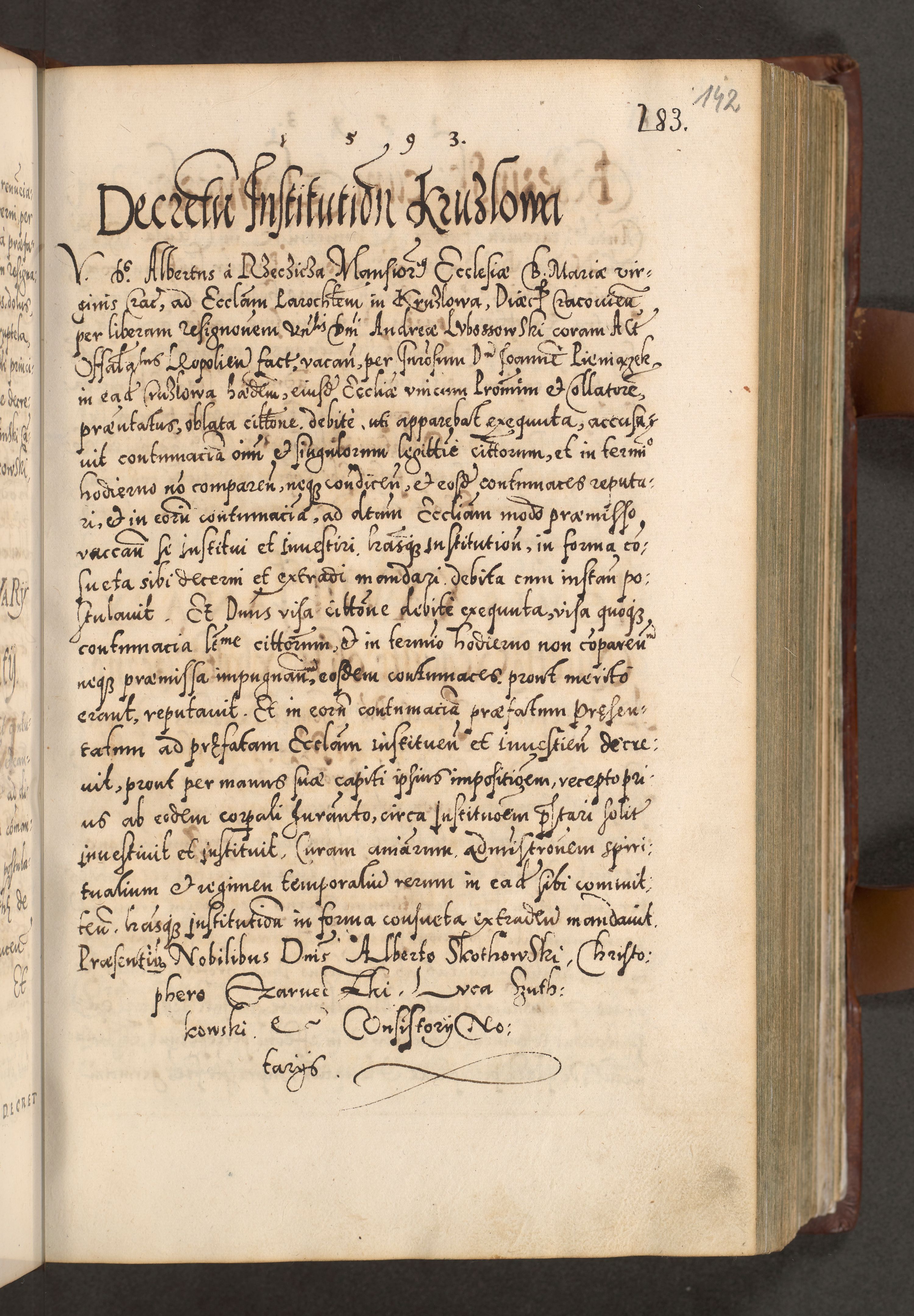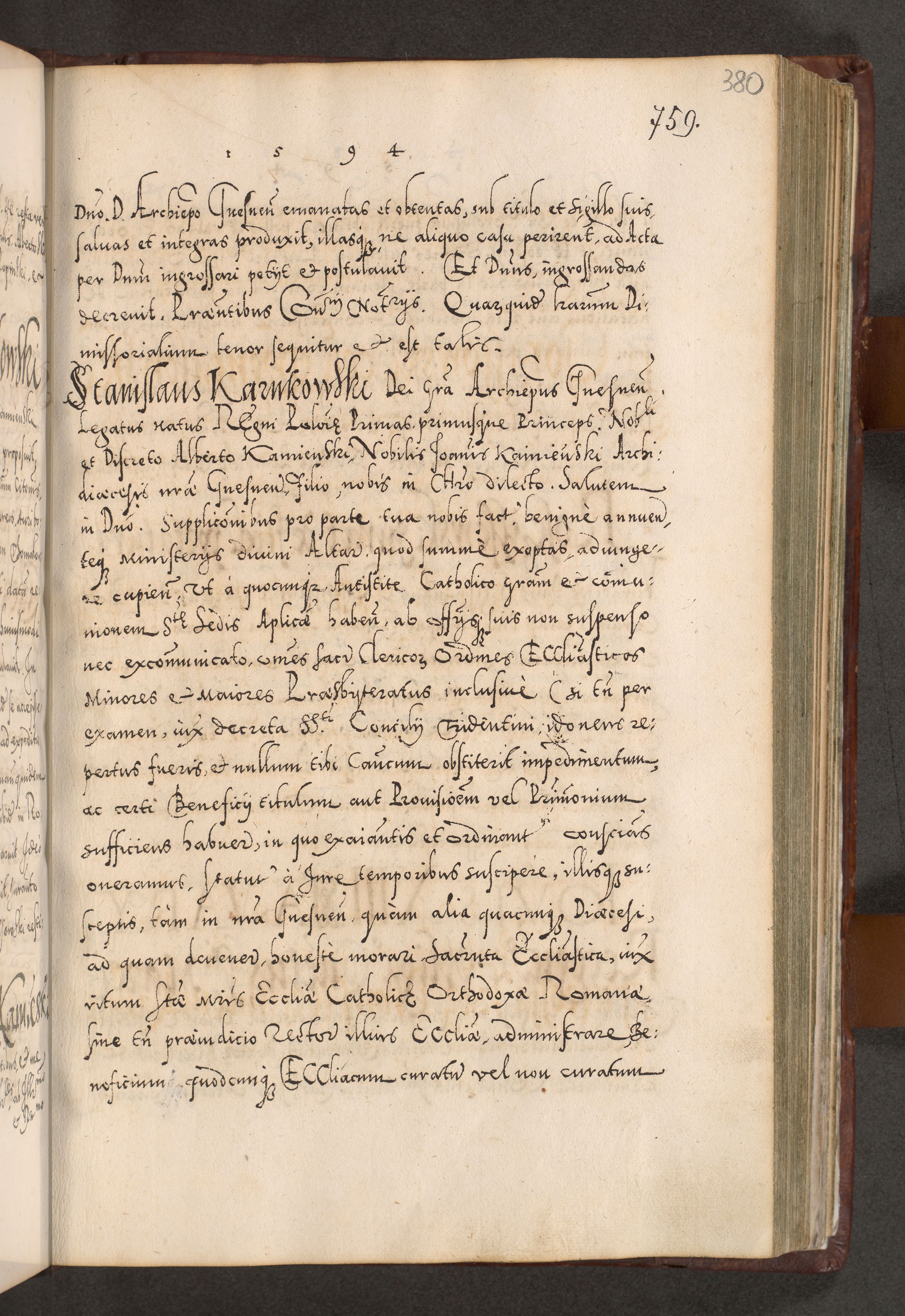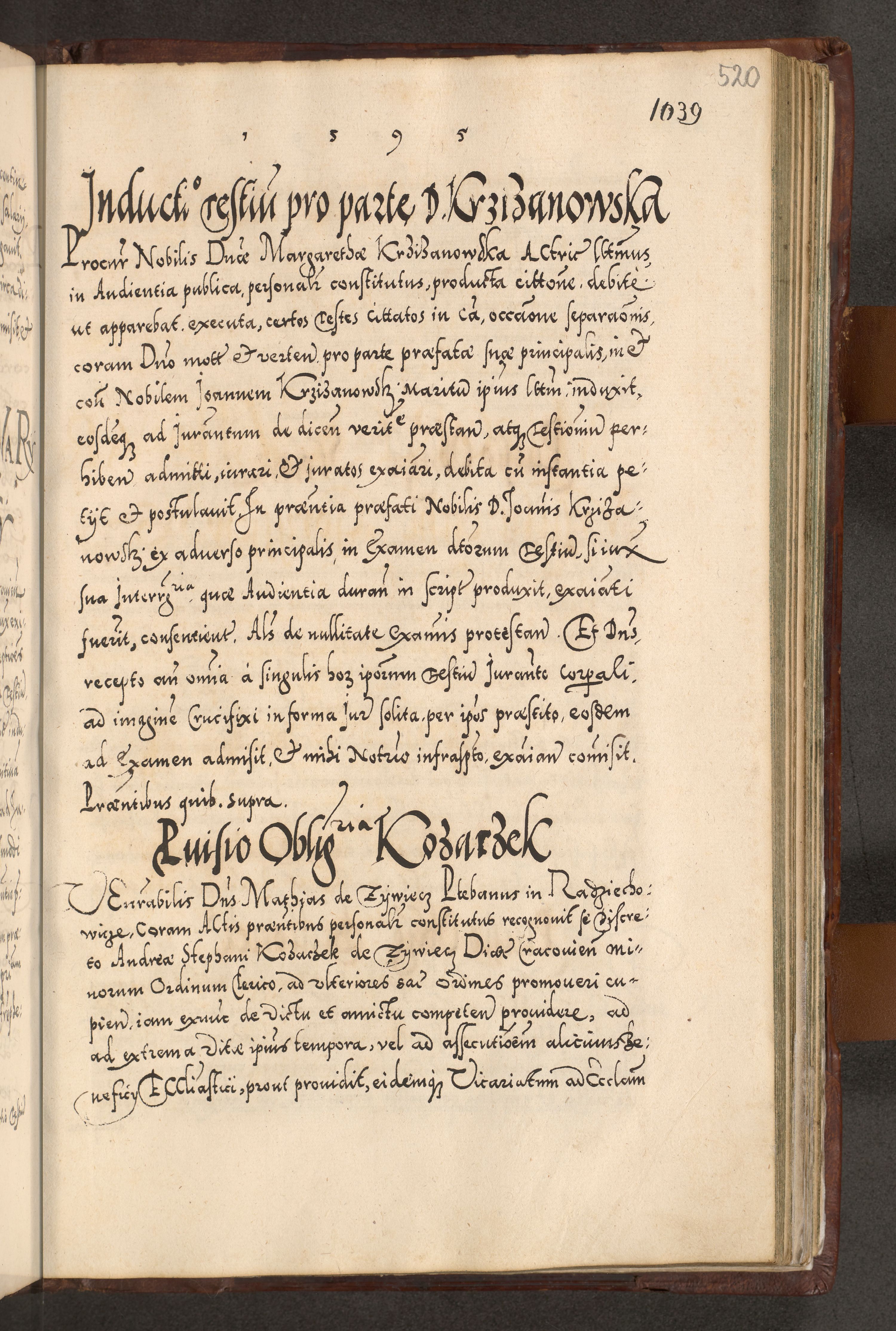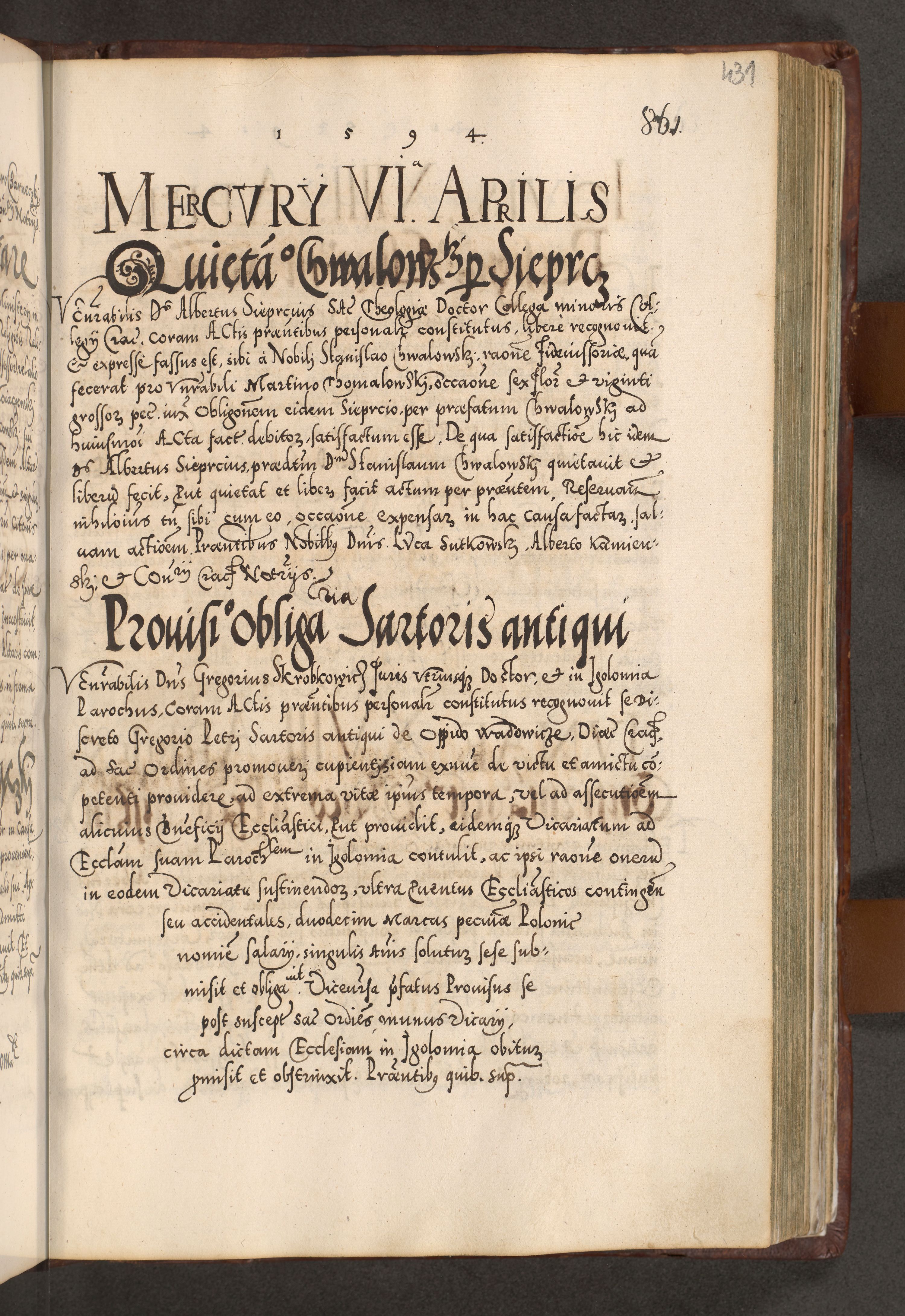 Illistrissimo et revedissimo in Christo Patre Domino Domino Georgio Rzadziwił Miserone Divina Sacrostae R. E. Tituli S. Sixti Presbitero Cardinali Duce in Olyka et Niesswiesz ad Gubernacula Ecclessiae Cracoviensis cuius administratorialem a Sancta Sede Apostolica obtinverat feliciter sedente. Acta actorum, causarum, sententiarum tam deffinitivarum quam interloquutoriarum decretorum, obligationum, quietationum, recognitionum, constitutionum procuratorum etc. coram Reverendo Domino Stanislao Crassinskz de Crasne Archidiacono Cracoviensis, Scholastico Gnesnesis, Custode Plocensis etc. Vicario et Officiali Generali Cracoviensi in Ano Domini Millesimo Quingentesimo Nonagesimo Primo cuius indictio quarta pontificatus SS. Domini Nostri Gregorii XIIII Anno I psius prio feliciter incipiut
