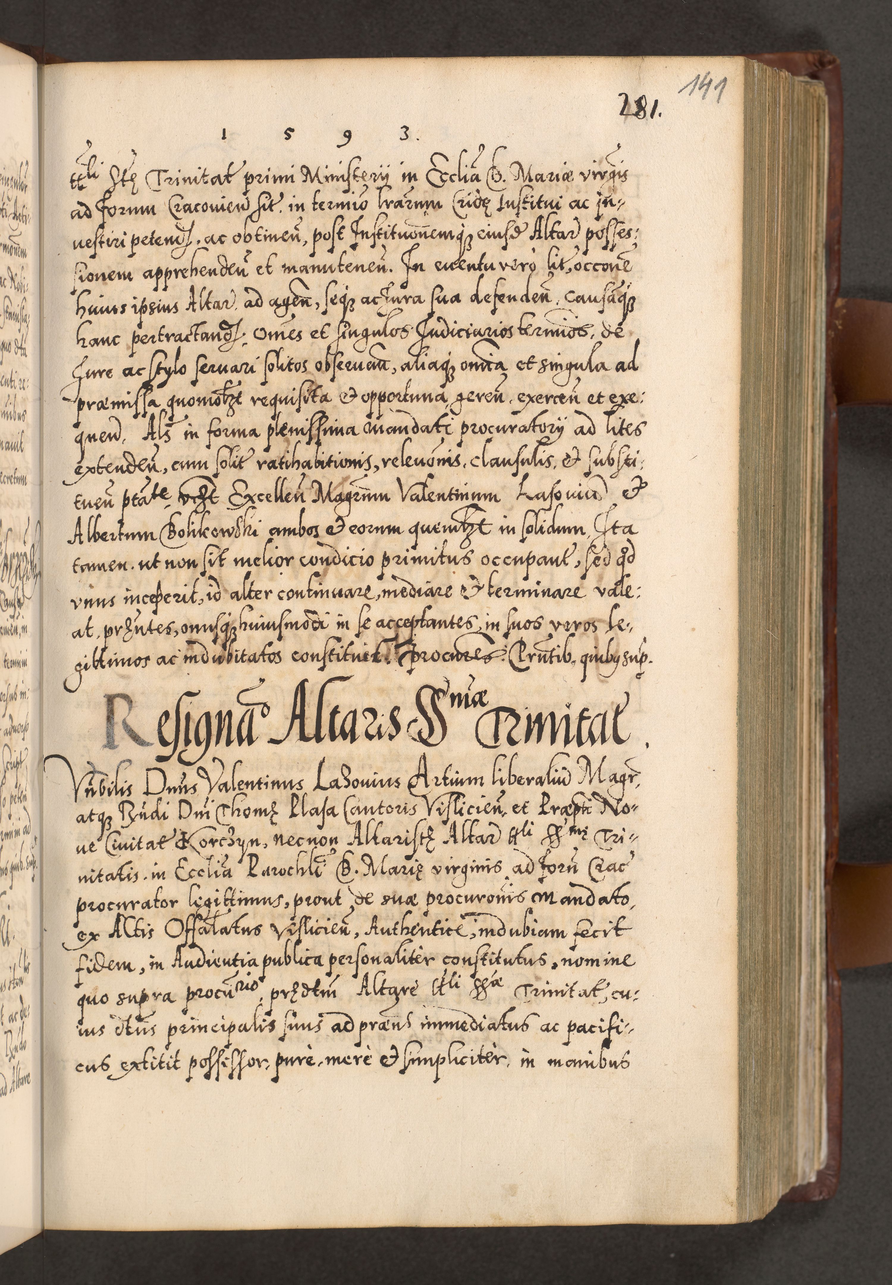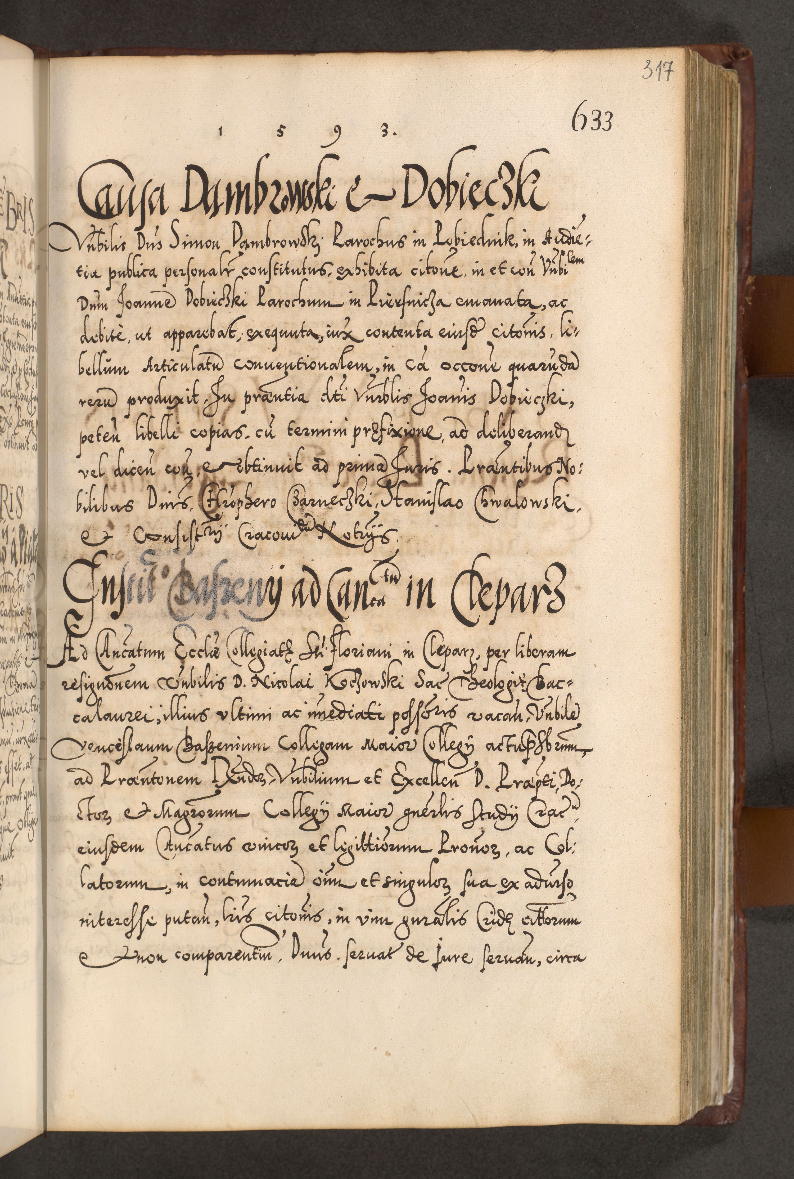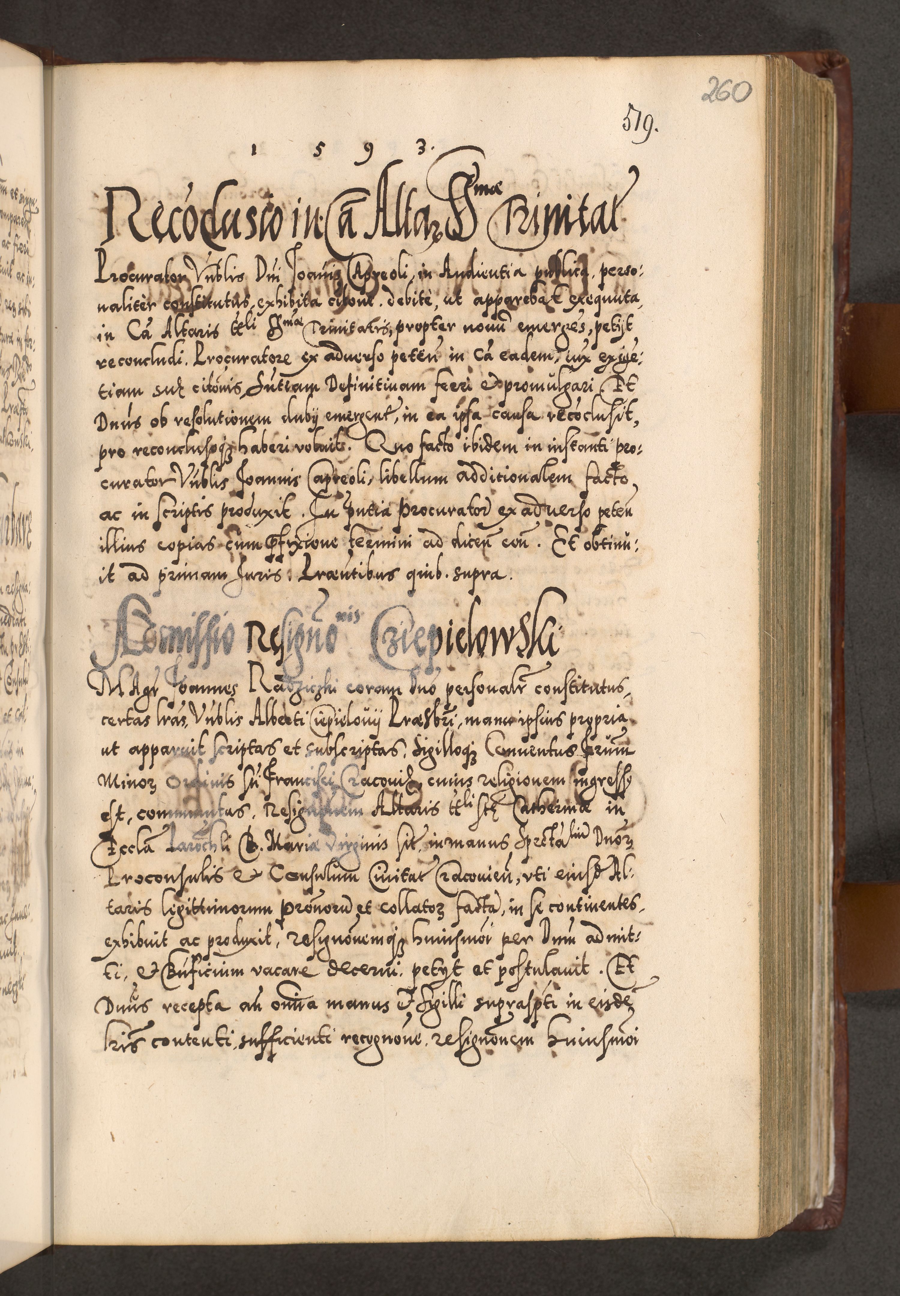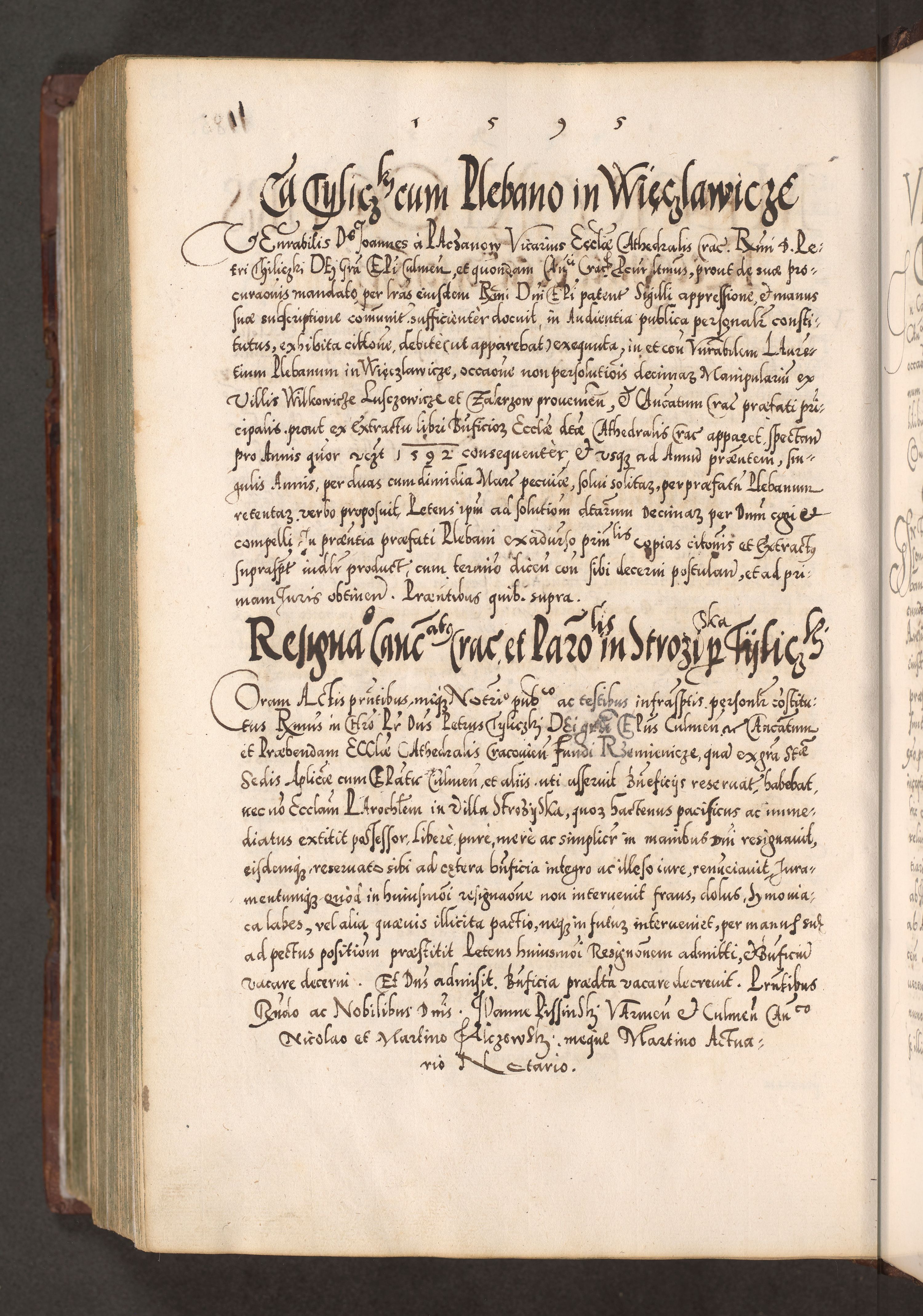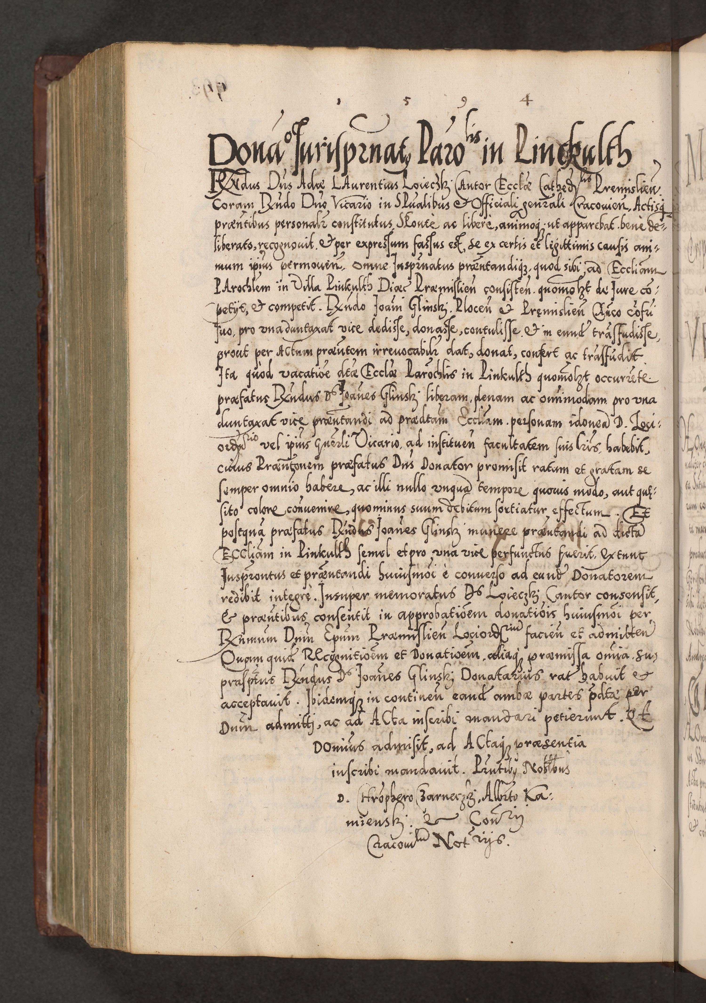 Illistrissimo et revedissimo in Christo Patre Domino Domino Georgio Rzadziwił Miserone Divina Sacrostae R. E. Tituli S. Sixti Presbitero Cardinali Duce in Olyka et Niesswiesz ad Gubernacula Ecclessiae Cracoviensis cuius administratorialem a Sancta Sede Apostolica obtinverat feliciter sedente. Acta actorum, causarum, sententiarum tam deffinitivarum quam interloquutoriarum decretorum, obligationum, quietationum, recognitionum, constitutionum procuratorum etc. coram Reverendo Domino Stanislao Crassinskz de Crasne Archidiacono Cracoviensis, Scholastico Gnesnesis, Custode Plocensis etc. Vicario et Officiali Generali Cracoviensi in Ano Domini Millesimo Quingentesimo Nonagesimo Primo cuius indictio quarta pontificatus SS. Domini Nostri Gregorii XIIII Anno I psius prio feliciter incipiut