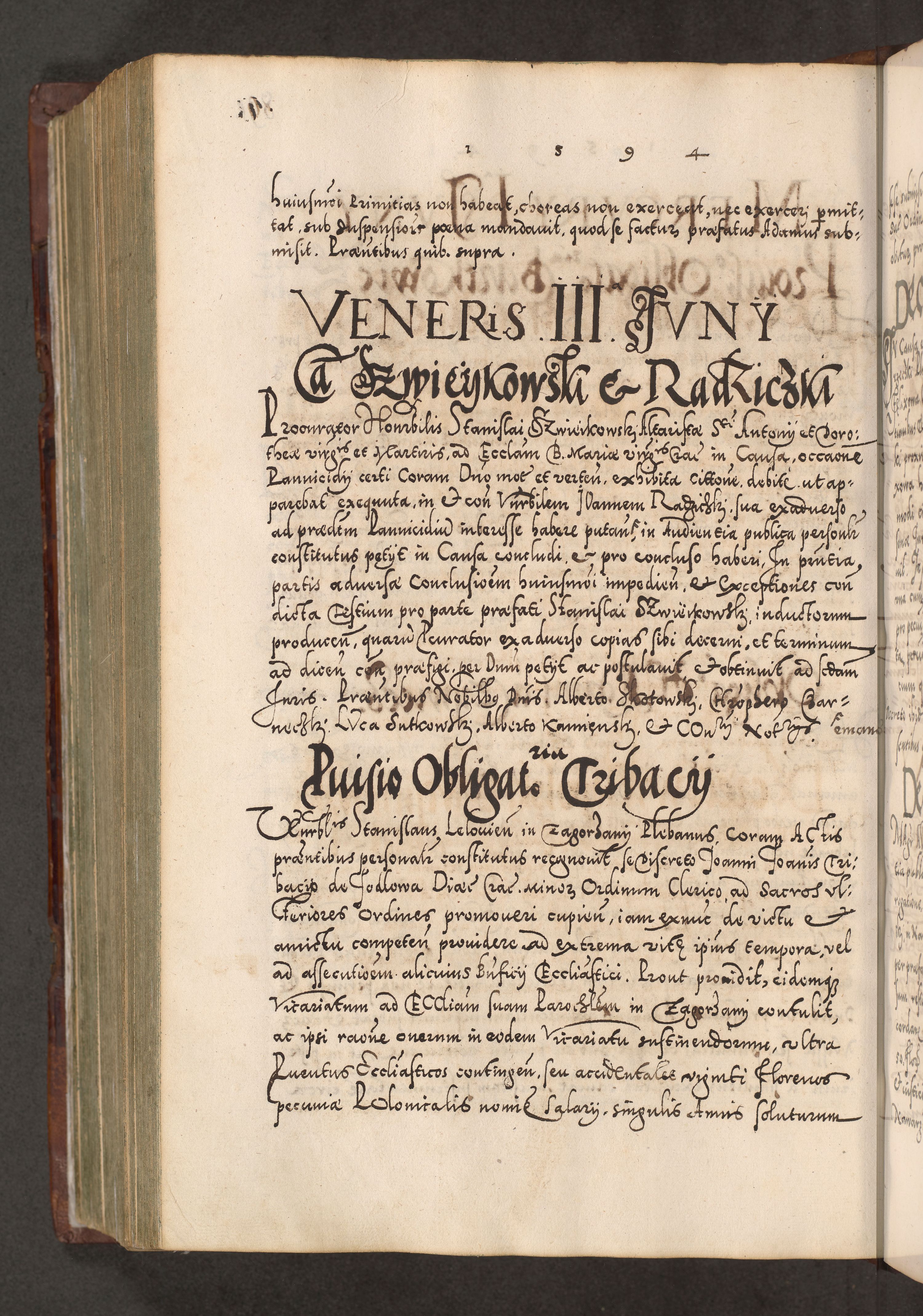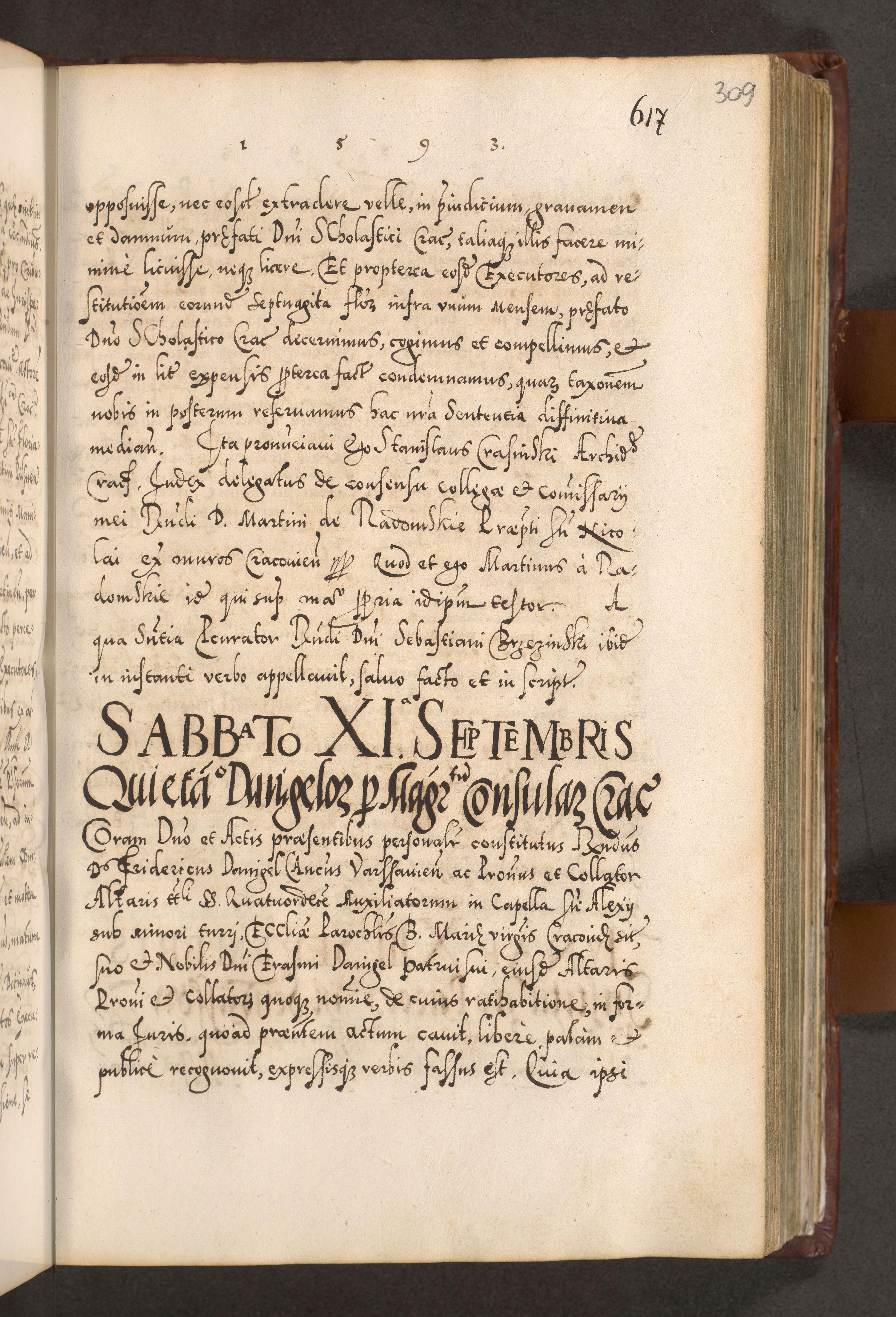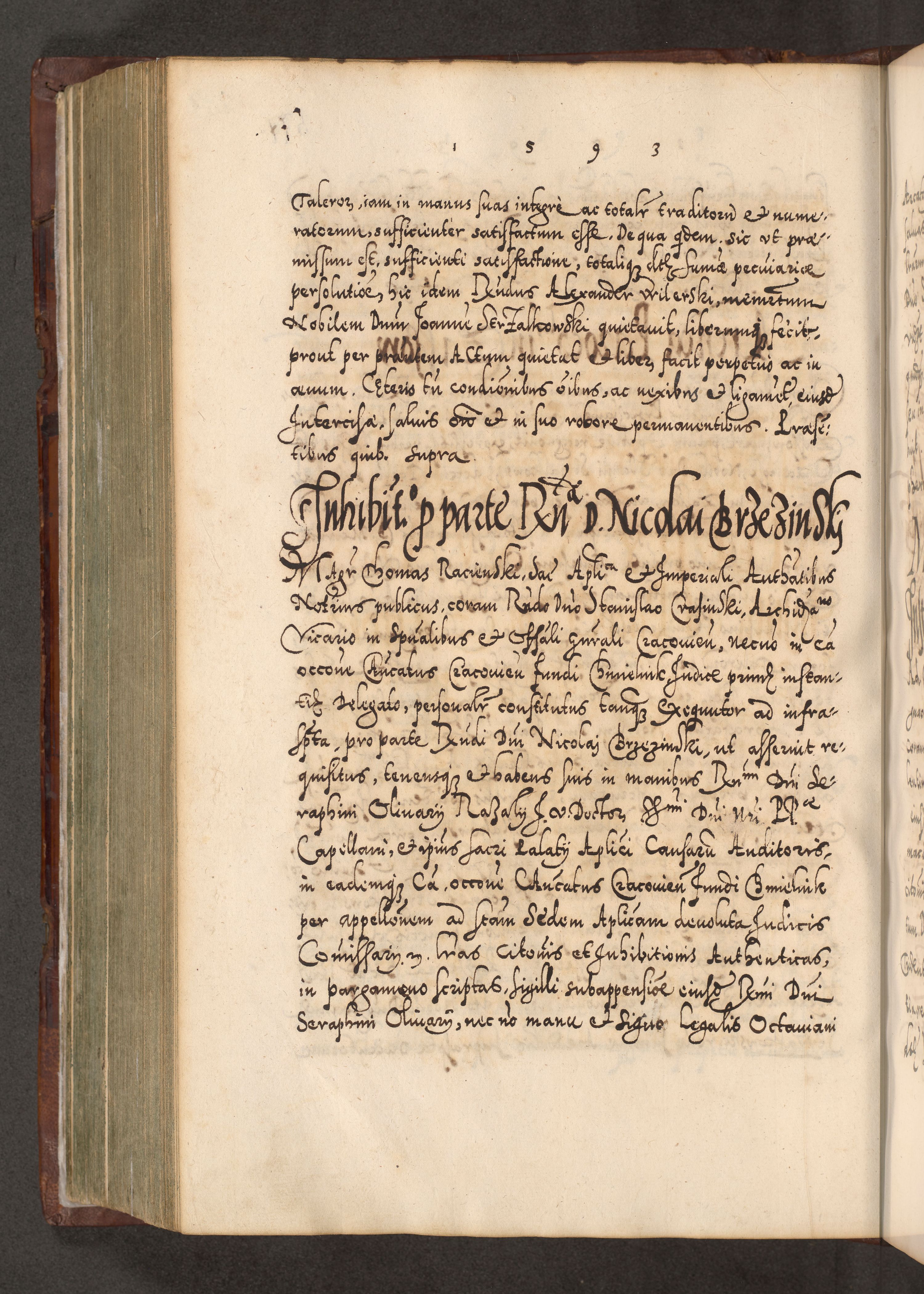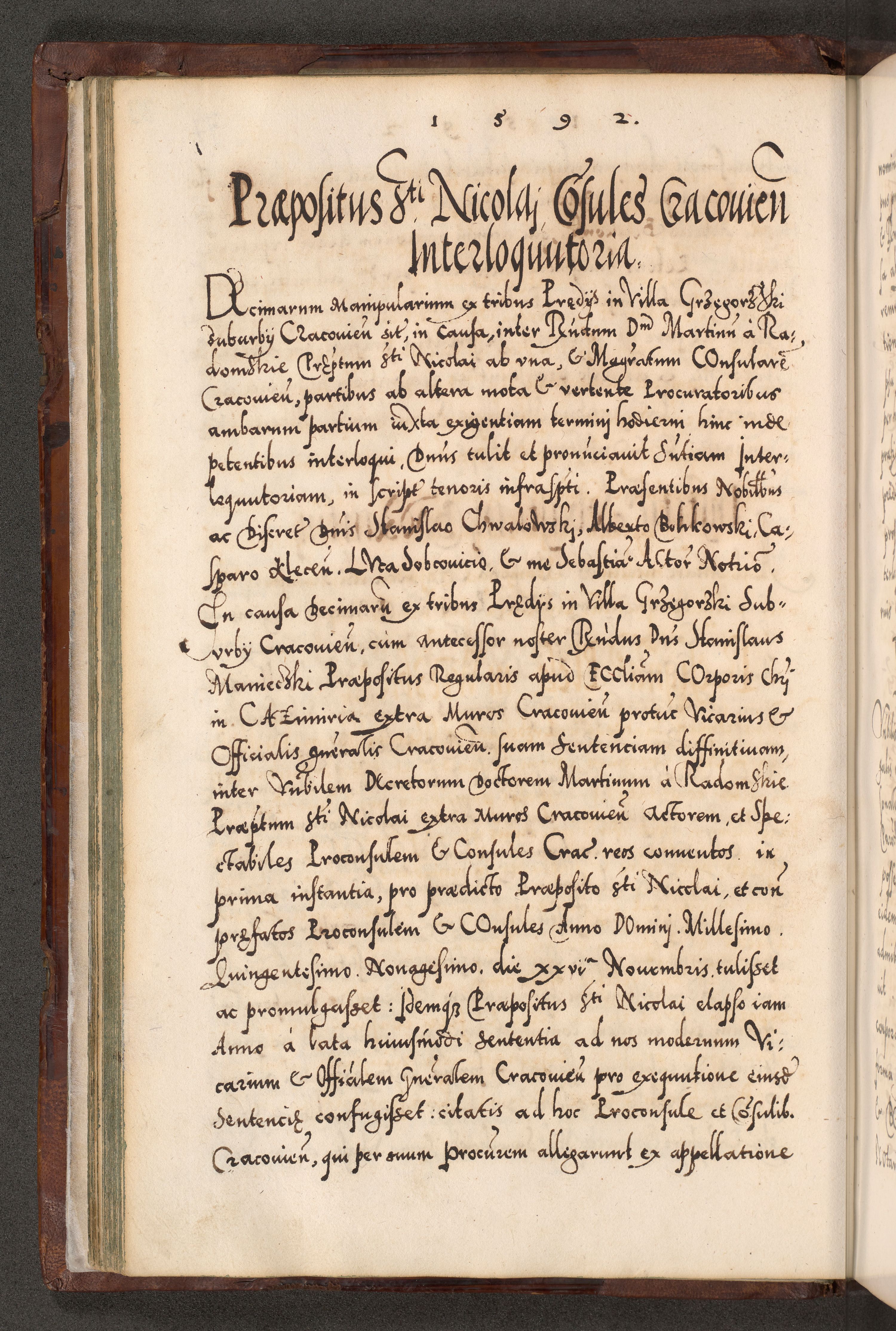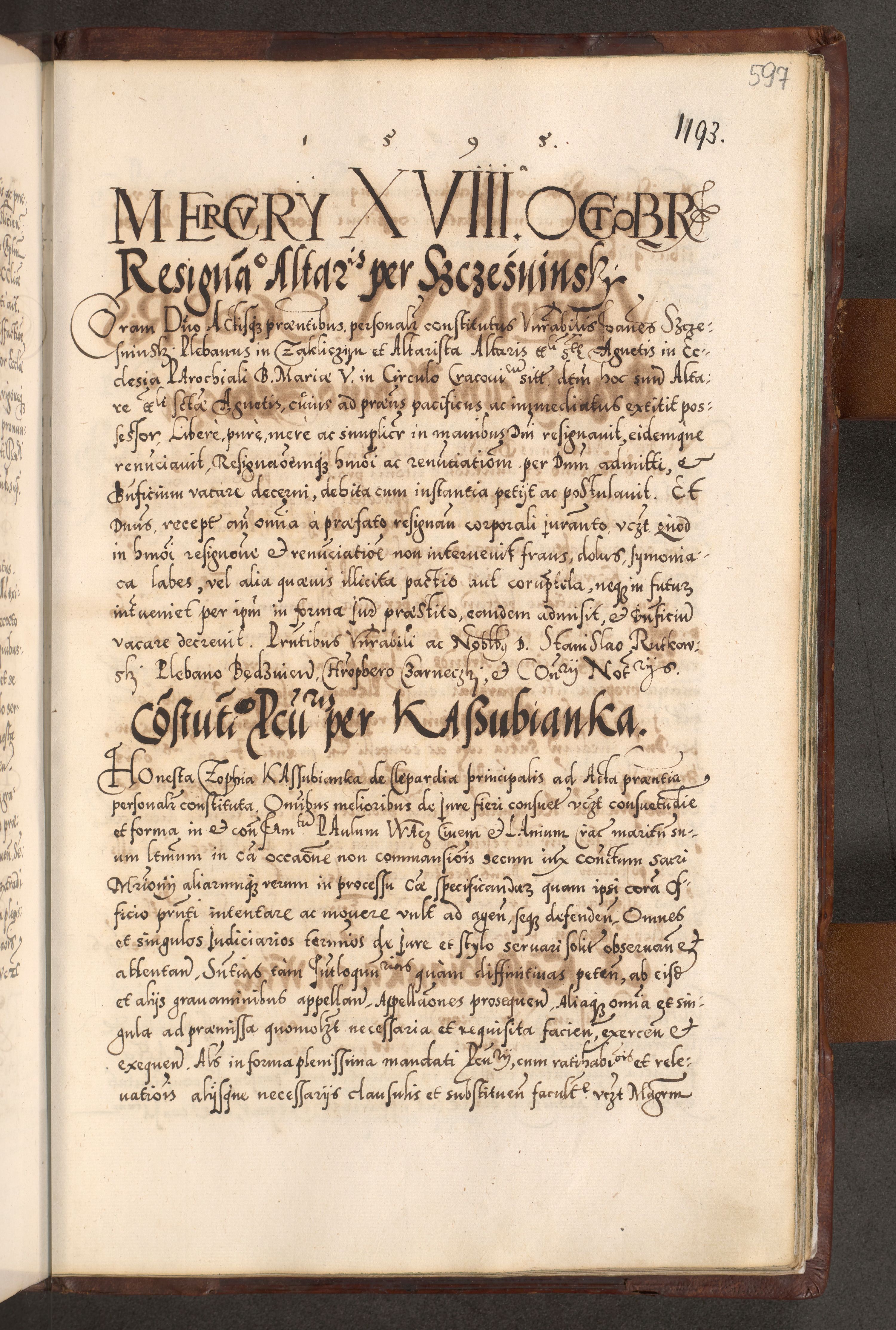 Illistrissimo et revedissimo in Christo Patre Domino Domino Georgio Rzadziwił Miserone Divina Sacrostae R. E. Tituli S. Sixti Presbitero Cardinali Duce in Olyka et Niesswiesz ad Gubernacula Ecclessiae Cracoviensis cuius administratorialem a Sancta Sede Apostolica obtinverat feliciter sedente. Acta actorum, causarum, sententiarum tam deffinitivarum quam interloquutoriarum decretorum, obligationum, quietationum, recognitionum, constitutionum procuratorum etc. coram Reverendo Domino Stanislao Crassinskz de Crasne Archidiacono Cracoviensis, Scholastico Gnesnesis, Custode Plocensis etc. Vicario et Officiali Generali Cracoviensi in Ano Domini Millesimo Quingentesimo Nonagesimo Primo cuius indictio quarta pontificatus SS. Domini Nostri Gregorii XIIII Anno I psius prio feliciter incipiut
