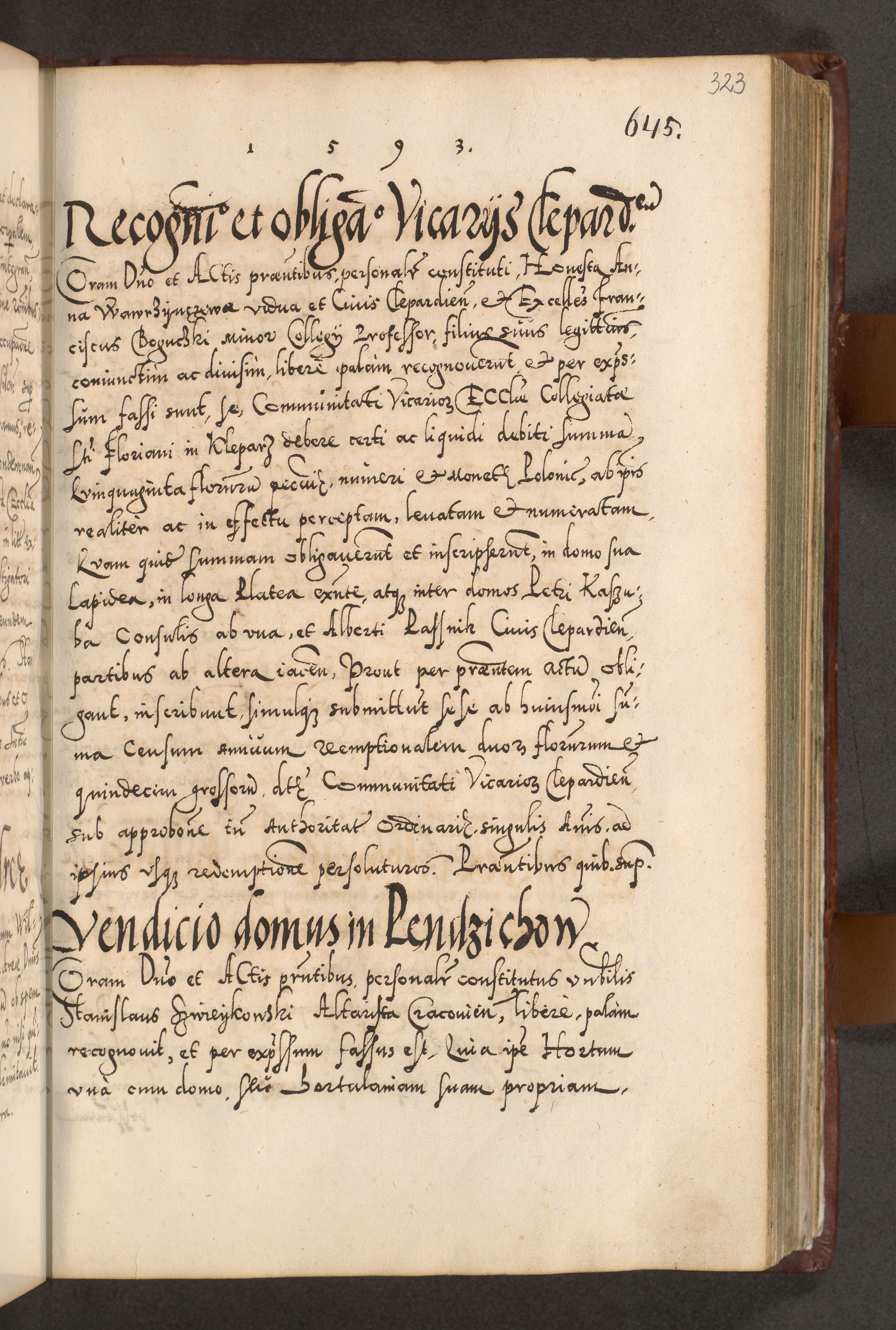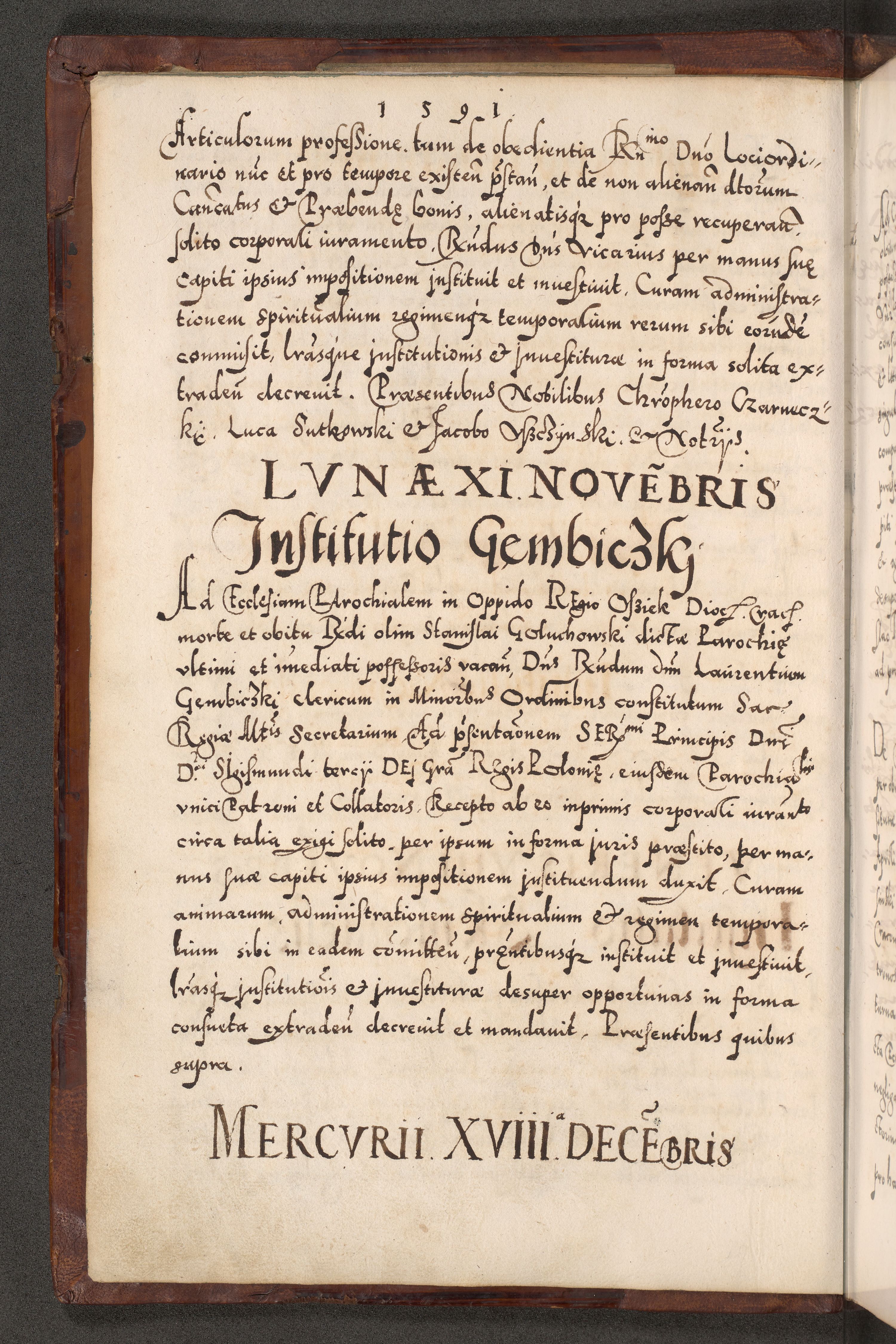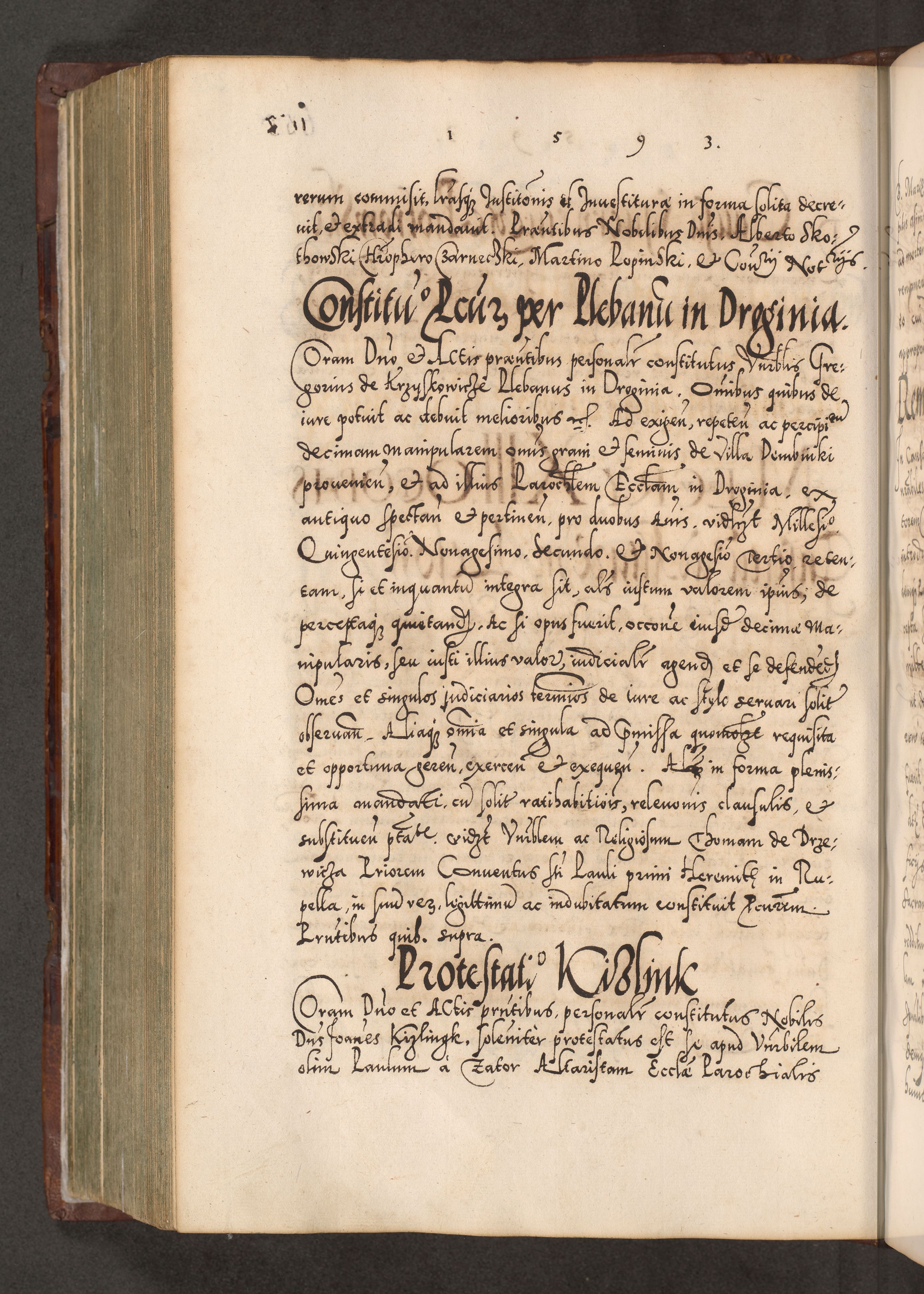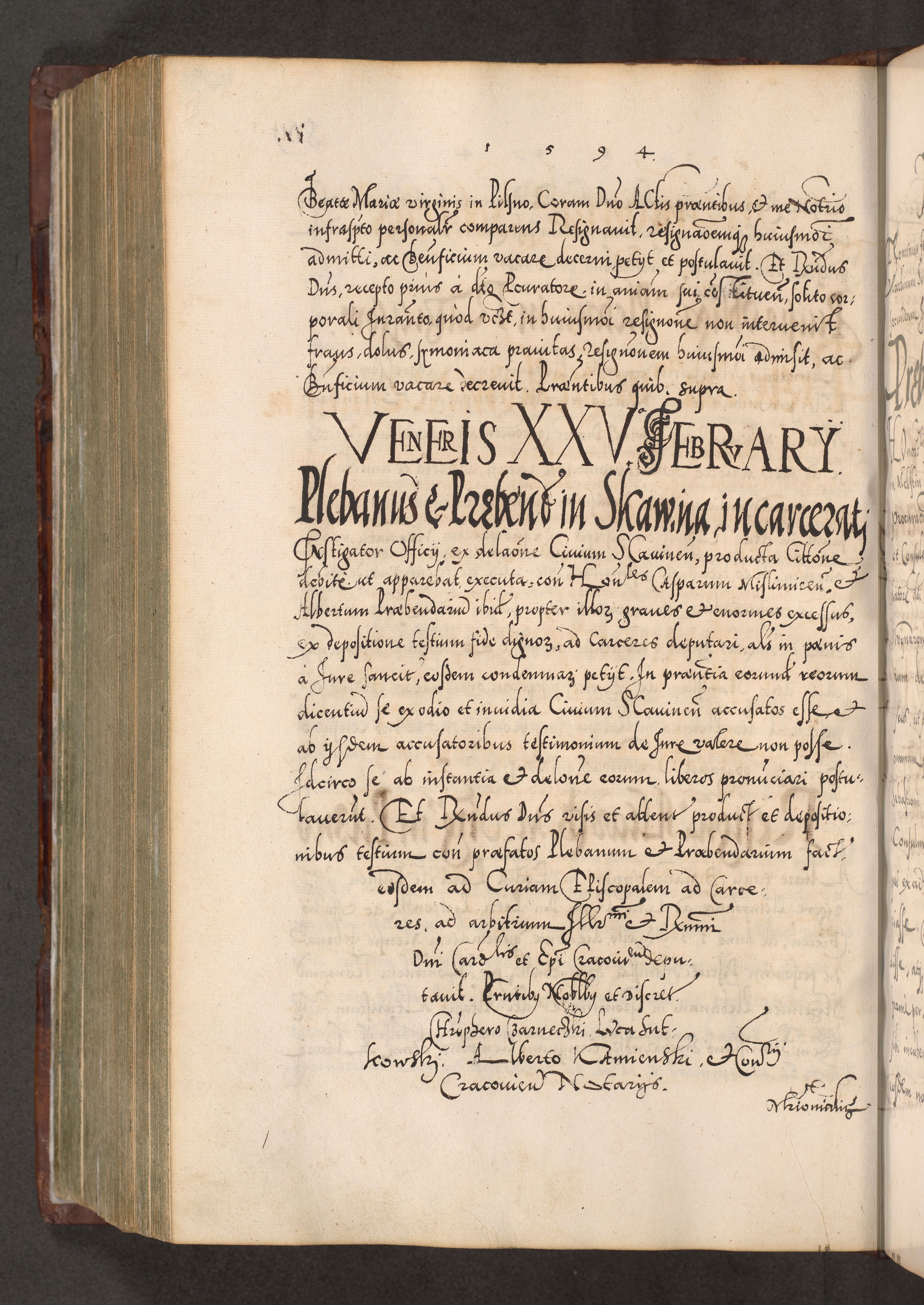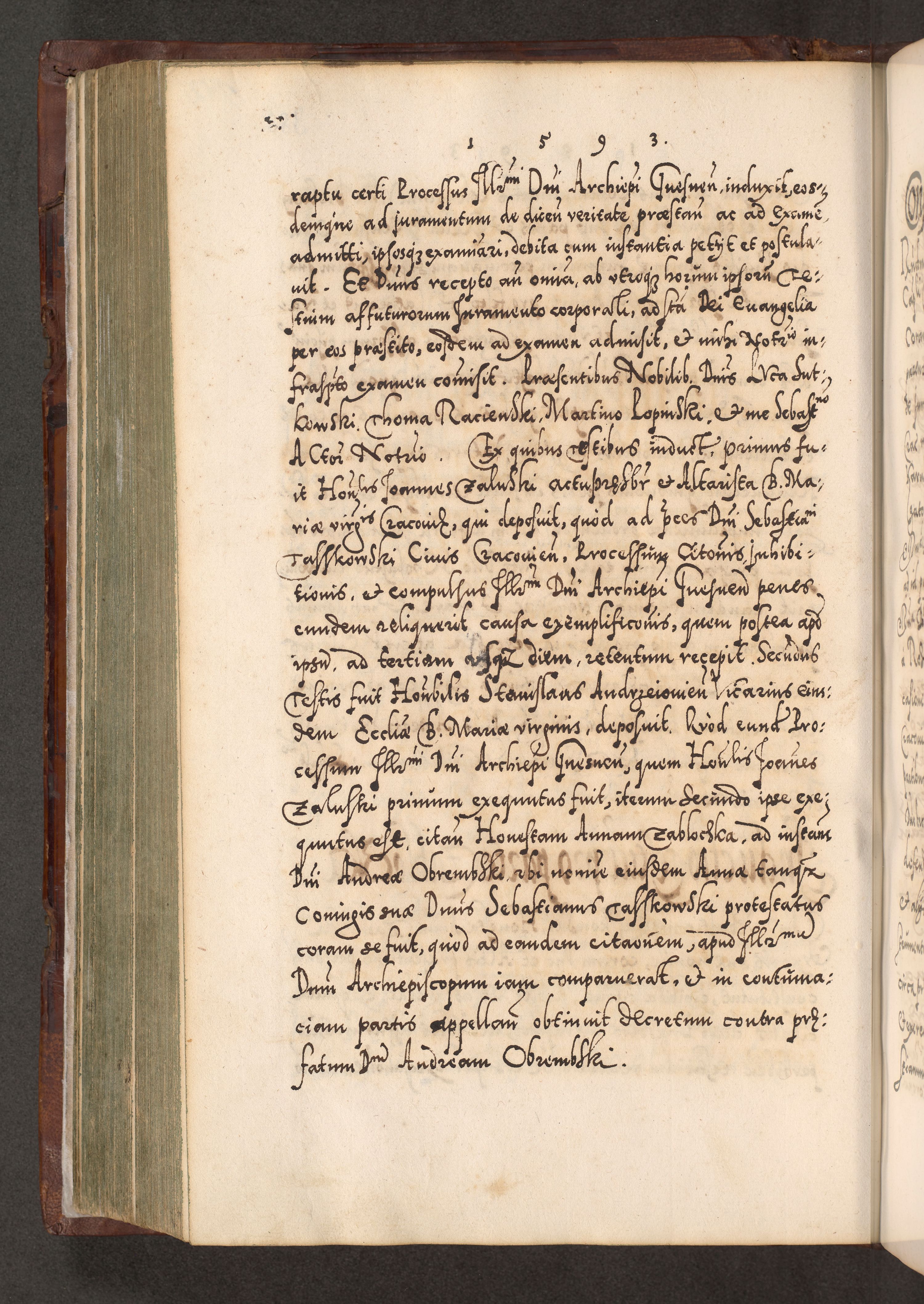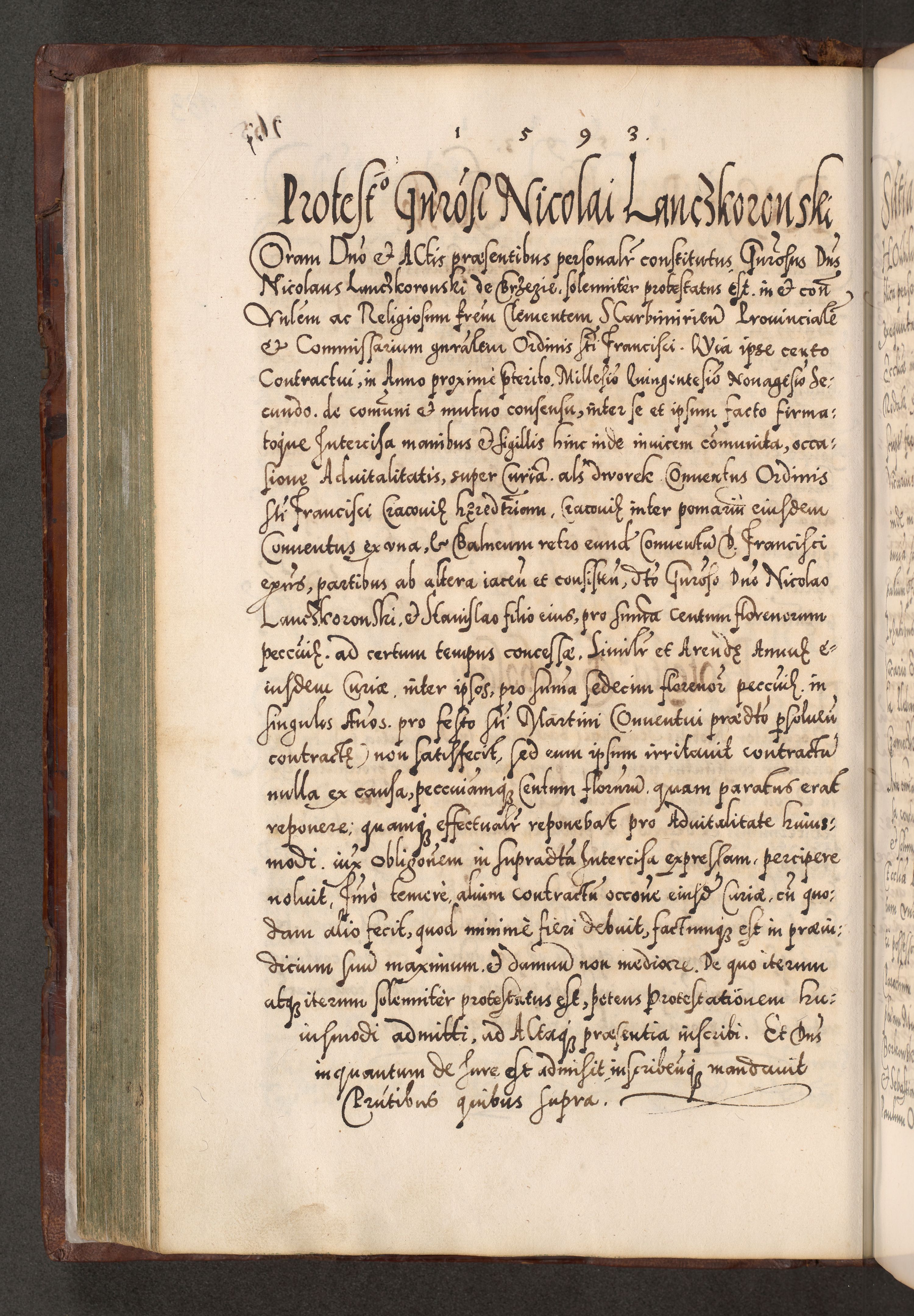 Illistrissimo et revedissimo in Christo Patre Domino Domino Georgio Rzadziwił Miserone Divina Sacrostae R. E. Tituli S. Sixti Presbitero Cardinali Duce in Olyka et Niesswiesz ad Gubernacula Ecclessiae Cracoviensis cuius administratorialem a Sancta Sede Apostolica obtinverat feliciter sedente. Acta actorum, causarum, sententiarum tam deffinitivarum quam interloquutoriarum decretorum, obligationum, quietationum, recognitionum, constitutionum procuratorum etc. coram Reverendo Domino Stanislao Crassinskz de Crasne Archidiacono Cracoviensis, Scholastico Gnesnesis, Custode Plocensis etc. Vicario et Officiali Generali Cracoviensi in Ano Domini Millesimo Quingentesimo Nonagesimo Primo cuius indictio quarta pontificatus SS. Domini Nostri Gregorii XIIII Anno I psius prio feliciter incipiut
