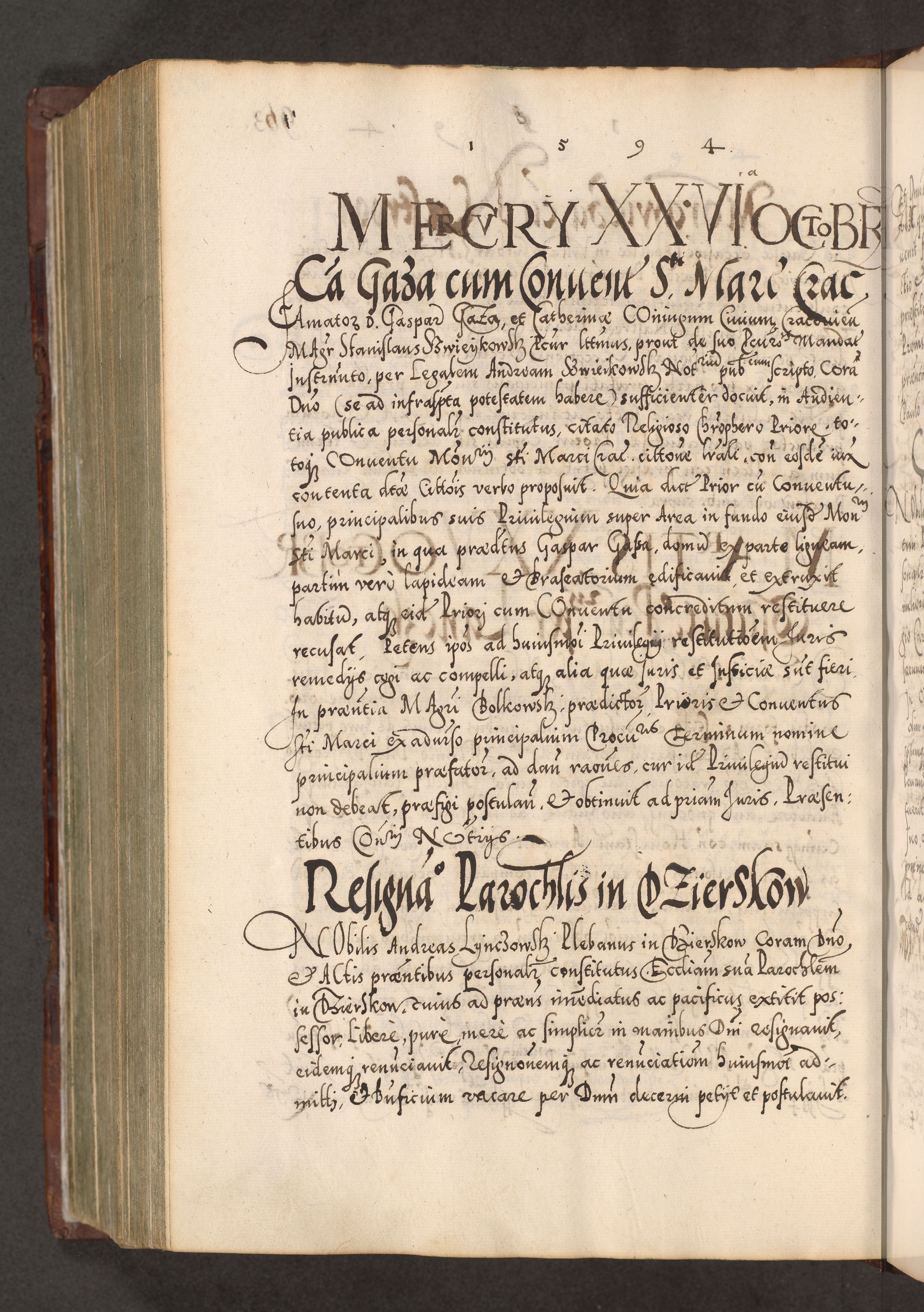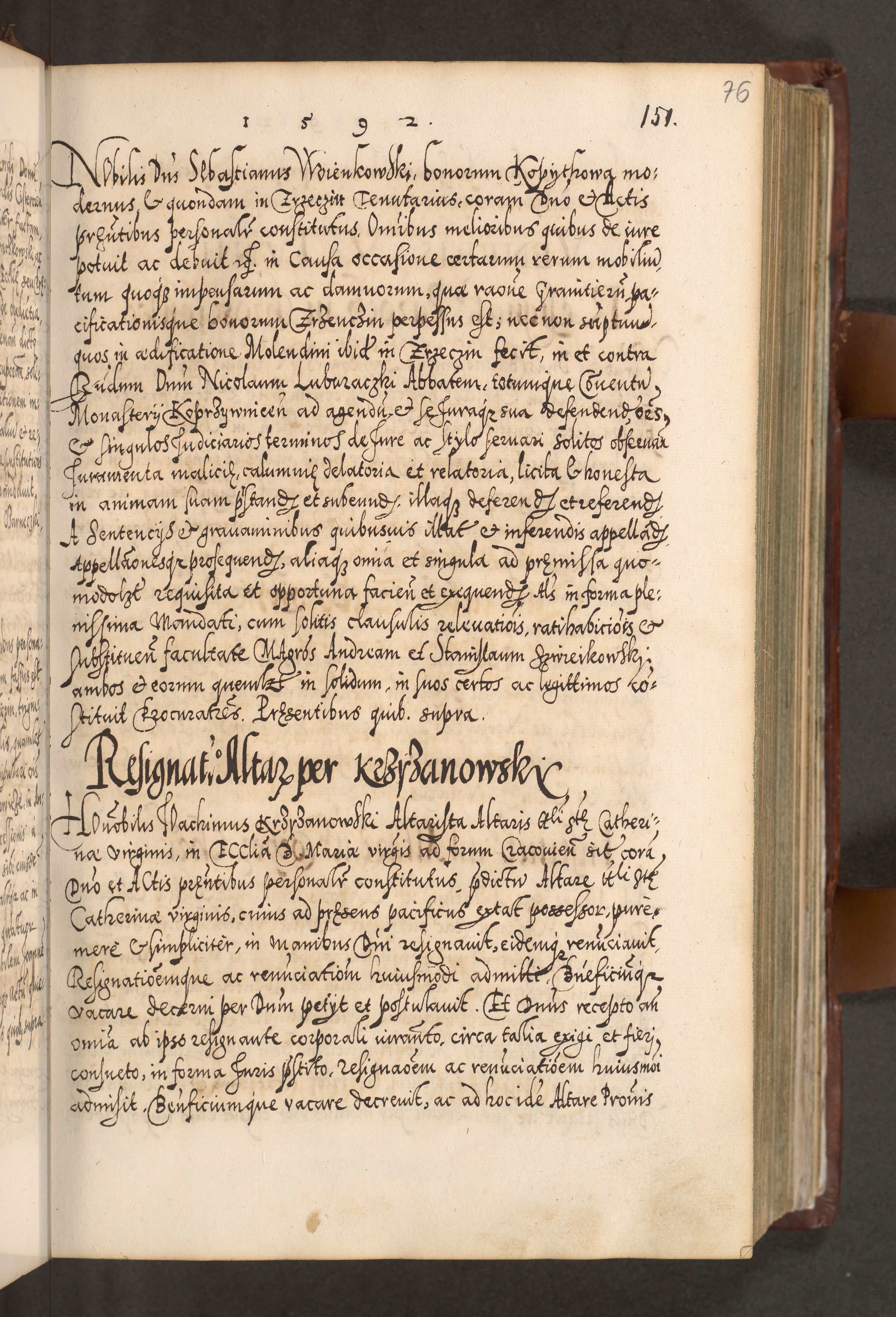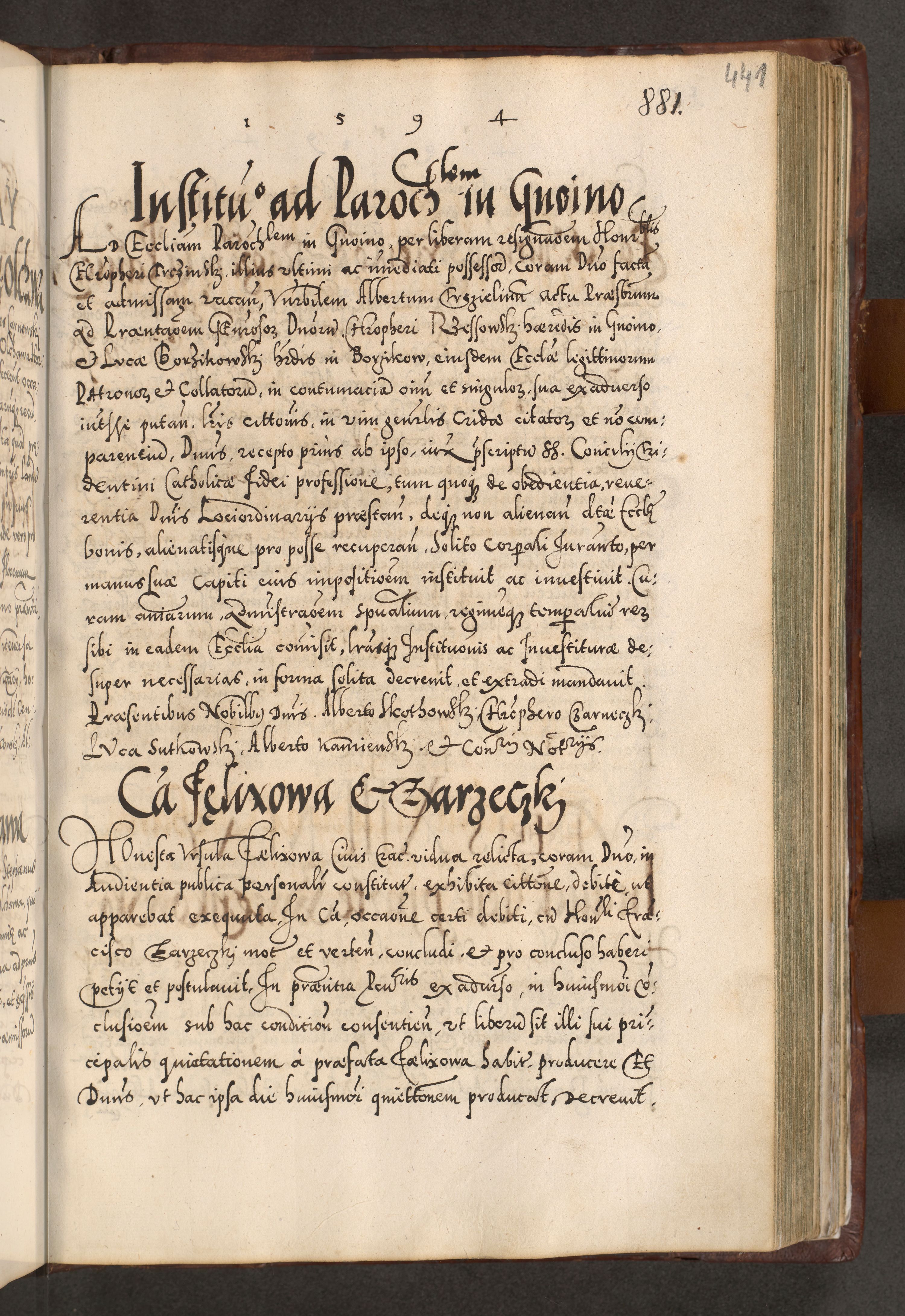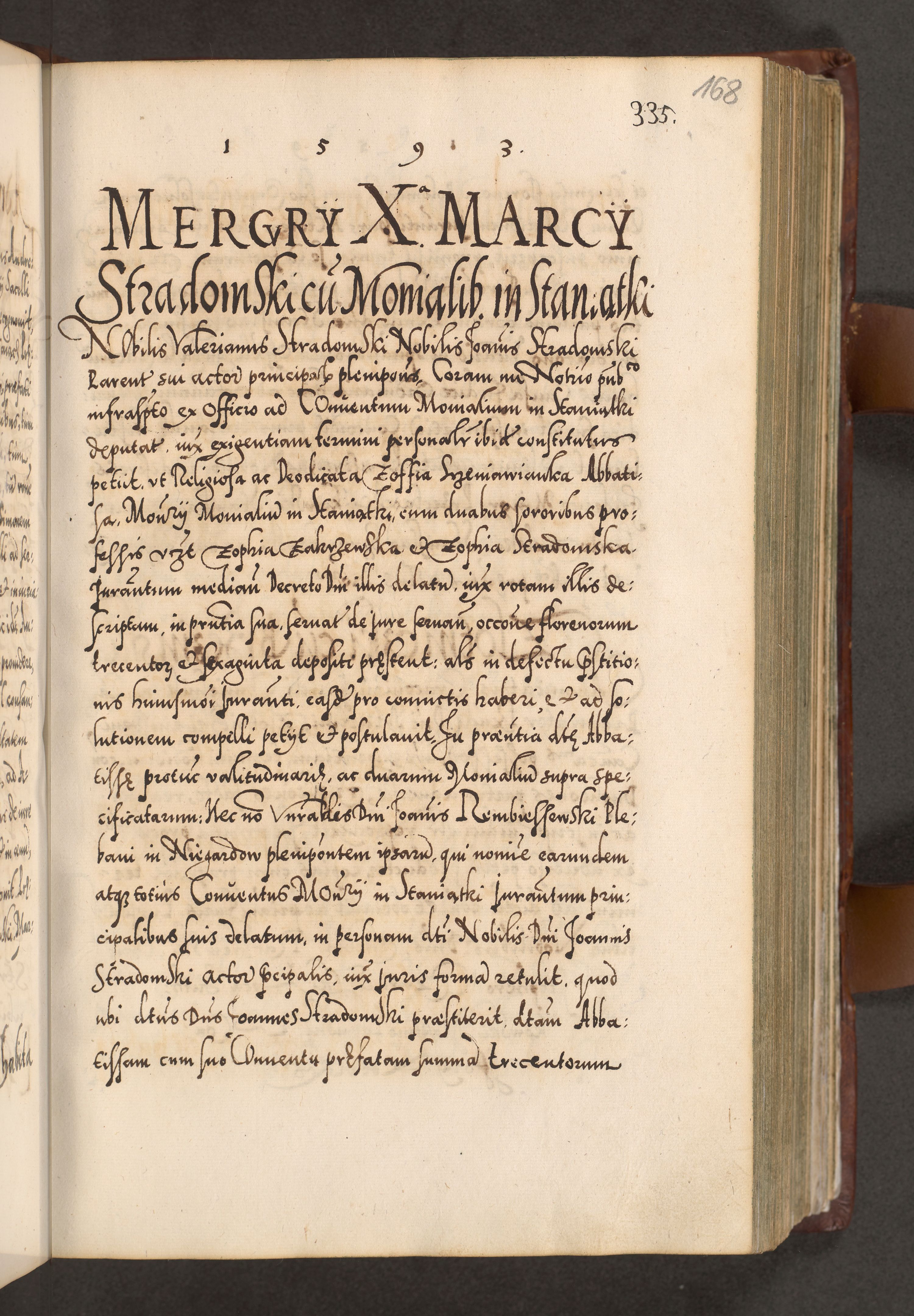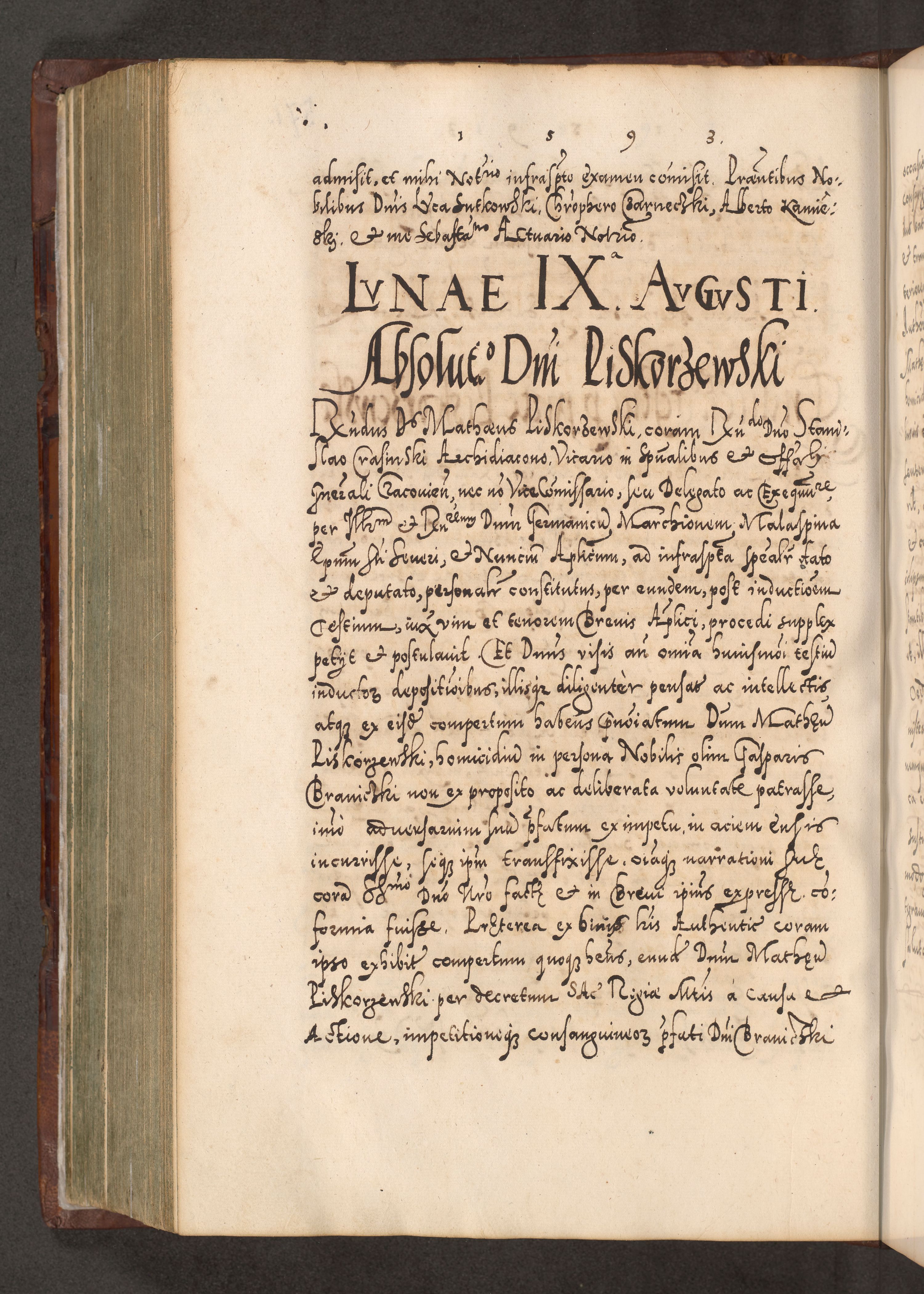 Illistrissimo et revedissimo in Christo Patre Domino Domino Georgio Rzadziwił Miserone Divina Sacrostae R. E. Tituli S. Sixti Presbitero Cardinali Duce in Olyka et Niesswiesz ad Gubernacula Ecclessiae Cracoviensis cuius administratorialem a Sancta Sede Apostolica obtinverat feliciter sedente. Acta actorum, causarum, sententiarum tam deffinitivarum quam interloquutoriarum decretorum, obligationum, quietationum, recognitionum, constitutionum procuratorum etc. coram Reverendo Domino Stanislao Crassinskz de Crasne Archidiacono Cracoviensis, Scholastico Gnesnesis, Custode Plocensis etc. Vicario et Officiali Generali Cracoviensi in Ano Domini Millesimo Quingentesimo Nonagesimo Primo cuius indictio quarta pontificatus SS. Domini Nostri Gregorii XIIII Anno I psius prio feliciter incipiut