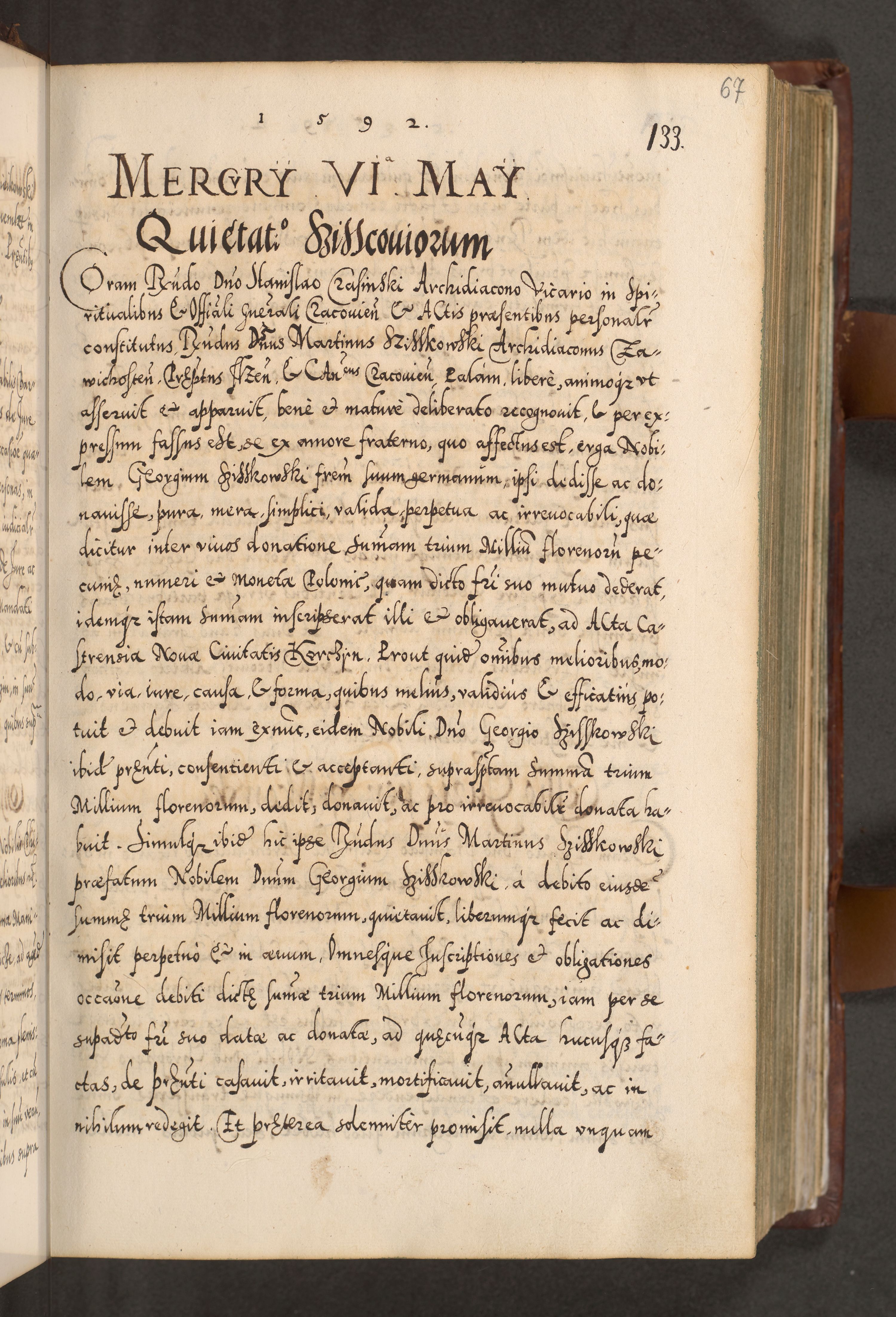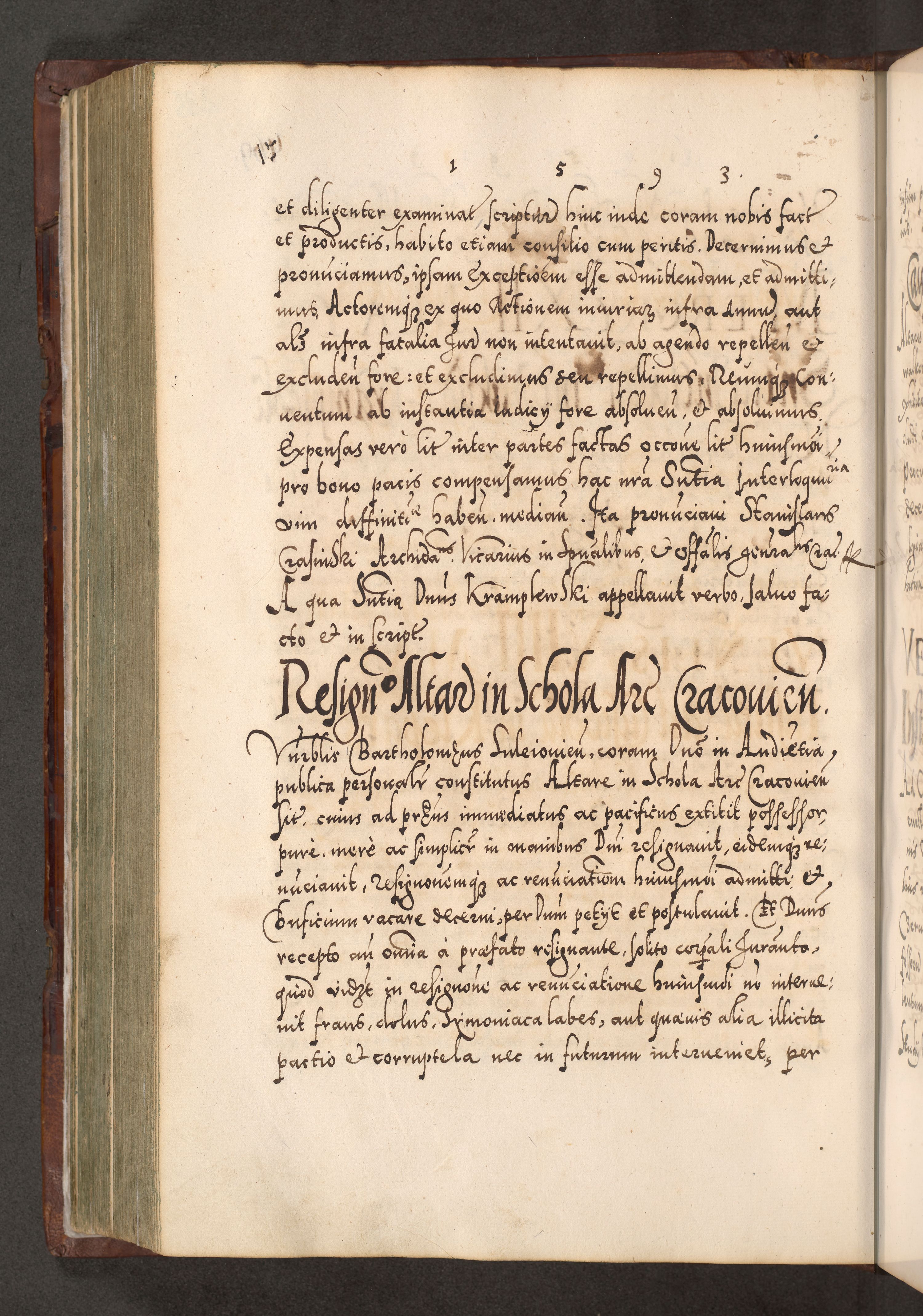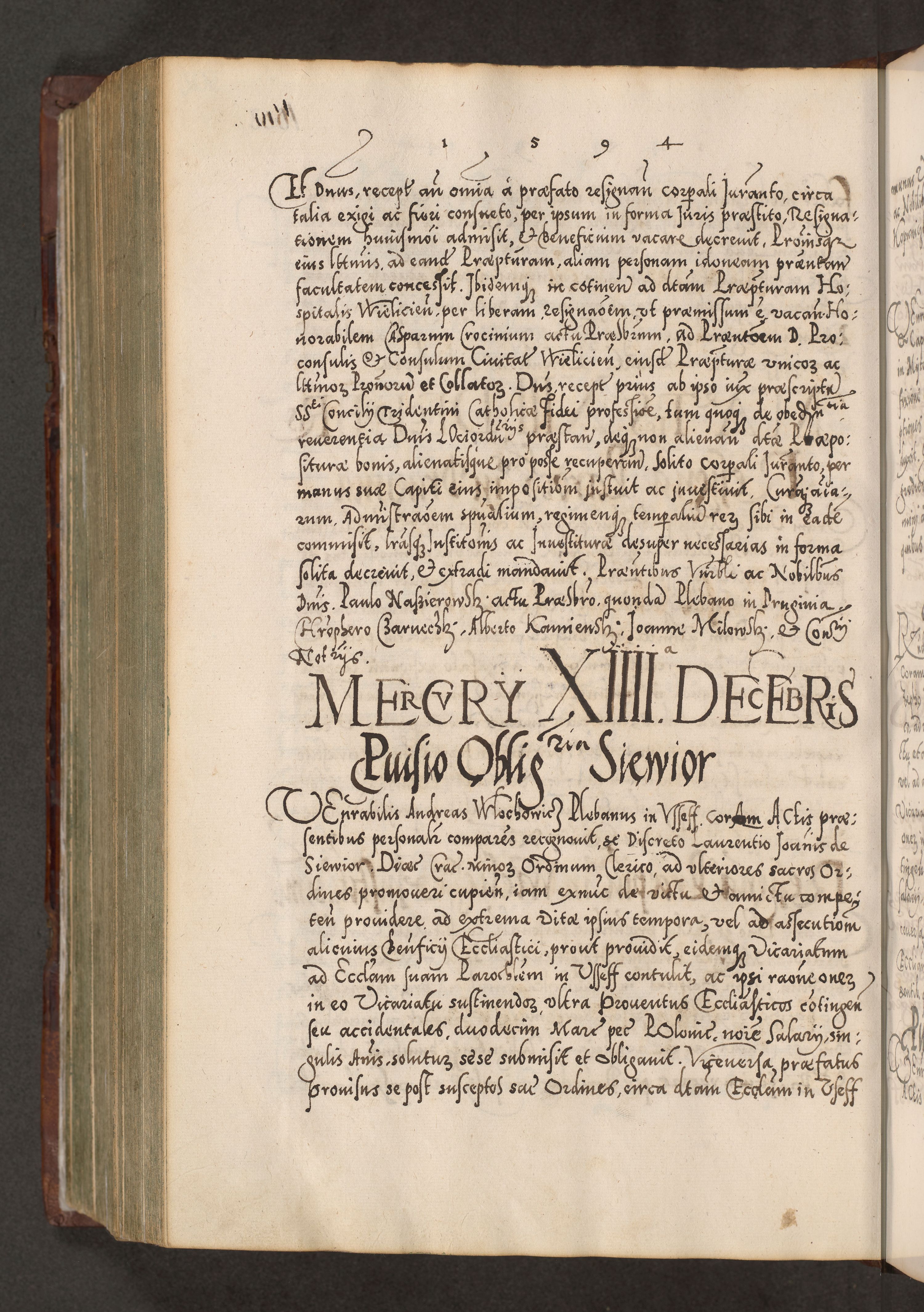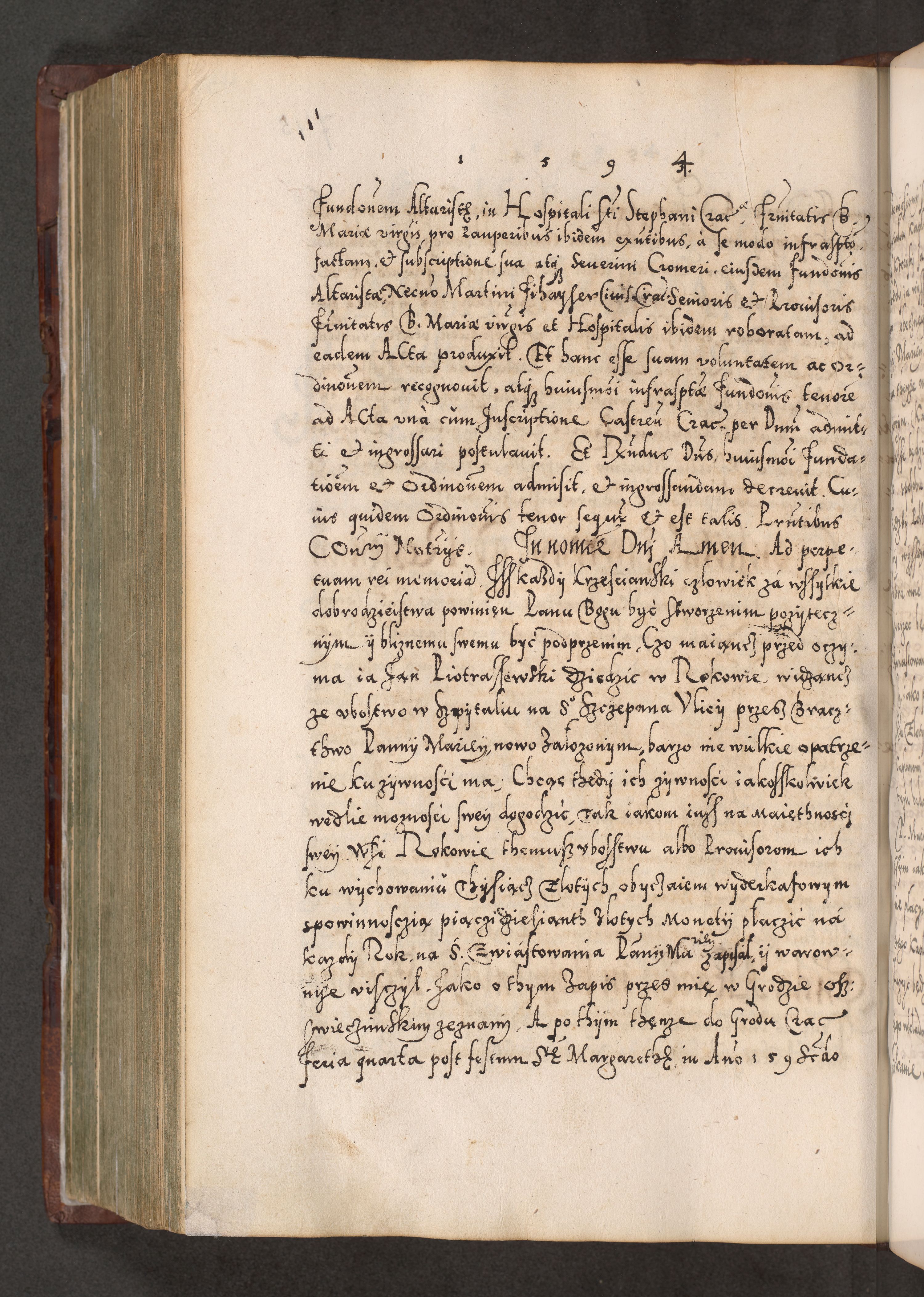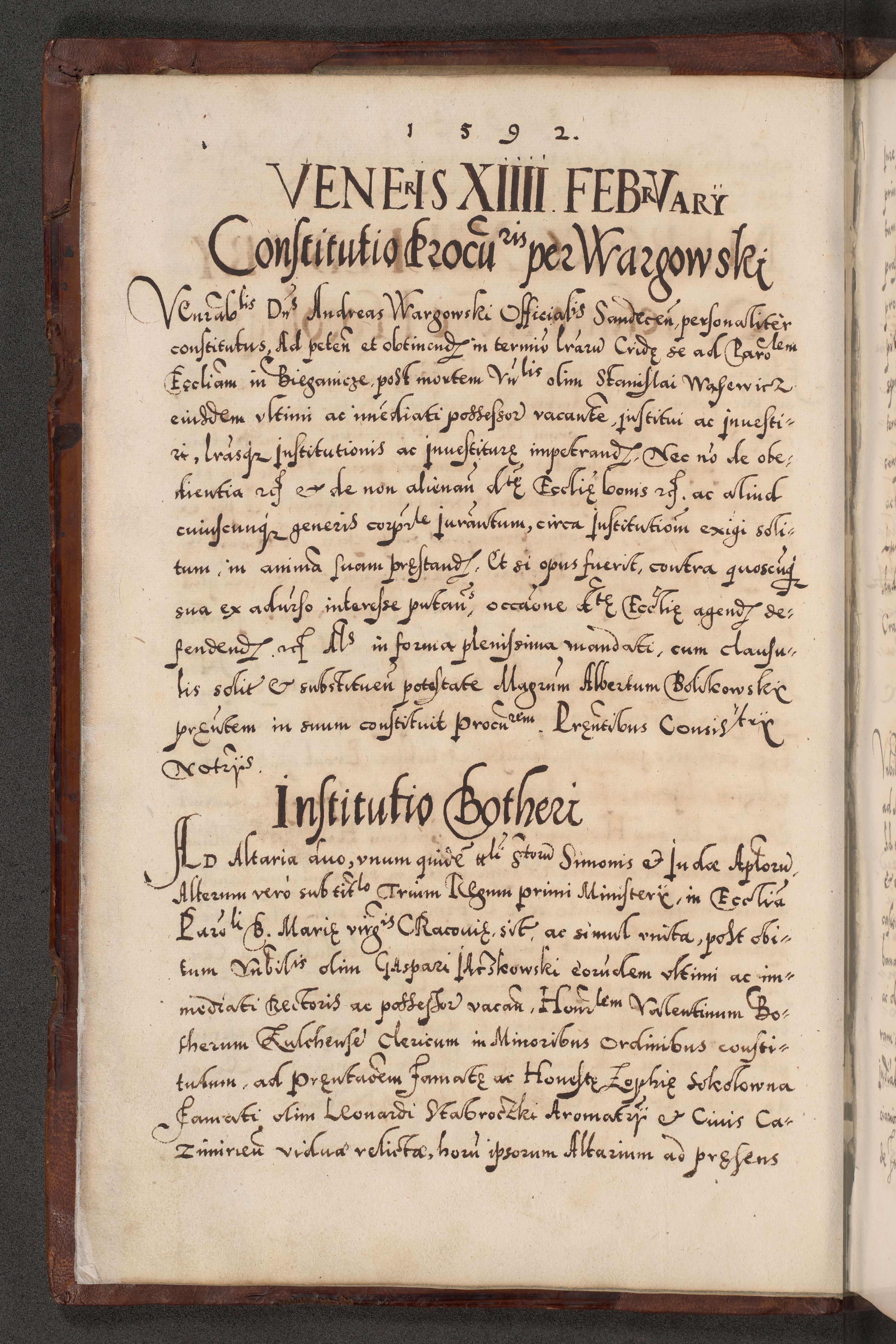 Illistrissimo et revedissimo in Christo Patre Domino Domino Georgio Rzadziwił Miserone Divina Sacrostae R. E. Tituli S. Sixti Presbitero Cardinali Duce in Olyka et Niesswiesz ad Gubernacula Ecclessiae Cracoviensis cuius administratorialem a Sancta Sede Apostolica obtinverat feliciter sedente. Acta actorum, causarum, sententiarum tam deffinitivarum quam interloquutoriarum decretorum, obligationum, quietationum, recognitionum, constitutionum procuratorum etc. coram Reverendo Domino Stanislao Crassinskz de Crasne Archidiacono Cracoviensis, Scholastico Gnesnesis, Custode Plocensis etc. Vicario et Officiali Generali Cracoviensi in Ano Domini Millesimo Quingentesimo Nonagesimo Primo cuius indictio quarta pontificatus SS. Domini Nostri Gregorii XIIII Anno I psius prio feliciter incipiut