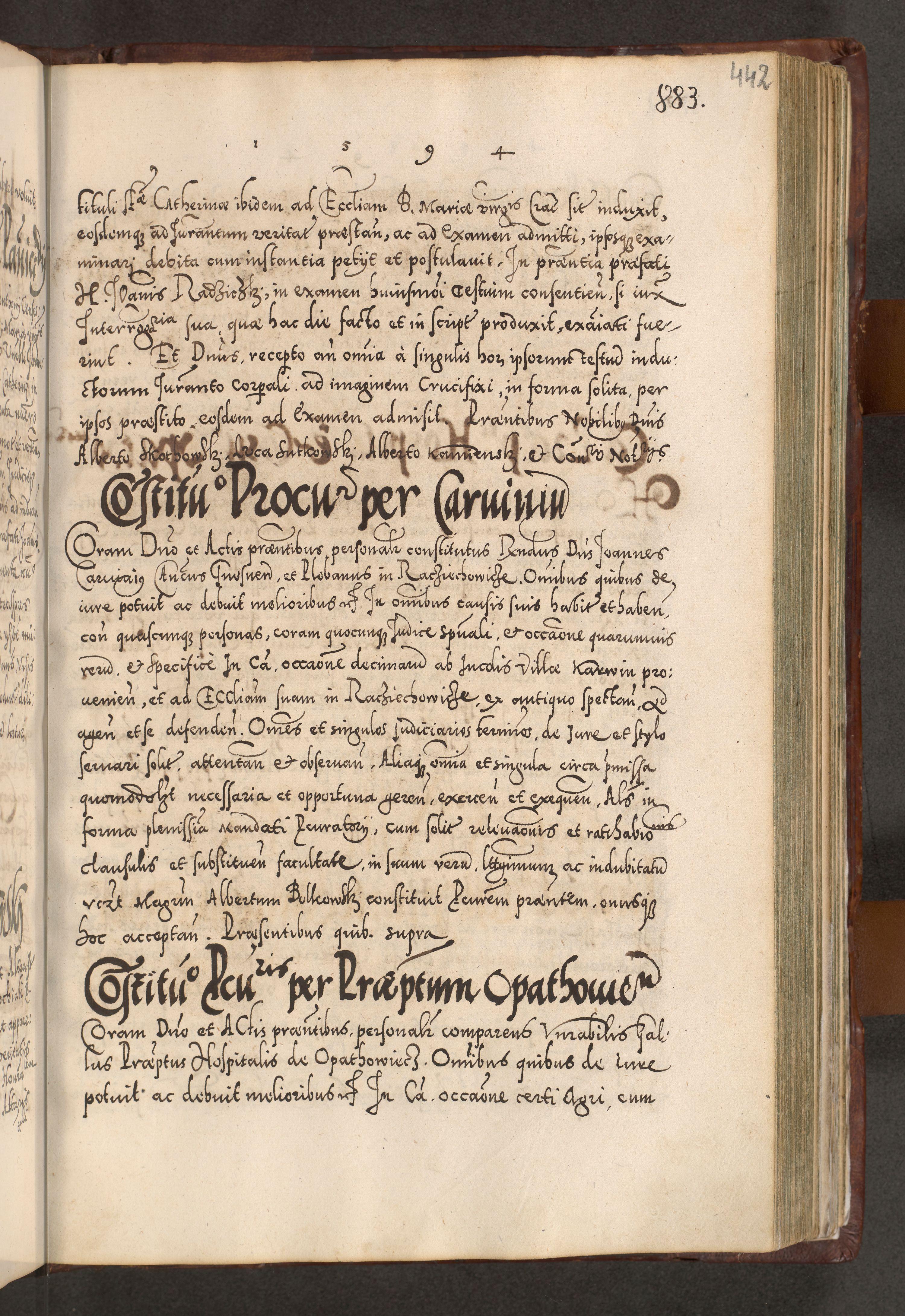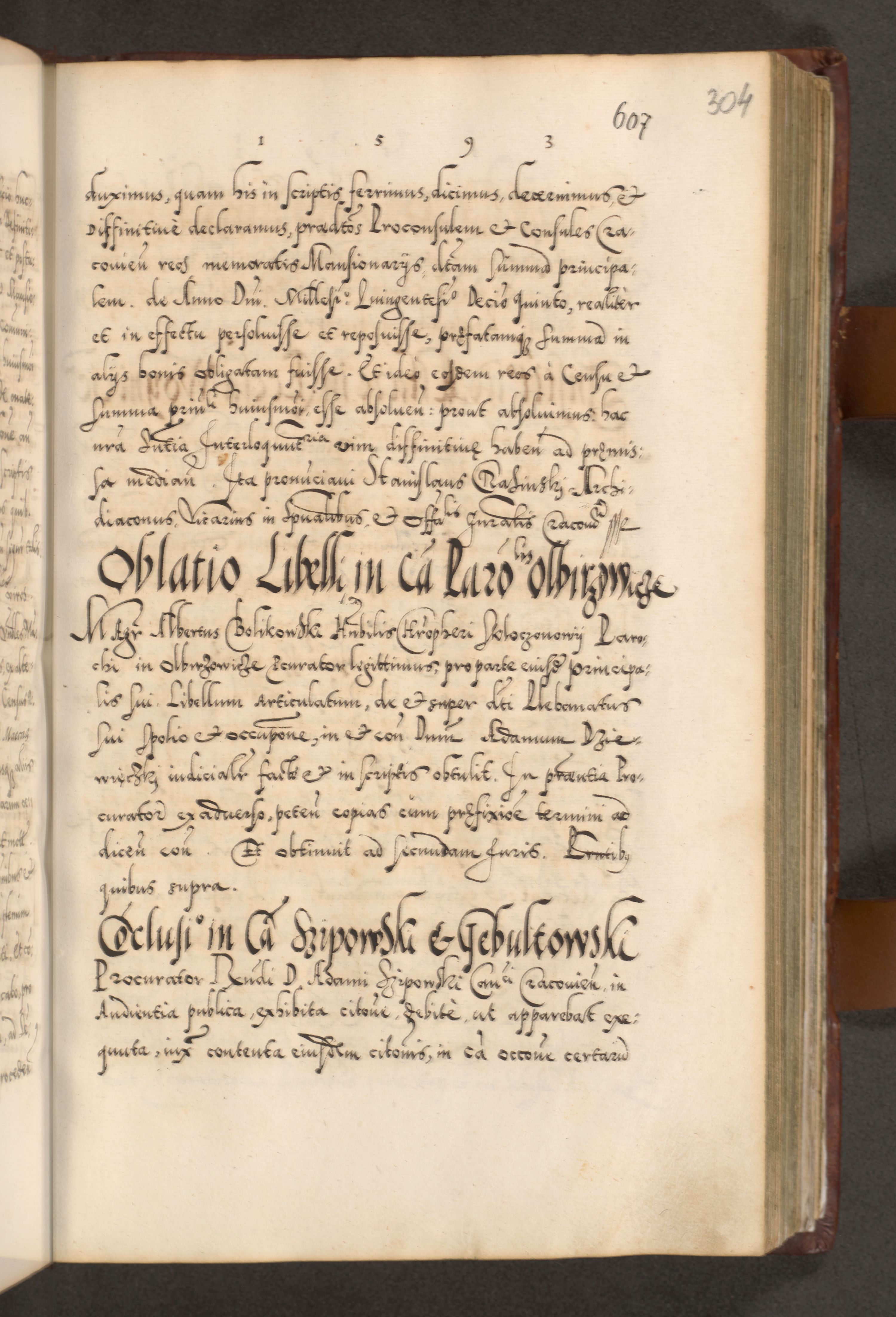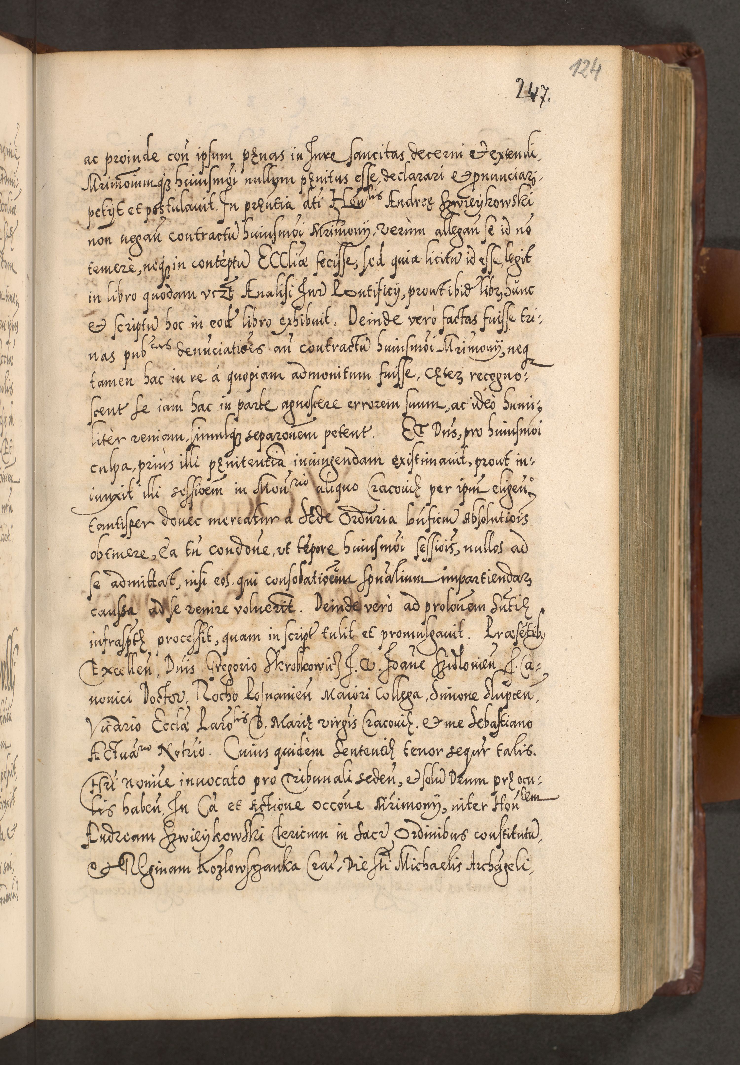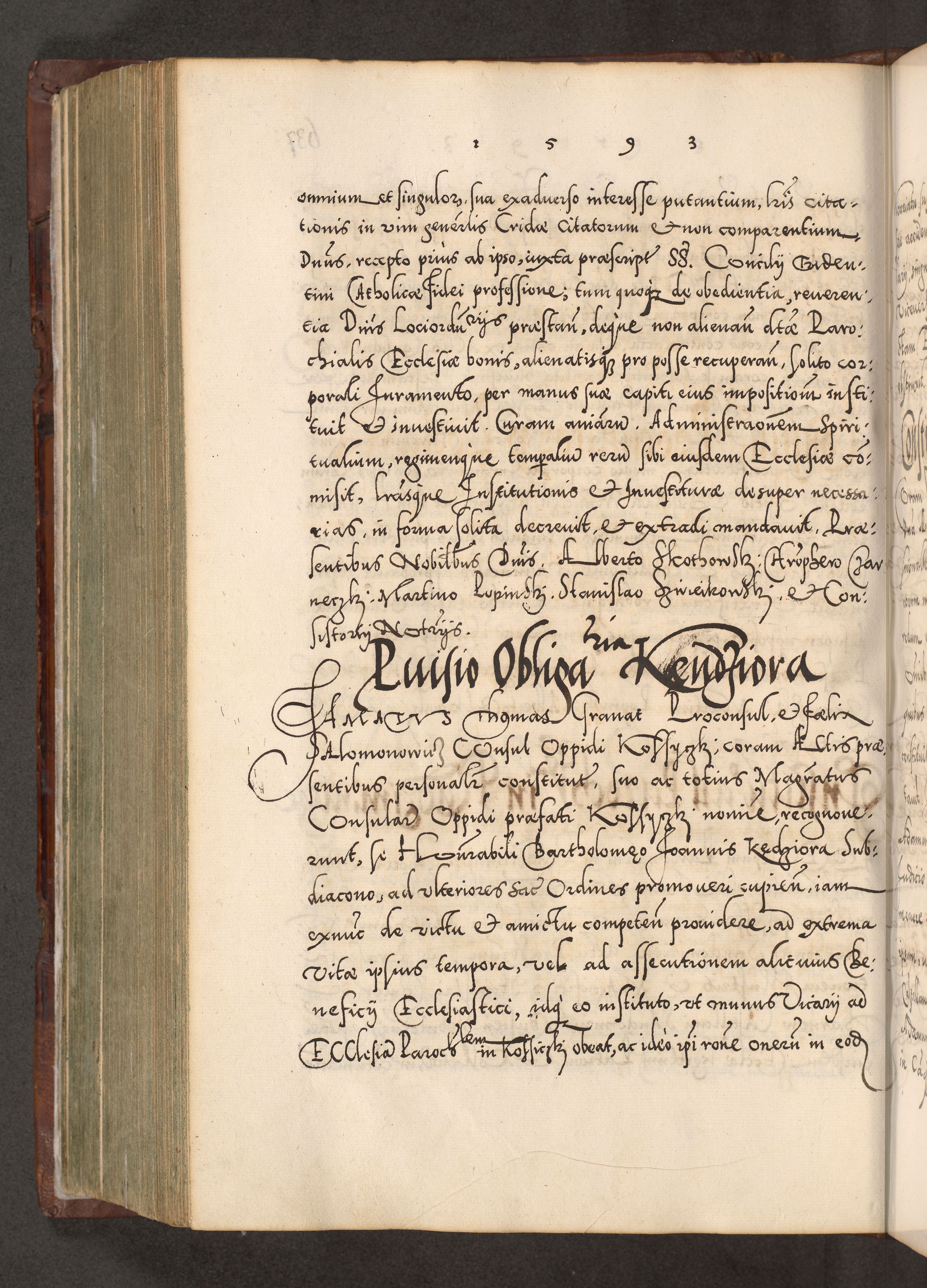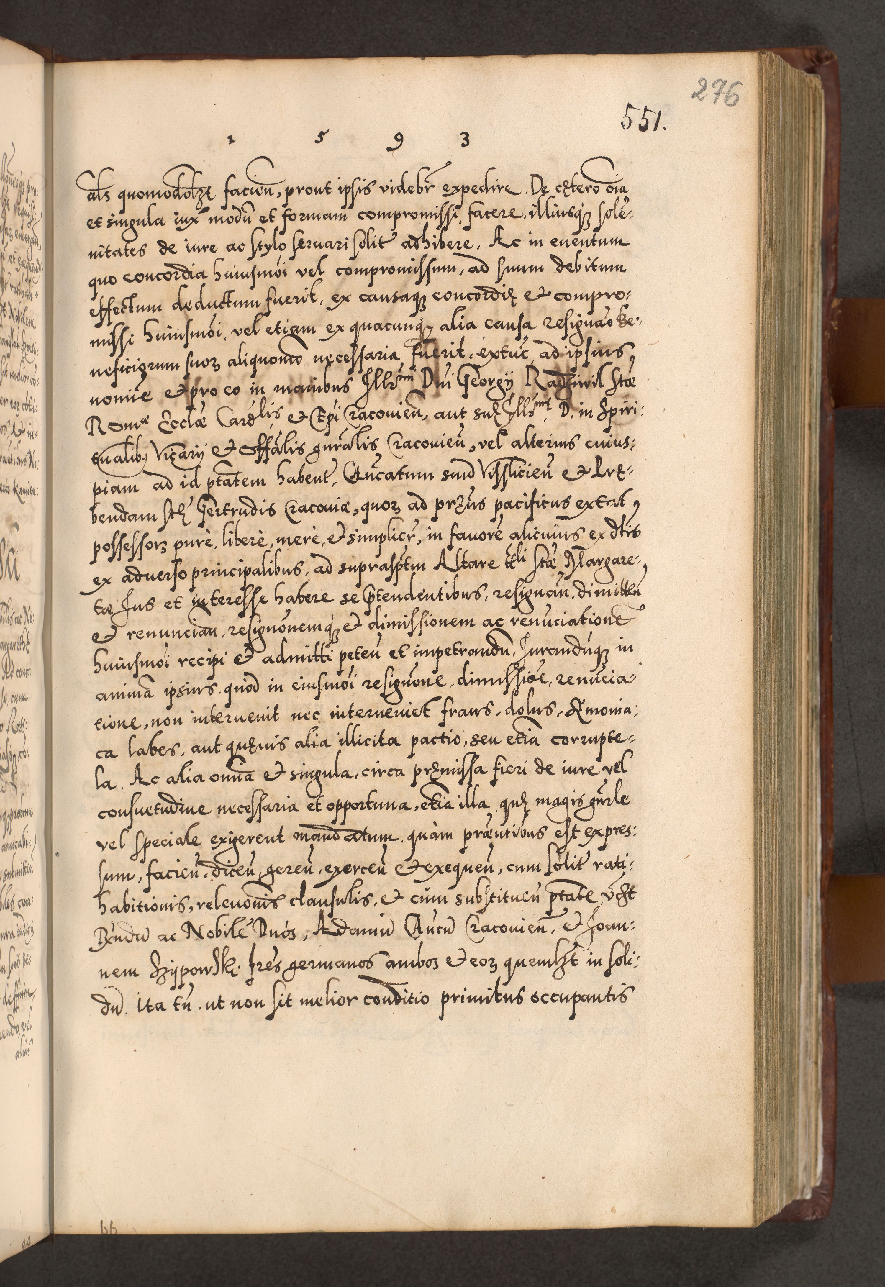 Illistrissimo et revedissimo in Christo Patre Domino Domino Georgio Rzadziwił Miserone Divina Sacrostae R. E. Tituli S. Sixti Presbitero Cardinali Duce in Olyka et Niesswiesz ad Gubernacula Ecclessiae Cracoviensis cuius administratorialem a Sancta Sede Apostolica obtinverat feliciter sedente. Acta actorum, causarum, sententiarum tam deffinitivarum quam interloquutoriarum decretorum, obligationum, quietationum, recognitionum, constitutionum procuratorum etc. coram Reverendo Domino Stanislao Crassinskz de Crasne Archidiacono Cracoviensis, Scholastico Gnesnesis, Custode Plocensis etc. Vicario et Officiali Generali Cracoviensi in Ano Domini Millesimo Quingentesimo Nonagesimo Primo cuius indictio quarta pontificatus SS. Domini Nostri Gregorii XIIII Anno I psius prio feliciter incipiut