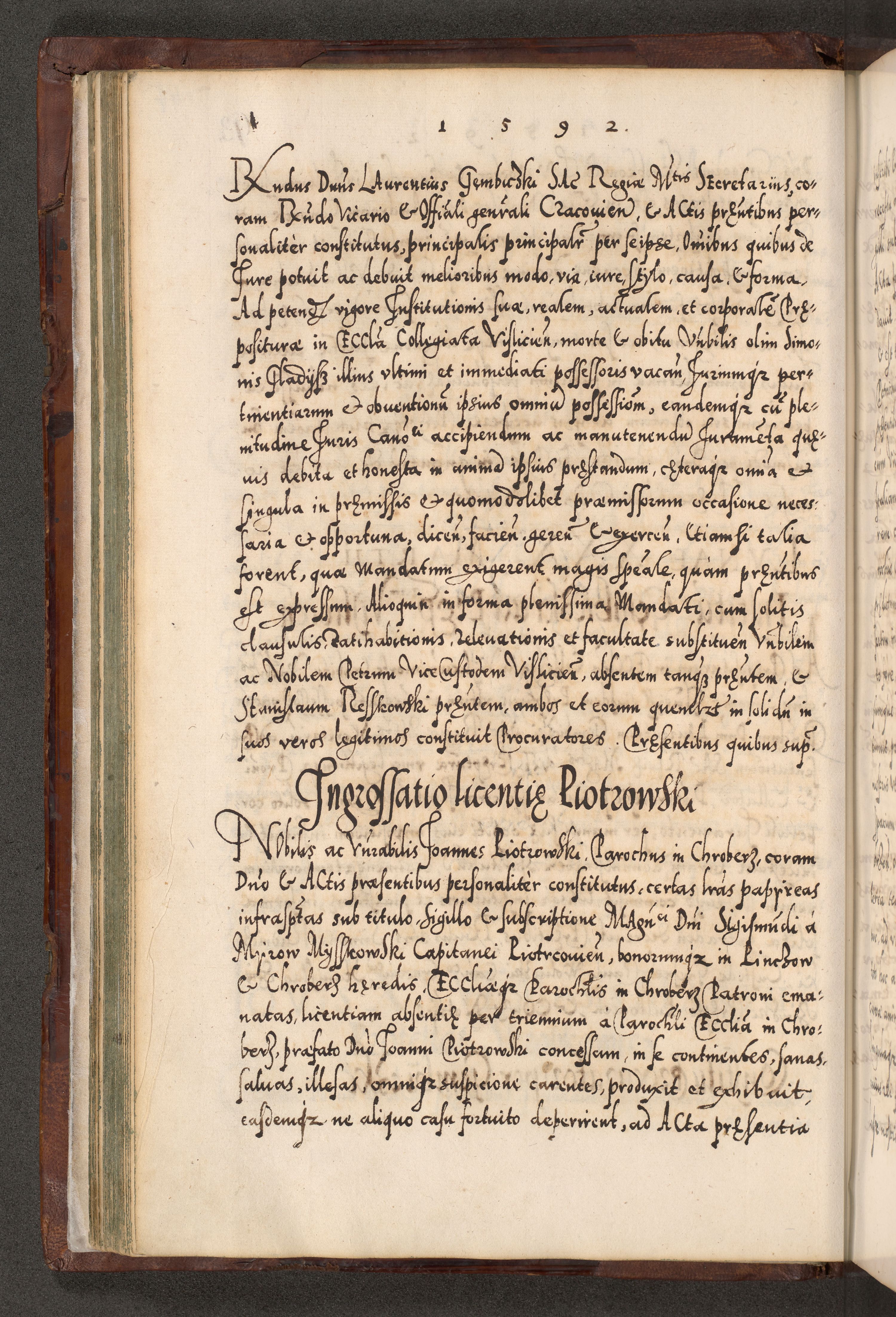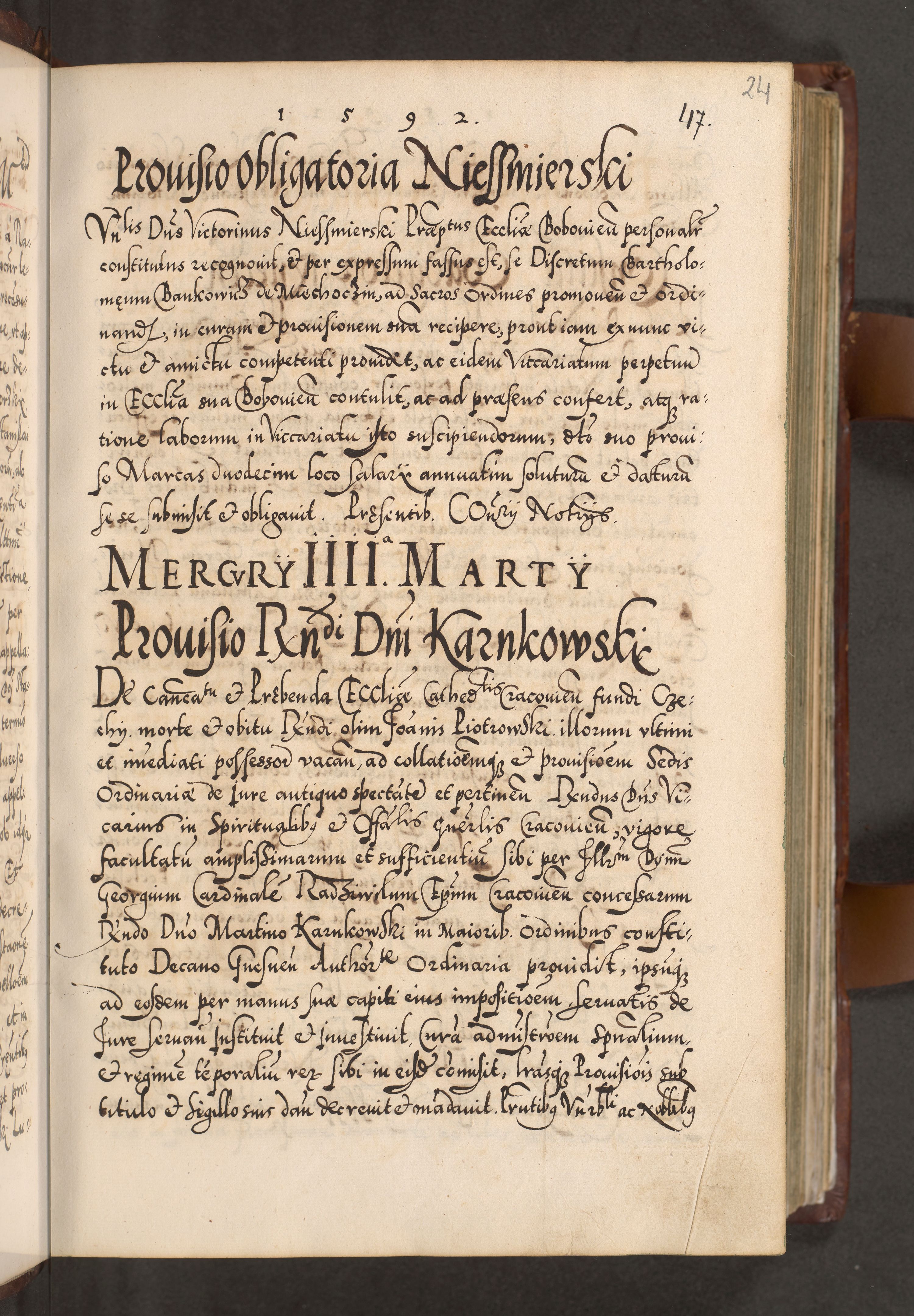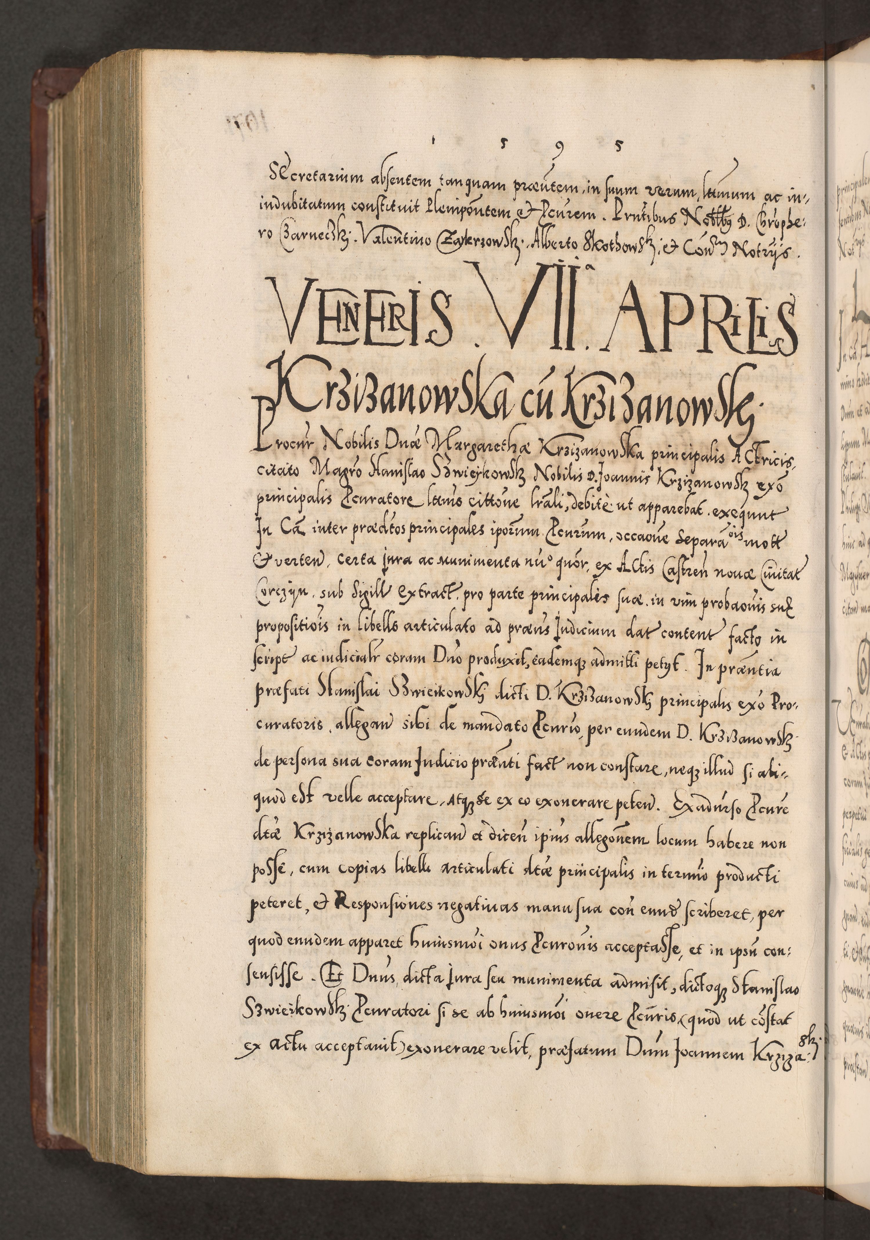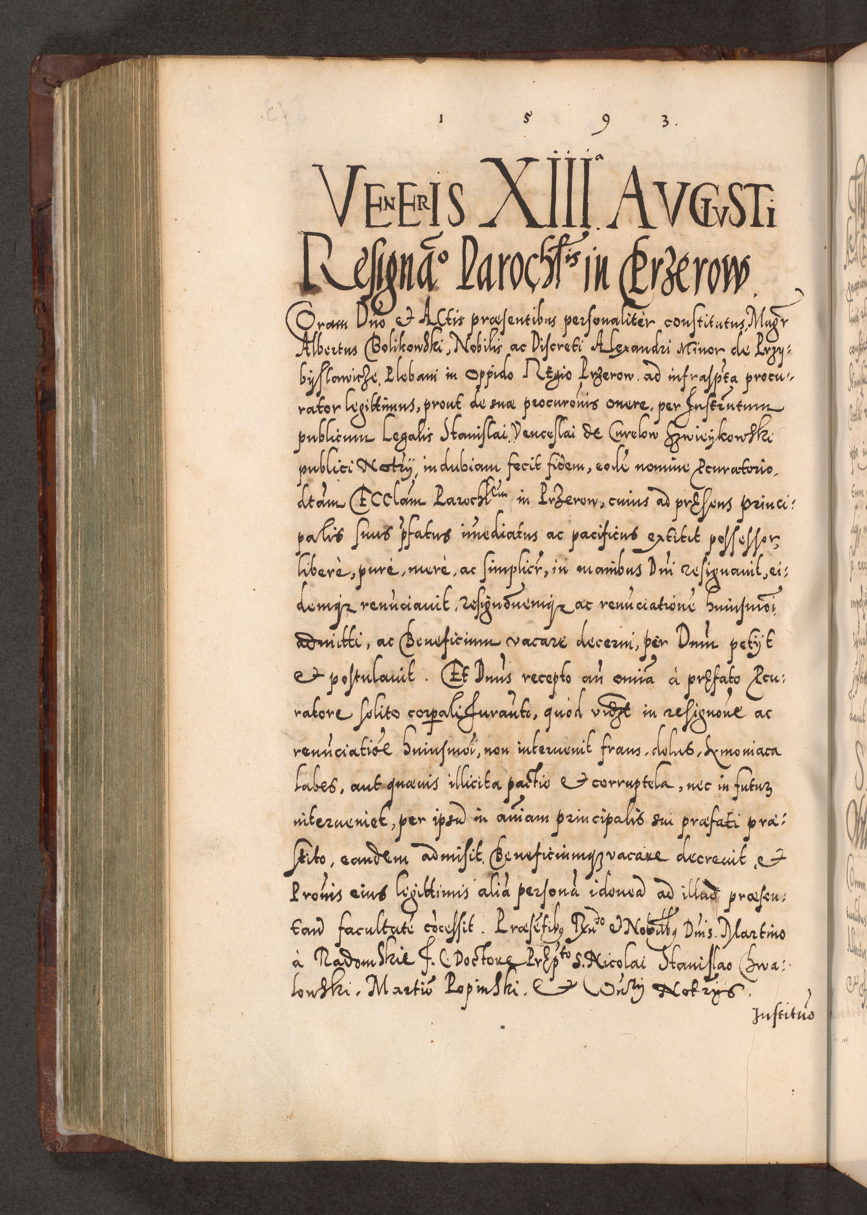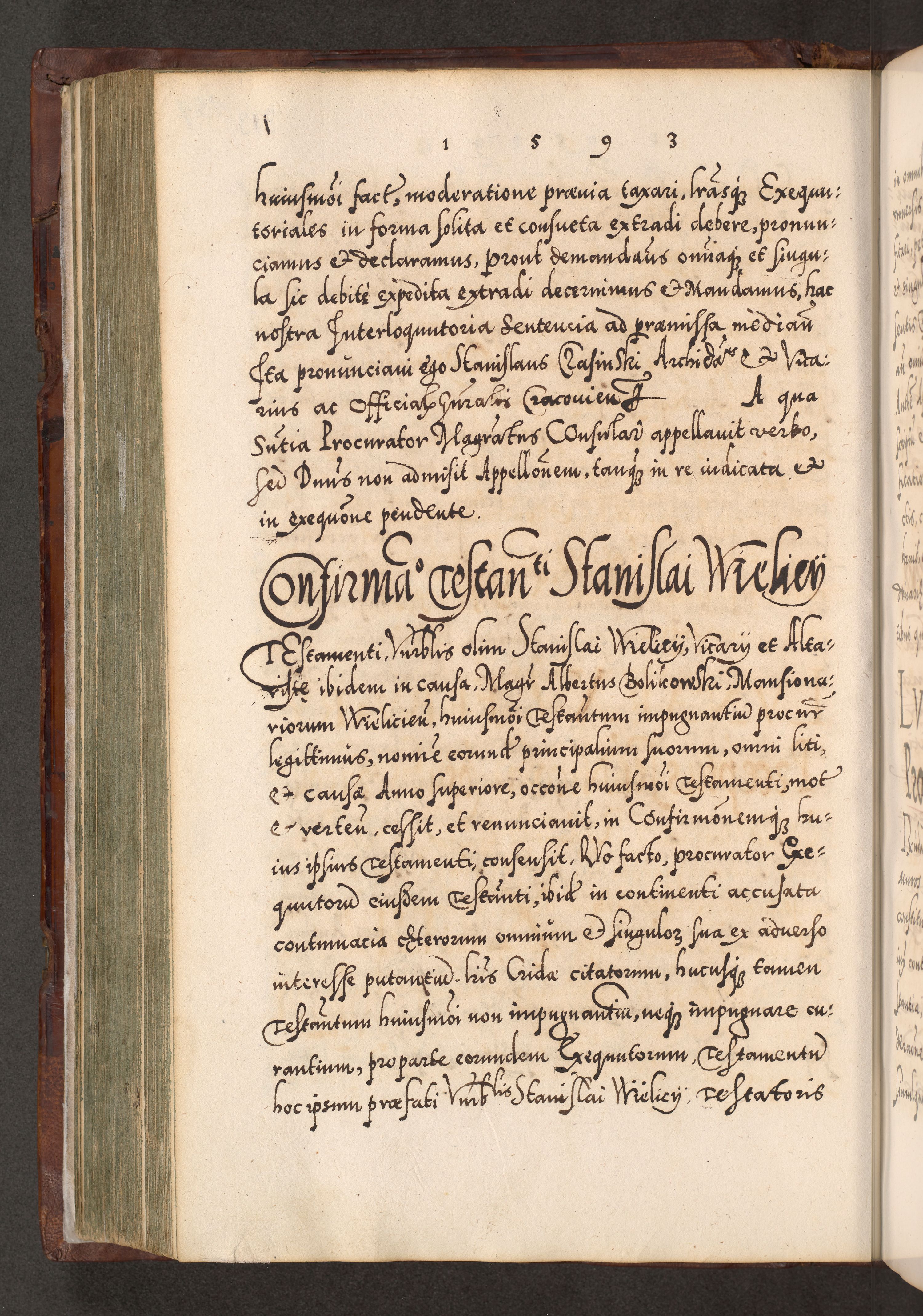 Illistrissimo et revedissimo in Christo Patre Domino Domino Georgio Rzadziwił Miserone Divina Sacrostae R. E. Tituli S. Sixti Presbitero Cardinali Duce in Olyka et Niesswiesz ad Gubernacula Ecclessiae Cracoviensis cuius administratorialem a Sancta Sede Apostolica obtinverat feliciter sedente. Acta actorum, causarum, sententiarum tam deffinitivarum quam interloquutoriarum decretorum, obligationum, quietationum, recognitionum, constitutionum procuratorum etc. coram Reverendo Domino Stanislao Crassinskz de Crasne Archidiacono Cracoviensis, Scholastico Gnesnesis, Custode Plocensis etc. Vicario et Officiali Generali Cracoviensi in Ano Domini Millesimo Quingentesimo Nonagesimo Primo cuius indictio quarta pontificatus SS. Domini Nostri Gregorii XIIII Anno I psius prio feliciter incipiut