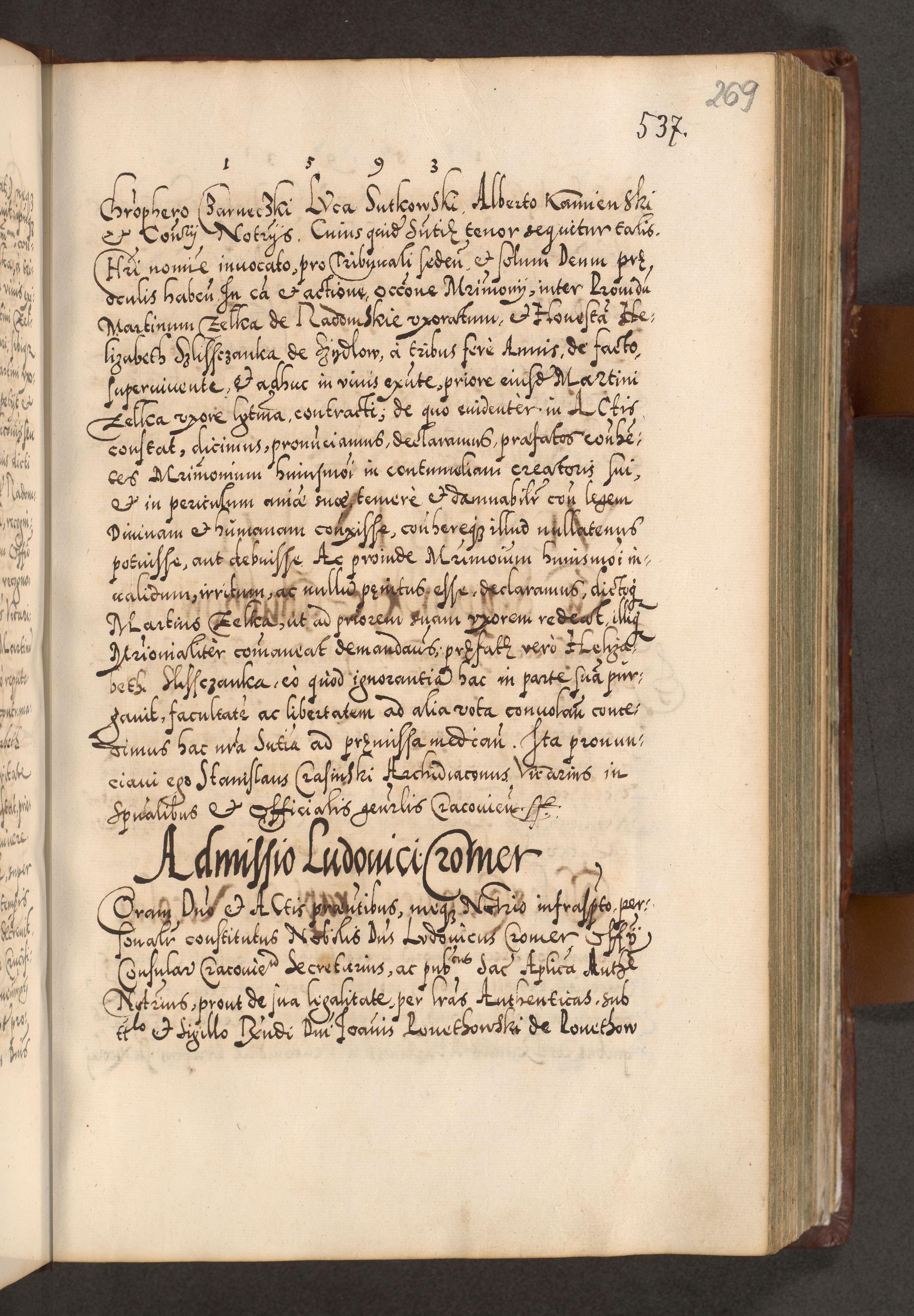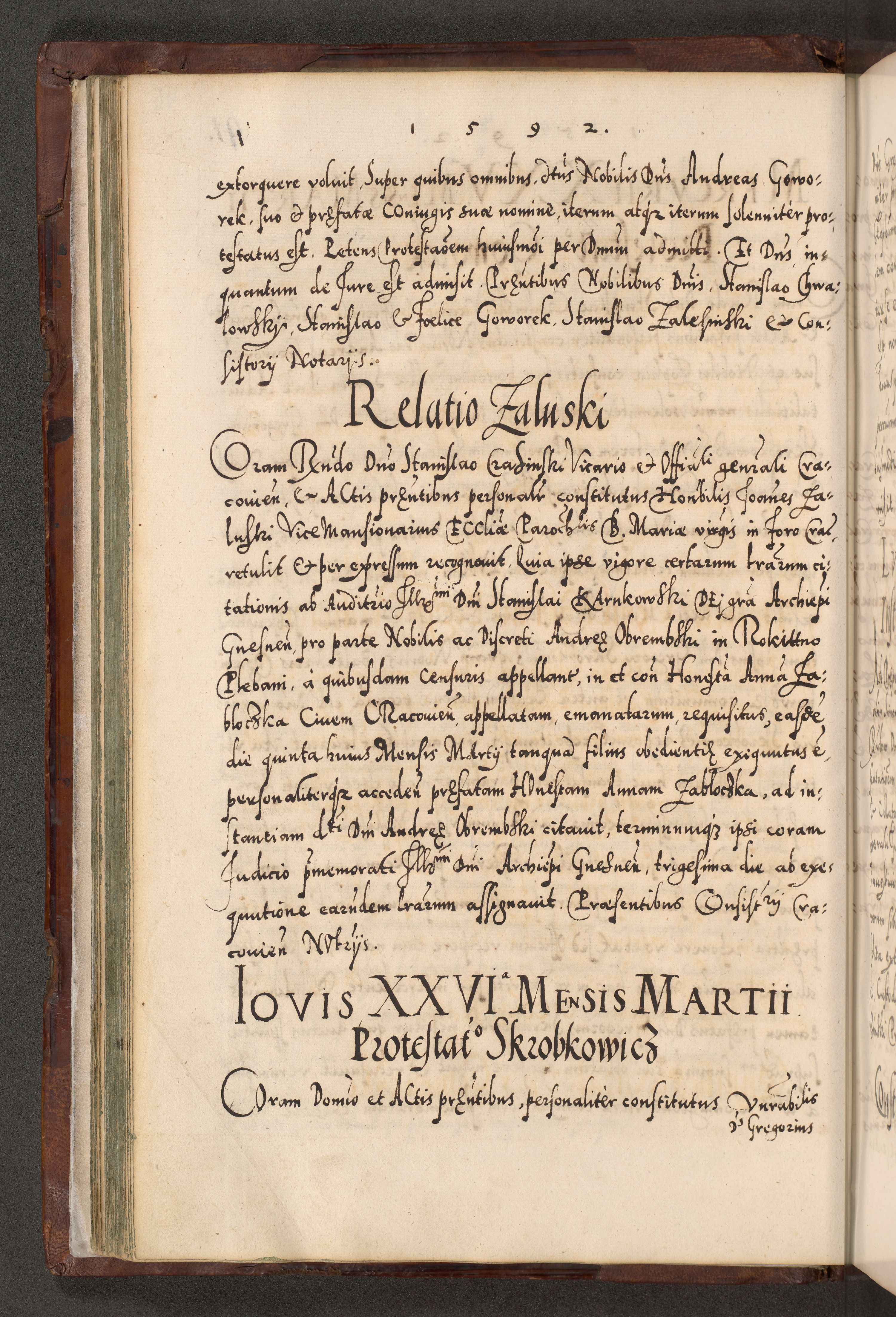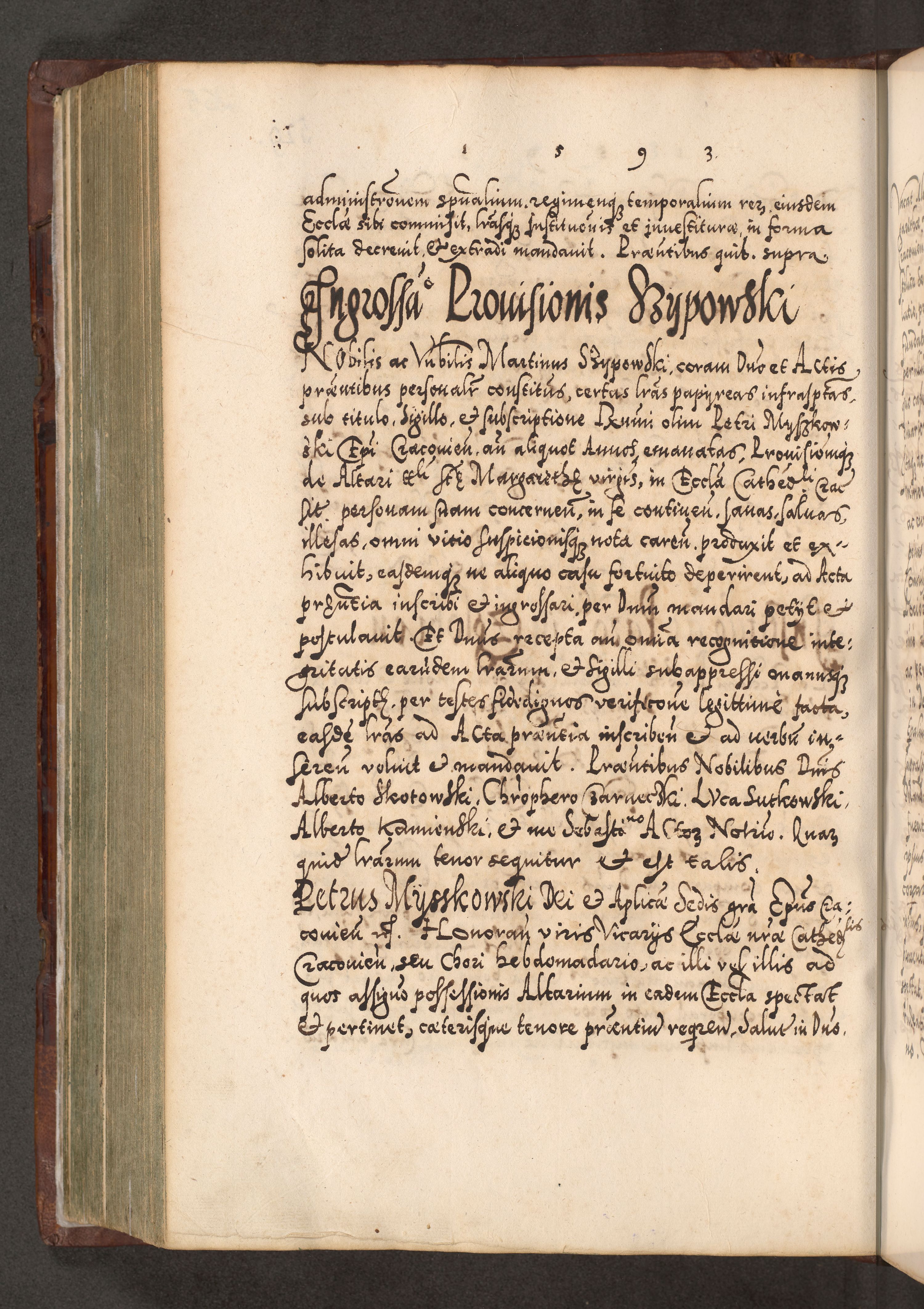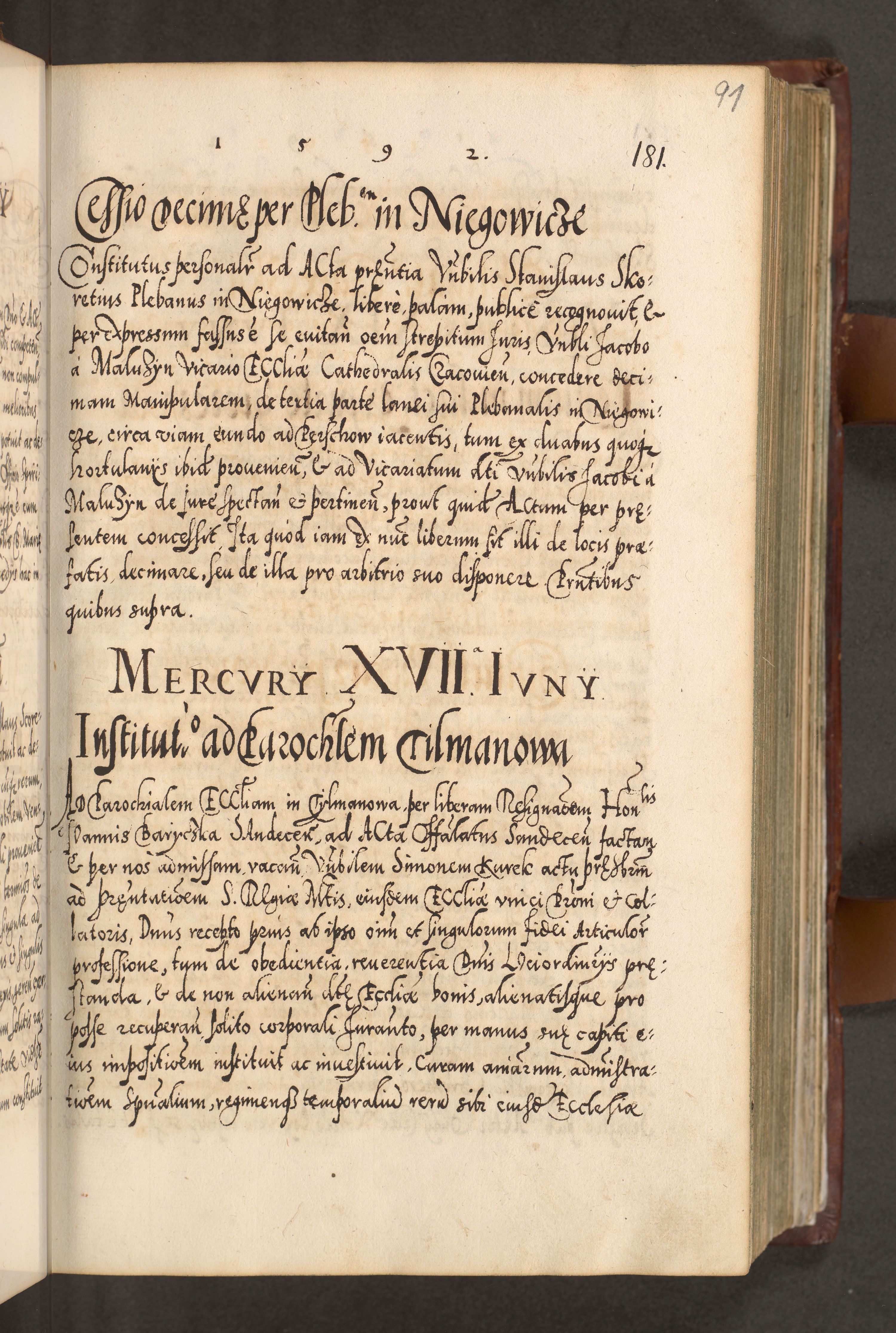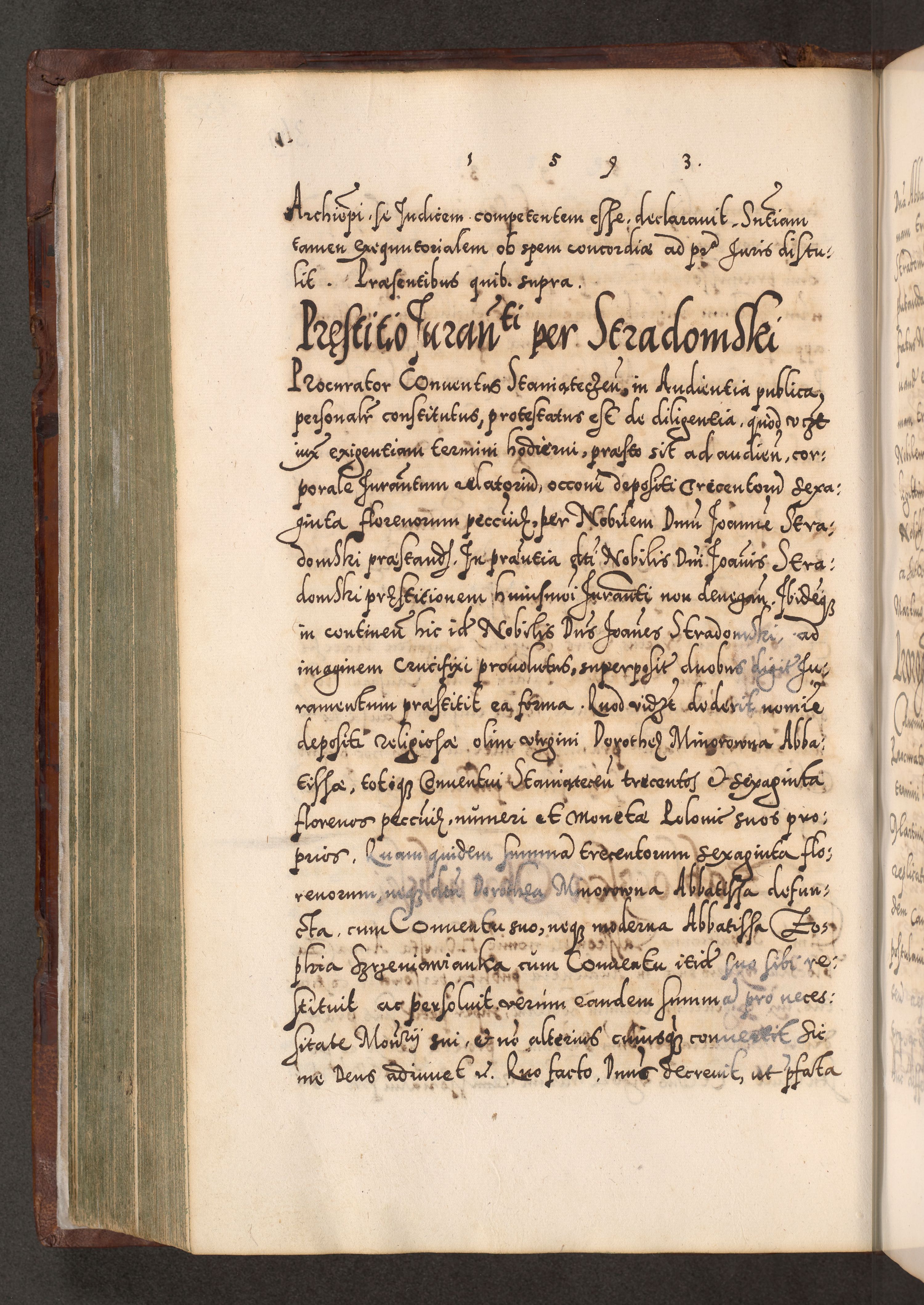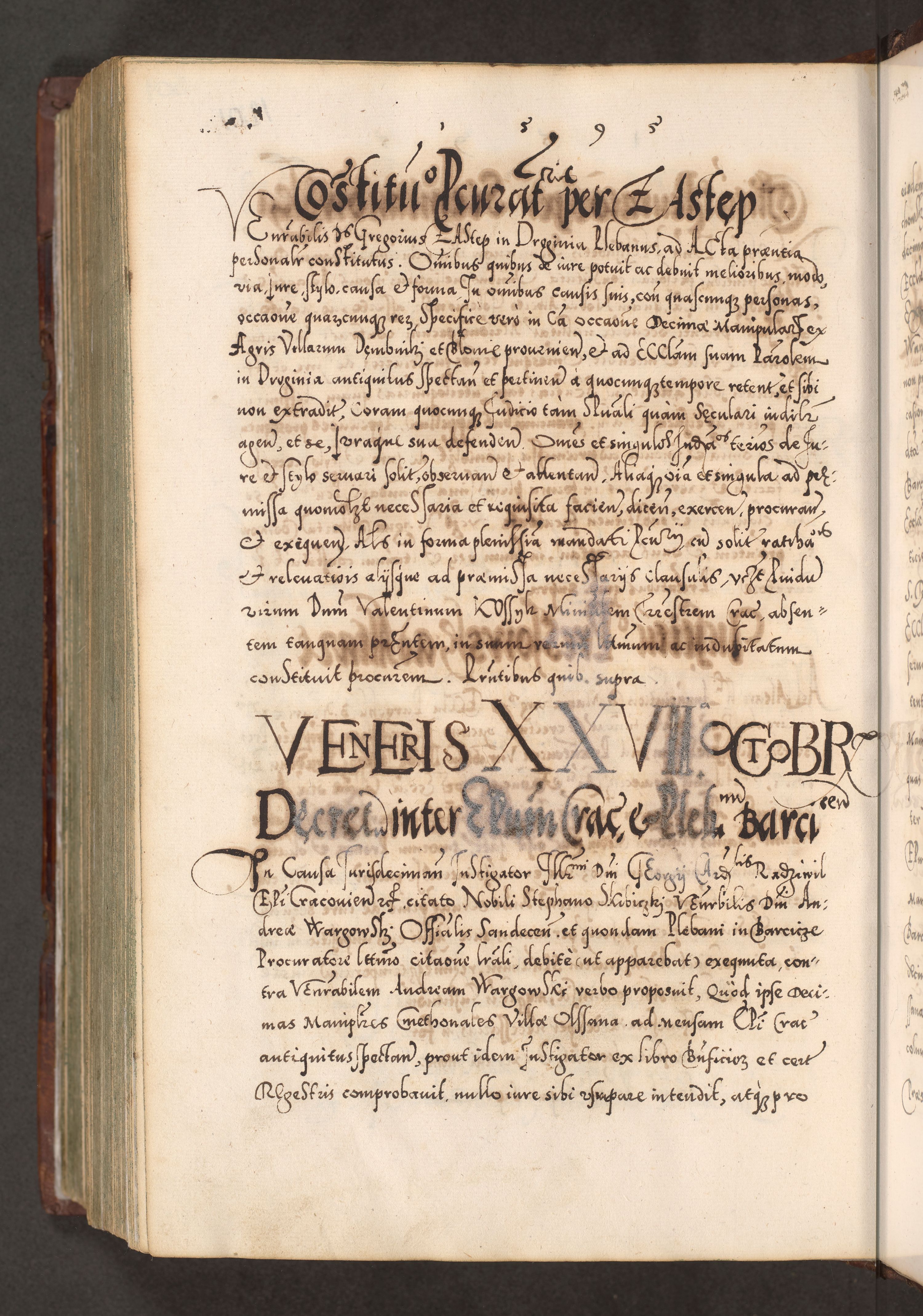 Illistrissimo et revedissimo in Christo Patre Domino Domino Georgio Rzadziwił Miserone Divina Sacrostae R. E. Tituli S. Sixti Presbitero Cardinali Duce in Olyka et Niesswiesz ad Gubernacula Ecclessiae Cracoviensis cuius administratorialem a Sancta Sede Apostolica obtinverat feliciter sedente. Acta actorum, causarum, sententiarum tam deffinitivarum quam interloquutoriarum decretorum, obligationum, quietationum, recognitionum, constitutionum procuratorum etc. coram Reverendo Domino Stanislao Crassinskz de Crasne Archidiacono Cracoviensis, Scholastico Gnesnesis, Custode Plocensis etc. Vicario et Officiali Generali Cracoviensi in Ano Domini Millesimo Quingentesimo Nonagesimo Primo cuius indictio quarta pontificatus SS. Domini Nostri Gregorii XIIII Anno I psius prio feliciter incipiut