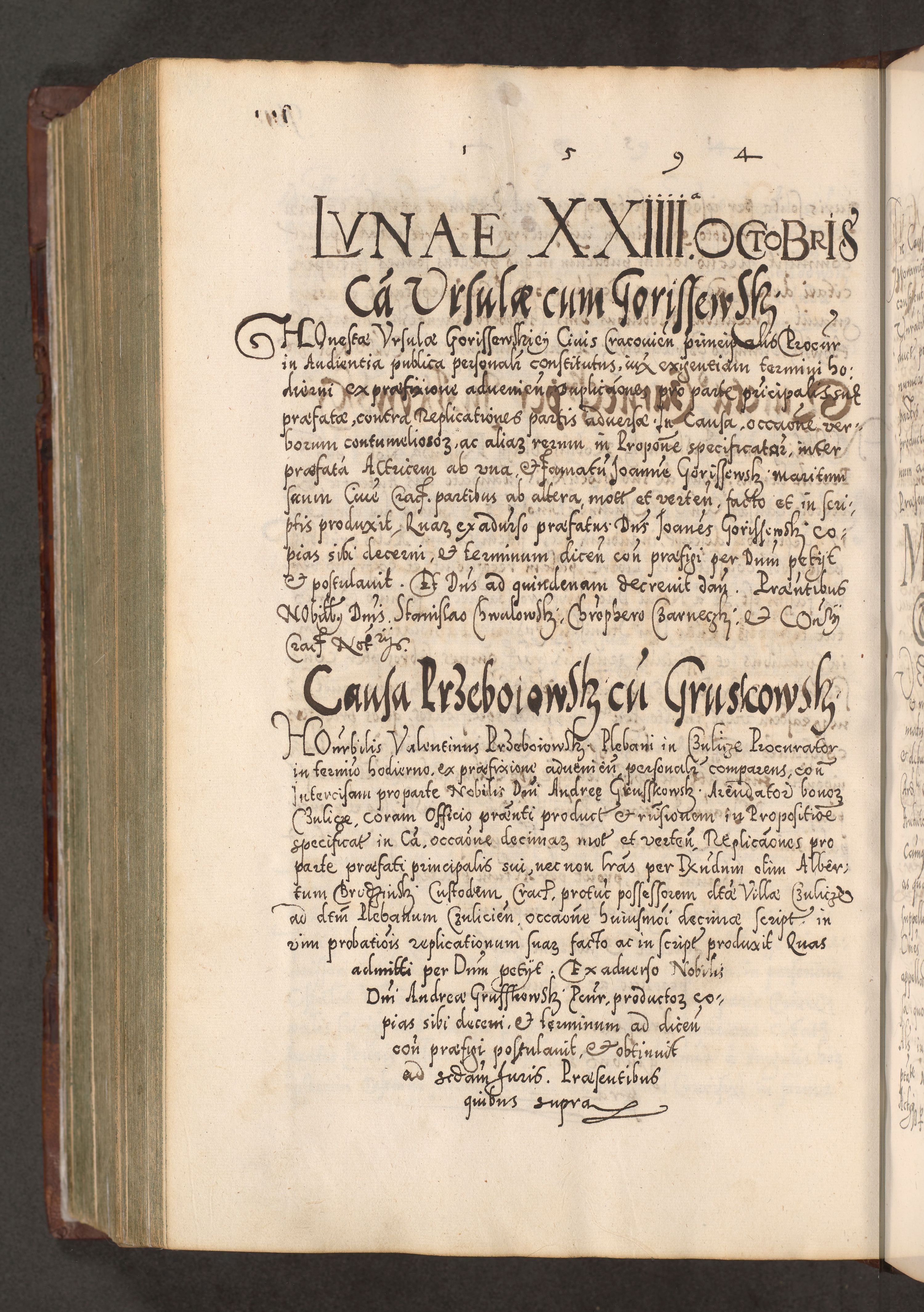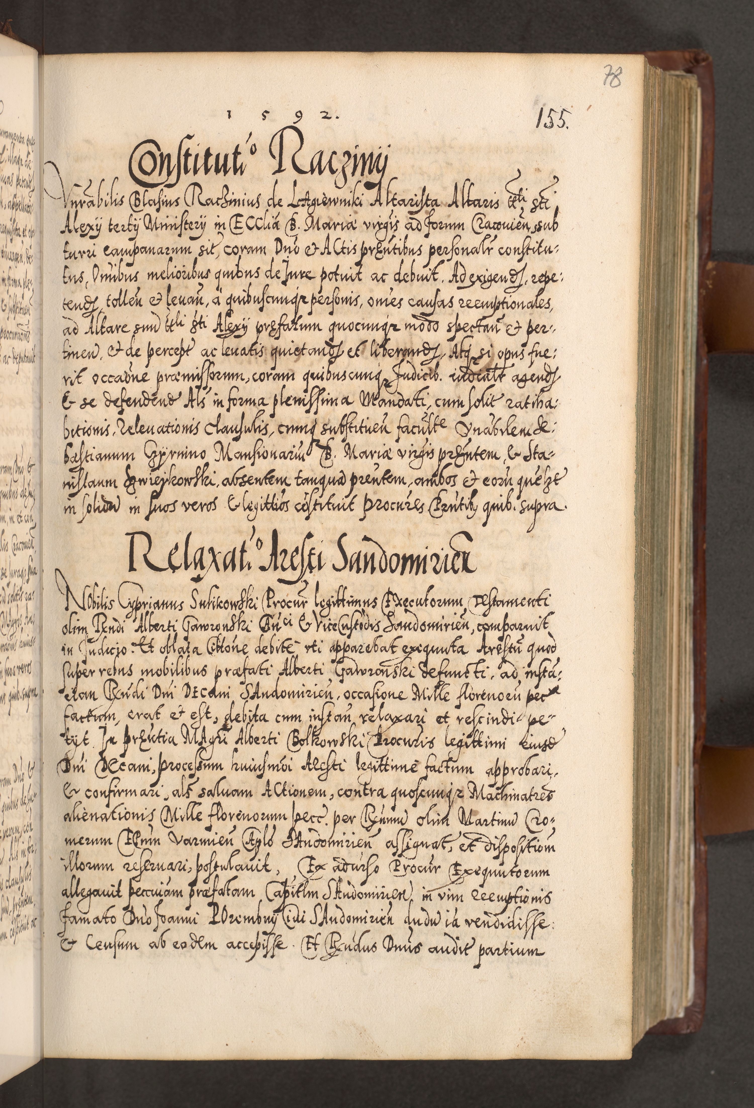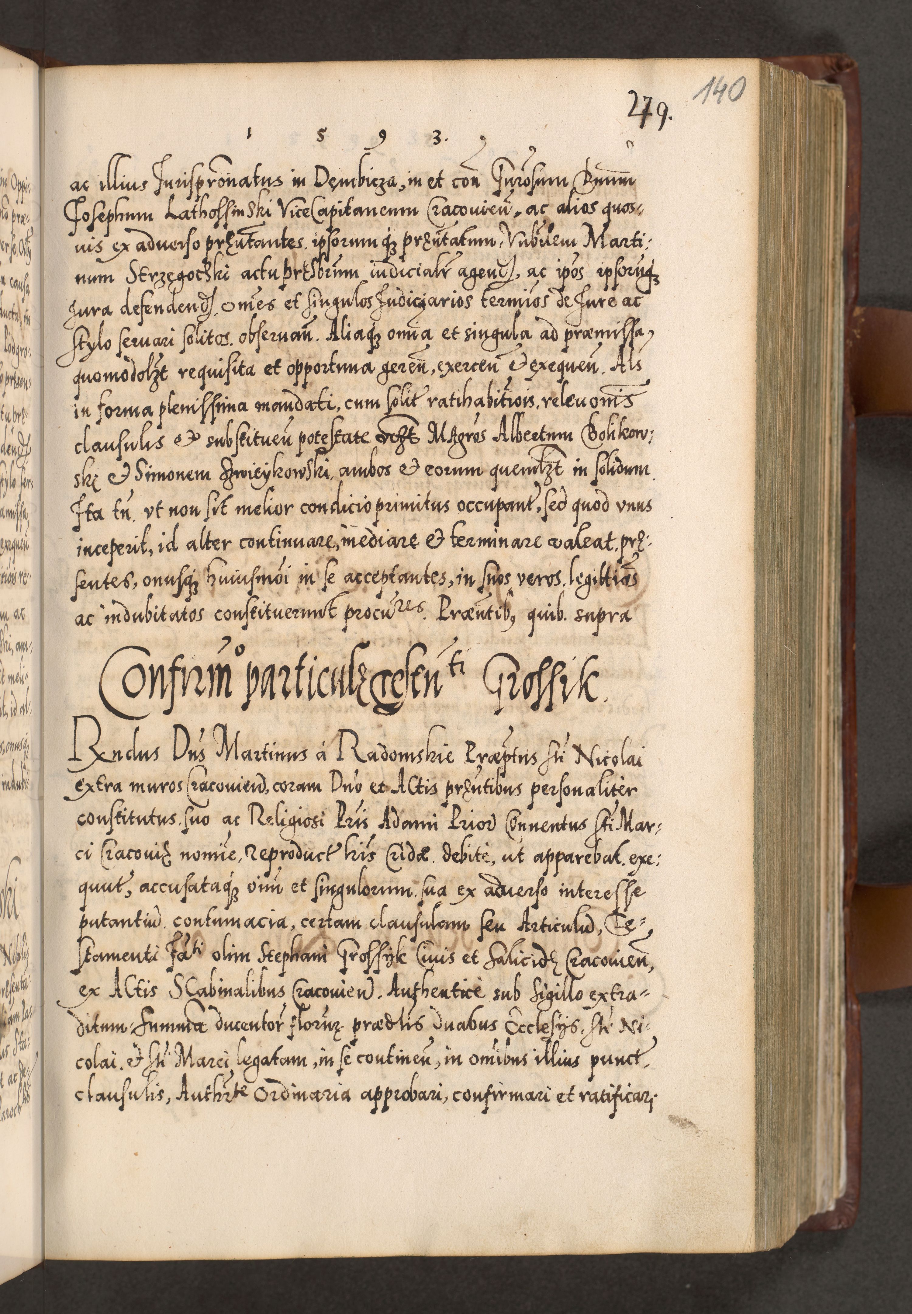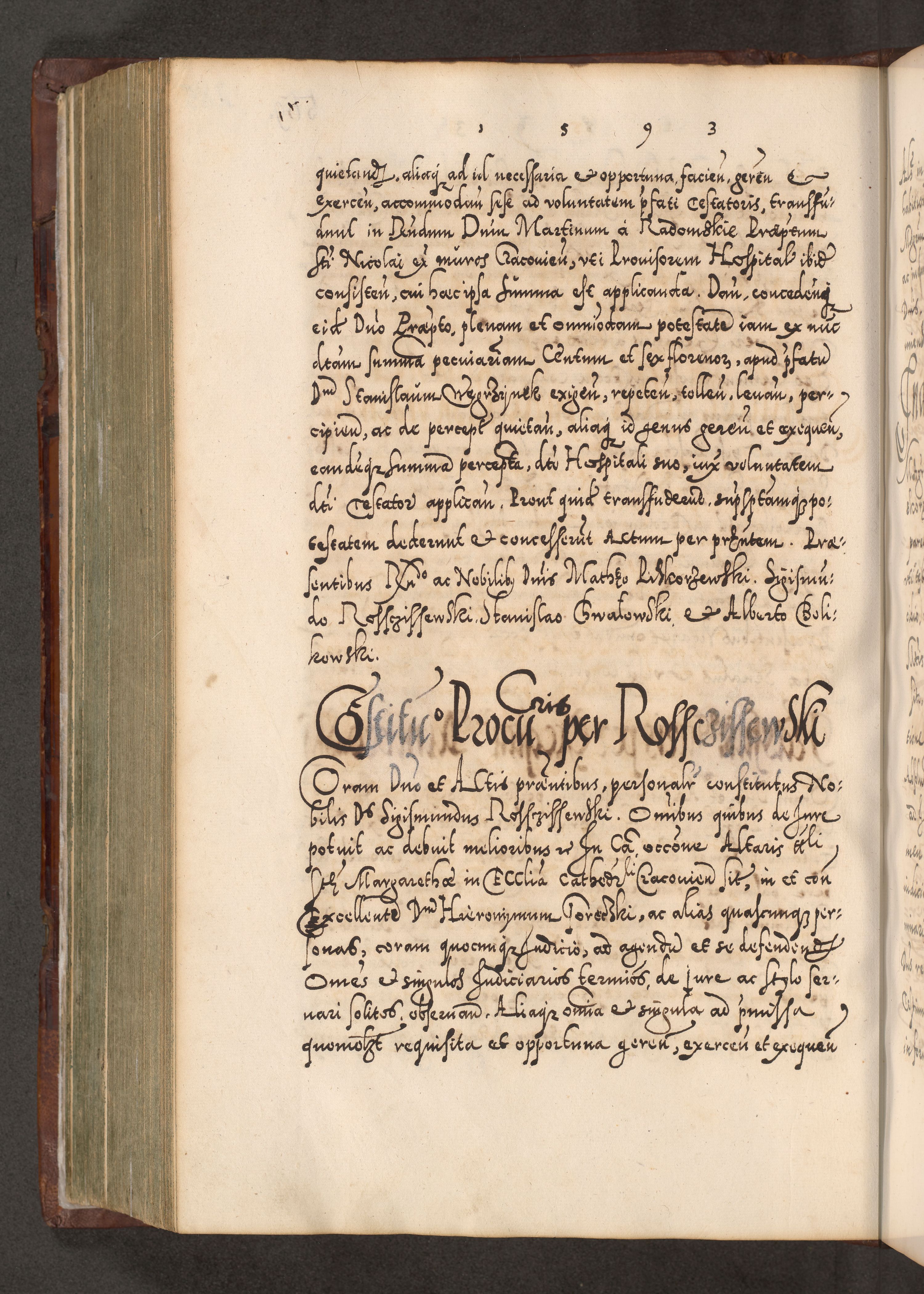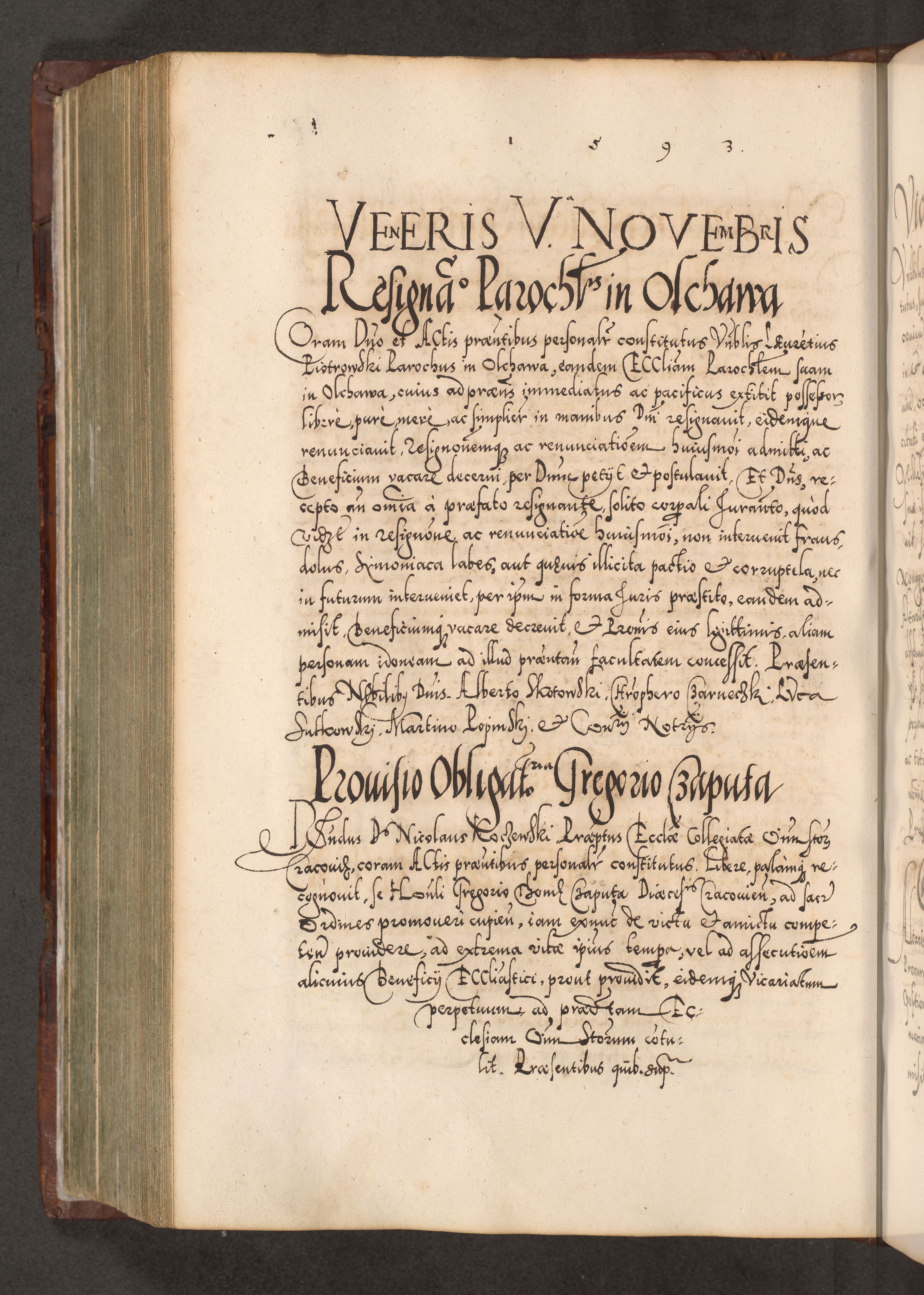 Illistrissimo et revedissimo in Christo Patre Domino Domino Georgio Rzadziwił Miserone Divina Sacrostae R. E. Tituli S. Sixti Presbitero Cardinali Duce in Olyka et Niesswiesz ad Gubernacula Ecclessiae Cracoviensis cuius administratorialem a Sancta Sede Apostolica obtinverat feliciter sedente. Acta actorum, causarum, sententiarum tam deffinitivarum quam interloquutoriarum decretorum, obligationum, quietationum, recognitionum, constitutionum procuratorum etc. coram Reverendo Domino Stanislao Crassinskz de Crasne Archidiacono Cracoviensis, Scholastico Gnesnesis, Custode Plocensis etc. Vicario et Officiali Generali Cracoviensi in Ano Domini Millesimo Quingentesimo Nonagesimo Primo cuius indictio quarta pontificatus SS. Domini Nostri Gregorii XIIII Anno I psius prio feliciter incipiut