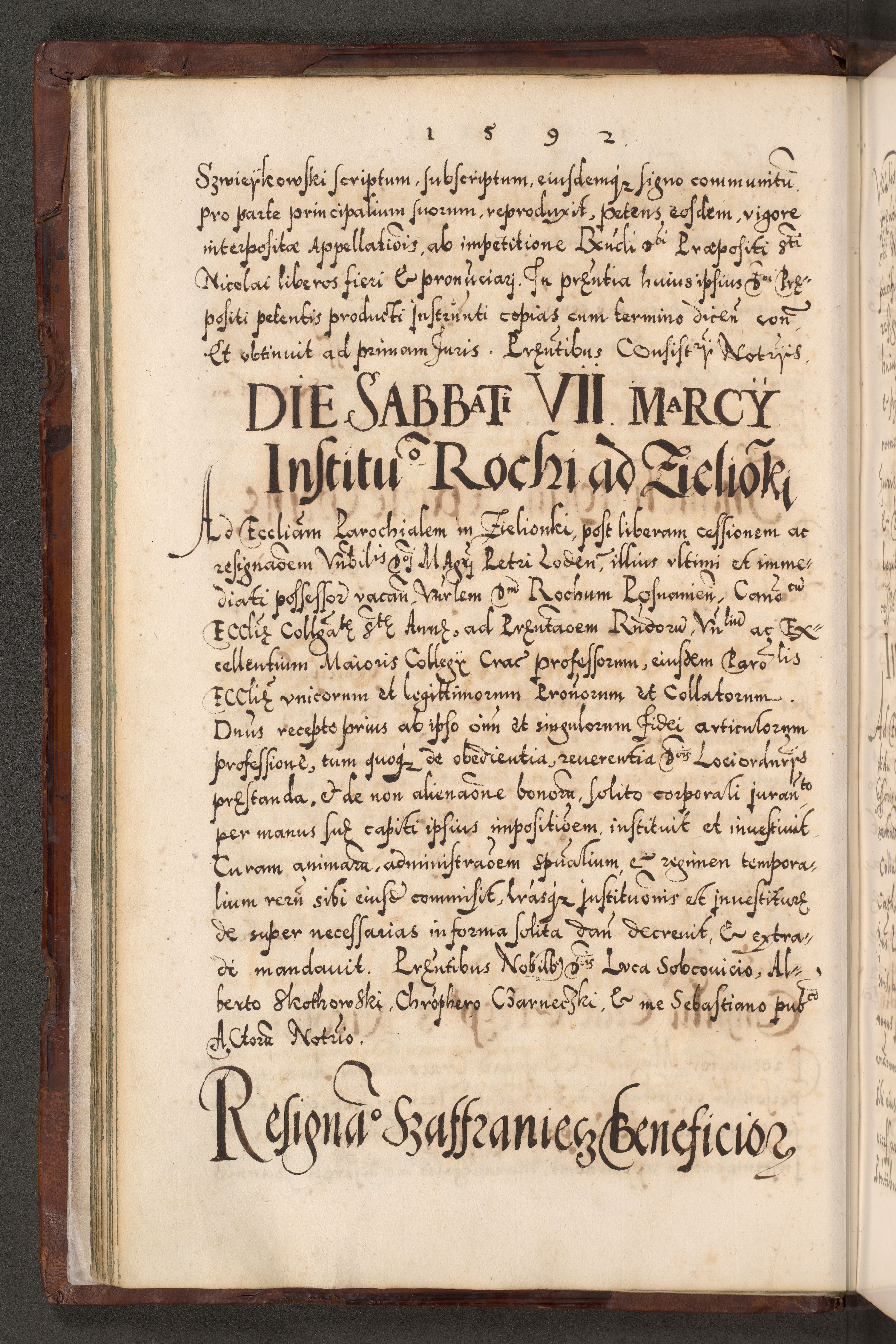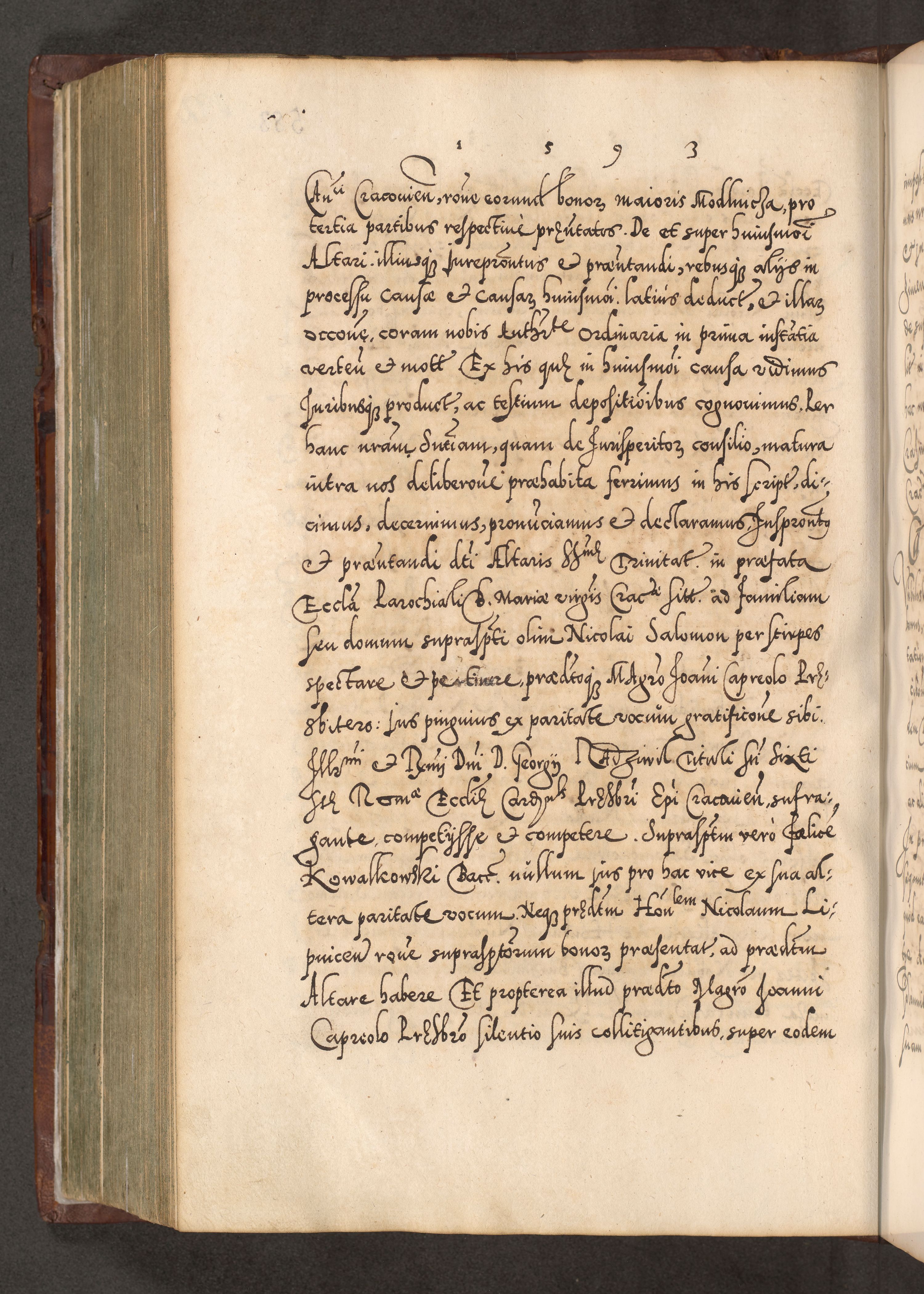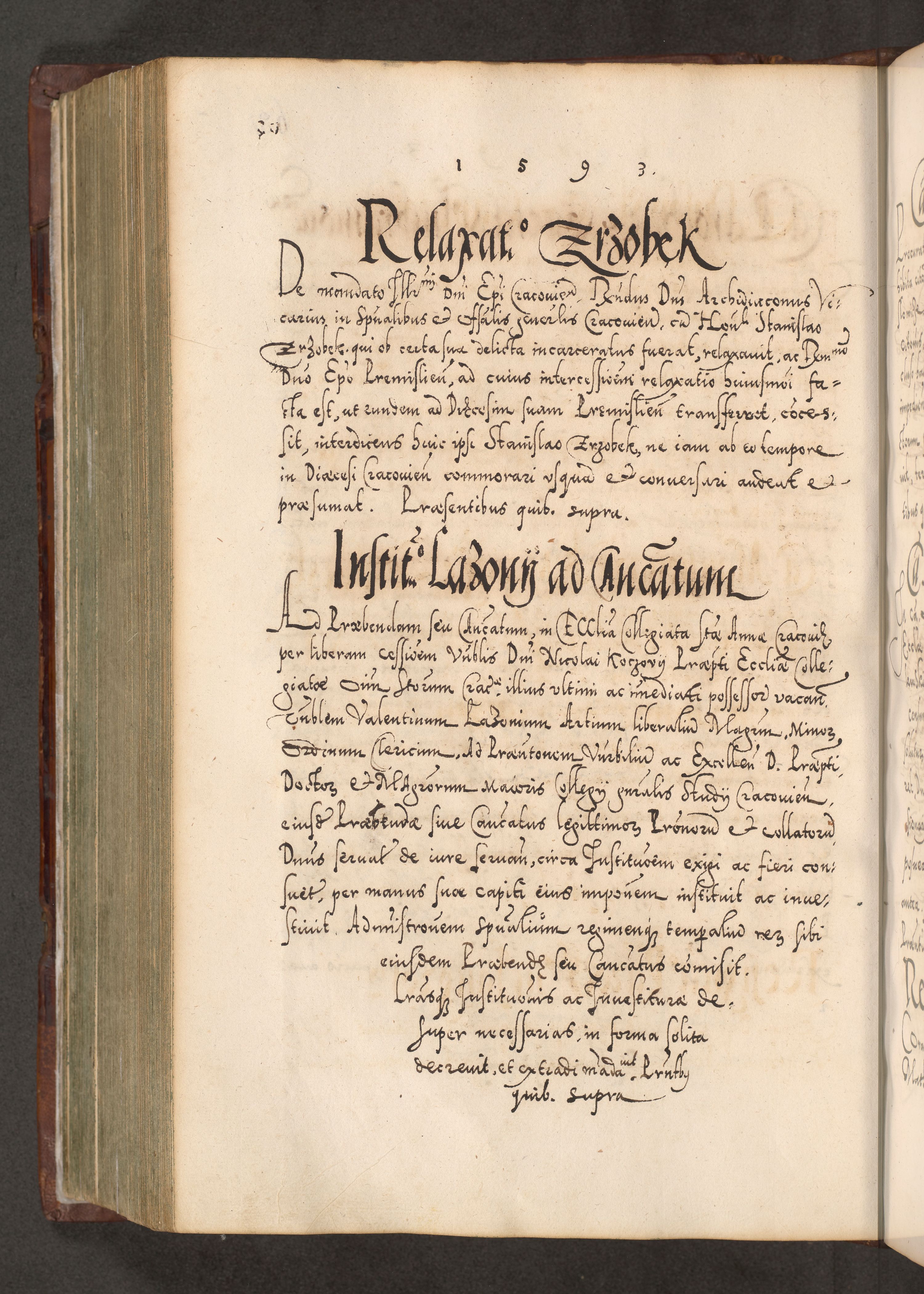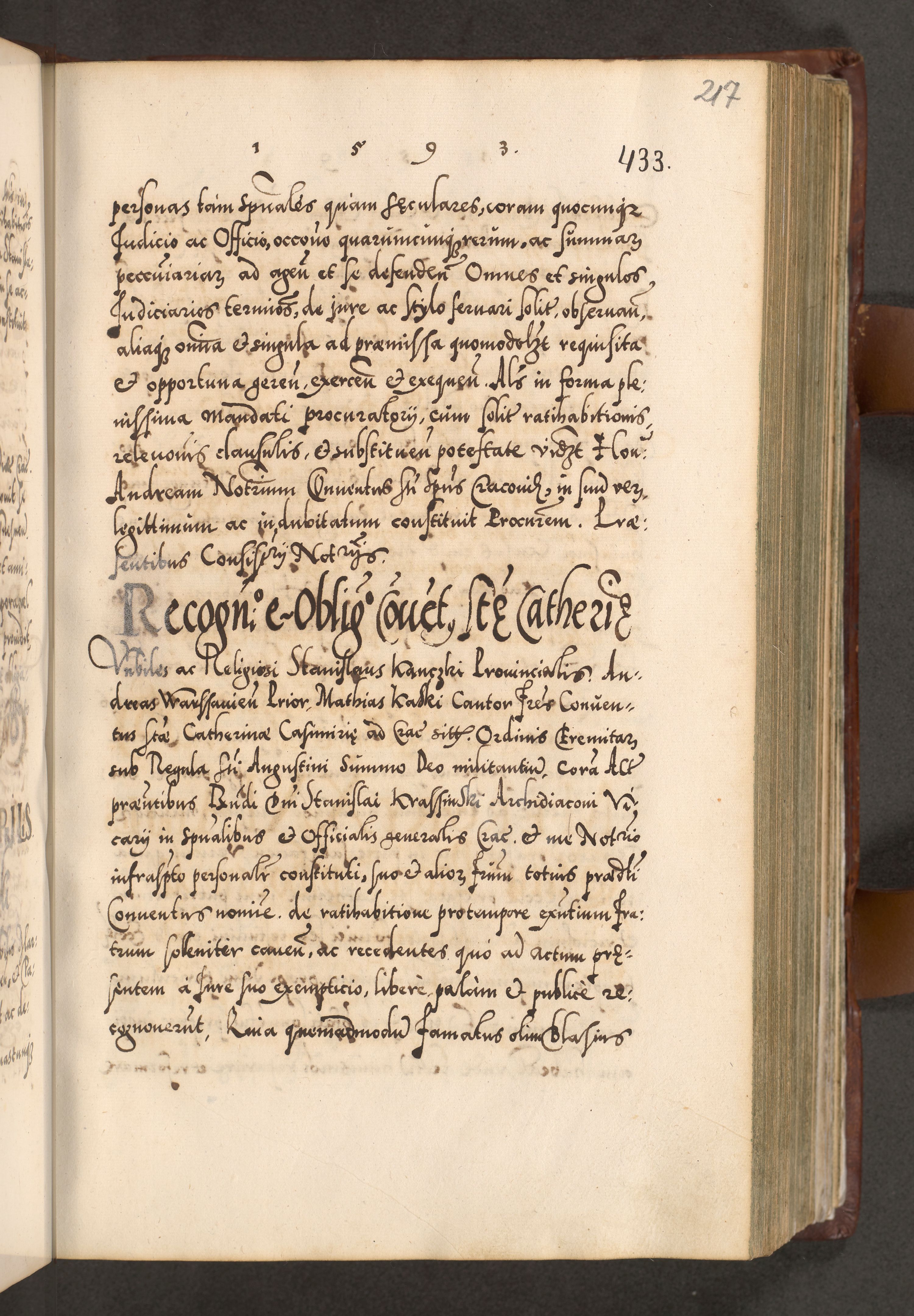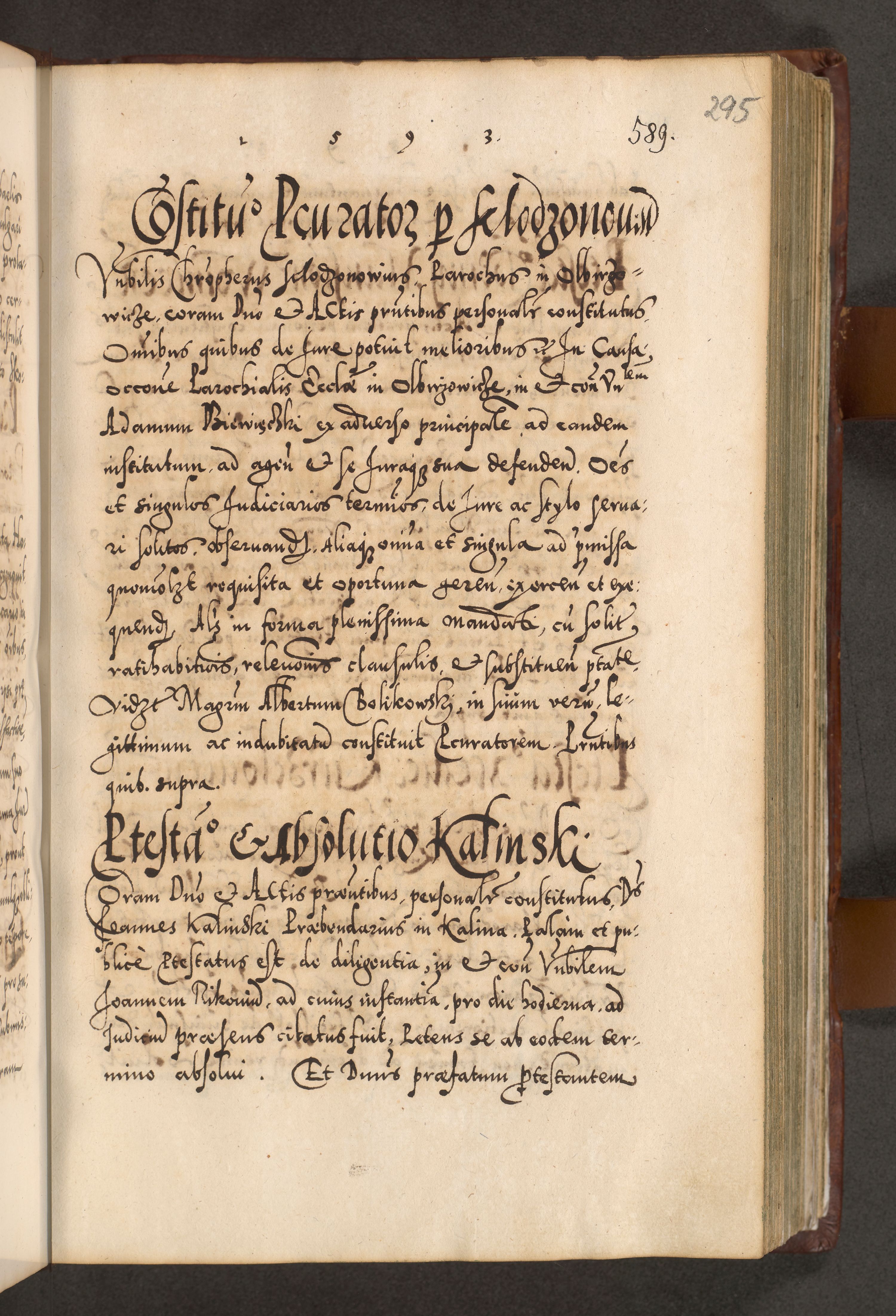 Illistrissimo et revedissimo in Christo Patre Domino Domino Georgio Rzadziwił Miserone Divina Sacrostae R. E. Tituli S. Sixti Presbitero Cardinali Duce in Olyka et Niesswiesz ad Gubernacula Ecclessiae Cracoviensis cuius administratorialem a Sancta Sede Apostolica obtinverat feliciter sedente. Acta actorum, causarum, sententiarum tam deffinitivarum quam interloquutoriarum decretorum, obligationum, quietationum, recognitionum, constitutionum procuratorum etc. coram Reverendo Domino Stanislao Crassinskz de Crasne Archidiacono Cracoviensis, Scholastico Gnesnesis, Custode Plocensis etc. Vicario et Officiali Generali Cracoviensi in Ano Domini Millesimo Quingentesimo Nonagesimo Primo cuius indictio quarta pontificatus SS. Domini Nostri Gregorii XIIII Anno I psius prio feliciter incipiut