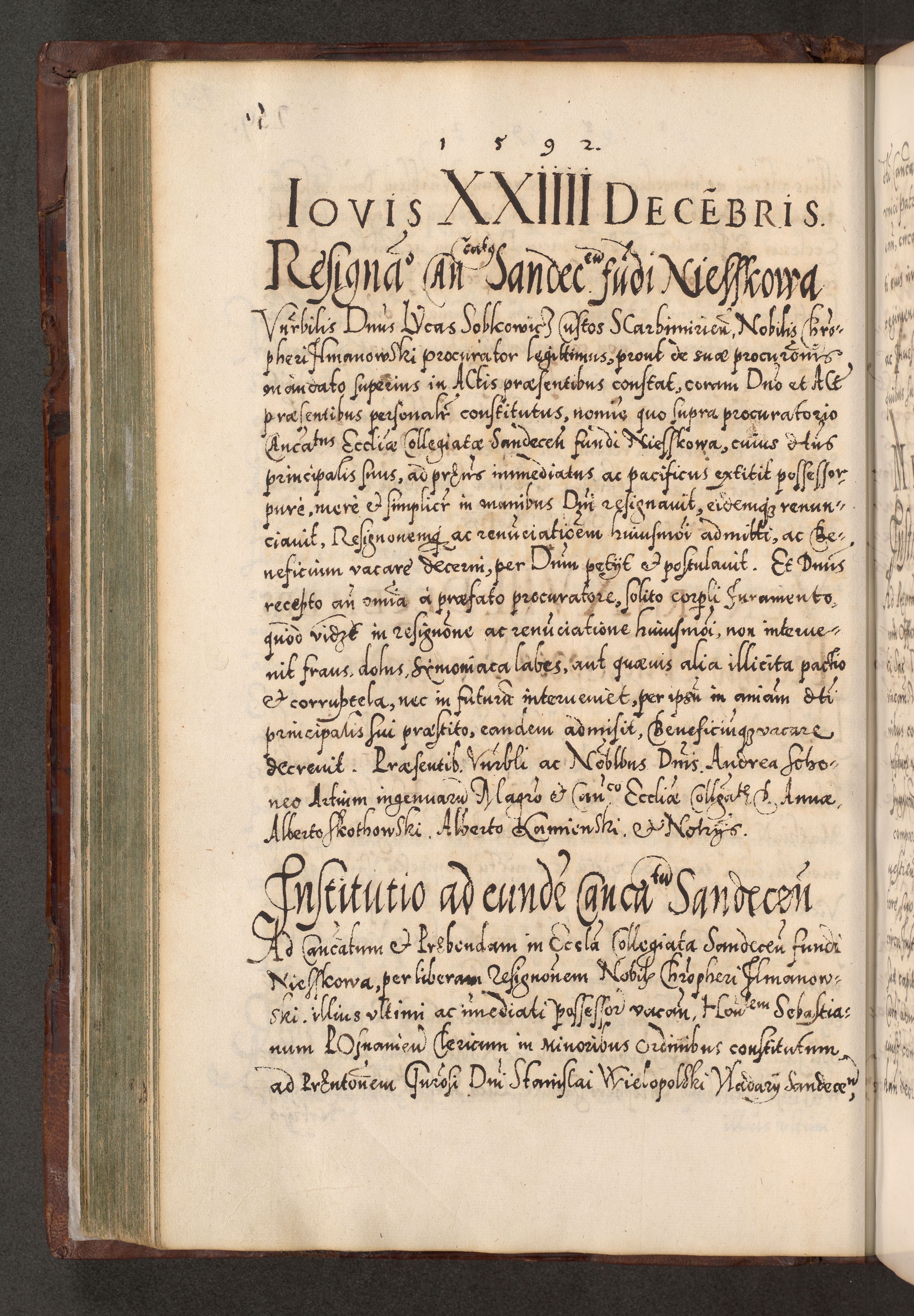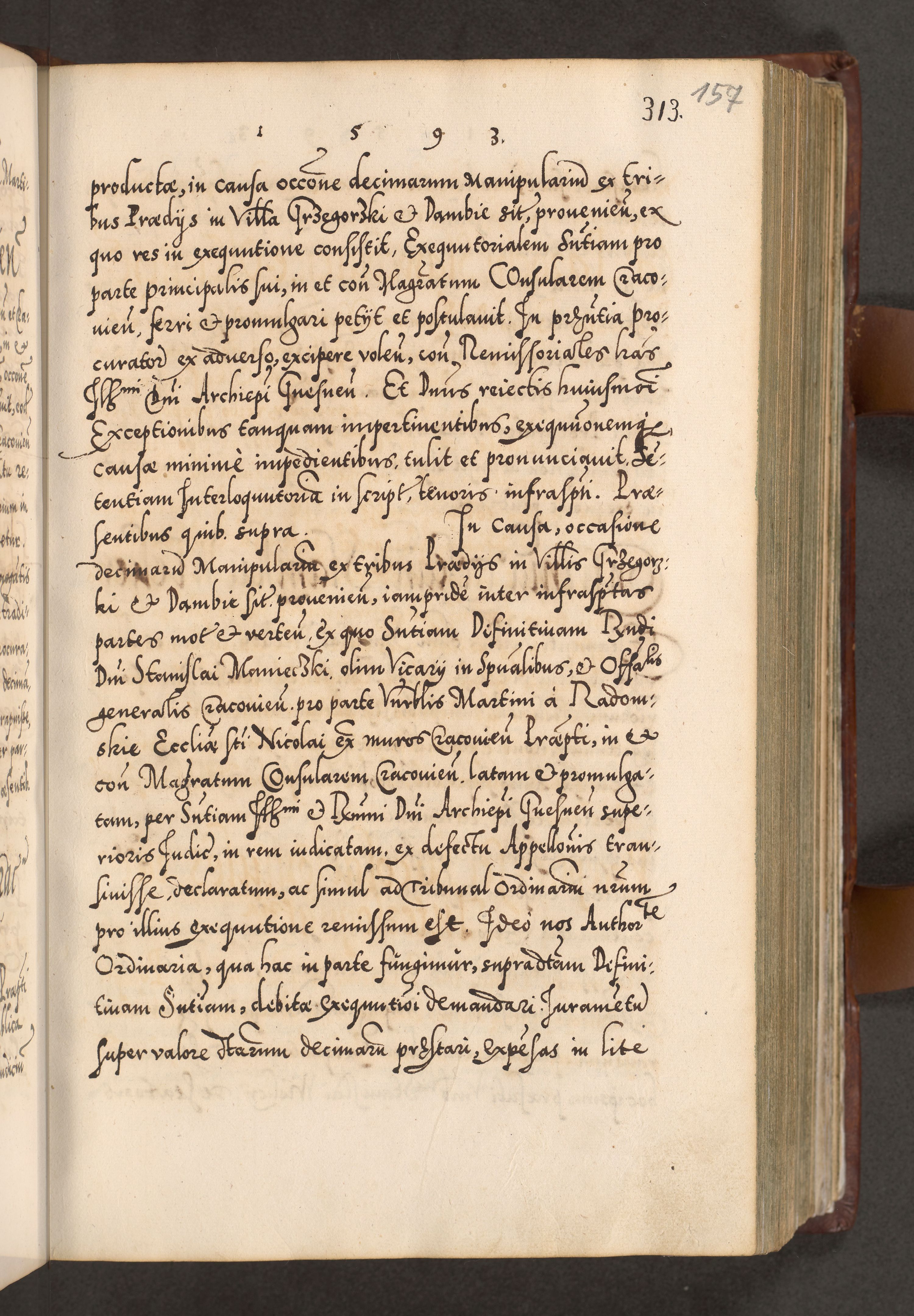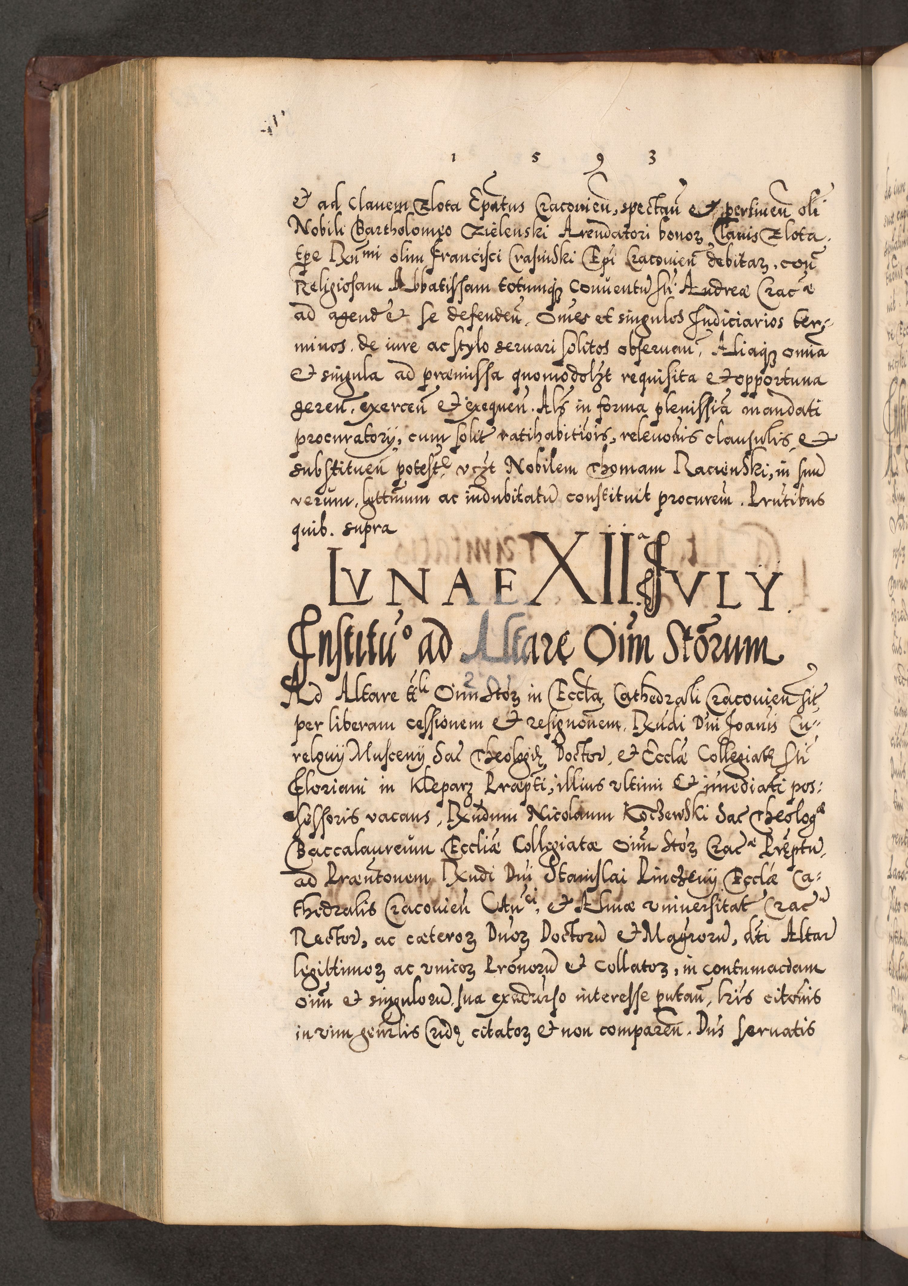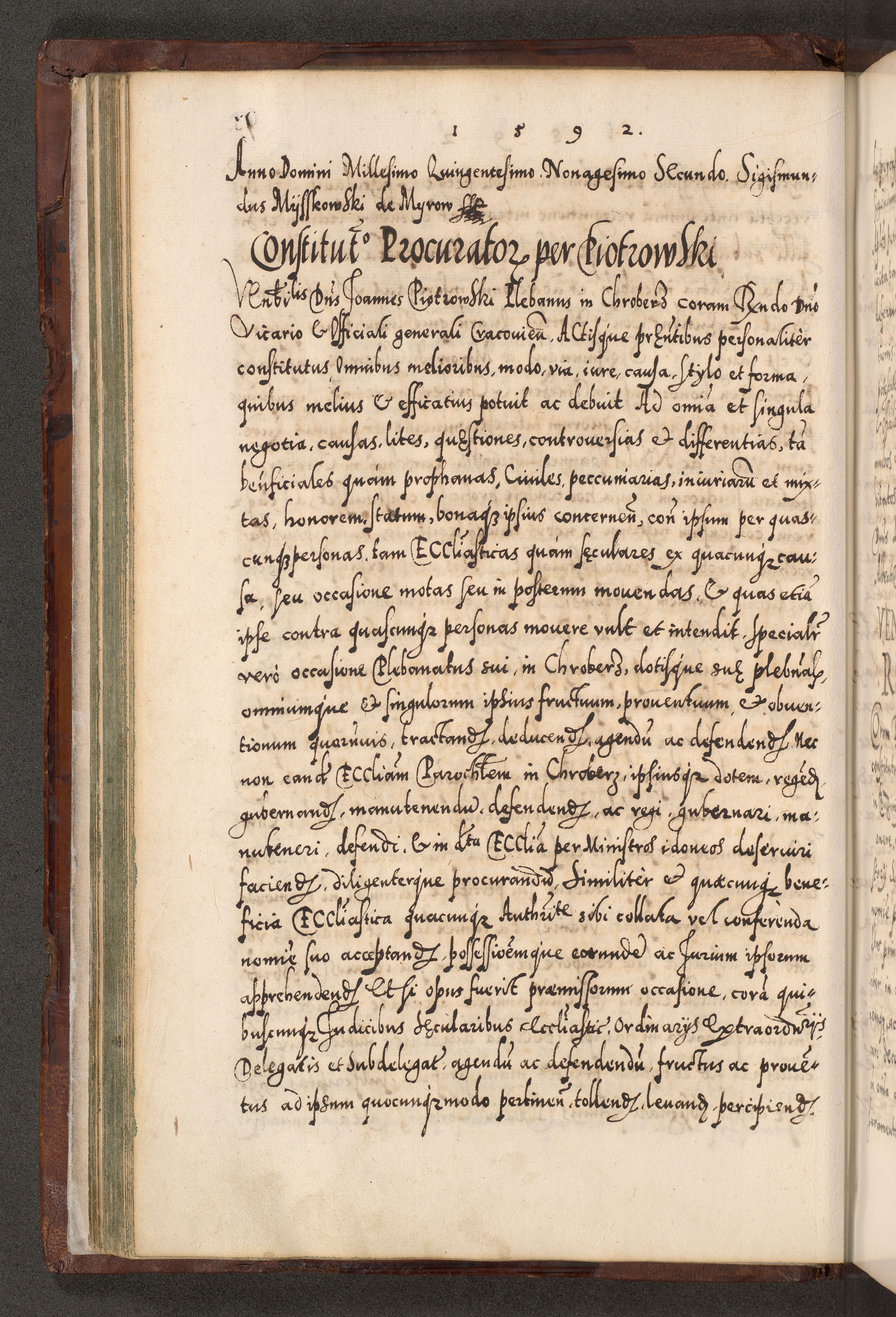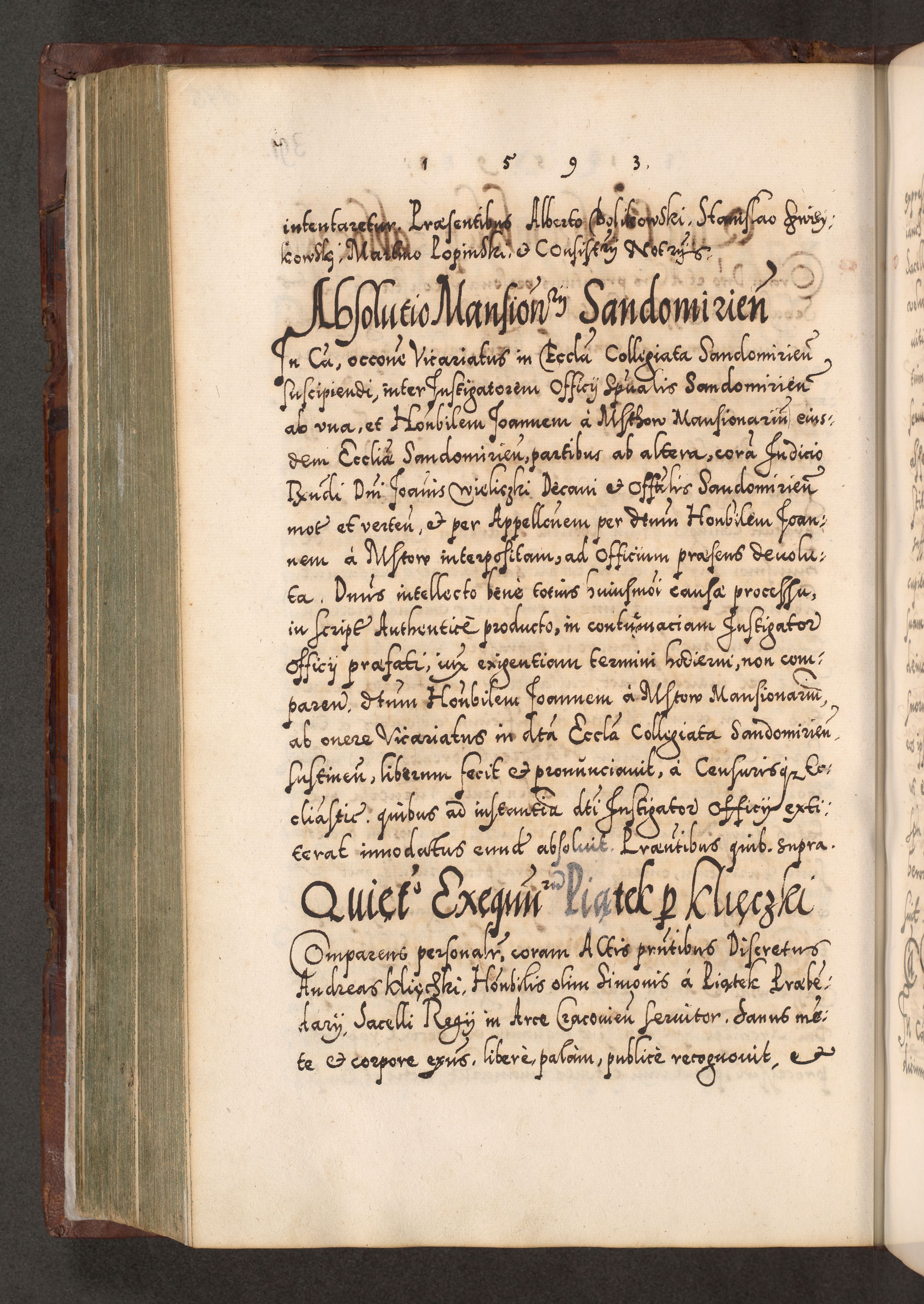 Illistrissimo et revedissimo in Christo Patre Domino Domino Georgio Rzadziwił Miserone Divina Sacrostae R. E. Tituli S. Sixti Presbitero Cardinali Duce in Olyka et Niesswiesz ad Gubernacula Ecclessiae Cracoviensis cuius administratorialem a Sancta Sede Apostolica obtinverat feliciter sedente. Acta actorum, causarum, sententiarum tam deffinitivarum quam interloquutoriarum decretorum, obligationum, quietationum, recognitionum, constitutionum procuratorum etc. coram Reverendo Domino Stanislao Crassinskz de Crasne Archidiacono Cracoviensis, Scholastico Gnesnesis, Custode Plocensis etc. Vicario et Officiali Generali Cracoviensi in Ano Domini Millesimo Quingentesimo Nonagesimo Primo cuius indictio quarta pontificatus SS. Domini Nostri Gregorii XIIII Anno I psius prio feliciter incipiut