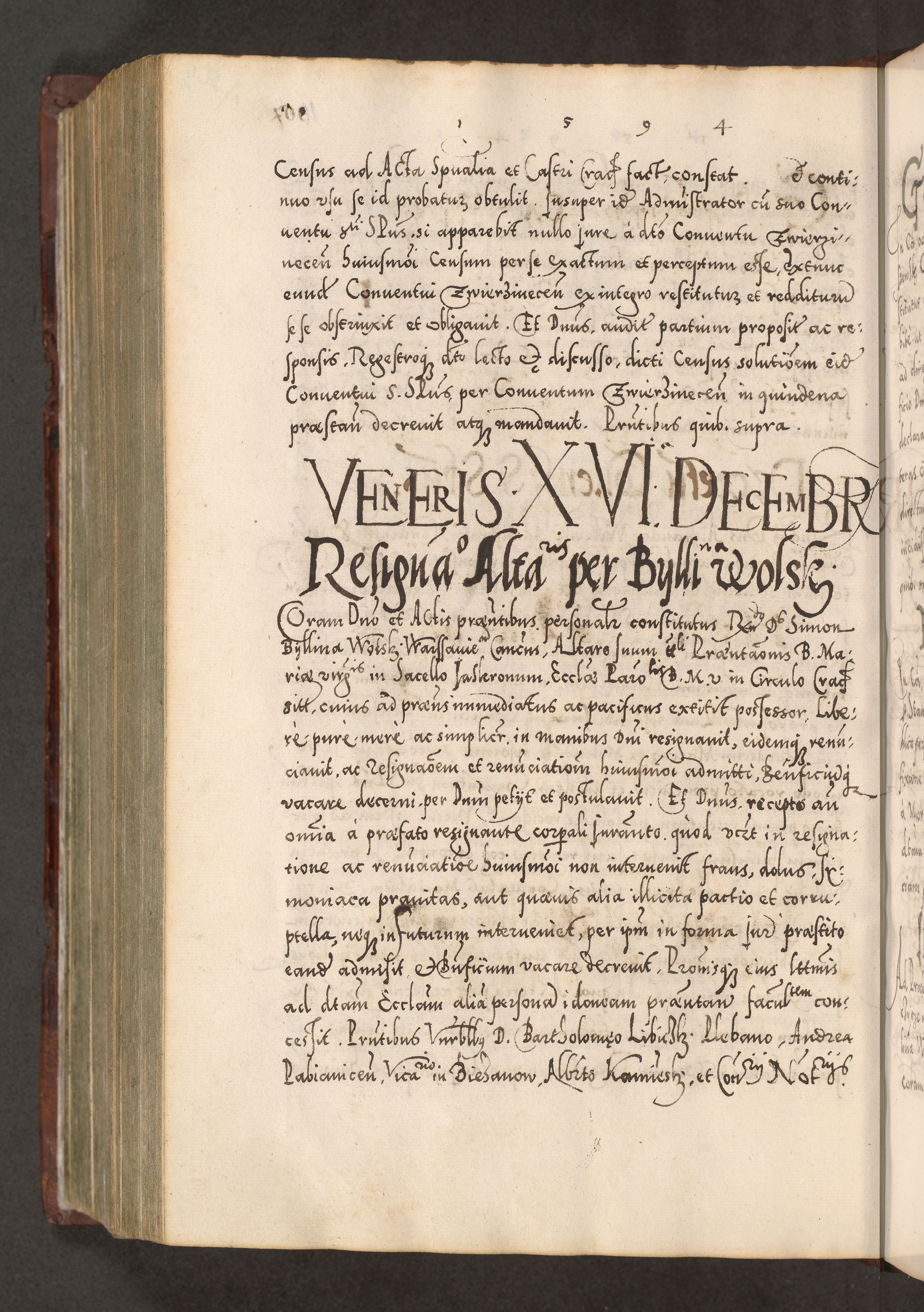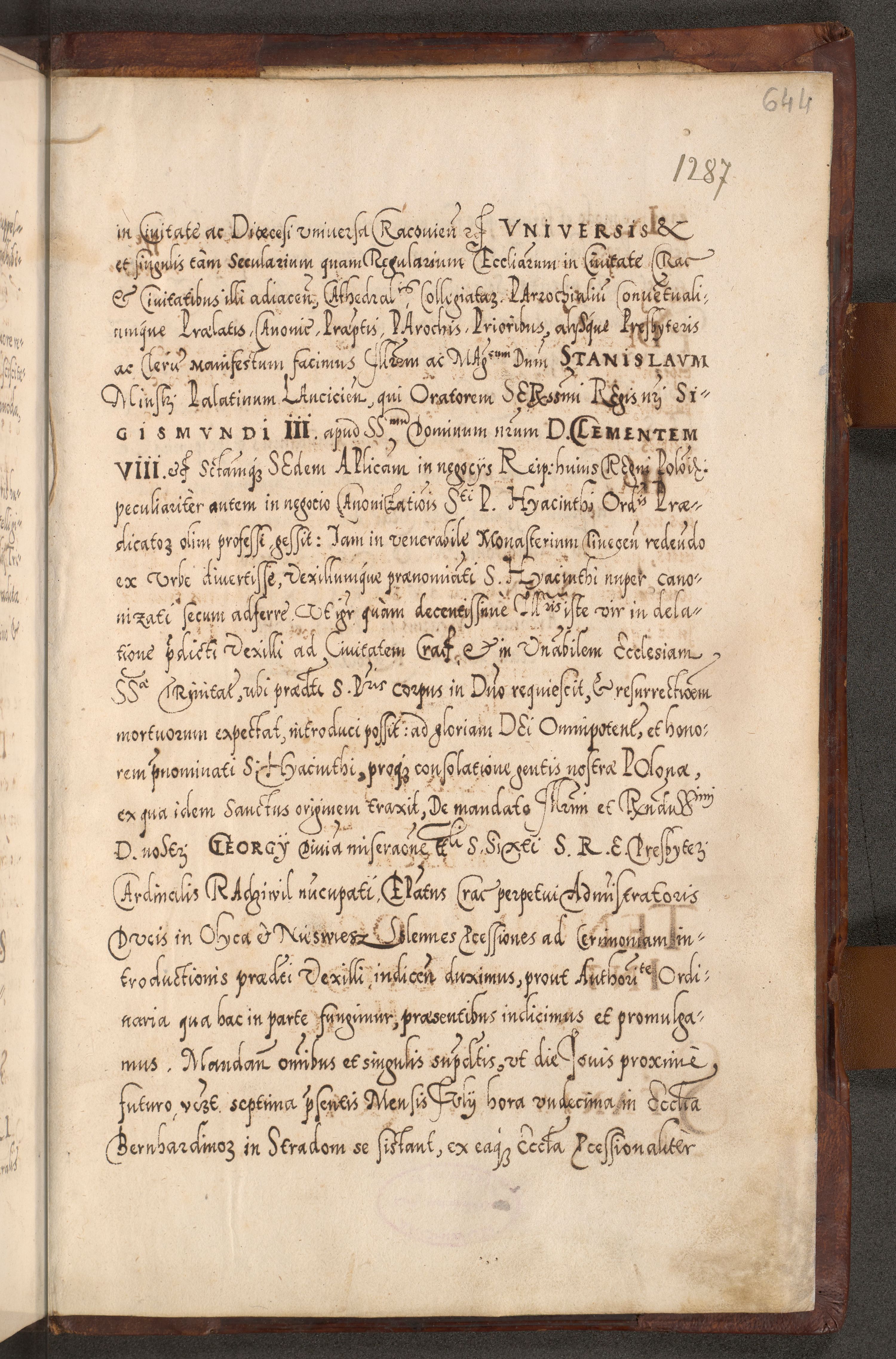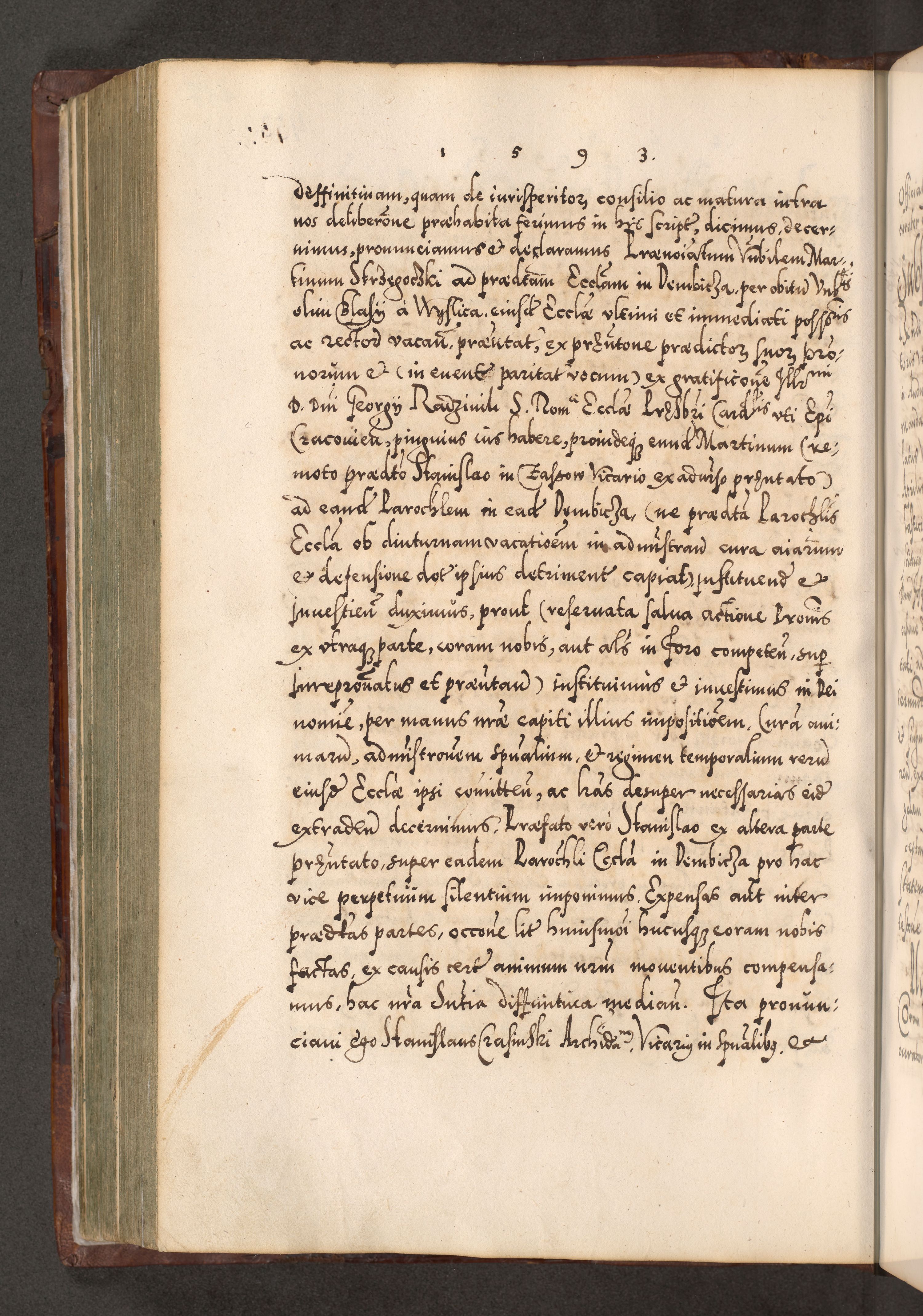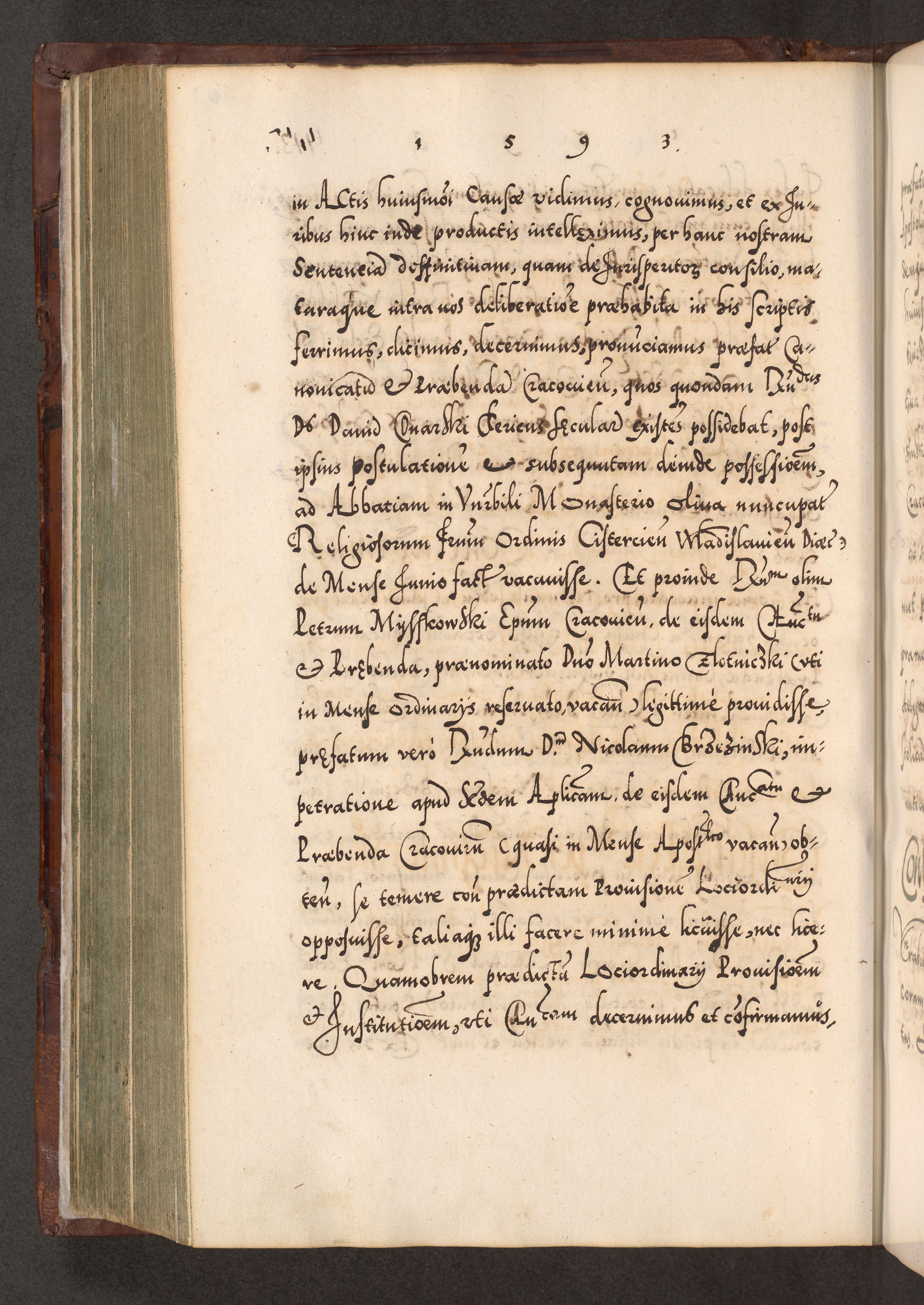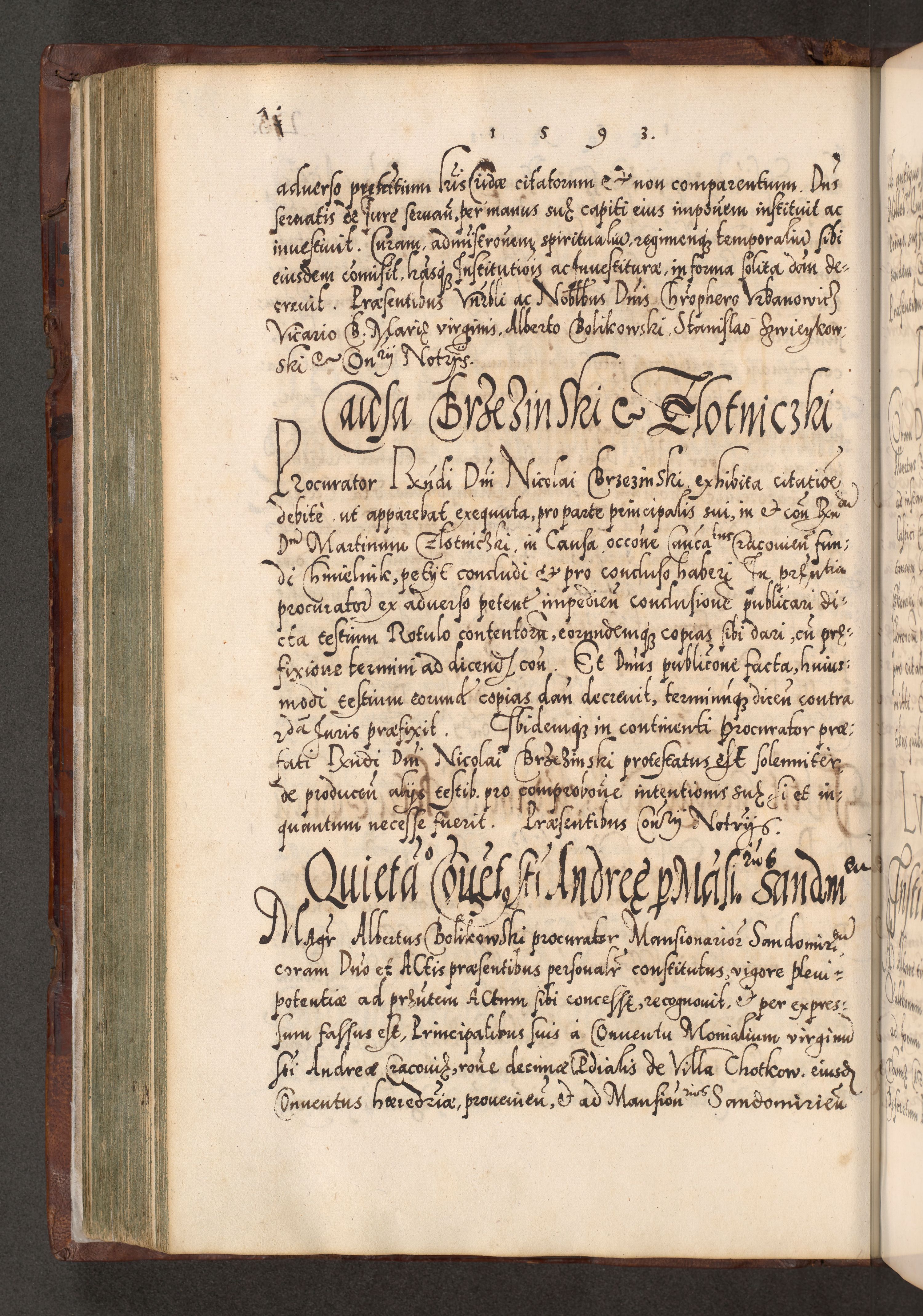 Illistrissimo et revedissimo in Christo Patre Domino Domino Georgio Rzadziwił Miserone Divina Sacrostae R. E. Tituli S. Sixti Presbitero Cardinali Duce in Olyka et Niesswiesz ad Gubernacula Ecclessiae Cracoviensis cuius administratorialem a Sancta Sede Apostolica obtinverat feliciter sedente. Acta actorum, causarum, sententiarum tam deffinitivarum quam interloquutoriarum decretorum, obligationum, quietationum, recognitionum, constitutionum procuratorum etc. coram Reverendo Domino Stanislao Crassinskz de Crasne Archidiacono Cracoviensis, Scholastico Gnesnesis, Custode Plocensis etc. Vicario et Officiali Generali Cracoviensi in Ano Domini Millesimo Quingentesimo Nonagesimo Primo cuius indictio quarta pontificatus SS. Domini Nostri Gregorii XIIII Anno I psius prio feliciter incipiut