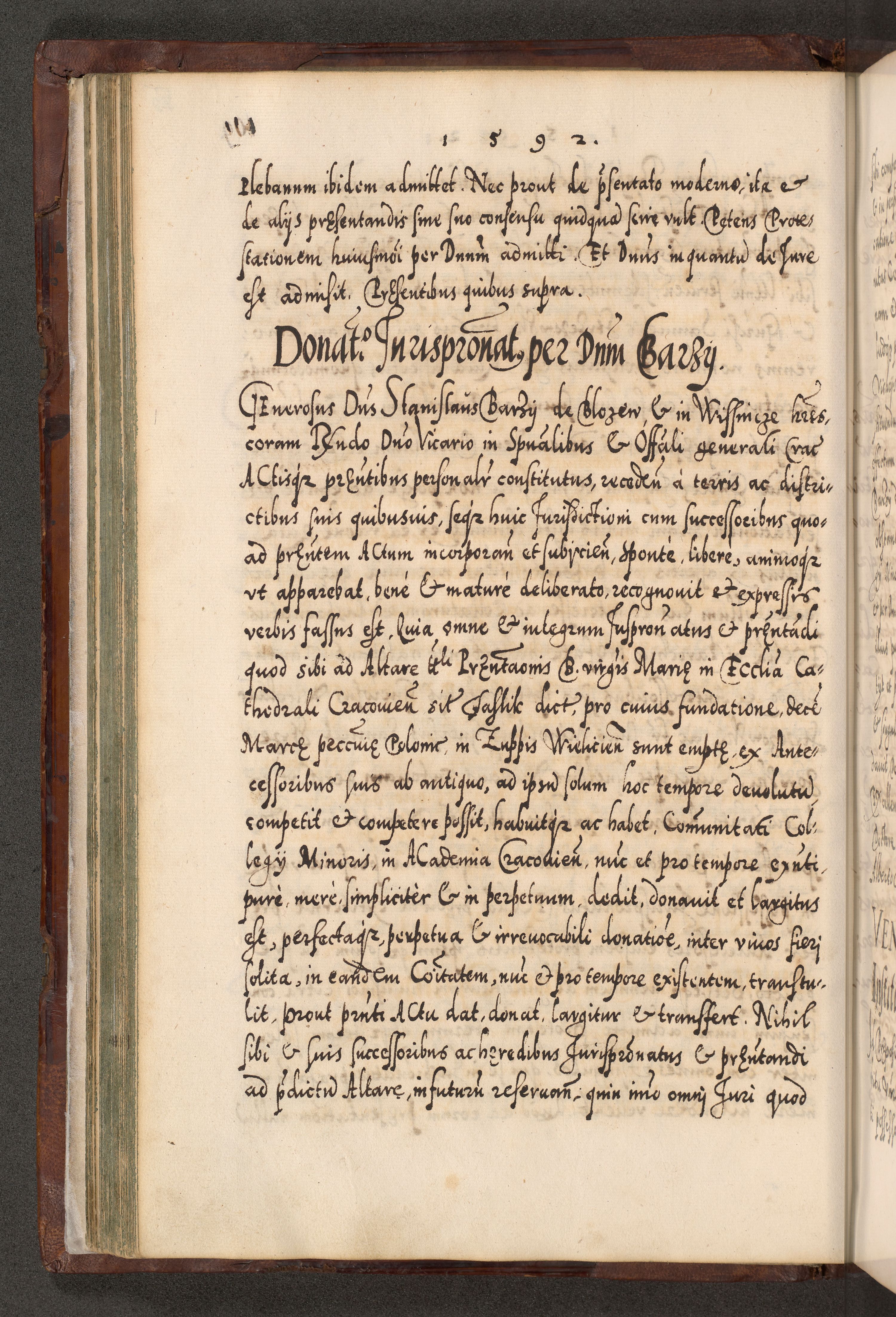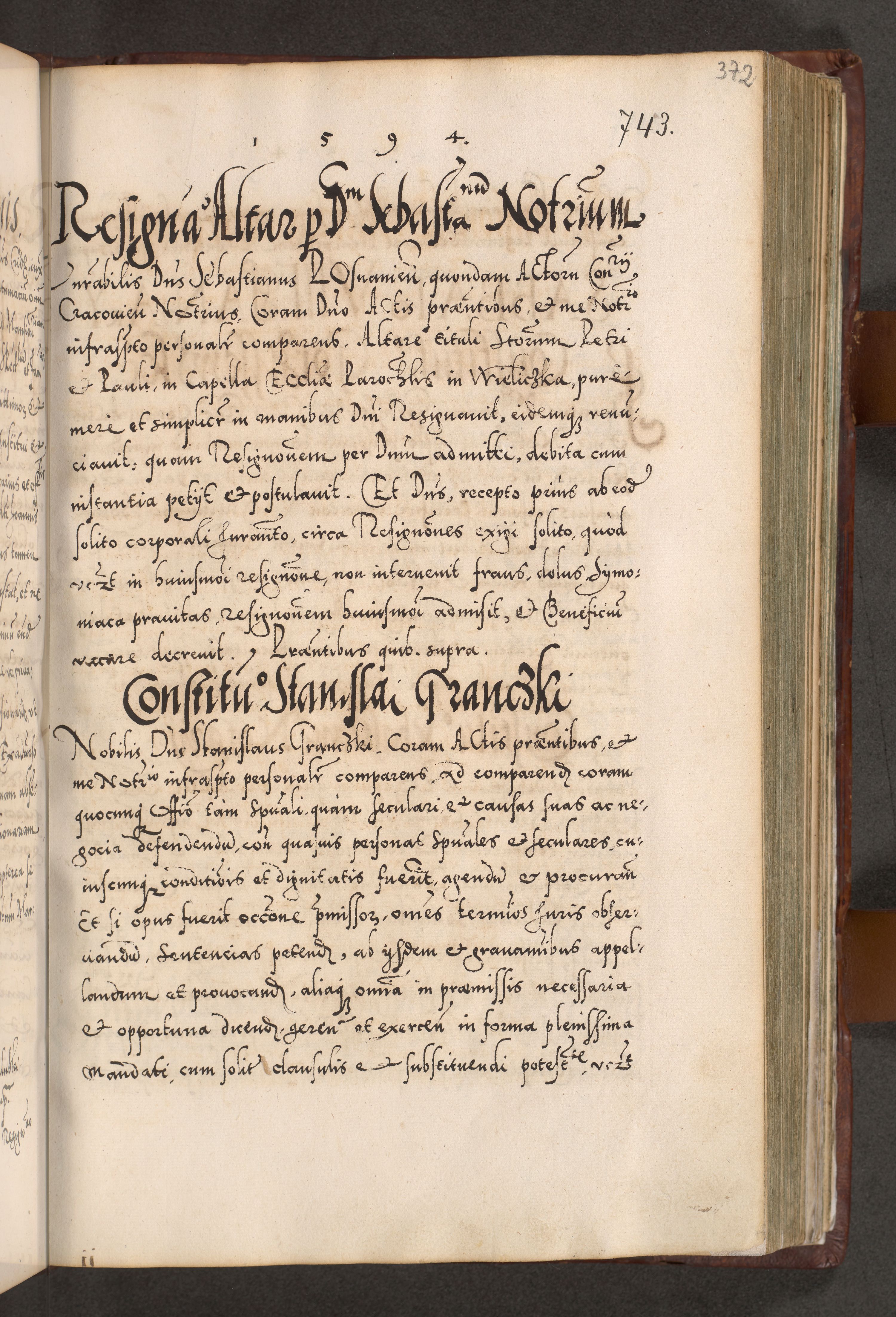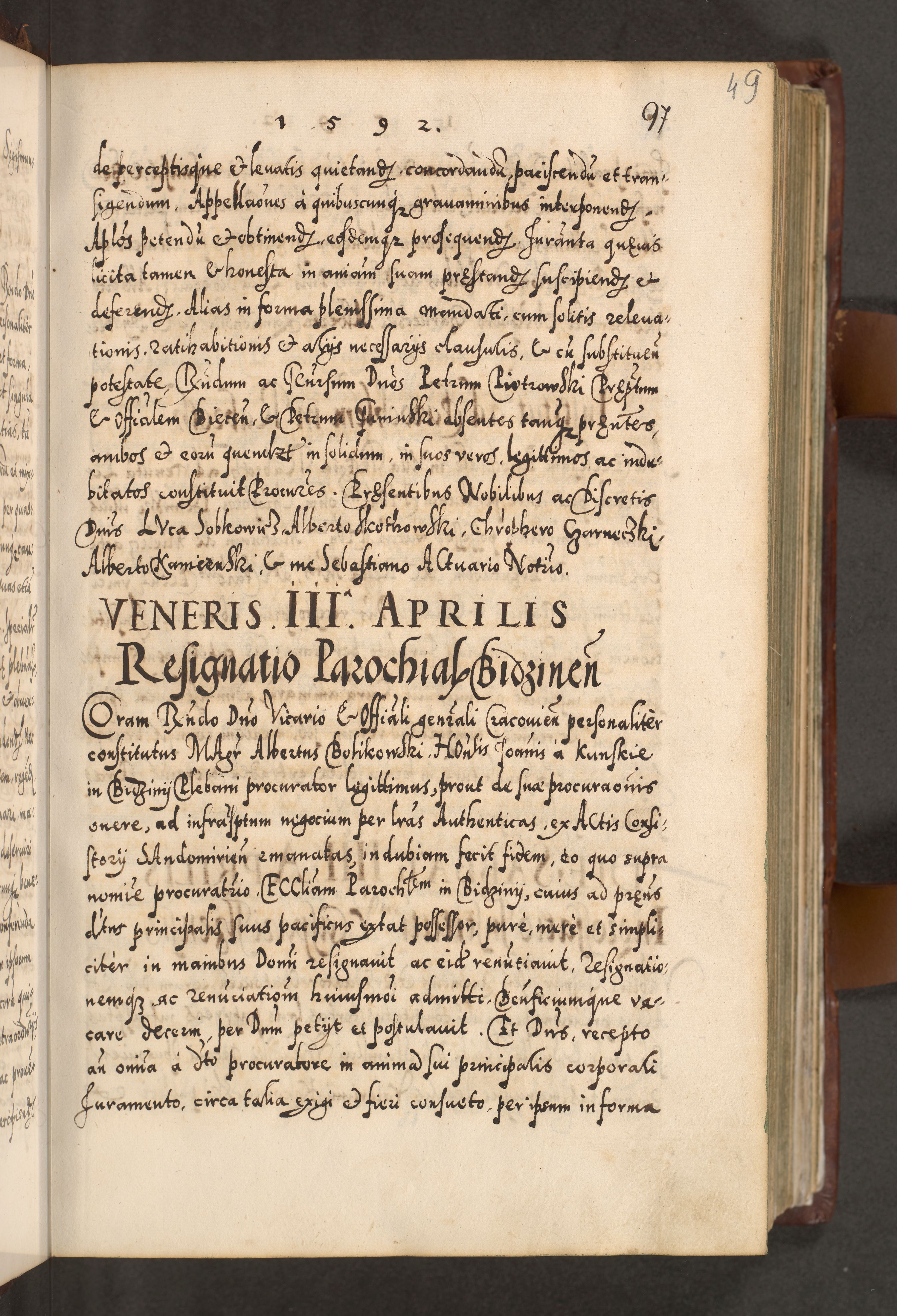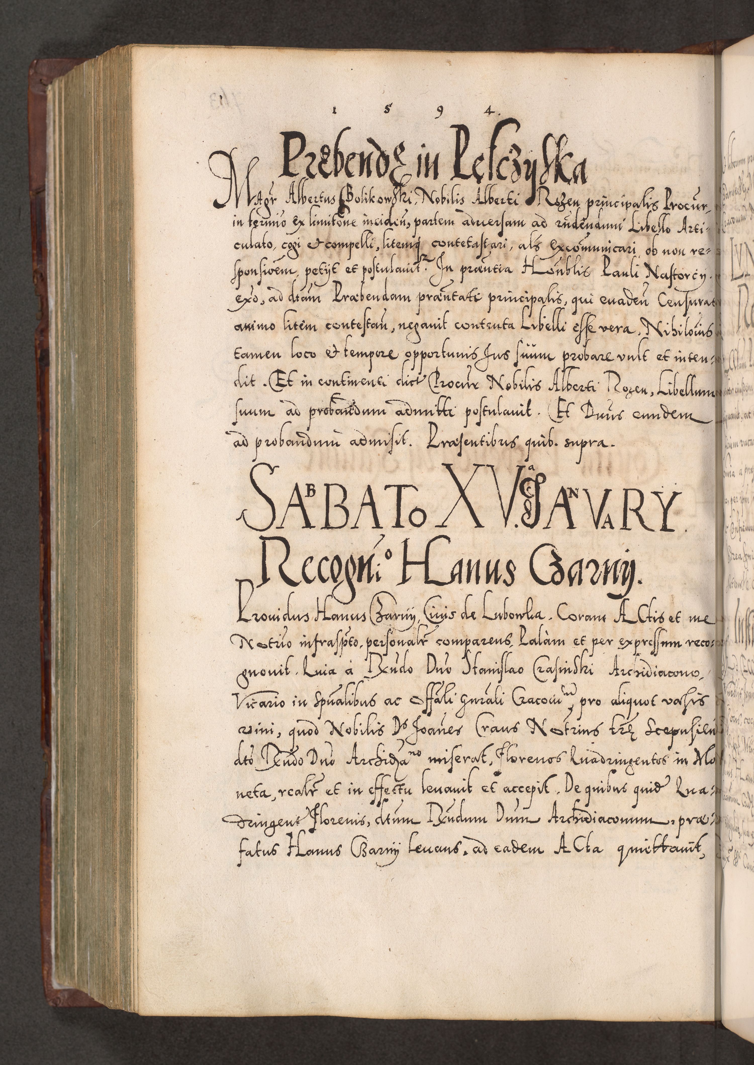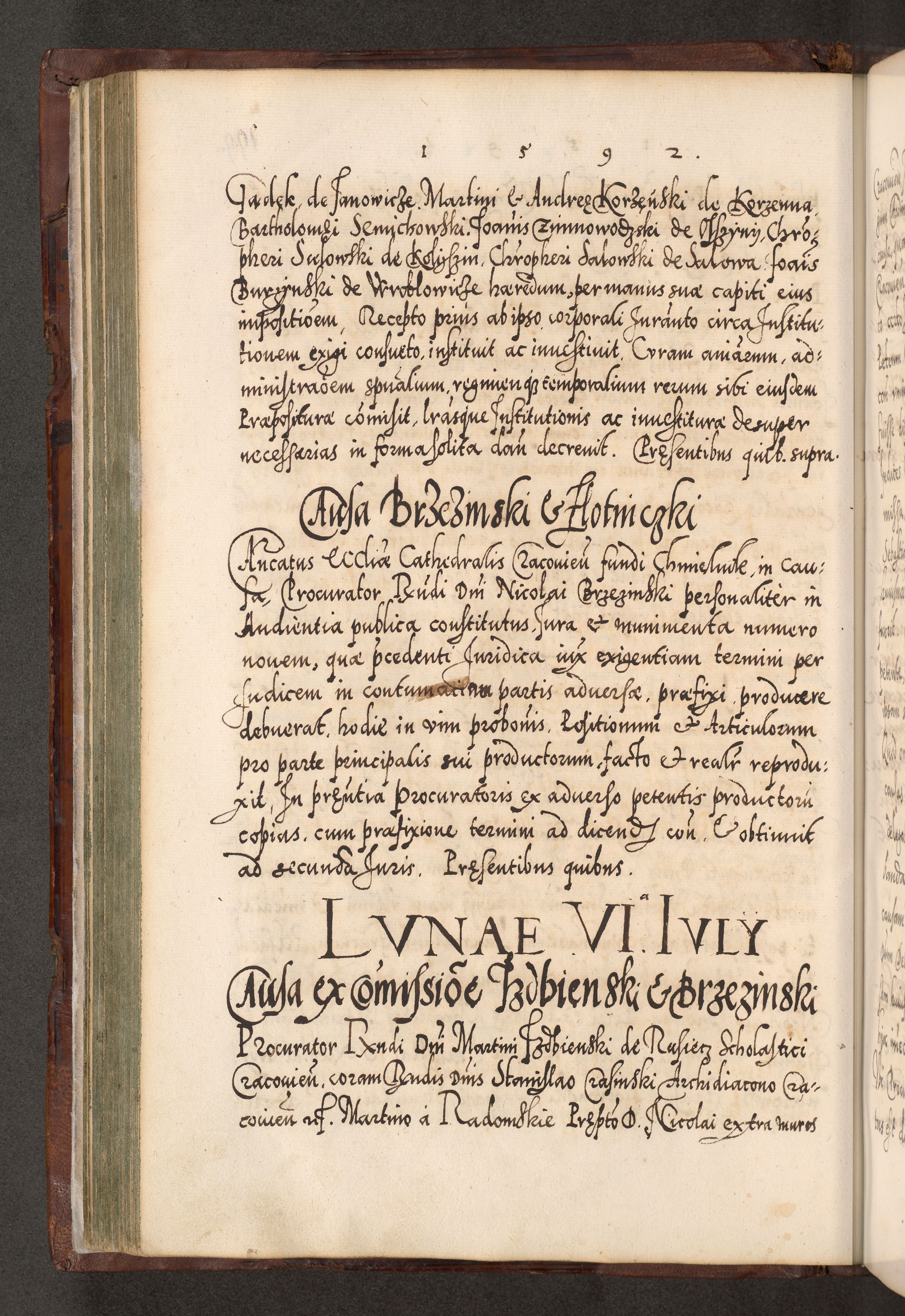 Illistrissimo et revedissimo in Christo Patre Domino Domino Georgio Rzadziwił Miserone Divina Sacrostae R. E. Tituli S. Sixti Presbitero Cardinali Duce in Olyka et Niesswiesz ad Gubernacula Ecclessiae Cracoviensis cuius administratorialem a Sancta Sede Apostolica obtinverat feliciter sedente. Acta actorum, causarum, sententiarum tam deffinitivarum quam interloquutoriarum decretorum, obligationum, quietationum, recognitionum, constitutionum procuratorum etc. coram Reverendo Domino Stanislao Crassinskz de Crasne Archidiacono Cracoviensis, Scholastico Gnesnesis, Custode Plocensis etc. Vicario et Officiali Generali Cracoviensi in Ano Domini Millesimo Quingentesimo Nonagesimo Primo cuius indictio quarta pontificatus SS. Domini Nostri Gregorii XIIII Anno I psius prio feliciter incipiut