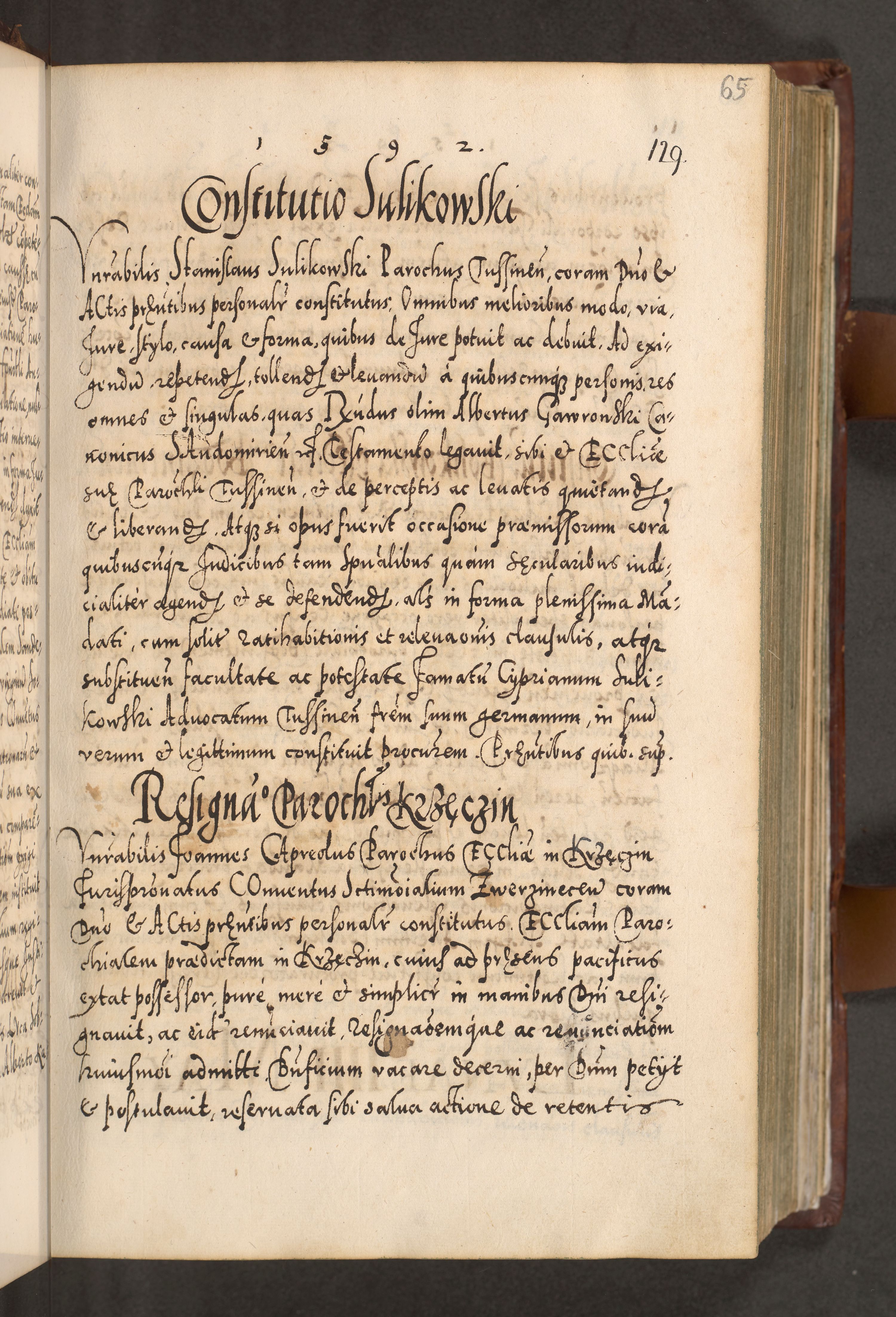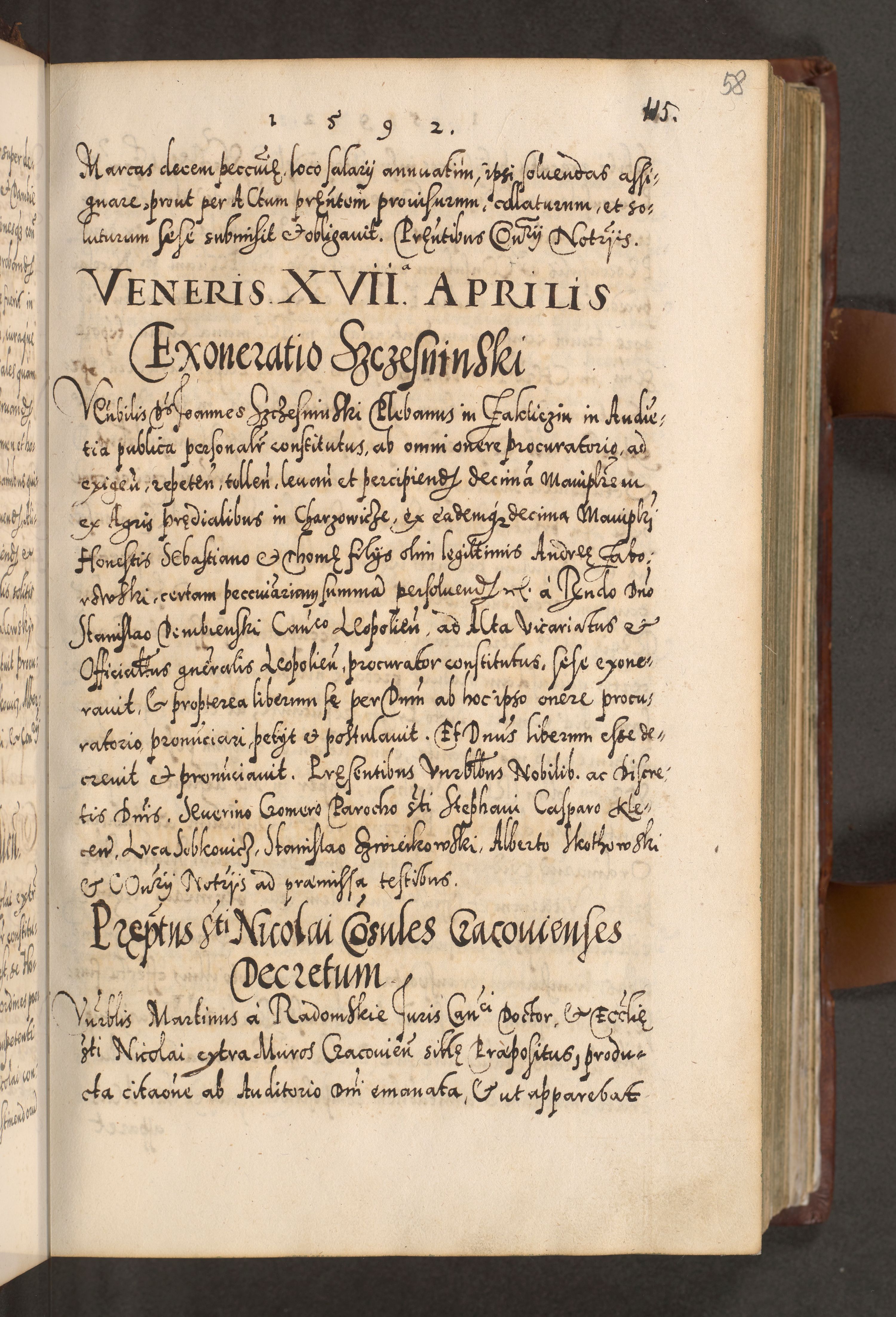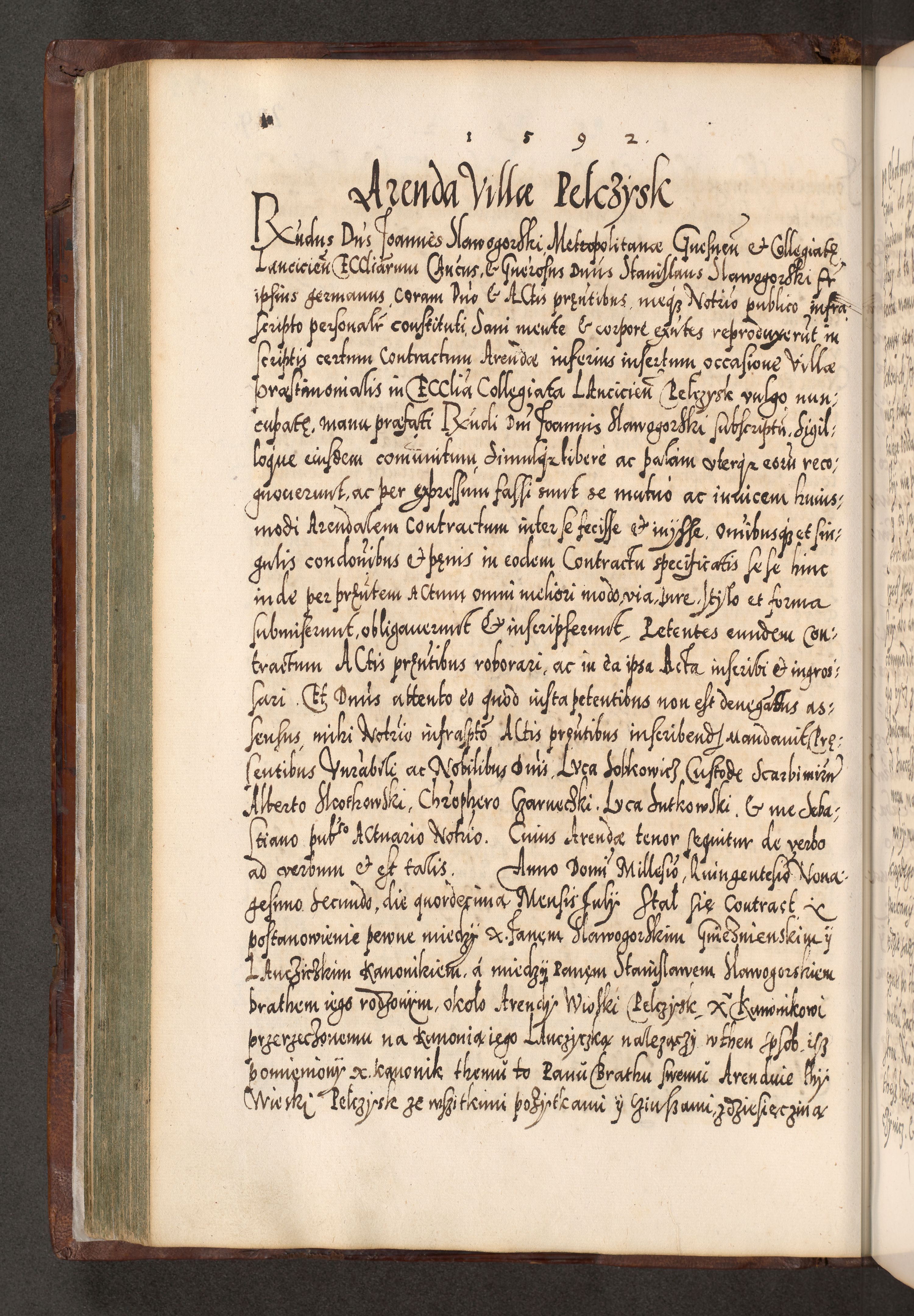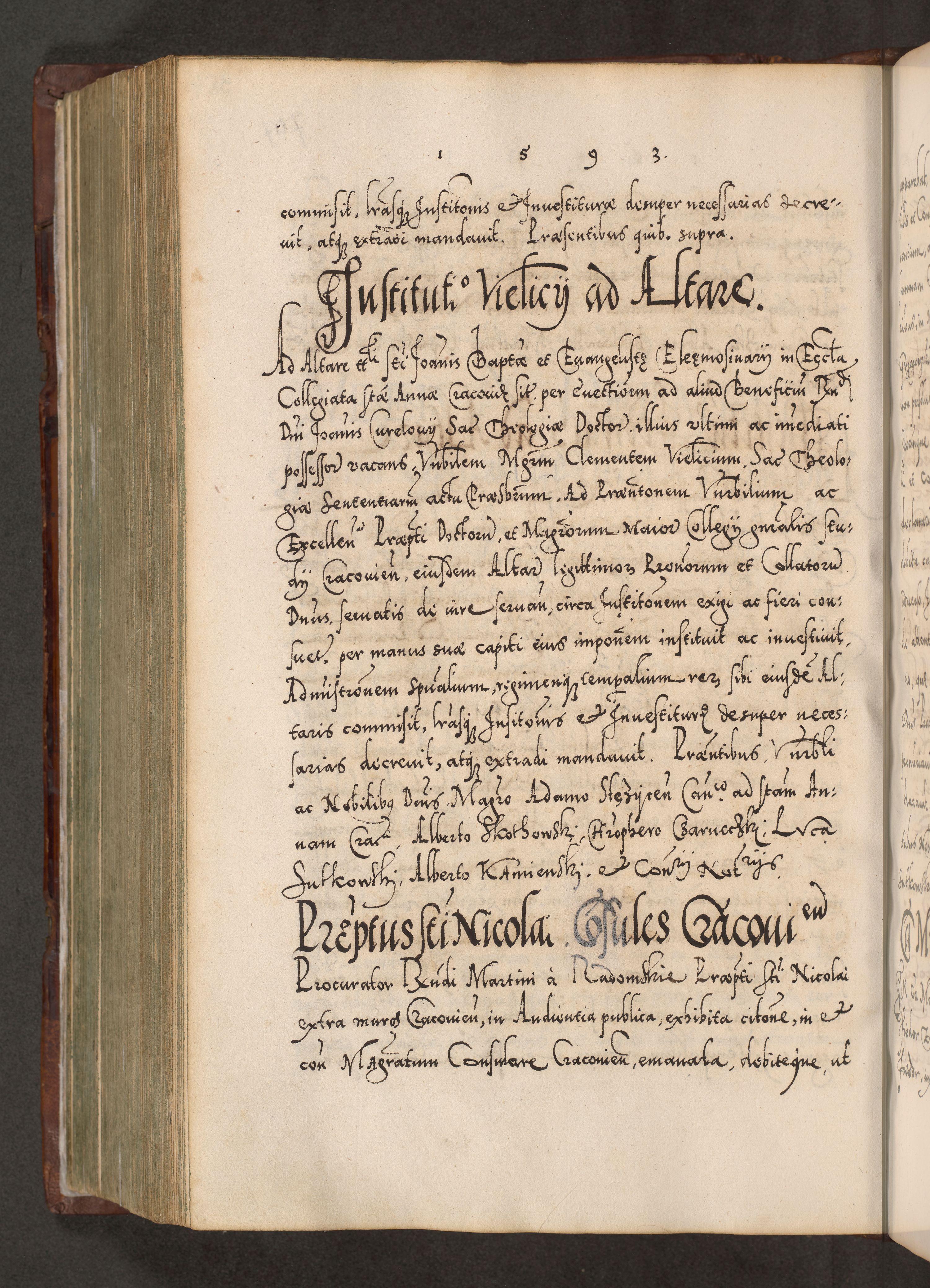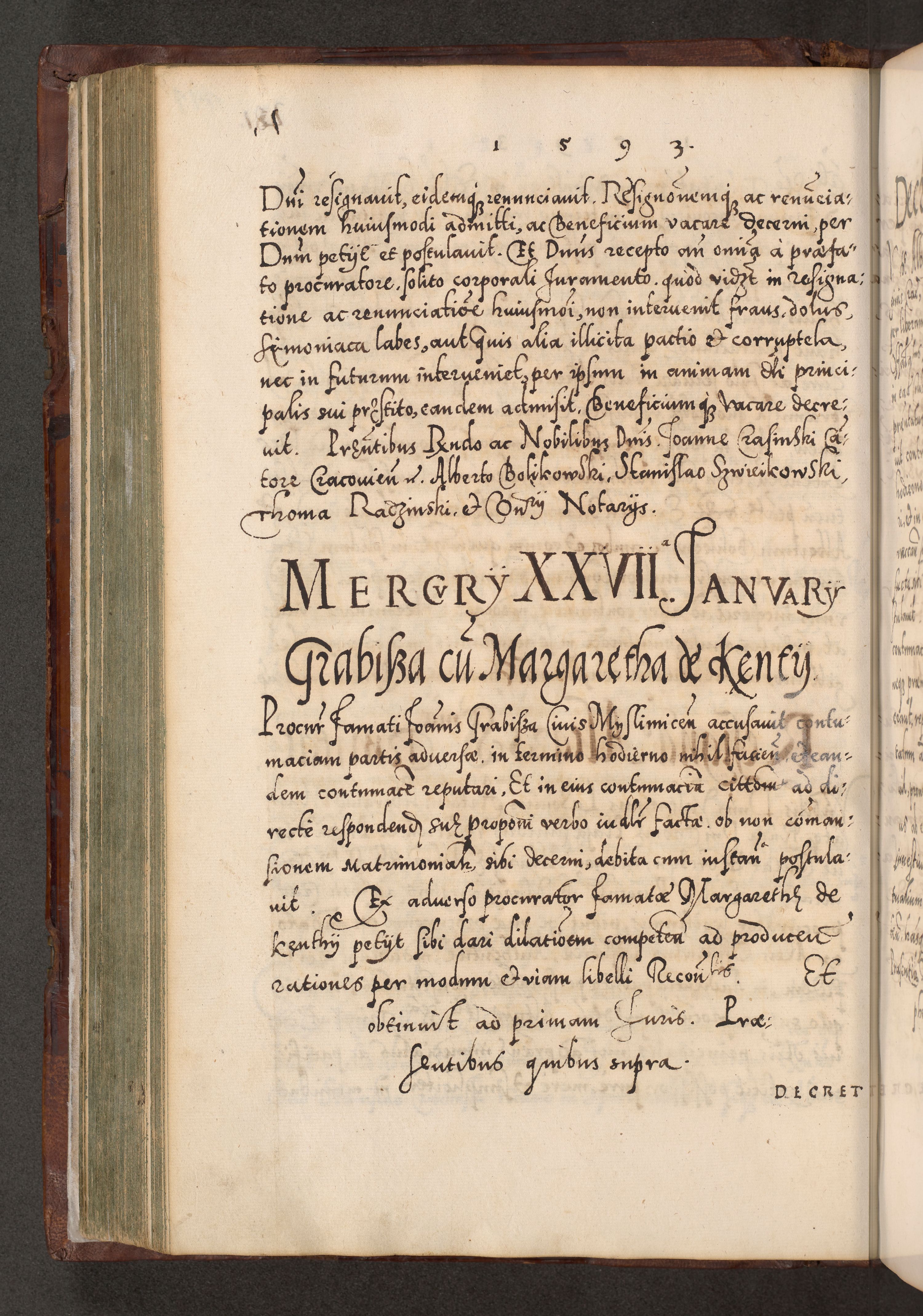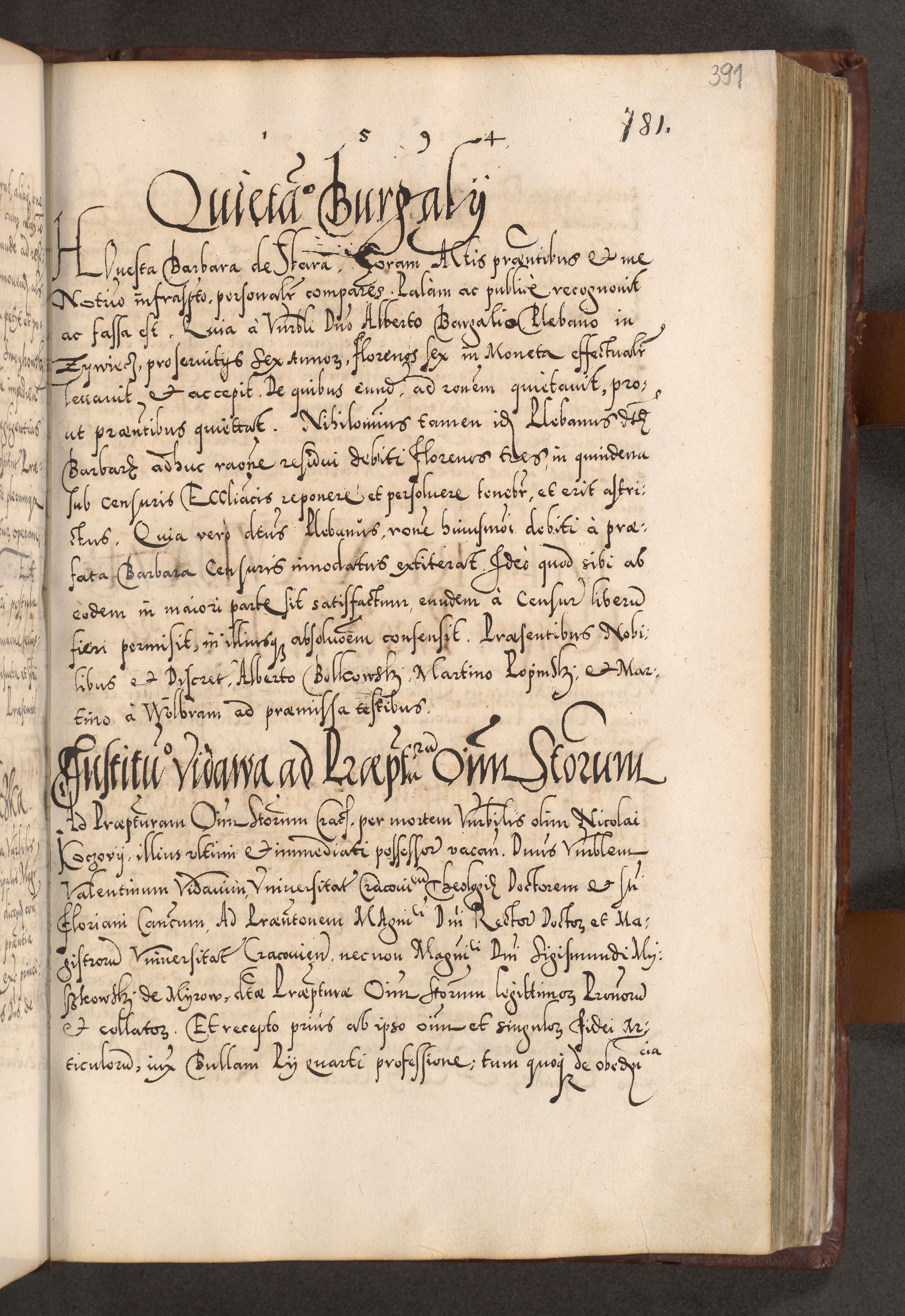 Illistrissimo et revedissimo in Christo Patre Domino Domino Georgio Rzadziwił Miserone Divina Sacrostae R. E. Tituli S. Sixti Presbitero Cardinali Duce in Olyka et Niesswiesz ad Gubernacula Ecclessiae Cracoviensis cuius administratorialem a Sancta Sede Apostolica obtinverat feliciter sedente. Acta actorum, causarum, sententiarum tam deffinitivarum quam interloquutoriarum decretorum, obligationum, quietationum, recognitionum, constitutionum procuratorum etc. coram Reverendo Domino Stanislao Crassinskz de Crasne Archidiacono Cracoviensis, Scholastico Gnesnesis, Custode Plocensis etc. Vicario et Officiali Generali Cracoviensi in Ano Domini Millesimo Quingentesimo Nonagesimo Primo cuius indictio quarta pontificatus SS. Domini Nostri Gregorii XIIII Anno I psius prio feliciter incipiut