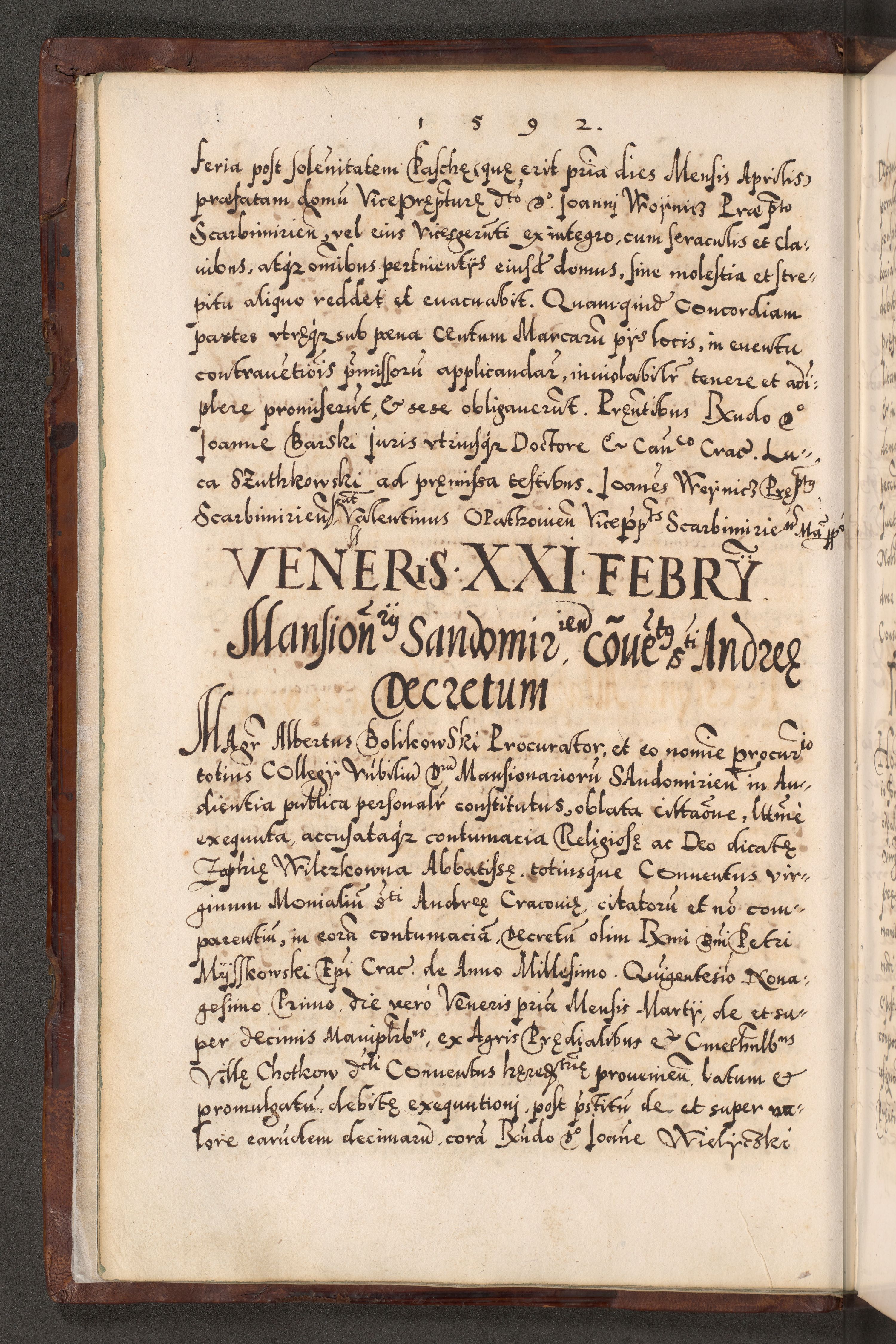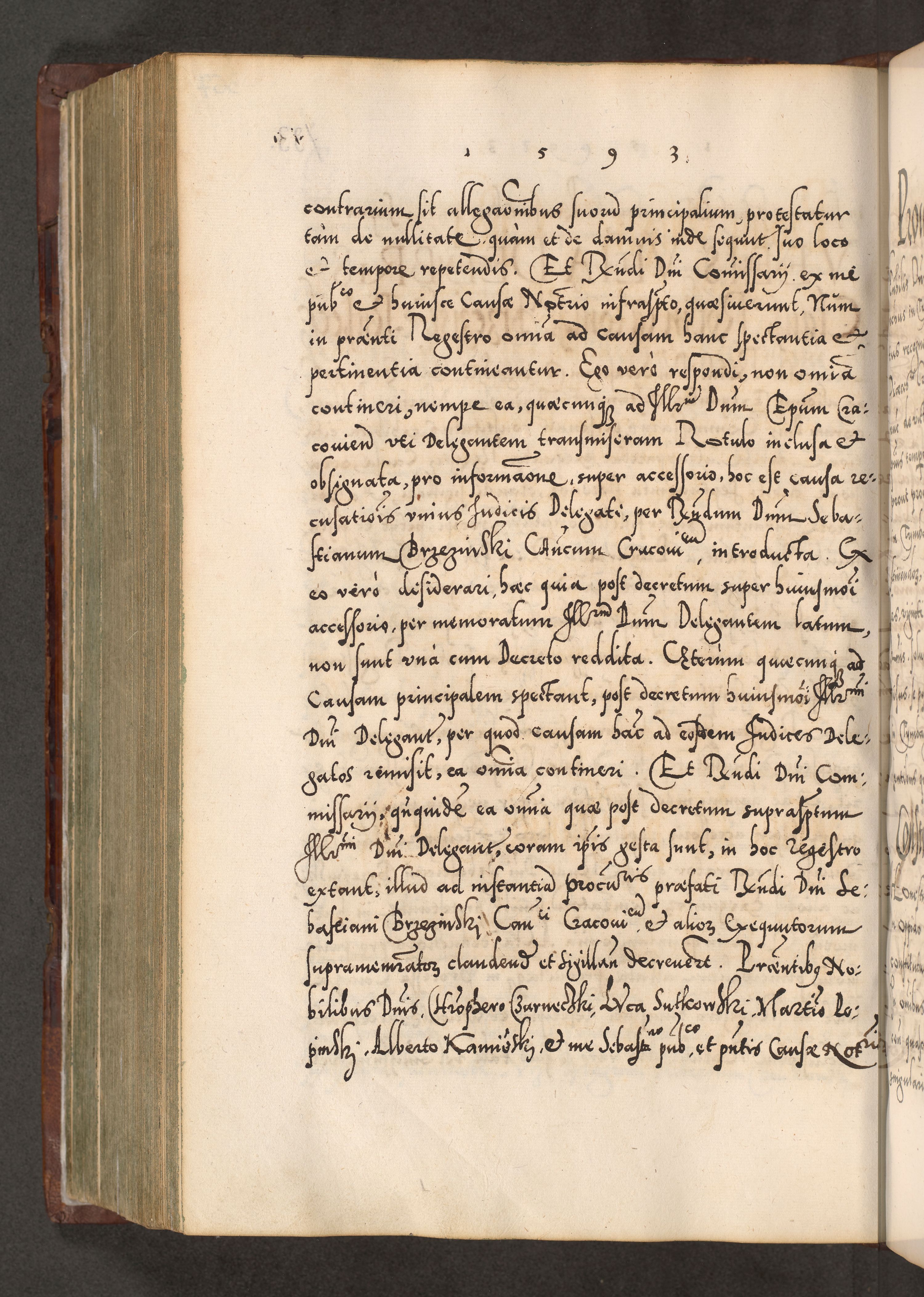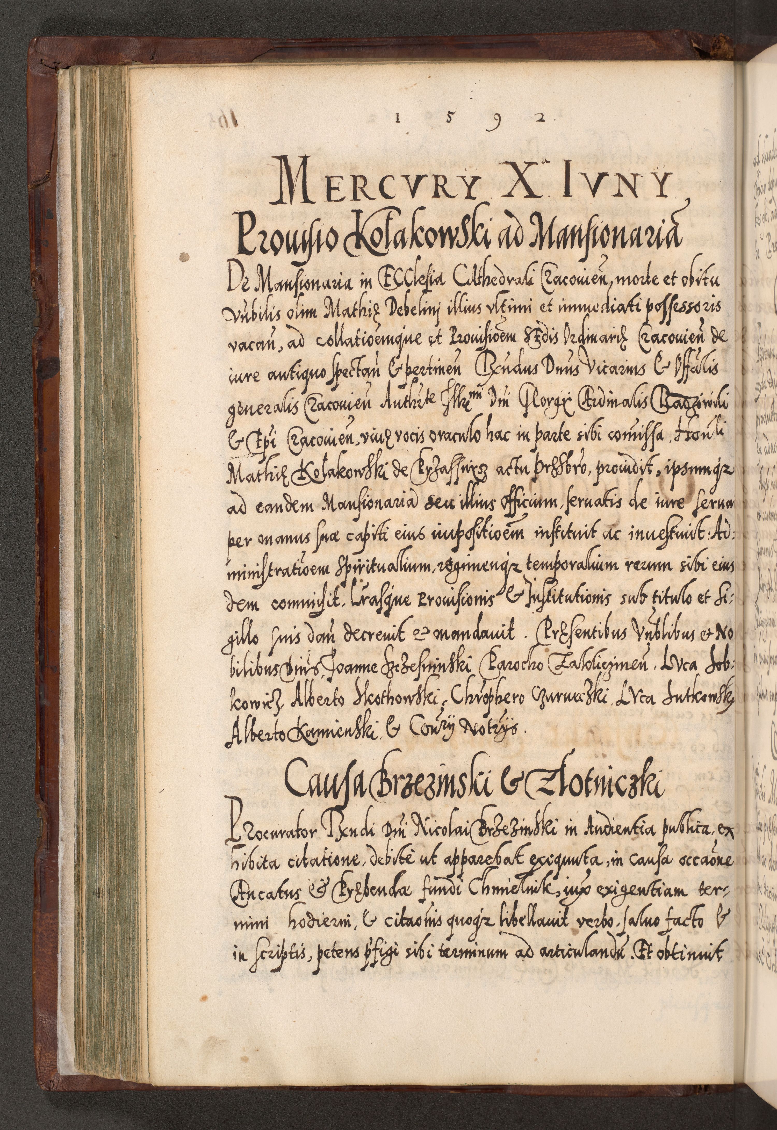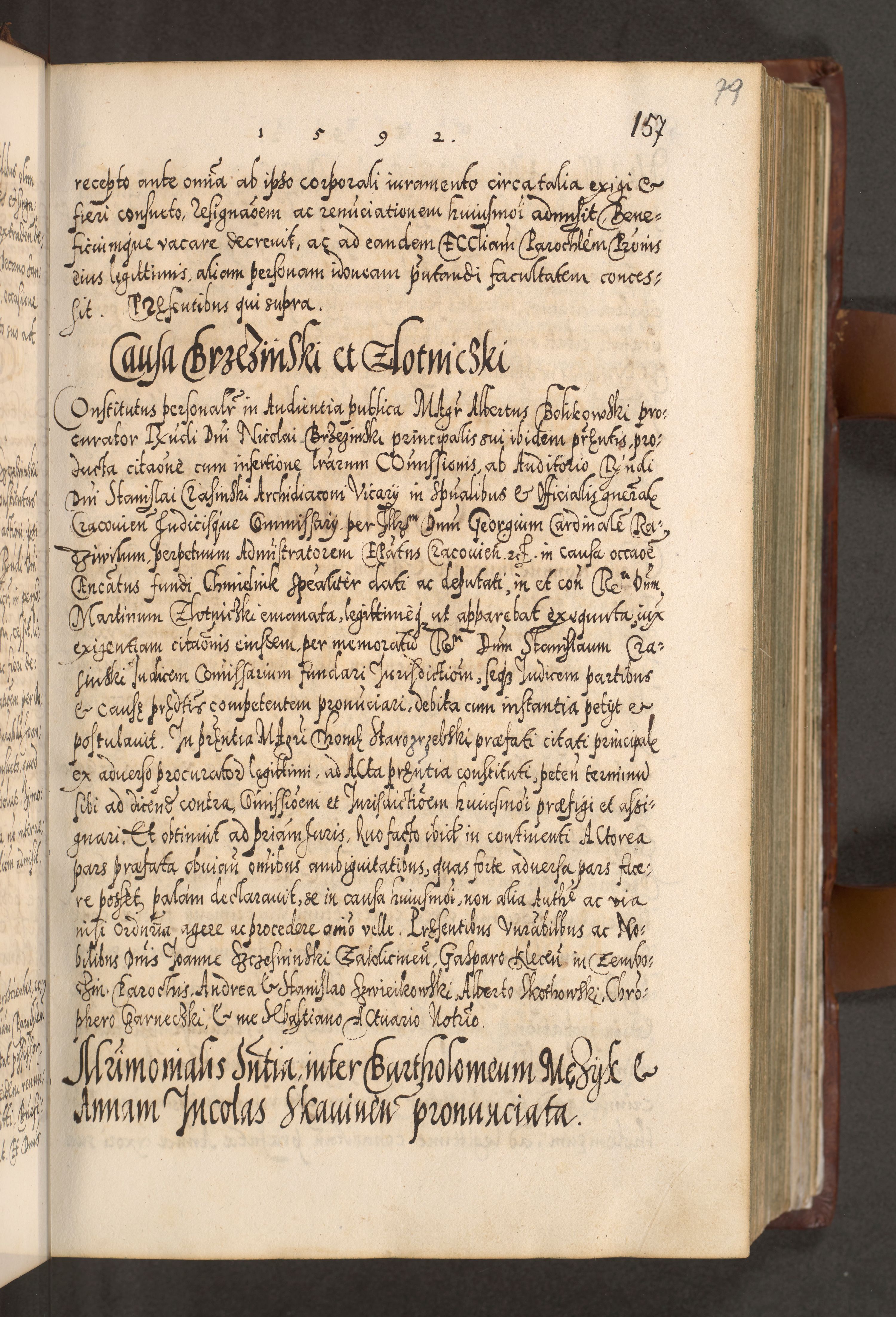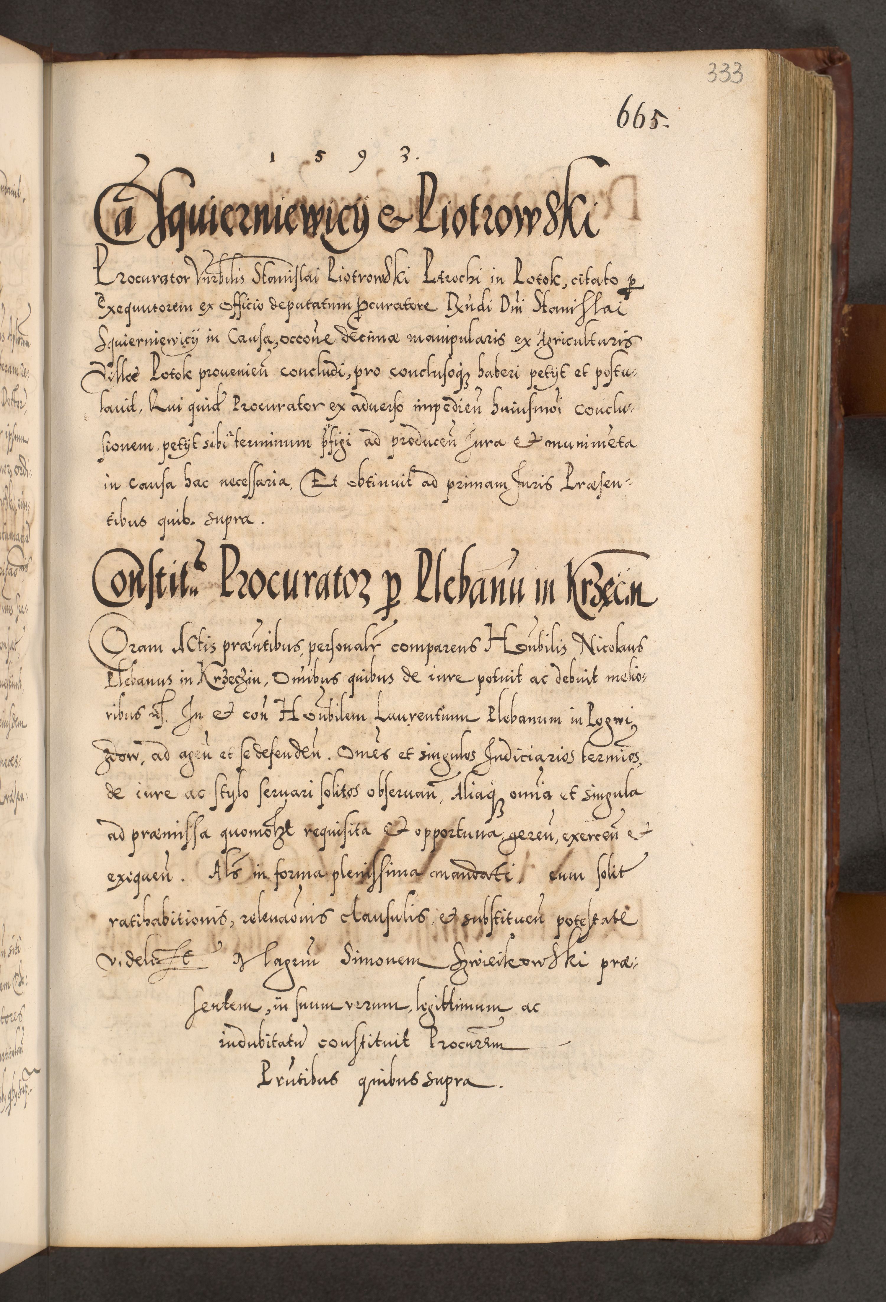 Illistrissimo et revedissimo in Christo Patre Domino Domino Georgio Rzadziwił Miserone Divina Sacrostae R. E. Tituli S. Sixti Presbitero Cardinali Duce in Olyka et Niesswiesz ad Gubernacula Ecclessiae Cracoviensis cuius administratorialem a Sancta Sede Apostolica obtinverat feliciter sedente. Acta actorum, causarum, sententiarum tam deffinitivarum quam interloquutoriarum decretorum, obligationum, quietationum, recognitionum, constitutionum procuratorum etc. coram Reverendo Domino Stanislao Crassinskz de Crasne Archidiacono Cracoviensis, Scholastico Gnesnesis, Custode Plocensis etc. Vicario et Officiali Generali Cracoviensi in Ano Domini Millesimo Quingentesimo Nonagesimo Primo cuius indictio quarta pontificatus SS. Domini Nostri Gregorii XIIII Anno I psius prio feliciter incipiut