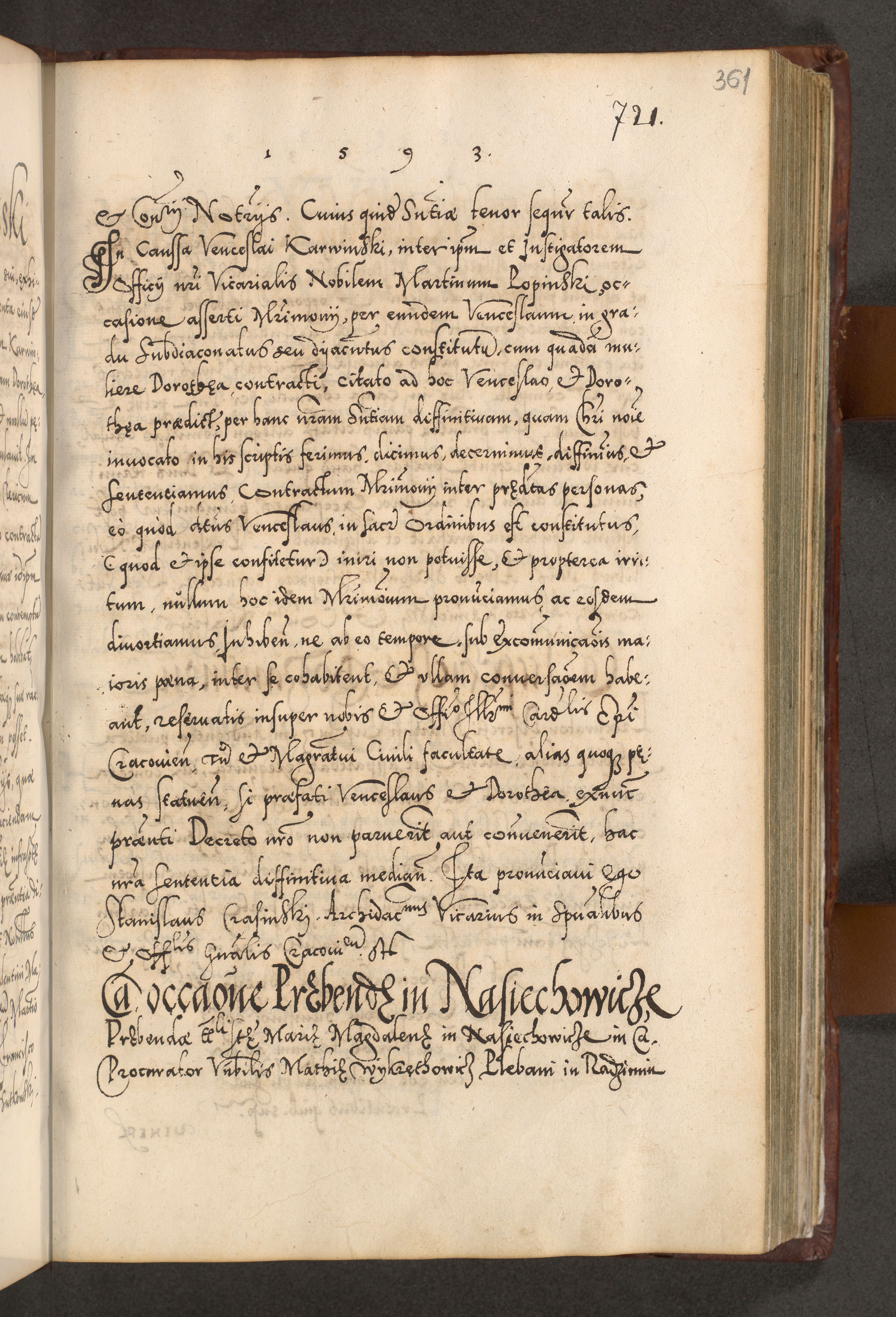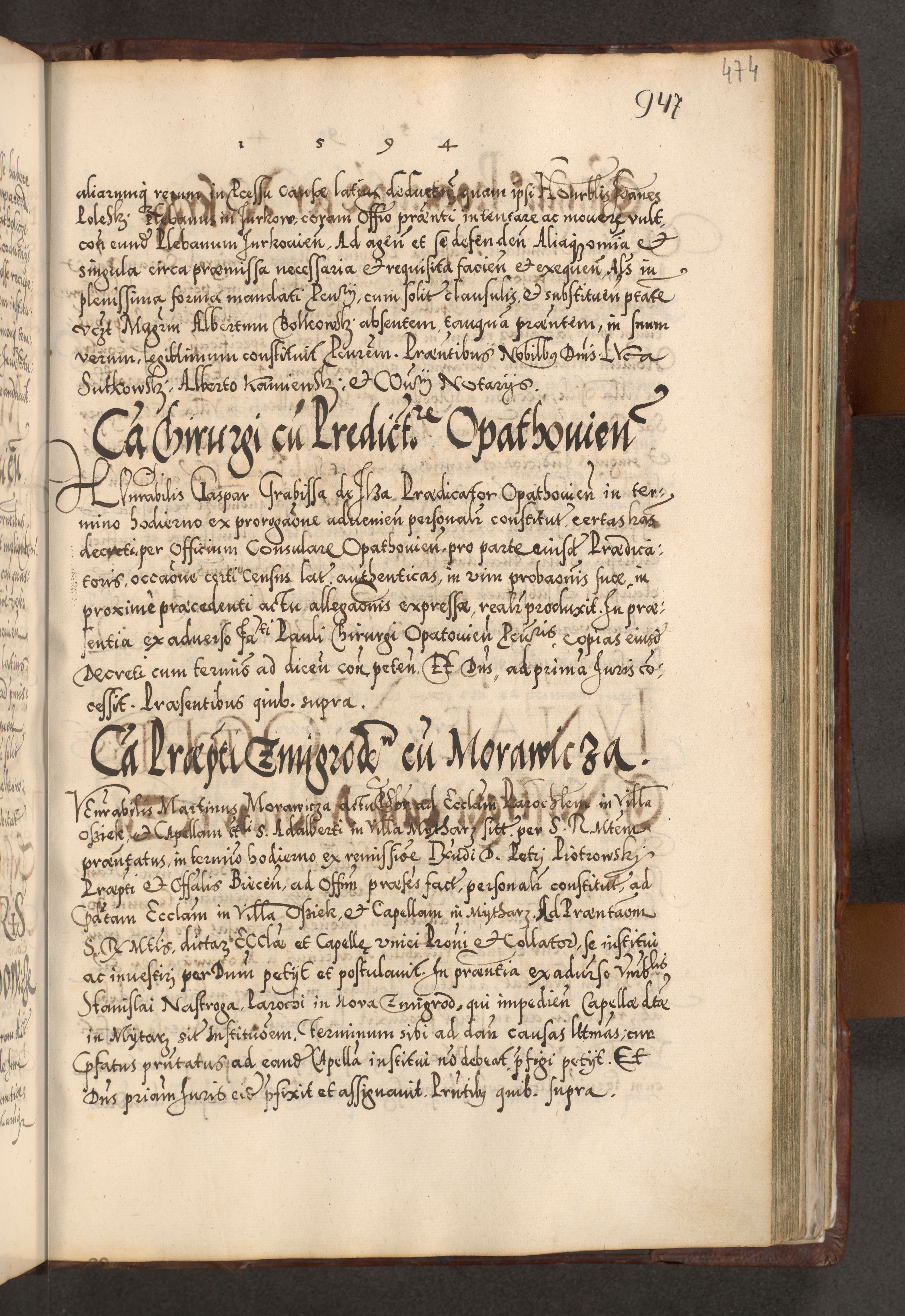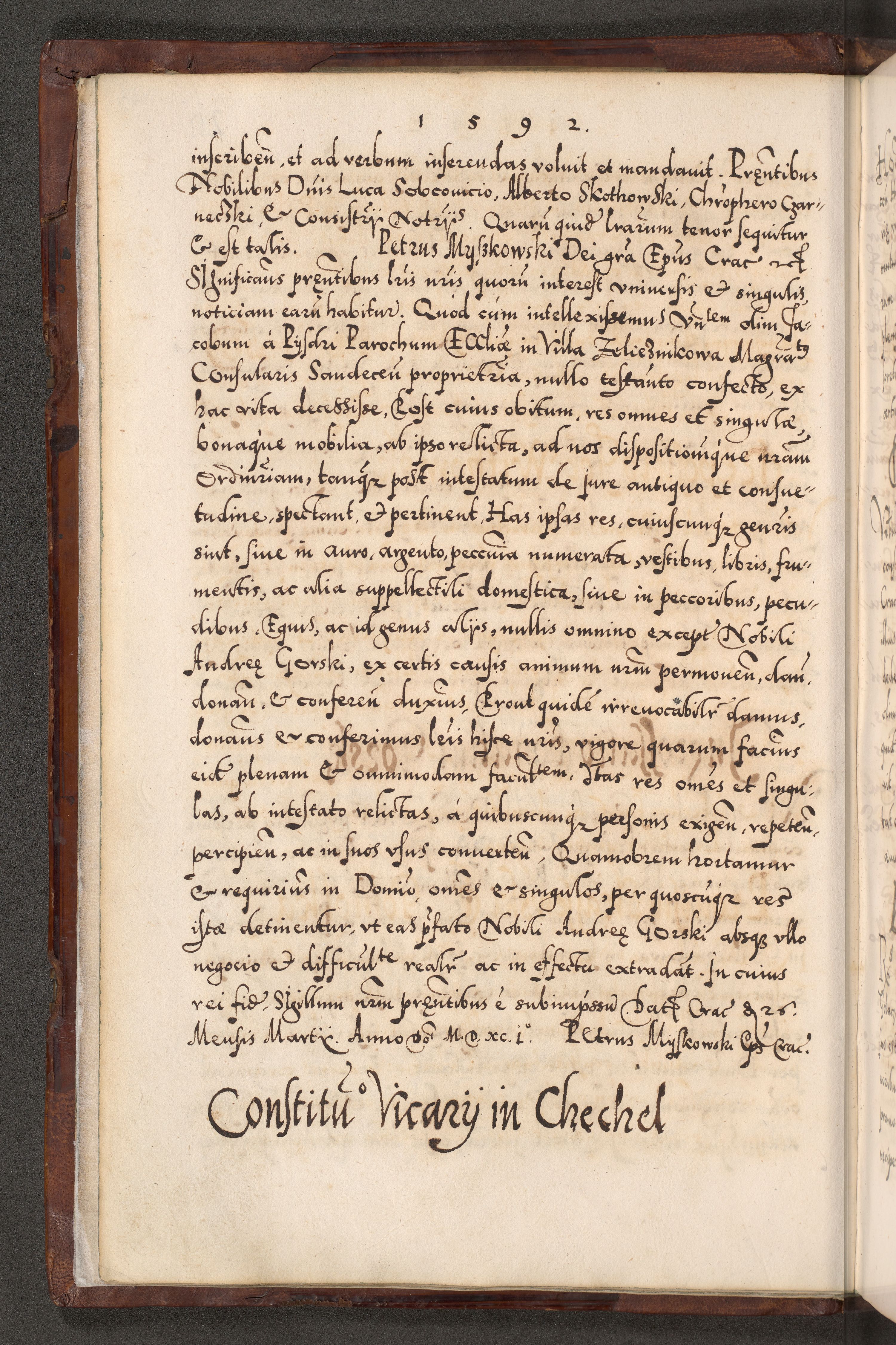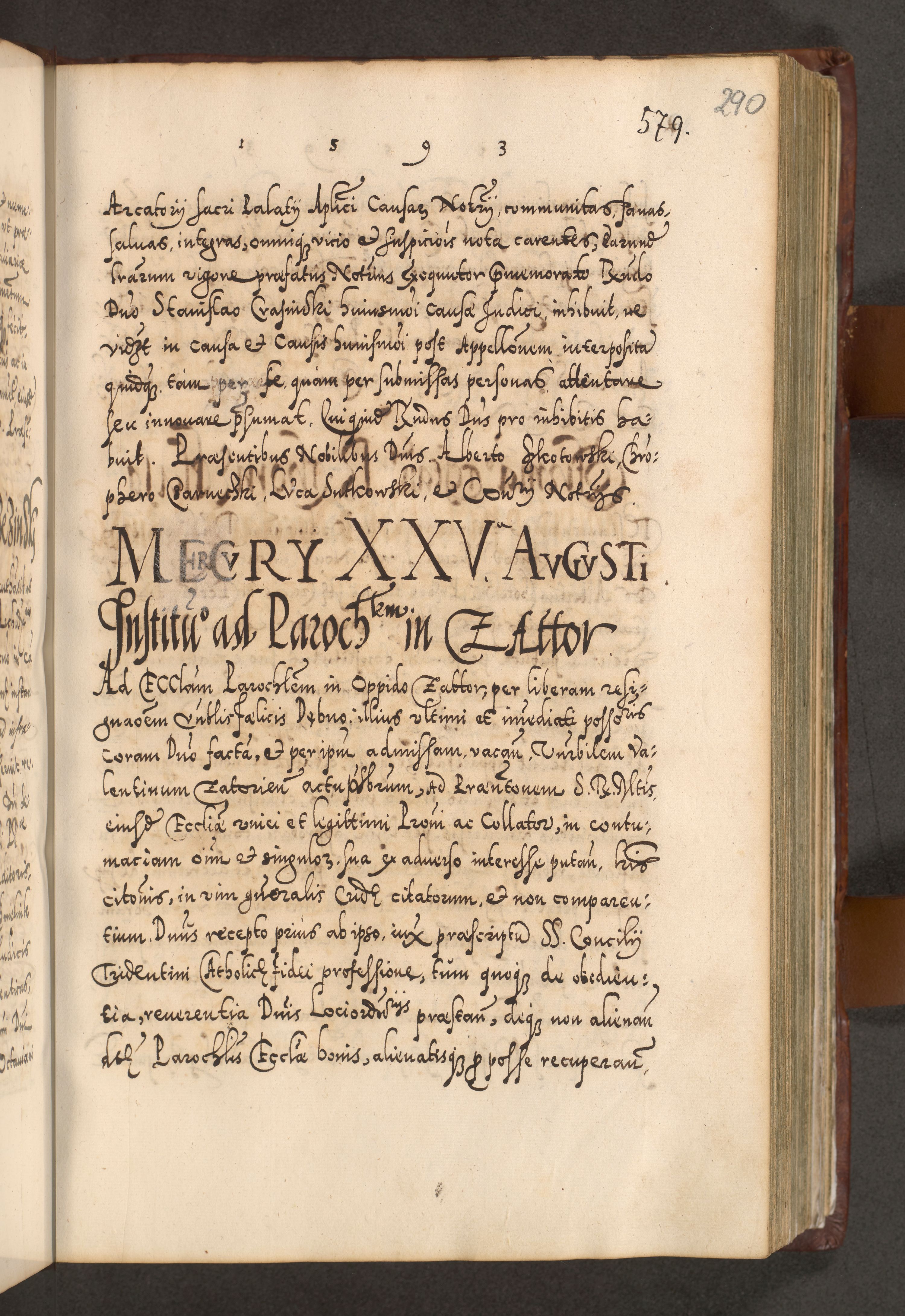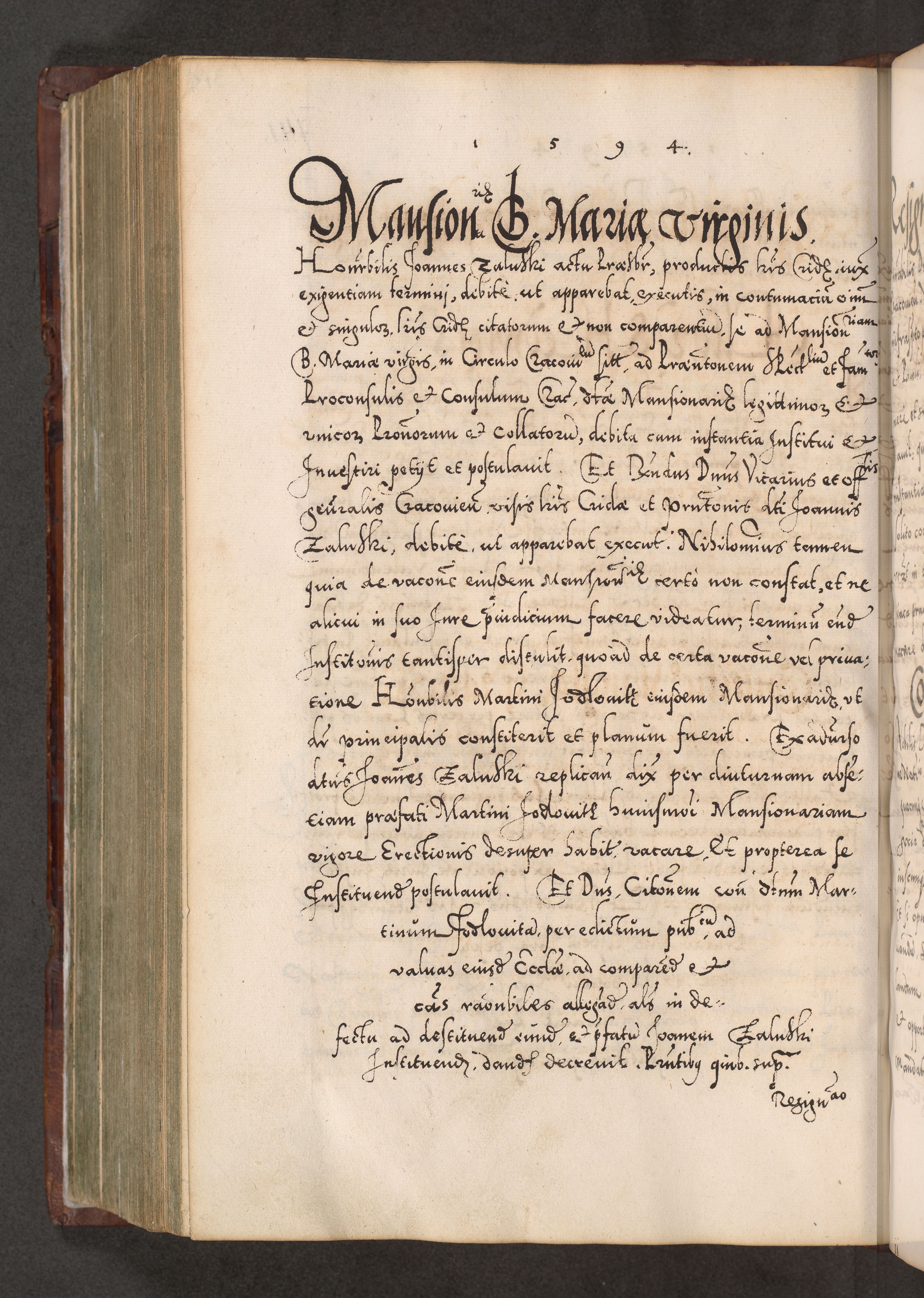 Illistrissimo et revedissimo in Christo Patre Domino Domino Georgio Rzadziwił Miserone Divina Sacrostae R. E. Tituli S. Sixti Presbitero Cardinali Duce in Olyka et Niesswiesz ad Gubernacula Ecclessiae Cracoviensis cuius administratorialem a Sancta Sede Apostolica obtinverat feliciter sedente. Acta actorum, causarum, sententiarum tam deffinitivarum quam interloquutoriarum decretorum, obligationum, quietationum, recognitionum, constitutionum procuratorum etc. coram Reverendo Domino Stanislao Crassinskz de Crasne Archidiacono Cracoviensis, Scholastico Gnesnesis, Custode Plocensis etc. Vicario et Officiali Generali Cracoviensi in Ano Domini Millesimo Quingentesimo Nonagesimo Primo cuius indictio quarta pontificatus SS. Domini Nostri Gregorii XIIII Anno I psius prio feliciter incipiut