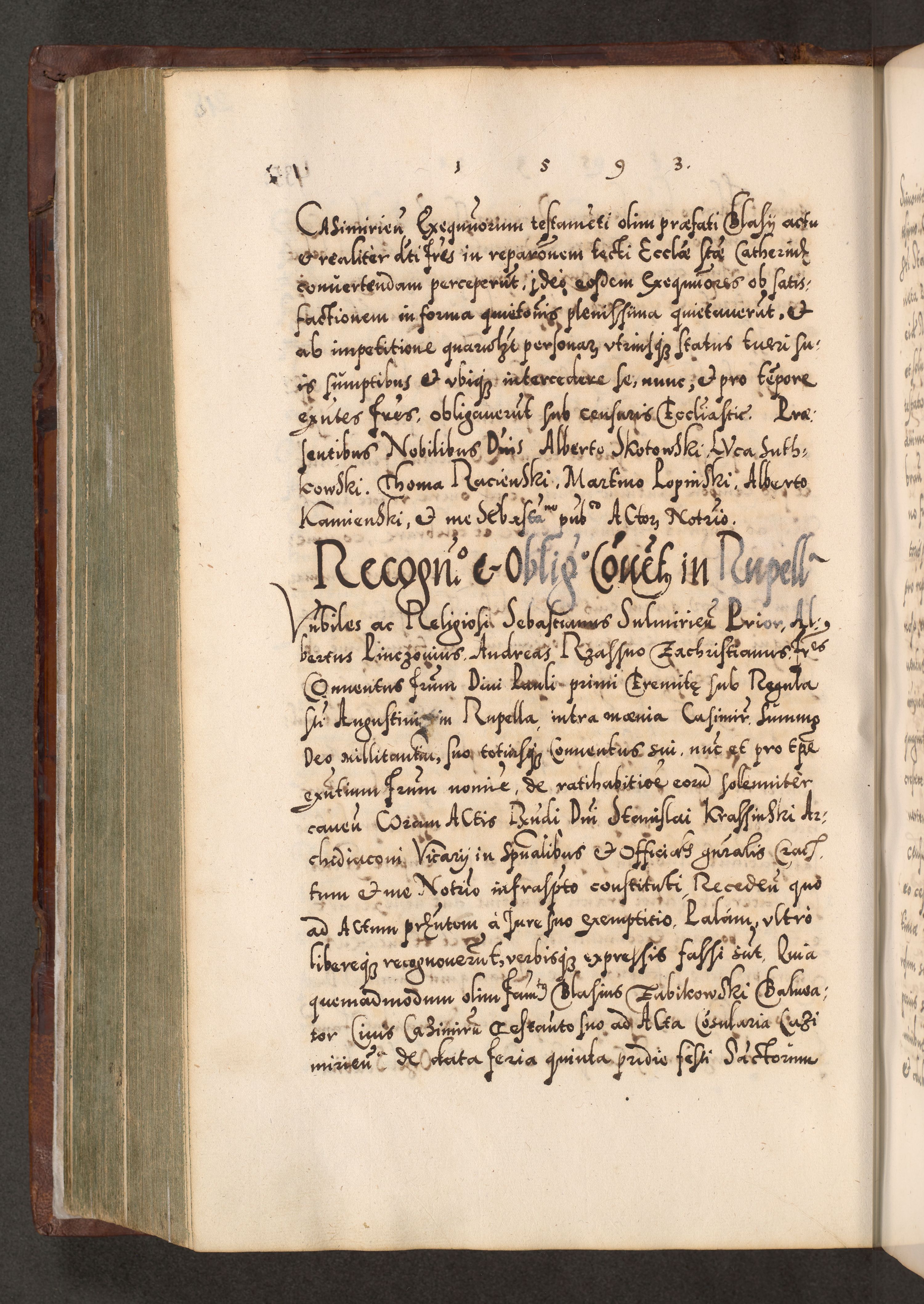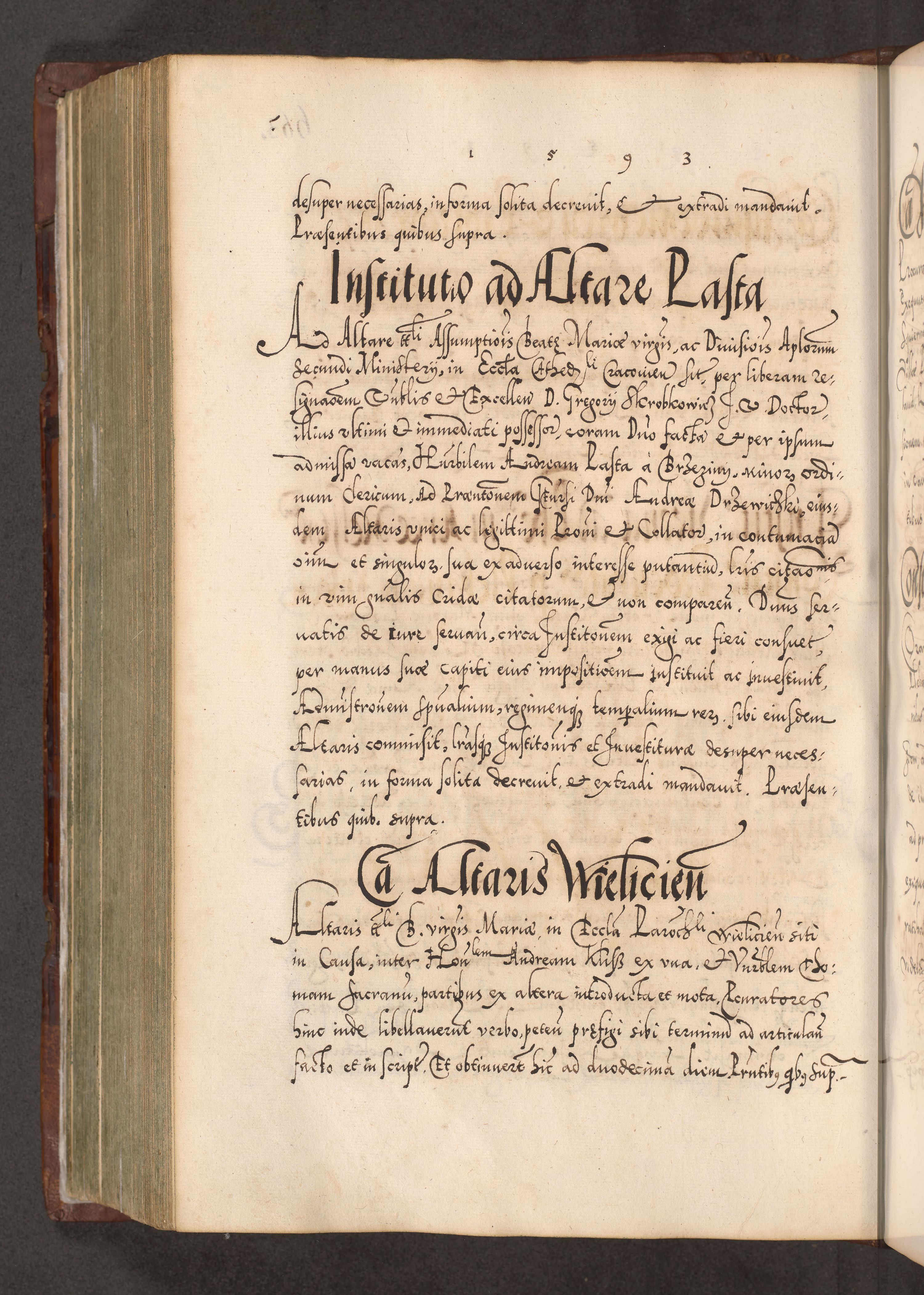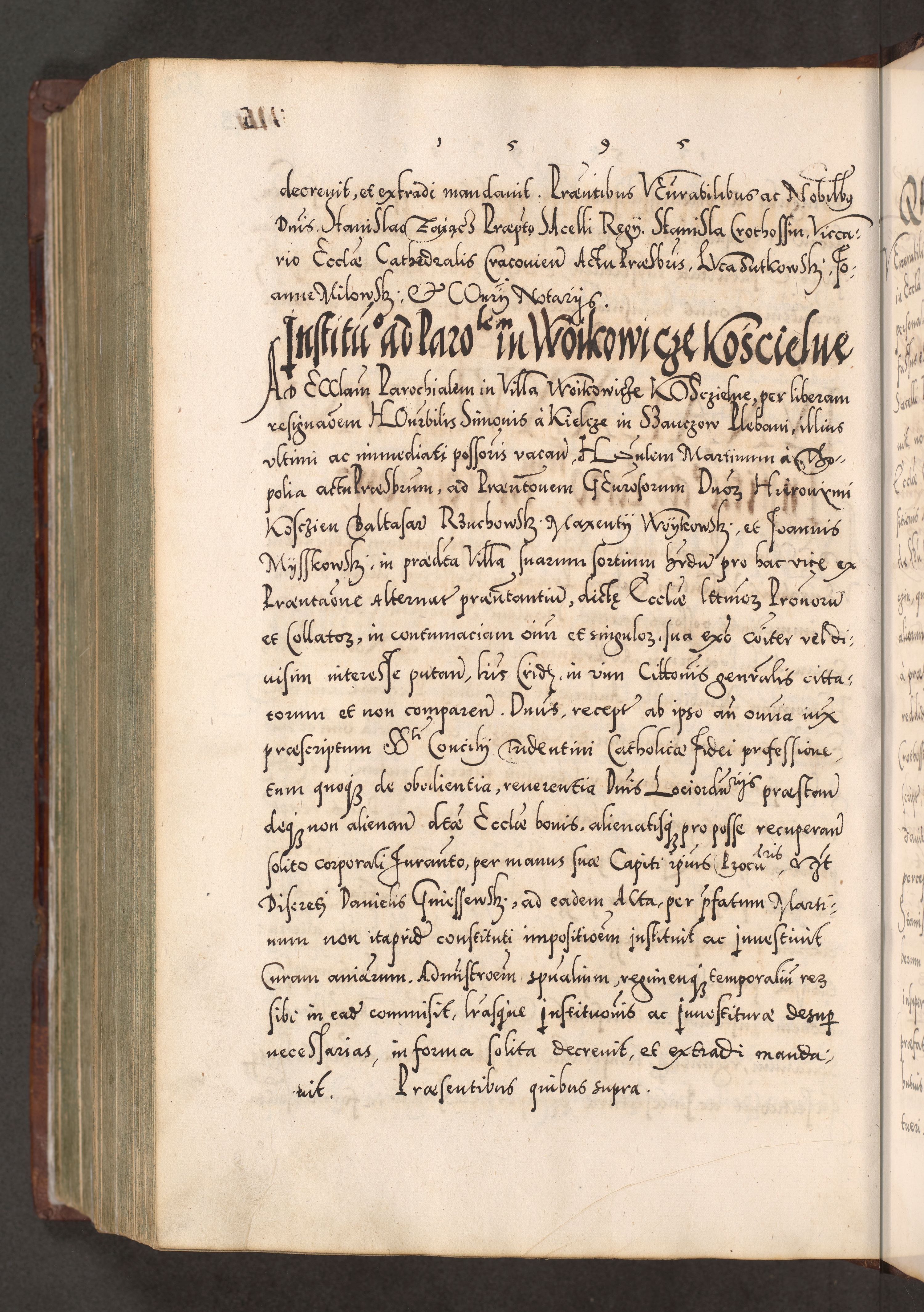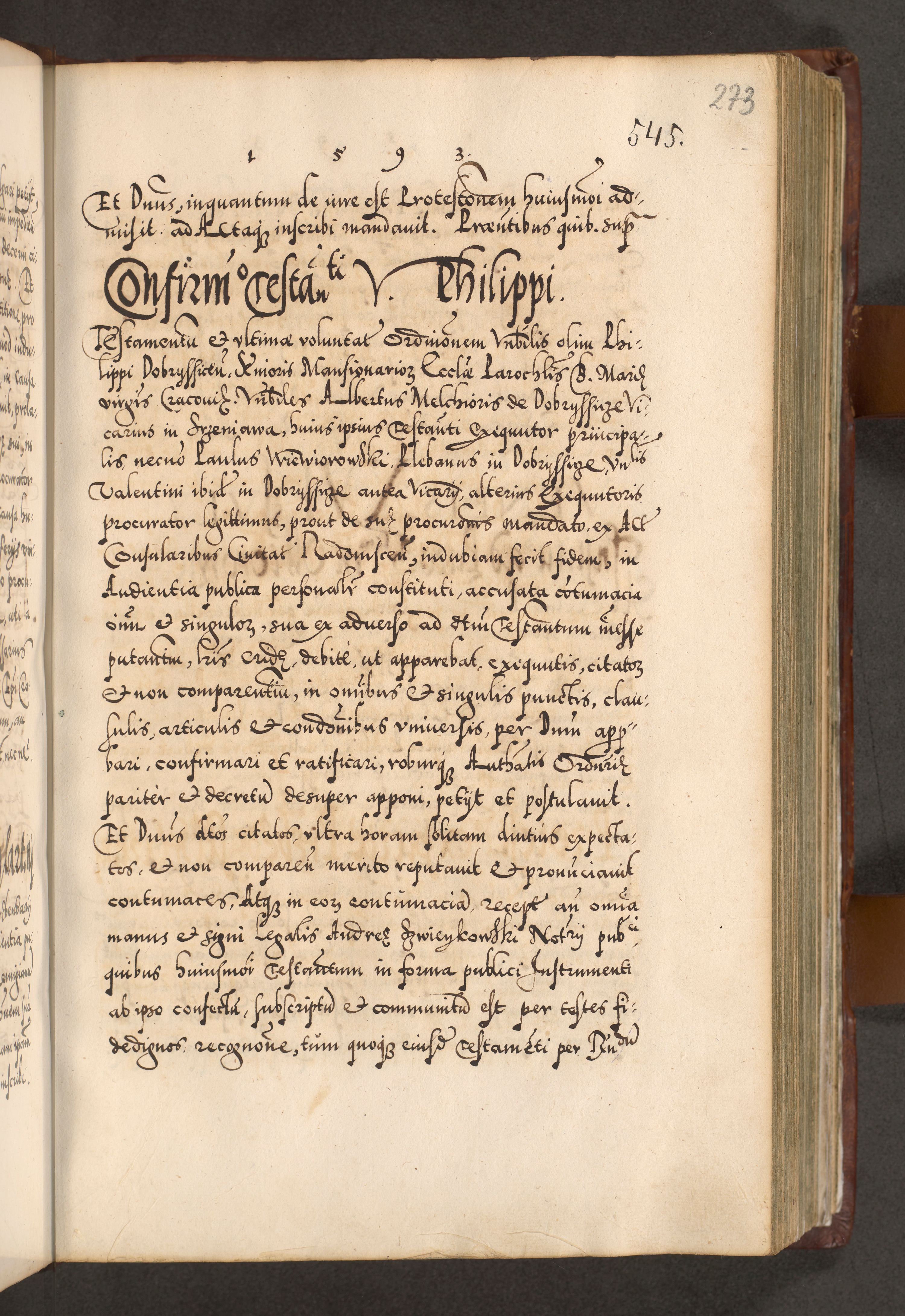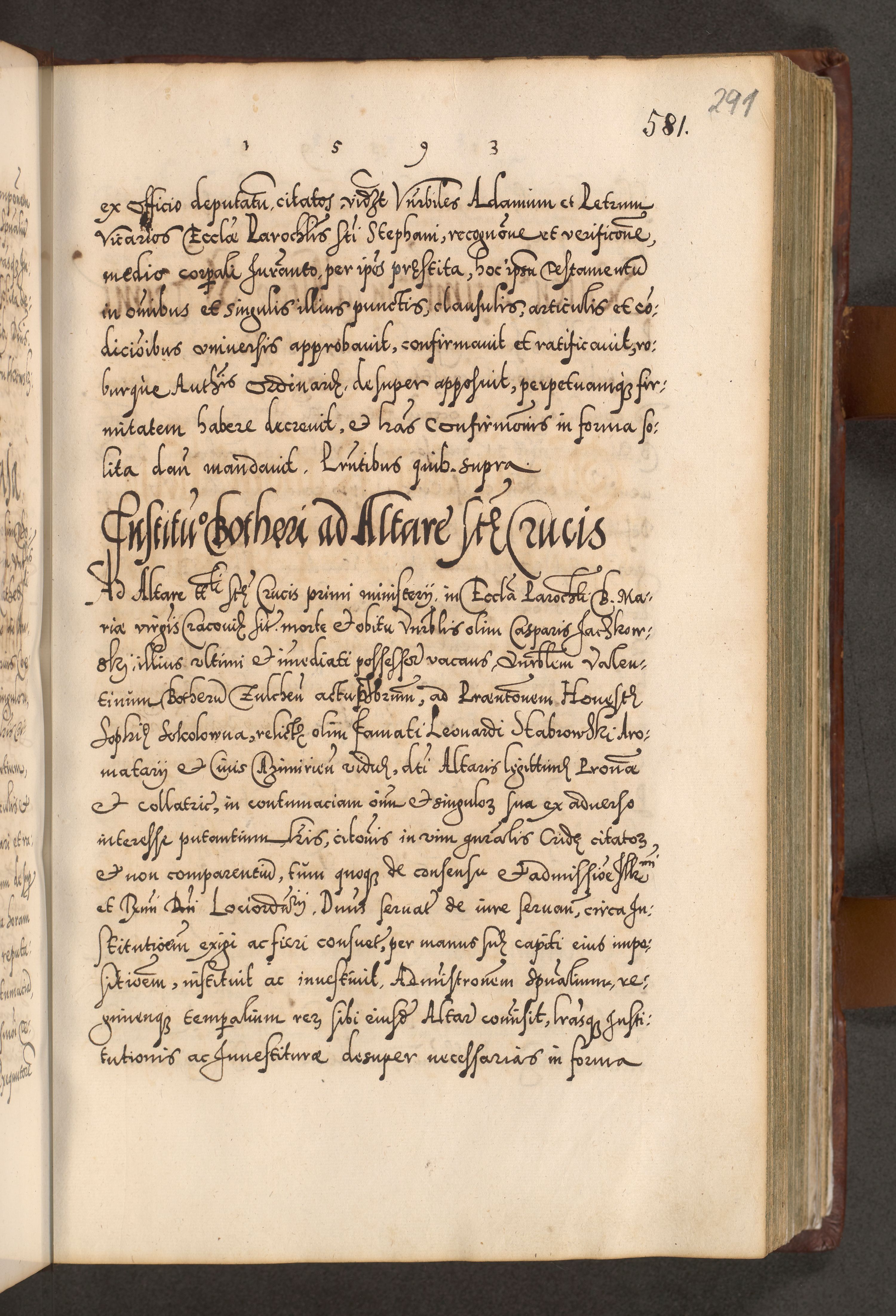 Illistrissimo et revedissimo in Christo Patre Domino Domino Georgio Rzadziwił Miserone Divina Sacrostae R. E. Tituli S. Sixti Presbitero Cardinali Duce in Olyka et Niesswiesz ad Gubernacula Ecclessiae Cracoviensis cuius administratorialem a Sancta Sede Apostolica obtinverat feliciter sedente. Acta actorum, causarum, sententiarum tam deffinitivarum quam interloquutoriarum decretorum, obligationum, quietationum, recognitionum, constitutionum procuratorum etc. coram Reverendo Domino Stanislao Crassinskz de Crasne Archidiacono Cracoviensis, Scholastico Gnesnesis, Custode Plocensis etc. Vicario et Officiali Generali Cracoviensi in Ano Domini Millesimo Quingentesimo Nonagesimo Primo cuius indictio quarta pontificatus SS. Domini Nostri Gregorii XIIII Anno I psius prio feliciter incipiut