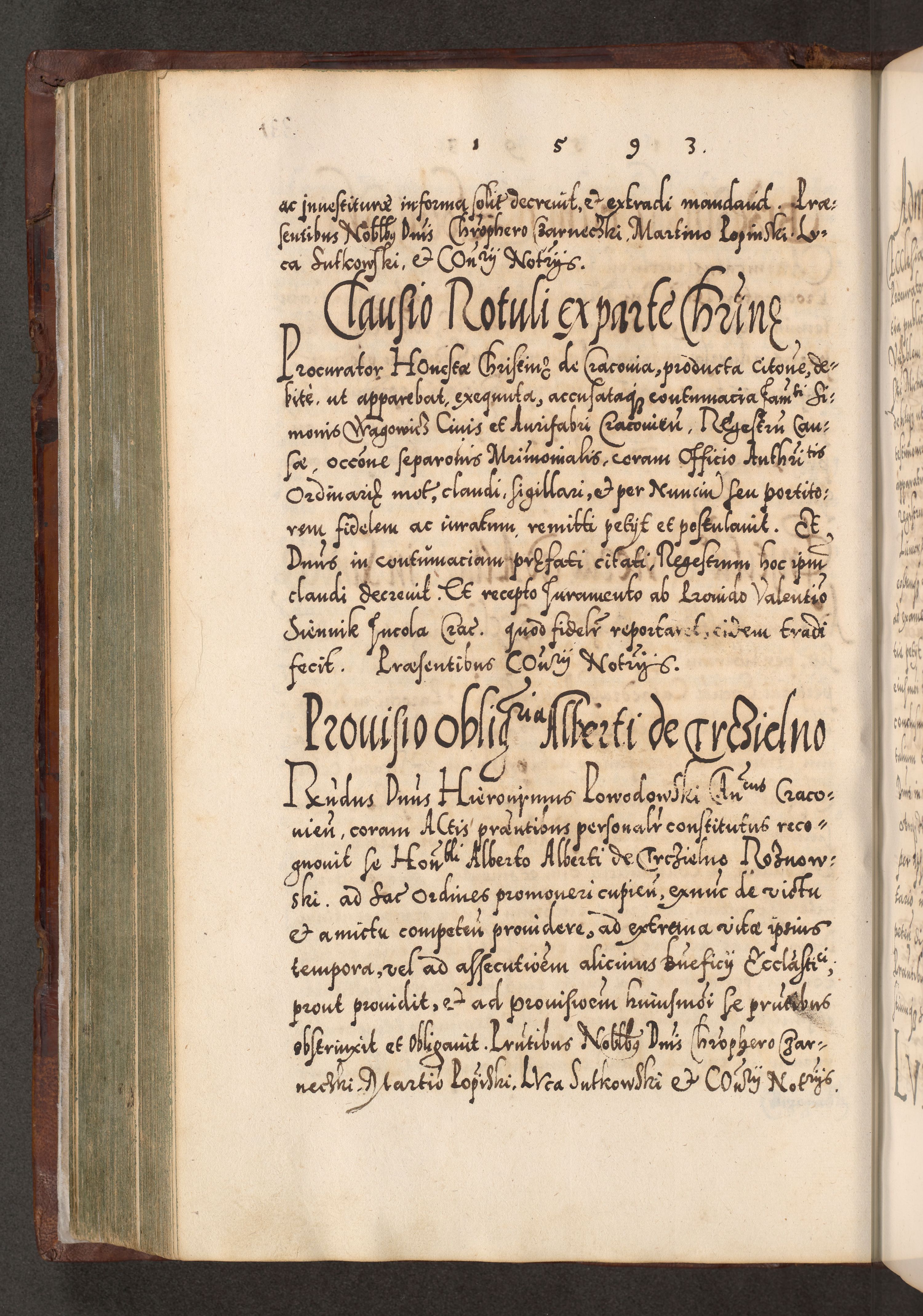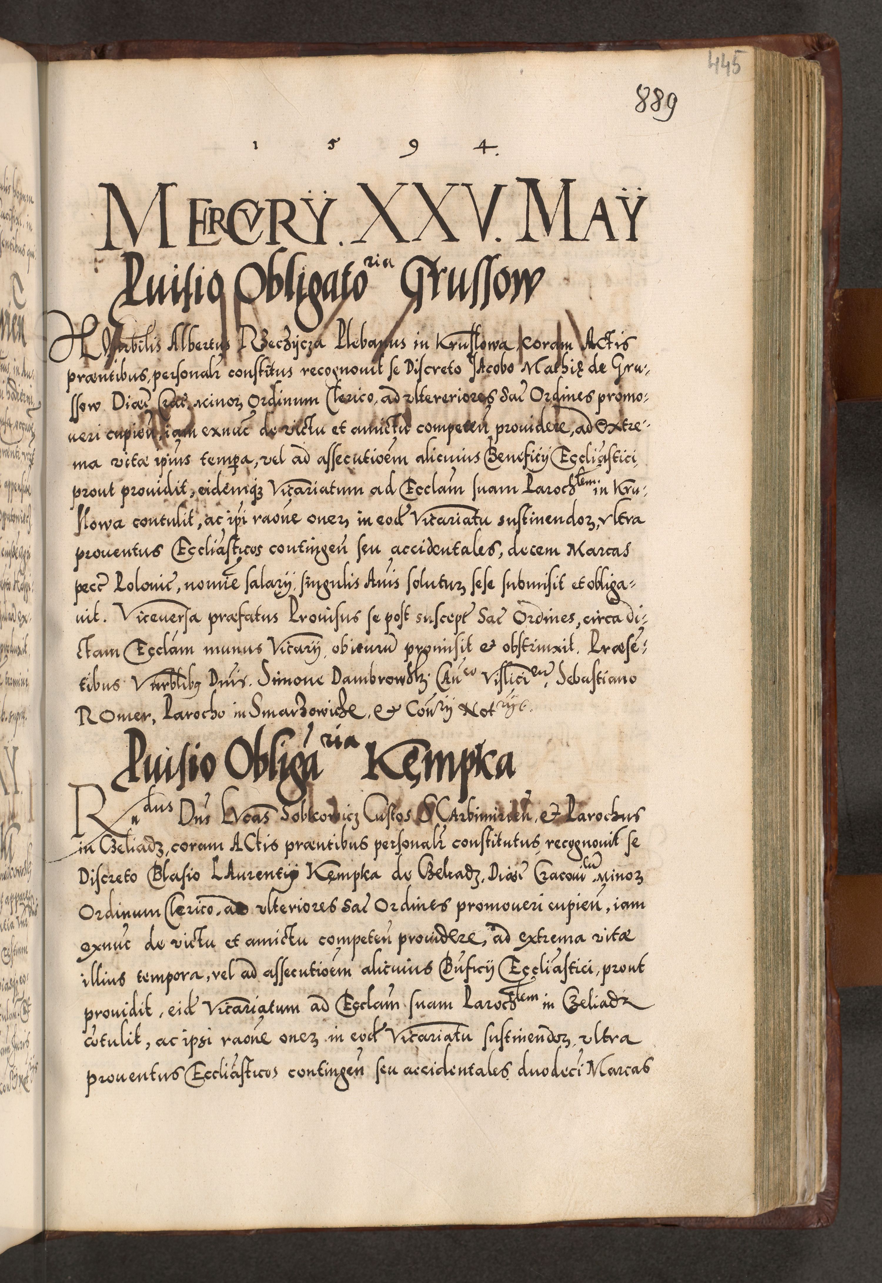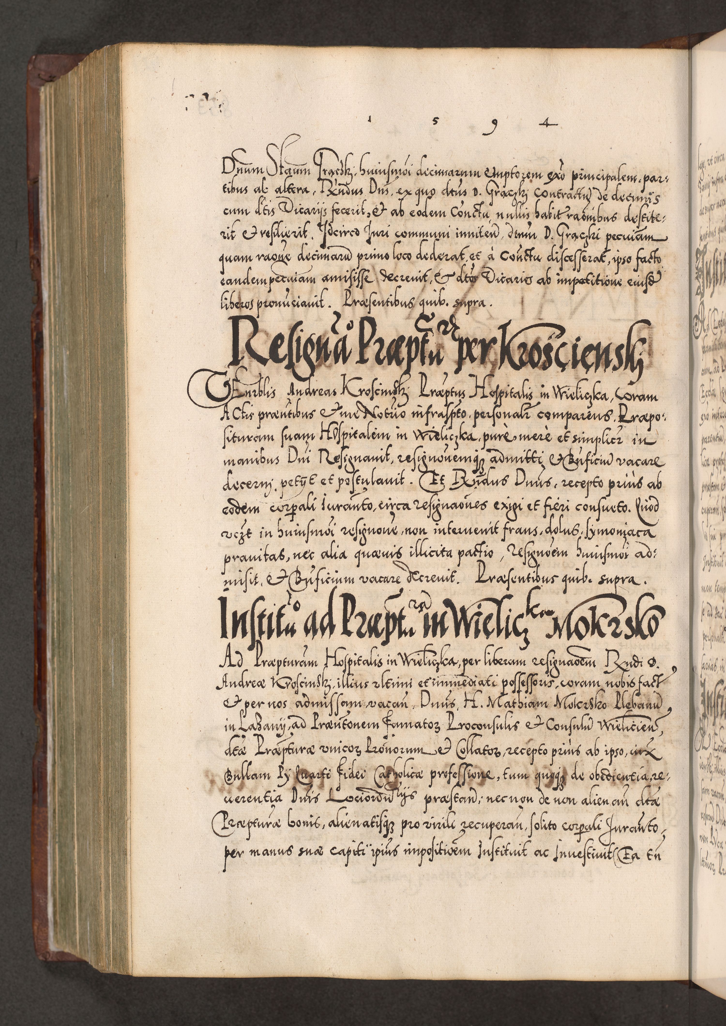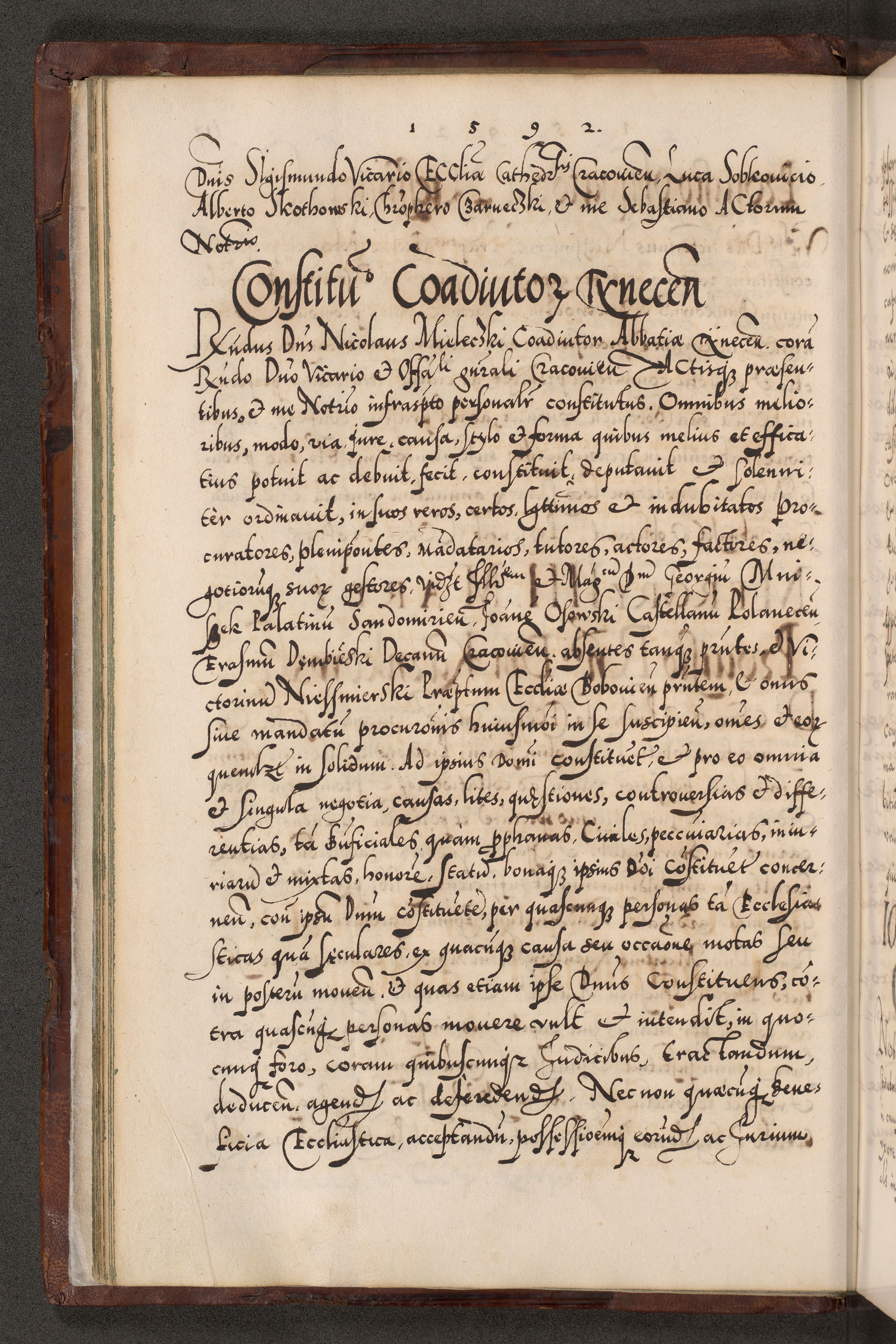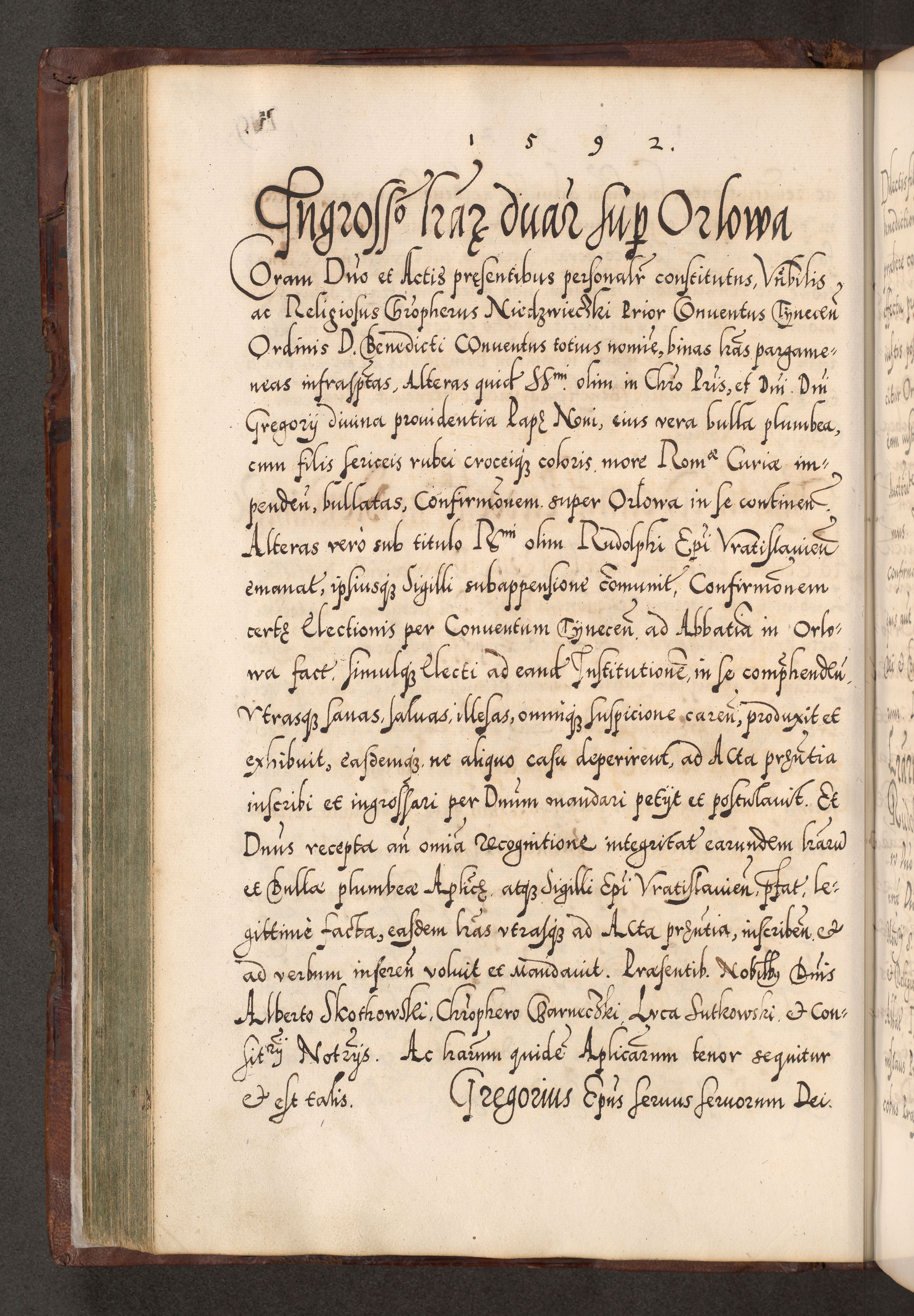 Illistrissimo et revedissimo in Christo Patre Domino Domino Georgio Rzadziwił Miserone Divina Sacrostae R. E. Tituli S. Sixti Presbitero Cardinali Duce in Olyka et Niesswiesz ad Gubernacula Ecclessiae Cracoviensis cuius administratorialem a Sancta Sede Apostolica obtinverat feliciter sedente. Acta actorum, causarum, sententiarum tam deffinitivarum quam interloquutoriarum decretorum, obligationum, quietationum, recognitionum, constitutionum procuratorum etc. coram Reverendo Domino Stanislao Crassinskz de Crasne Archidiacono Cracoviensis, Scholastico Gnesnesis, Custode Plocensis etc. Vicario et Officiali Generali Cracoviensi in Ano Domini Millesimo Quingentesimo Nonagesimo Primo cuius indictio quarta pontificatus SS. Domini Nostri Gregorii XIIII Anno I psius prio feliciter incipiut