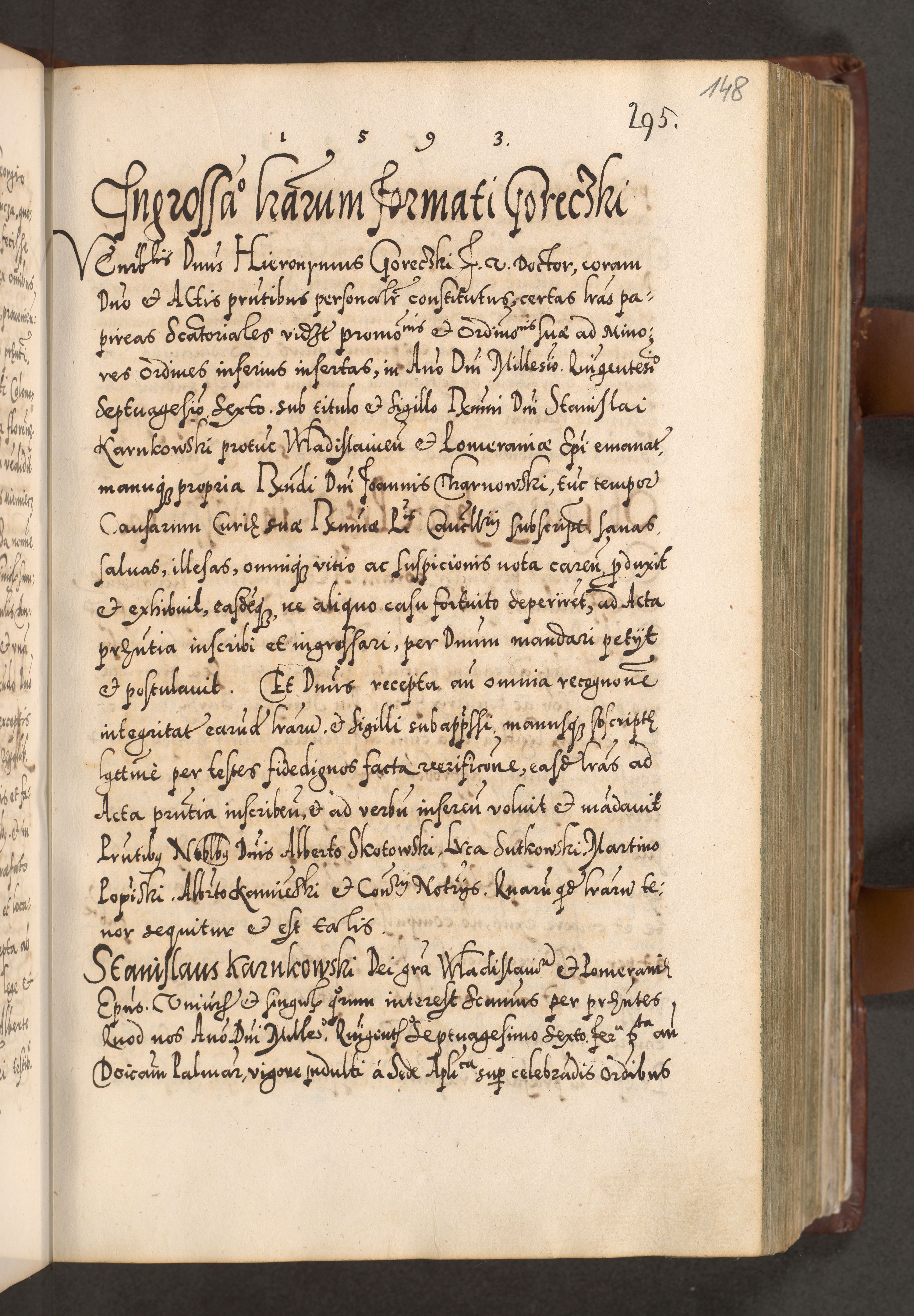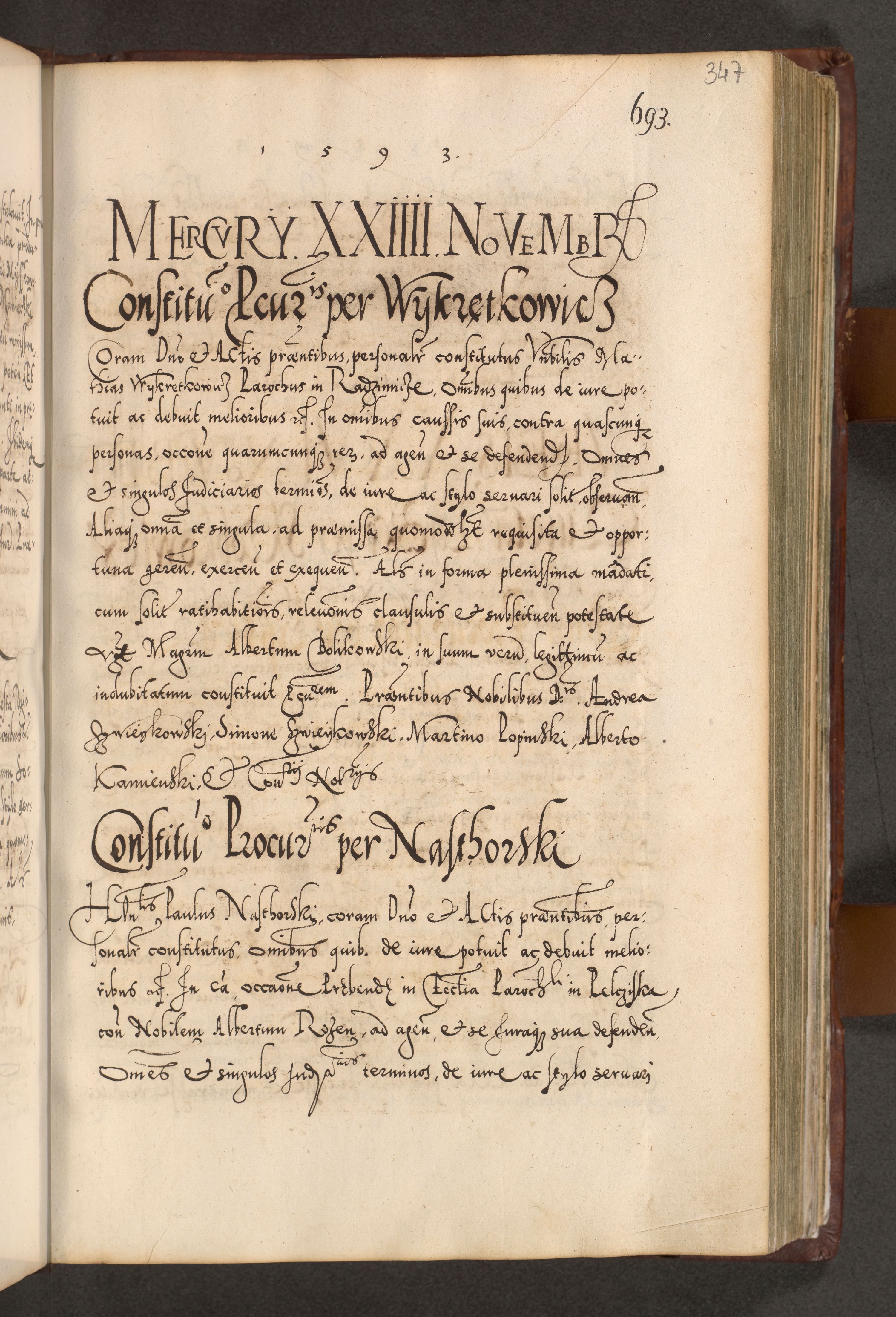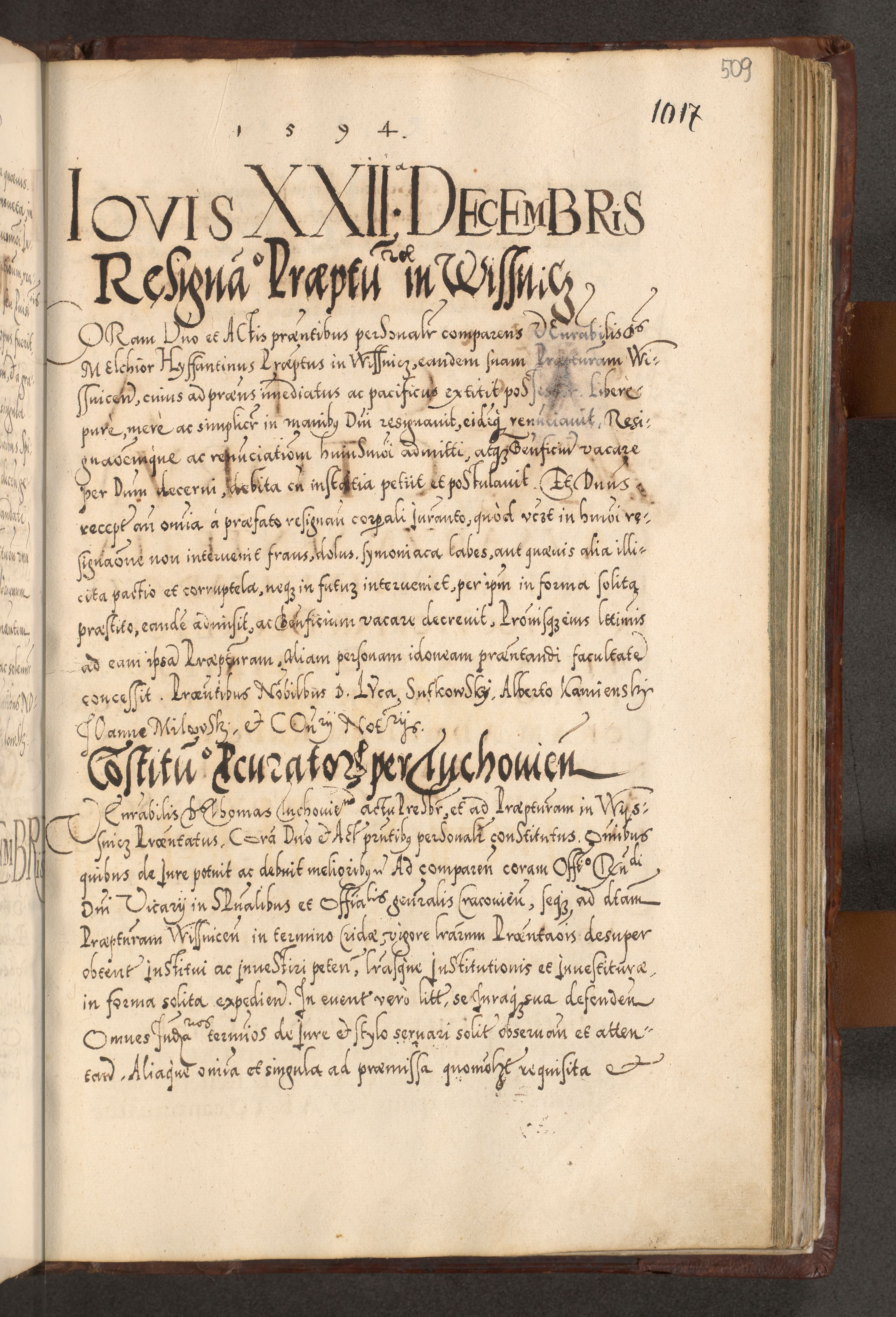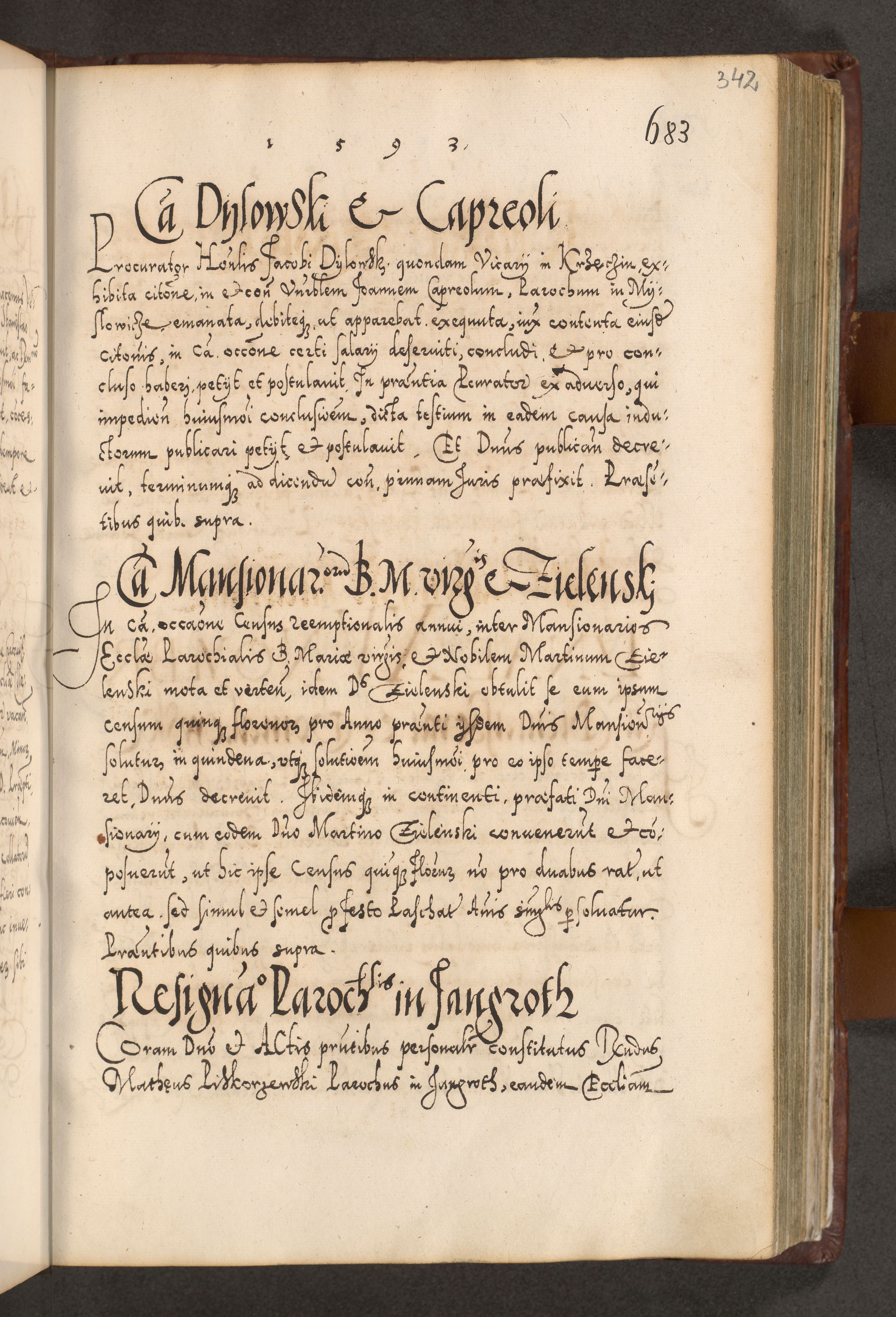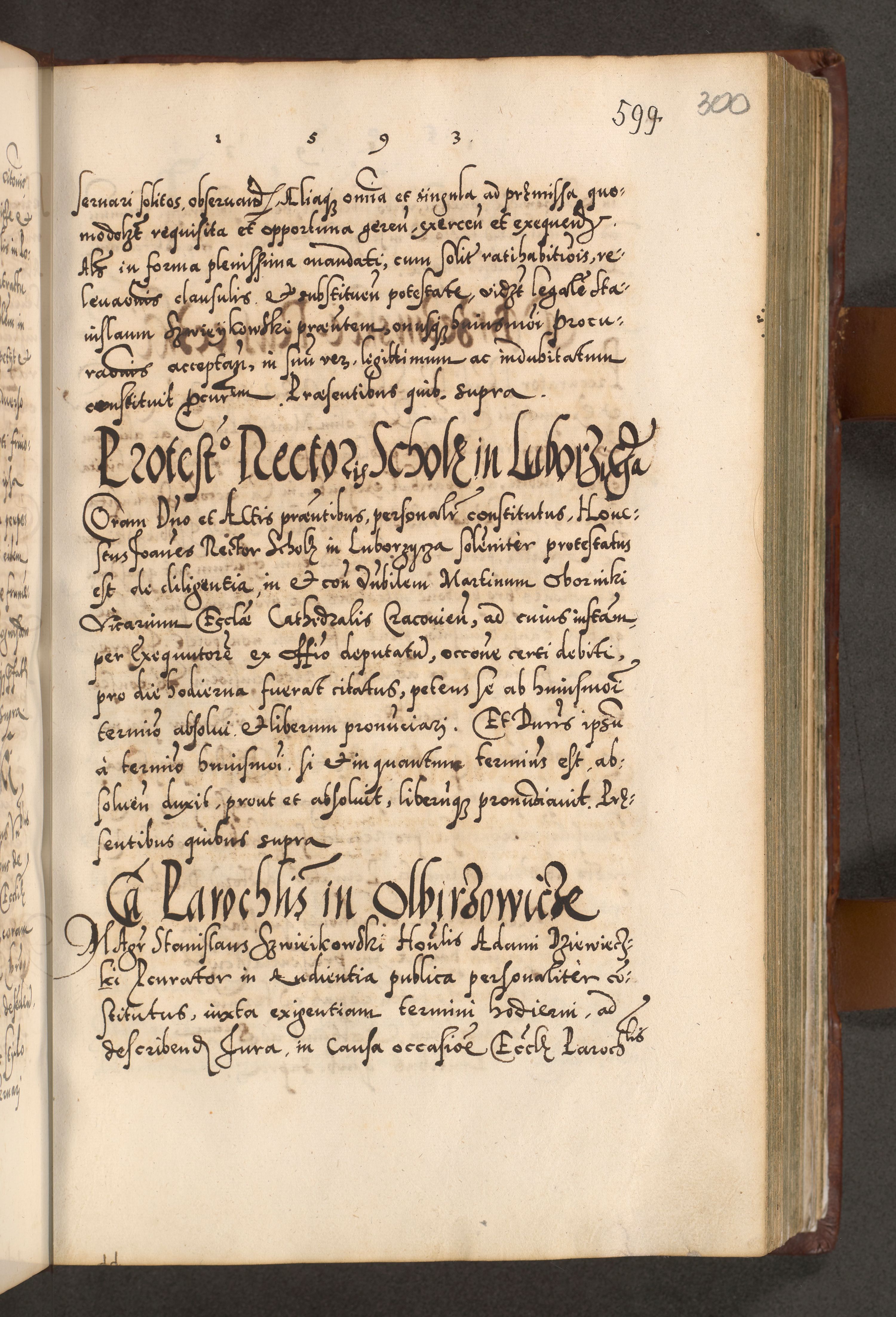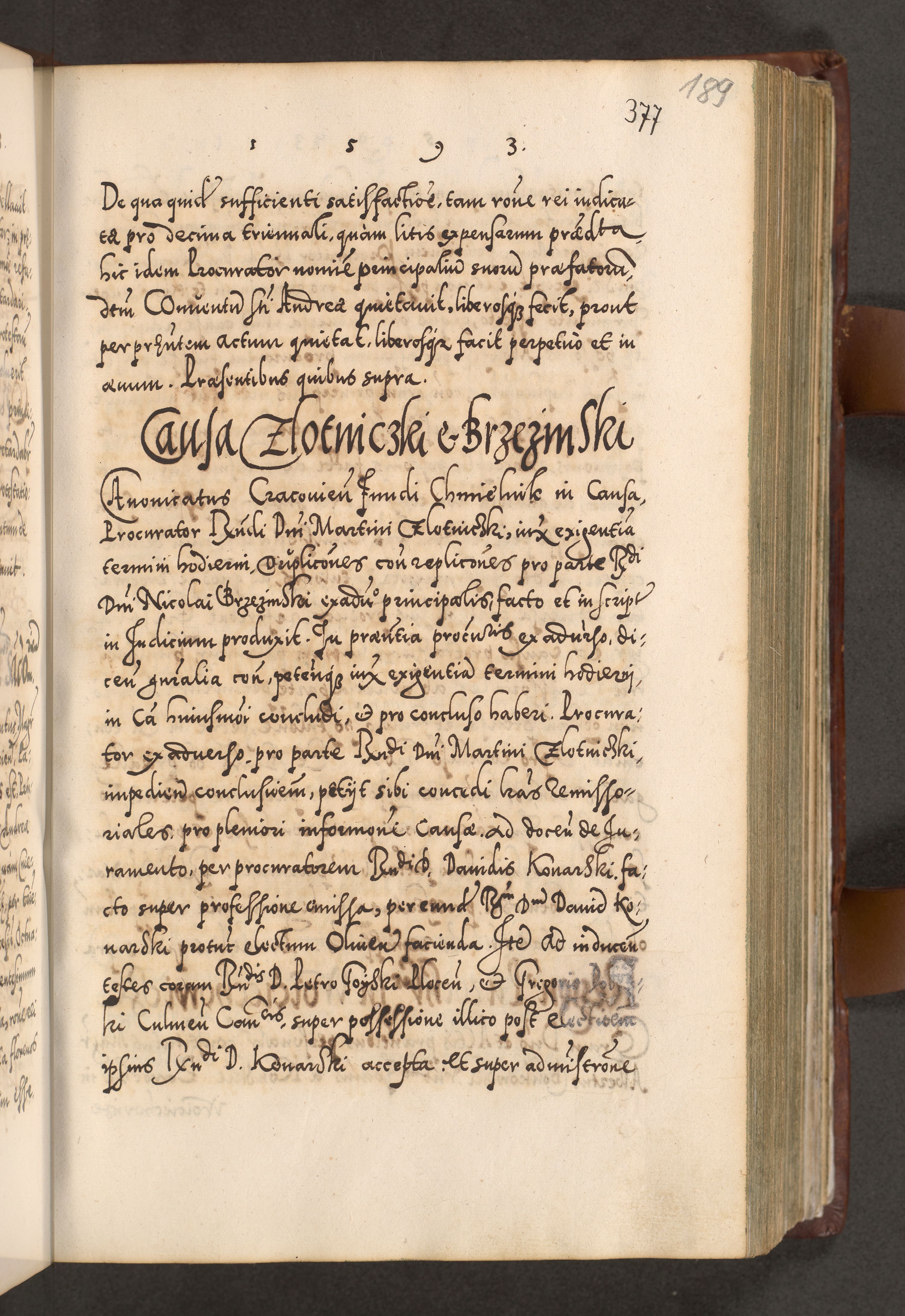 Illistrissimo et revedissimo in Christo Patre Domino Domino Georgio Rzadziwił Miserone Divina Sacrostae R. E. Tituli S. Sixti Presbitero Cardinali Duce in Olyka et Niesswiesz ad Gubernacula Ecclessiae Cracoviensis cuius administratorialem a Sancta Sede Apostolica obtinverat feliciter sedente. Acta actorum, causarum, sententiarum tam deffinitivarum quam interloquutoriarum decretorum, obligationum, quietationum, recognitionum, constitutionum procuratorum etc. coram Reverendo Domino Stanislao Crassinskz de Crasne Archidiacono Cracoviensis, Scholastico Gnesnesis, Custode Plocensis etc. Vicario et Officiali Generali Cracoviensi in Ano Domini Millesimo Quingentesimo Nonagesimo Primo cuius indictio quarta pontificatus SS. Domini Nostri Gregorii XIIII Anno I psius prio feliciter incipiut