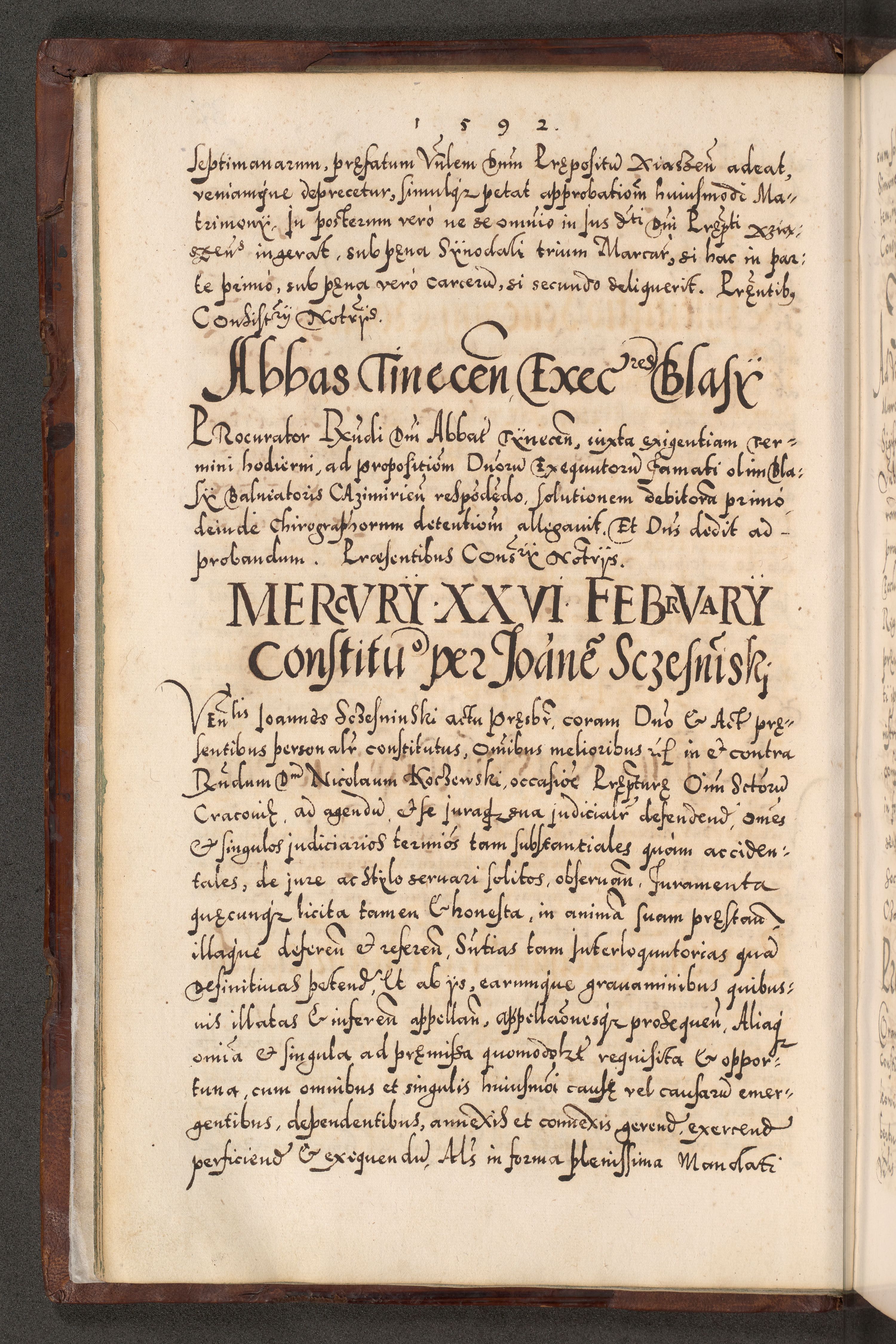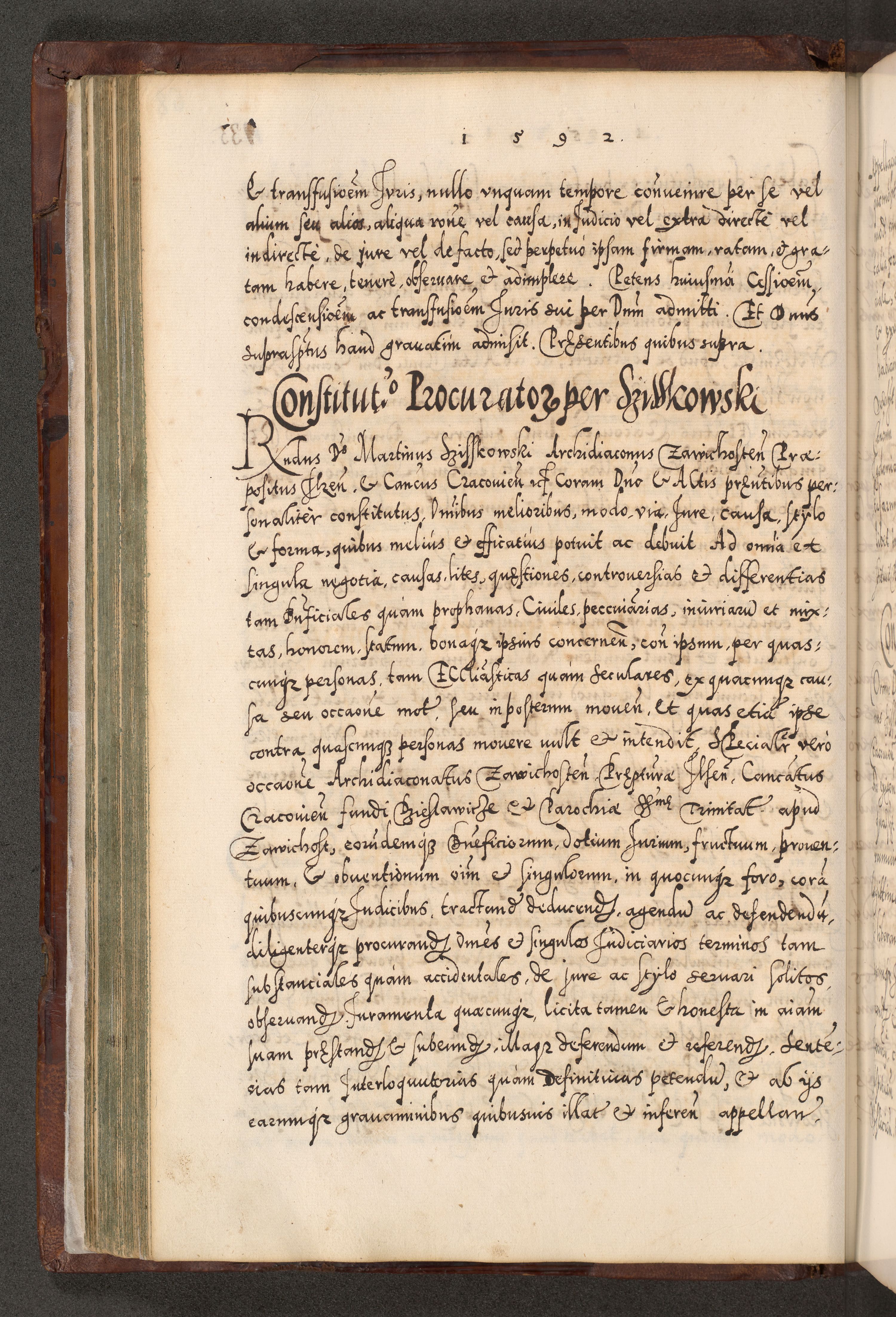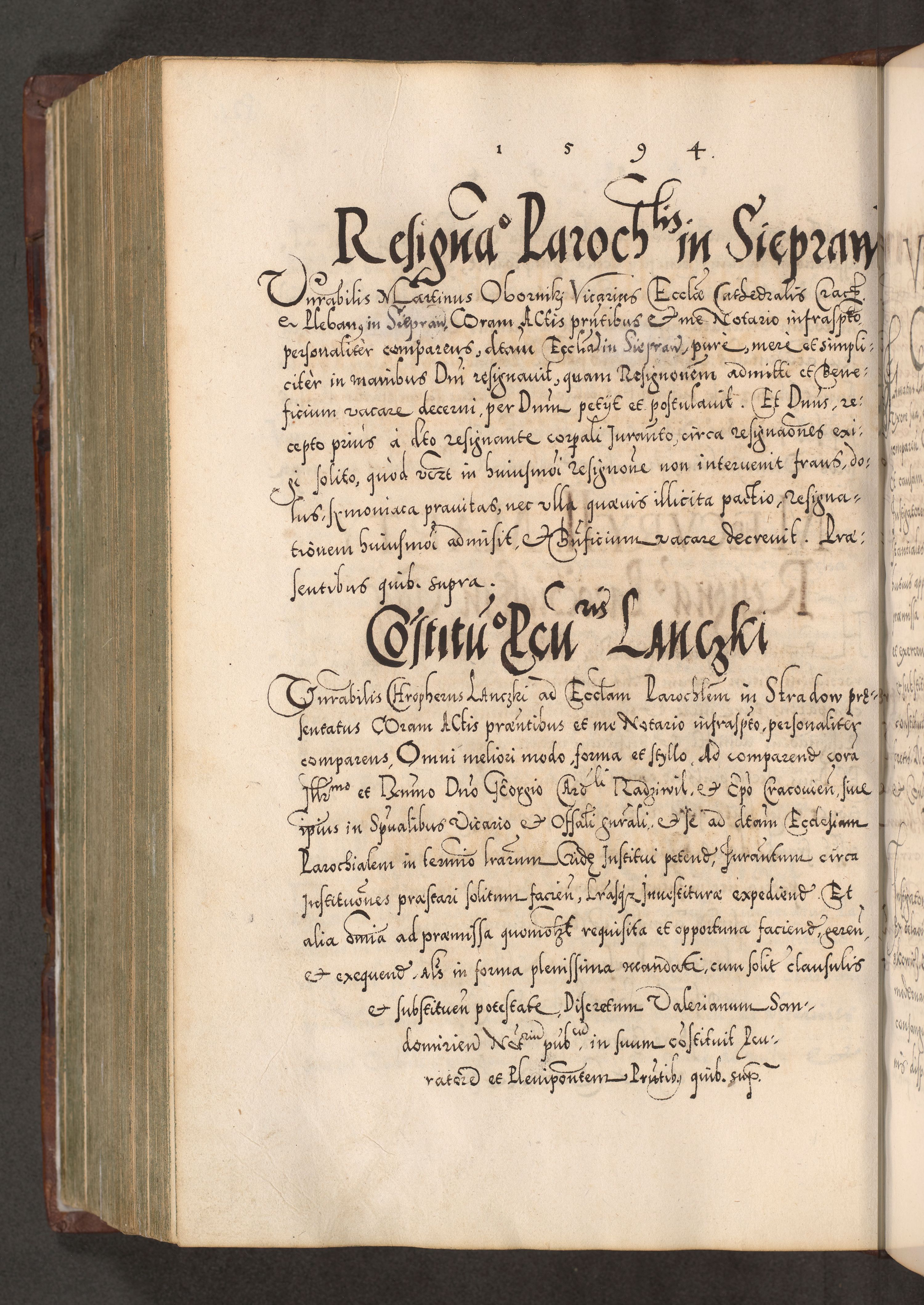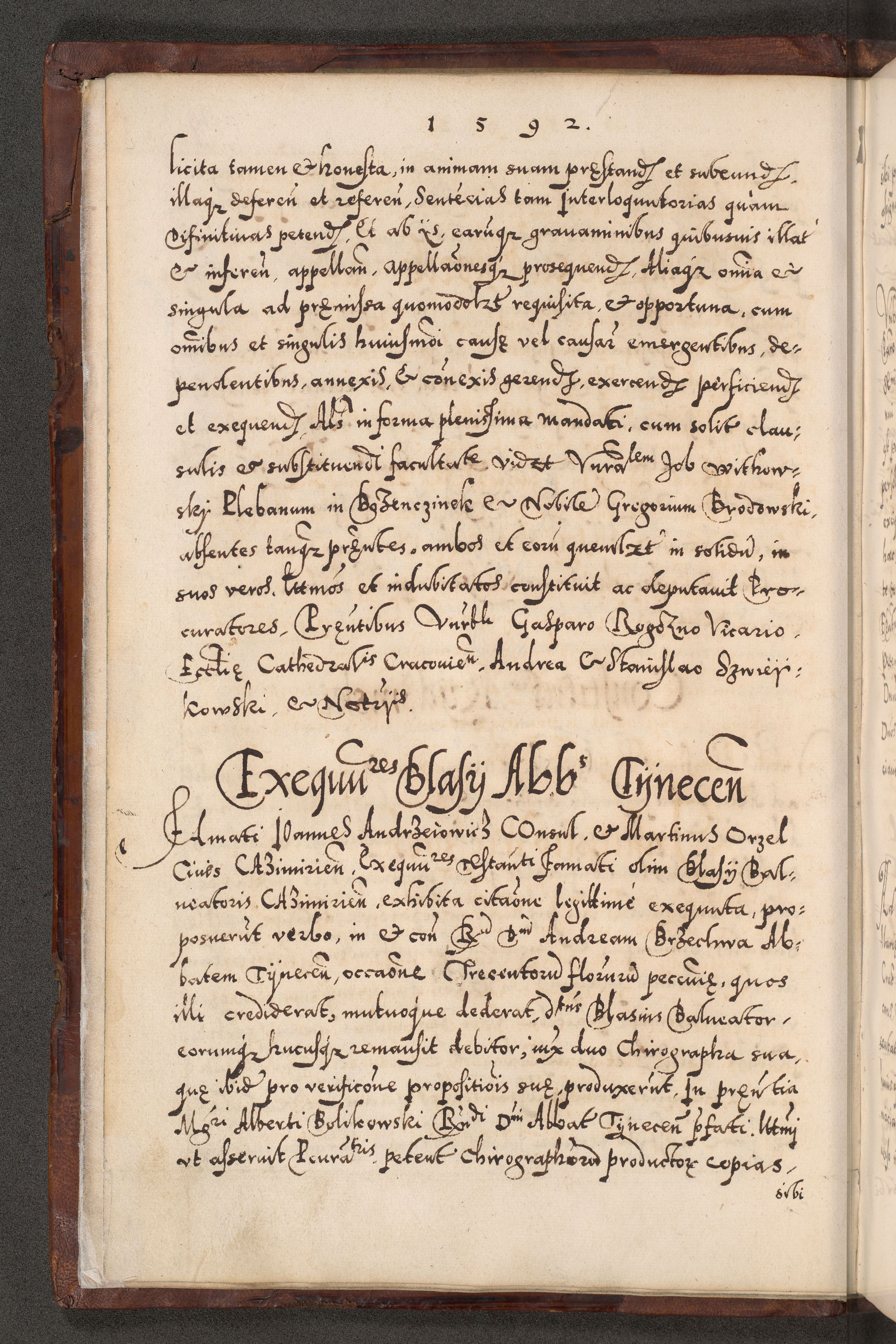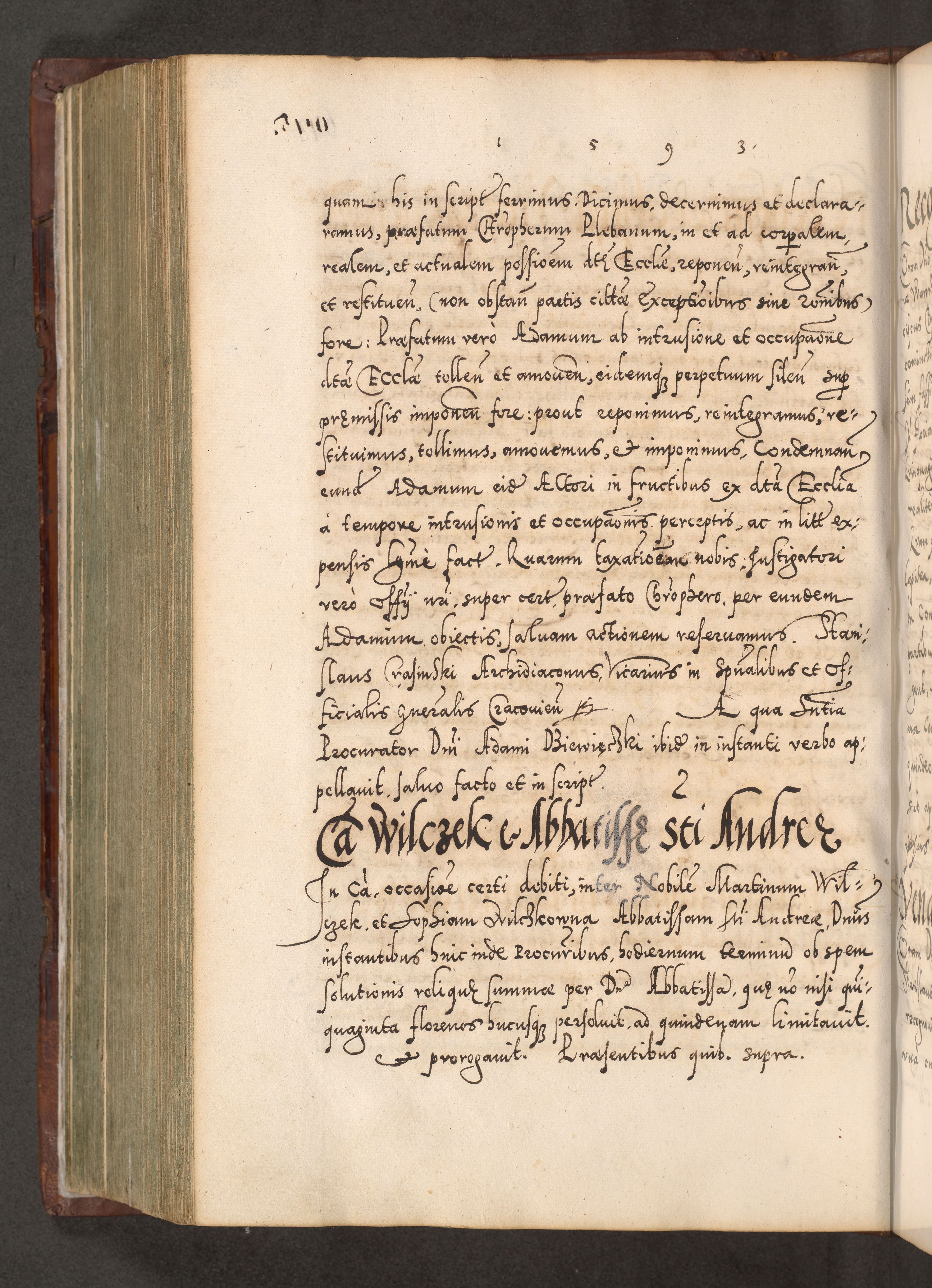 Illistrissimo et revedissimo in Christo Patre Domino Domino Georgio Rzadziwił Miserone Divina Sacrostae R. E. Tituli S. Sixti Presbitero Cardinali Duce in Olyka et Niesswiesz ad Gubernacula Ecclessiae Cracoviensis cuius administratorialem a Sancta Sede Apostolica obtinverat feliciter sedente. Acta actorum, causarum, sententiarum tam deffinitivarum quam interloquutoriarum decretorum, obligationum, quietationum, recognitionum, constitutionum procuratorum etc. coram Reverendo Domino Stanislao Crassinskz de Crasne Archidiacono Cracoviensis, Scholastico Gnesnesis, Custode Plocensis etc. Vicario et Officiali Generali Cracoviensi in Ano Domini Millesimo Quingentesimo Nonagesimo Primo cuius indictio quarta pontificatus SS. Domini Nostri Gregorii XIIII Anno I psius prio feliciter incipiut