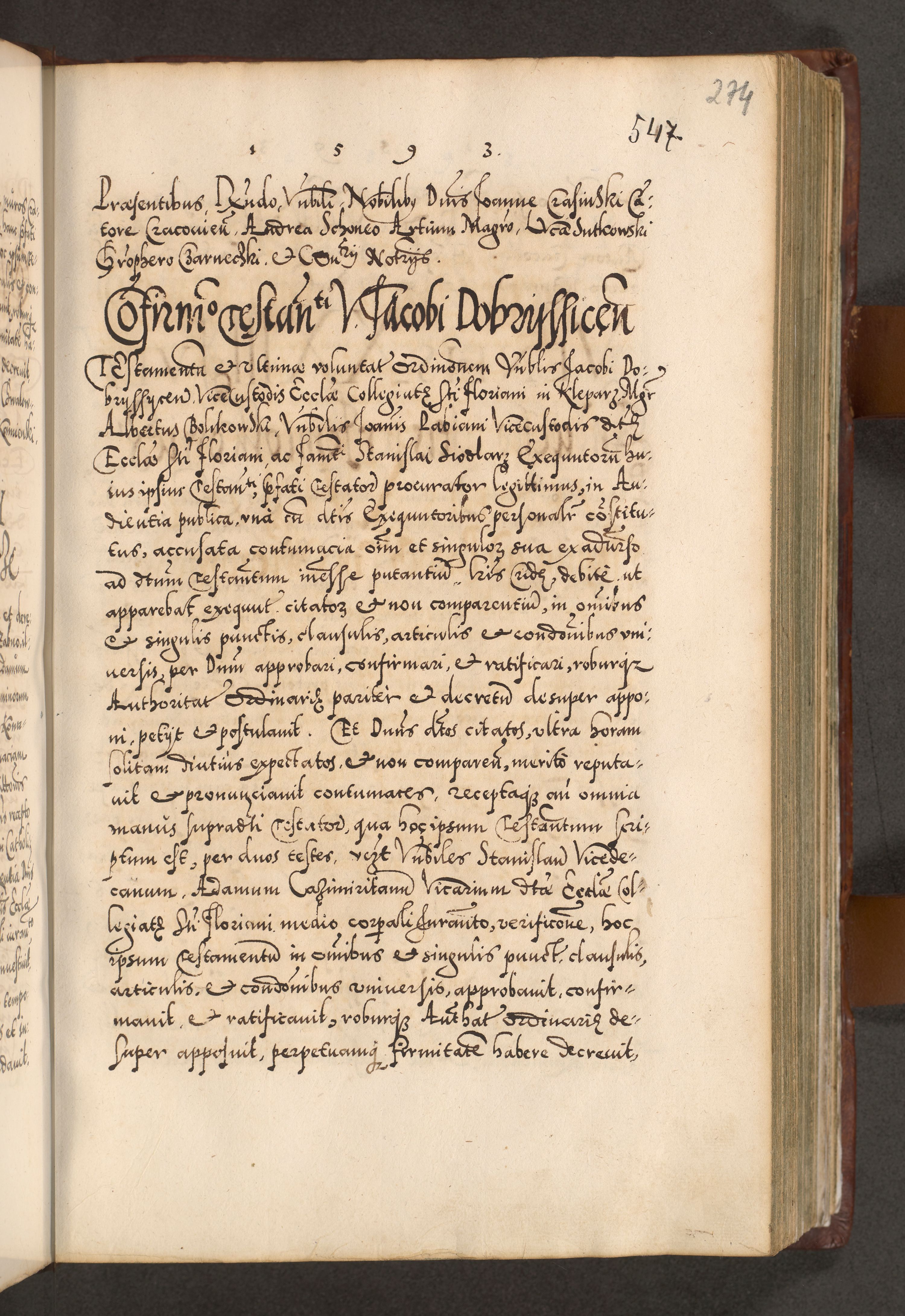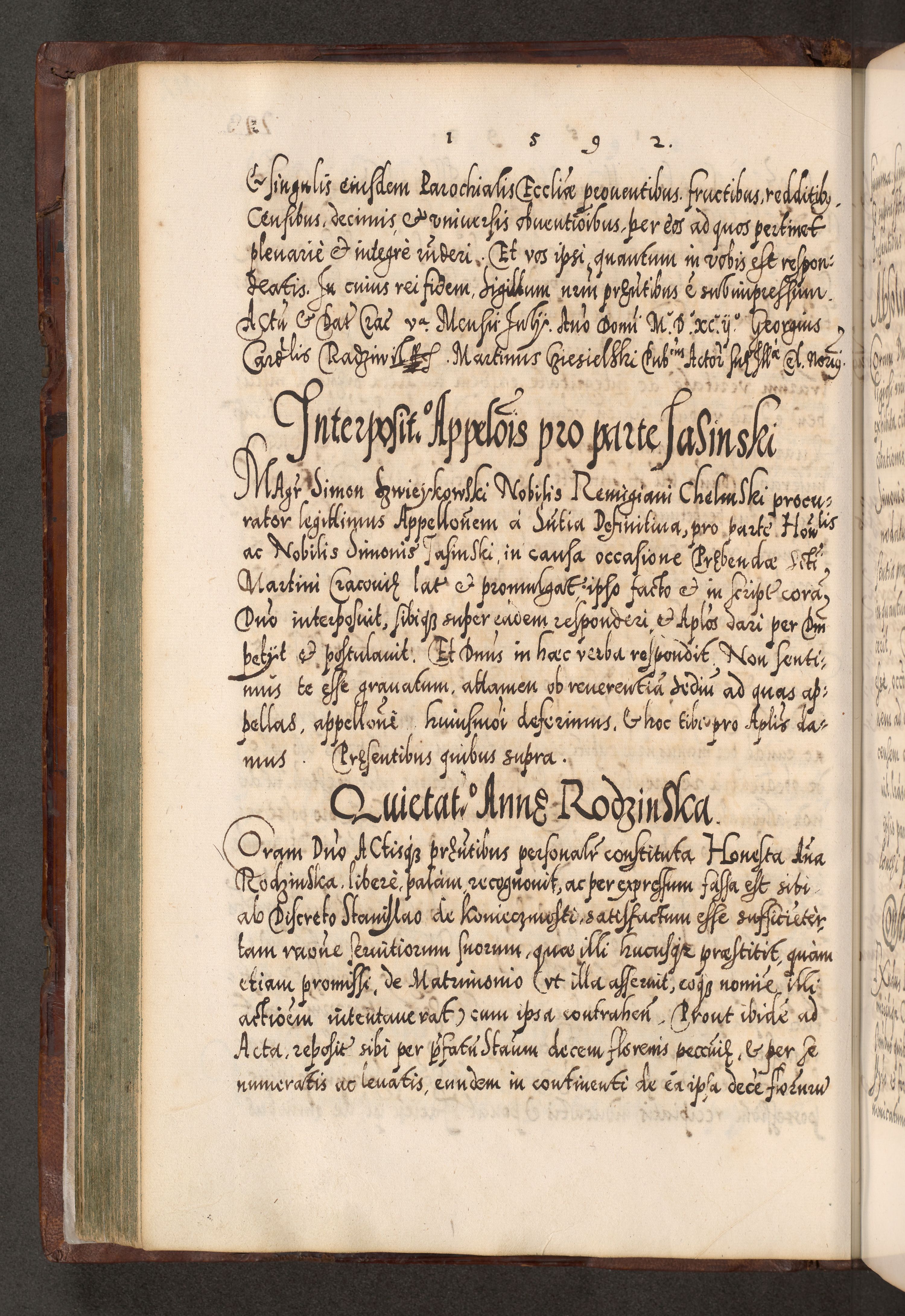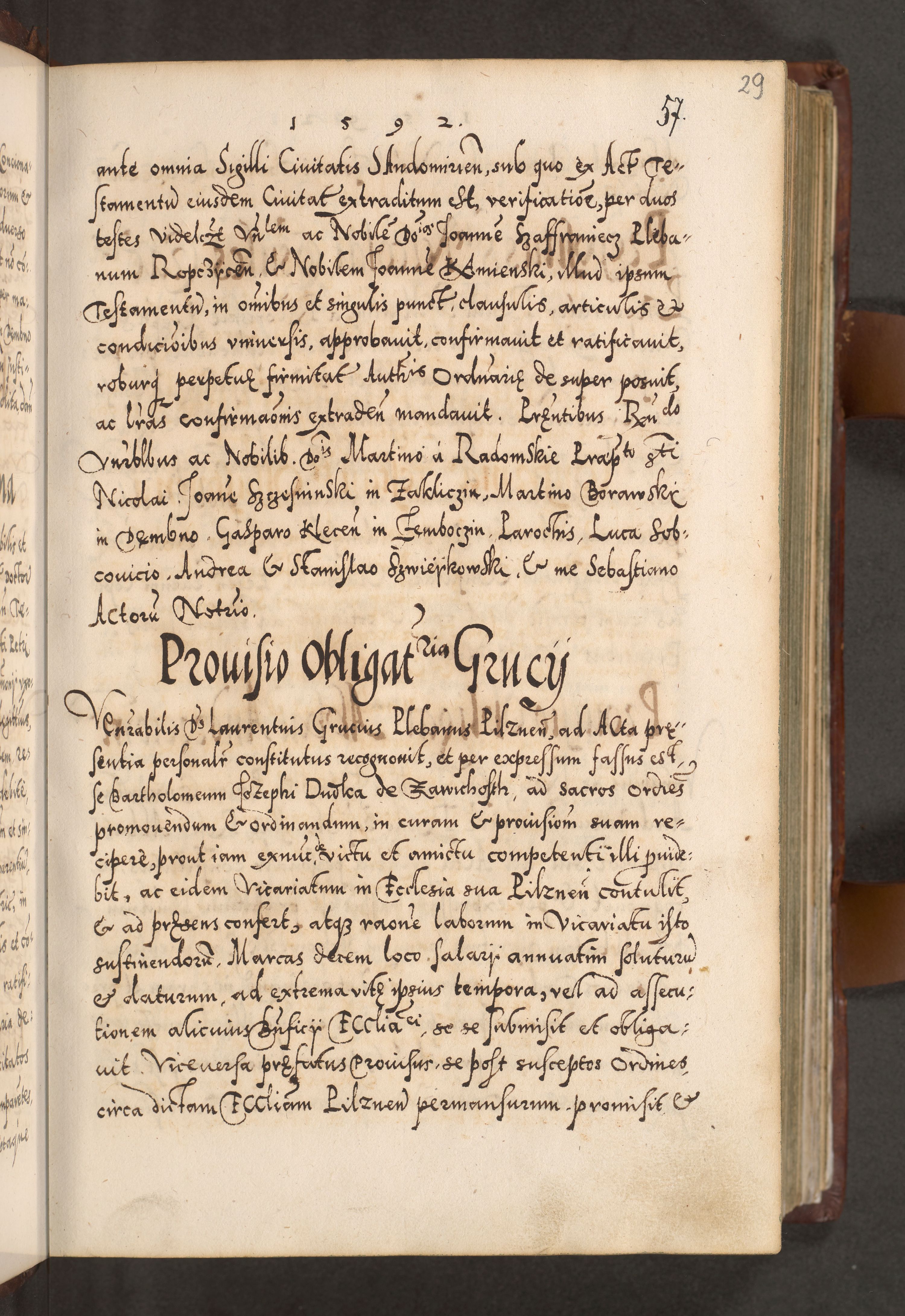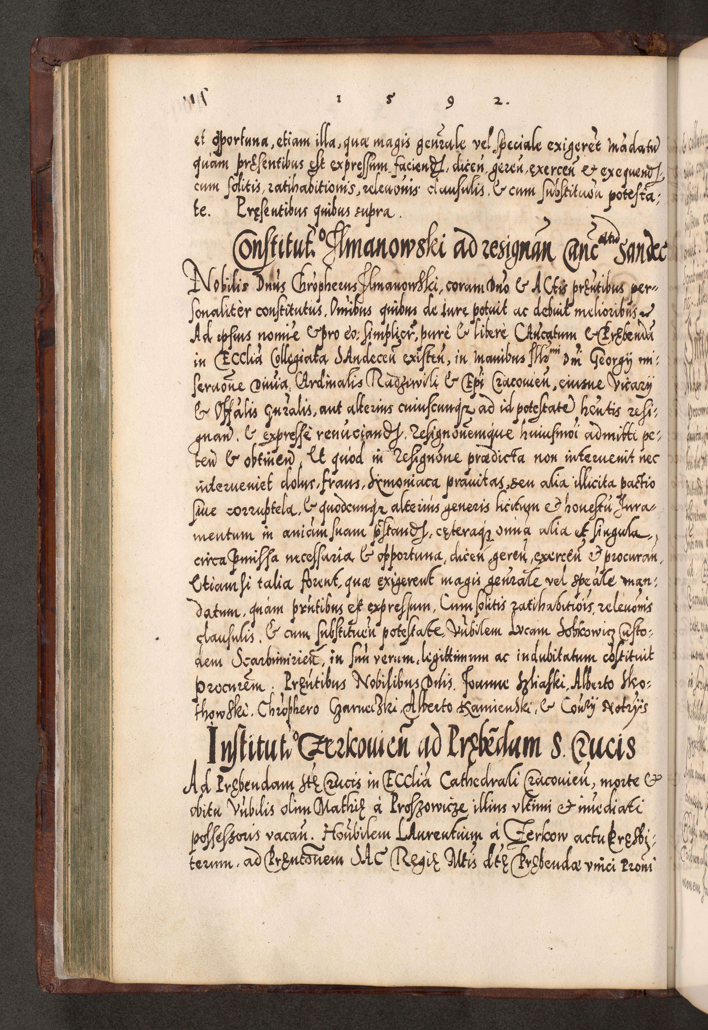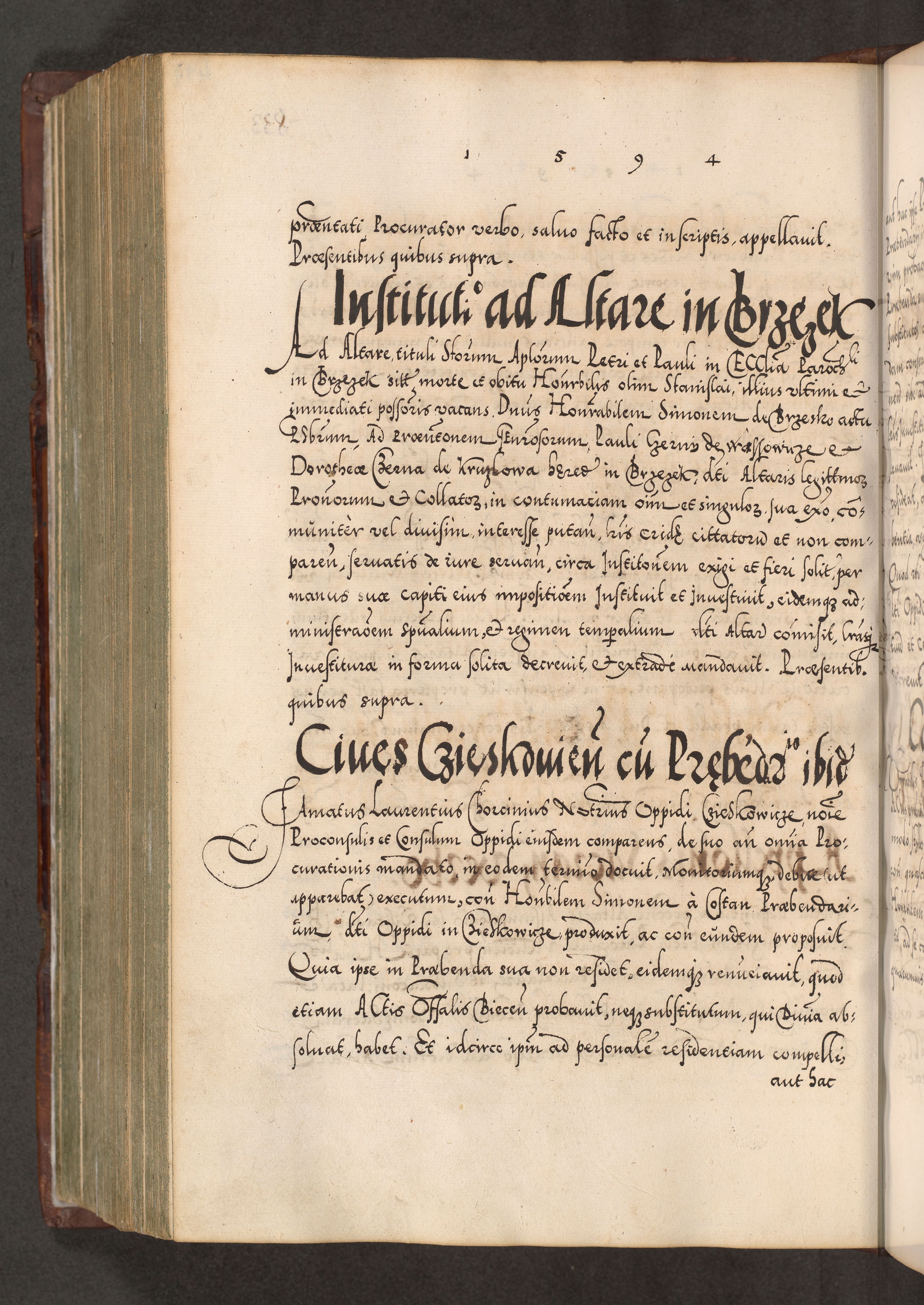 Illistrissimo et revedissimo in Christo Patre Domino Domino Georgio Rzadziwił Miserone Divina Sacrostae R. E. Tituli S. Sixti Presbitero Cardinali Duce in Olyka et Niesswiesz ad Gubernacula Ecclessiae Cracoviensis cuius administratorialem a Sancta Sede Apostolica obtinverat feliciter sedente. Acta actorum, causarum, sententiarum tam deffinitivarum quam interloquutoriarum decretorum, obligationum, quietationum, recognitionum, constitutionum procuratorum etc. coram Reverendo Domino Stanislao Crassinskz de Crasne Archidiacono Cracoviensis, Scholastico Gnesnesis, Custode Plocensis etc. Vicario et Officiali Generali Cracoviensi in Ano Domini Millesimo Quingentesimo Nonagesimo Primo cuius indictio quarta pontificatus SS. Domini Nostri Gregorii XIIII Anno I psius prio feliciter incipiut