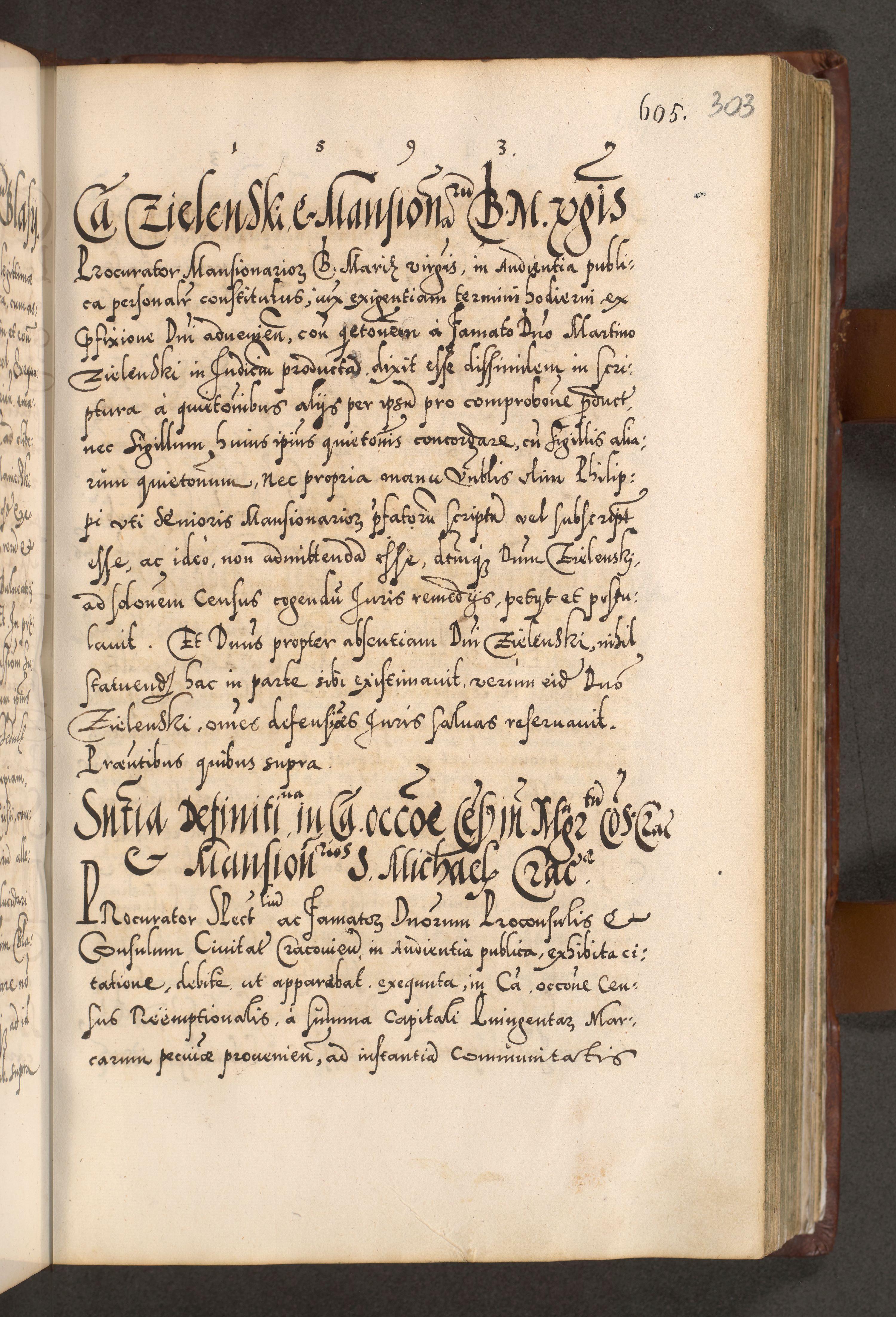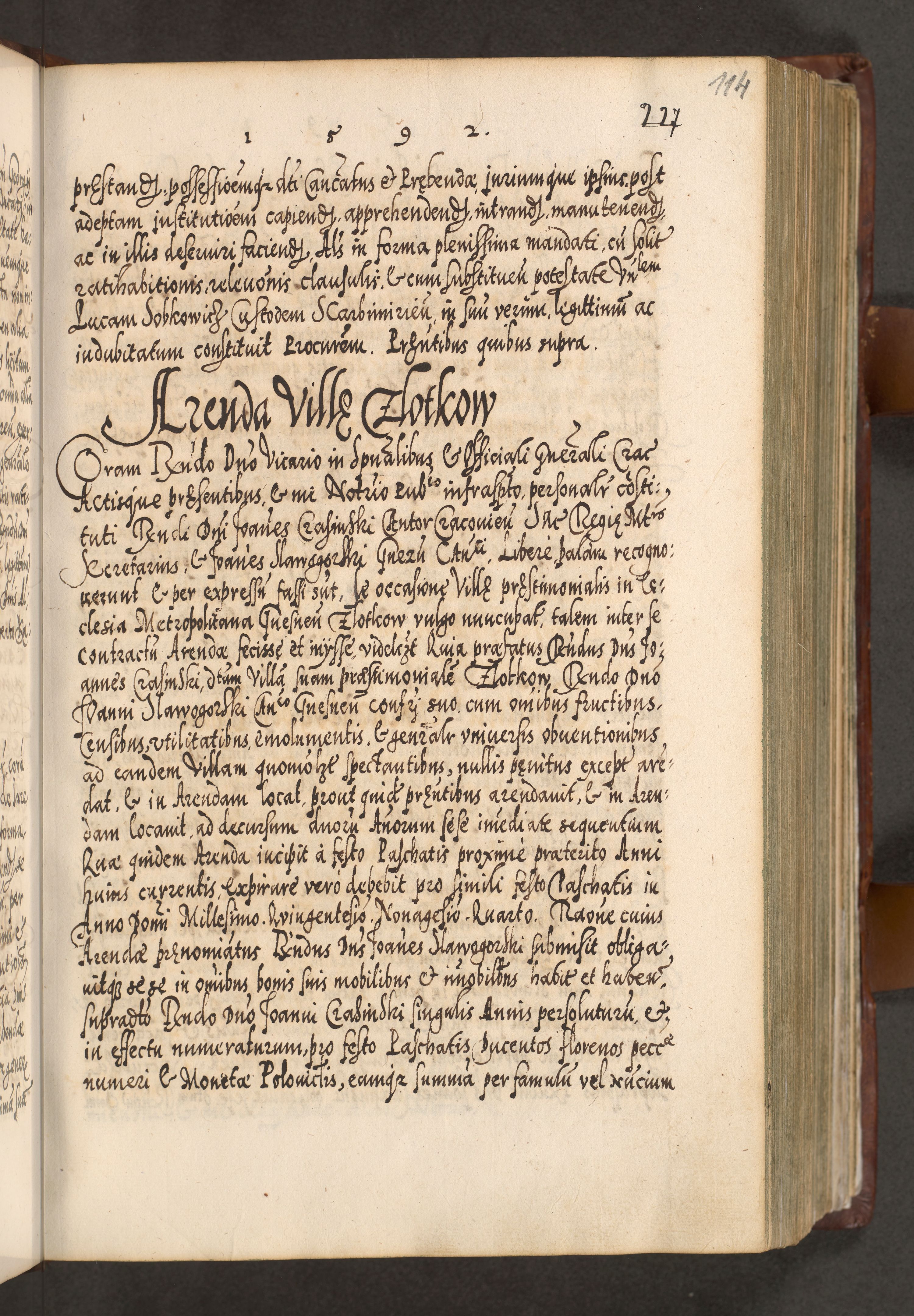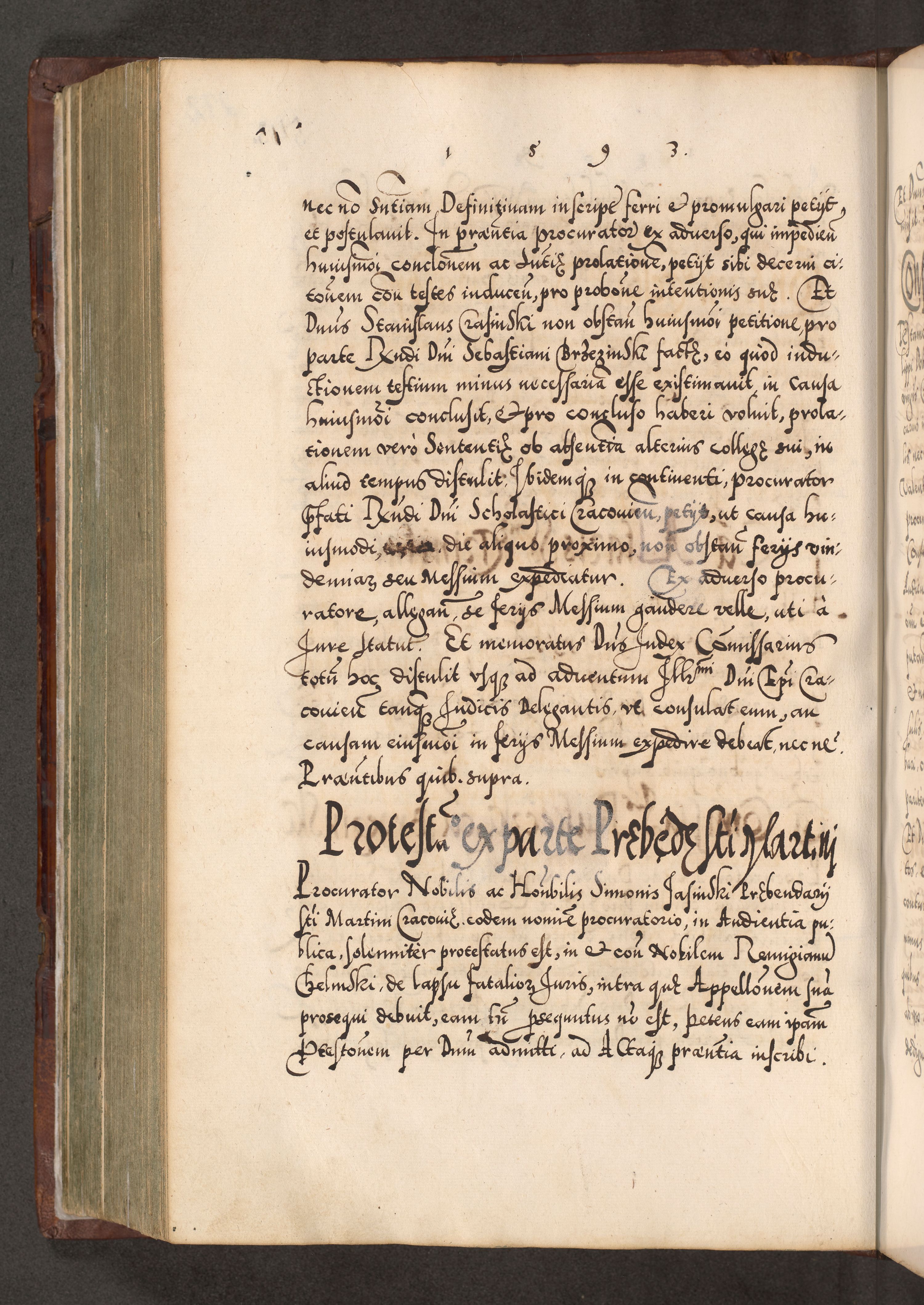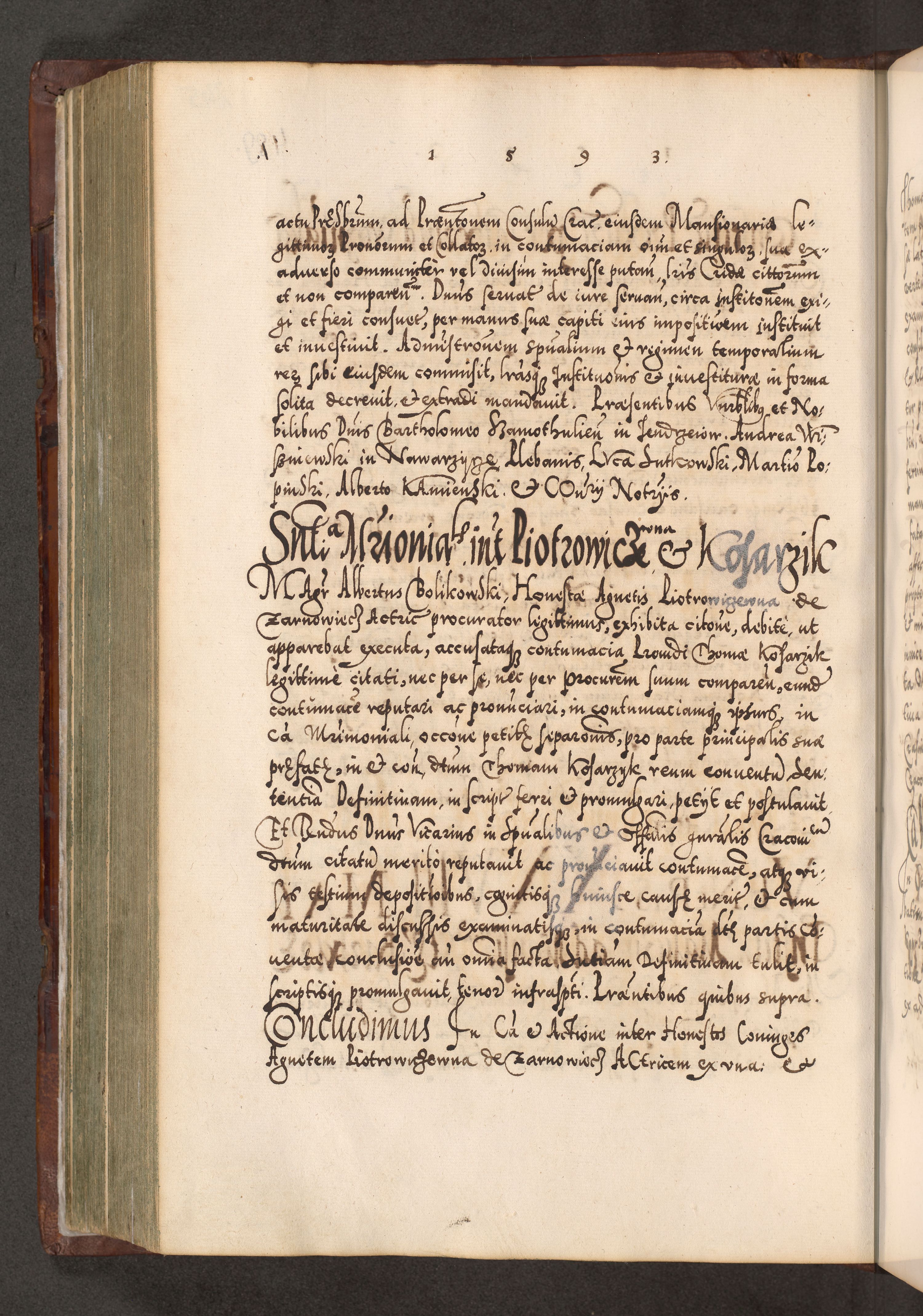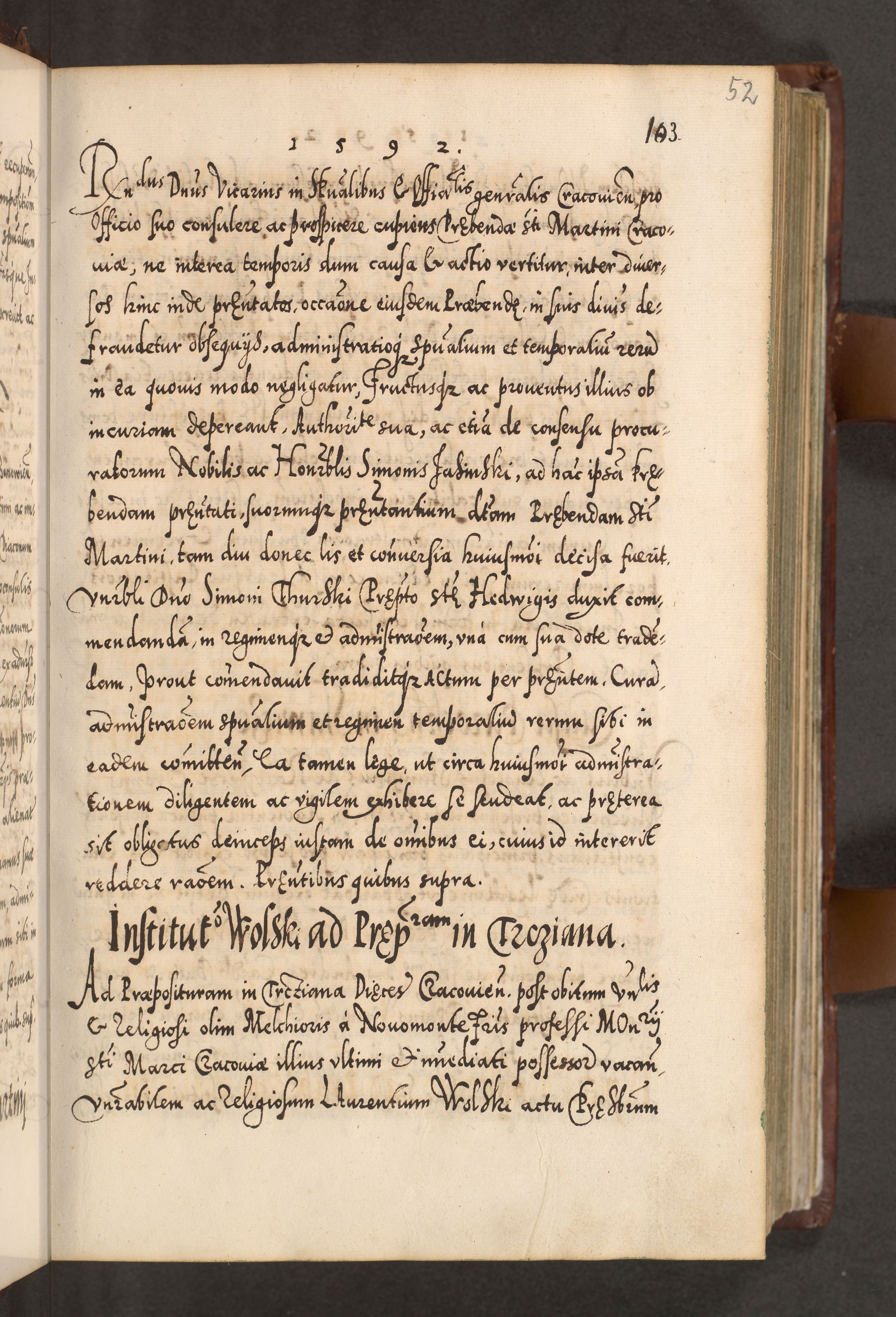 Illistrissimo et revedissimo in Christo Patre Domino Domino Georgio Rzadziwił Miserone Divina Sacrostae R. E. Tituli S. Sixti Presbitero Cardinali Duce in Olyka et Niesswiesz ad Gubernacula Ecclessiae Cracoviensis cuius administratorialem a Sancta Sede Apostolica obtinverat feliciter sedente. Acta actorum, causarum, sententiarum tam deffinitivarum quam interloquutoriarum decretorum, obligationum, quietationum, recognitionum, constitutionum procuratorum etc. coram Reverendo Domino Stanislao Crassinskz de Crasne Archidiacono Cracoviensis, Scholastico Gnesnesis, Custode Plocensis etc. Vicario et Officiali Generali Cracoviensi in Ano Domini Millesimo Quingentesimo Nonagesimo Primo cuius indictio quarta pontificatus SS. Domini Nostri Gregorii XIIII Anno I psius prio feliciter incipiut