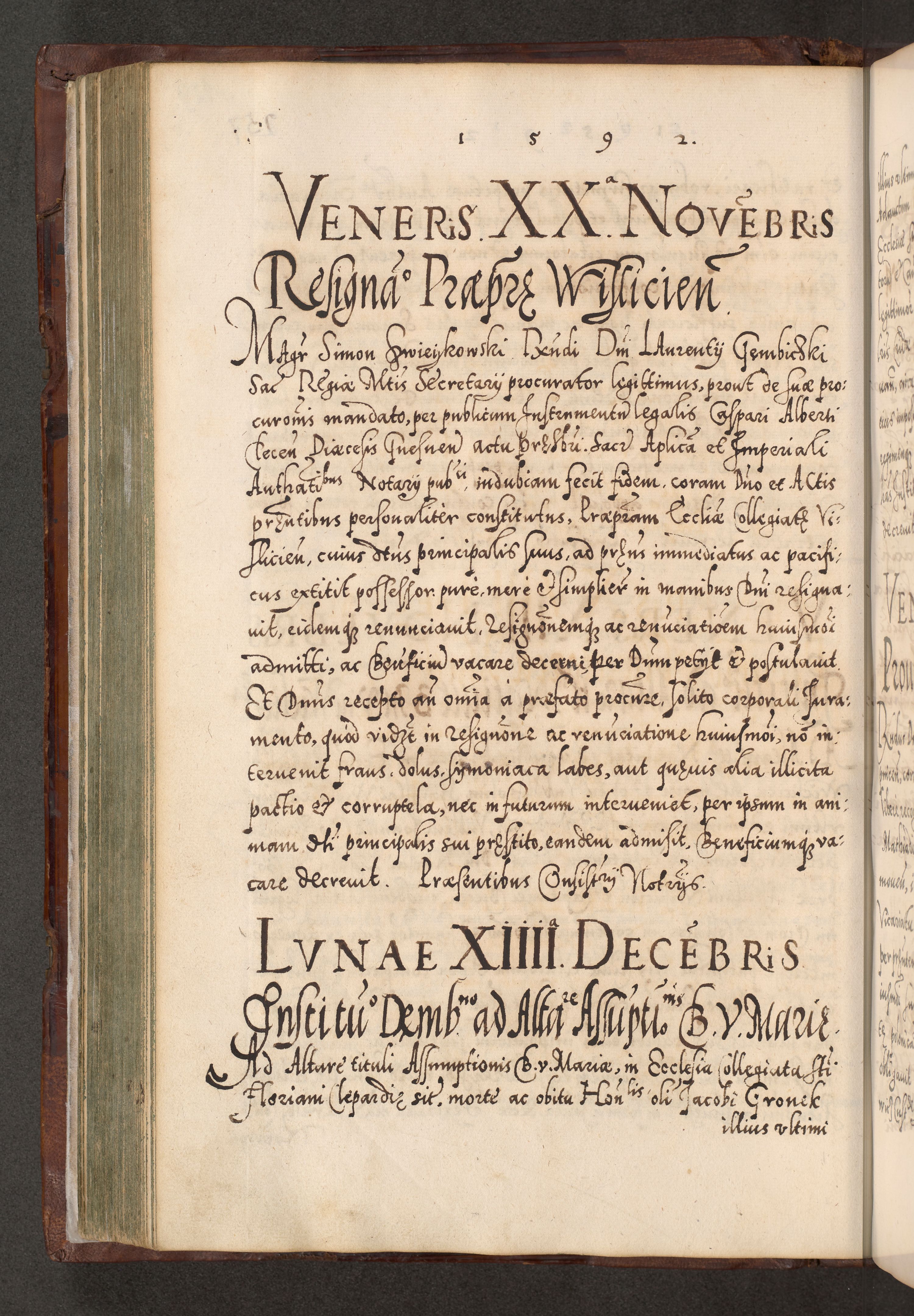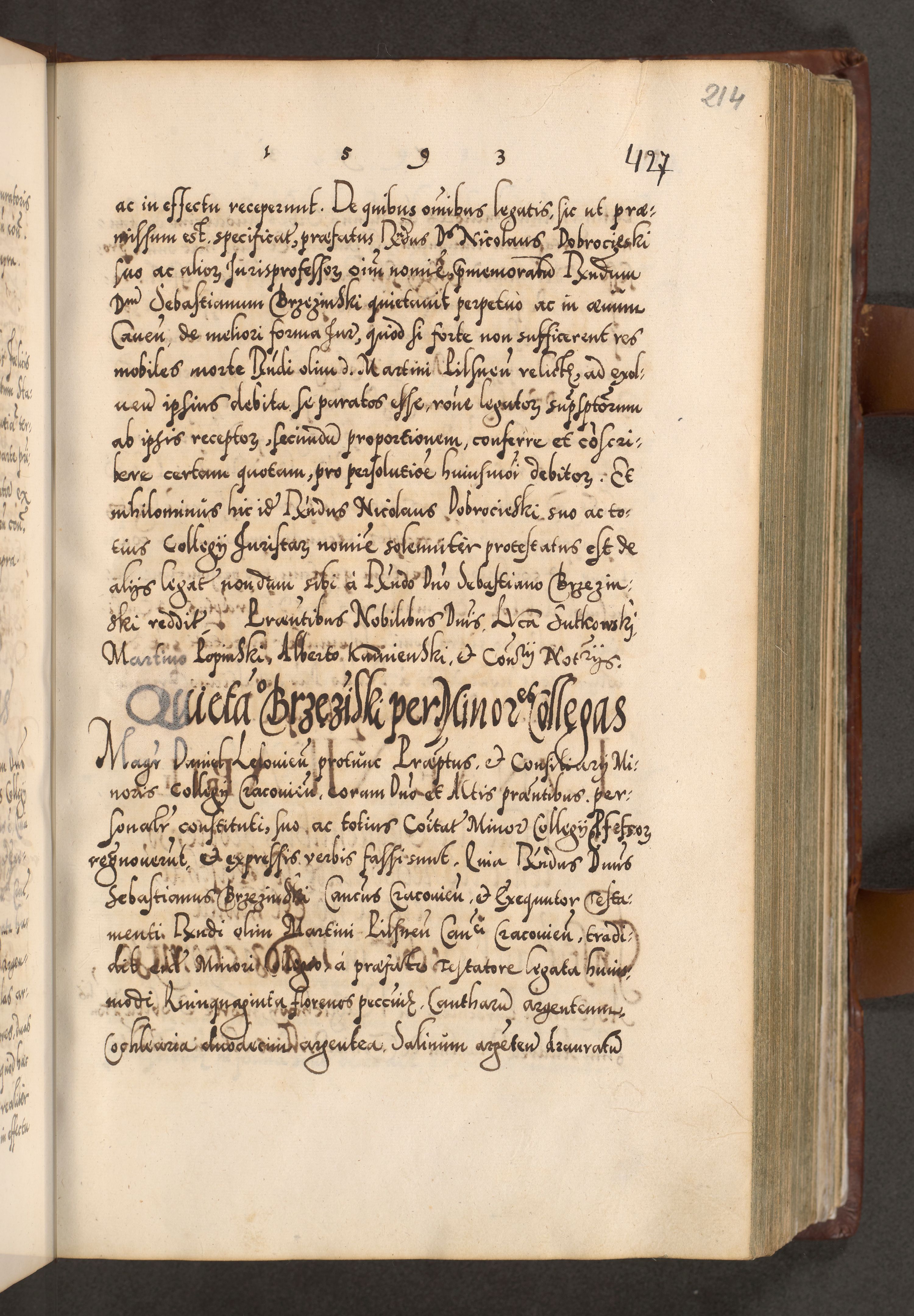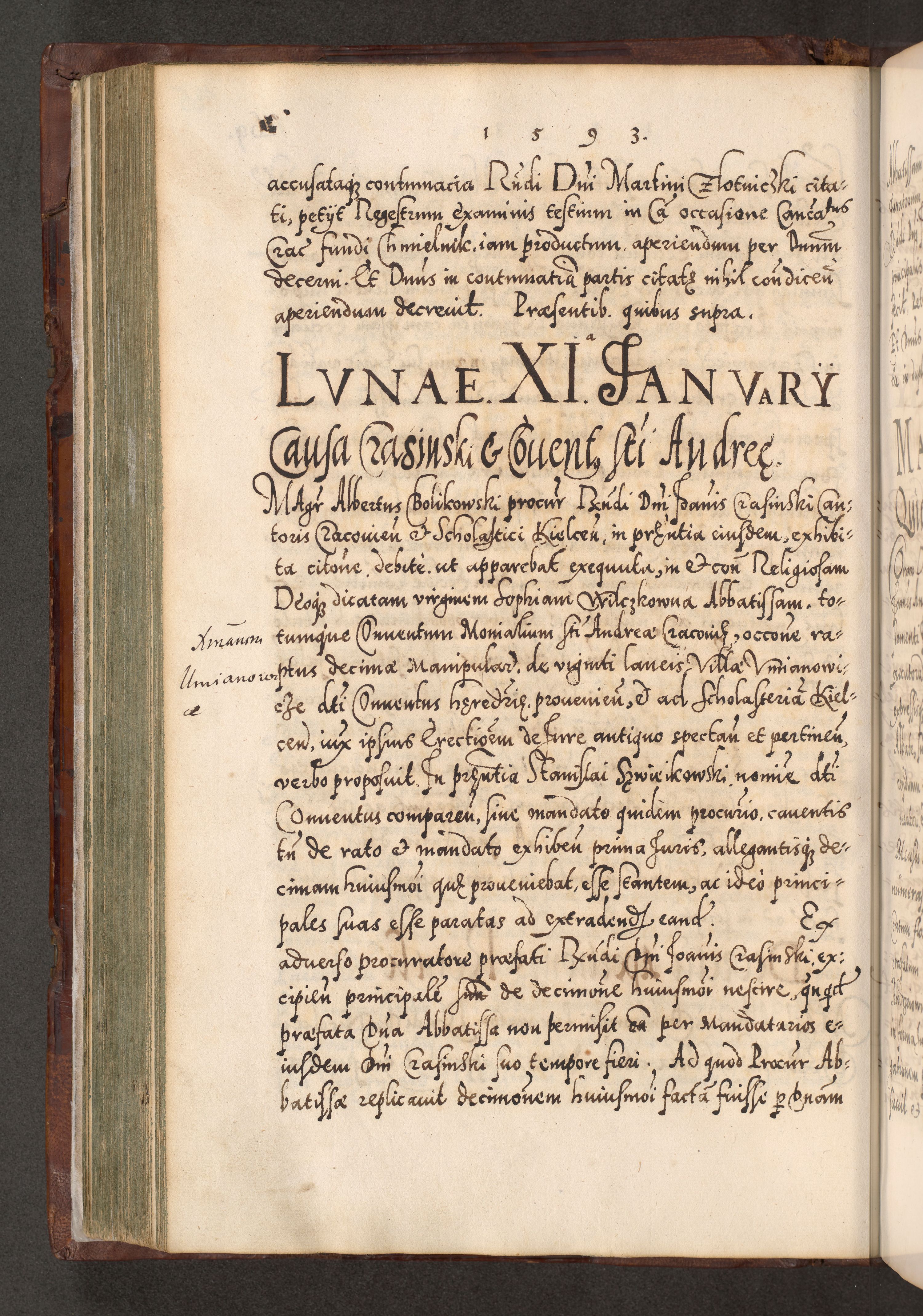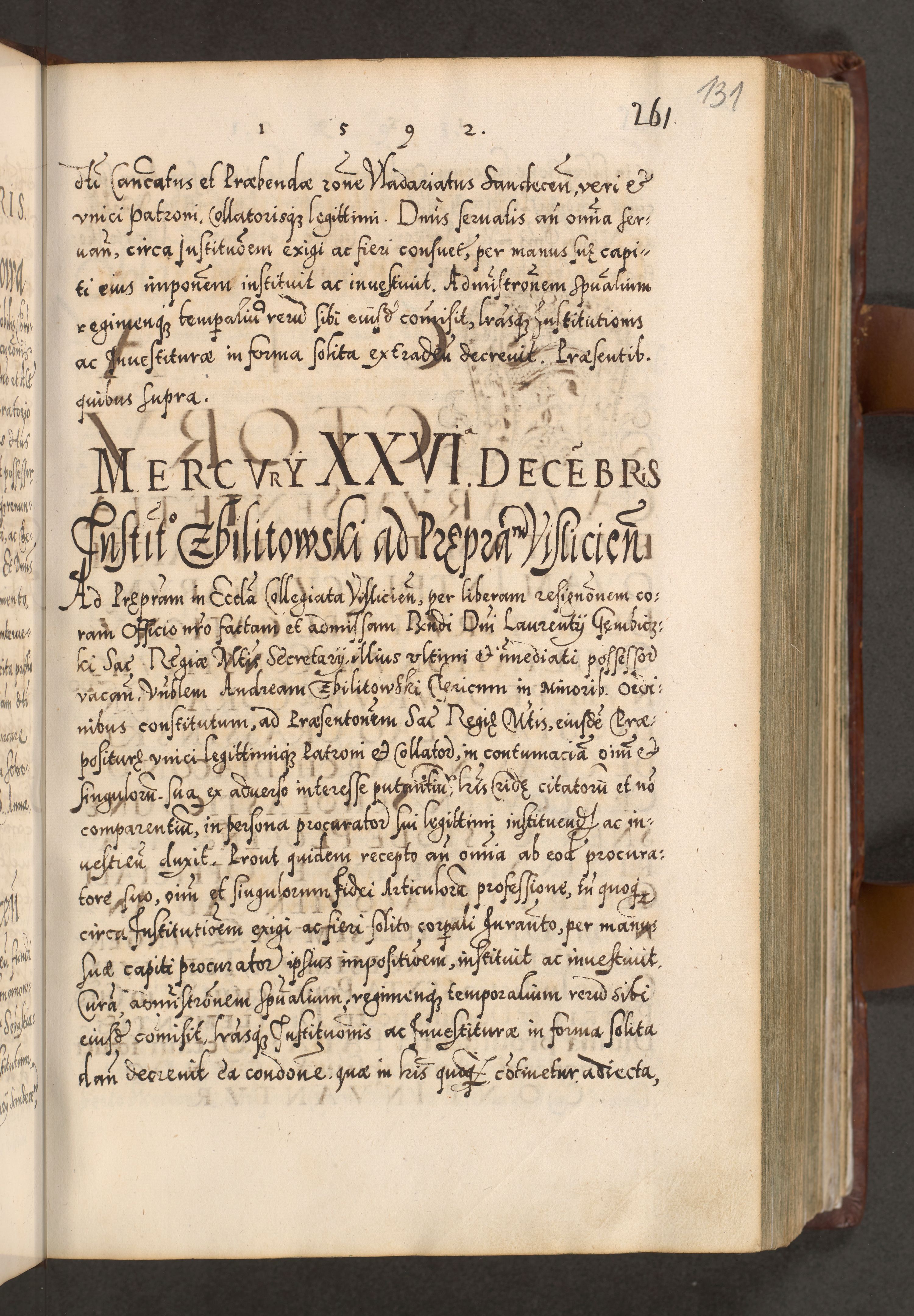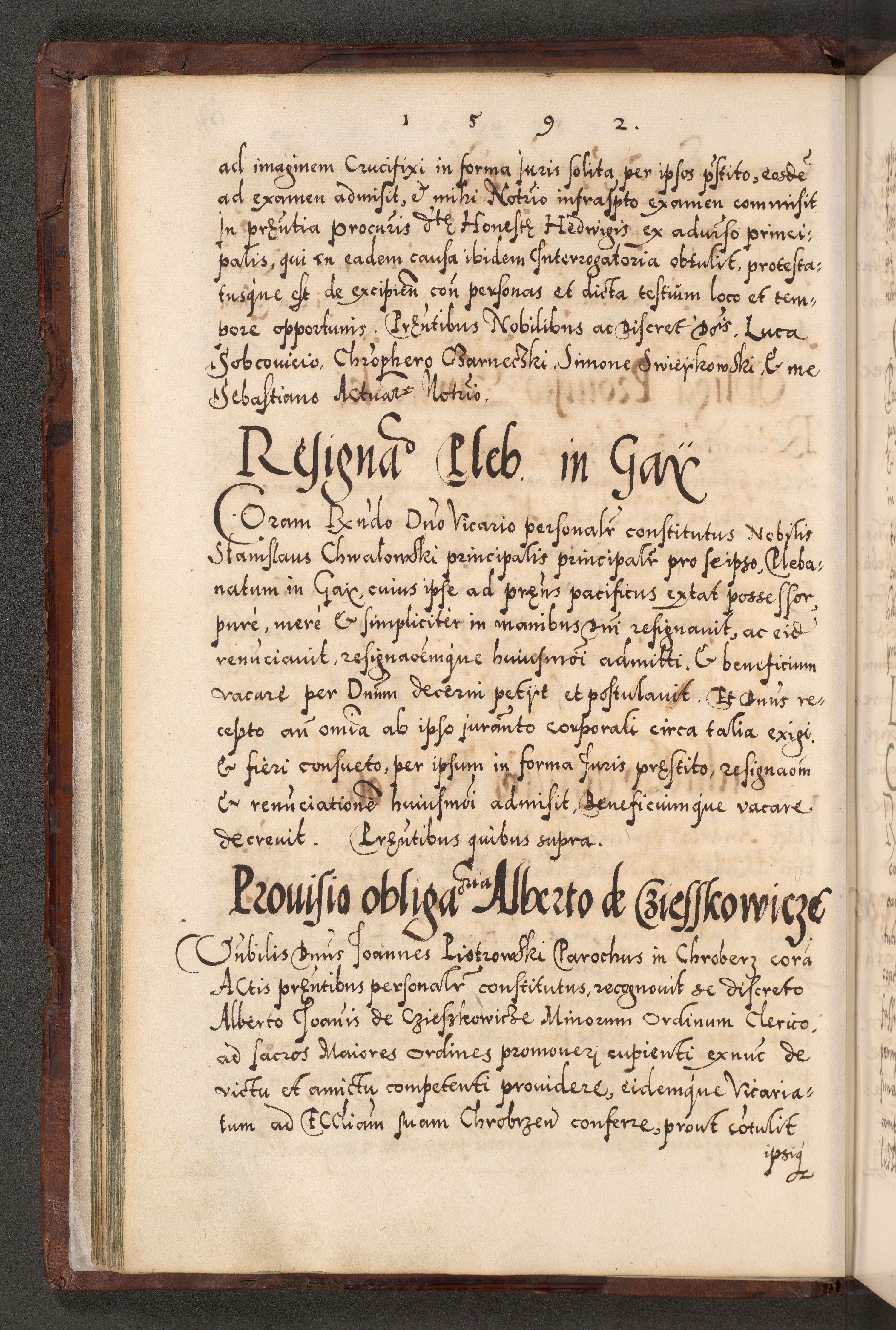 Illistrissimo et revedissimo in Christo Patre Domino Domino Georgio Rzadziwił Miserone Divina Sacrostae R. E. Tituli S. Sixti Presbitero Cardinali Duce in Olyka et Niesswiesz ad Gubernacula Ecclessiae Cracoviensis cuius administratorialem a Sancta Sede Apostolica obtinverat feliciter sedente. Acta actorum, causarum, sententiarum tam deffinitivarum quam interloquutoriarum decretorum, obligationum, quietationum, recognitionum, constitutionum procuratorum etc. coram Reverendo Domino Stanislao Crassinskz de Crasne Archidiacono Cracoviensis, Scholastico Gnesnesis, Custode Plocensis etc. Vicario et Officiali Generali Cracoviensi in Ano Domini Millesimo Quingentesimo Nonagesimo Primo cuius indictio quarta pontificatus SS. Domini Nostri Gregorii XIIII Anno I psius prio feliciter incipiut