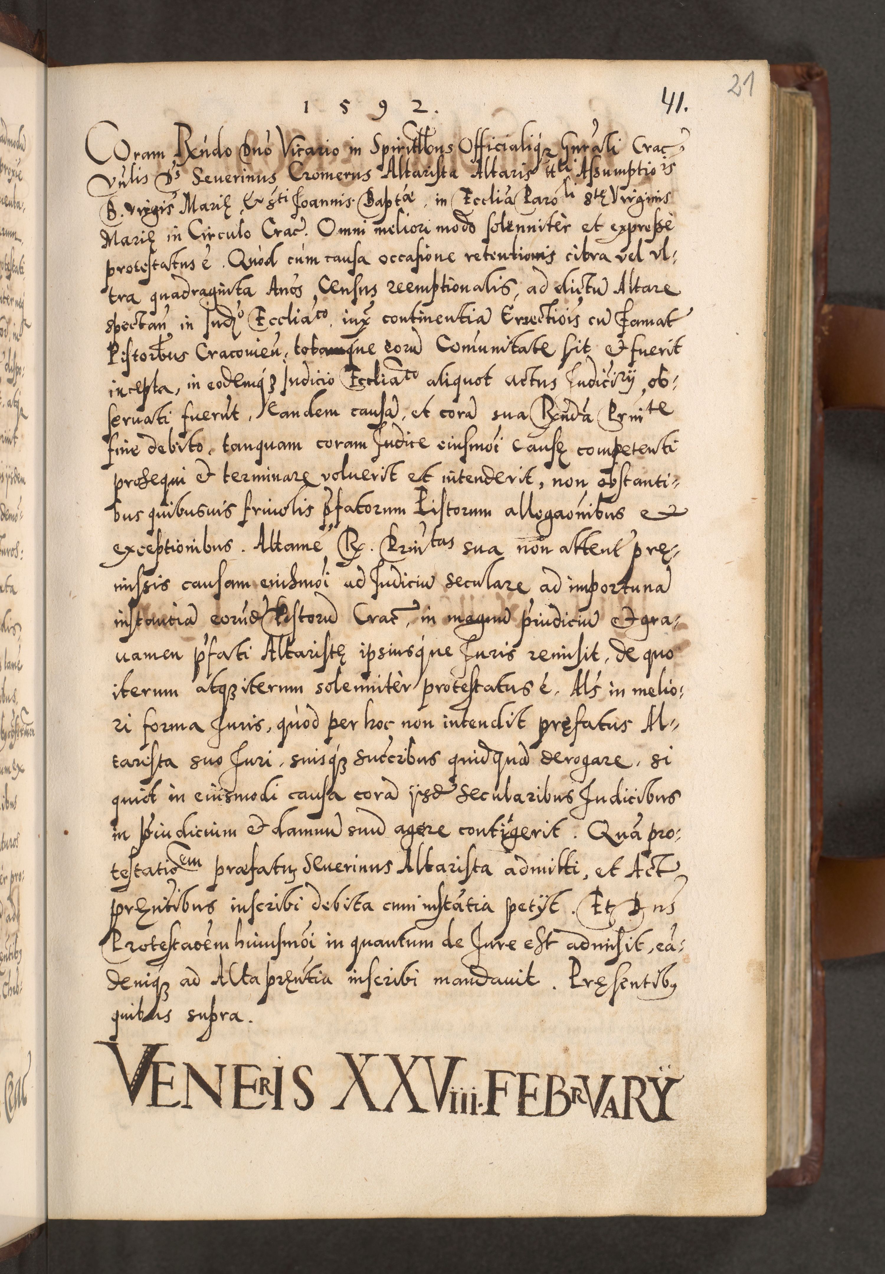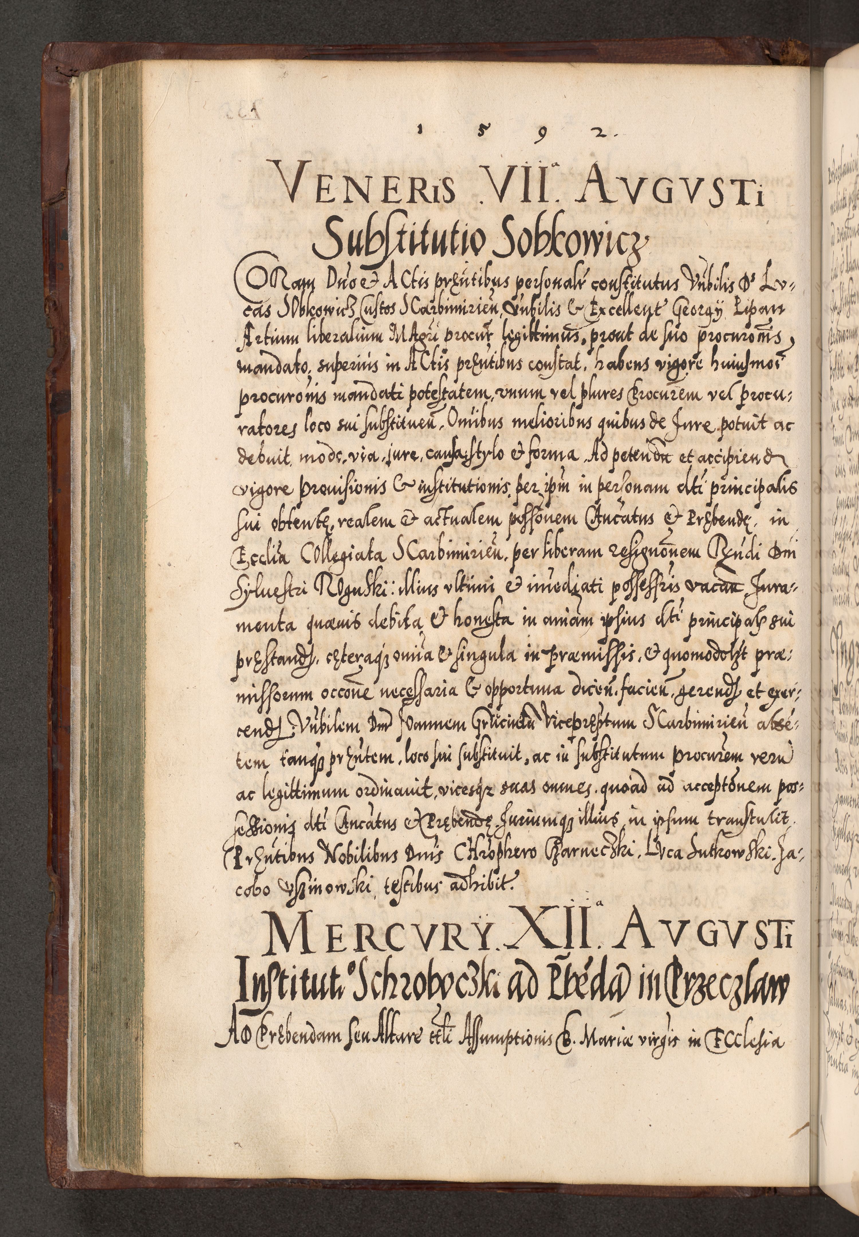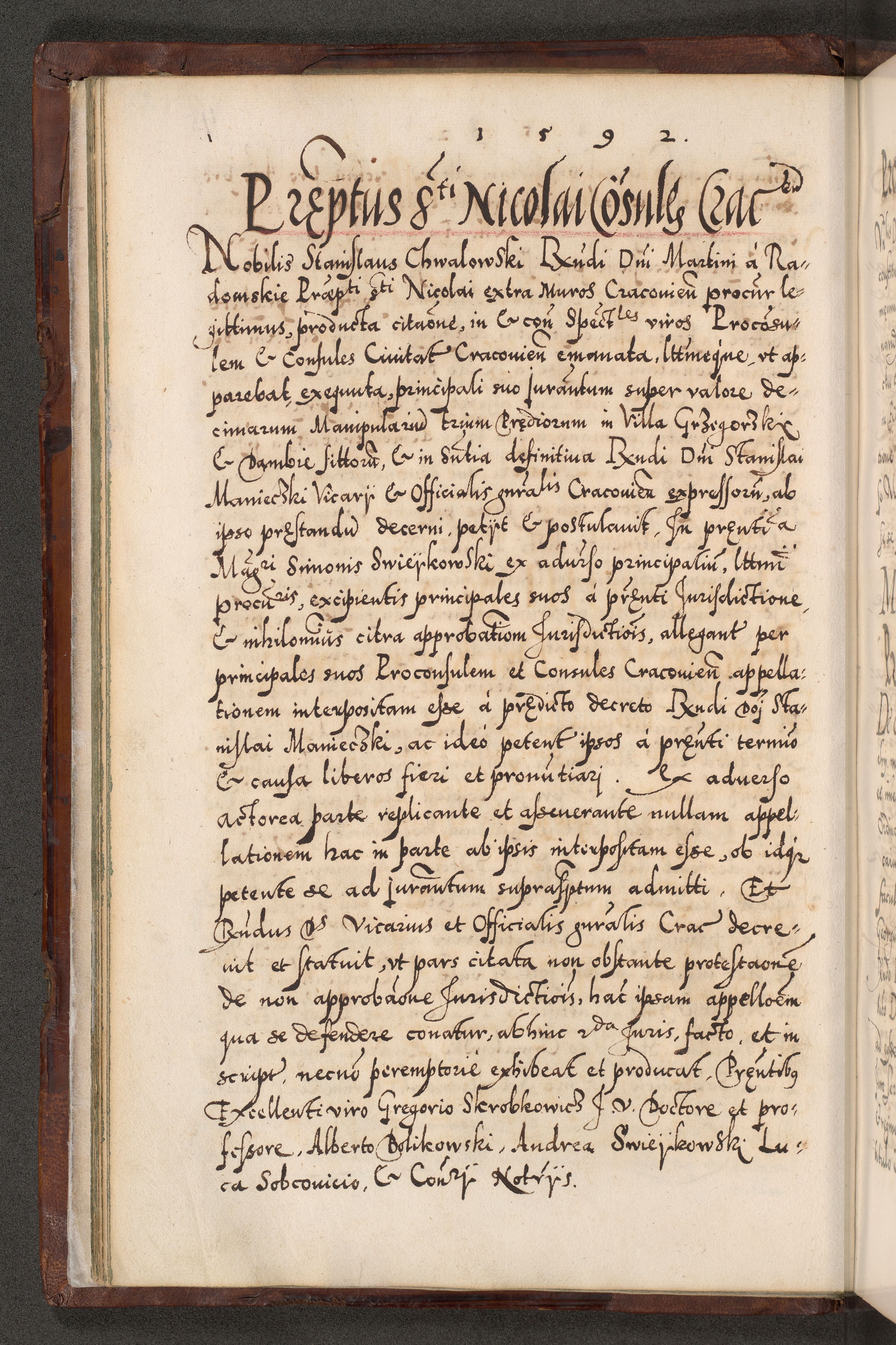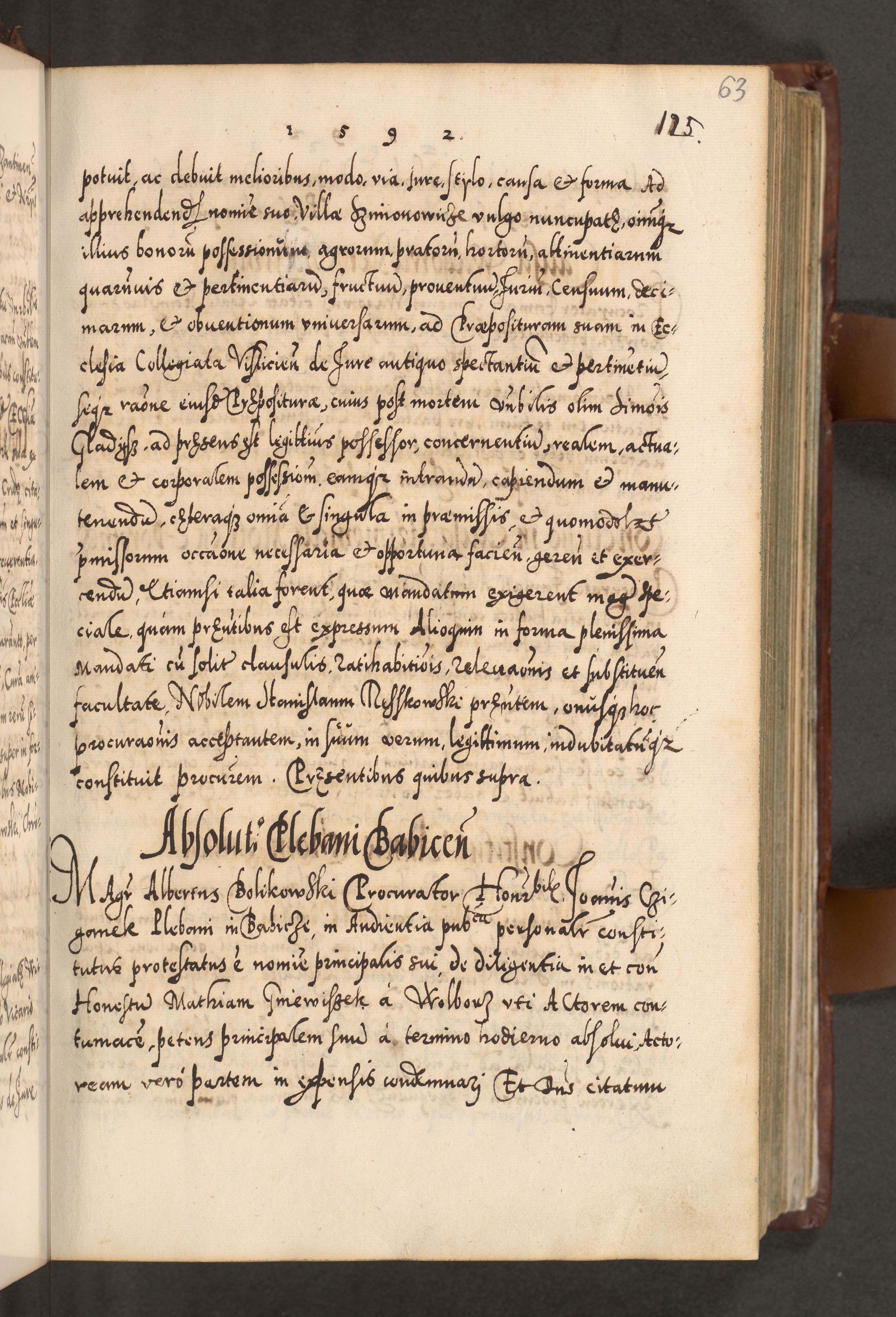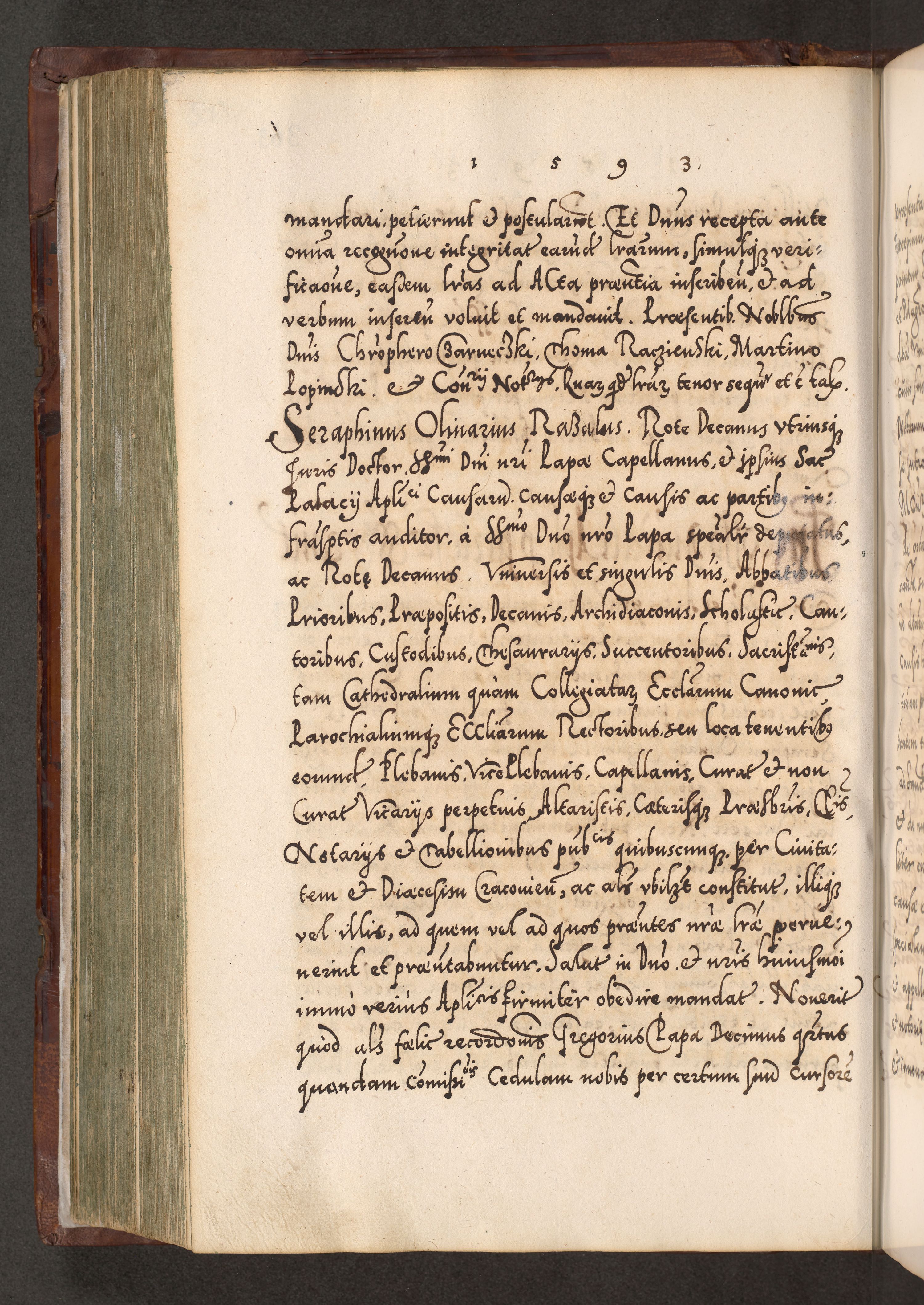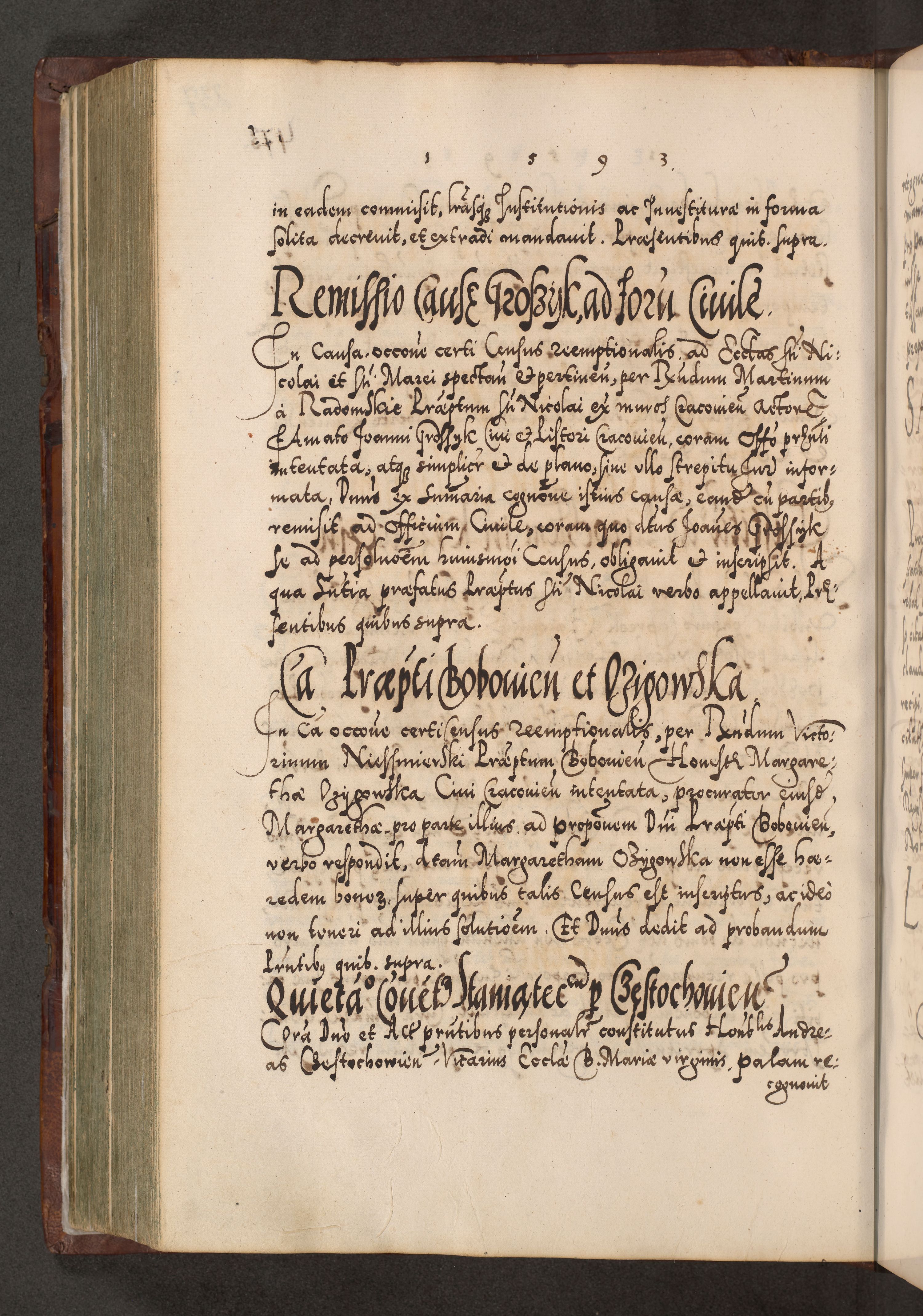 Illistrissimo et revedissimo in Christo Patre Domino Domino Georgio Rzadziwił Miserone Divina Sacrostae R. E. Tituli S. Sixti Presbitero Cardinali Duce in Olyka et Niesswiesz ad Gubernacula Ecclessiae Cracoviensis cuius administratorialem a Sancta Sede Apostolica obtinverat feliciter sedente. Acta actorum, causarum, sententiarum tam deffinitivarum quam interloquutoriarum decretorum, obligationum, quietationum, recognitionum, constitutionum procuratorum etc. coram Reverendo Domino Stanislao Crassinskz de Crasne Archidiacono Cracoviensis, Scholastico Gnesnesis, Custode Plocensis etc. Vicario et Officiali Generali Cracoviensi in Ano Domini Millesimo Quingentesimo Nonagesimo Primo cuius indictio quarta pontificatus SS. Domini Nostri Gregorii XIIII Anno I psius prio feliciter incipiut