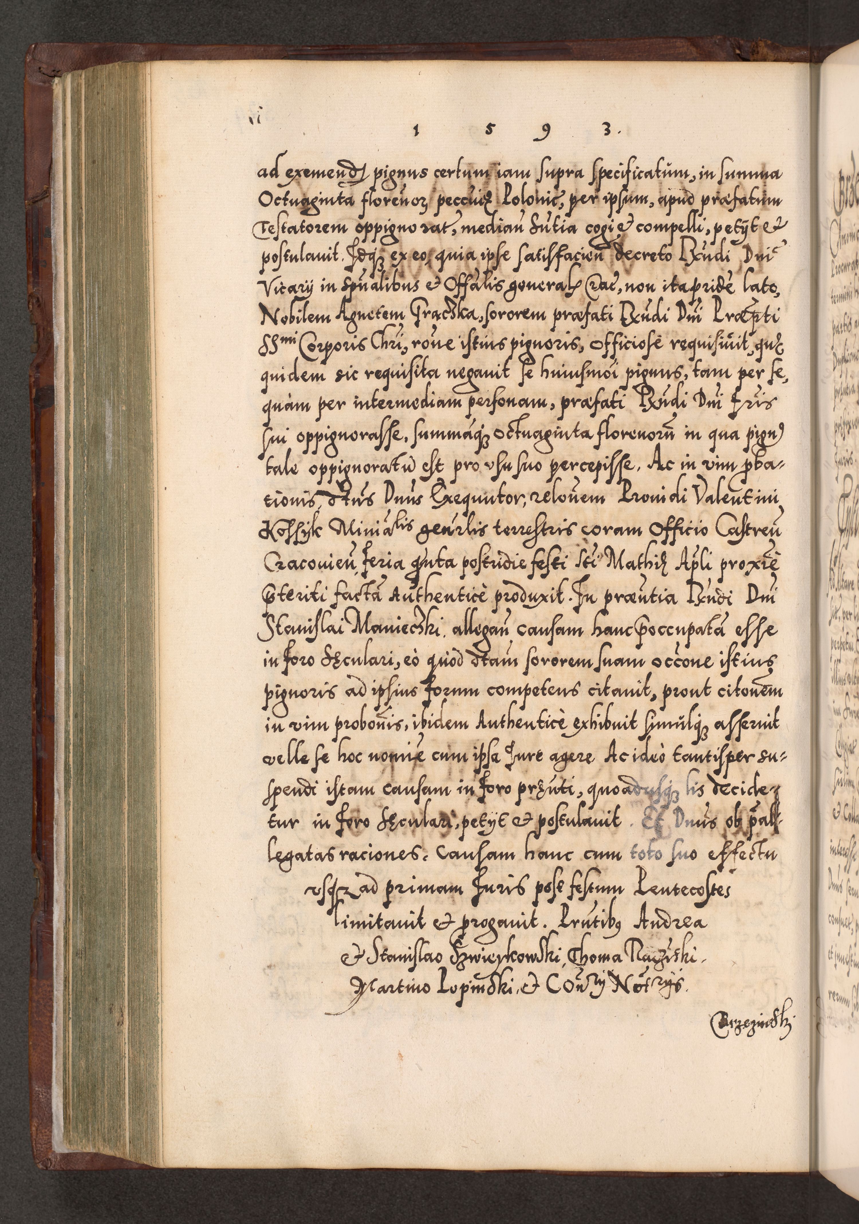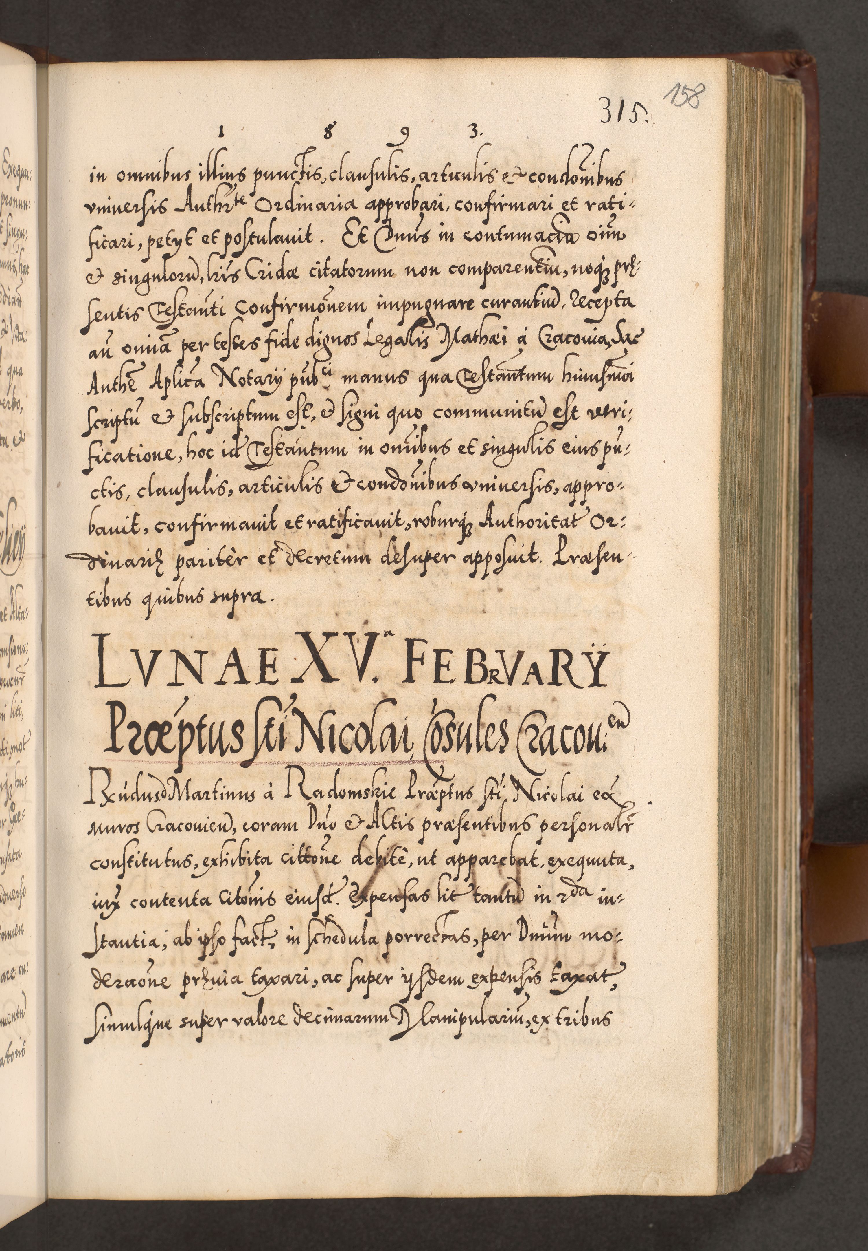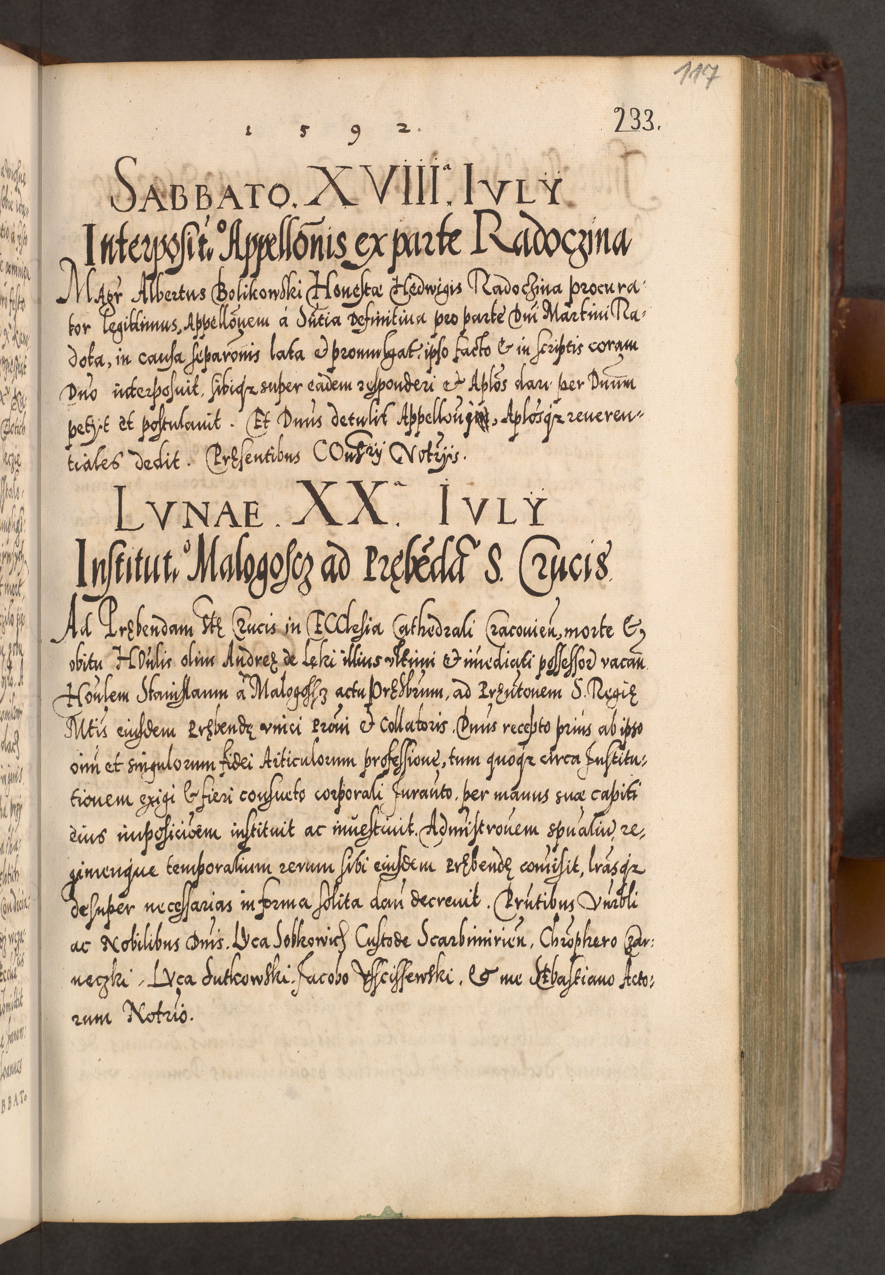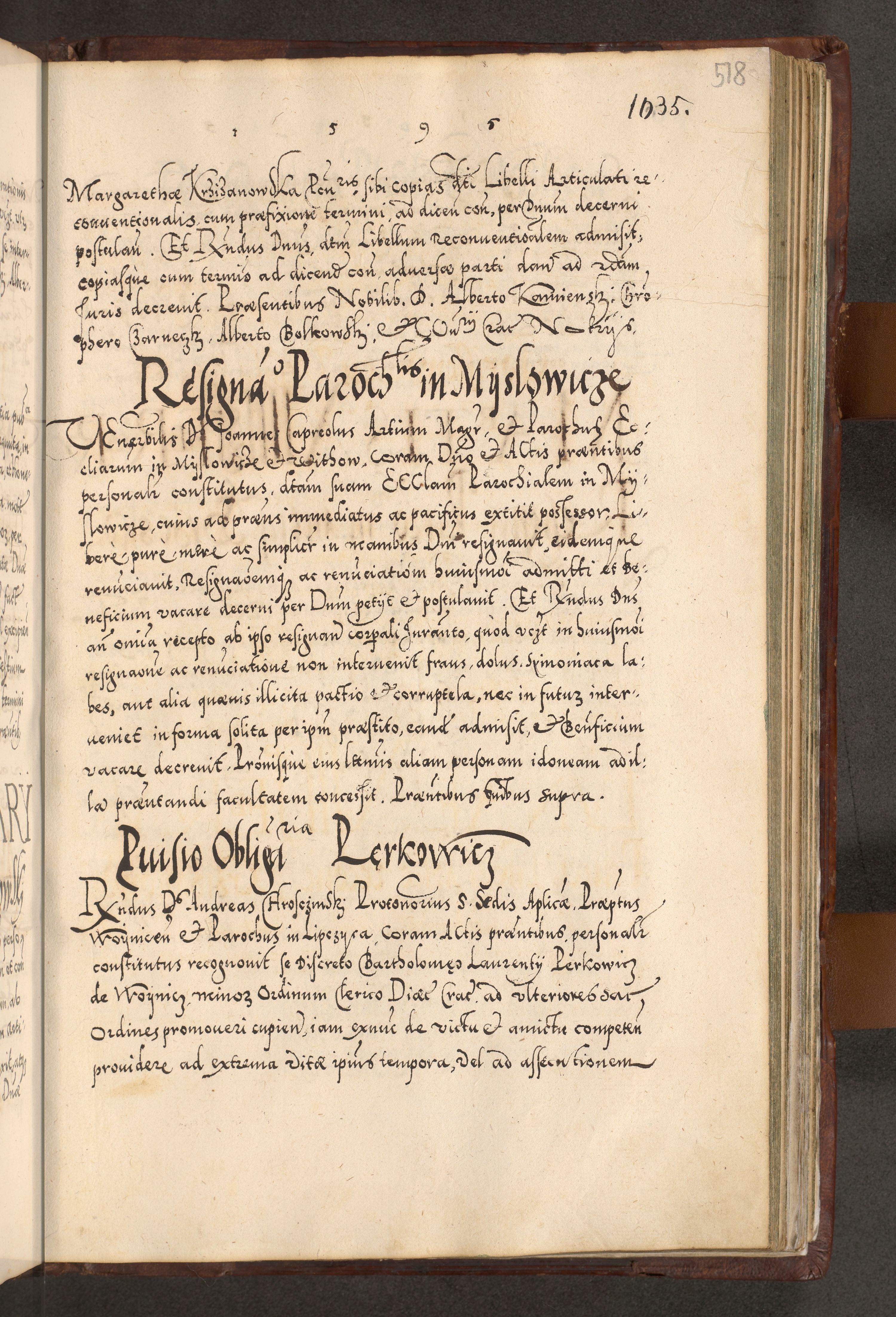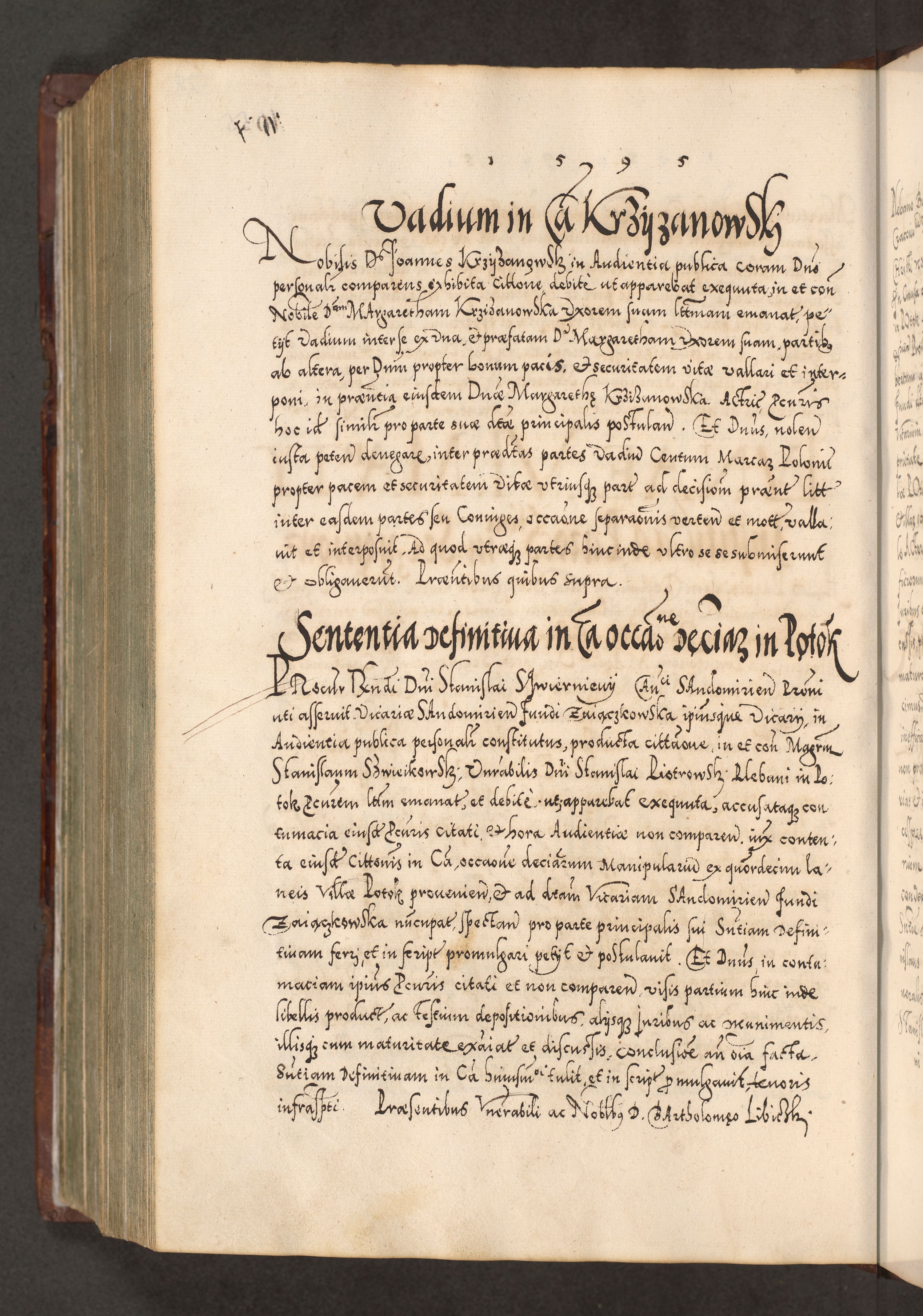 Illistrissimo et revedissimo in Christo Patre Domino Domino Georgio Rzadziwił Miserone Divina Sacrostae R. E. Tituli S. Sixti Presbitero Cardinali Duce in Olyka et Niesswiesz ad Gubernacula Ecclessiae Cracoviensis cuius administratorialem a Sancta Sede Apostolica obtinverat feliciter sedente. Acta actorum, causarum, sententiarum tam deffinitivarum quam interloquutoriarum decretorum, obligationum, quietationum, recognitionum, constitutionum procuratorum etc. coram Reverendo Domino Stanislao Crassinskz de Crasne Archidiacono Cracoviensis, Scholastico Gnesnesis, Custode Plocensis etc. Vicario et Officiali Generali Cracoviensi in Ano Domini Millesimo Quingentesimo Nonagesimo Primo cuius indictio quarta pontificatus SS. Domini Nostri Gregorii XIIII Anno I psius prio feliciter incipiut