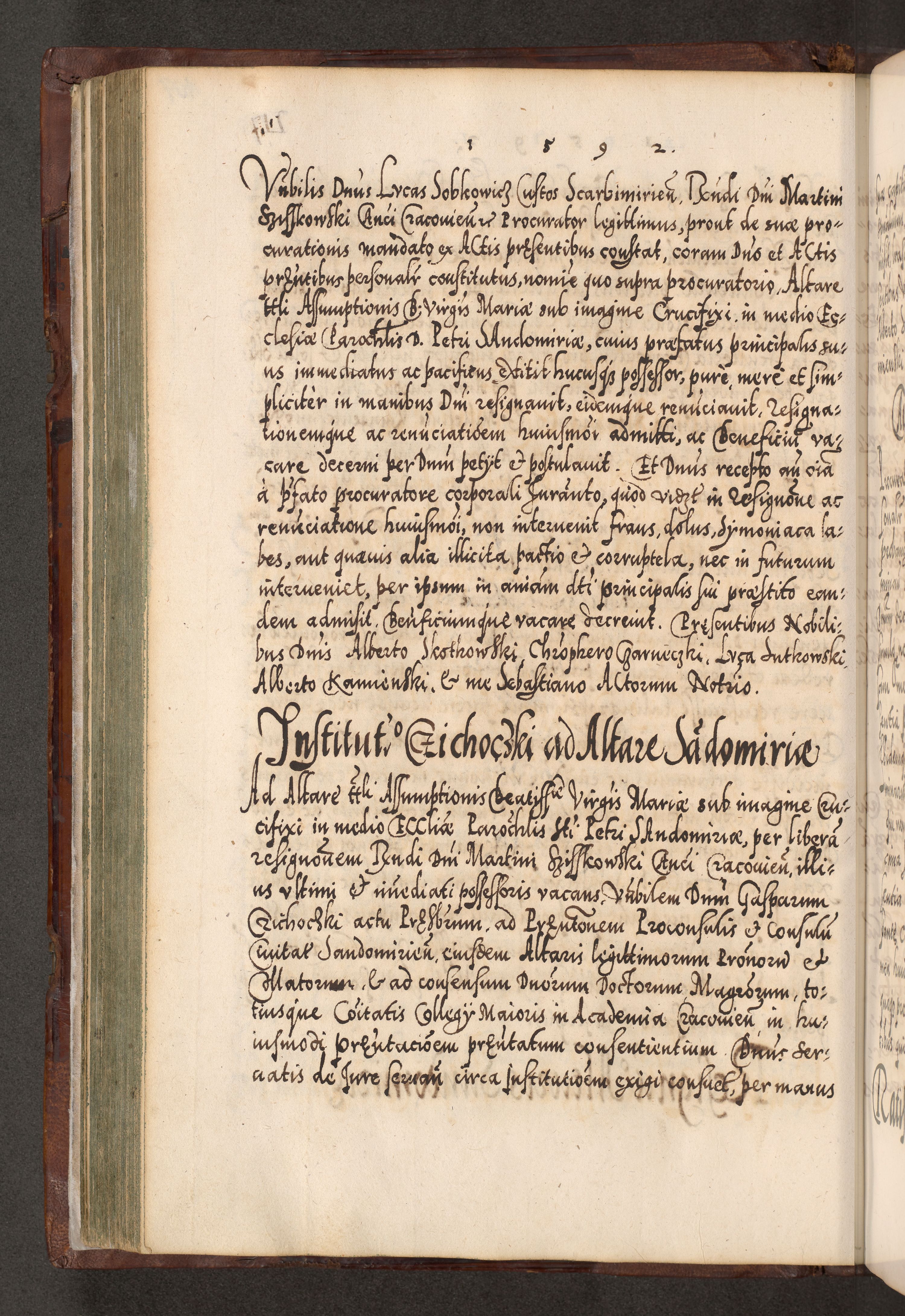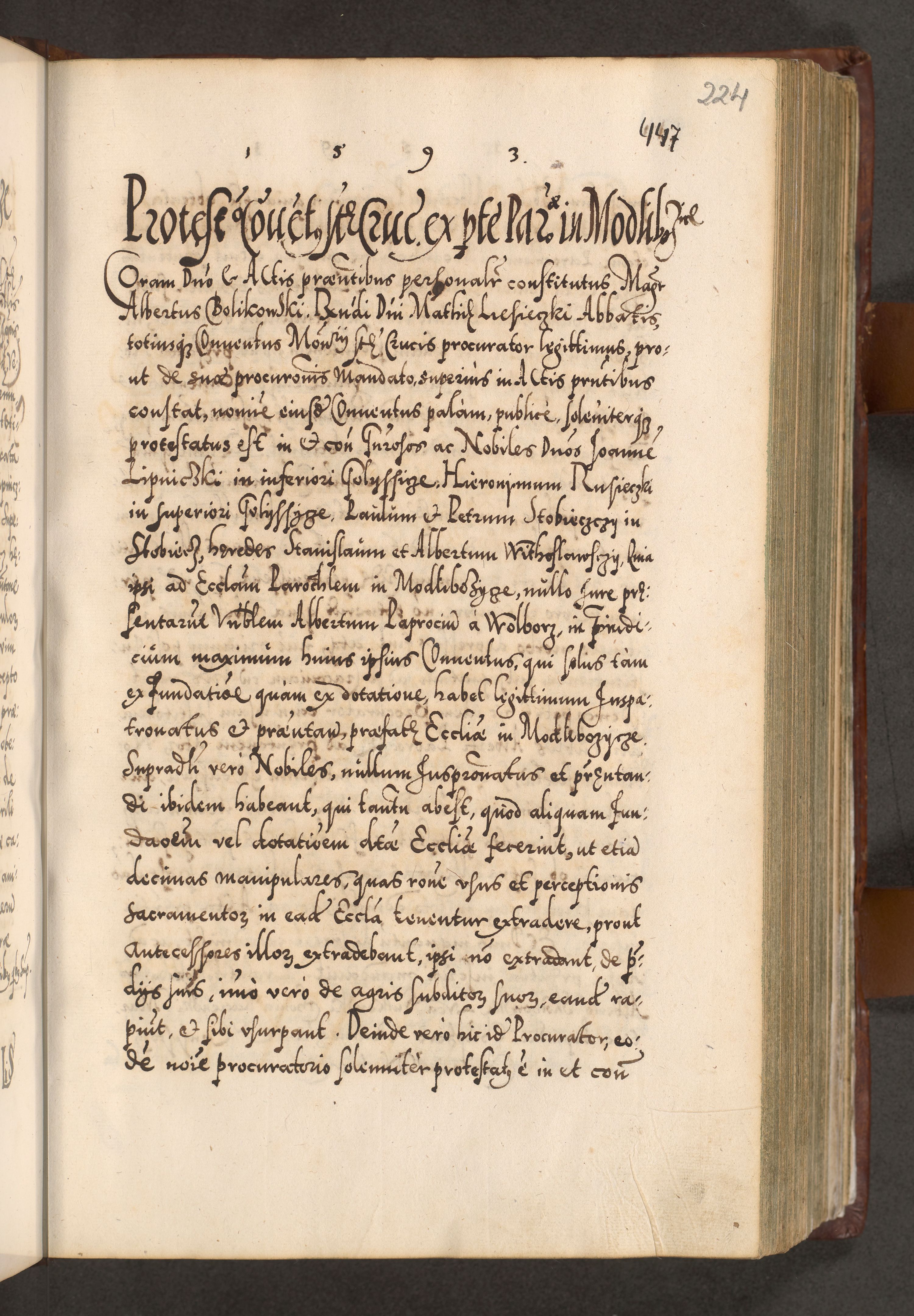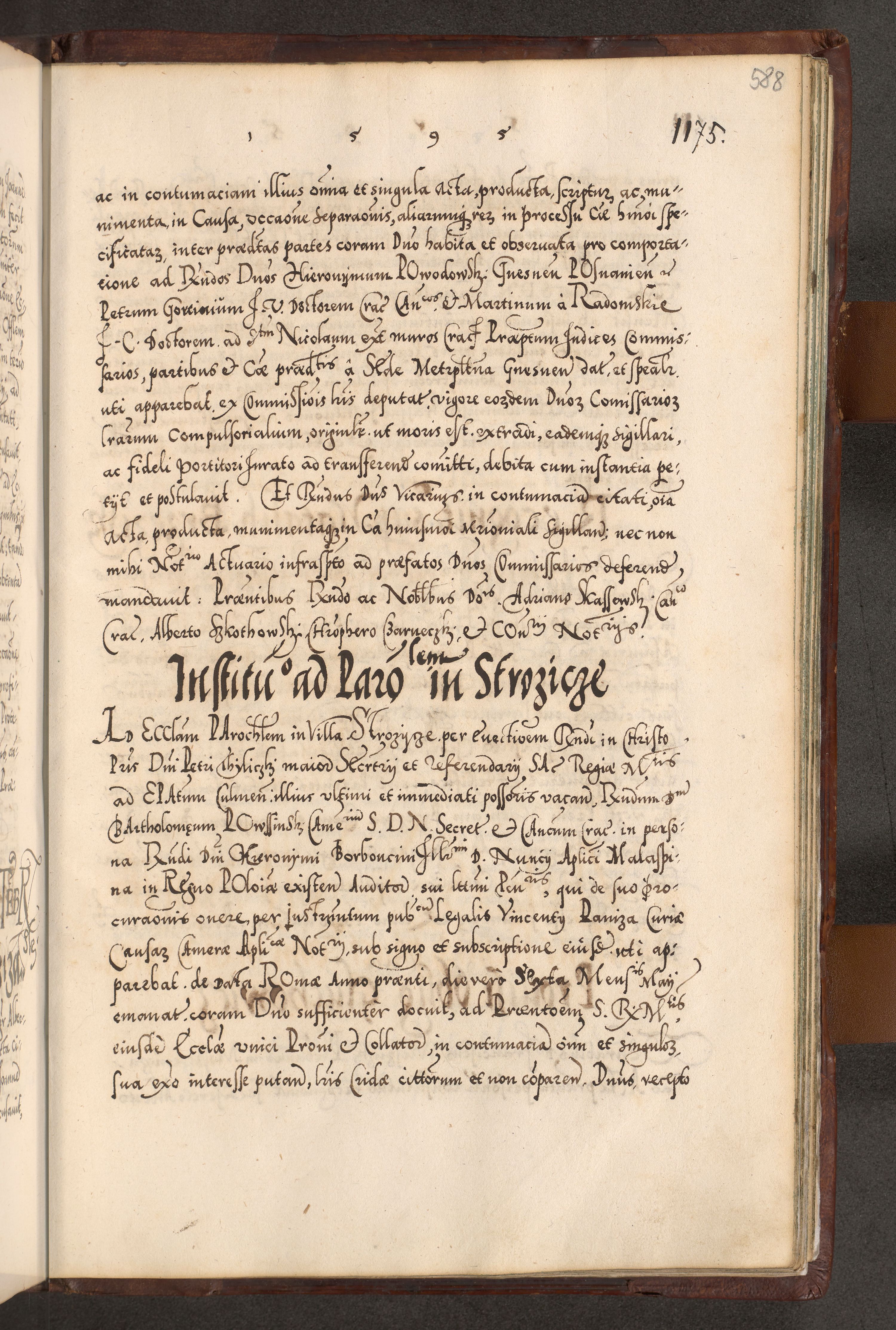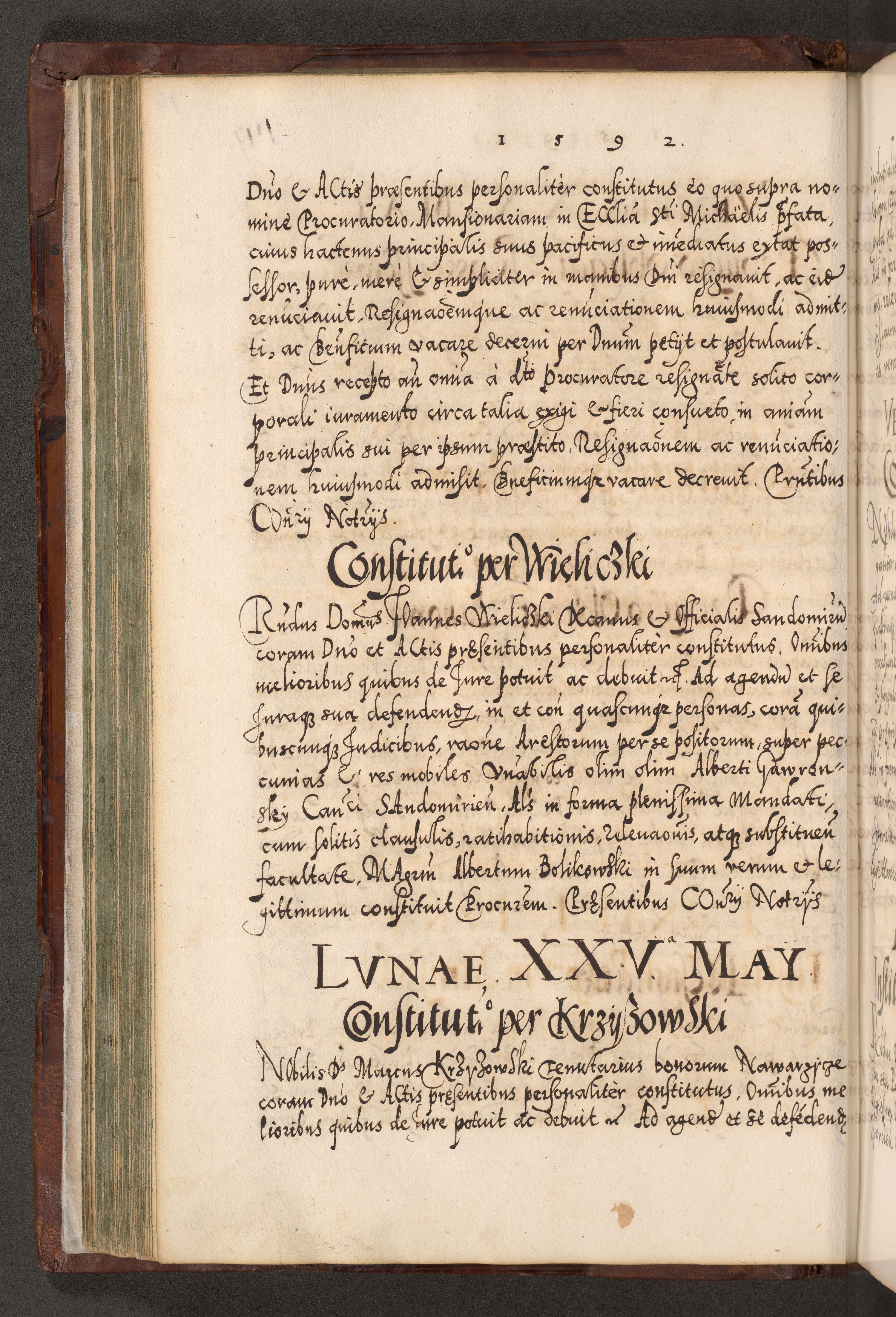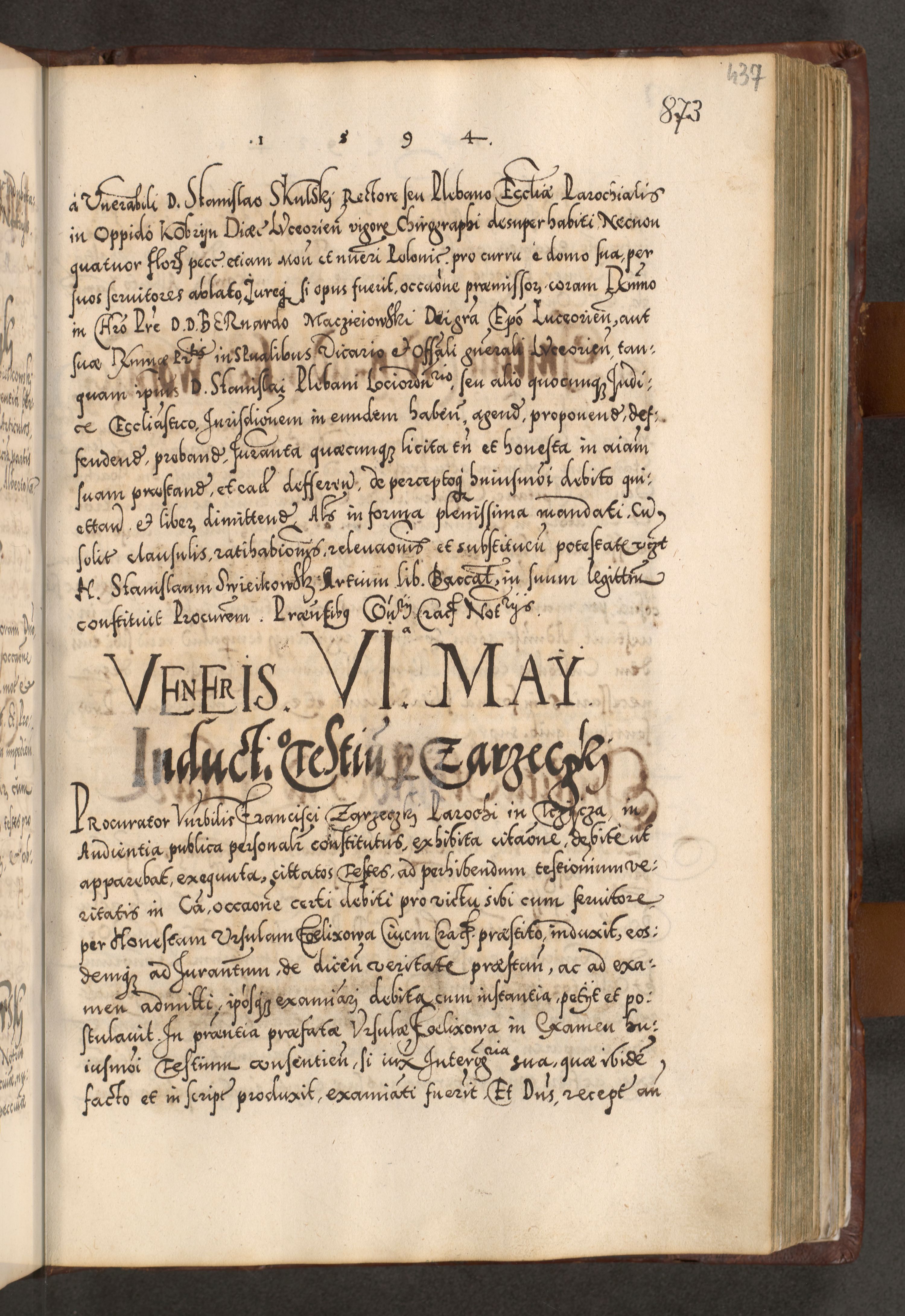 Illistrissimo et revedissimo in Christo Patre Domino Domino Georgio Rzadziwił Miserone Divina Sacrostae R. E. Tituli S. Sixti Presbitero Cardinali Duce in Olyka et Niesswiesz ad Gubernacula Ecclessiae Cracoviensis cuius administratorialem a Sancta Sede Apostolica obtinverat feliciter sedente. Acta actorum, causarum, sententiarum tam deffinitivarum quam interloquutoriarum decretorum, obligationum, quietationum, recognitionum, constitutionum procuratorum etc. coram Reverendo Domino Stanislao Crassinskz de Crasne Archidiacono Cracoviensis, Scholastico Gnesnesis, Custode Plocensis etc. Vicario et Officiali Generali Cracoviensi in Ano Domini Millesimo Quingentesimo Nonagesimo Primo cuius indictio quarta pontificatus SS. Domini Nostri Gregorii XIIII Anno I psius prio feliciter incipiut