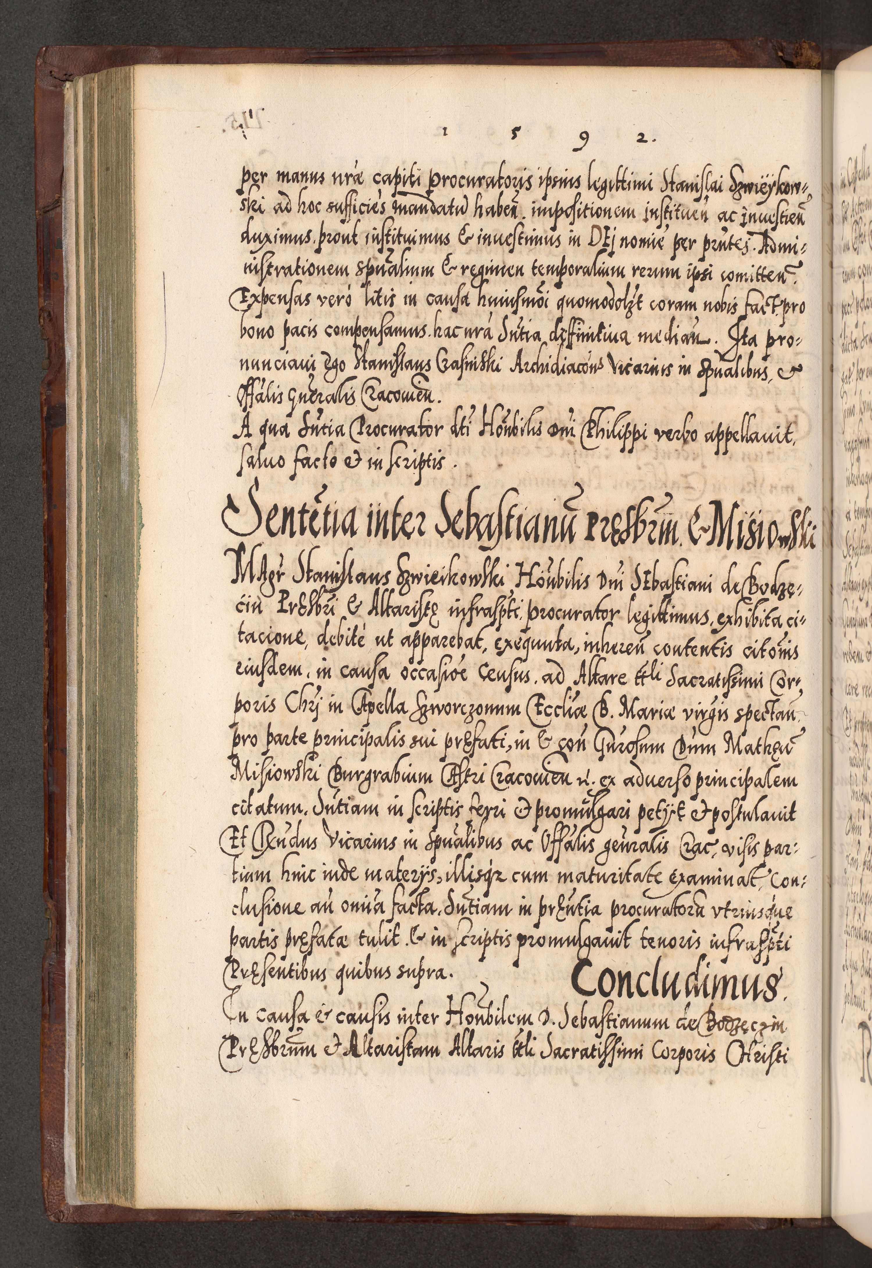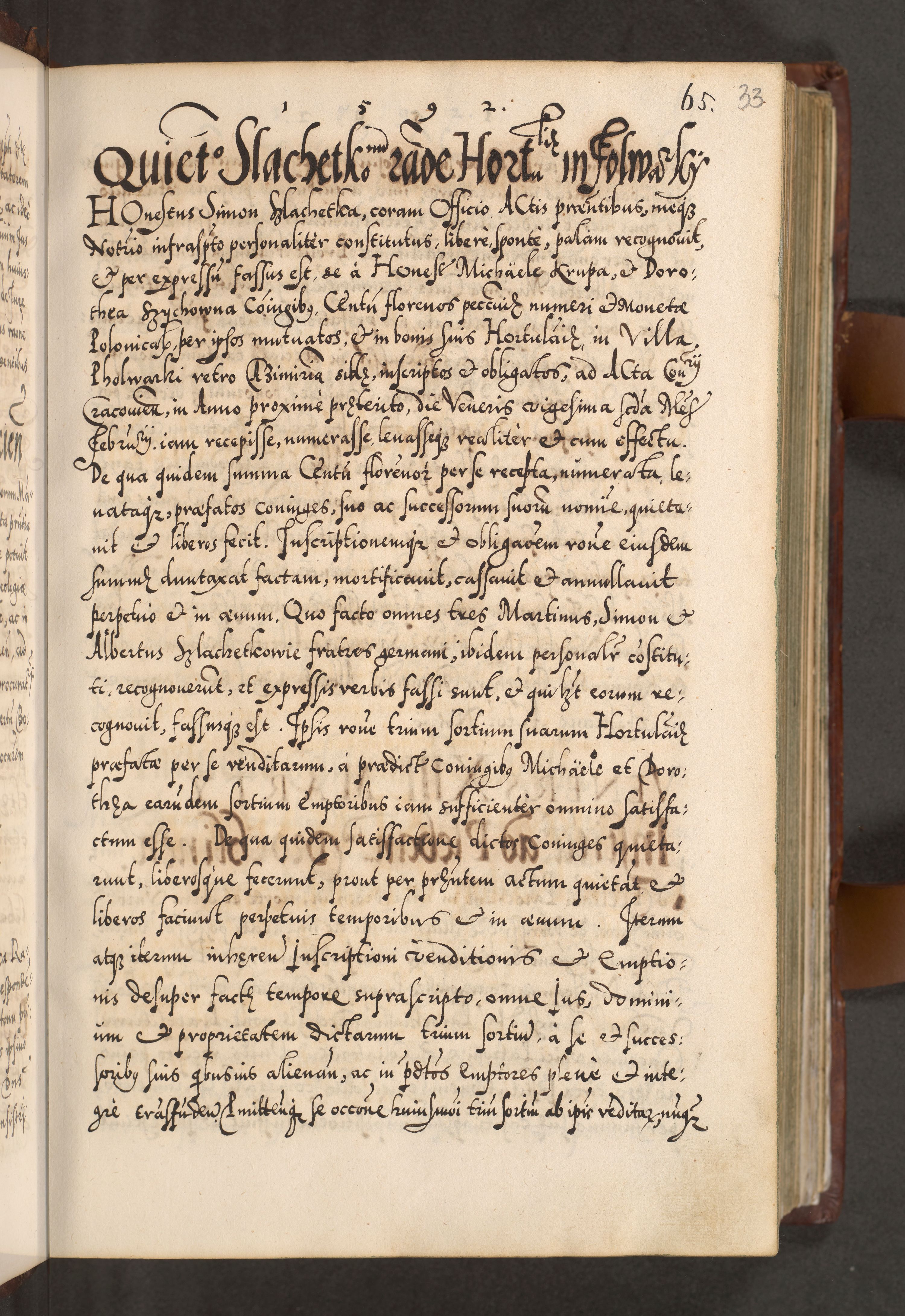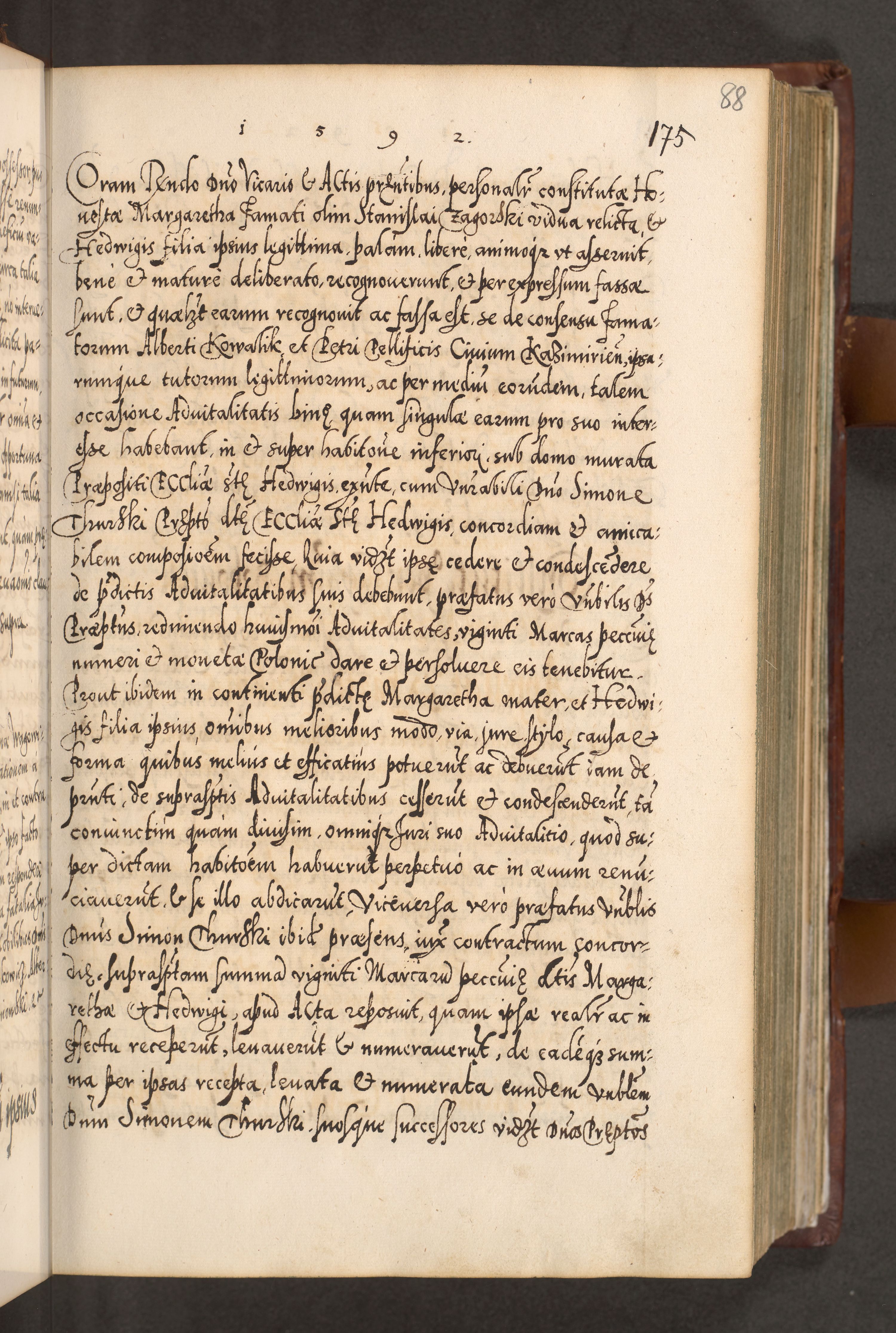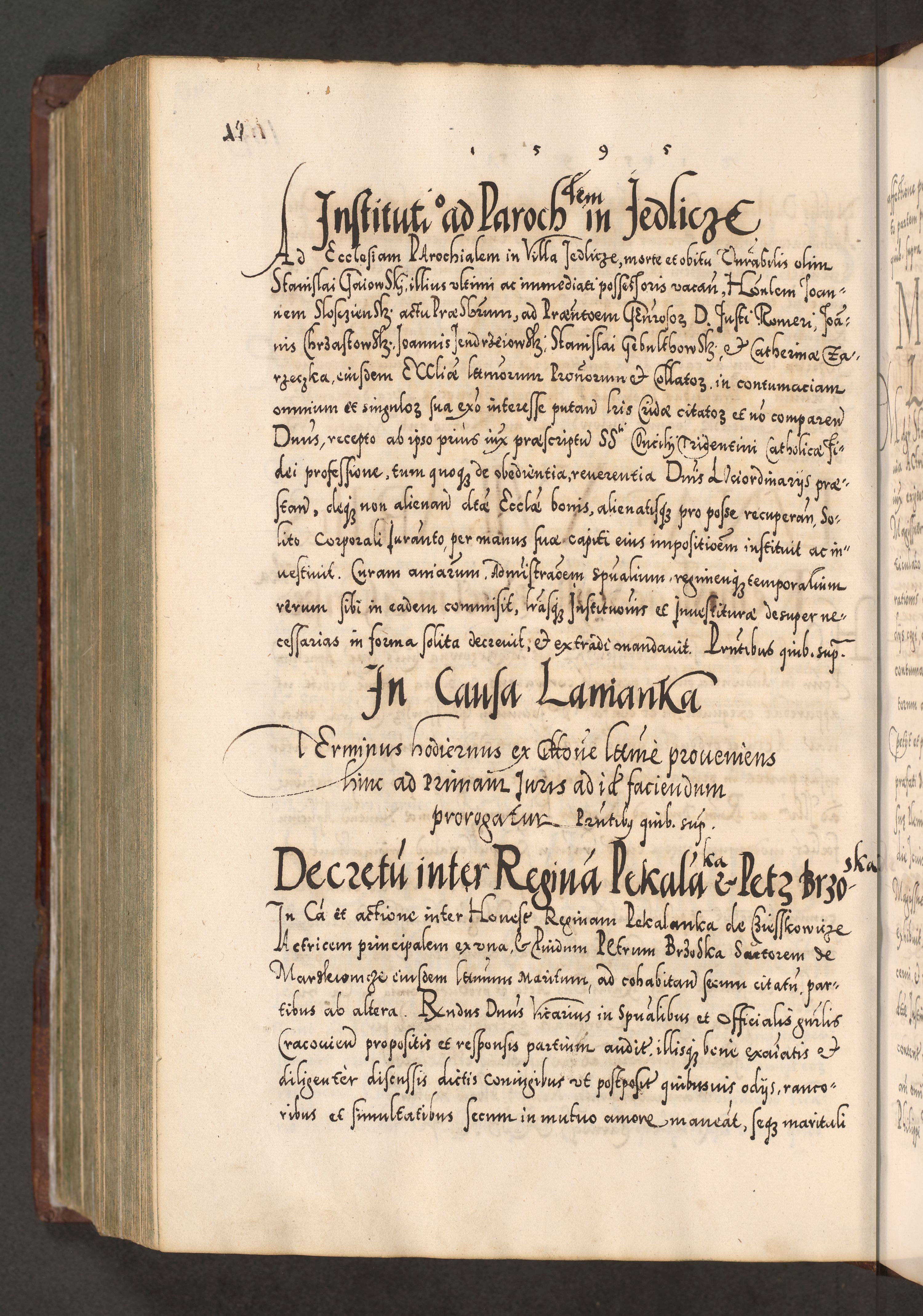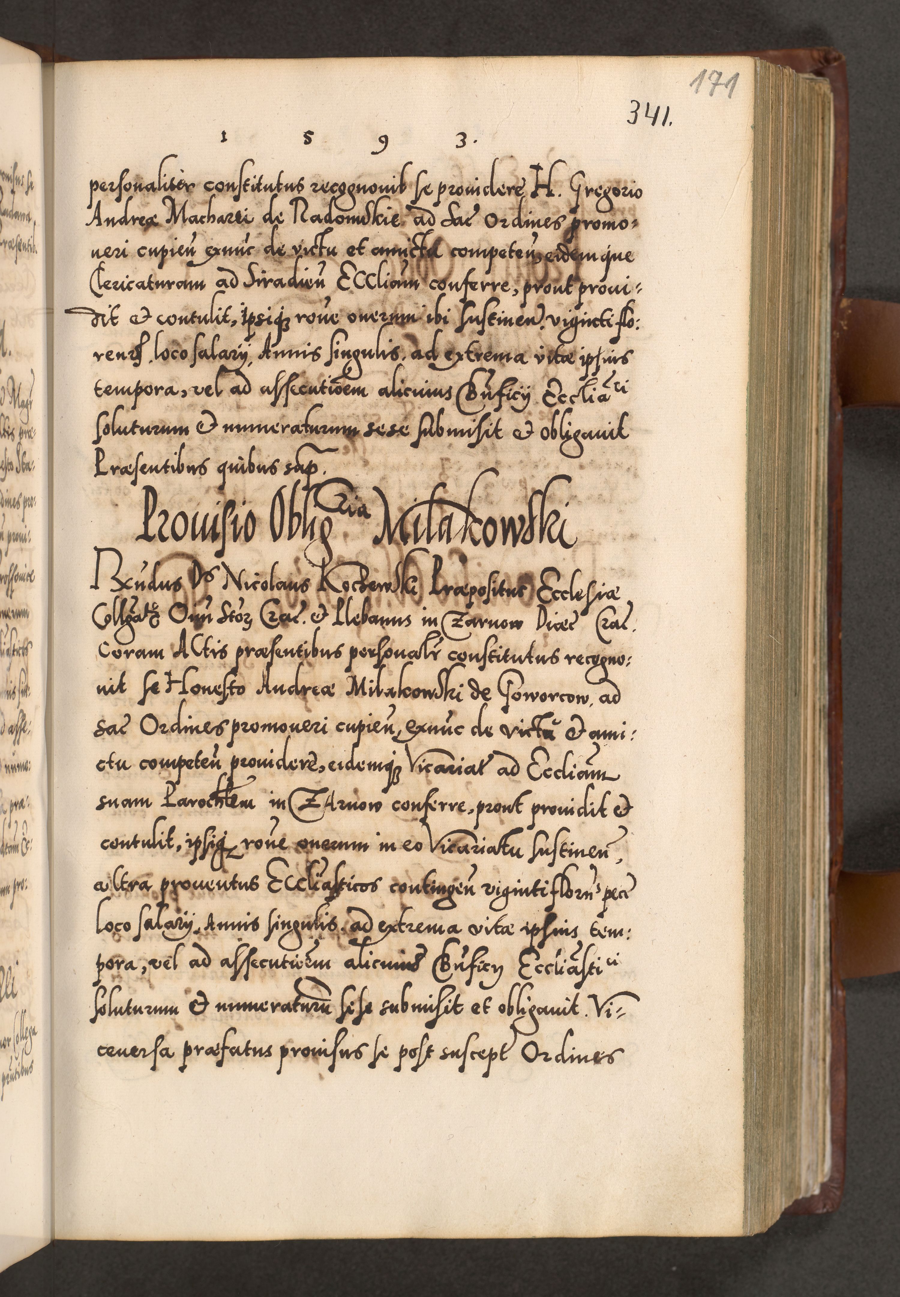 Illistrissimo et revedissimo in Christo Patre Domino Domino Georgio Rzadziwił Miserone Divina Sacrostae R. E. Tituli S. Sixti Presbitero Cardinali Duce in Olyka et Niesswiesz ad Gubernacula Ecclessiae Cracoviensis cuius administratorialem a Sancta Sede Apostolica obtinverat feliciter sedente. Acta actorum, causarum, sententiarum tam deffinitivarum quam interloquutoriarum decretorum, obligationum, quietationum, recognitionum, constitutionum procuratorum etc. coram Reverendo Domino Stanislao Crassinskz de Crasne Archidiacono Cracoviensis, Scholastico Gnesnesis, Custode Plocensis etc. Vicario et Officiali Generali Cracoviensi in Ano Domini Millesimo Quingentesimo Nonagesimo Primo cuius indictio quarta pontificatus SS. Domini Nostri Gregorii XIIII Anno I psius prio feliciter incipiut