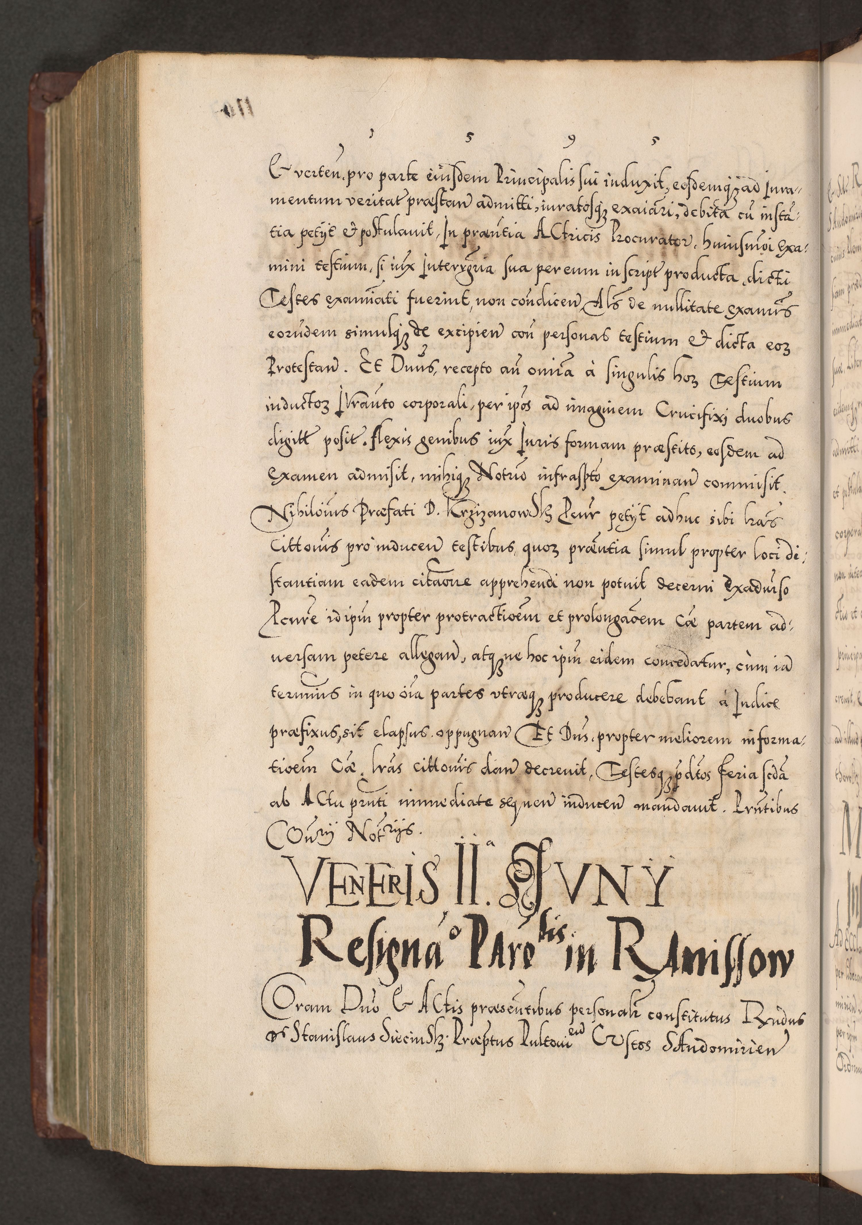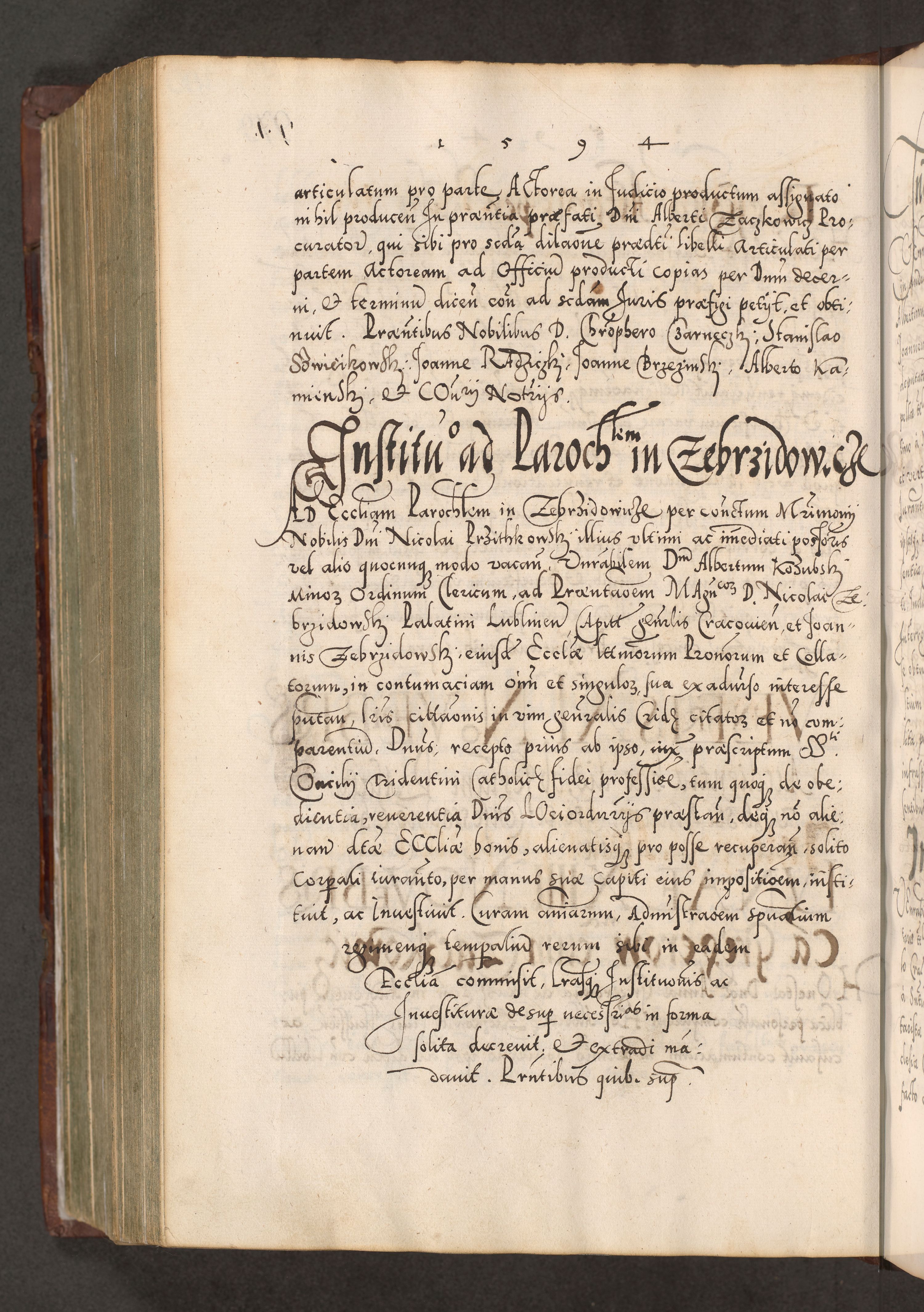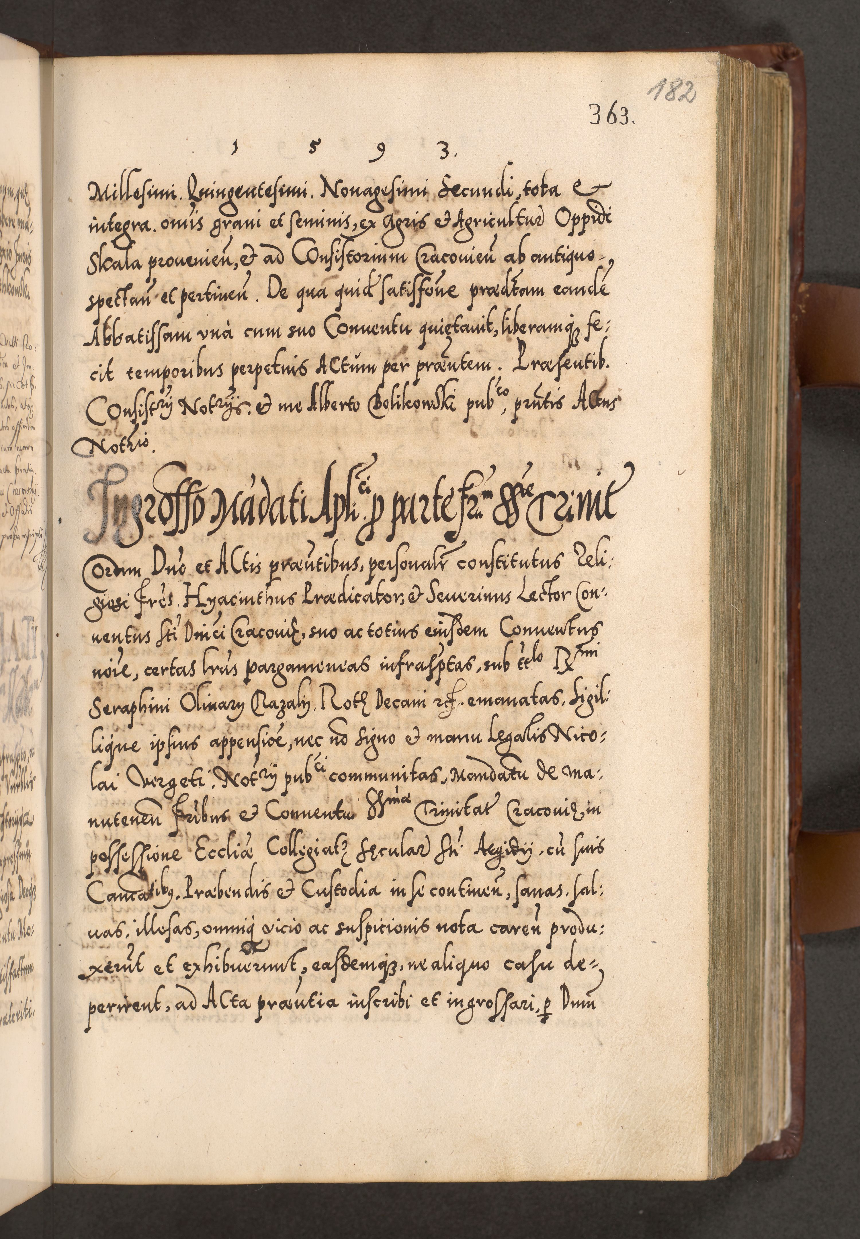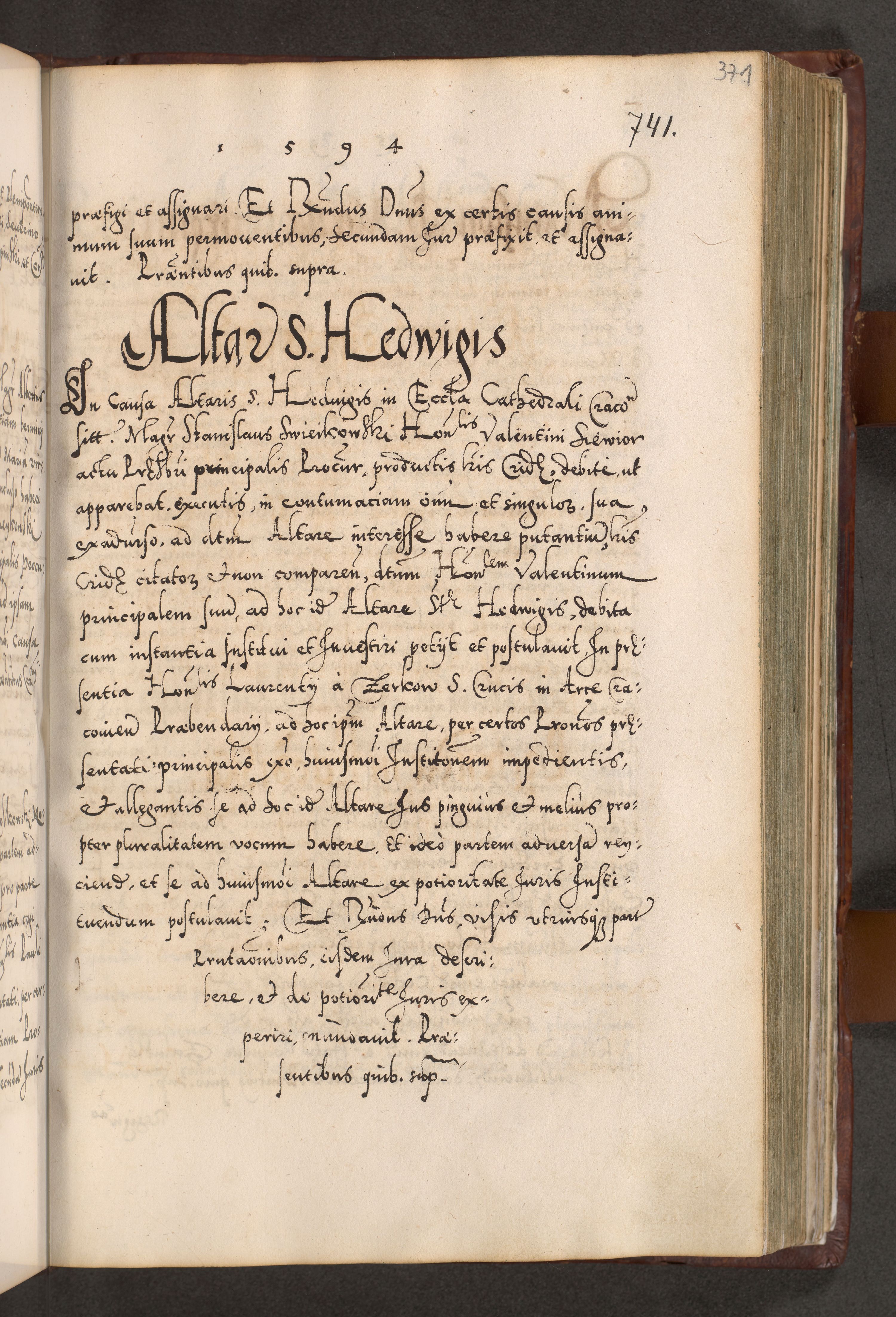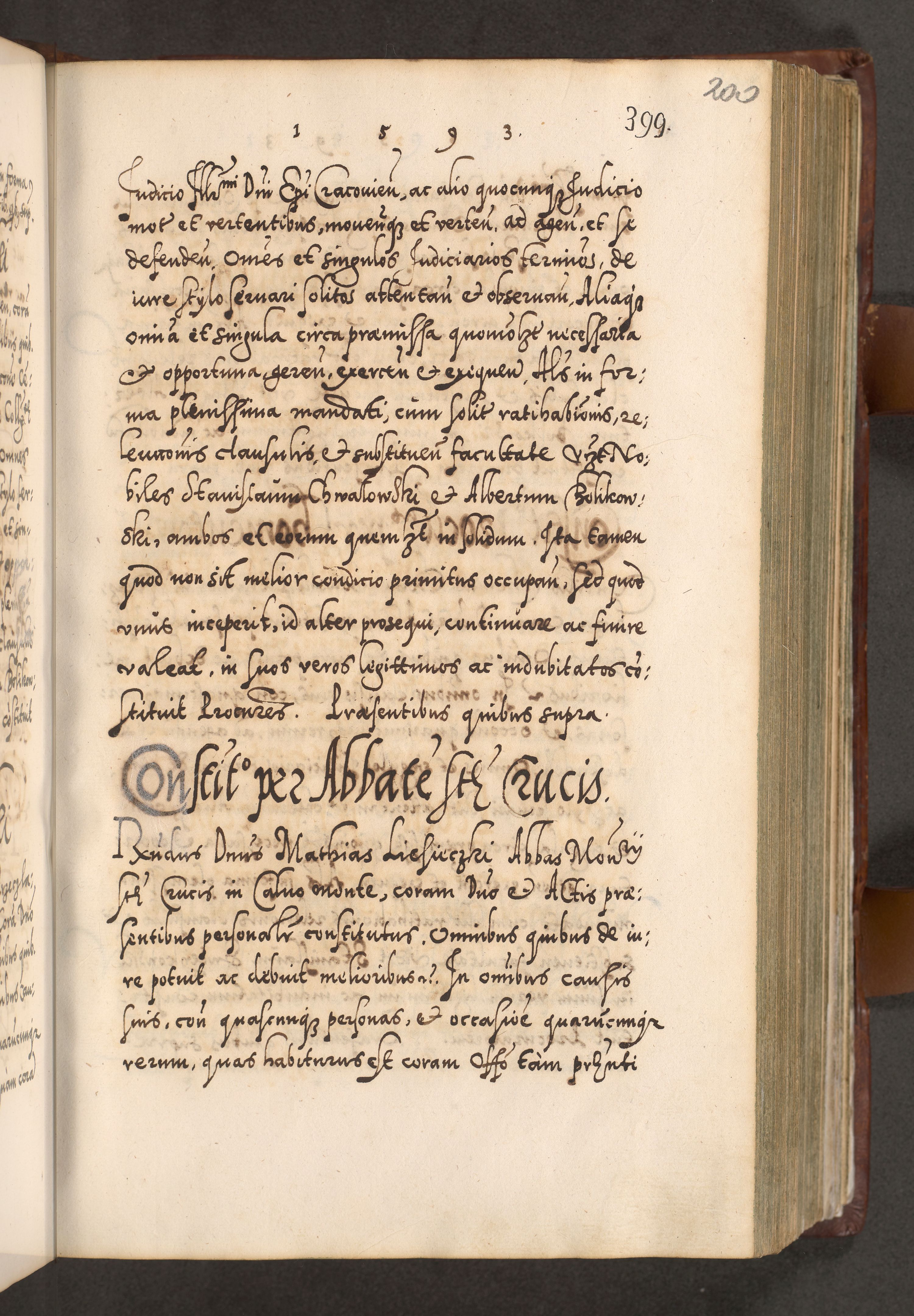 Illistrissimo et revedissimo in Christo Patre Domino Domino Georgio Rzadziwił Miserone Divina Sacrostae R. E. Tituli S. Sixti Presbitero Cardinali Duce in Olyka et Niesswiesz ad Gubernacula Ecclessiae Cracoviensis cuius administratorialem a Sancta Sede Apostolica obtinverat feliciter sedente. Acta actorum, causarum, sententiarum tam deffinitivarum quam interloquutoriarum decretorum, obligationum, quietationum, recognitionum, constitutionum procuratorum etc. coram Reverendo Domino Stanislao Crassinskz de Crasne Archidiacono Cracoviensis, Scholastico Gnesnesis, Custode Plocensis etc. Vicario et Officiali Generali Cracoviensi in Ano Domini Millesimo Quingentesimo Nonagesimo Primo cuius indictio quarta pontificatus SS. Domini Nostri Gregorii XIIII Anno I psius prio feliciter incipiut