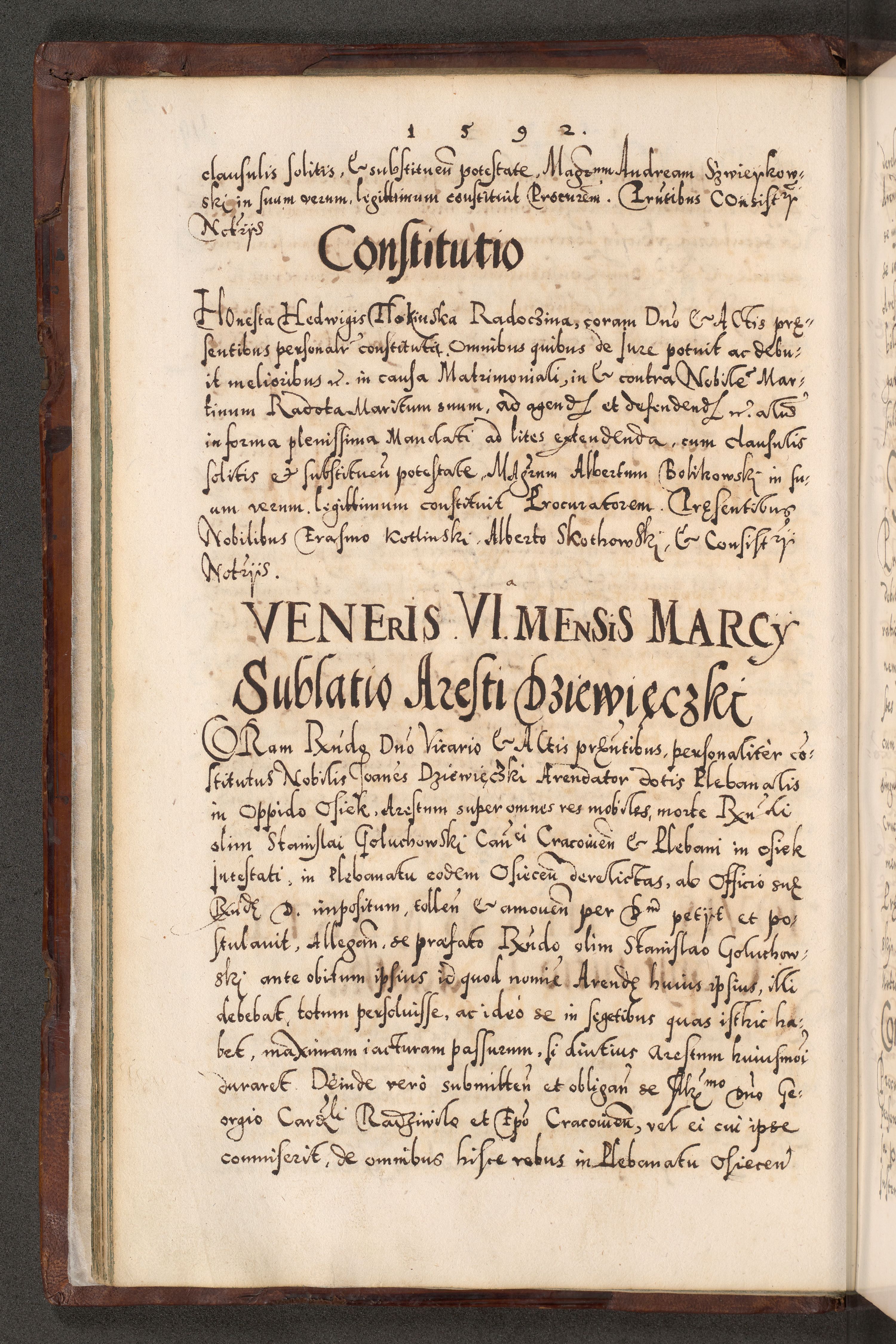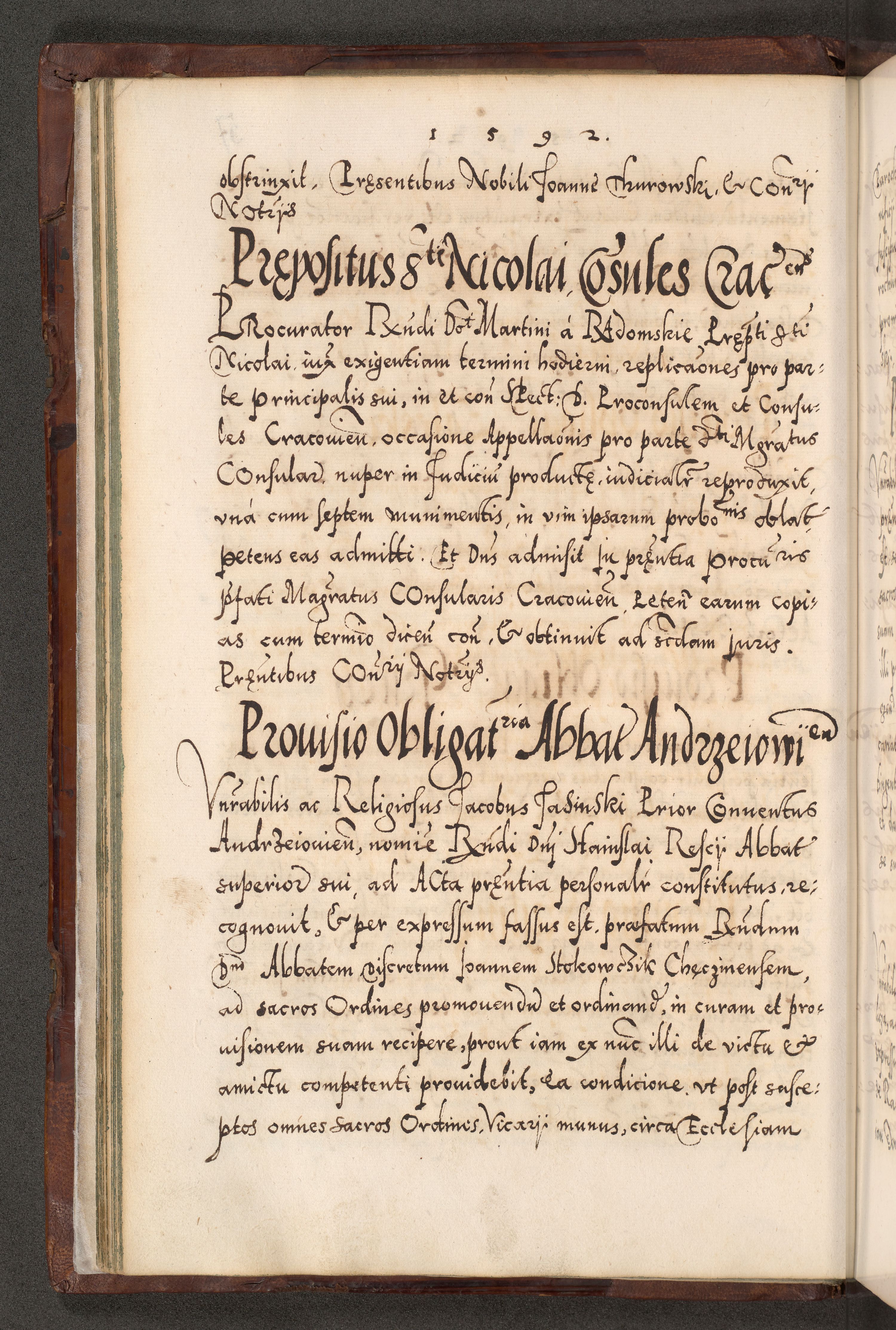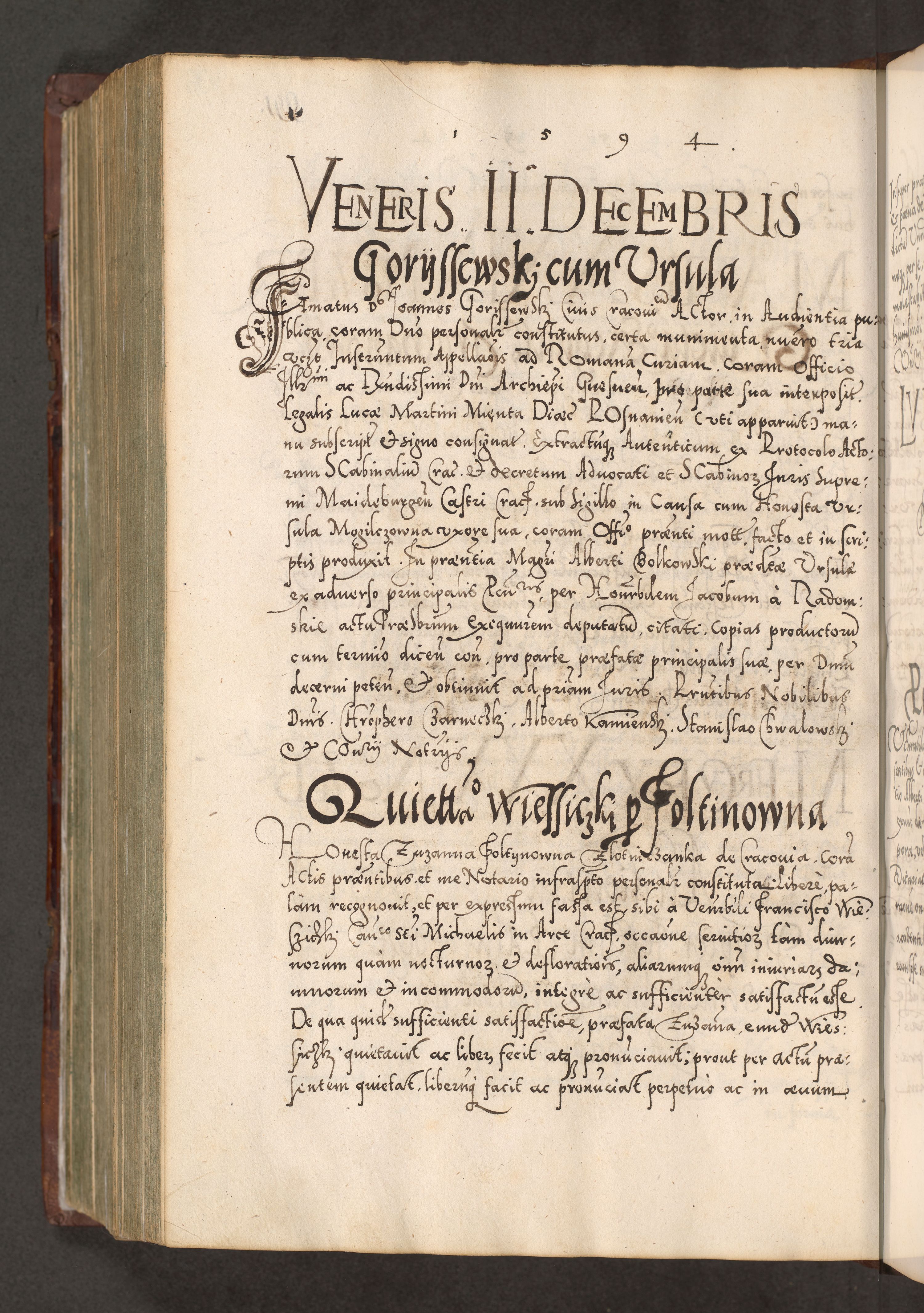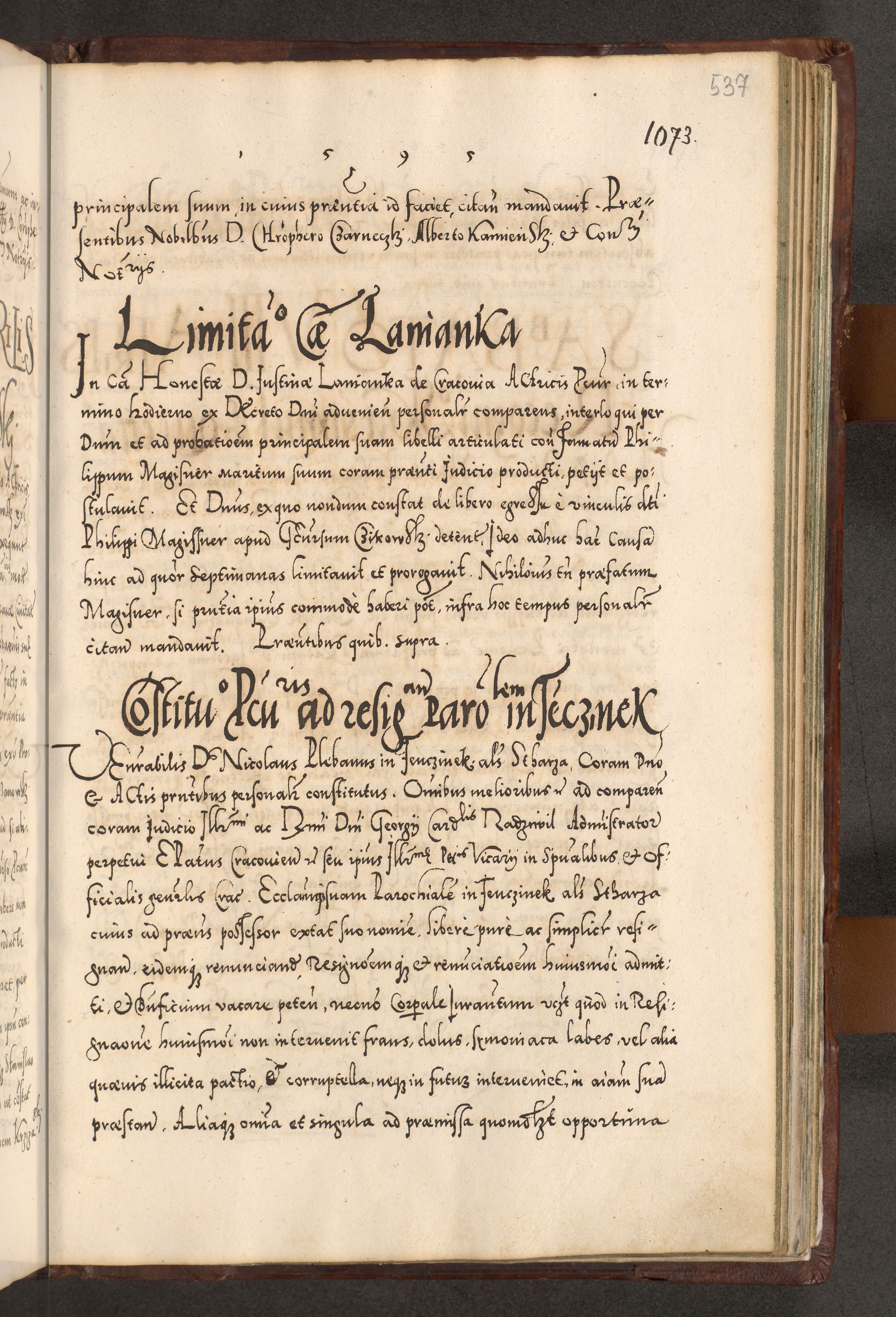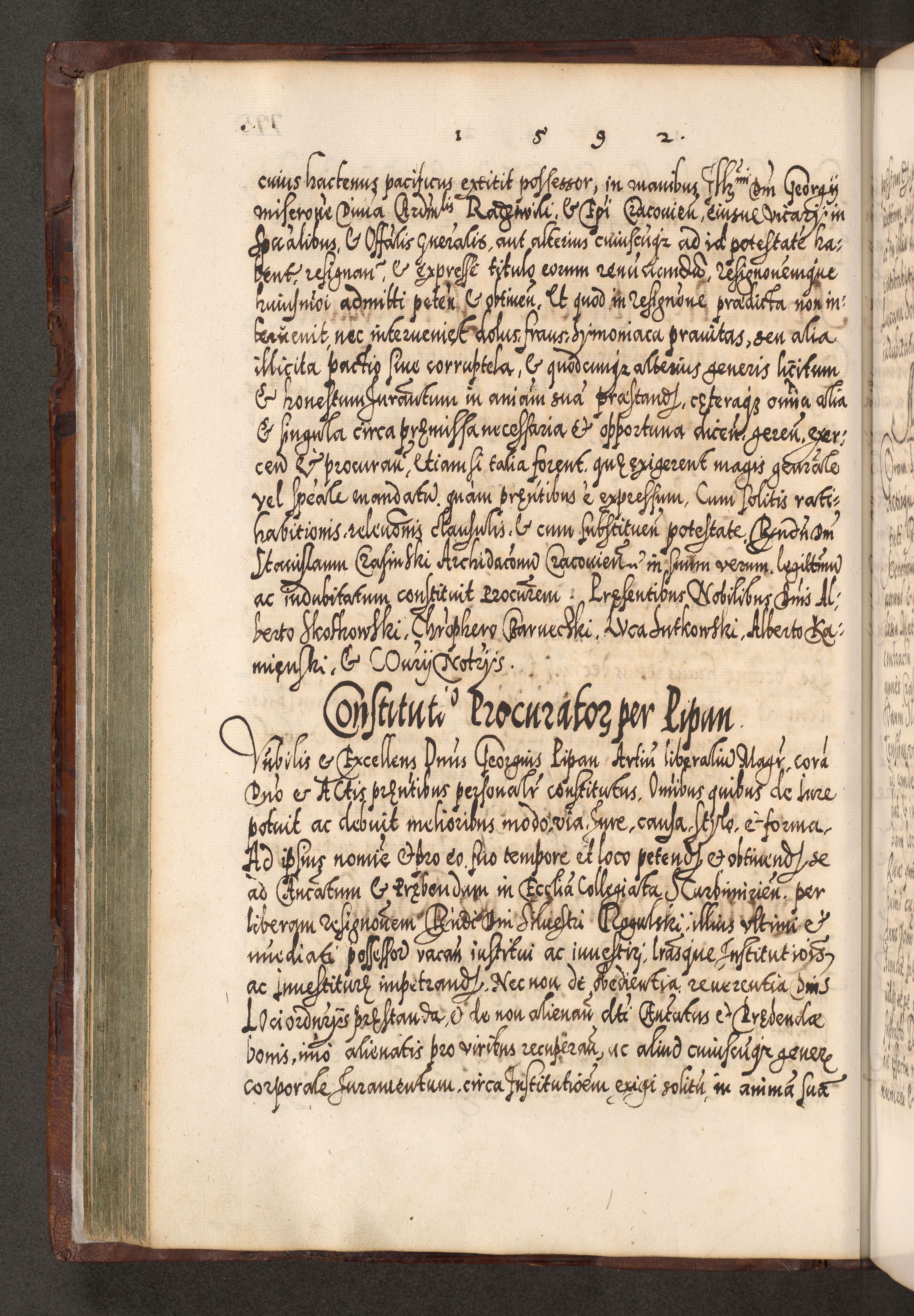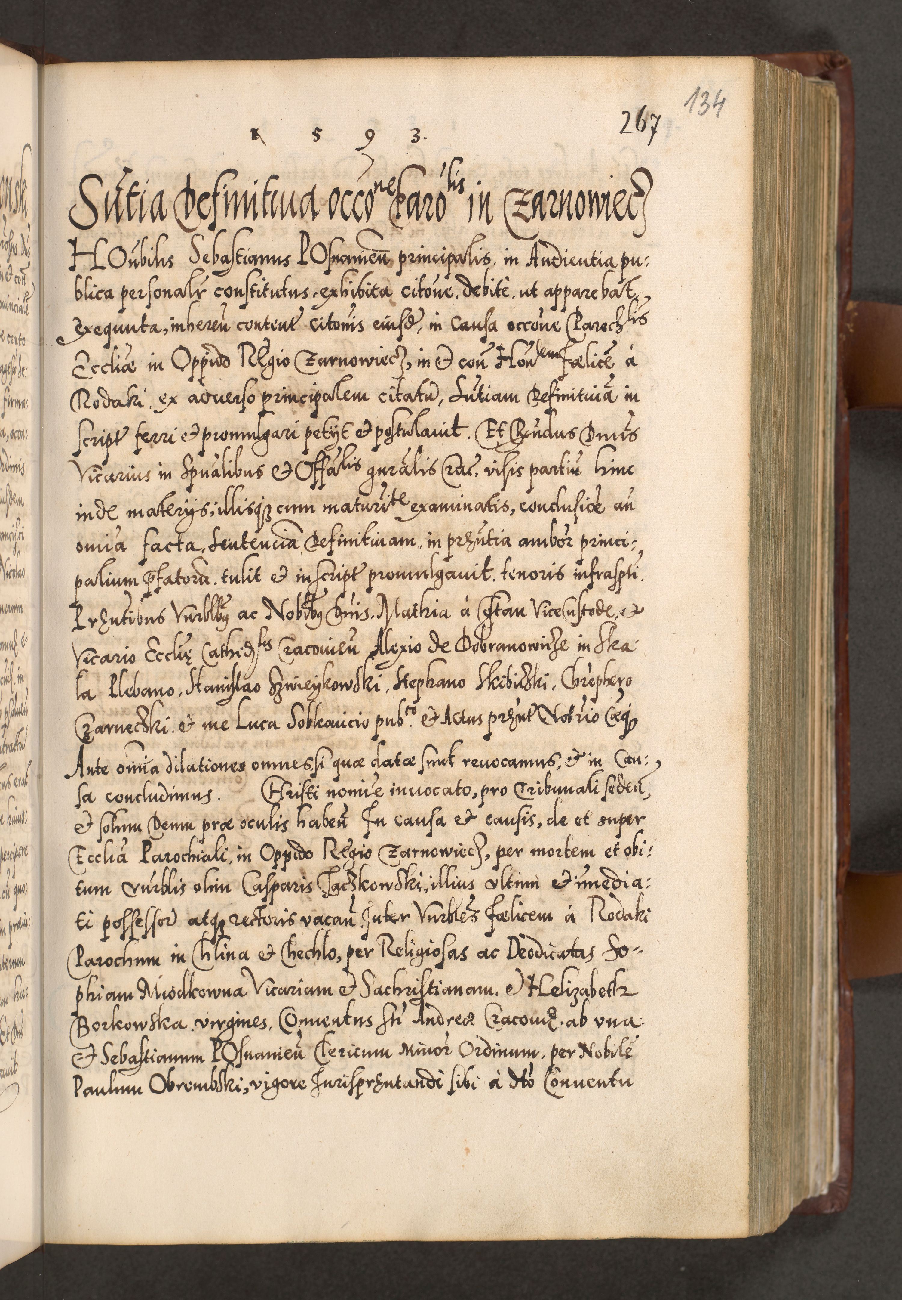 Illistrissimo et revedissimo in Christo Patre Domino Domino Georgio Rzadziwił Miserone Divina Sacrostae R. E. Tituli S. Sixti Presbitero Cardinali Duce in Olyka et Niesswiesz ad Gubernacula Ecclessiae Cracoviensis cuius administratorialem a Sancta Sede Apostolica obtinverat feliciter sedente. Acta actorum, causarum, sententiarum tam deffinitivarum quam interloquutoriarum decretorum, obligationum, quietationum, recognitionum, constitutionum procuratorum etc. coram Reverendo Domino Stanislao Crassinskz de Crasne Archidiacono Cracoviensis, Scholastico Gnesnesis, Custode Plocensis etc. Vicario et Officiali Generali Cracoviensi in Ano Domini Millesimo Quingentesimo Nonagesimo Primo cuius indictio quarta pontificatus SS. Domini Nostri Gregorii XIIII Anno I psius prio feliciter incipiut