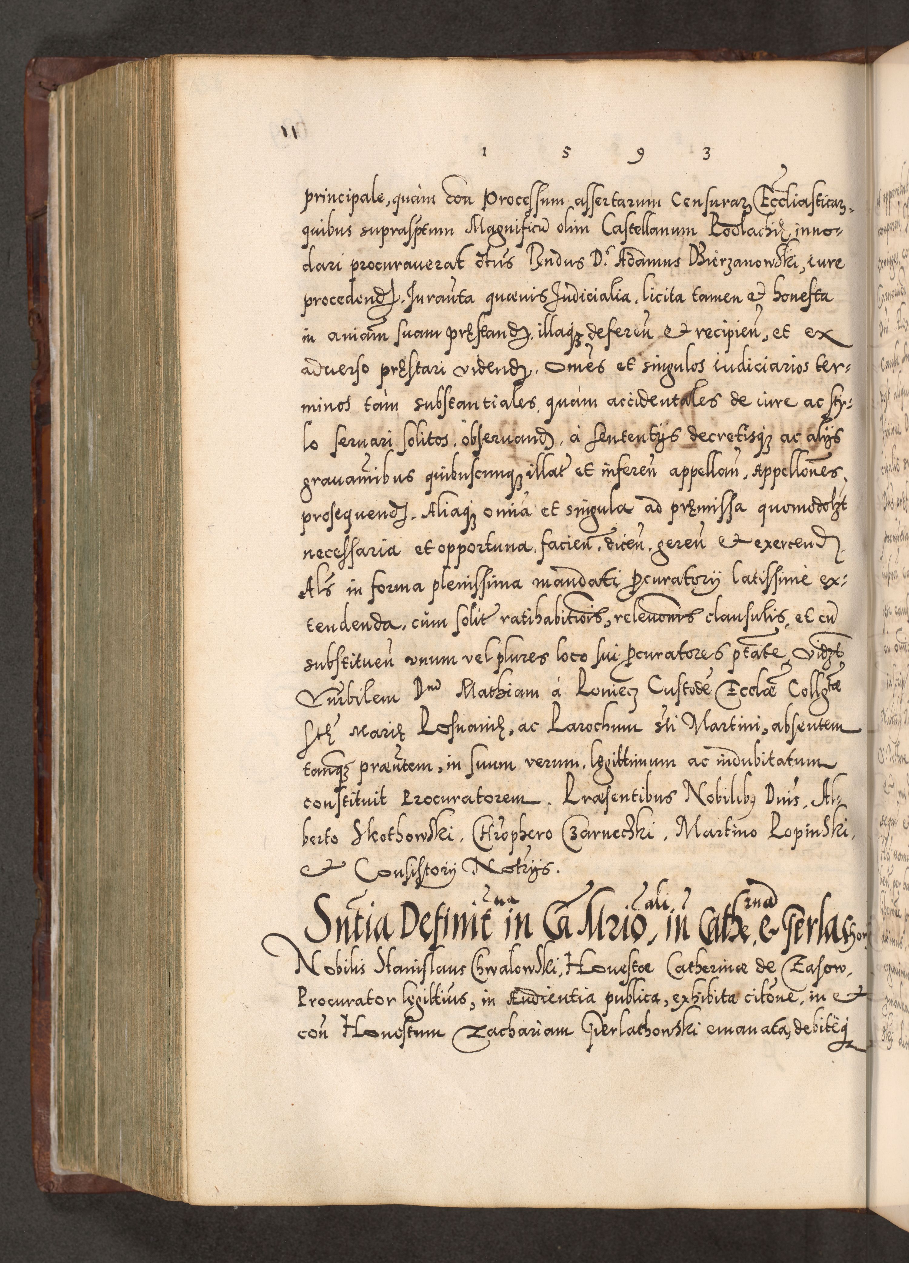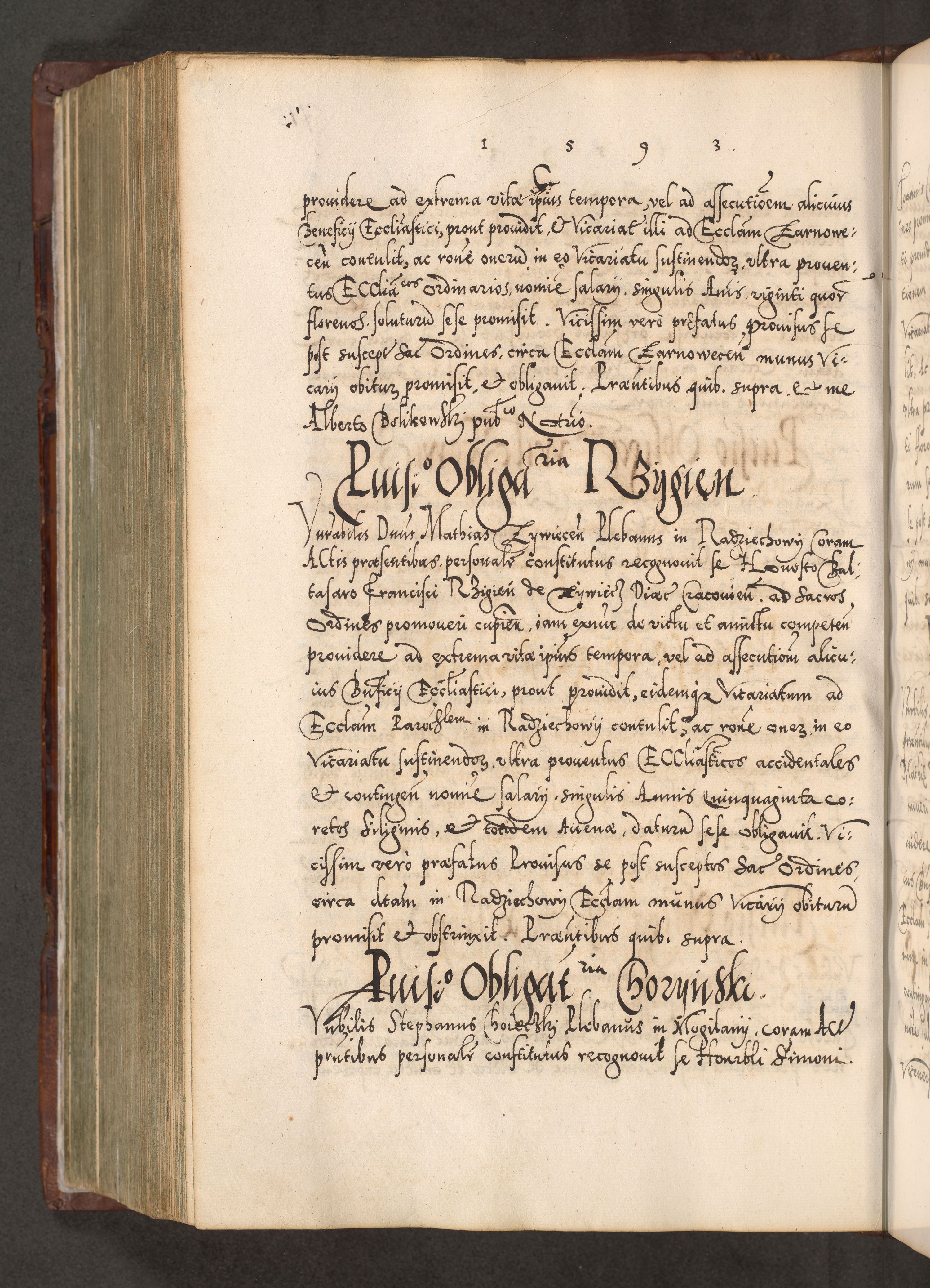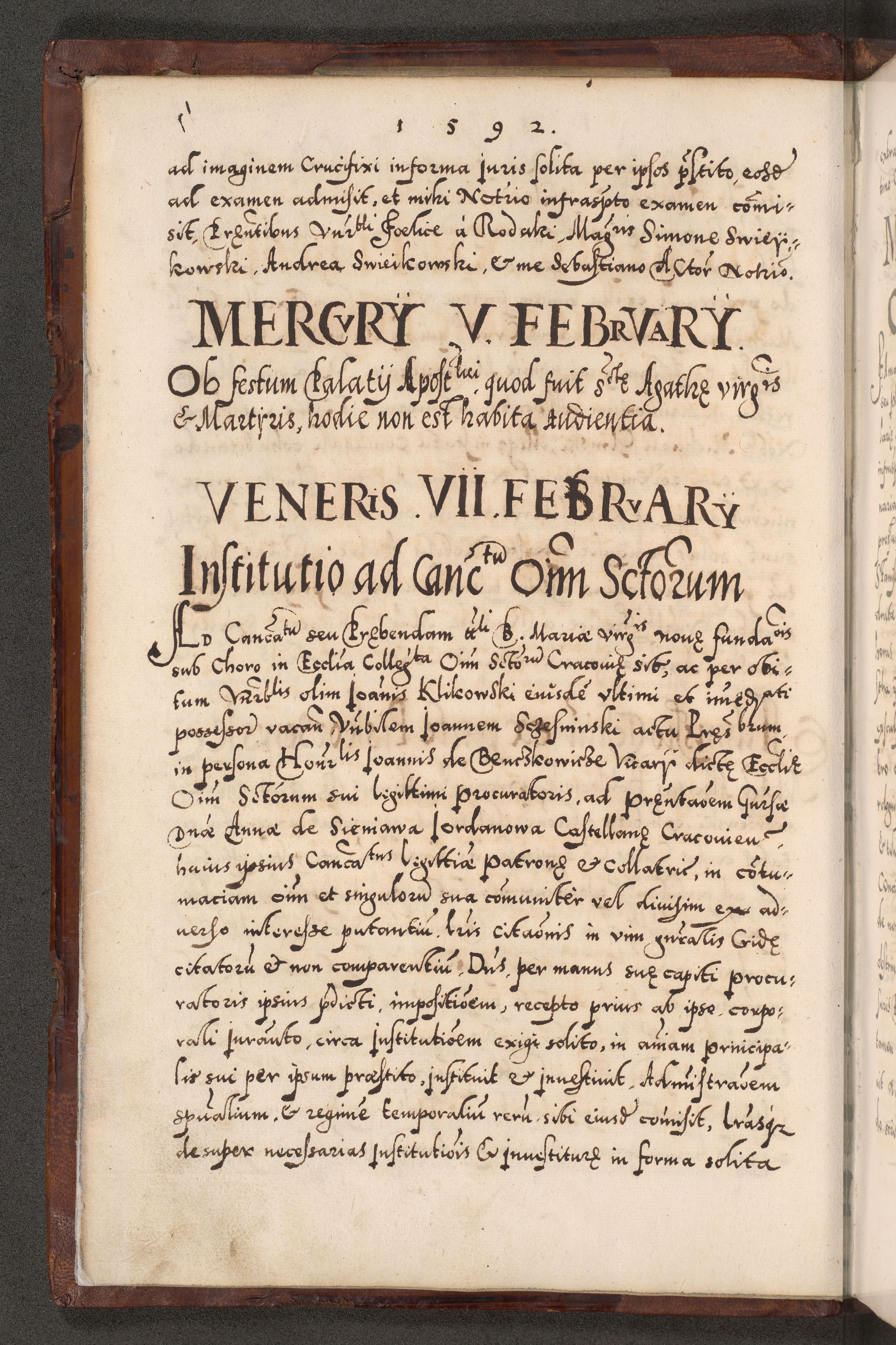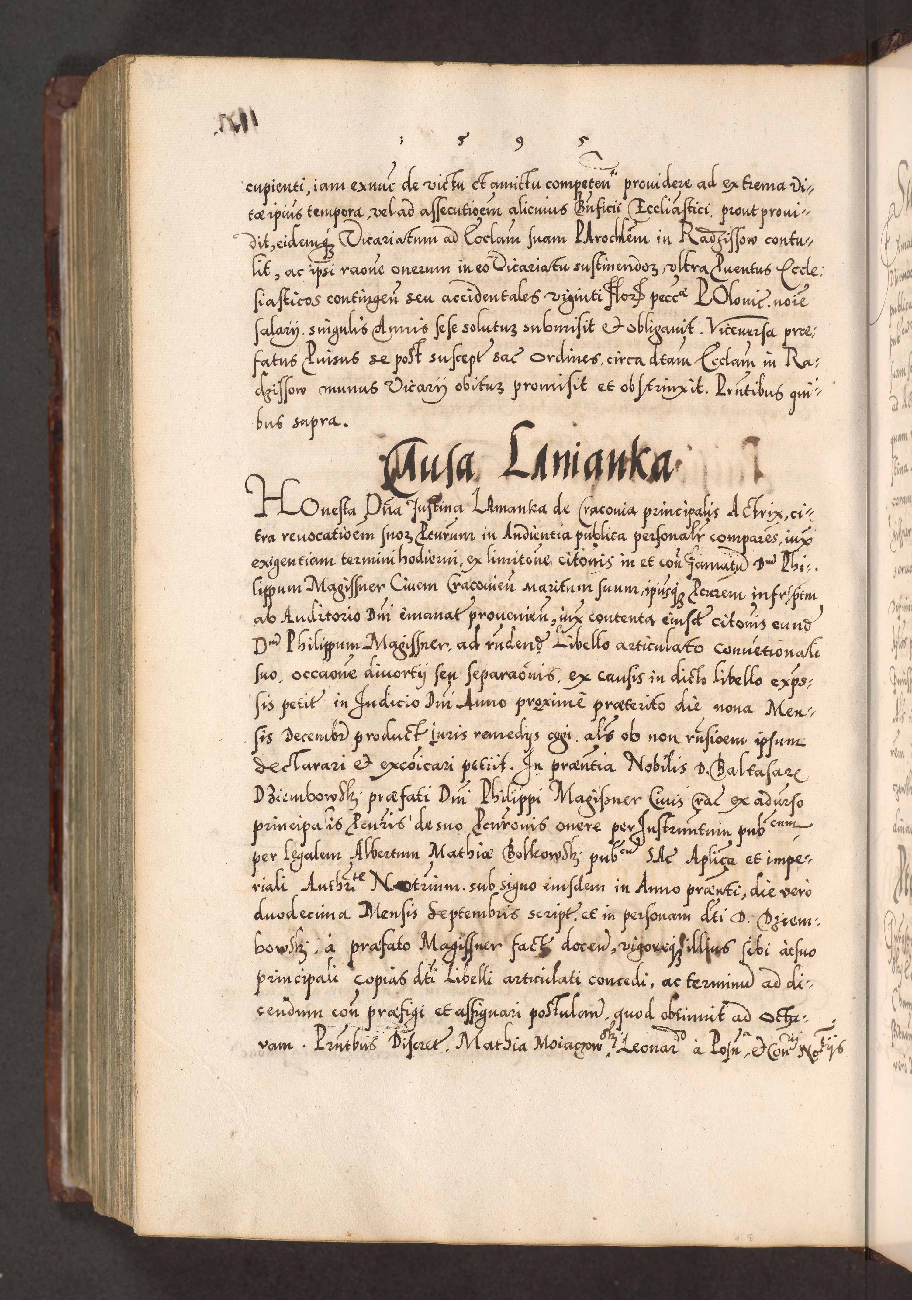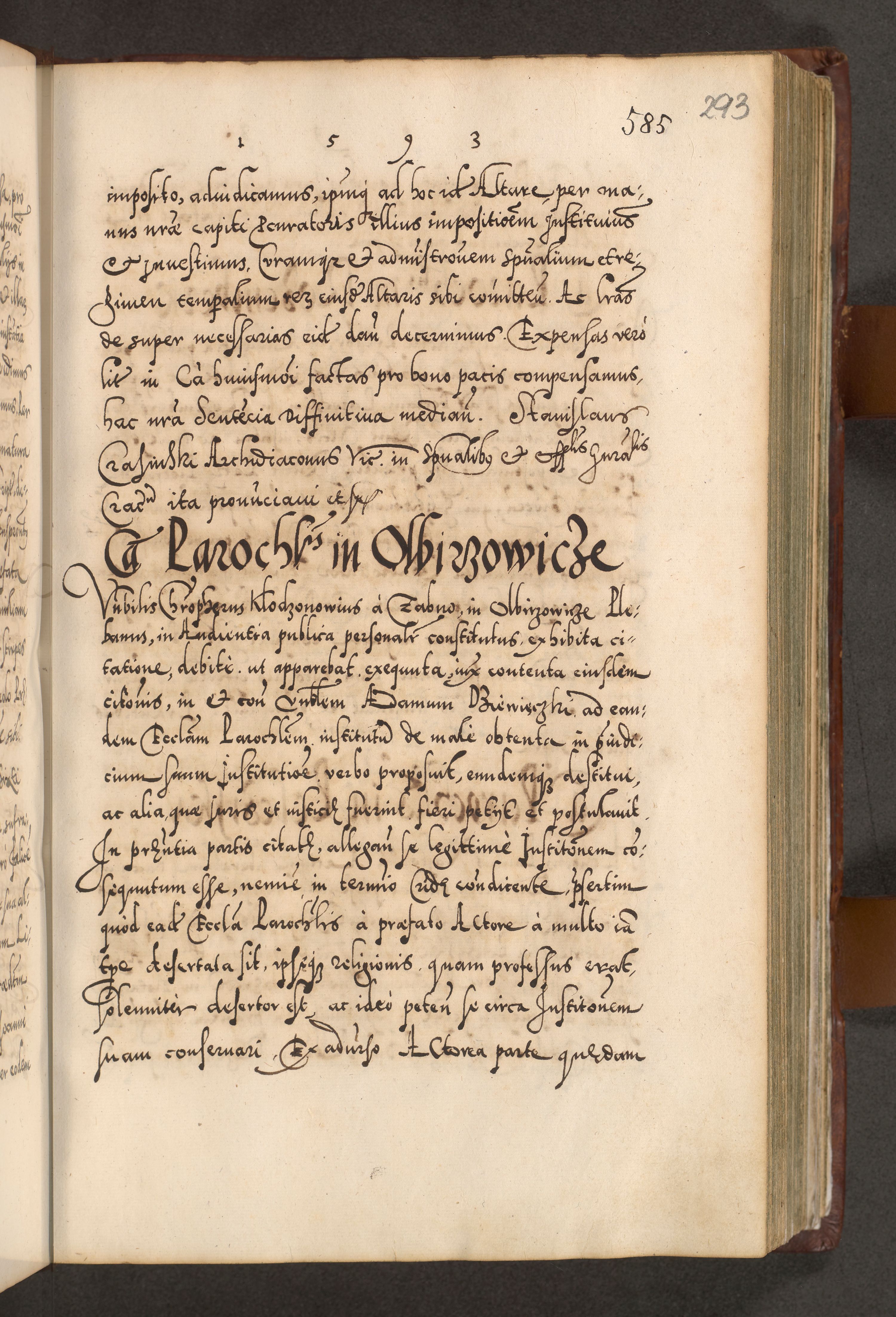 Illistrissimo et revedissimo in Christo Patre Domino Domino Georgio Rzadziwił Miserone Divina Sacrostae R. E. Tituli S. Sixti Presbitero Cardinali Duce in Olyka et Niesswiesz ad Gubernacula Ecclessiae Cracoviensis cuius administratorialem a Sancta Sede Apostolica obtinverat feliciter sedente. Acta actorum, causarum, sententiarum tam deffinitivarum quam interloquutoriarum decretorum, obligationum, quietationum, recognitionum, constitutionum procuratorum etc. coram Reverendo Domino Stanislao Crassinskz de Crasne Archidiacono Cracoviensis, Scholastico Gnesnesis, Custode Plocensis etc. Vicario et Officiali Generali Cracoviensi in Ano Domini Millesimo Quingentesimo Nonagesimo Primo cuius indictio quarta pontificatus SS. Domini Nostri Gregorii XIIII Anno I psius prio feliciter incipiut