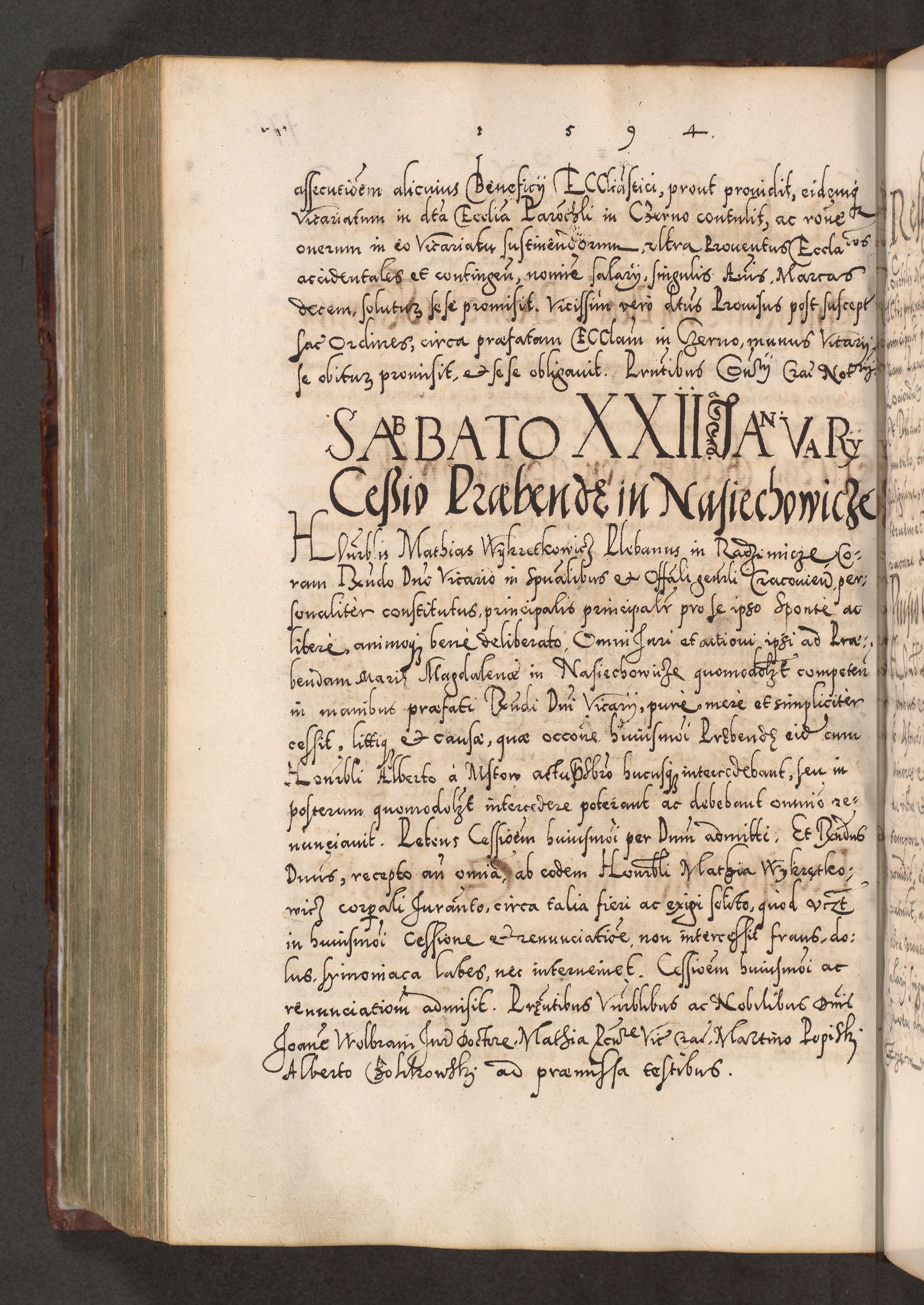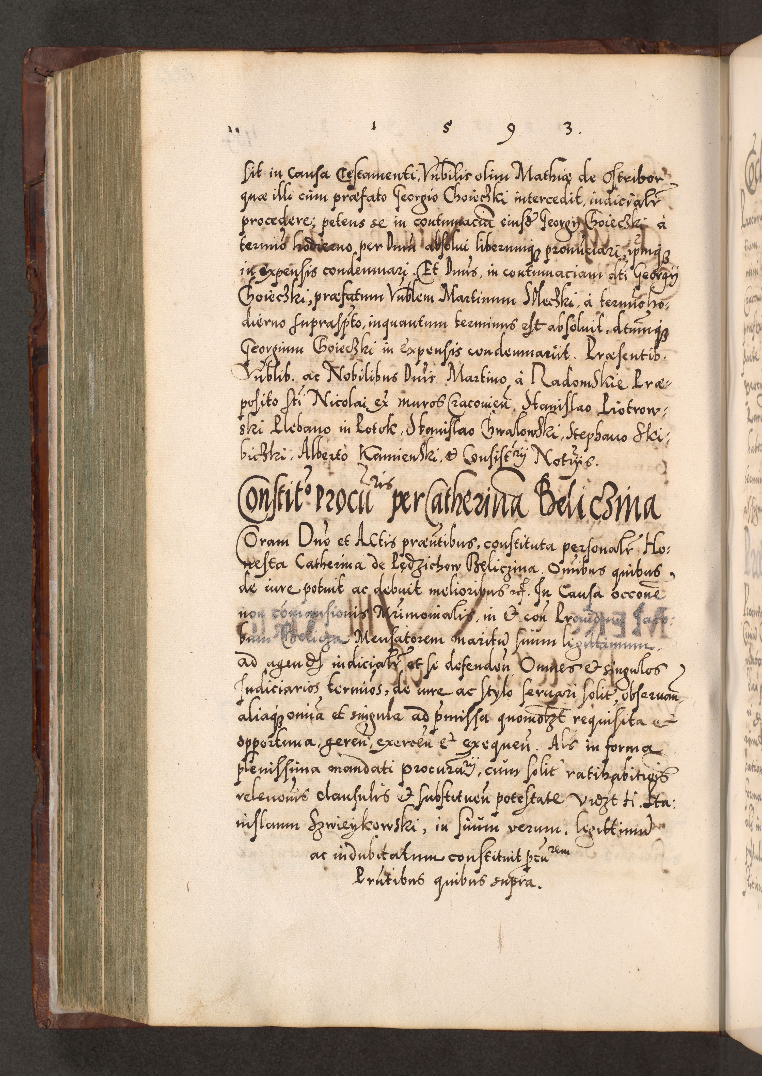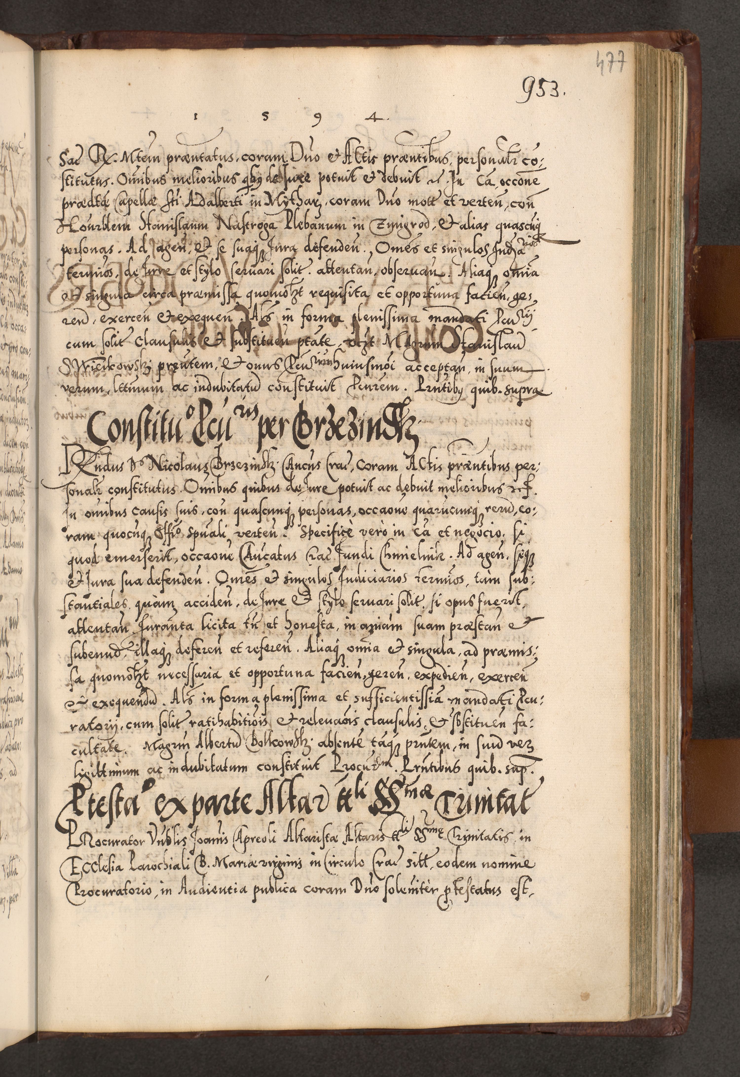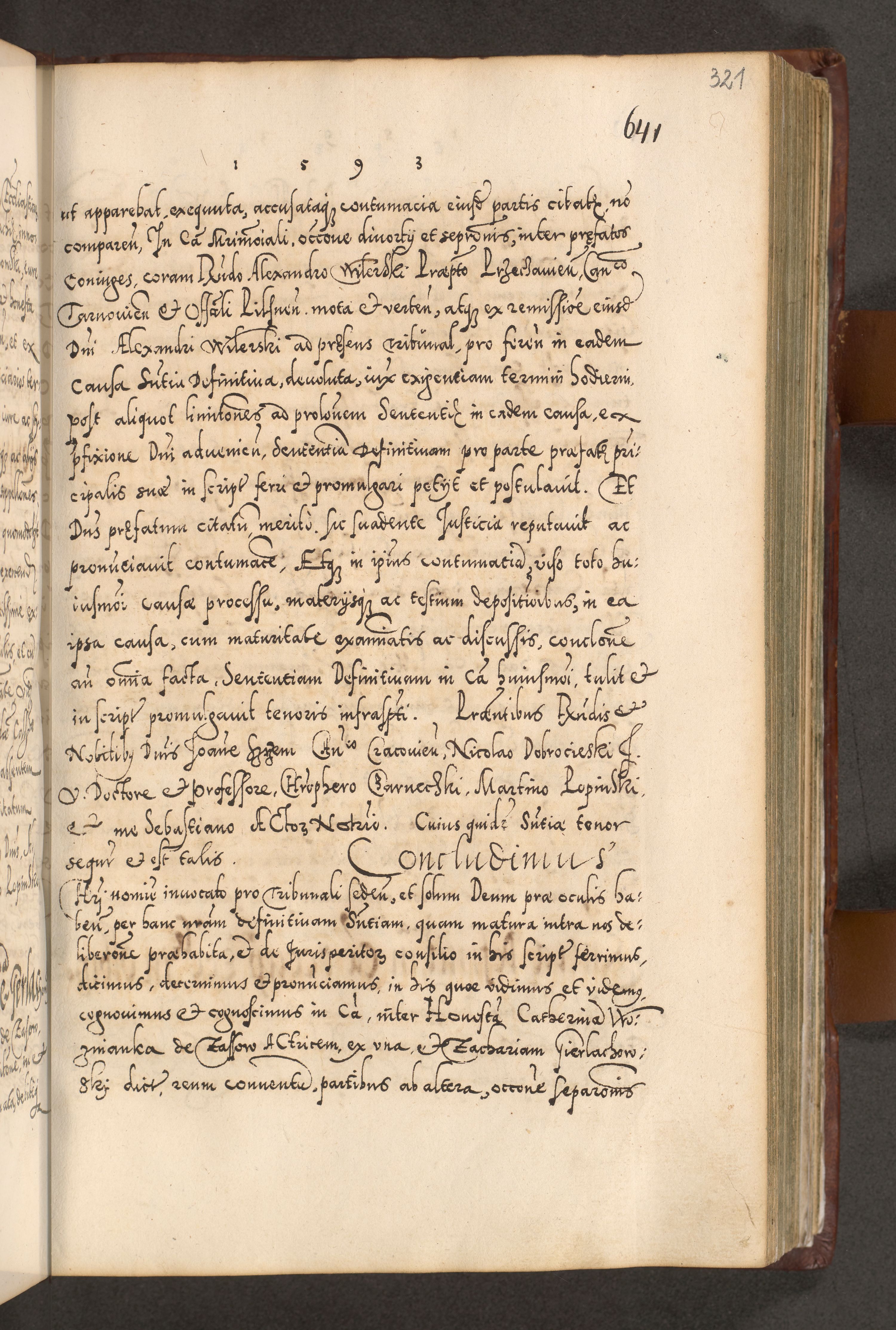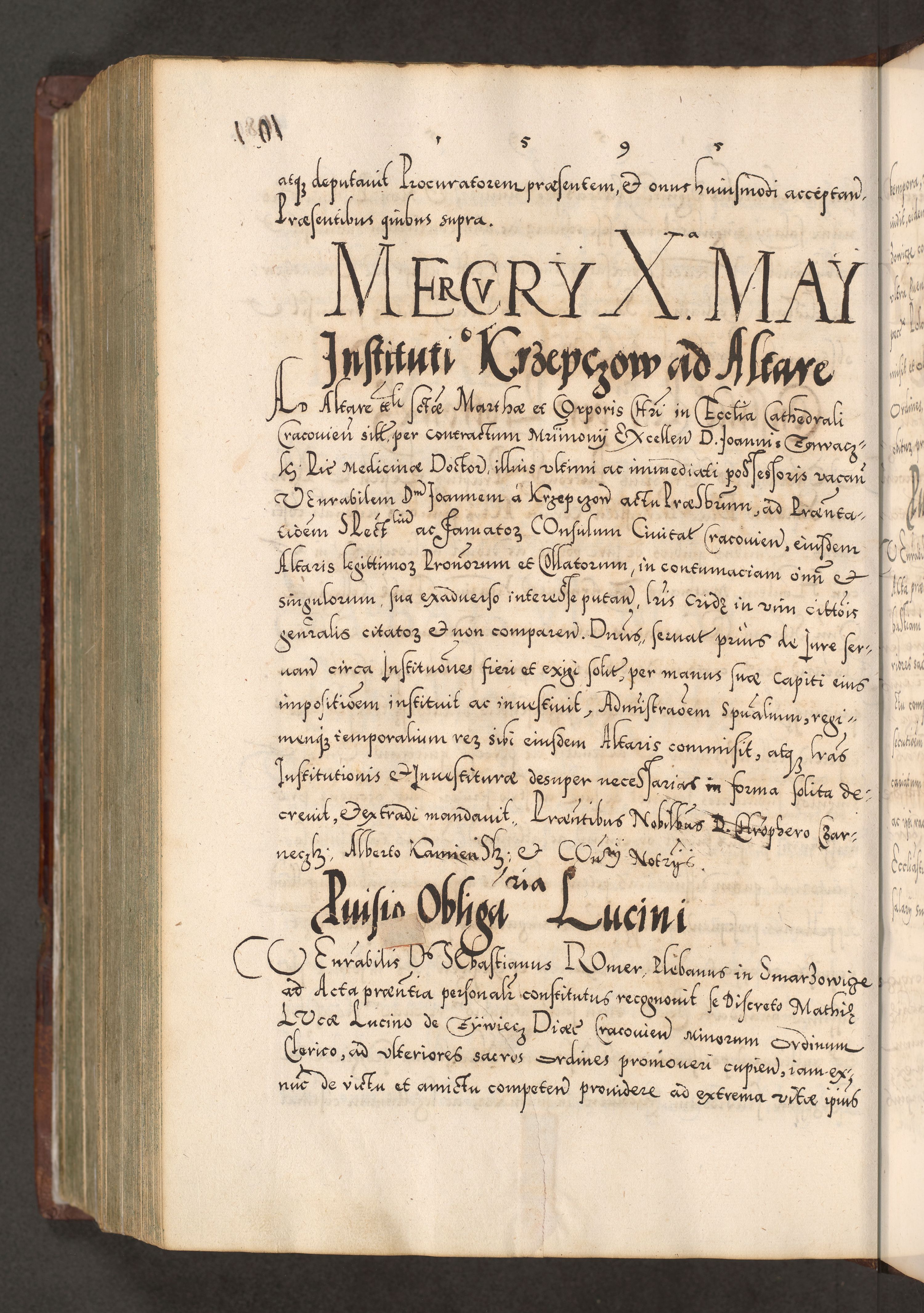 Illistrissimo et revedissimo in Christo Patre Domino Domino Georgio Rzadziwił Miserone Divina Sacrostae R. E. Tituli S. Sixti Presbitero Cardinali Duce in Olyka et Niesswiesz ad Gubernacula Ecclessiae Cracoviensis cuius administratorialem a Sancta Sede Apostolica obtinverat feliciter sedente. Acta actorum, causarum, sententiarum tam deffinitivarum quam interloquutoriarum decretorum, obligationum, quietationum, recognitionum, constitutionum procuratorum etc. coram Reverendo Domino Stanislao Crassinskz de Crasne Archidiacono Cracoviensis, Scholastico Gnesnesis, Custode Plocensis etc. Vicario et Officiali Generali Cracoviensi in Ano Domini Millesimo Quingentesimo Nonagesimo Primo cuius indictio quarta pontificatus SS. Domini Nostri Gregorii XIIII Anno I psius prio feliciter incipiut