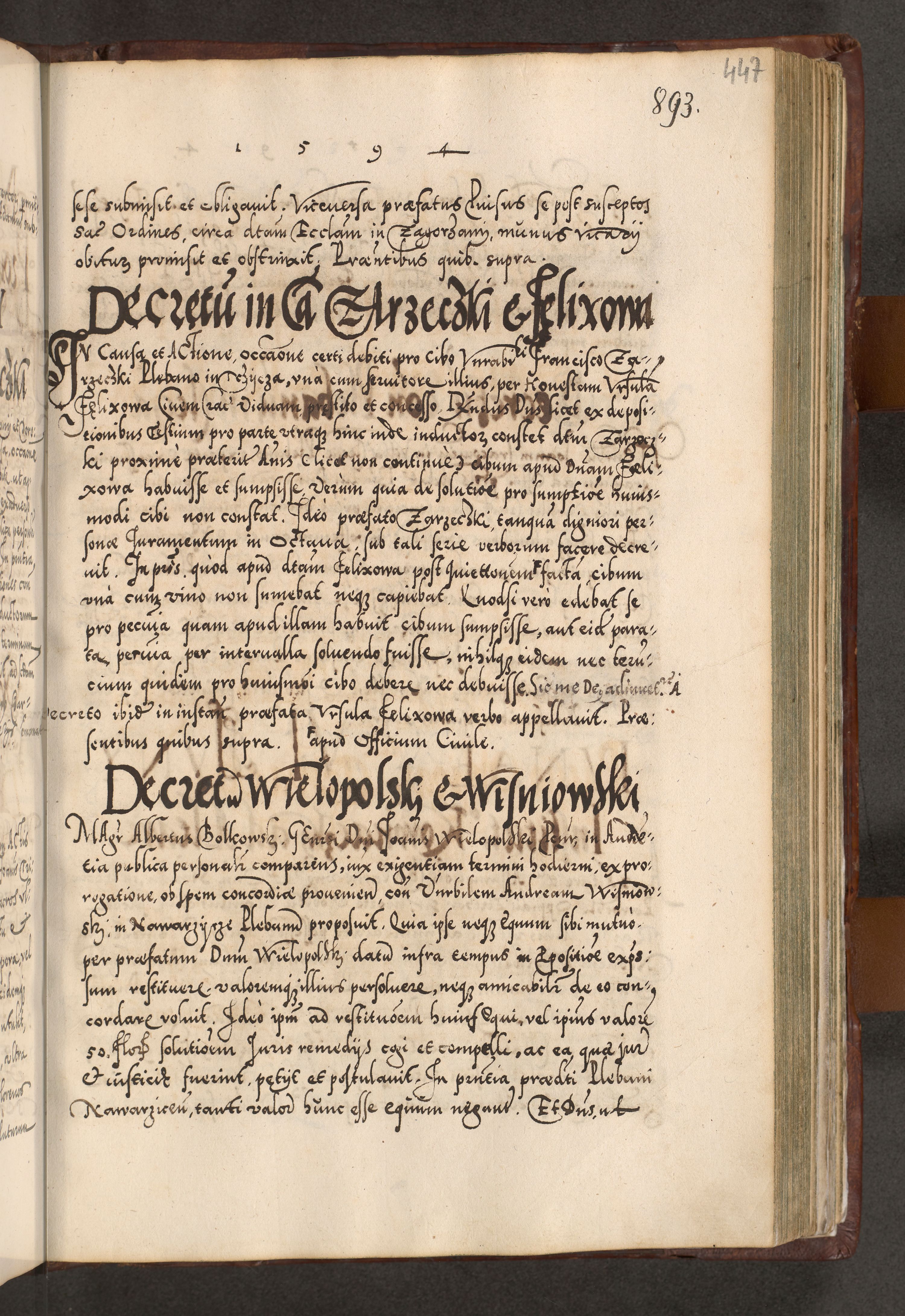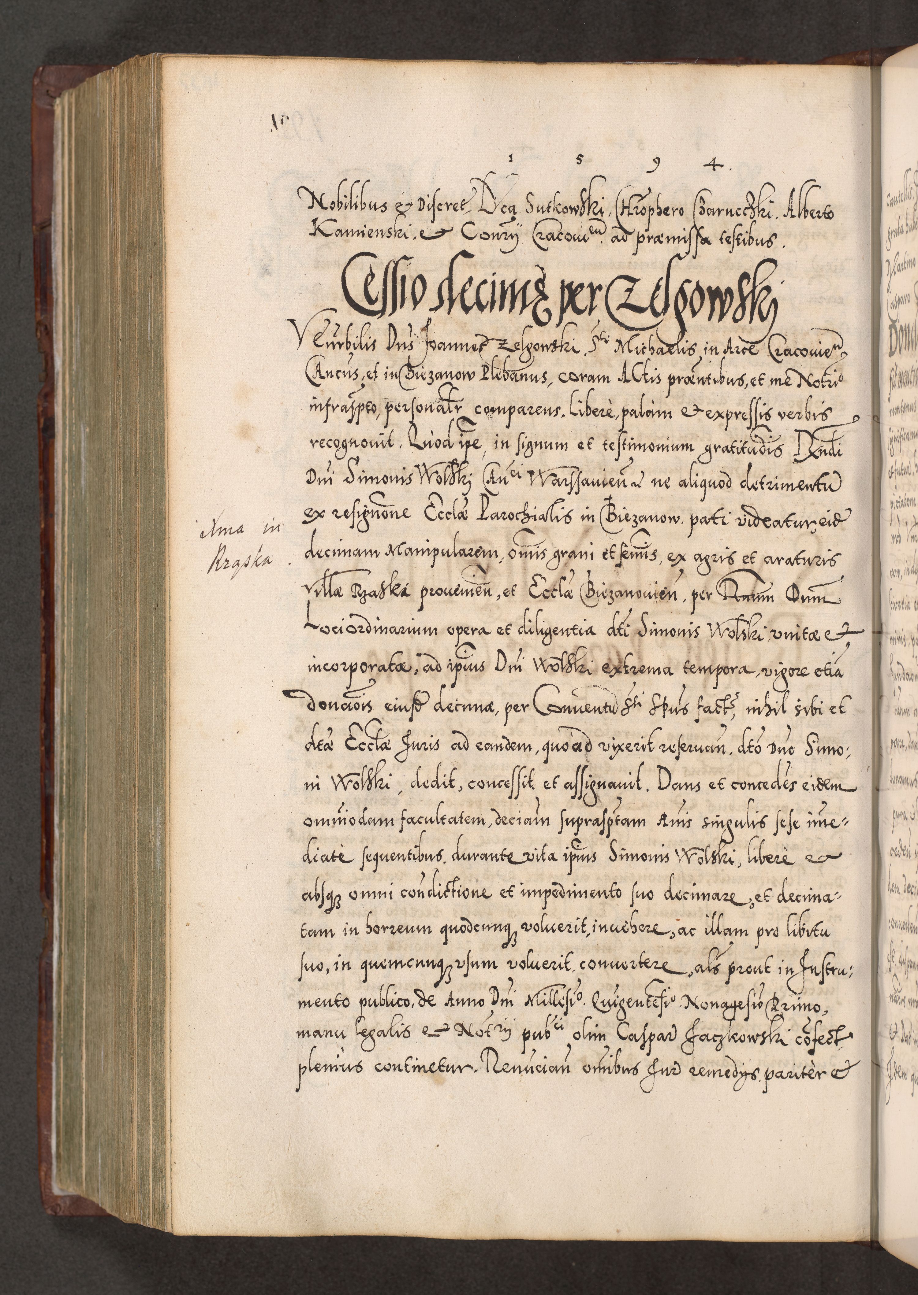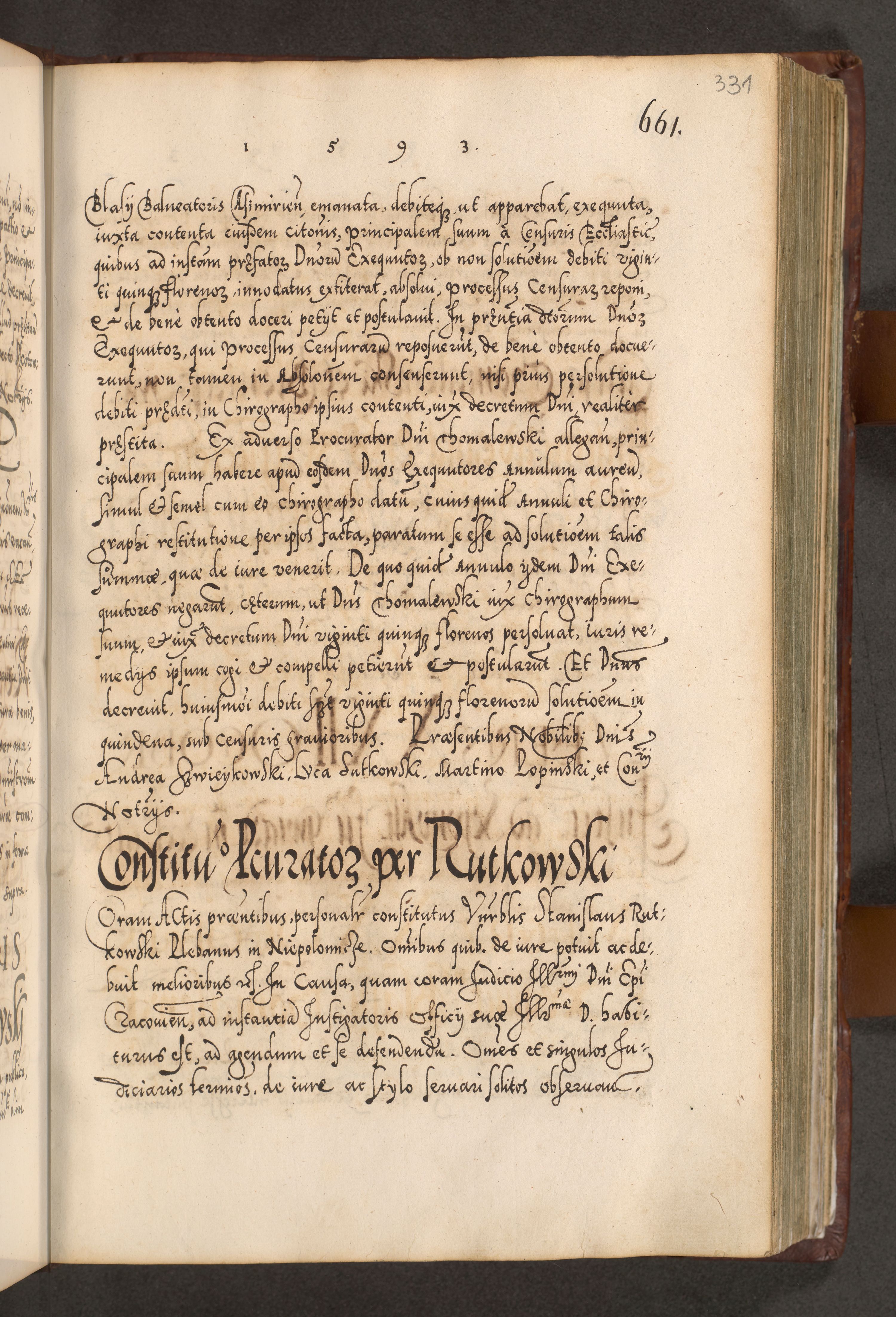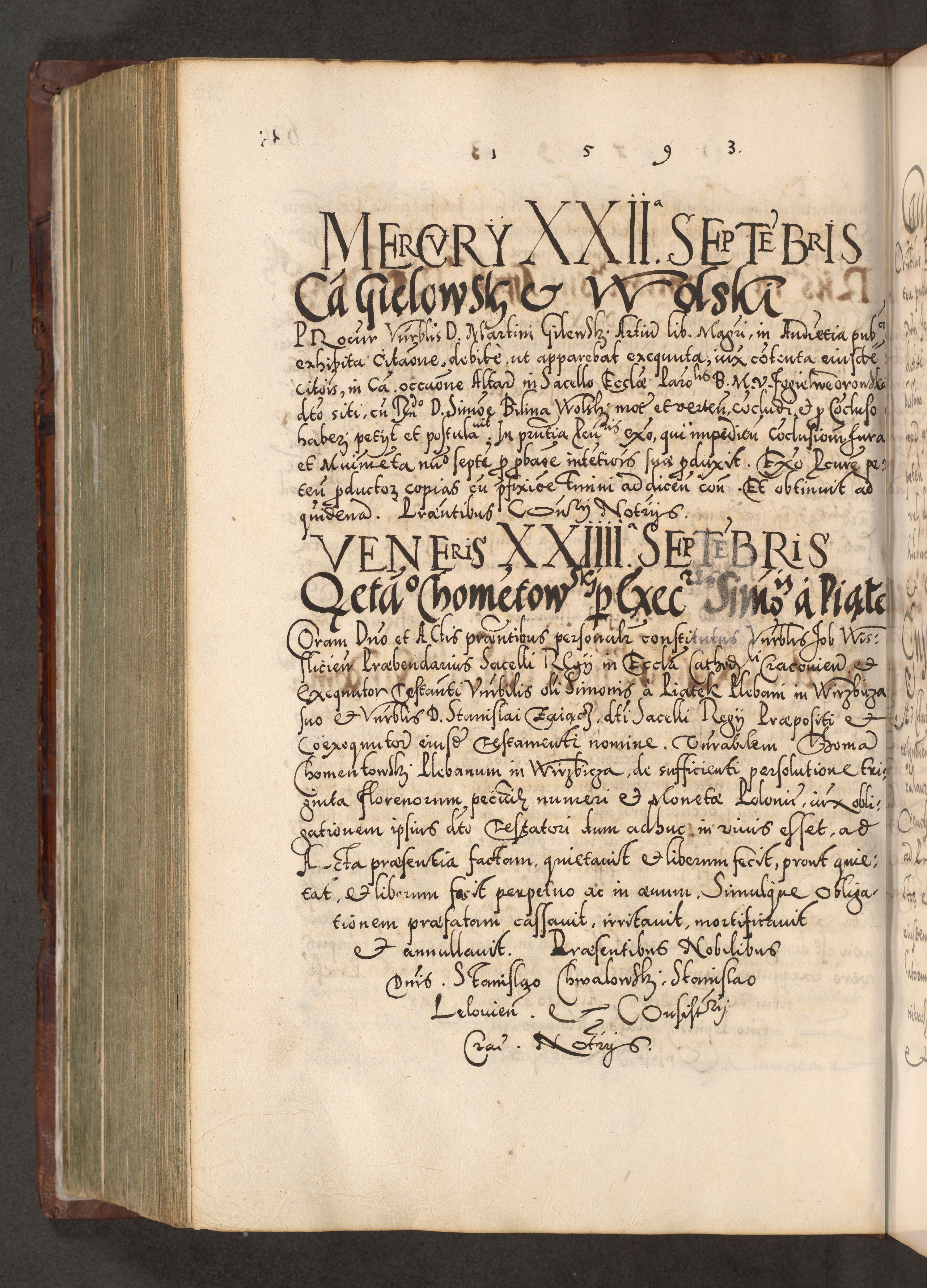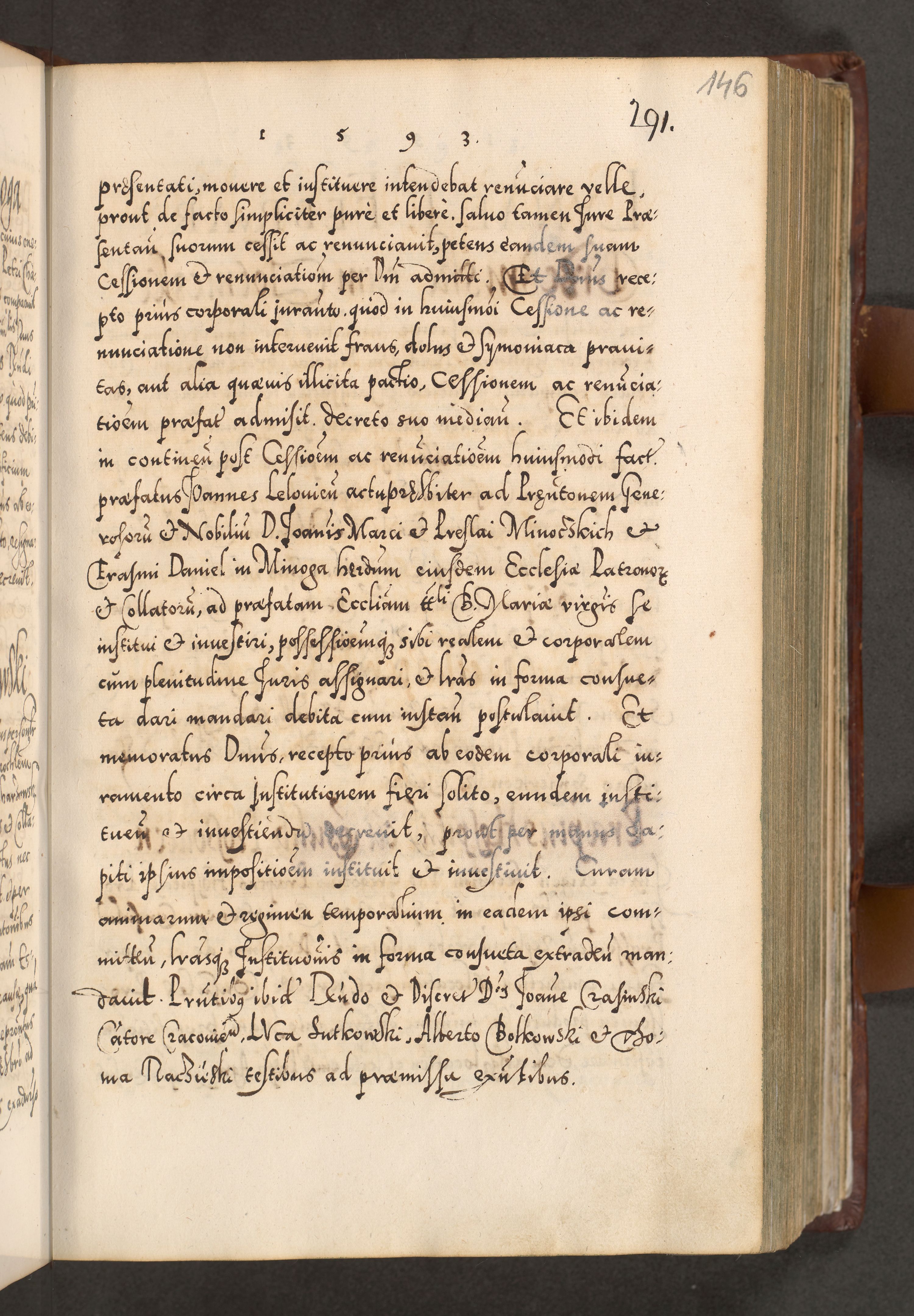 Illistrissimo et revedissimo in Christo Patre Domino Domino Georgio Rzadziwił Miserone Divina Sacrostae R. E. Tituli S. Sixti Presbitero Cardinali Duce in Olyka et Niesswiesz ad Gubernacula Ecclessiae Cracoviensis cuius administratorialem a Sancta Sede Apostolica obtinverat feliciter sedente. Acta actorum, causarum, sententiarum tam deffinitivarum quam interloquutoriarum decretorum, obligationum, quietationum, recognitionum, constitutionum procuratorum etc. coram Reverendo Domino Stanislao Crassinskz de Crasne Archidiacono Cracoviensis, Scholastico Gnesnesis, Custode Plocensis etc. Vicario et Officiali Generali Cracoviensi in Ano Domini Millesimo Quingentesimo Nonagesimo Primo cuius indictio quarta pontificatus SS. Domini Nostri Gregorii XIIII Anno I psius prio feliciter incipiut