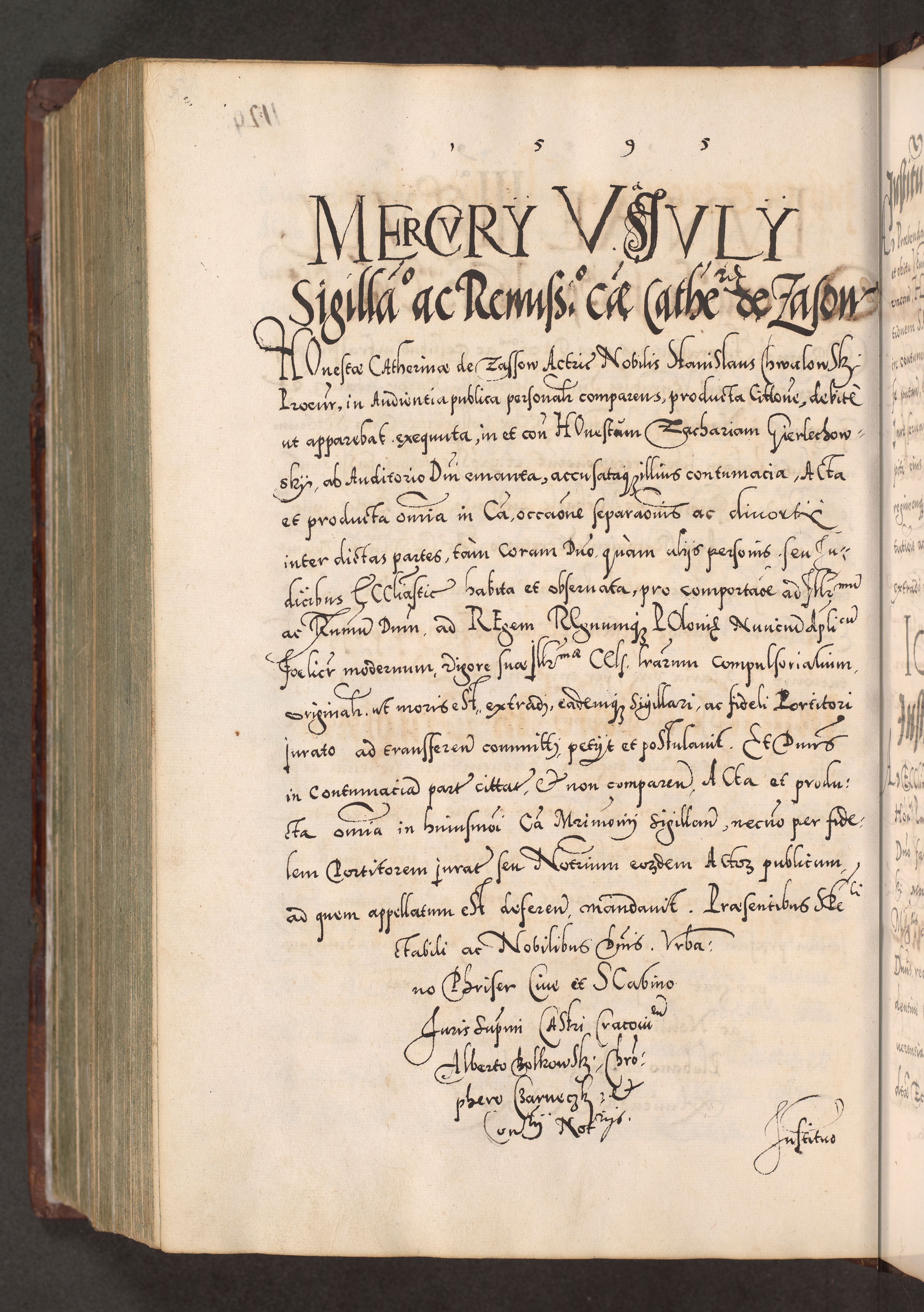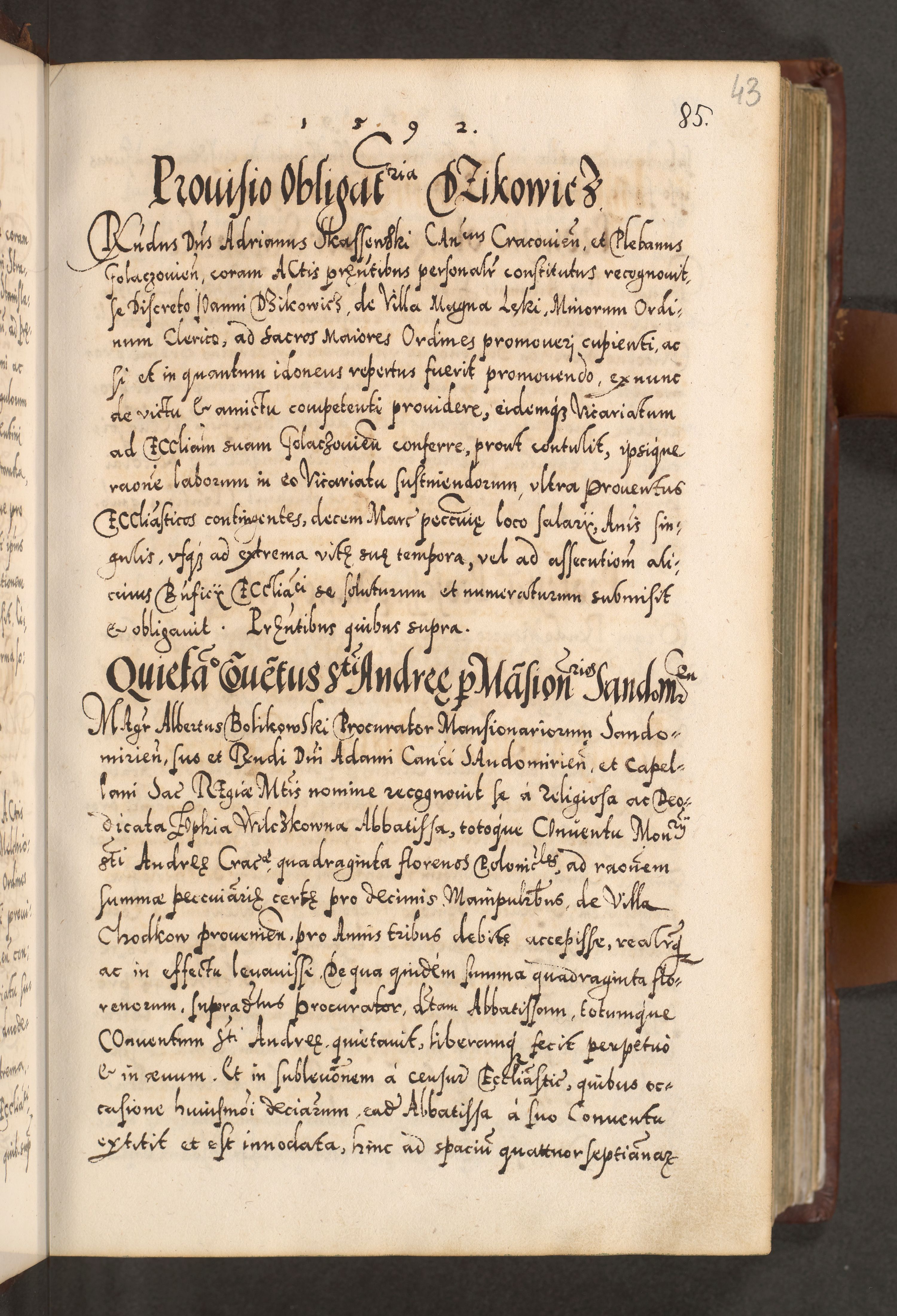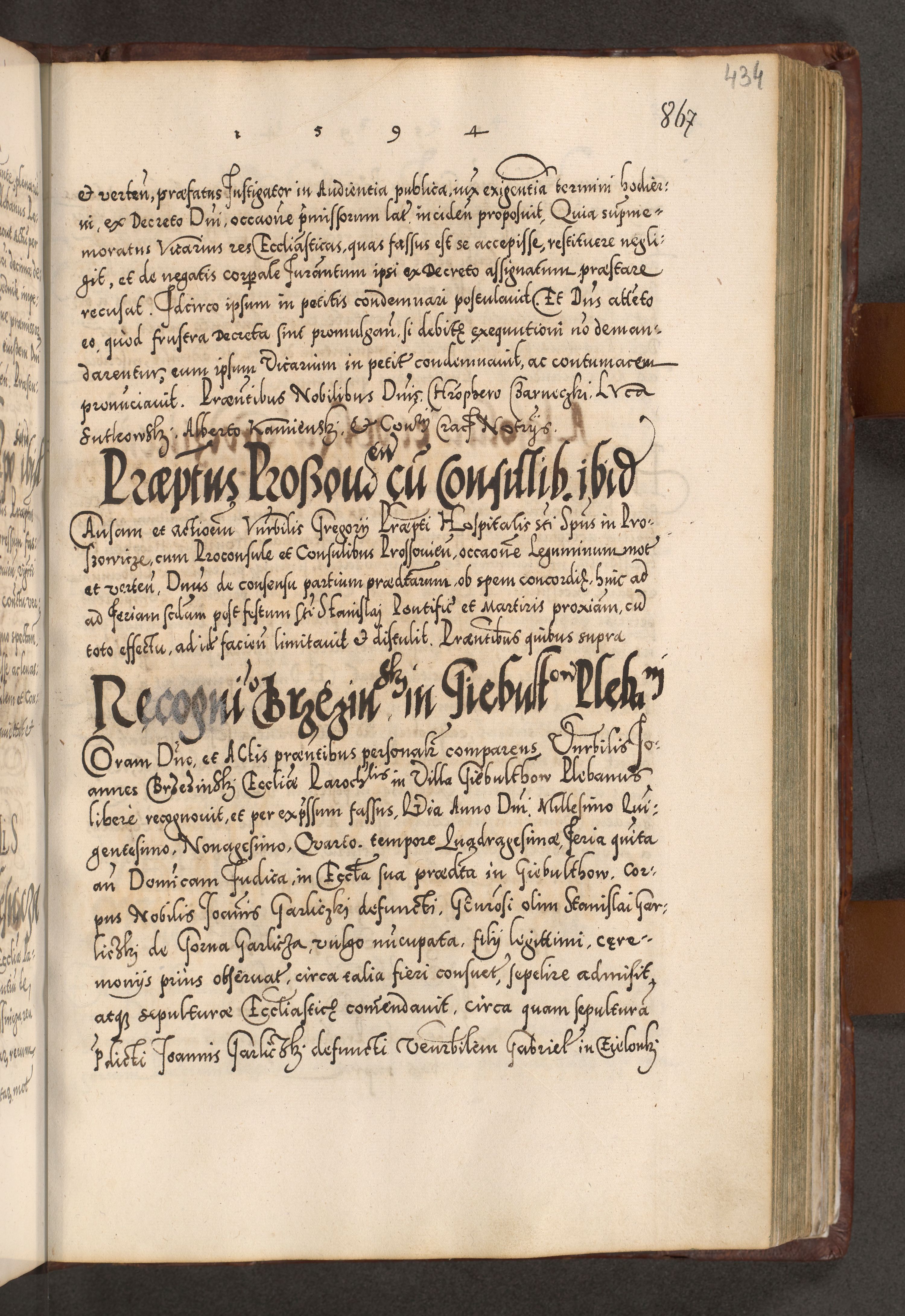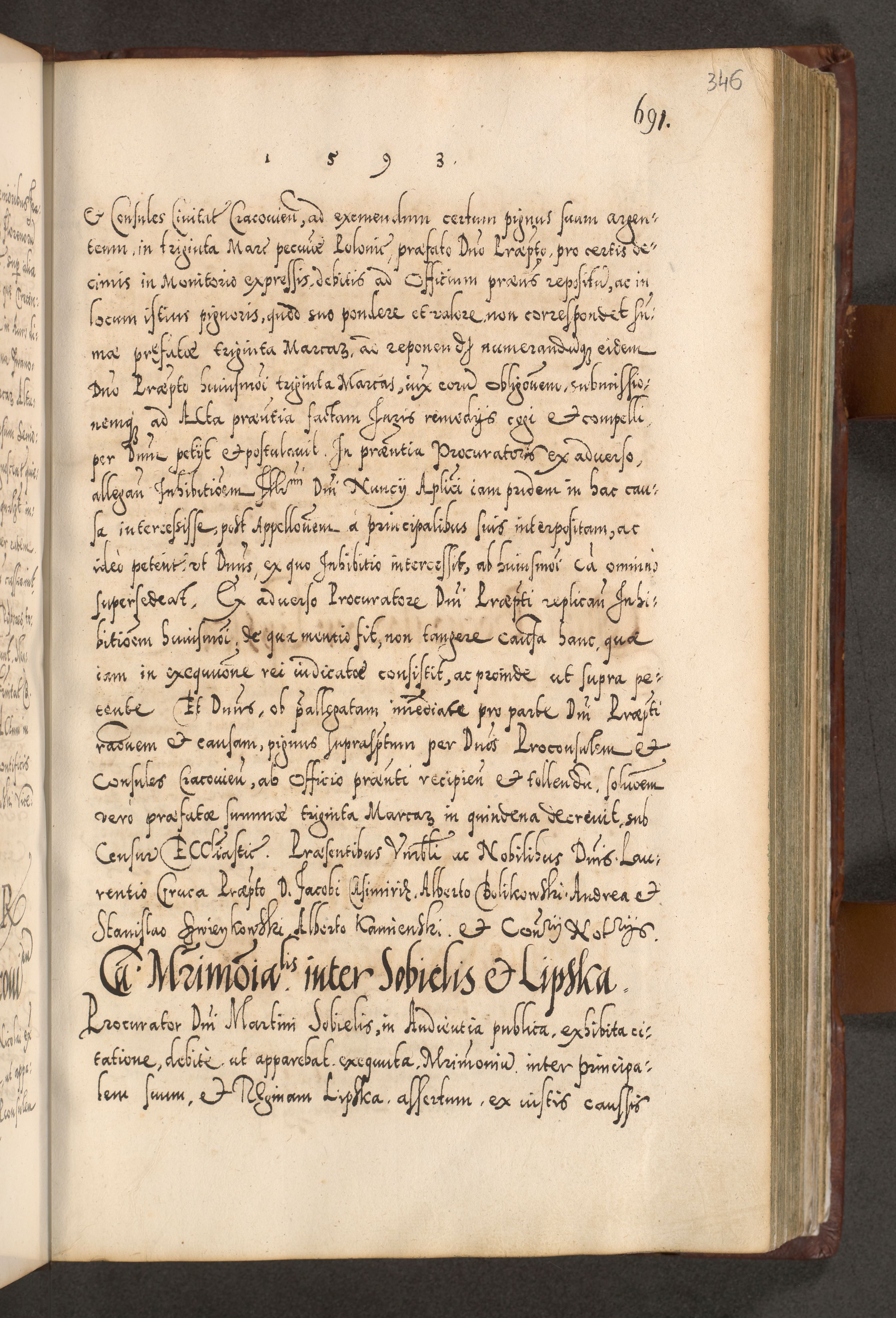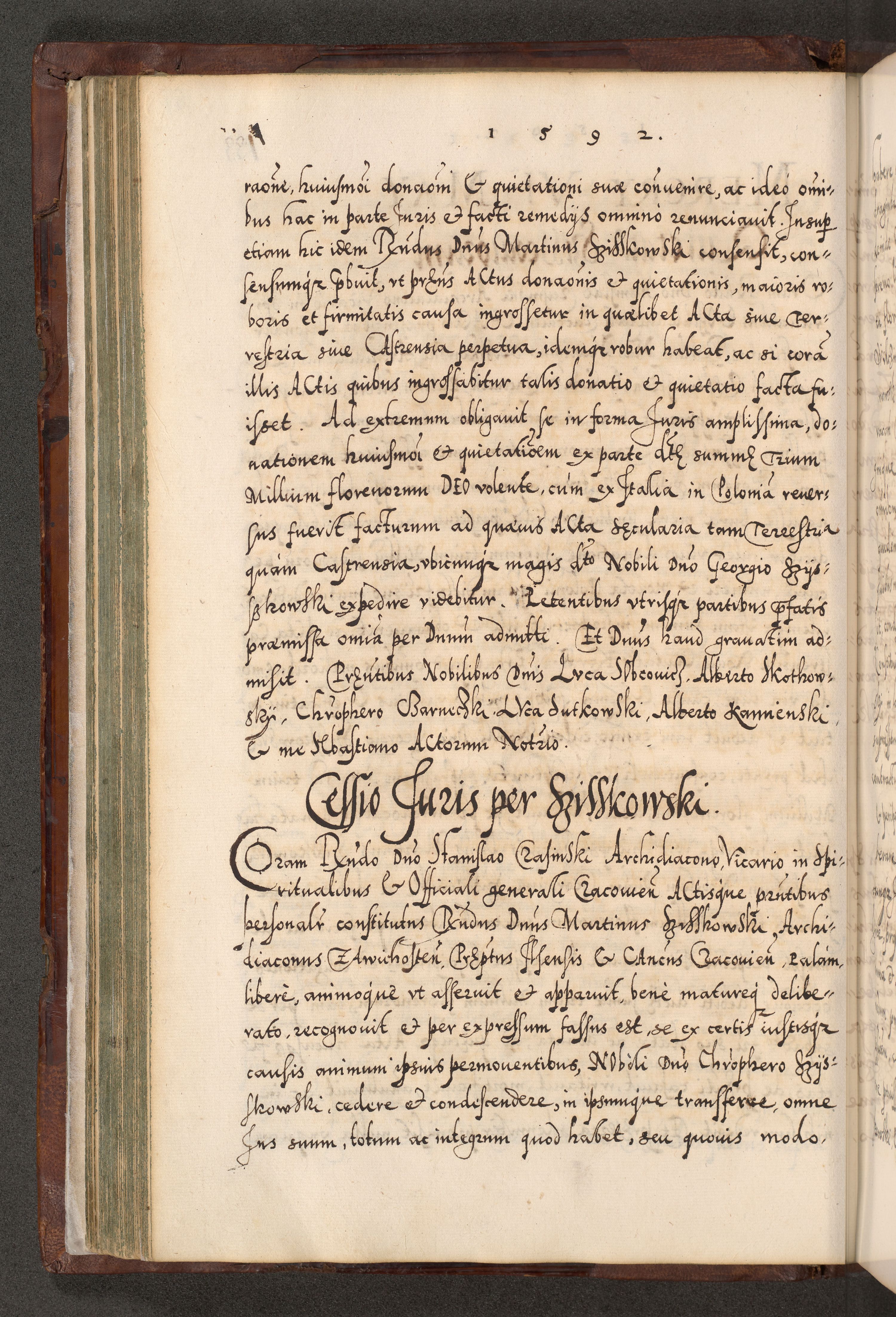 Illistrissimo et revedissimo in Christo Patre Domino Domino Georgio Rzadziwił Miserone Divina Sacrostae R. E. Tituli S. Sixti Presbitero Cardinali Duce in Olyka et Niesswiesz ad Gubernacula Ecclessiae Cracoviensis cuius administratorialem a Sancta Sede Apostolica obtinverat feliciter sedente. Acta actorum, causarum, sententiarum tam deffinitivarum quam interloquutoriarum decretorum, obligationum, quietationum, recognitionum, constitutionum procuratorum etc. coram Reverendo Domino Stanislao Crassinskz de Crasne Archidiacono Cracoviensis, Scholastico Gnesnesis, Custode Plocensis etc. Vicario et Officiali Generali Cracoviensi in Ano Domini Millesimo Quingentesimo Nonagesimo Primo cuius indictio quarta pontificatus SS. Domini Nostri Gregorii XIIII Anno I psius prio feliciter incipiut