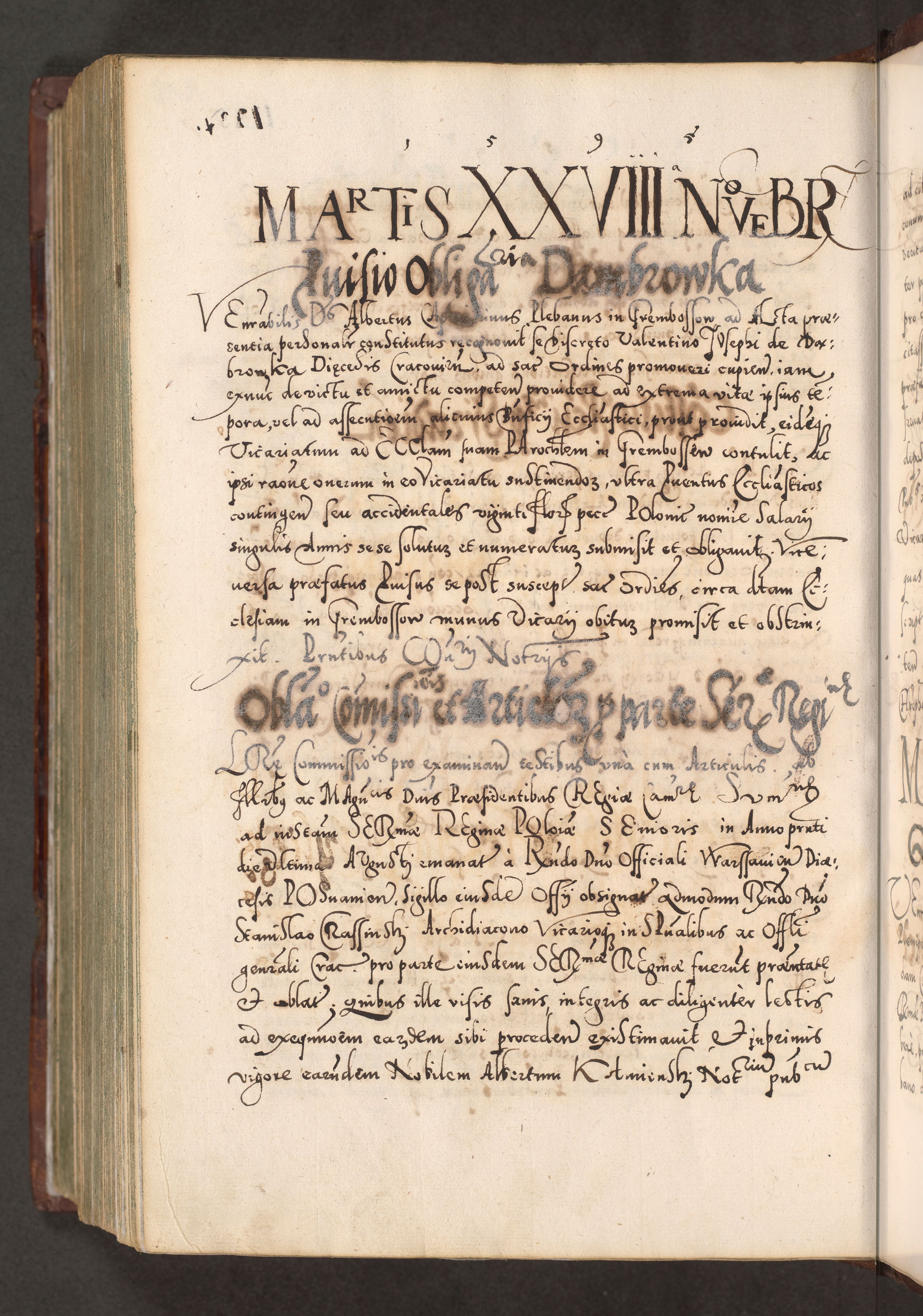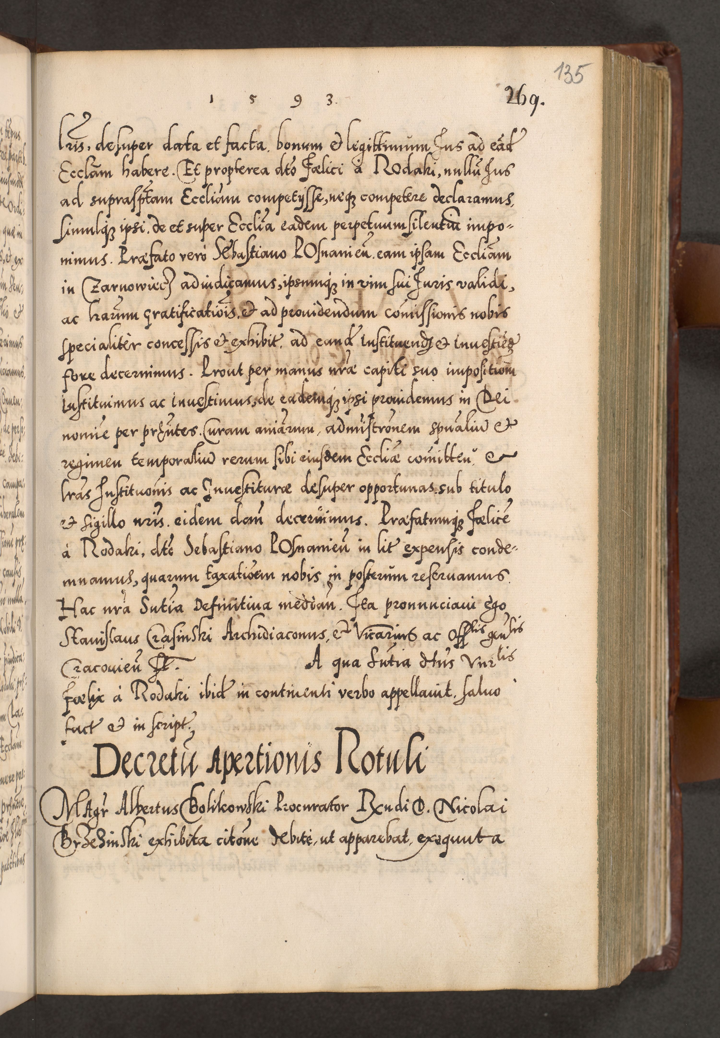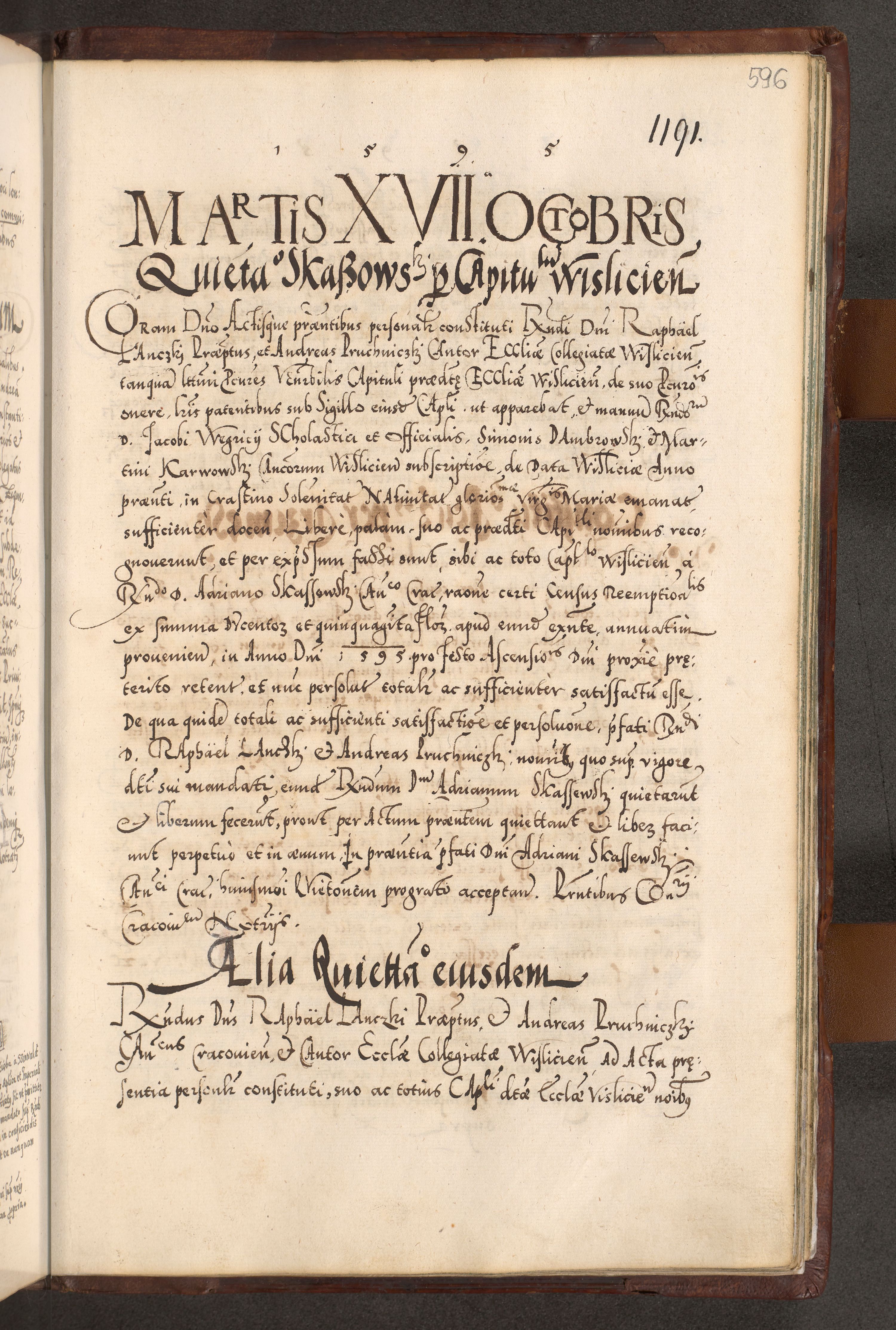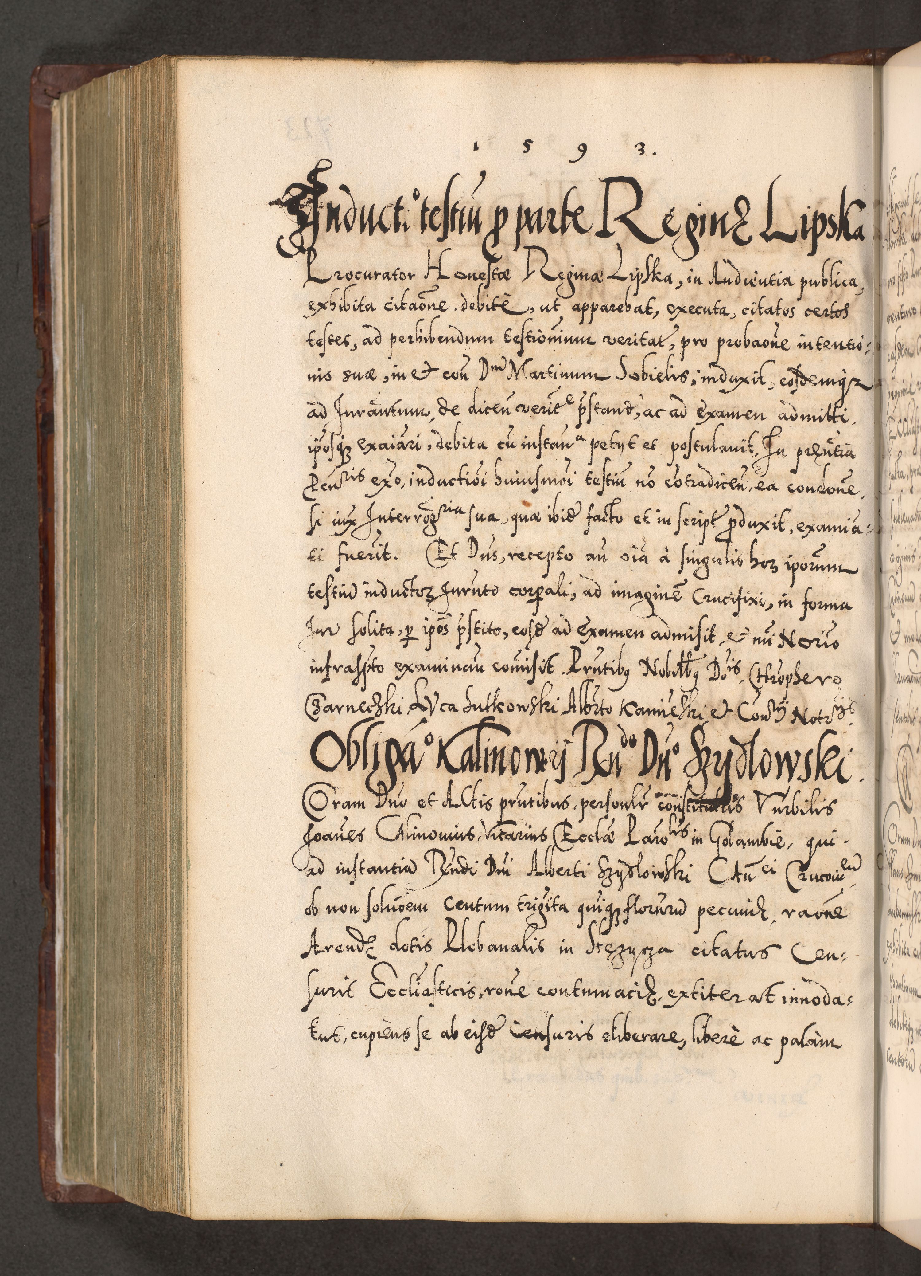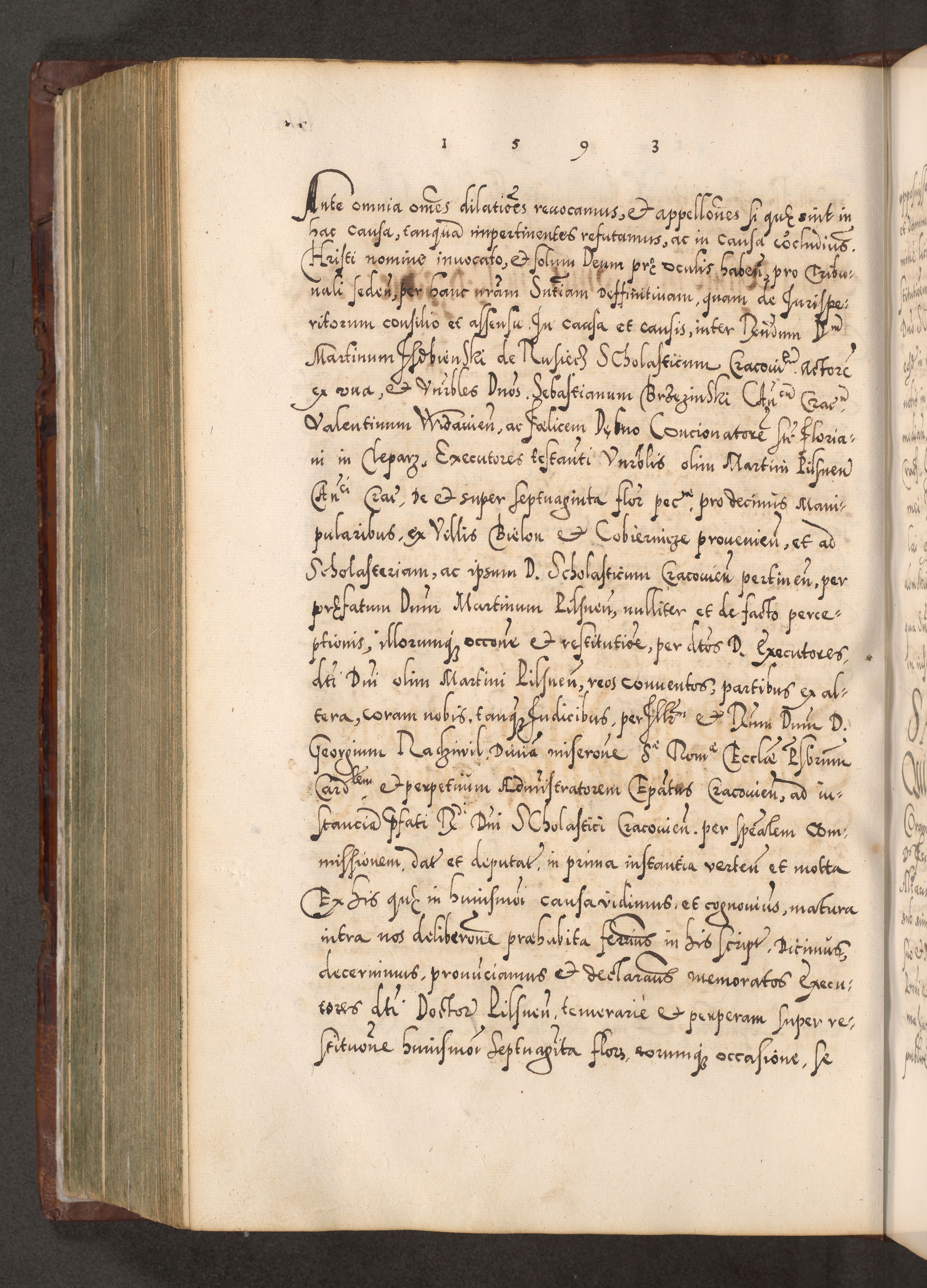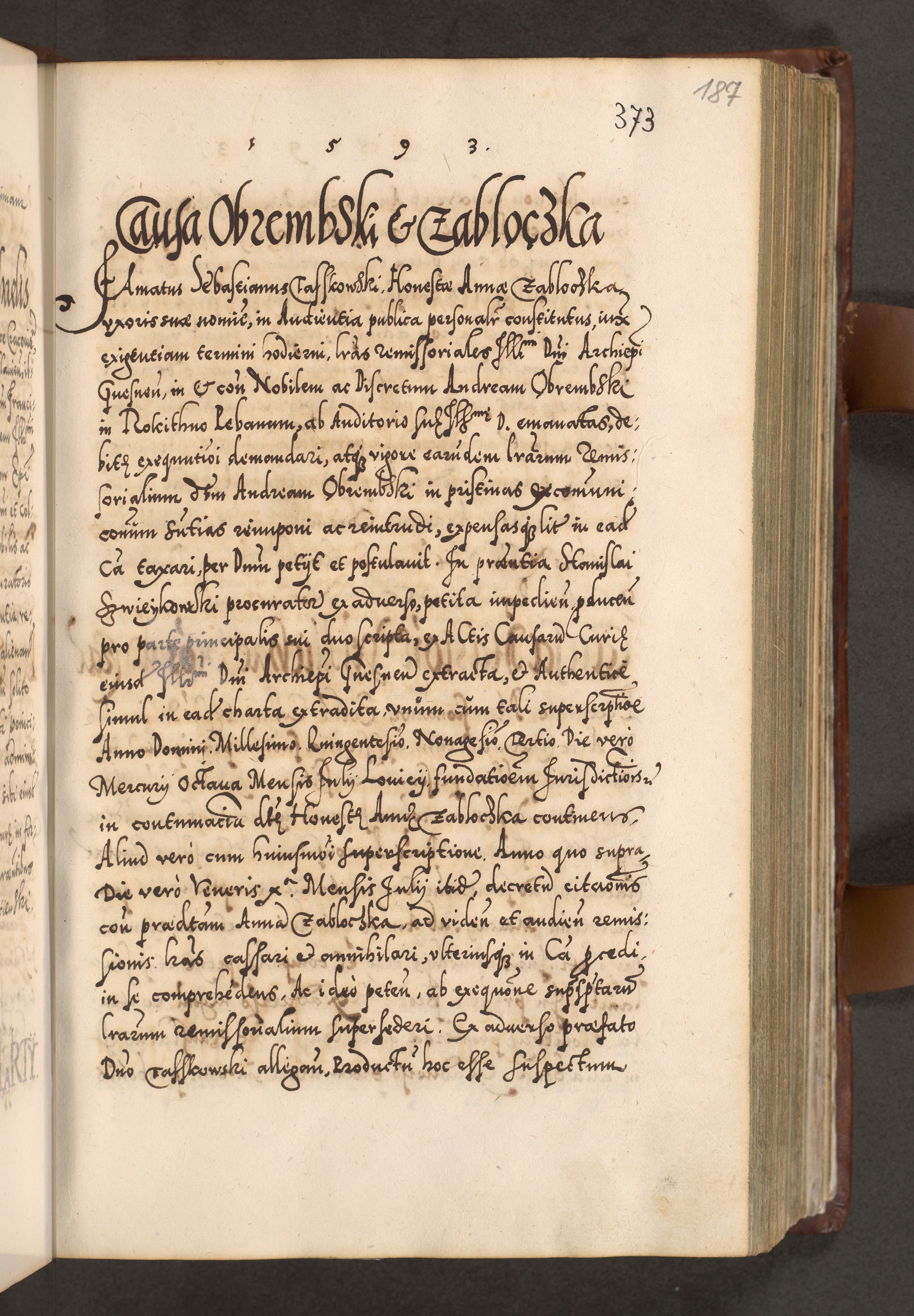 Illistrissimo et revedissimo in Christo Patre Domino Domino Georgio Rzadziwił Miserone Divina Sacrostae R. E. Tituli S. Sixti Presbitero Cardinali Duce in Olyka et Niesswiesz ad Gubernacula Ecclessiae Cracoviensis cuius administratorialem a Sancta Sede Apostolica obtinverat feliciter sedente. Acta actorum, causarum, sententiarum tam deffinitivarum quam interloquutoriarum decretorum, obligationum, quietationum, recognitionum, constitutionum procuratorum etc. coram Reverendo Domino Stanislao Crassinskz de Crasne Archidiacono Cracoviensis, Scholastico Gnesnesis, Custode Plocensis etc. Vicario et Officiali Generali Cracoviensi in Ano Domini Millesimo Quingentesimo Nonagesimo Primo cuius indictio quarta pontificatus SS. Domini Nostri Gregorii XIIII Anno I psius prio feliciter incipiut