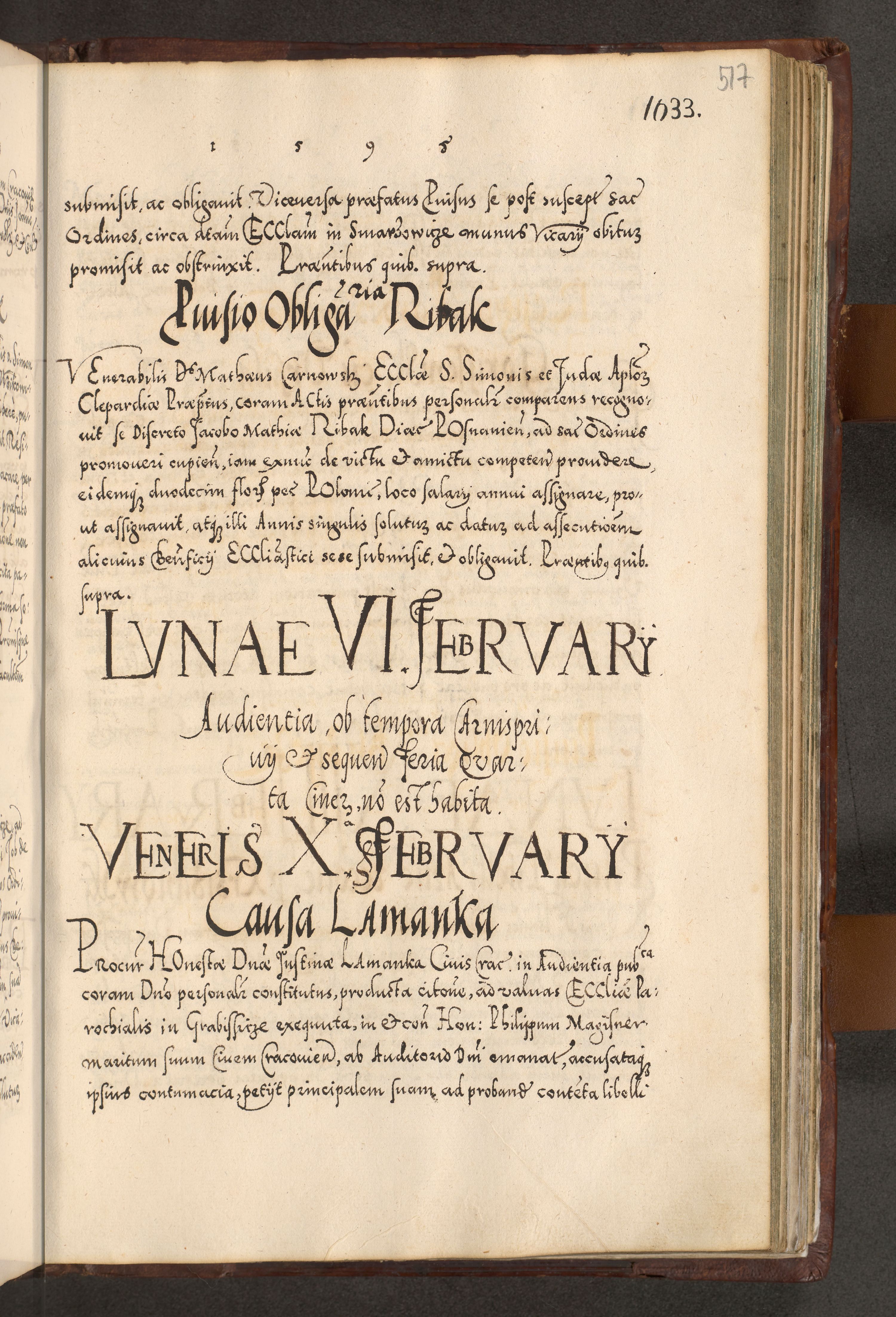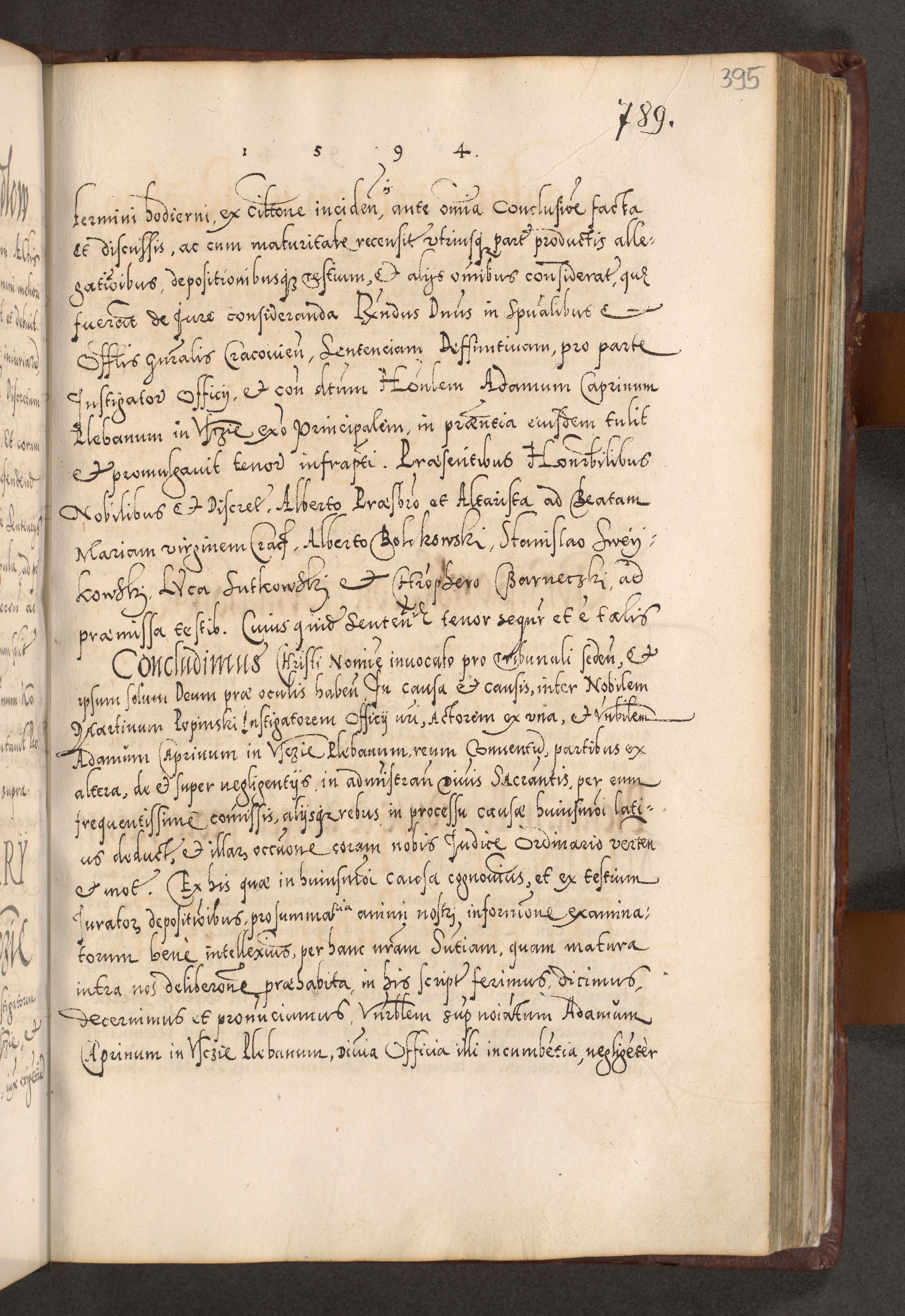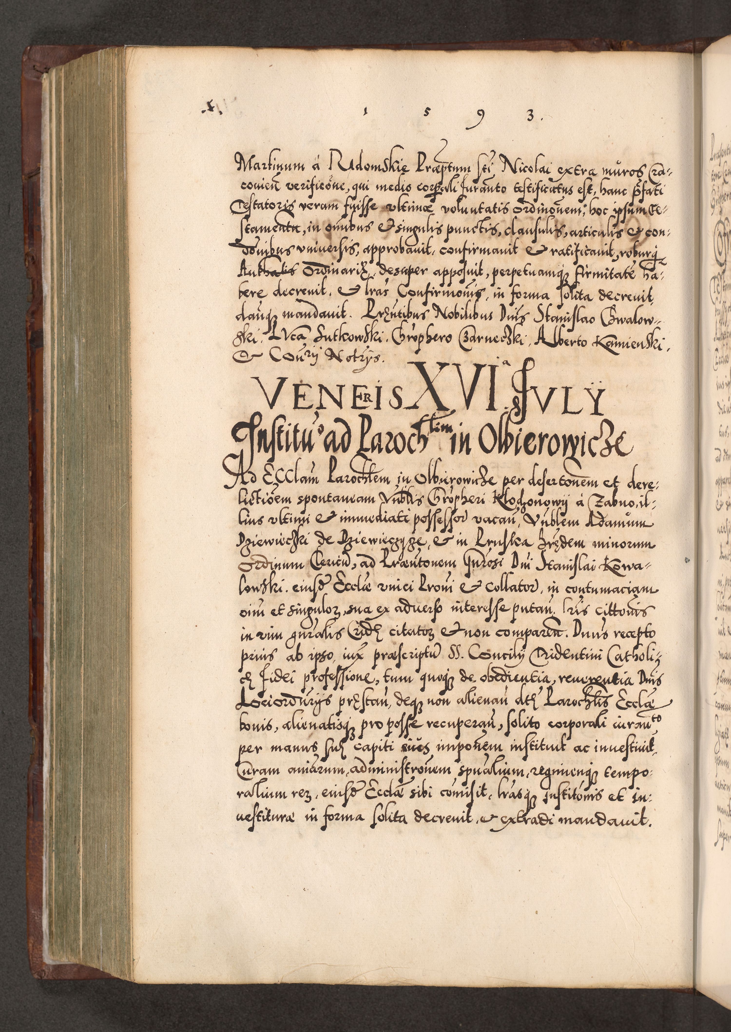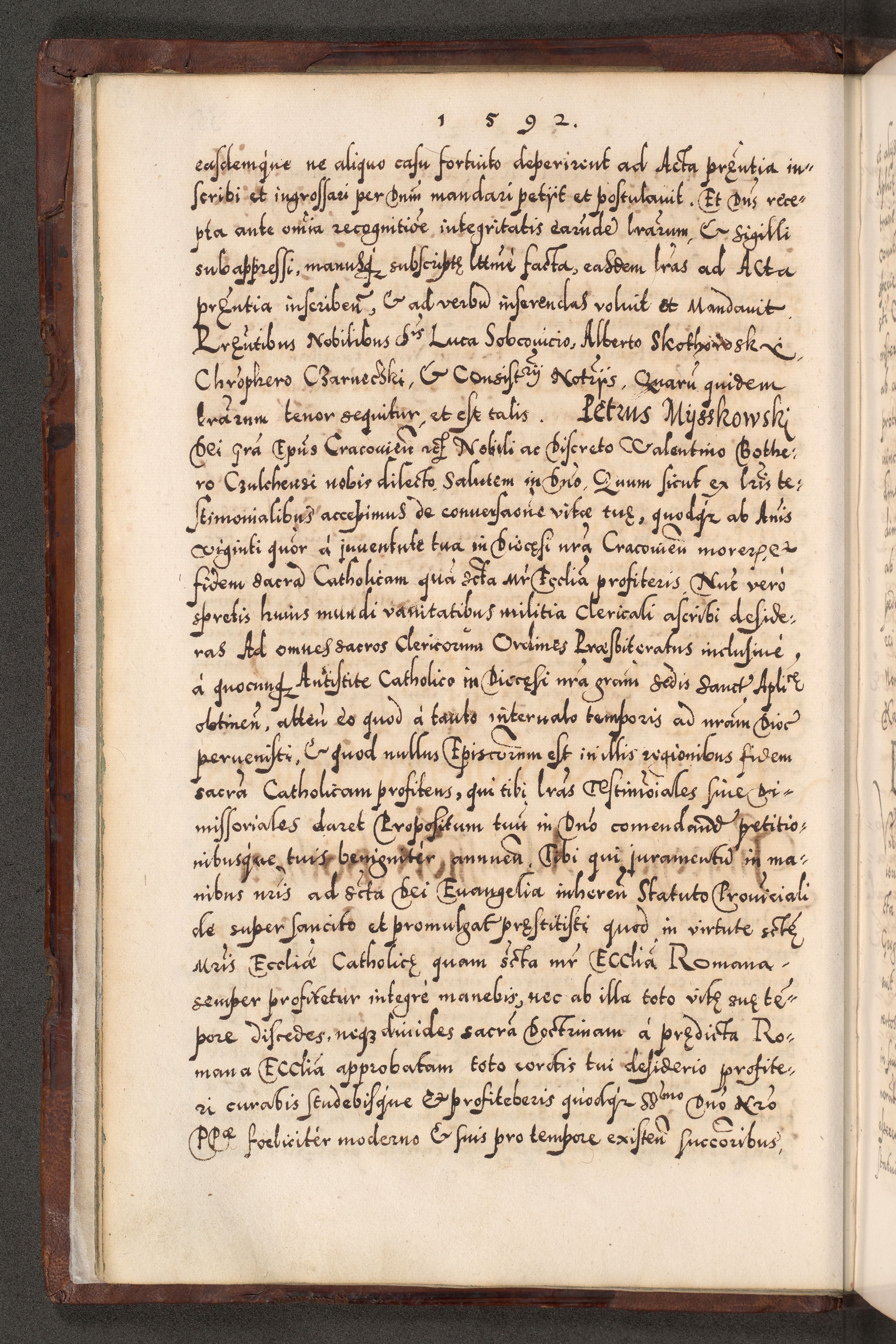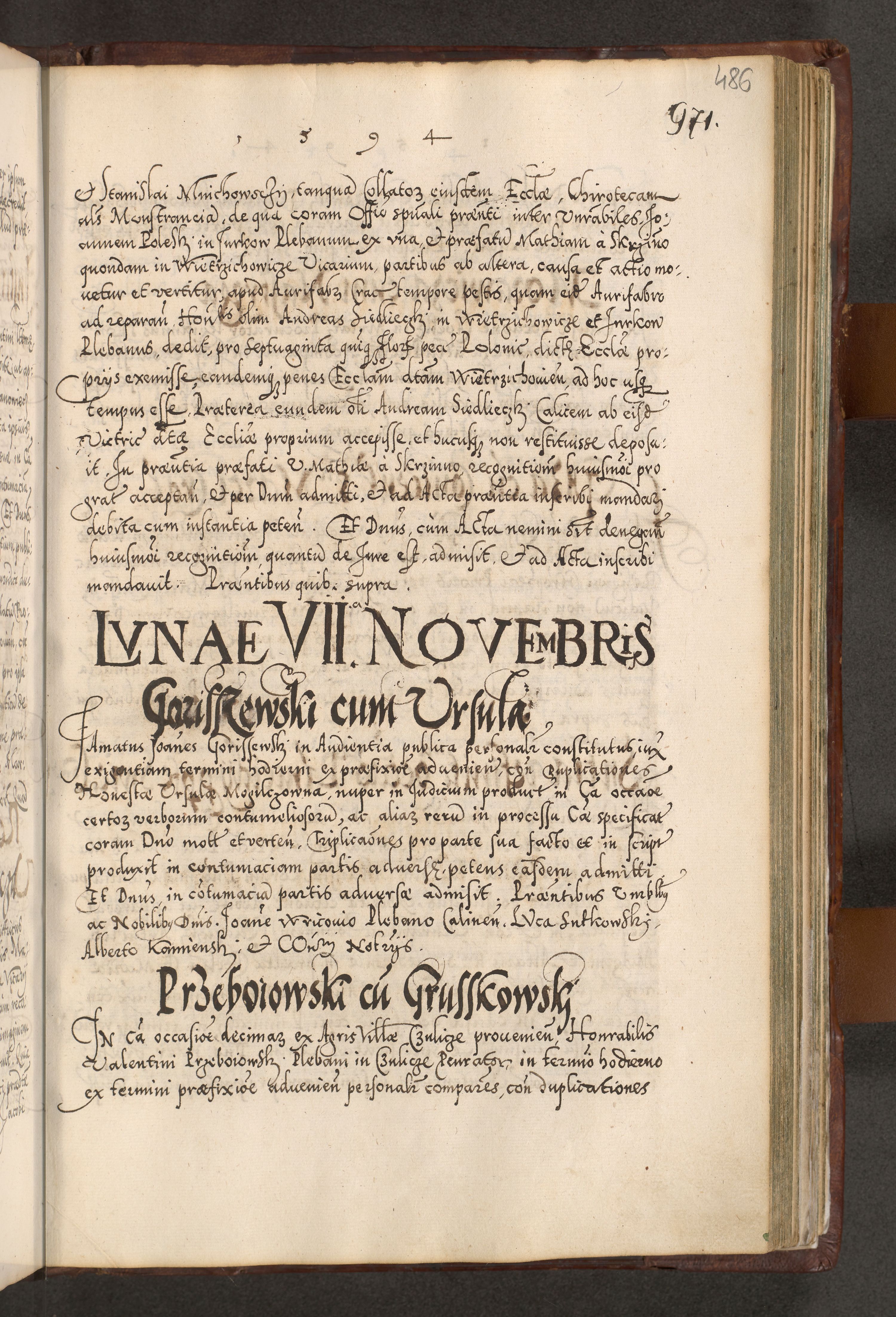 Illistrissimo et revedissimo in Christo Patre Domino Domino Georgio Rzadziwił Miserone Divina Sacrostae R. E. Tituli S. Sixti Presbitero Cardinali Duce in Olyka et Niesswiesz ad Gubernacula Ecclessiae Cracoviensis cuius administratorialem a Sancta Sede Apostolica obtinverat feliciter sedente. Acta actorum, causarum, sententiarum tam deffinitivarum quam interloquutoriarum decretorum, obligationum, quietationum, recognitionum, constitutionum procuratorum etc. coram Reverendo Domino Stanislao Crassinskz de Crasne Archidiacono Cracoviensis, Scholastico Gnesnesis, Custode Plocensis etc. Vicario et Officiali Generali Cracoviensi in Ano Domini Millesimo Quingentesimo Nonagesimo Primo cuius indictio quarta pontificatus SS. Domini Nostri Gregorii XIIII Anno I psius prio feliciter incipiut