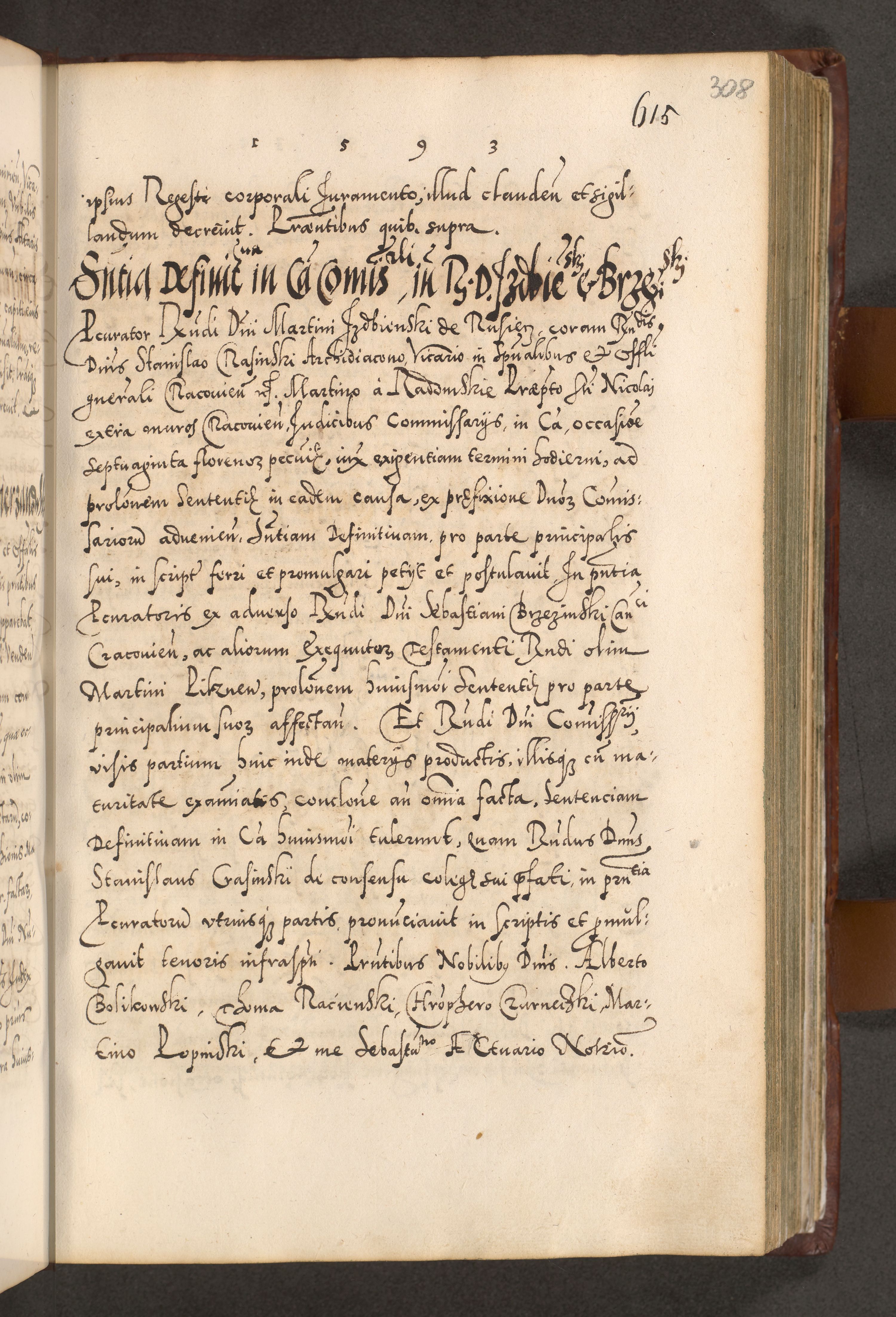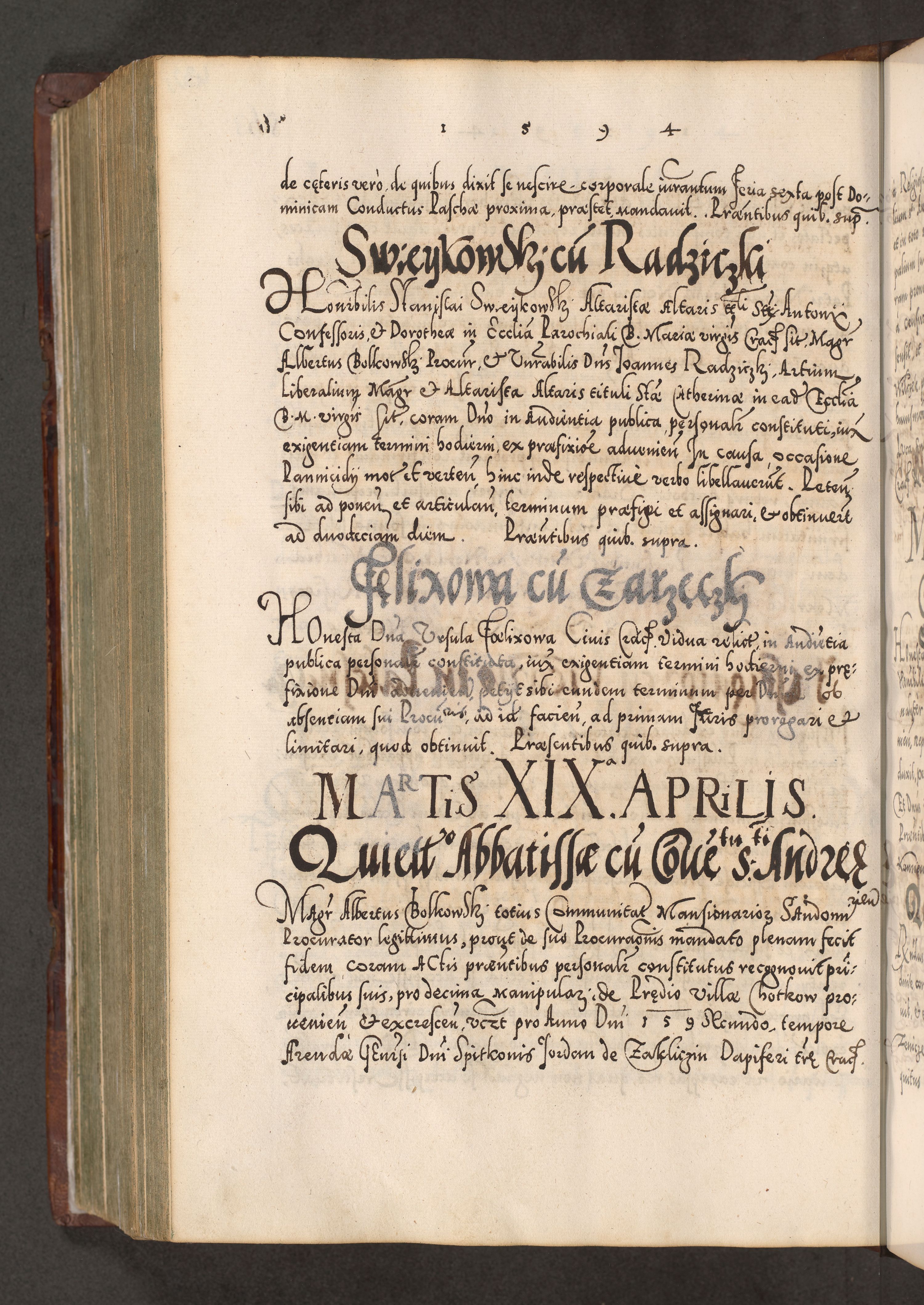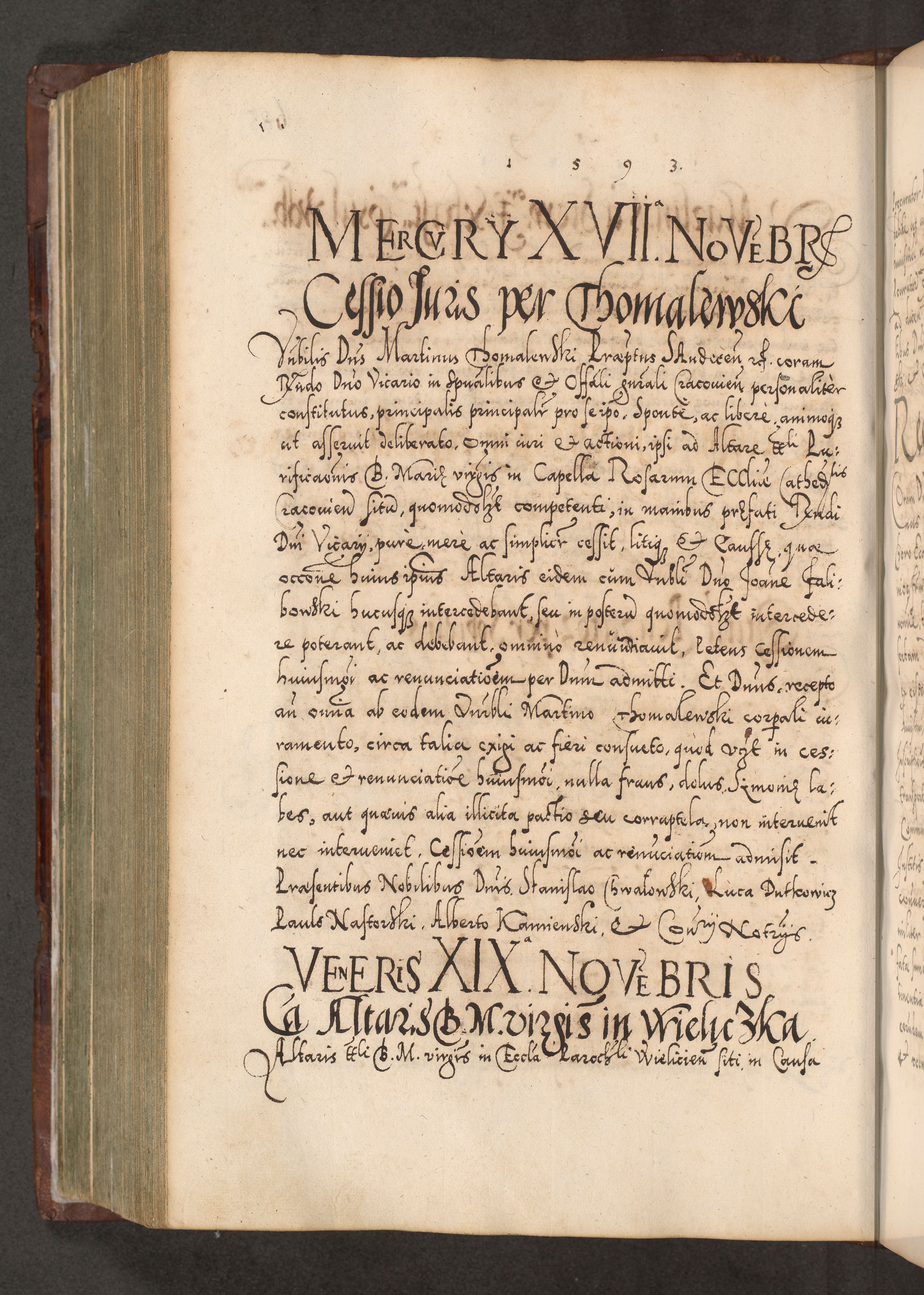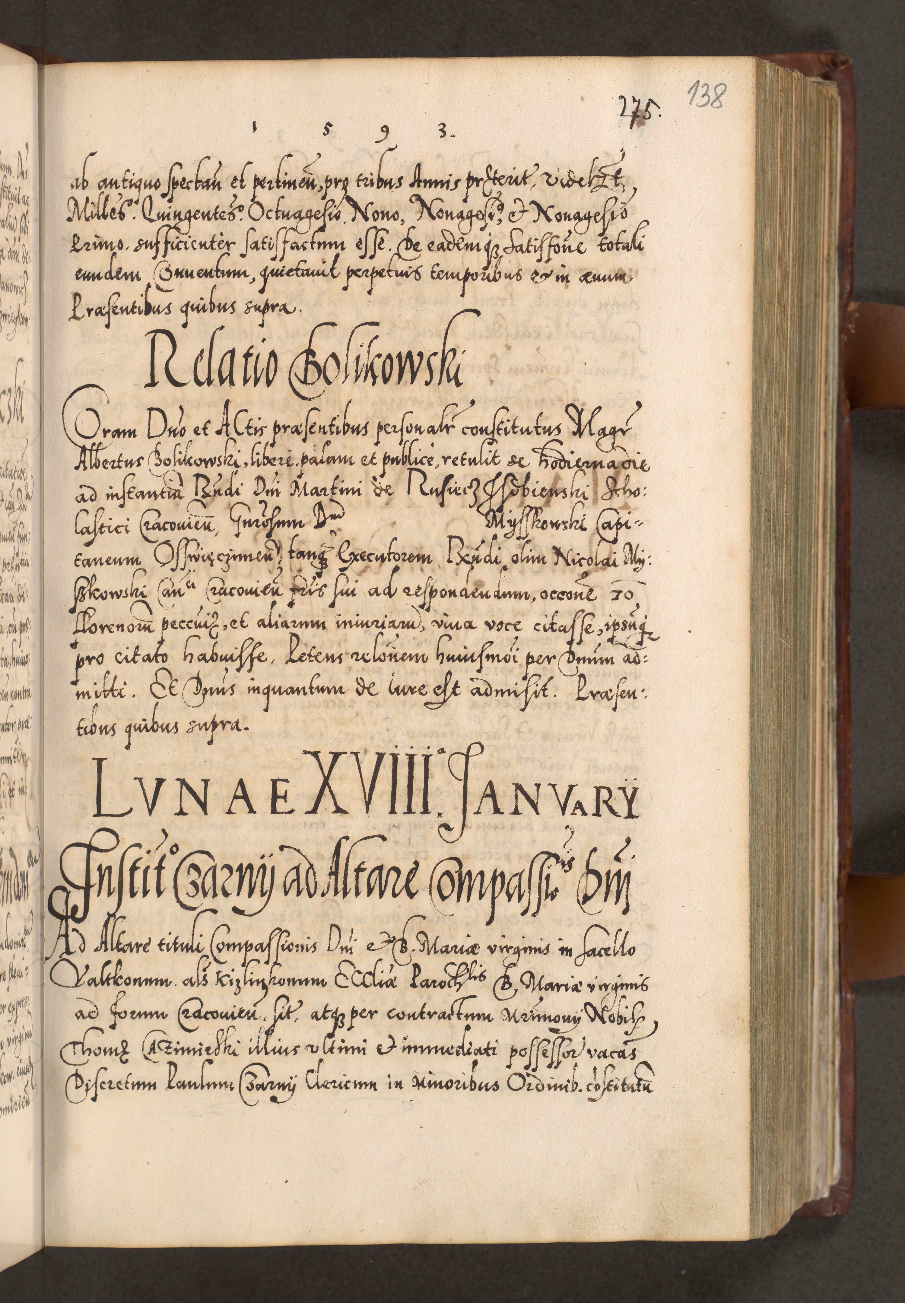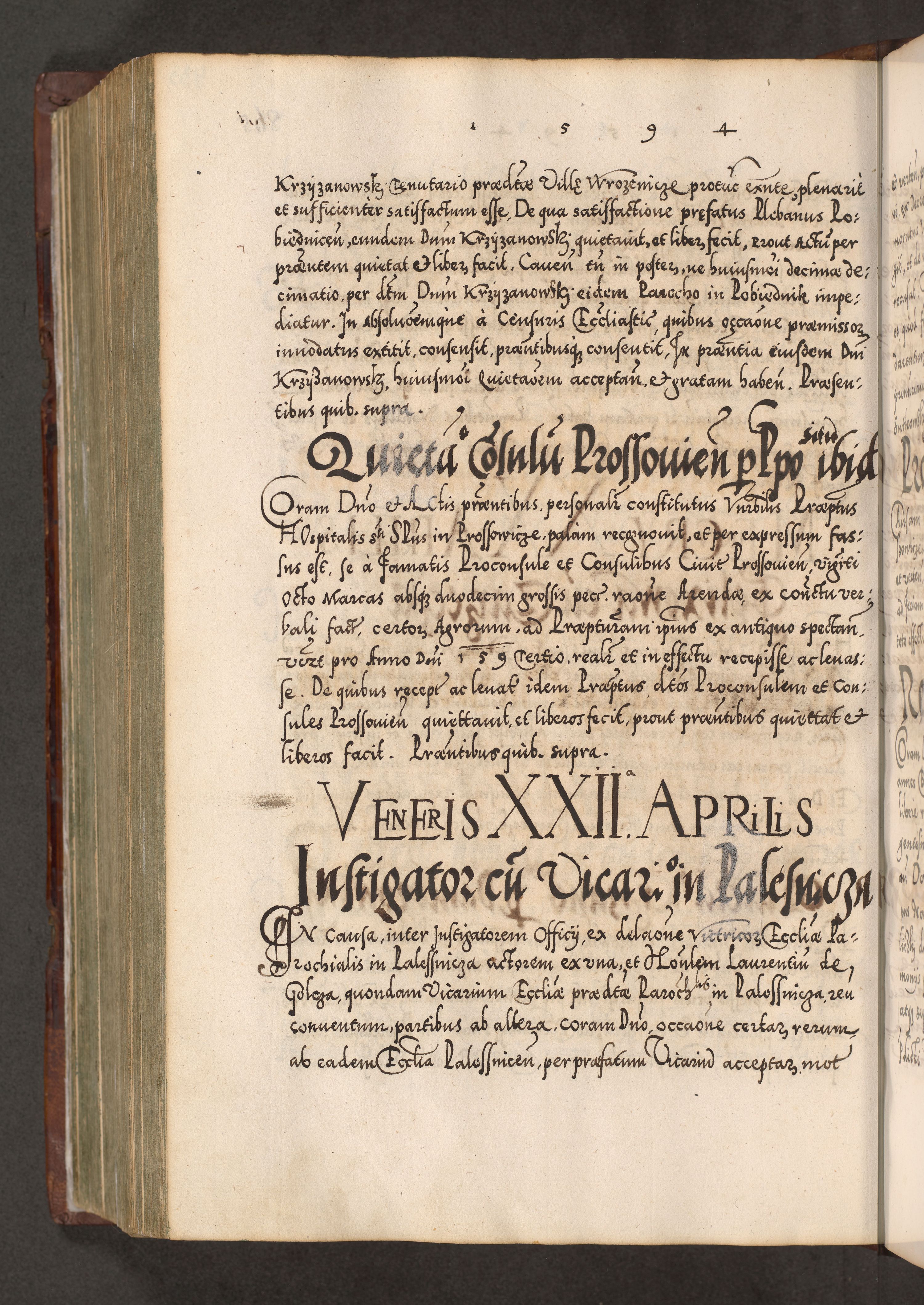Illistrissimo et revedissimo in Christo Patre Domino Domino Georgio Rzadziwił Miserone Divina Sacrostae R. E. Tituli S. Sixti Presbitero Cardinali Duce in Olyka et Niesswiesz ad Gubernacula Ecclessiae Cracoviensis cuius administratorialem a Sancta Sede Apostolica obtinverat feliciter sedente. Acta actorum, causarum, sententiarum tam deffinitivarum quam interloquutoriarum decretorum, obligationum, quietationum, recognitionum, constitutionum procuratorum etc. coram Reverendo Domino Stanislao Crassinskz de Crasne Archidiacono Cracoviensis, Scholastico Gnesnesis, Custode Plocensis etc. Vicario et Officiali Generali Cracoviensi in Ano Domini Millesimo Quingentesimo Nonagesimo Primo cuius indictio quarta pontificatus SS. Domini Nostri Gregorii XIIII Anno I psius prio feliciter incipiut