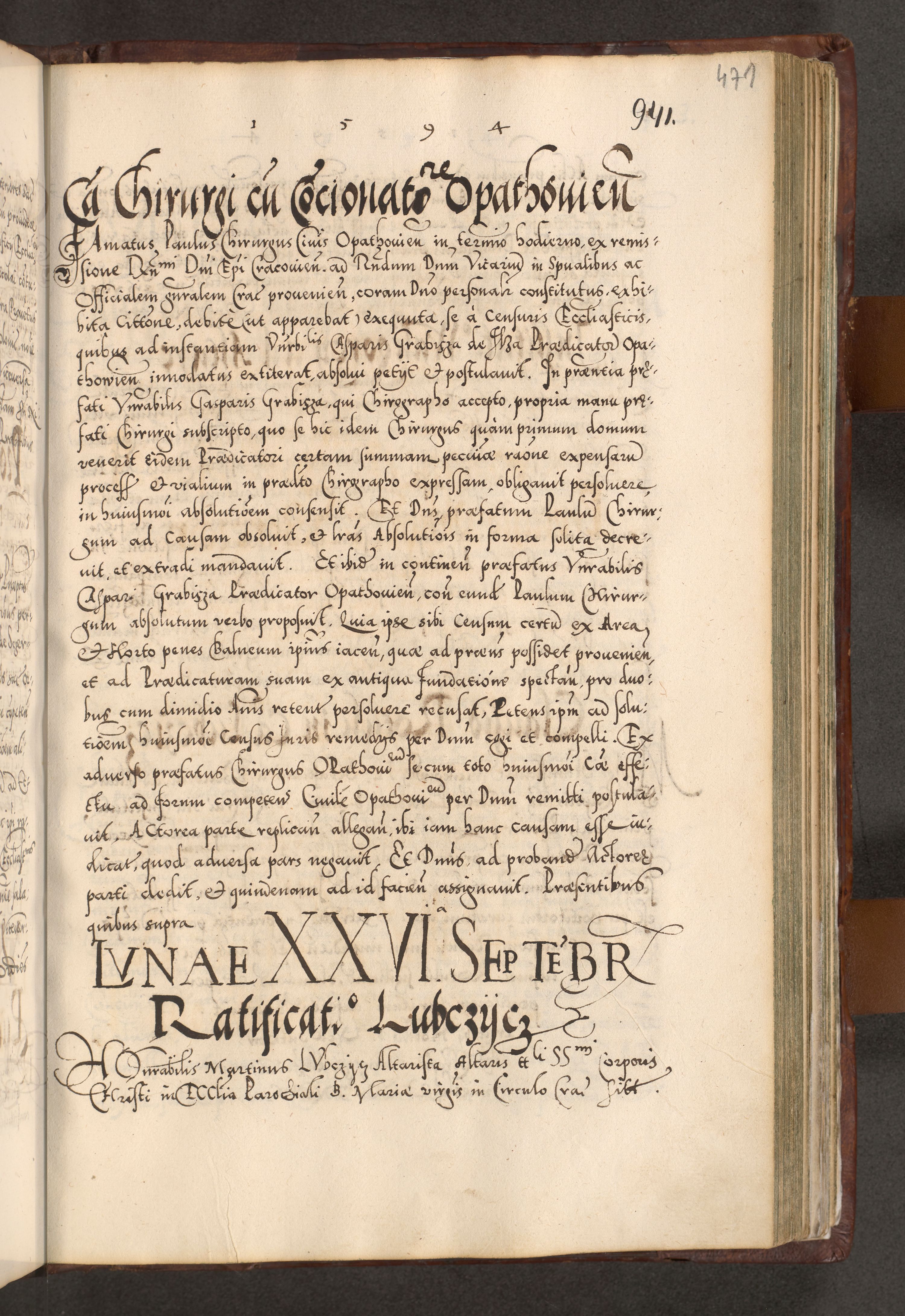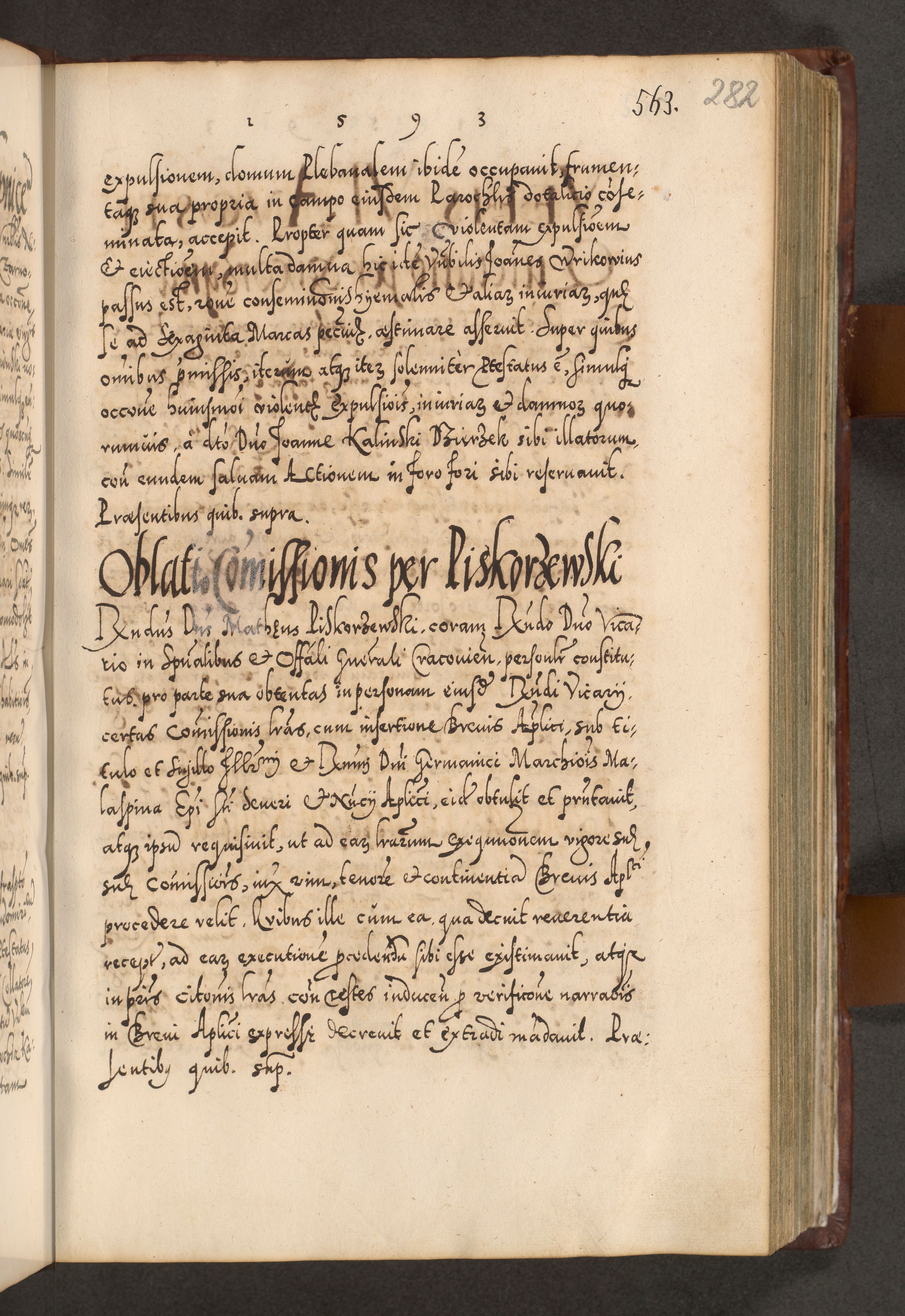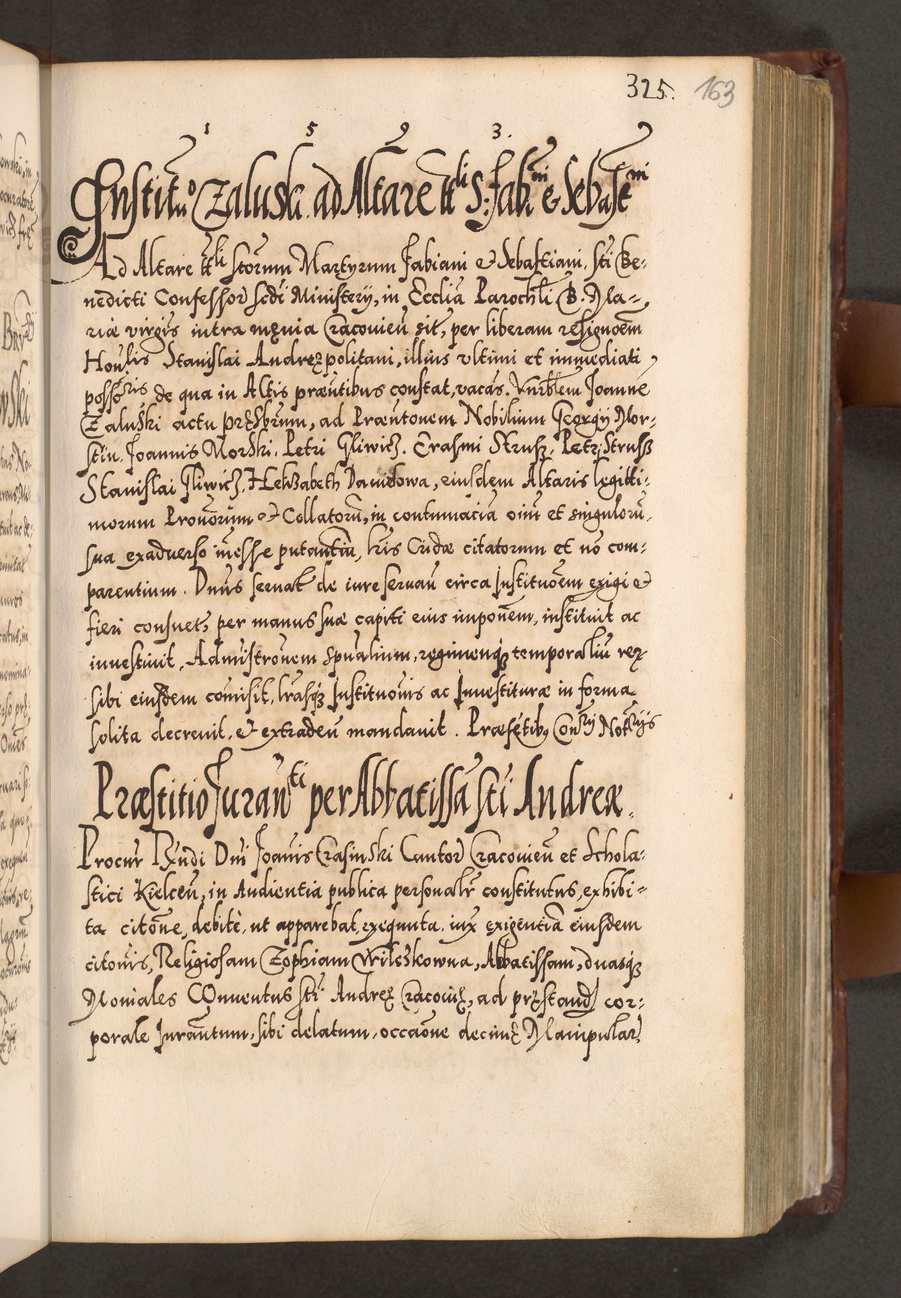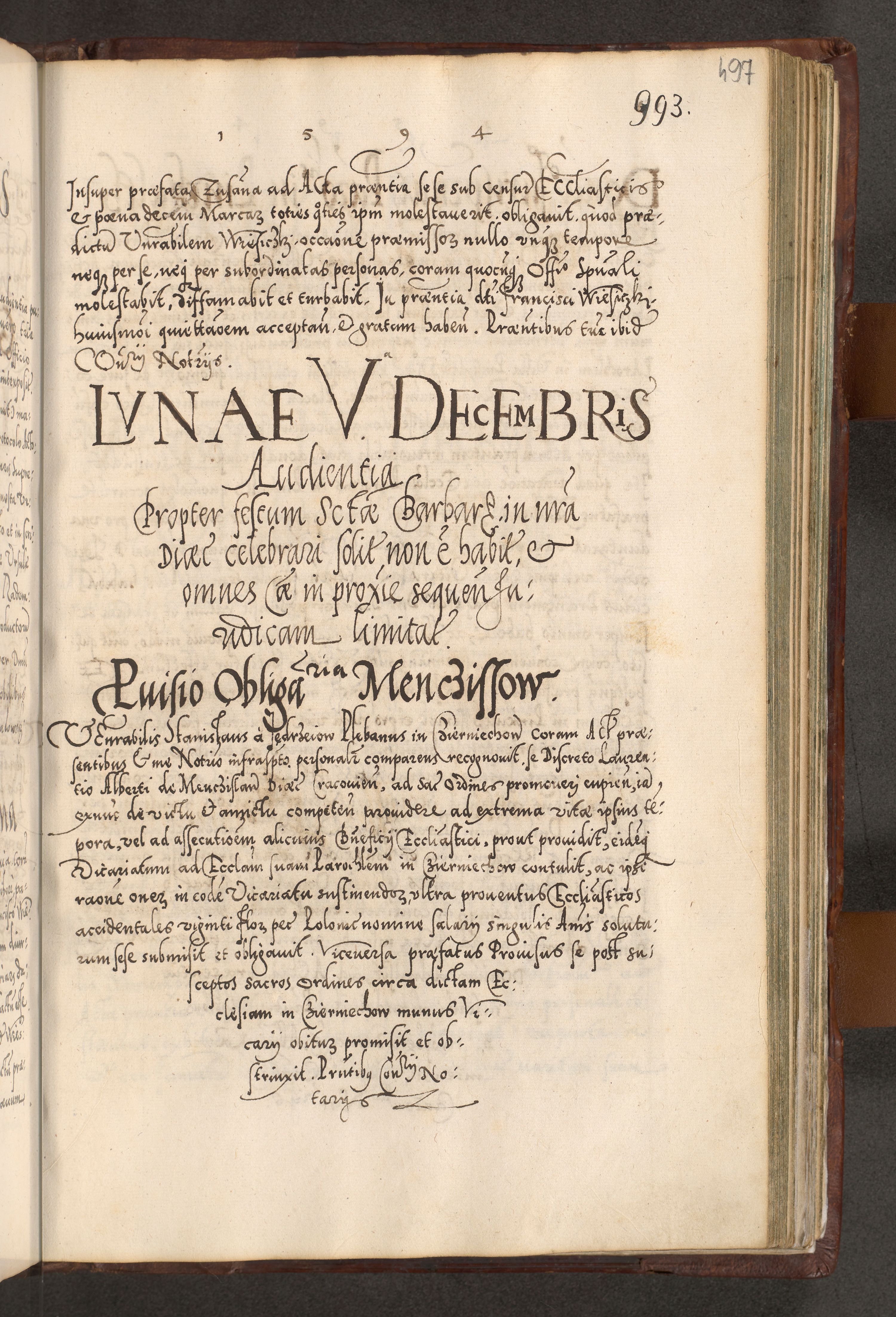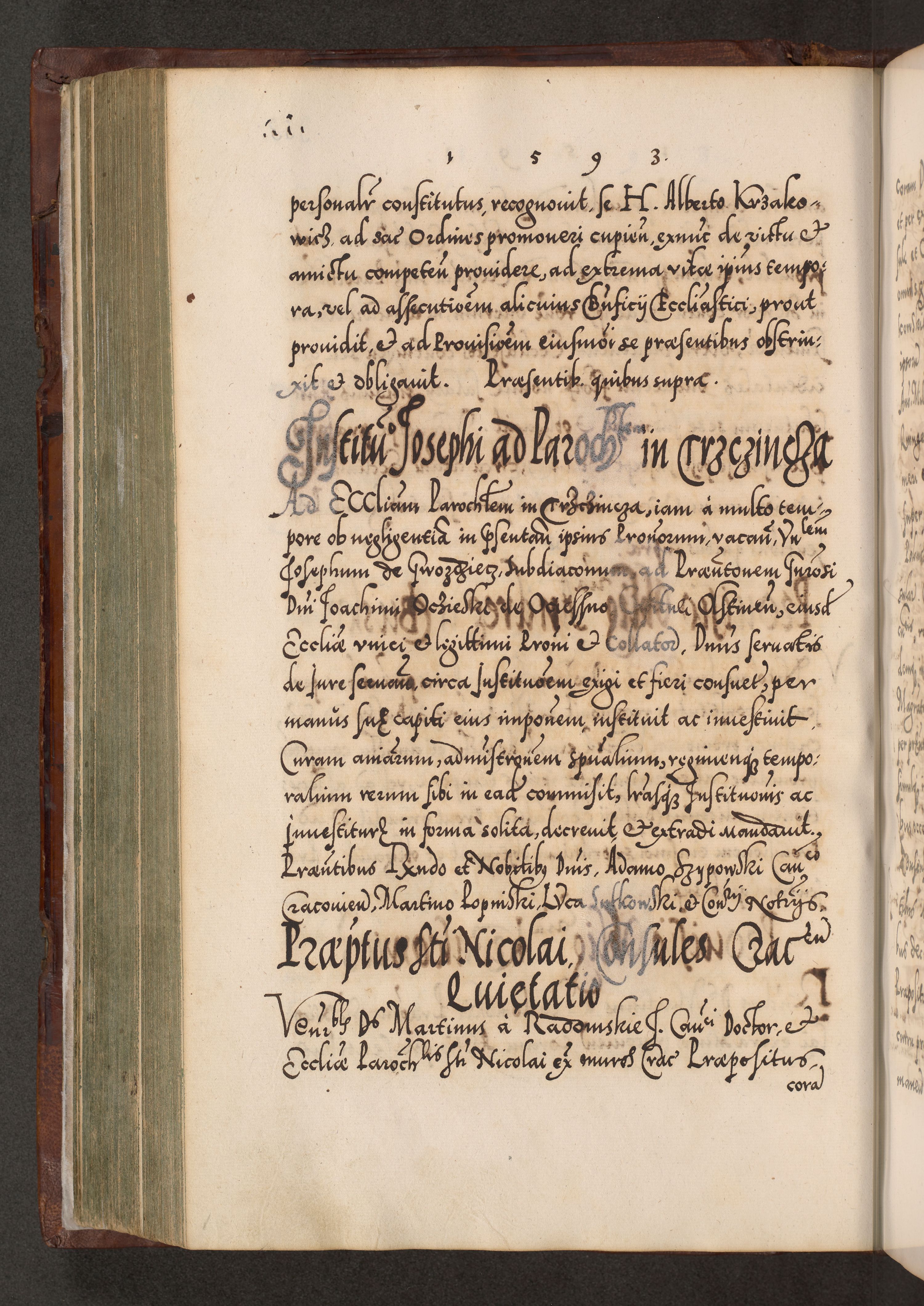 Illistrissimo et revedissimo in Christo Patre Domino Domino Georgio Rzadziwił Miserone Divina Sacrostae R. E. Tituli S. Sixti Presbitero Cardinali Duce in Olyka et Niesswiesz ad Gubernacula Ecclessiae Cracoviensis cuius administratorialem a Sancta Sede Apostolica obtinverat feliciter sedente. Acta actorum, causarum, sententiarum tam deffinitivarum quam interloquutoriarum decretorum, obligationum, quietationum, recognitionum, constitutionum procuratorum etc. coram Reverendo Domino Stanislao Crassinskz de Crasne Archidiacono Cracoviensis, Scholastico Gnesnesis, Custode Plocensis etc. Vicario et Officiali Generali Cracoviensi in Ano Domini Millesimo Quingentesimo Nonagesimo Primo cuius indictio quarta pontificatus SS. Domini Nostri Gregorii XIIII Anno I psius prio feliciter incipiut