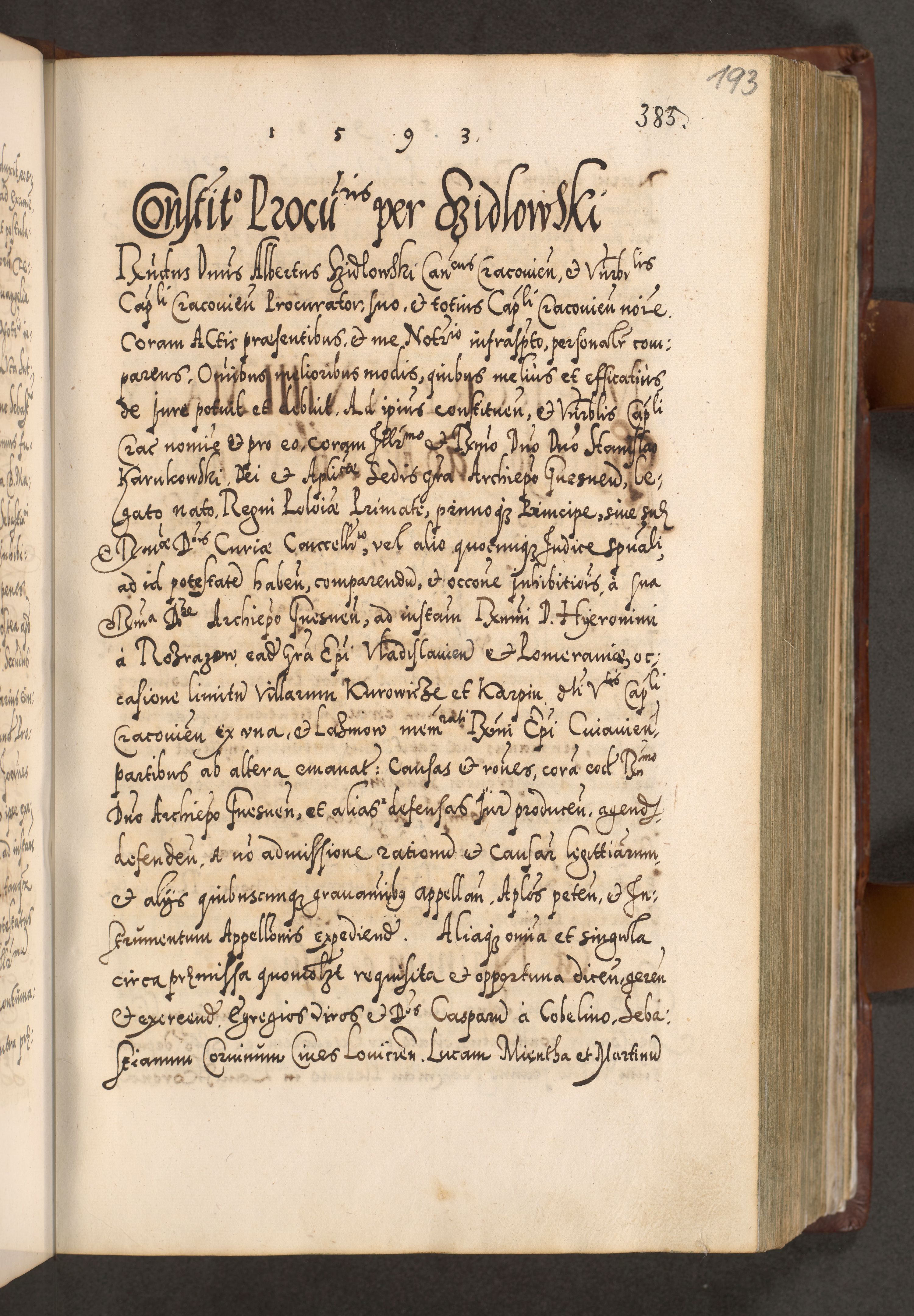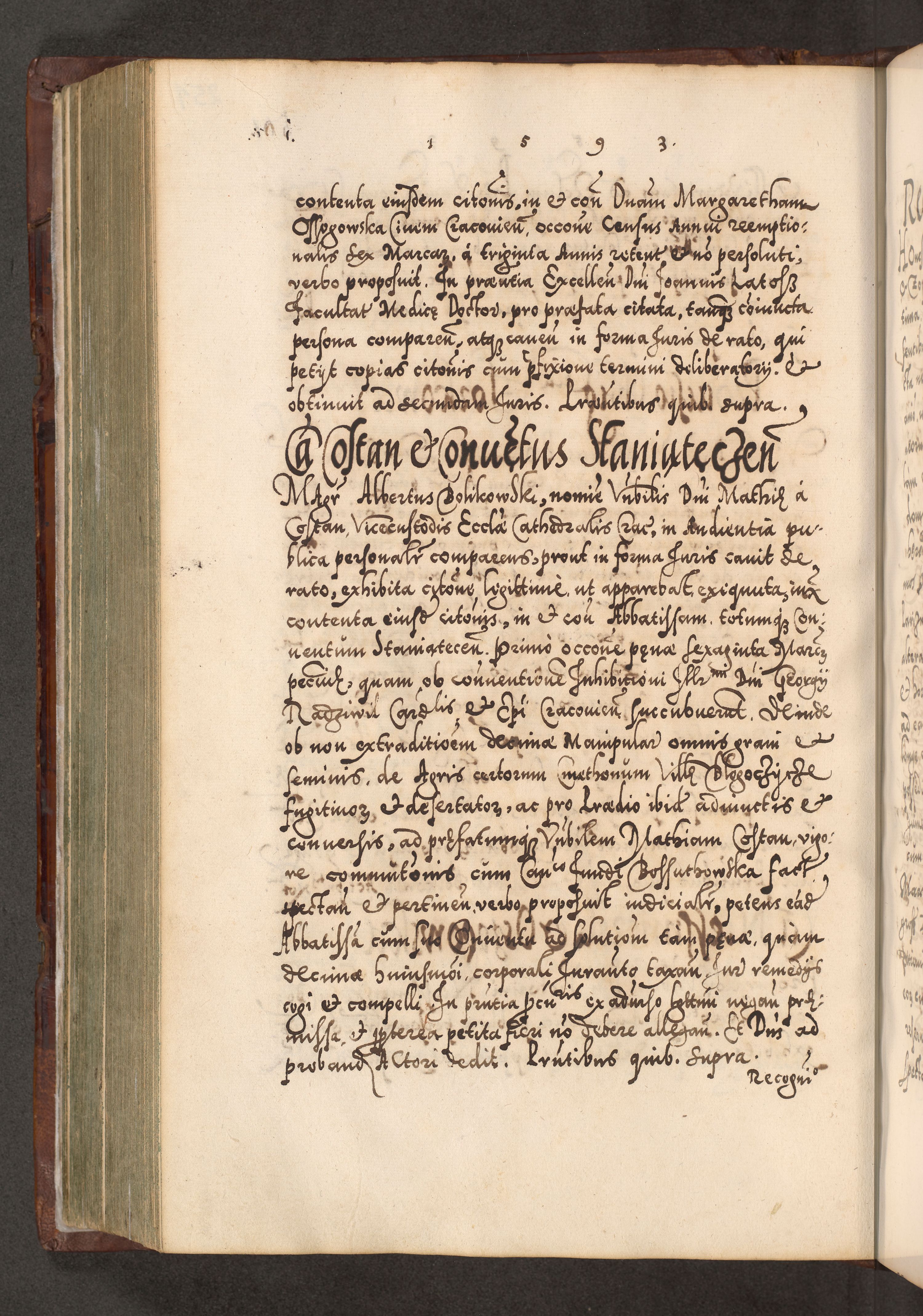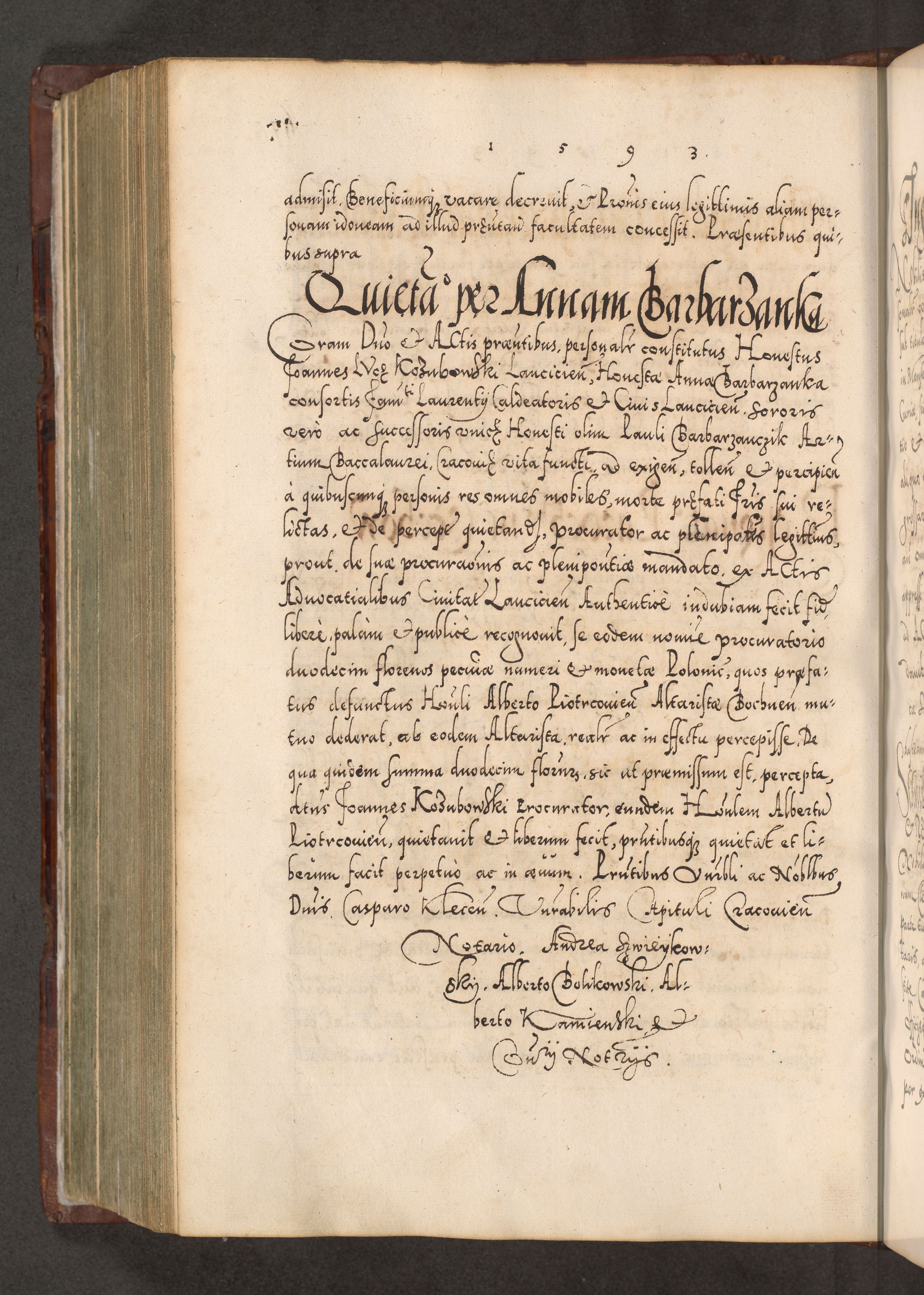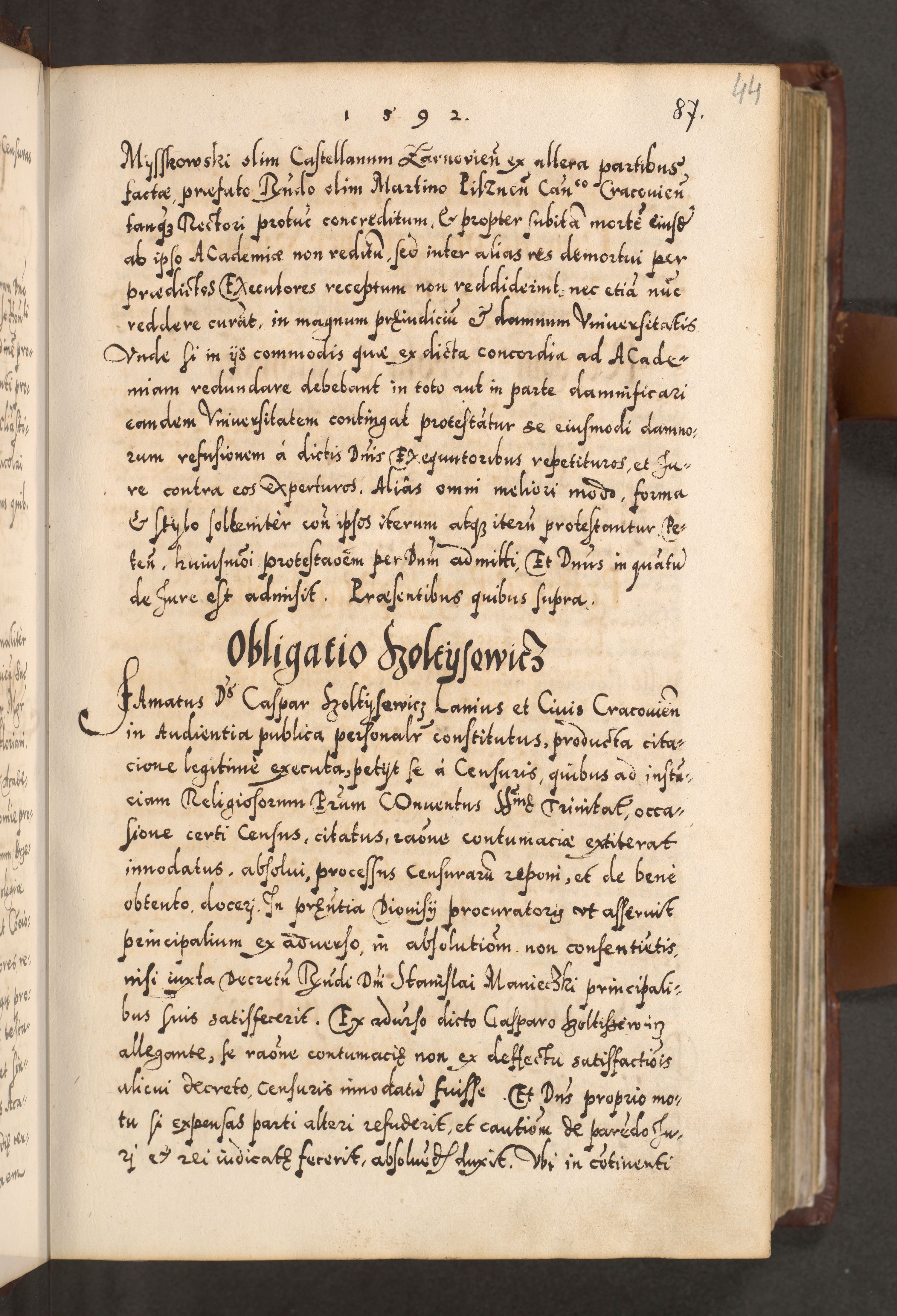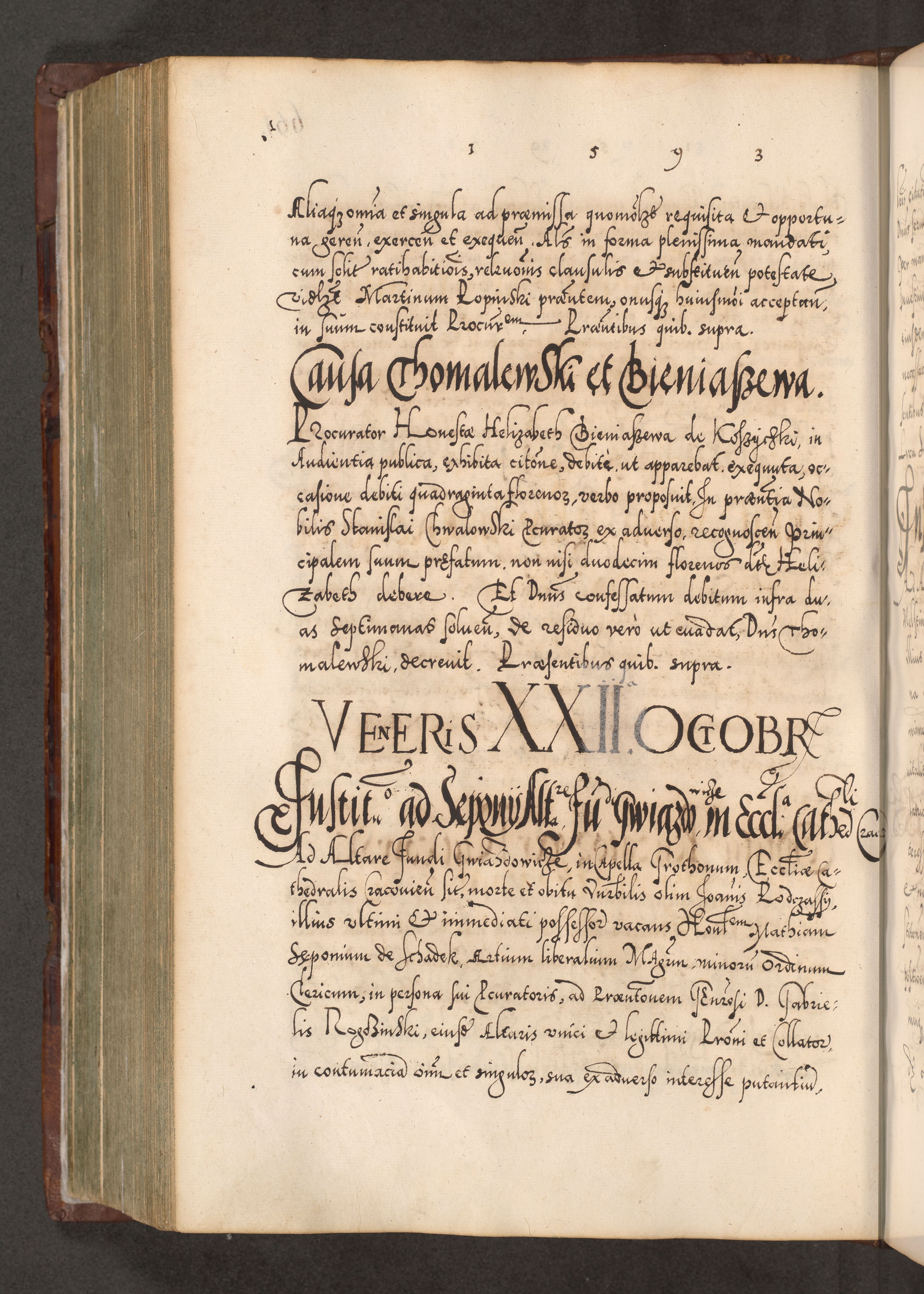 Illistrissimo et revedissimo in Christo Patre Domino Domino Georgio Rzadziwił Miserone Divina Sacrostae R. E. Tituli S. Sixti Presbitero Cardinali Duce in Olyka et Niesswiesz ad Gubernacula Ecclessiae Cracoviensis cuius administratorialem a Sancta Sede Apostolica obtinverat feliciter sedente. Acta actorum, causarum, sententiarum tam deffinitivarum quam interloquutoriarum decretorum, obligationum, quietationum, recognitionum, constitutionum procuratorum etc. coram Reverendo Domino Stanislao Crassinskz de Crasne Archidiacono Cracoviensis, Scholastico Gnesnesis, Custode Plocensis etc. Vicario et Officiali Generali Cracoviensi in Ano Domini Millesimo Quingentesimo Nonagesimo Primo cuius indictio quarta pontificatus SS. Domini Nostri Gregorii XIIII Anno I psius prio feliciter incipiut