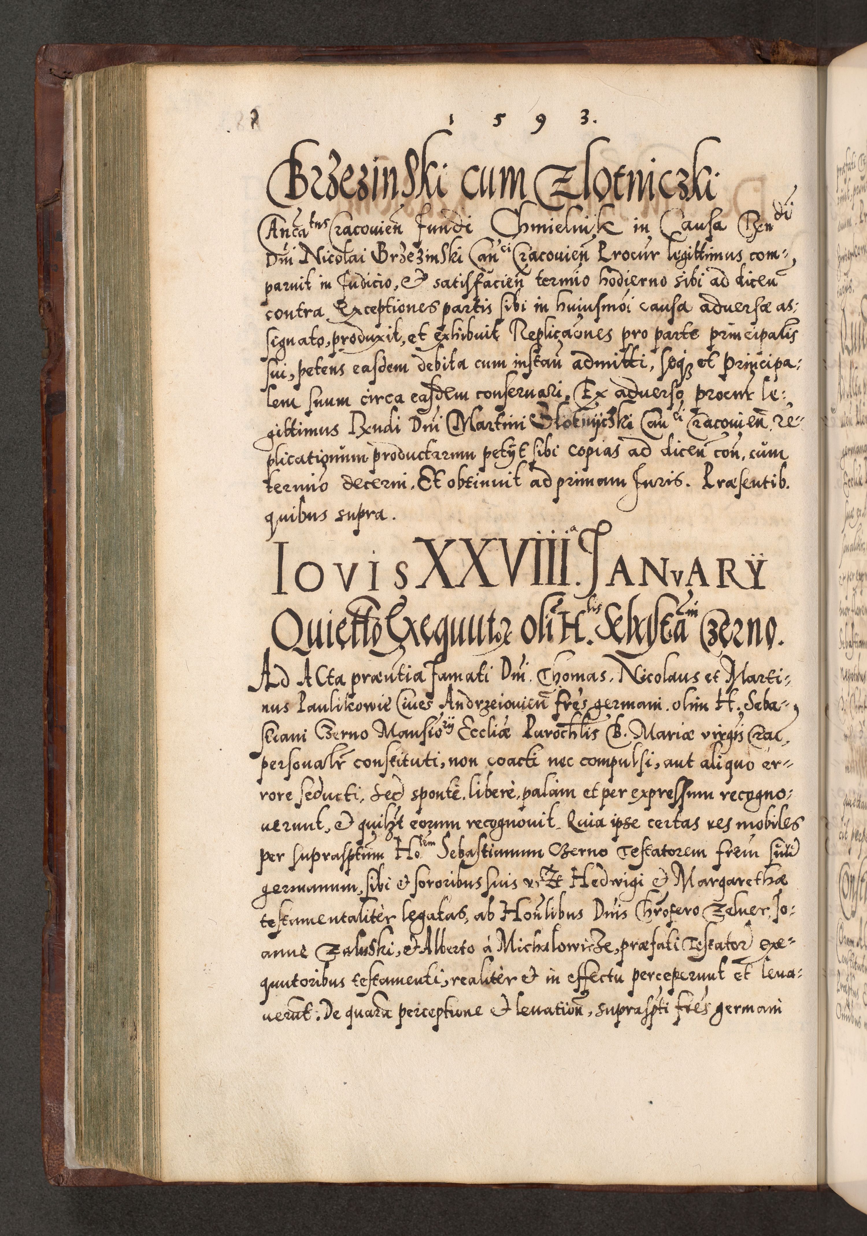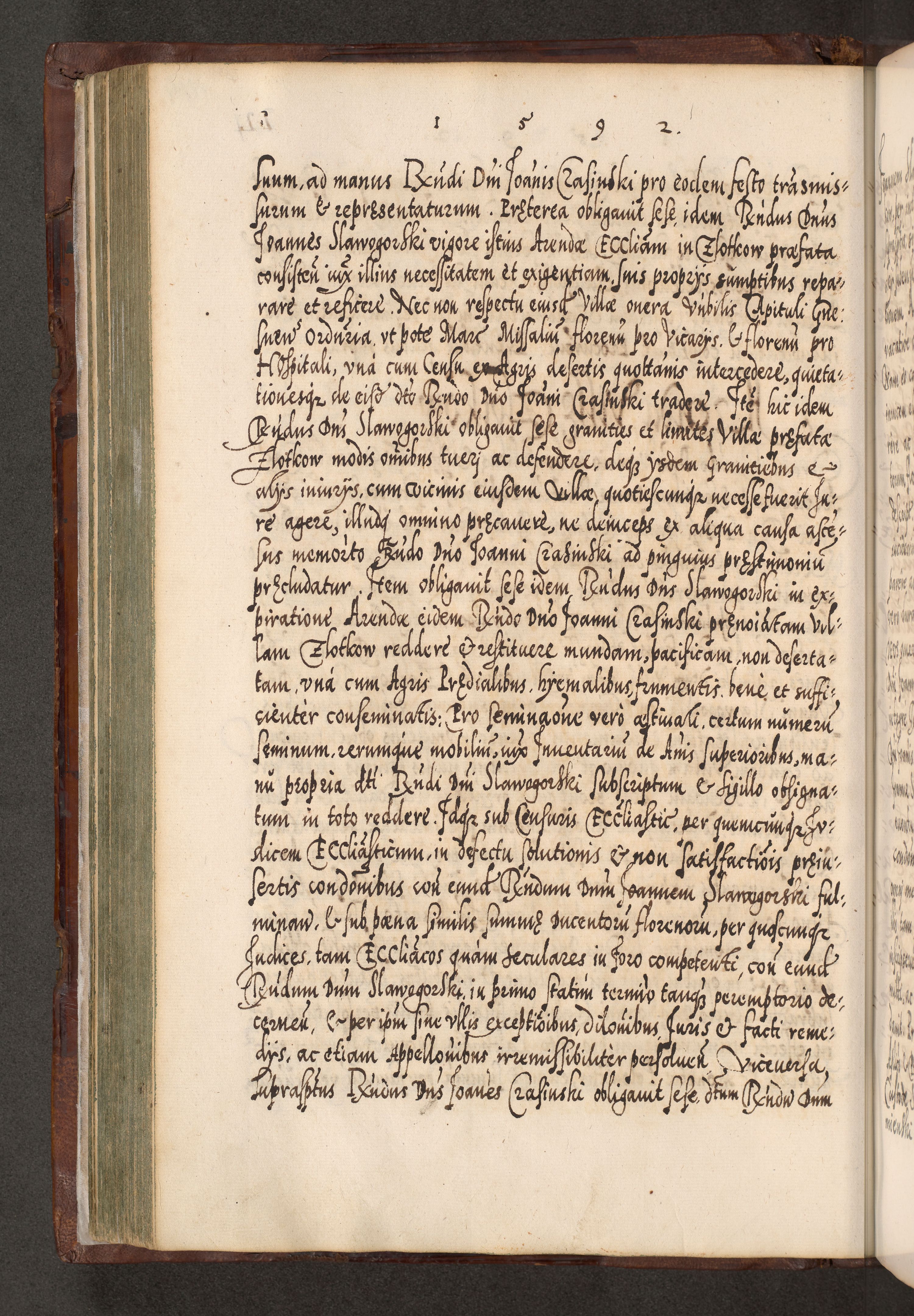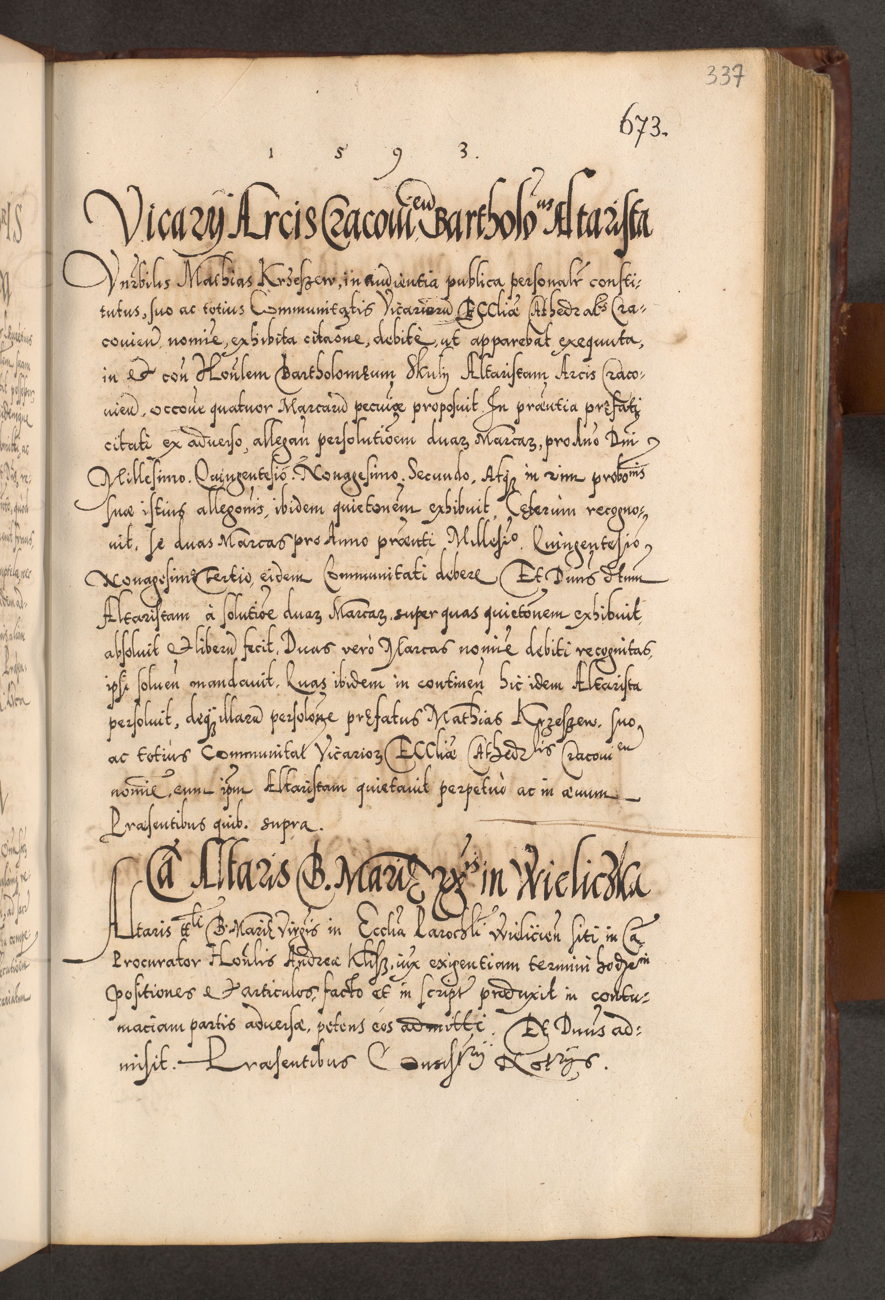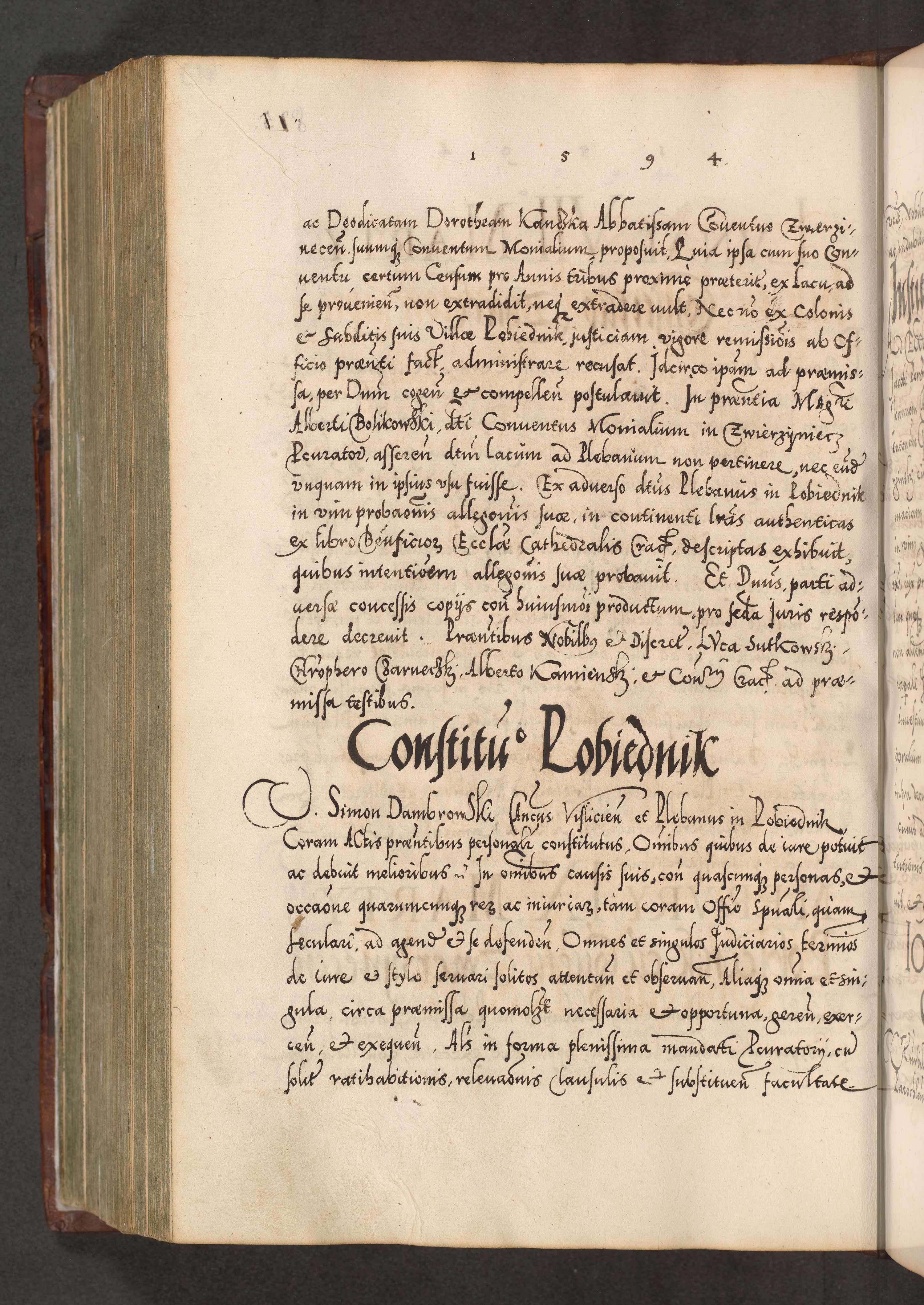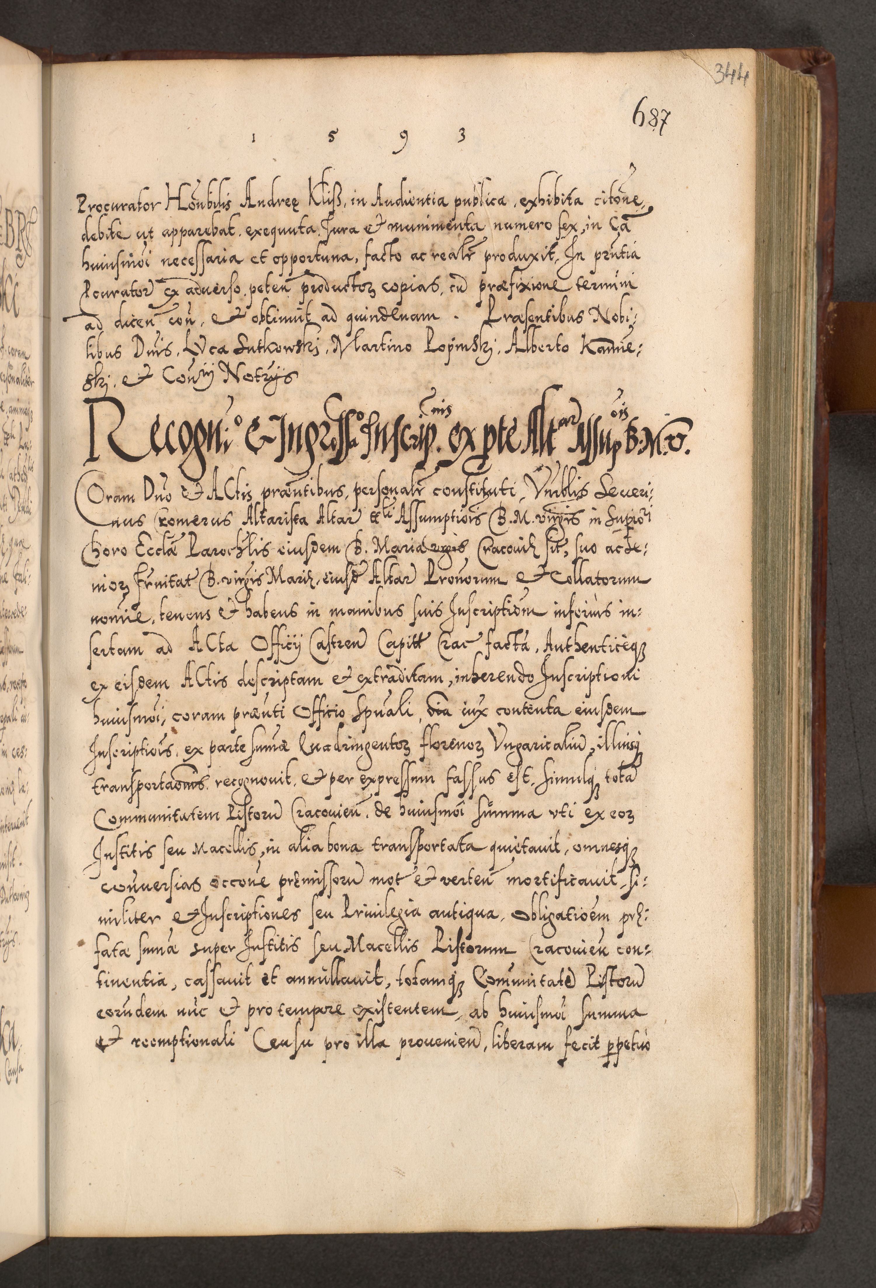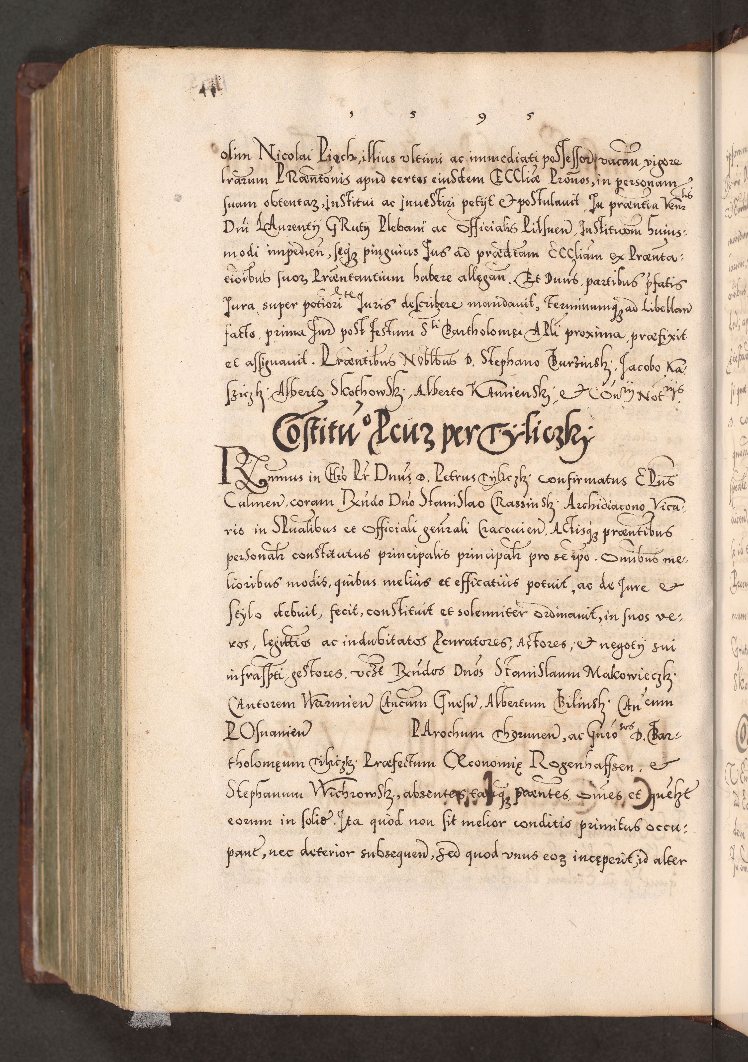 Illistrissimo et revedissimo in Christo Patre Domino Domino Georgio Rzadziwił Miserone Divina Sacrostae R. E. Tituli S. Sixti Presbitero Cardinali Duce in Olyka et Niesswiesz ad Gubernacula Ecclessiae Cracoviensis cuius administratorialem a Sancta Sede Apostolica obtinverat feliciter sedente. Acta actorum, causarum, sententiarum tam deffinitivarum quam interloquutoriarum decretorum, obligationum, quietationum, recognitionum, constitutionum procuratorum etc. coram Reverendo Domino Stanislao Crassinskz de Crasne Archidiacono Cracoviensis, Scholastico Gnesnesis, Custode Plocensis etc. Vicario et Officiali Generali Cracoviensi in Ano Domini Millesimo Quingentesimo Nonagesimo Primo cuius indictio quarta pontificatus SS. Domini Nostri Gregorii XIIII Anno I psius prio feliciter incipiut