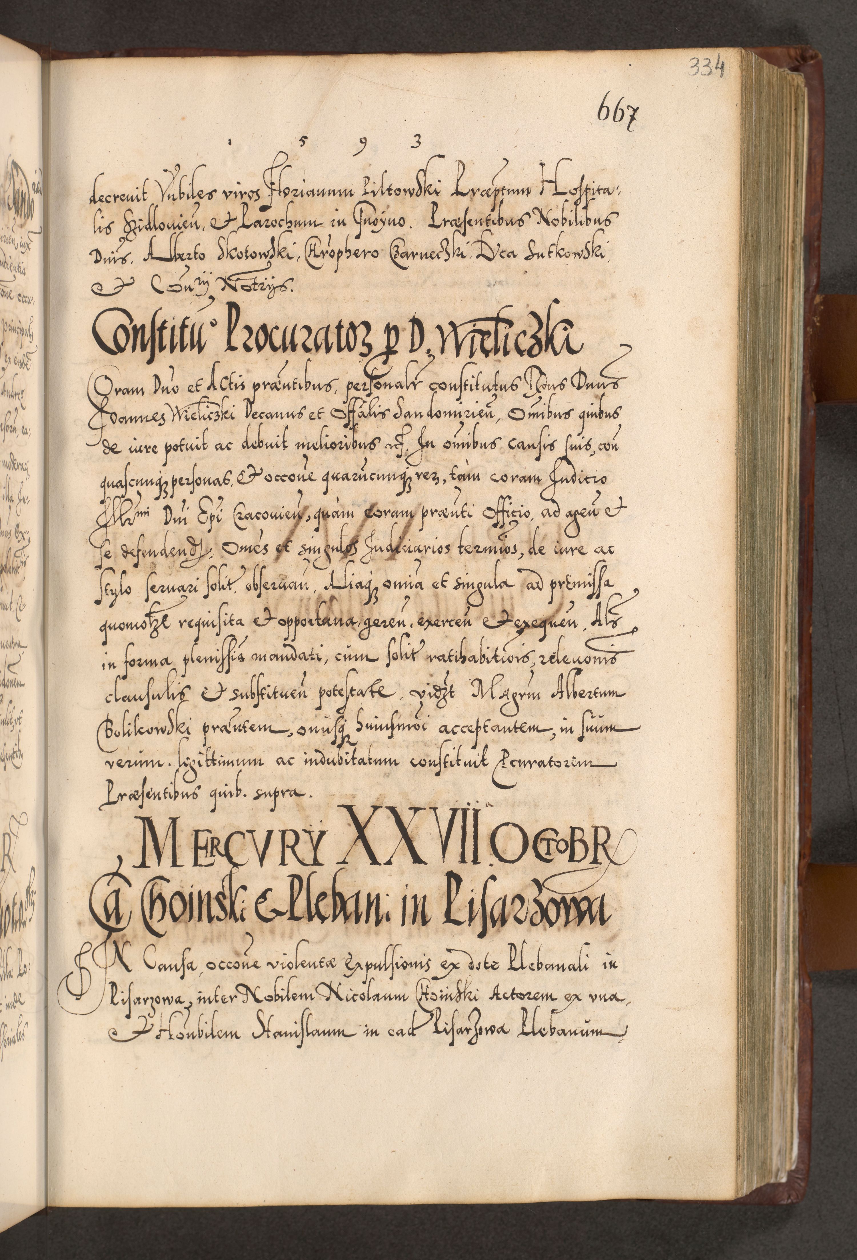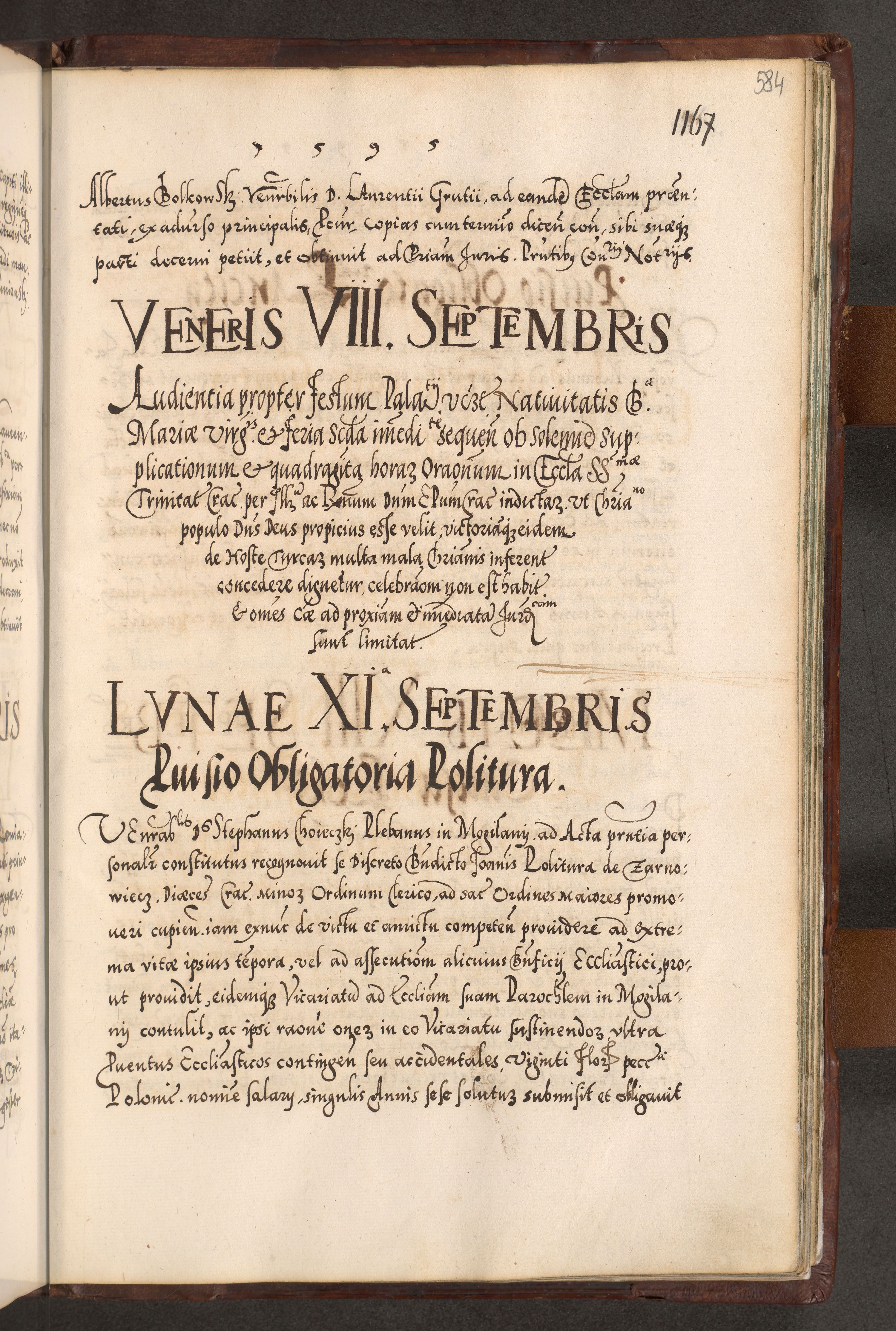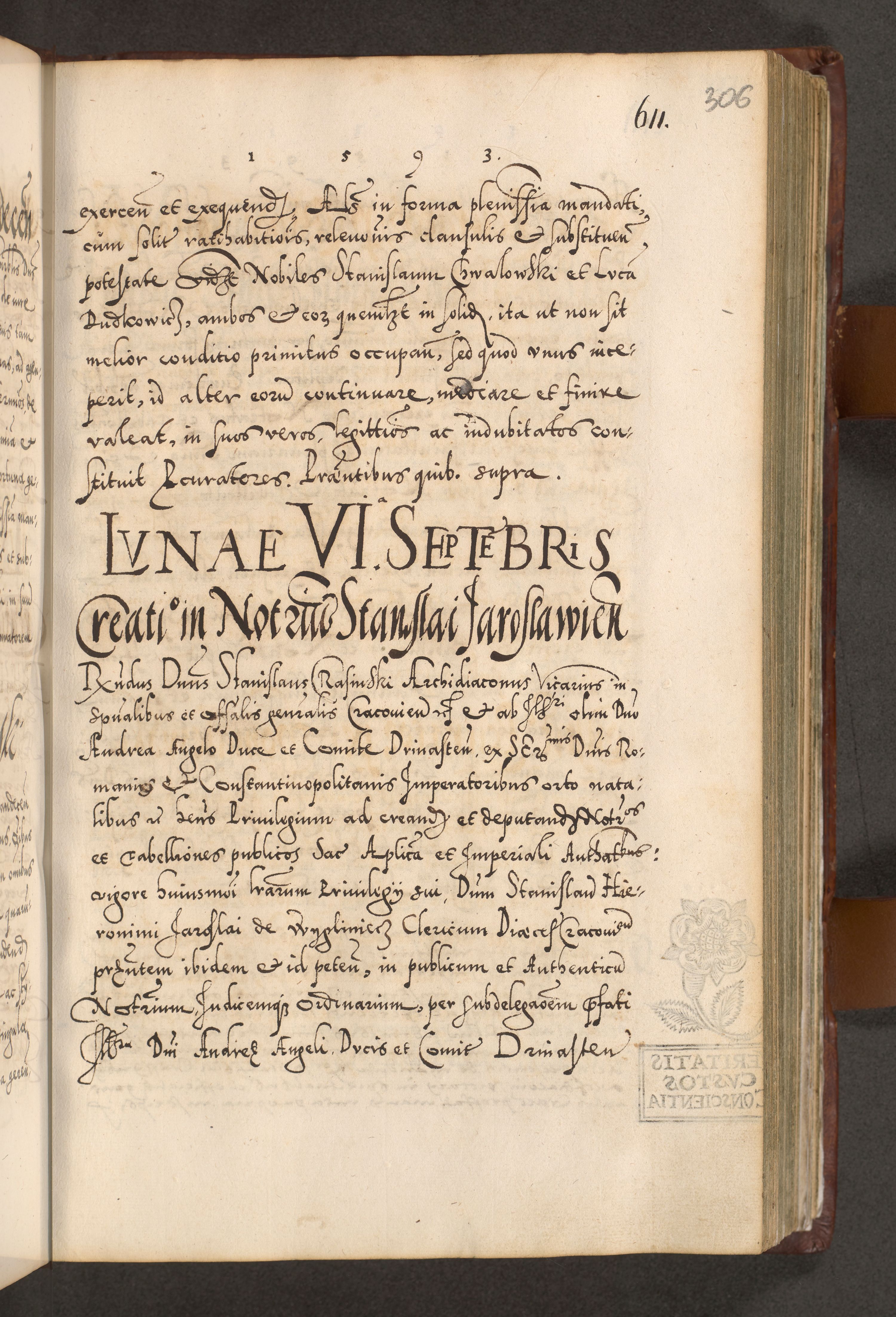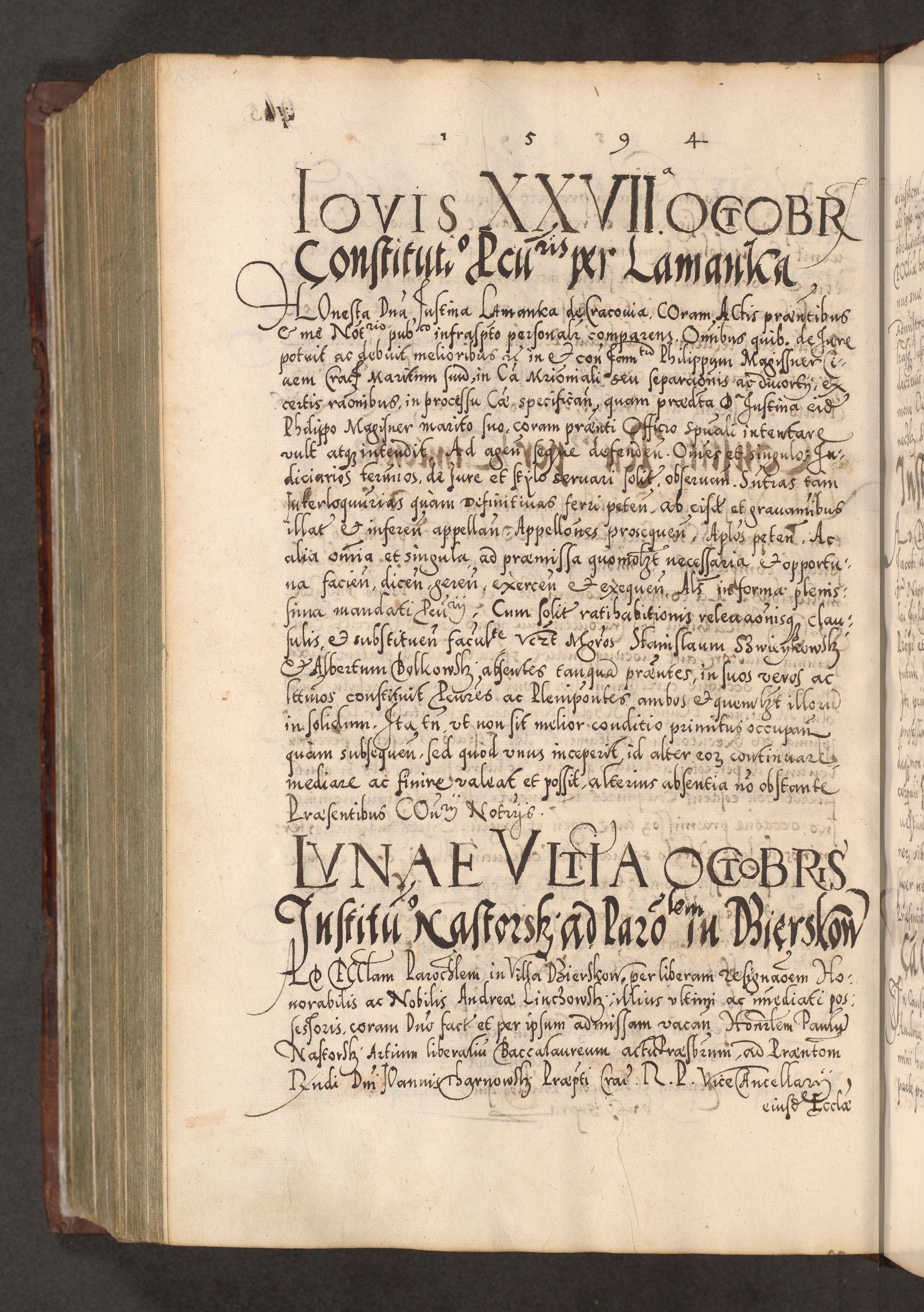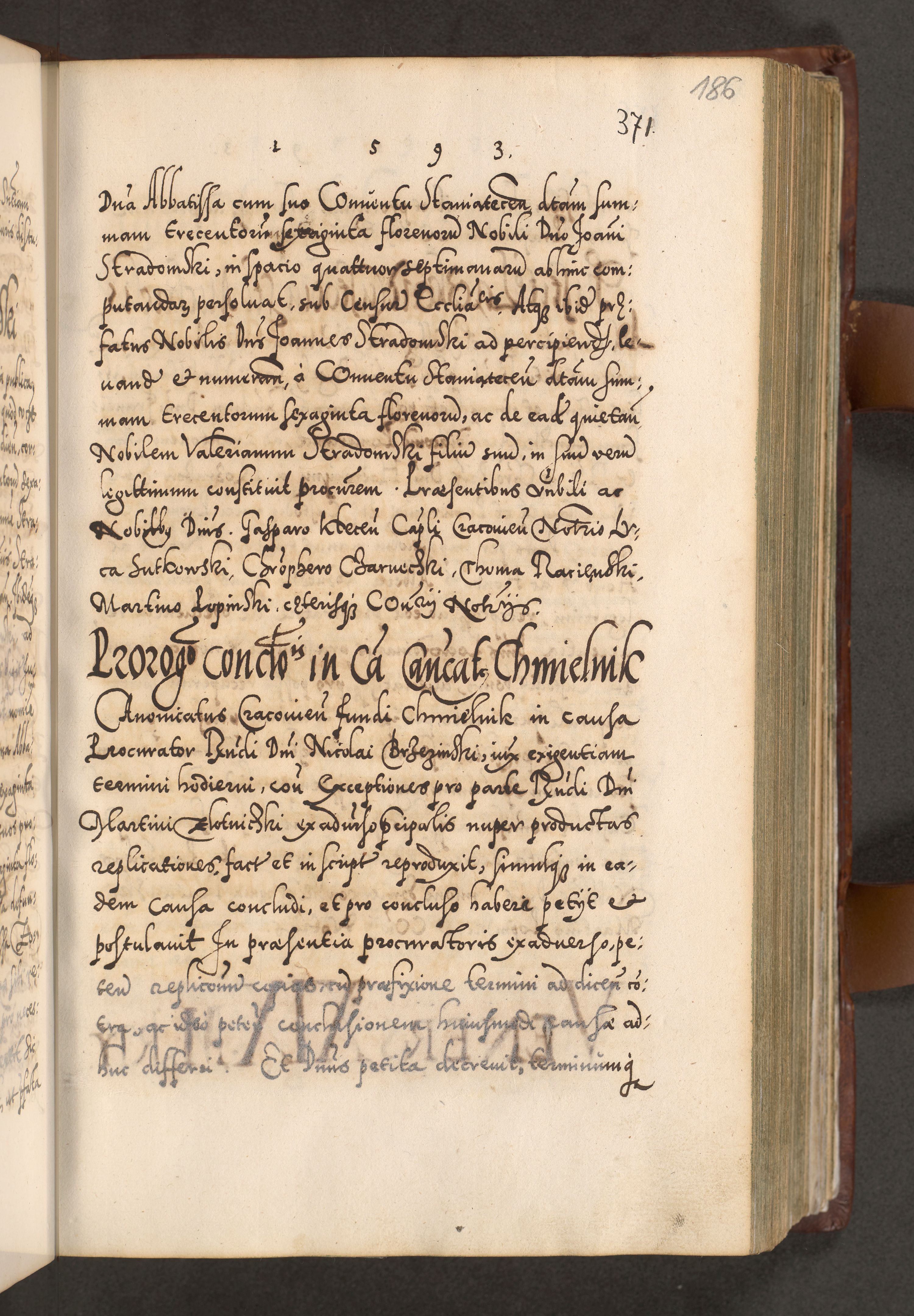 Illistrissimo et revedissimo in Christo Patre Domino Domino Georgio Rzadziwił Miserone Divina Sacrostae R. E. Tituli S. Sixti Presbitero Cardinali Duce in Olyka et Niesswiesz ad Gubernacula Ecclessiae Cracoviensis cuius administratorialem a Sancta Sede Apostolica obtinverat feliciter sedente. Acta actorum, causarum, sententiarum tam deffinitivarum quam interloquutoriarum decretorum, obligationum, quietationum, recognitionum, constitutionum procuratorum etc. coram Reverendo Domino Stanislao Crassinskz de Crasne Archidiacono Cracoviensis, Scholastico Gnesnesis, Custode Plocensis etc. Vicario et Officiali Generali Cracoviensi in Ano Domini Millesimo Quingentesimo Nonagesimo Primo cuius indictio quarta pontificatus SS. Domini Nostri Gregorii XIIII Anno I psius prio feliciter incipiut