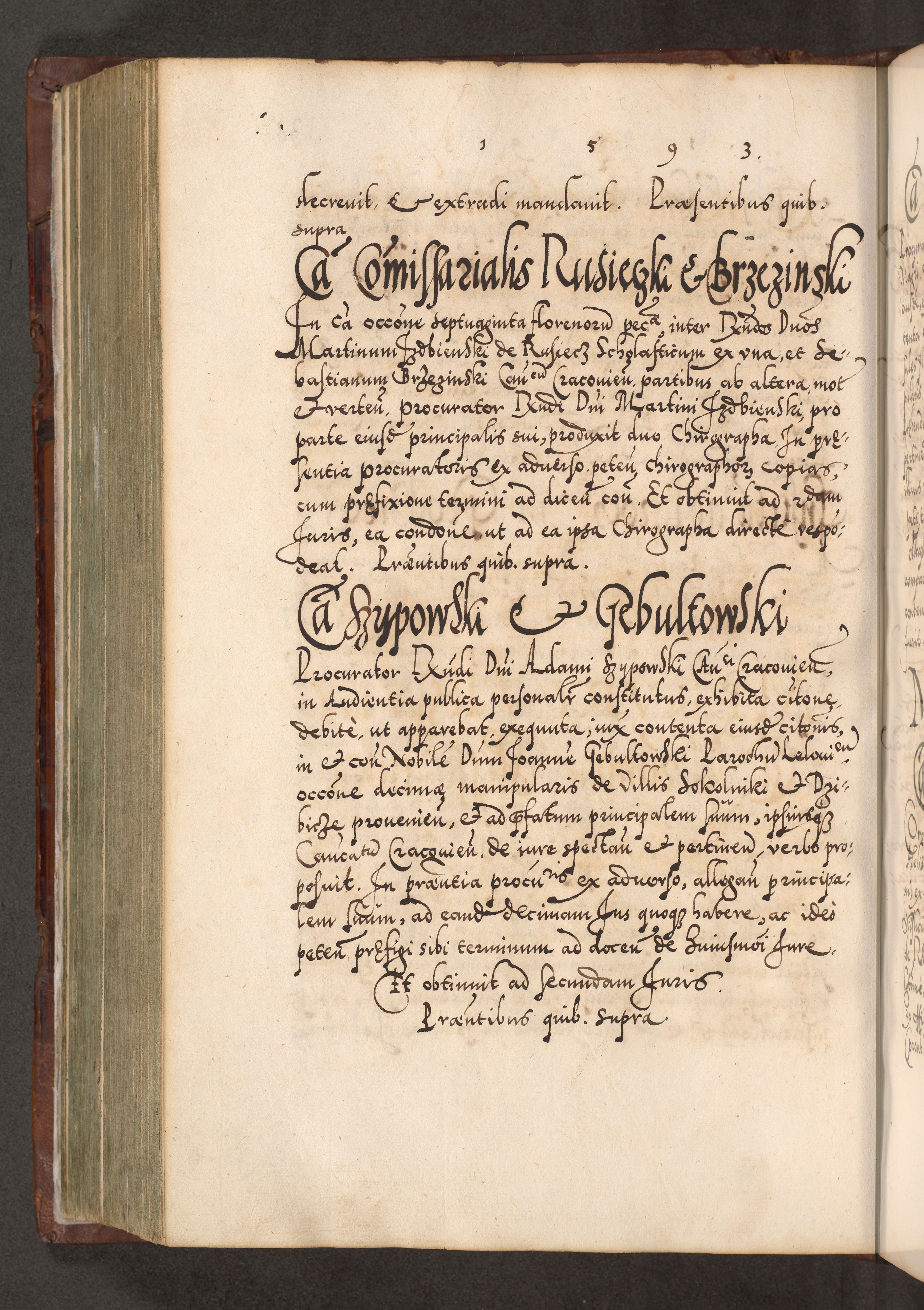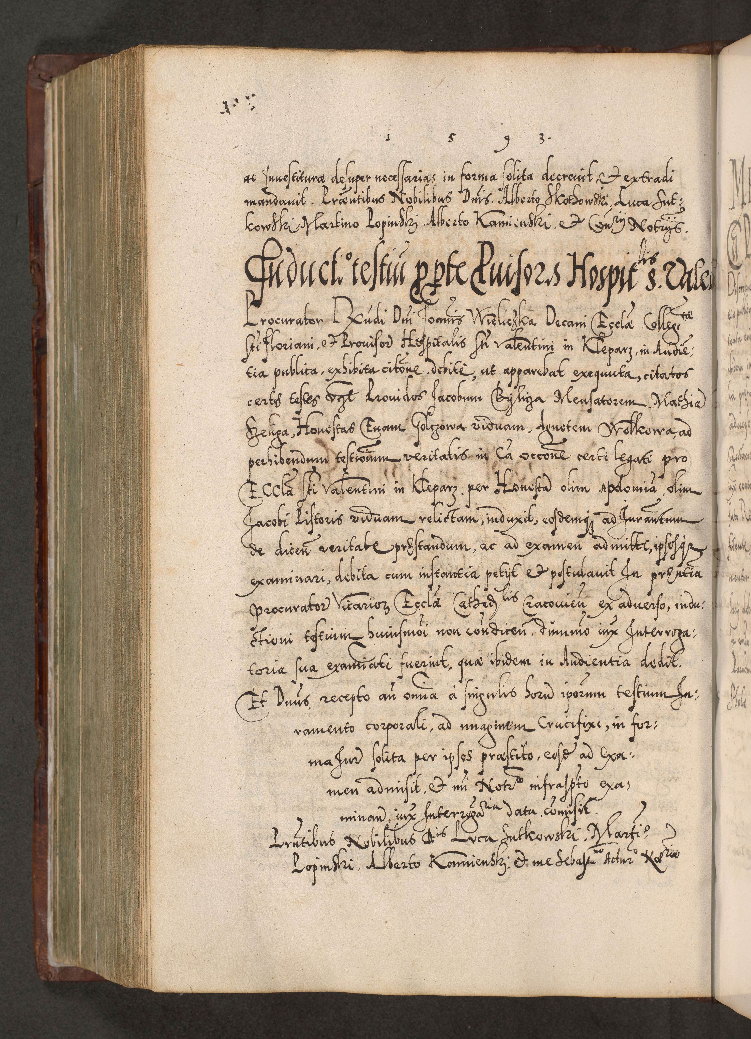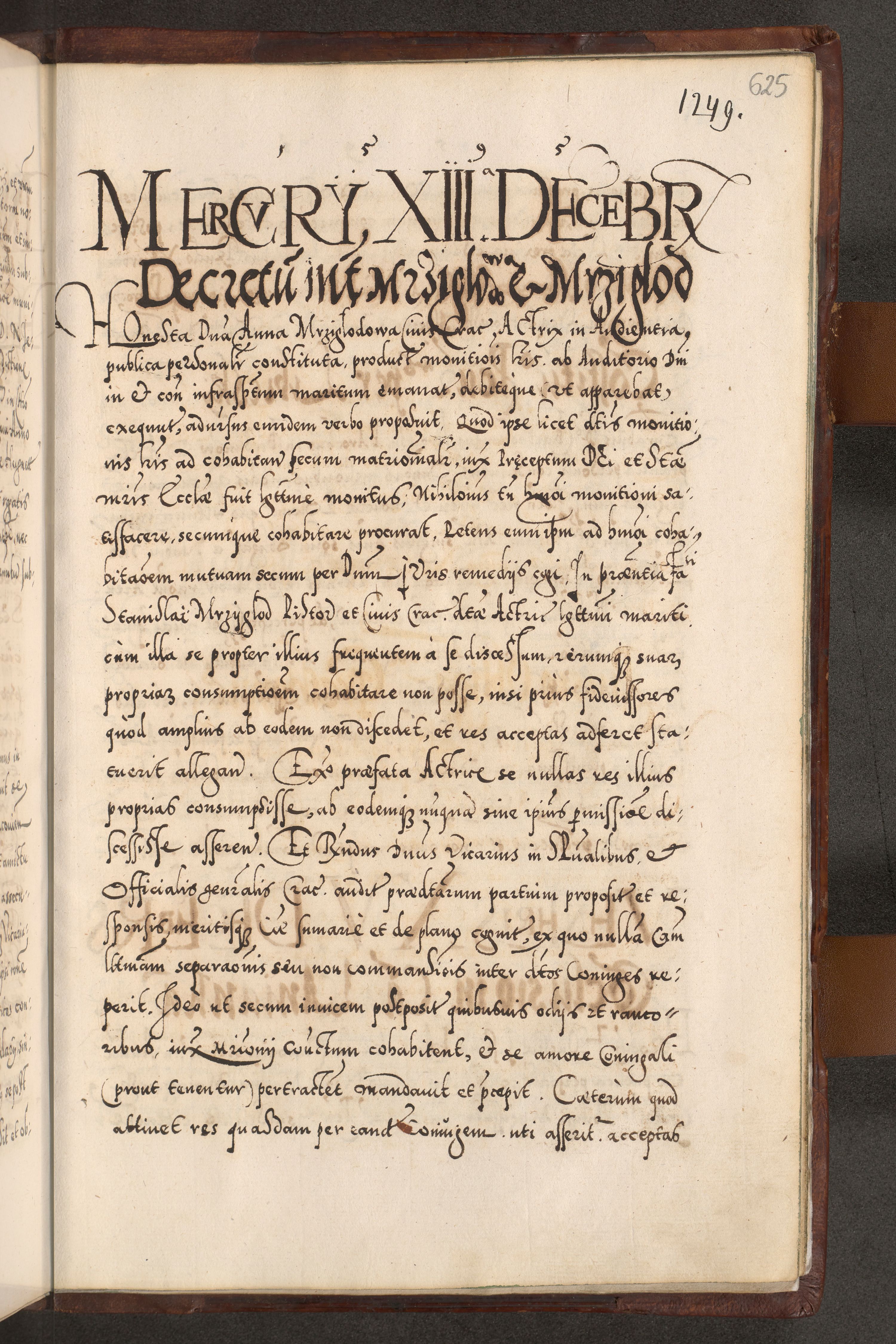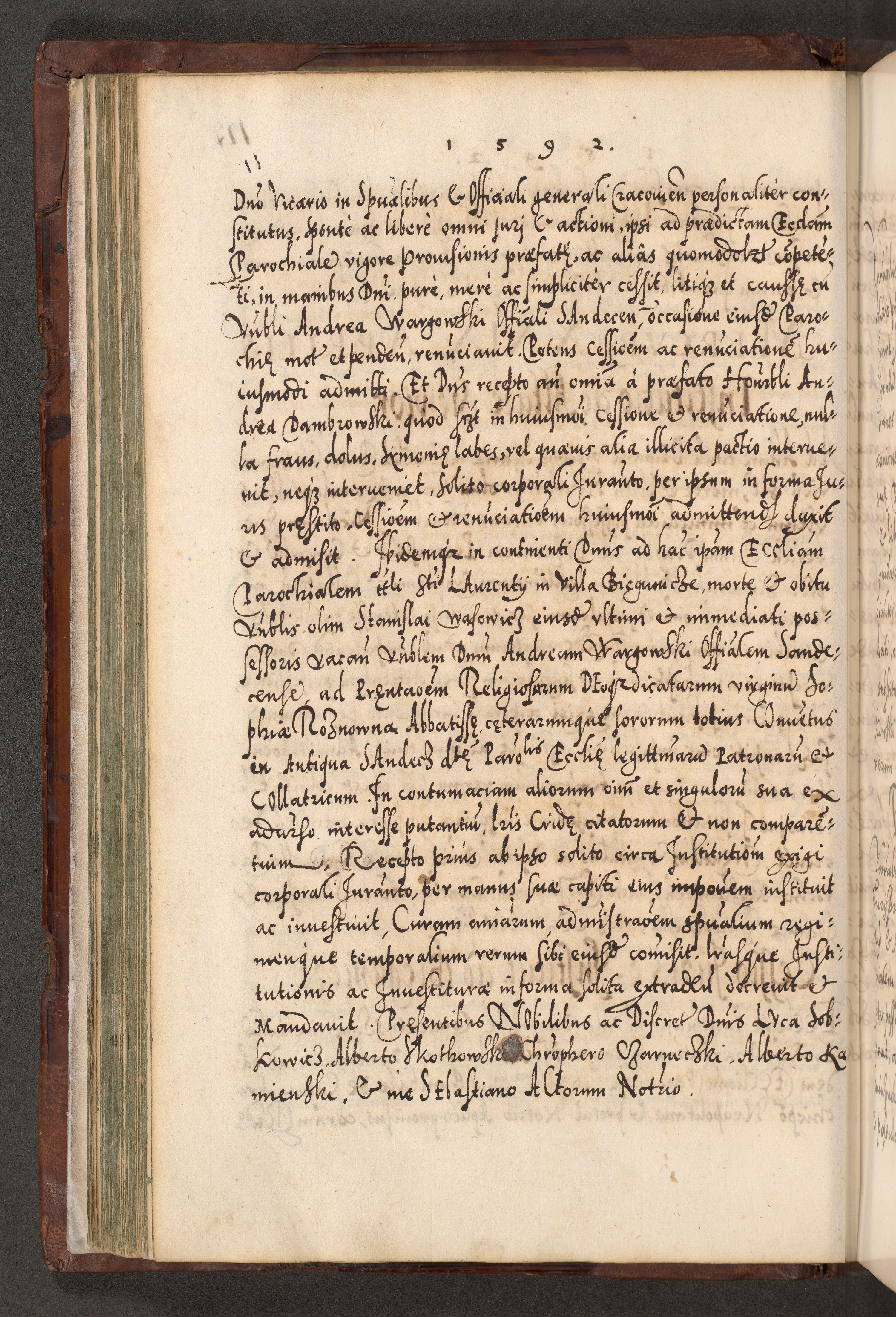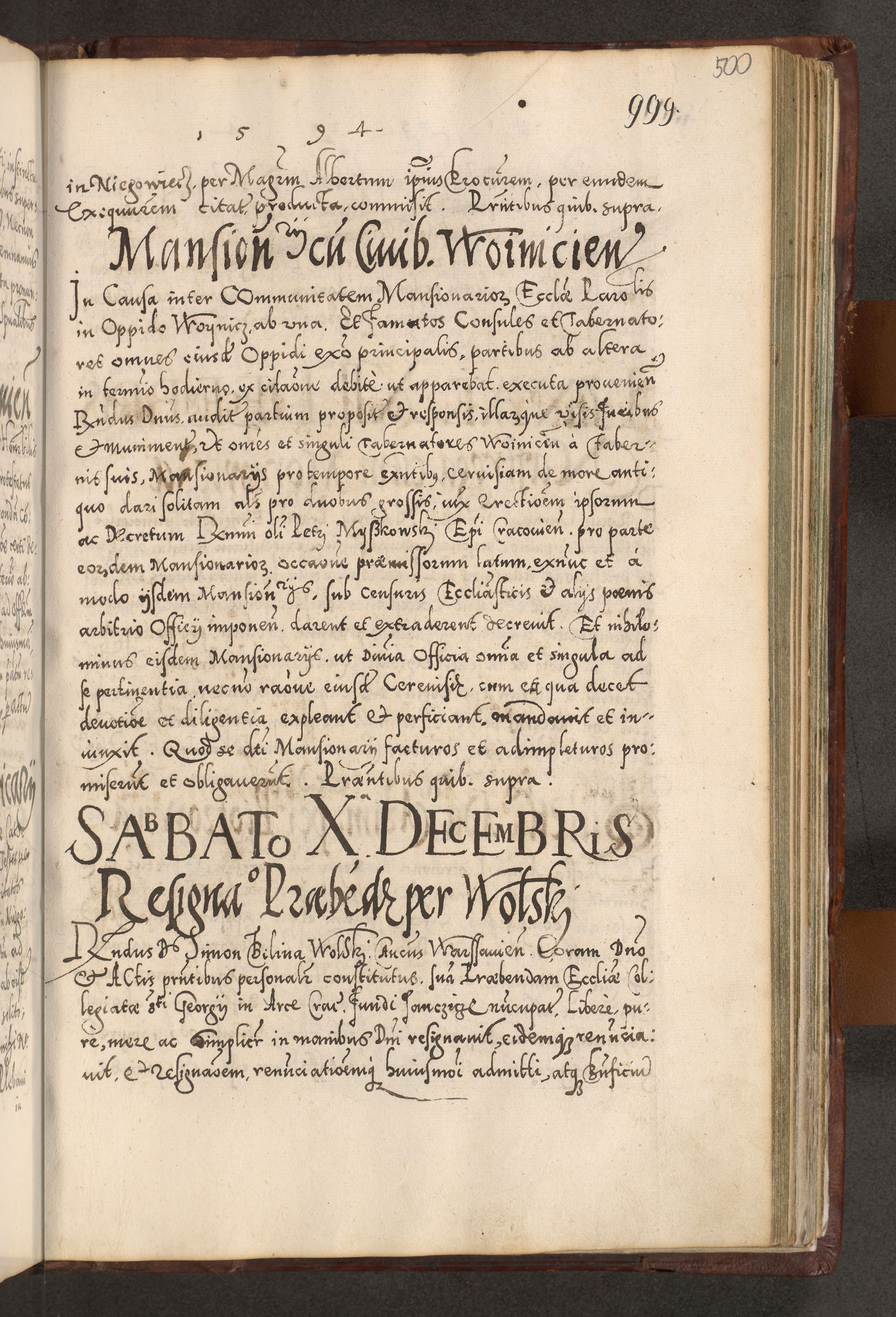 Illistrissimo et revedissimo in Christo Patre Domino Domino Georgio Rzadziwił Miserone Divina Sacrostae R. E. Tituli S. Sixti Presbitero Cardinali Duce in Olyka et Niesswiesz ad Gubernacula Ecclessiae Cracoviensis cuius administratorialem a Sancta Sede Apostolica obtinverat feliciter sedente. Acta actorum, causarum, sententiarum tam deffinitivarum quam interloquutoriarum decretorum, obligationum, quietationum, recognitionum, constitutionum procuratorum etc. coram Reverendo Domino Stanislao Crassinskz de Crasne Archidiacono Cracoviensis, Scholastico Gnesnesis, Custode Plocensis etc. Vicario et Officiali Generali Cracoviensi in Ano Domini Millesimo Quingentesimo Nonagesimo Primo cuius indictio quarta pontificatus SS. Domini Nostri Gregorii XIIII Anno I psius prio feliciter incipiut
