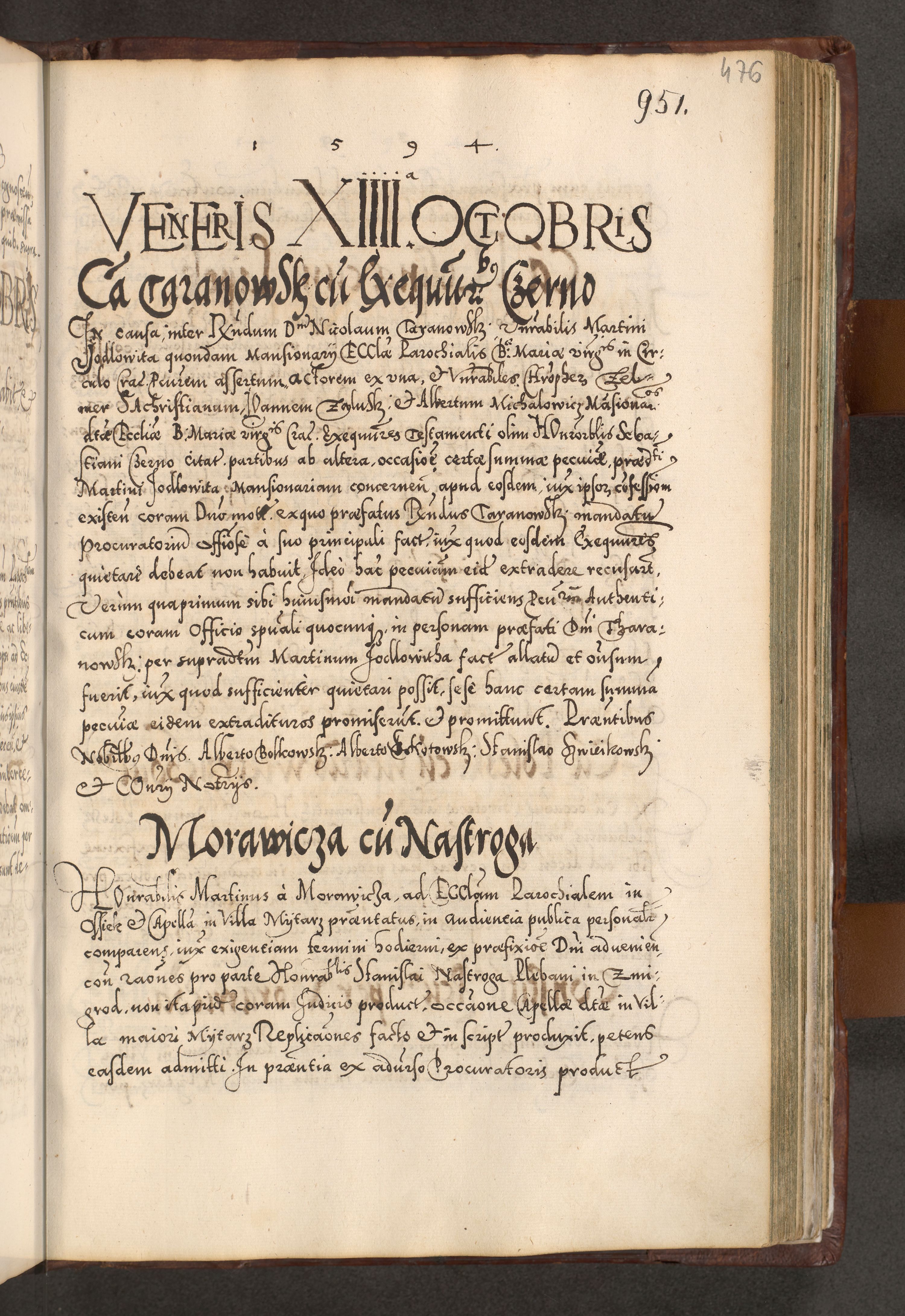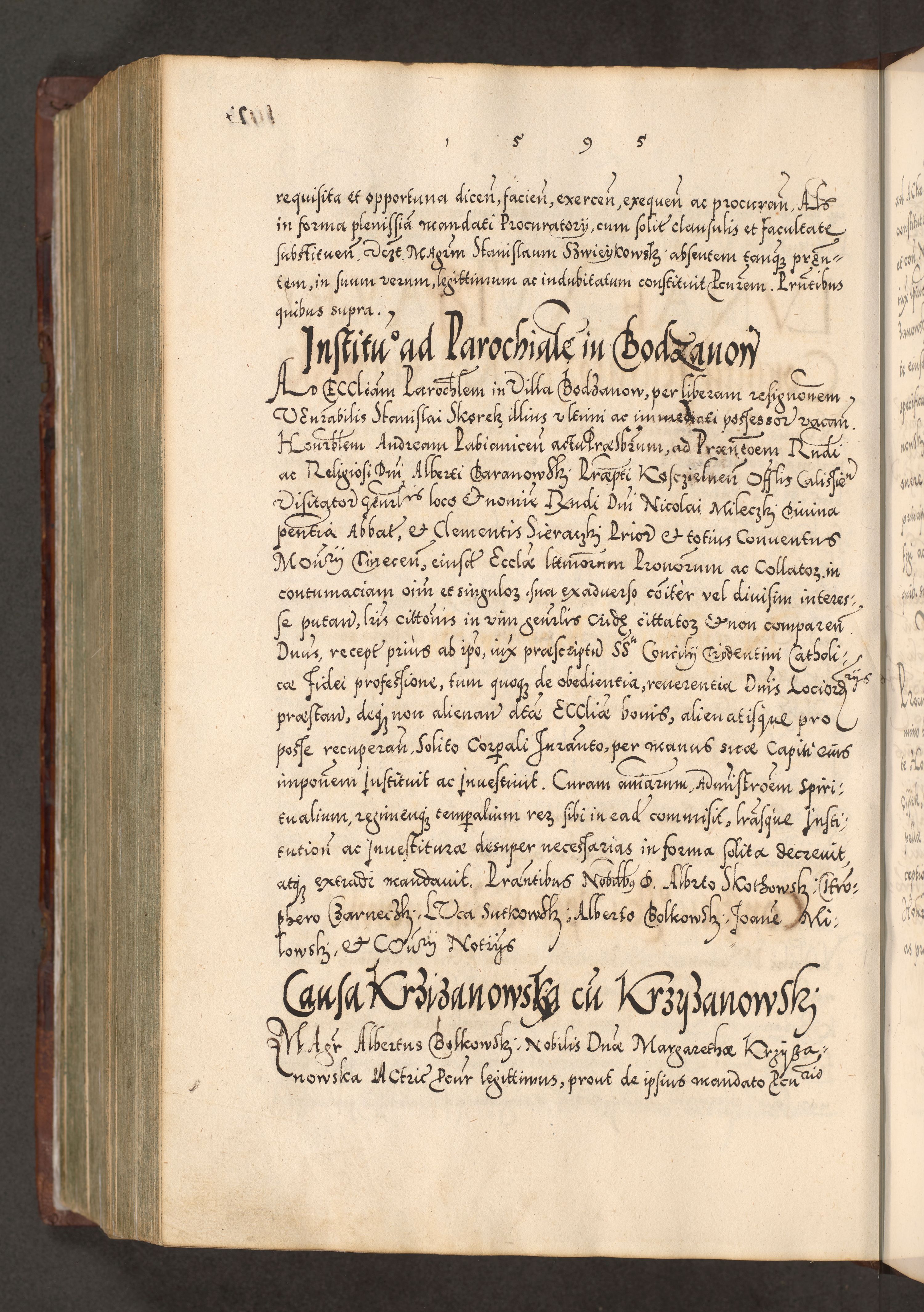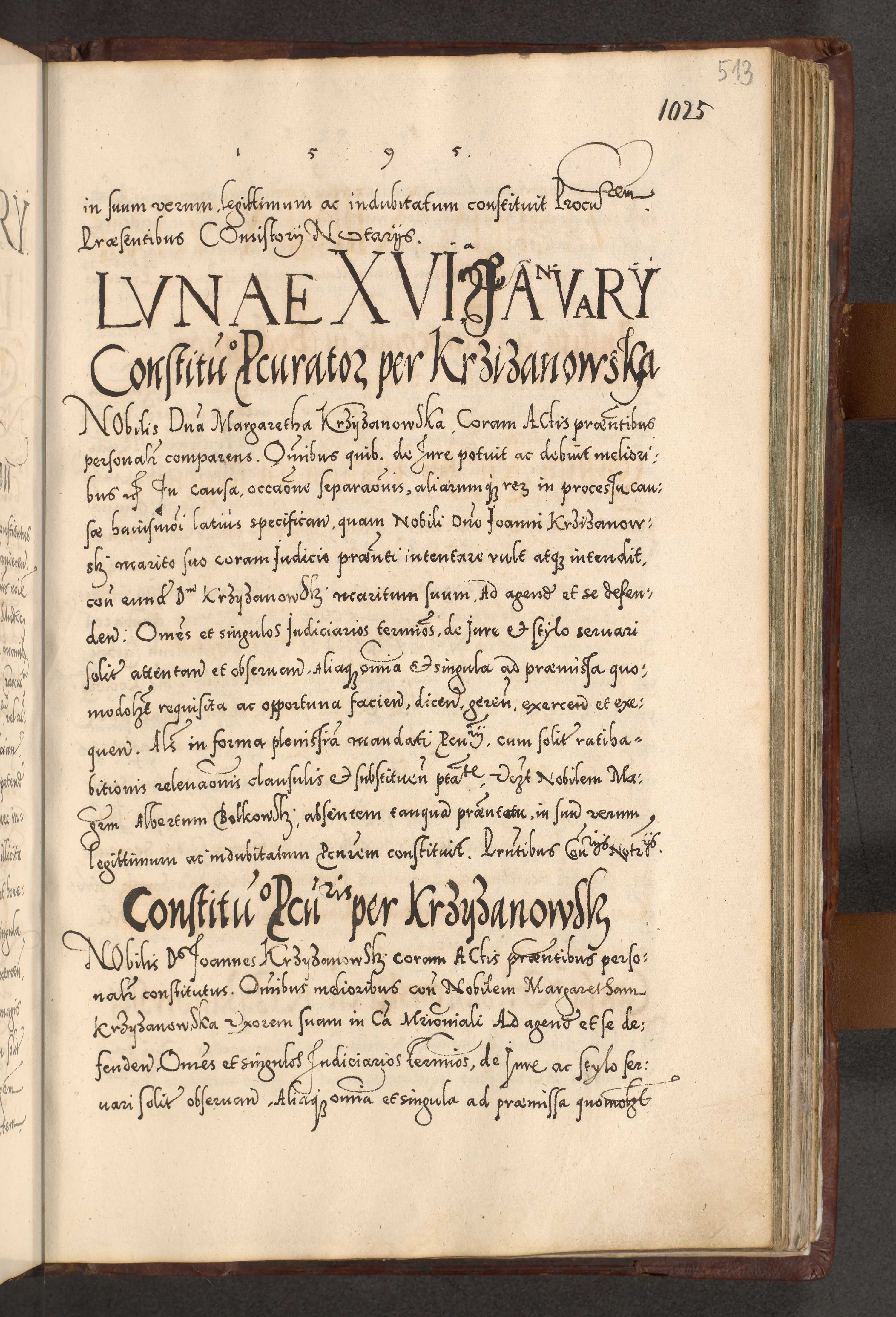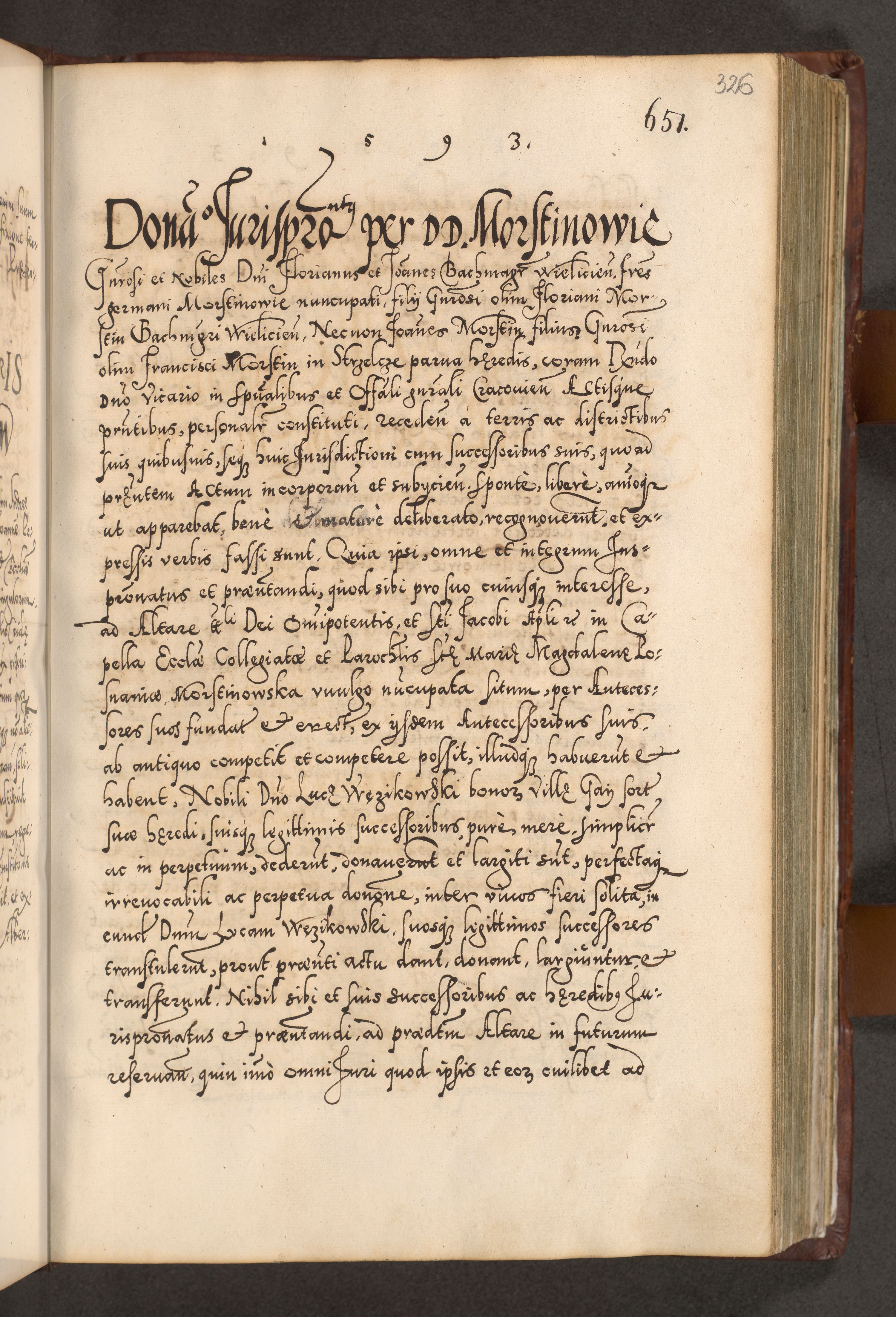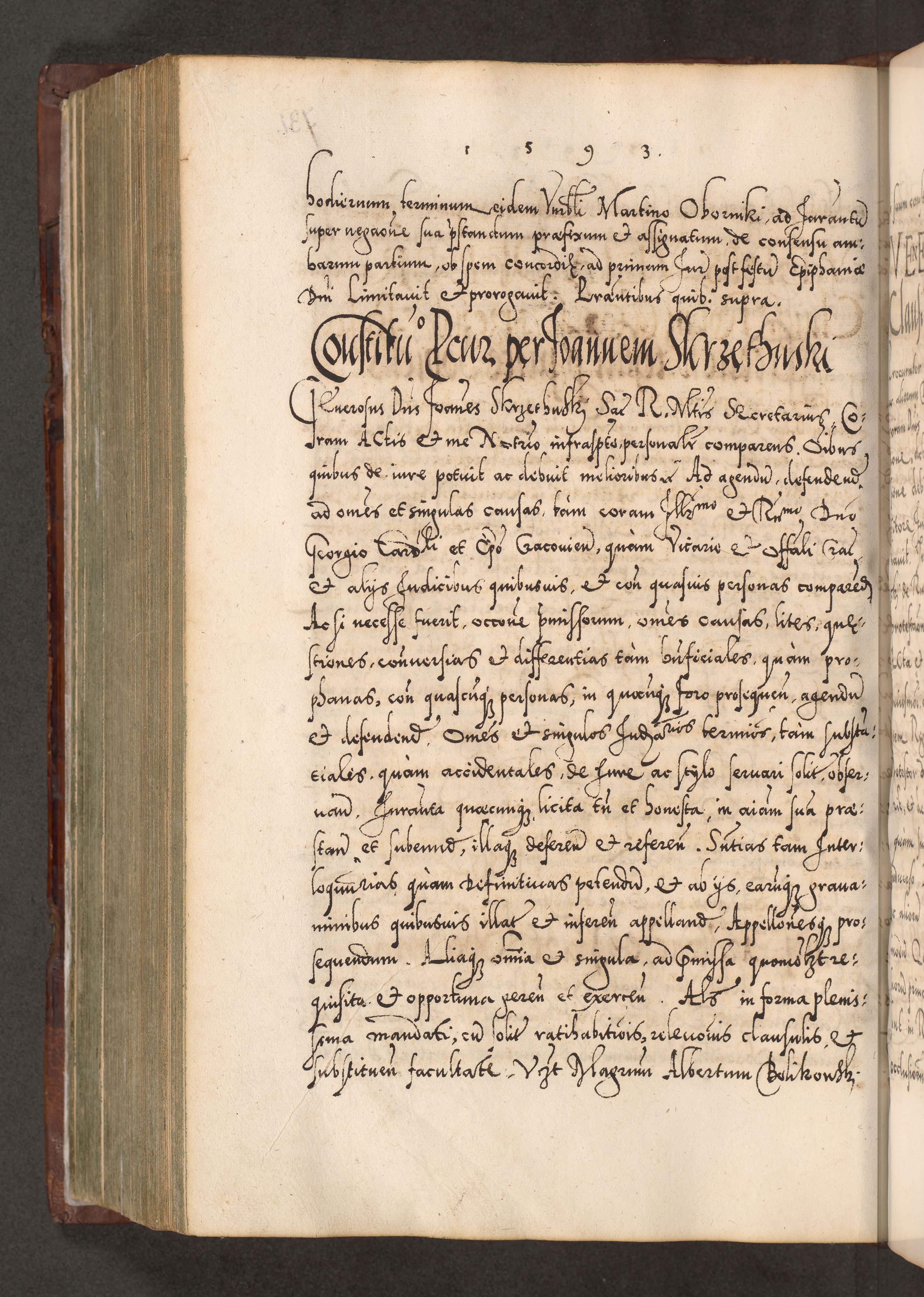 Illistrissimo et revedissimo in Christo Patre Domino Domino Georgio Rzadziwił Miserone Divina Sacrostae R. E. Tituli S. Sixti Presbitero Cardinali Duce in Olyka et Niesswiesz ad Gubernacula Ecclessiae Cracoviensis cuius administratorialem a Sancta Sede Apostolica obtinverat feliciter sedente. Acta actorum, causarum, sententiarum tam deffinitivarum quam interloquutoriarum decretorum, obligationum, quietationum, recognitionum, constitutionum procuratorum etc. coram Reverendo Domino Stanislao Crassinskz de Crasne Archidiacono Cracoviensis, Scholastico Gnesnesis, Custode Plocensis etc. Vicario et Officiali Generali Cracoviensi in Ano Domini Millesimo Quingentesimo Nonagesimo Primo cuius indictio quarta pontificatus SS. Domini Nostri Gregorii XIIII Anno I psius prio feliciter incipiut